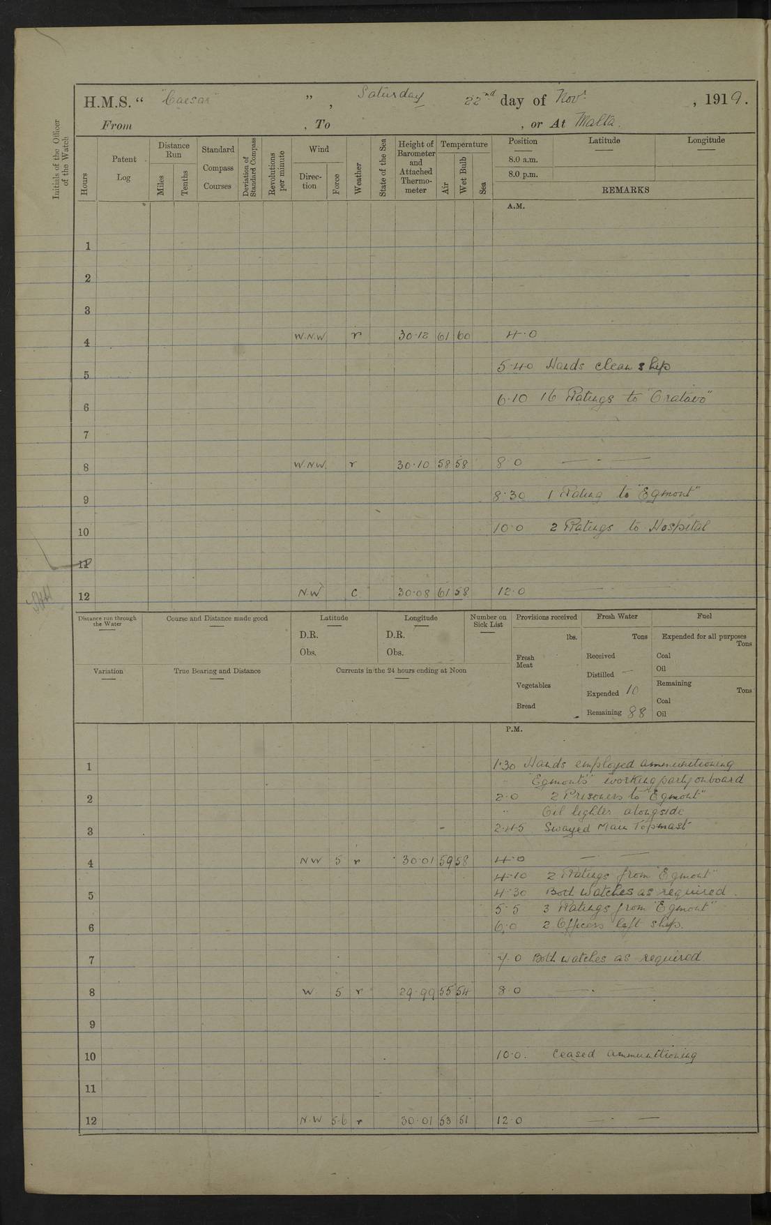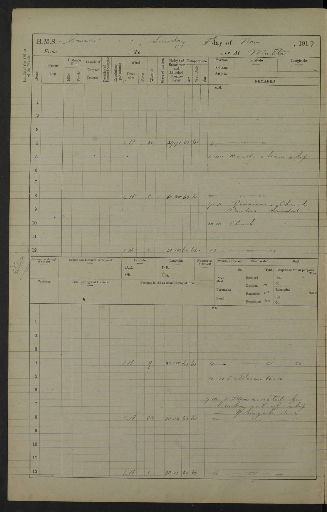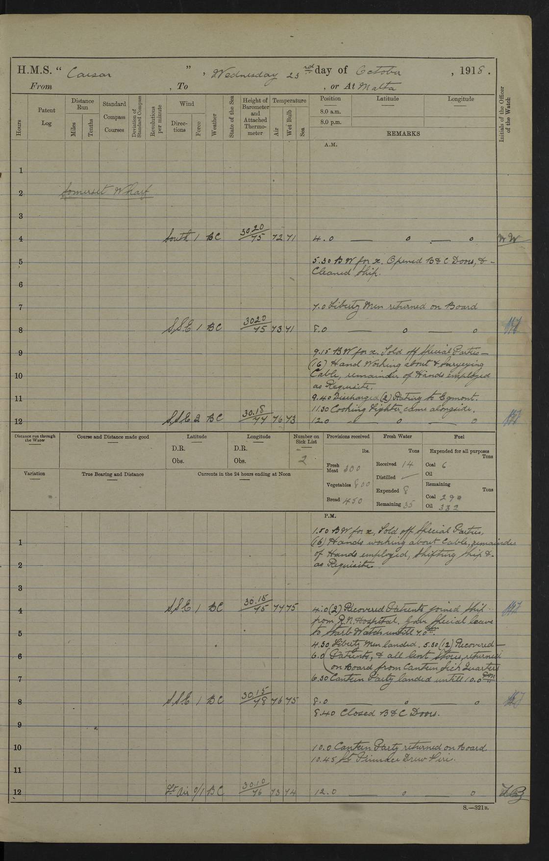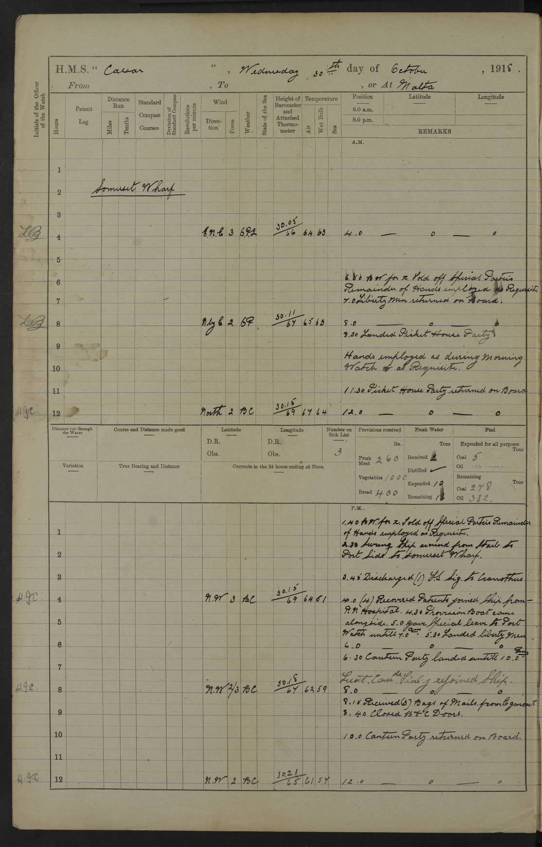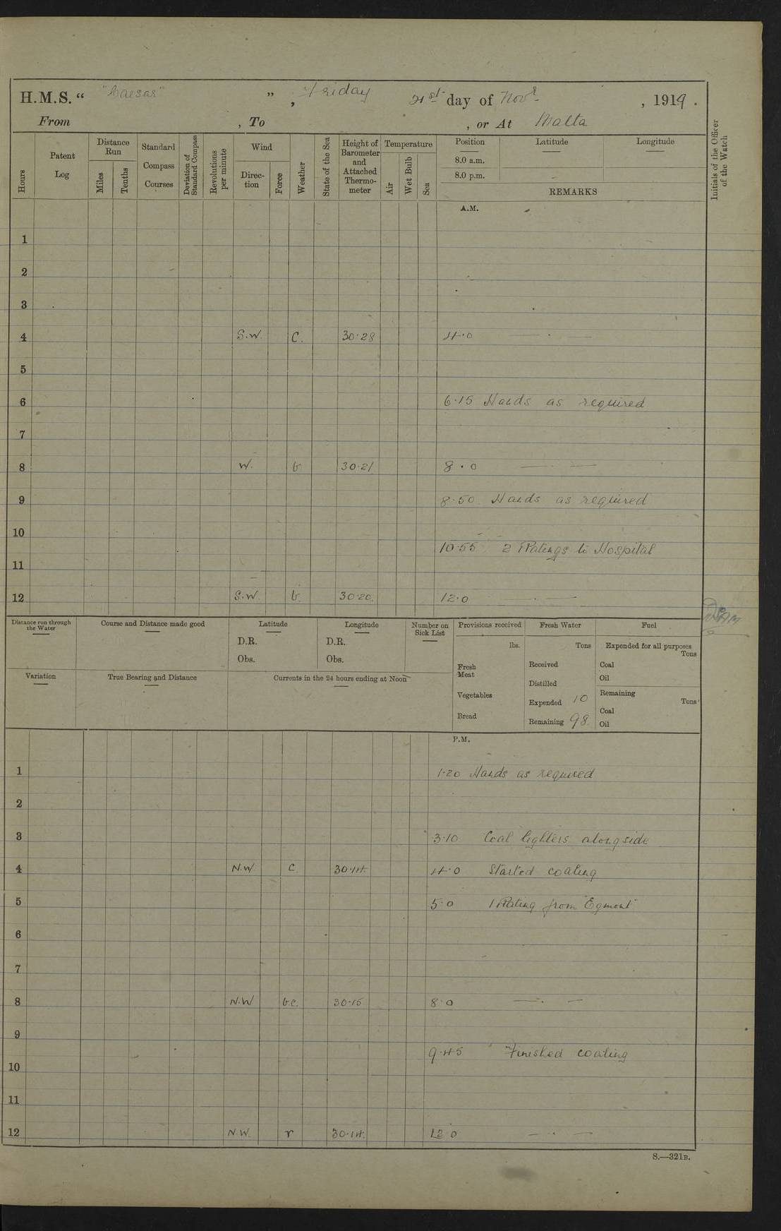 4edebb7b14d0450578000168: (https://s3.amazonaws.com:443/oldweather/ADM53-36589/0003_1.jpg) 1 November 1918 At Malta Lat 35.89, Long 14.52 [Somerset Wharf] 11.15am: Engineers Store Party returned on Board. 0.45pm: Paid Monthly Money. 1.0pm: Mr Goss, Gunner rejoined Ship from RN Hospital. 2.30pm: Gave Special leave to Port Watch untill 7.0am and Port Watch of Boys untill 6.0pm. Hands Made [sic] and Mend Clothes. 2.40pm: Landed liberty Men and Boys. 3.50pm: Provision Boat came alongside. 4.10pm: (4) Recovered Patients rejoined Ship from RN Hospital. 4.30pm: Landed liberty Men and Patrol. 6.0pm: Liberty Boys Returned on Board. 6.30pm: Canteen Party landed untill 10.0pm and Read Warrant No (24). 10.0pm: Canteen Party returned on Board. 11.50pm: Patrol returned on Board. [Provisions received: Fresh Meat 300 lbs, Vegetables 1000 lbs, Bread 450 lbs] 4edebb7c14d0450578000169: (https://s3.amazonaws.com:443/oldweather/ADM53-36589/0004_0.jpg) 2 November 1918 At Malta Lat 35.89, Long 14.52 [Hamilton Wharf] 7.15am: Shifted Berths from Somerset Wharf, to Hamilton Wharf. 8.0am: Tested life Buoys Correct. 8.45am: BW for x Told off Special Parties, Remainder of Hands employed as Requisite, and Landed Picket house Party. 9.10am: Held Court Martial on Board. 10.30am: Court Martial Finished. Noon: Picket House Party returned. 1.20pm: BW for x. Told off Special Parties. Remainder of Hands employed getting in Paymasters Stores and as Requisite. Lost overboard by accident Boat Hooks, Steel, Pattern (345), 2 in Number. 4.20pm: Hands to Fire Stations. 4.35pm: Read Warrant No 25 and gave Special leave to Starboard Watch untill 7.0am. 5.0pm: Landed liberty Men and Victualling Yard Lighter left Ship. 6.30pm: Canteen Party landed untill 10.0pm. [Provisions received: Fresh Meat 260 lbs, Bread 900 lbs] 4edebb7c14d045057800016a: (https://s3.amazonaws.com:443/oldweather/ADM53-36589/0004_1.jpg) 3 November 1918 At Malta Lat 35.89, Long 14.52 [Hamilton Wharf] 9.0am: Landed Church Parties, Wesleyans (14), Presbyterians (10). 9.30am: Divisions. 9.50am: Landed Roman Catholics (15). 10.10am: Discharged (5) Ratings to RN Hospital. 11.35am: All Church Parties returned on Board. 1.0pm: Gave Special leave to Port Watch untill 7.0am and Both Watches of Boys untill 5.30pm. 1.15pm: Landed liberty Men and Boys. 5.30pm: Liberty Boys returned on Board. 6.30pm: Canteen Party landed untill 10.0pm. 8.40pm: Closed B and C Doors. 10.0pm: Canteen Party returned on Board. [Number on sick list: 5] [Provisions received: Fresh Meat 280 lbs] 4edebb7c14d045057800016b: (https://s3.amazonaws.com:443/oldweather/ADM53-36589/0005_0.jpg) 4 November 1918 At Malta Lat 35.89, Long 14.52 [Hamilton Wharf] 6.50am: BW for x Told off Special Parties, remainder of Hands employed as Requisite. 7.0am: Liberty men returned on Board. 8.5am: Provision lighter came alongside. 8.10am: BW for x, Told off Special Parties, remainder of Hands employed Provisioning Ship and as requisite. 8.45am: Landed (1) Carpenter rating for Examination. 3.45pm: (2) Recovered Patients joined Ship from RN Hospital. 4.10pm: Received 8 Bags of Mails from Egmont, and Gave Special leave to Starboard Watch till 7.0am. 5.0pm: Landed Liberty Men and Patrol. 6.0pm: Hands employed getting in and stowing away Provisions. Midnight: Patrol returned on Board. [Weather fine, noon temperature 74F] 4edebb7c14d045057800016c: (https://s3.amazonaws.com:443/oldweather/ADM53-36589/0005_1.jpg) 5 November 1918 At Malta Lat 35.89, Long 14.52 [Hamilton Wharf] 6.45am: BW for x. Told off Special Parties. Remainder of Hands employed getting in and stowing away Provisions. 8.30am: Landed Hospital Party and Picket House Party. 11.0am: Landed (35) Rifles to Naval Ordinance for exchange. Noon: Picket House Party returned. 1.20pm: Landed (2) Ratings for Dental Treatment. 2.25pm: (35) Exchanged Rifles came on Board. 3.40pm: (2) Recovered Patients rejoined Ship from RN Hospital and disinfected Bedding. 4.0pm: Gave Special leave to Port Watch untill 7.0am. Starboard Watch employed stowing Provisions. 4.30pm: Landed Liberty men. Starboard Watch employed stowing away Provisions and Read Warrant No (26). [Provisions received: Fresh Meat 530 lbs, Bread 1000 lbs] 4edebb7c14d045057800016d: (https://s3.amazonaws.com:443/oldweather/ADM53-36589/0006_0.jpg) 6 November 1918 At Malta Lat 35.89, Long 14.52 [Hamilton Wharf] 6.50am: BW for x. Told off Special Parties, Remainder of Port Watch stowing Provisions, Starboard Watch drawing Quarter Deck Awning. 9.0am: Hands employed Provisioning Ship. 4.0pm: Gave Special leave to Starboard Watch untill 7.0am. 4.30pm: Landed liberty Men. Port Watch employed stowing away Provisions. 6.30pm: Canteen Party landed until 10.0pm. 10.0pm: Canteen Party returned on Board. [Number on sick list: 5] [Provisions received: Fresh Meat 250 lbs, Vegetables 1000 lbs, Bread 450 lbs] [Fuel Remaining: Coal 244 tons, Oil 332 tons] 4edebb7c14d045057800016e: (https://s3.amazonaws.com:443/oldweather/ADM53-36589/0006_1.jpg) 7 November 1918 At Malta Lat 35.89, Long 14.52 [No 4 Buoy] 6.30am: BW for x. Told off Special Parties. Remainder of Hands employed prepairing [preparing] Ship to Shift Berths, from Hamilton Wharf to No 4 Buoy. 7.0am: Liberty men returned on Board. 8.50am: Secured Ship to No 4 Buoy and Coal Lighters came alongside. 9.10am: Commenced Coaling Native labour. Hands employed Drawing Stores and as Requisite. 11.50am: Dockyard Parties returned. 1.40pm: BW for x Told off Special Parties, remainder of Hands employed as Requisite. 4.30pm: Gave Special leave to Port Watch untill 7.0am. 4.45pm: Landed liberty men and Patrol and Read Warrant No (27). 7.30pm: Completed Coaling (1481) Tons. 8.40pm: Watch employed sweeping down. 11.50pm: Patrol returned on Board. [Number on sick list: 6] [Provisions received: Fresh Meat 280 lbs, Bread 300 lbs] [Fuel Remaining: Coal 1716 tons, Oil 332 tons] 4edebb7c14d045057800016f: (https://s3.amazonaws.com:443/oldweather/ADM53-36589/0007_0.jpg) 8 November 1918 At Malta Lat 35.89, Long 