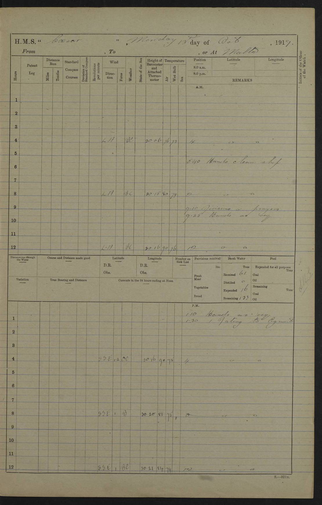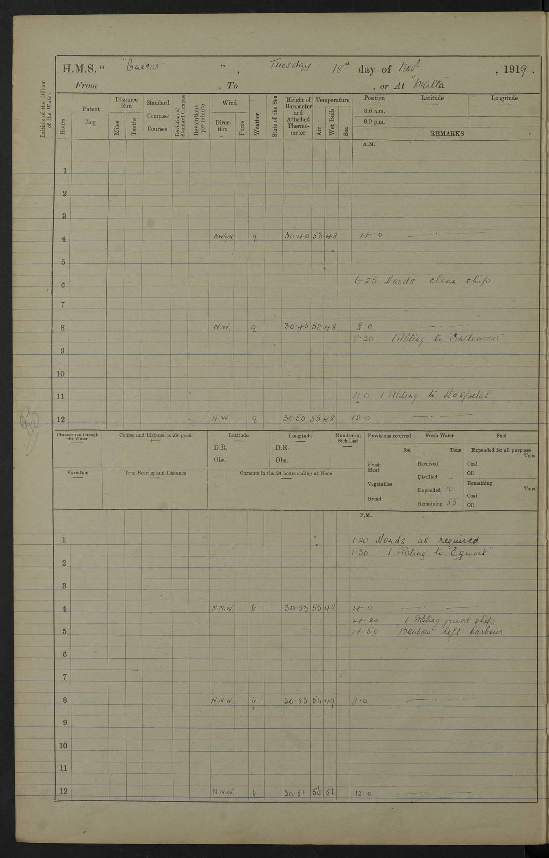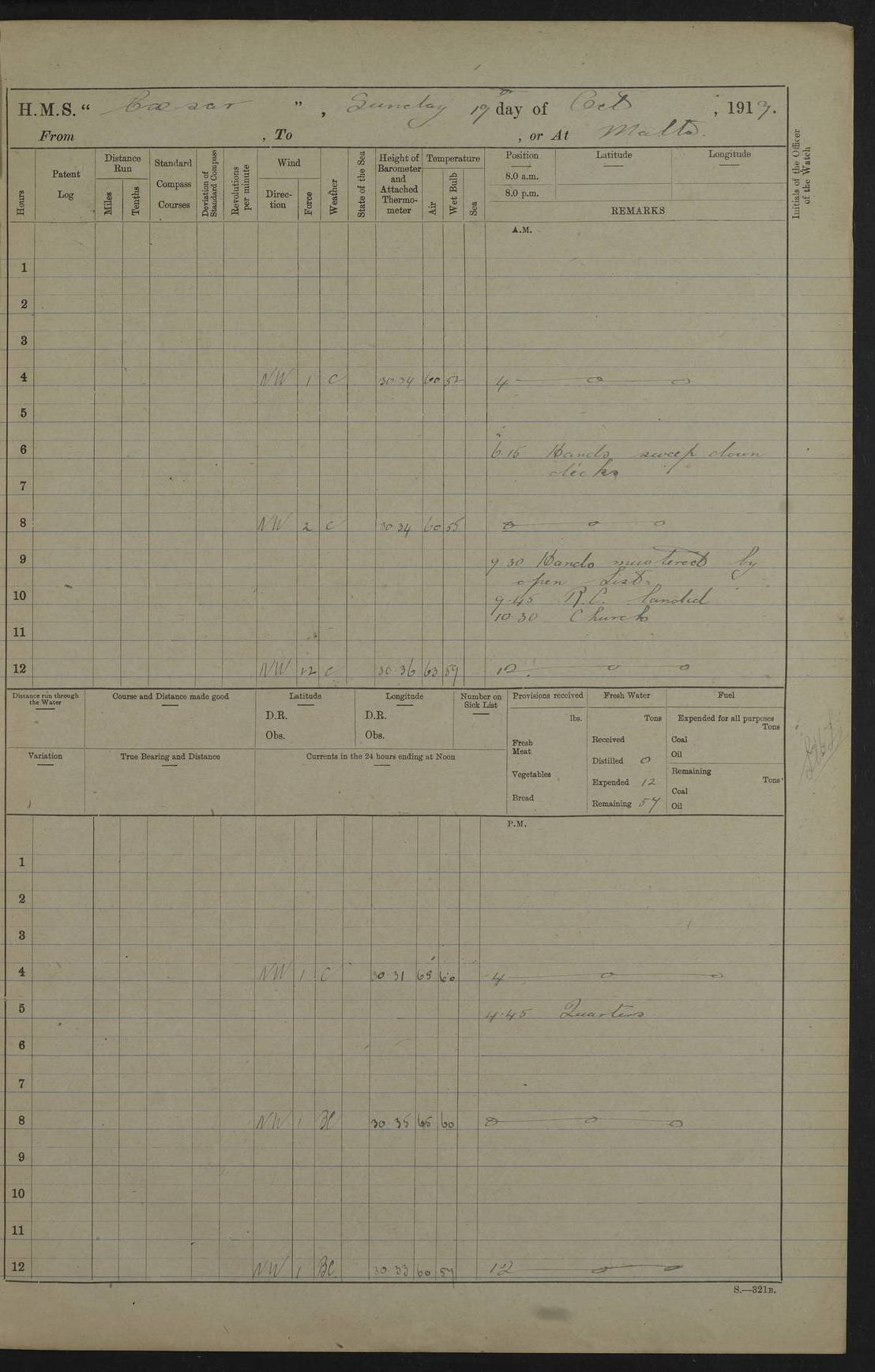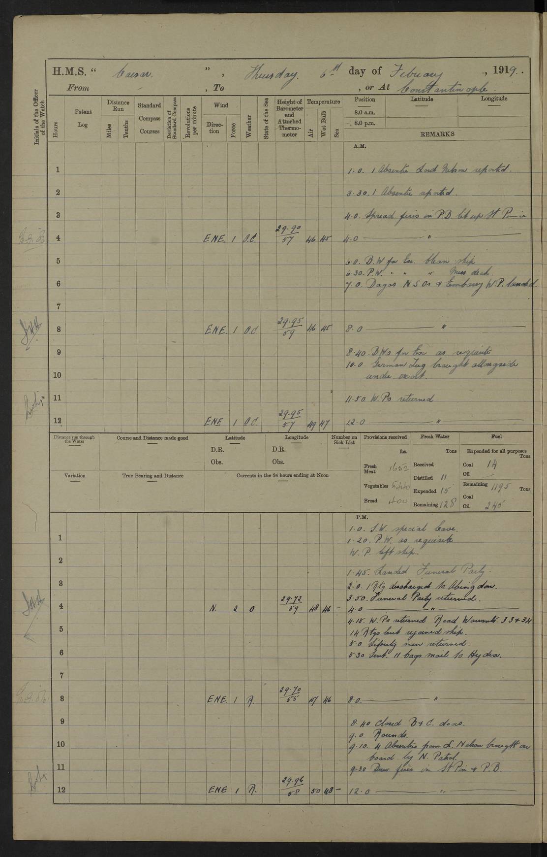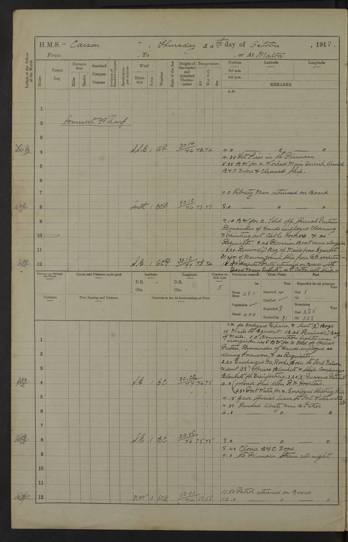 4edebb7b14d0450578000168: (https://s3.amazonaws.com:443/oldweather/ADM53-36589/0003_1.jpg) 1 November 1918 At Malta Lat 35.89, Long 14.52 [Somerset Wharf] 11.15am: Engineers Store Party returned on Board. 0.45pm: Paid Monthly Money. 1.0pm: Mr Goss, Gunner rejoined Ship from RN Hospital. 2.30pm: Gave Special leave to Port Watch untill 7.0am and Port Watch of Boys untill 6.0pm. Hands Made [sic] and Mend Clothes. 2.40pm: Landed liberty Men and Boys. 3.50pm: Provision Boat came alongside. 4.10pm: (4) Recovered Patients rejoined Ship from RN Hospital. 4.30pm: Landed liberty Men and Patrol. 6.0pm: Liberty Boys Returned on Board. 6.30pm: Canteen Party landed untill 10.0pm and Read Warrant No (24). 10.0pm: Canteen Party returned on Board. 11.50pm: Patrol returned on Board. [Provisions received: Fresh Meat 300 lbs, Vegetables 1000 lbs, Bread 450 lbs] 4edebb7c14d0450578000169: (https://s3.amazonaws.com:443/oldweather/ADM53-36589/0004_0.jpg) 2 November 1918 At Malta Lat 35.89, Long 14.52 [Hamilton Wharf] 7.15am: Shifted Berths from Somerset Wharf, to Hamilton Wharf. 8.0am: Tested life Buoys Correct. 8.45am: BW for x Told off Special Parties, Remainder of Hands employed as Requisite, and Landed Picket house Party. 9.10am: Held Court Martial on Board. 10.30am: Court Martial Finished. Noon: Picket House Party returned. 1.20pm: BW for x. Told off Special Parties. Remainder of Hands employed getting in Paymasters Stores and as Requisite. Lost overboard by accident Boat Hooks, Steel, Pattern (345), 2 in Number. 4.20pm: Hands to Fire Stations. 4.35pm: Read Warrant No 25 and gave Special leave to Starboard Watch untill 7.0am. 5.0pm: Landed liberty Men and Victualling Yard Lighter left Ship. 6.30pm: Canteen Party landed untill 10.0pm. [Provisions received: Fresh Meat 260 lbs, Bread 900 lbs] 4edebb7c14d045057800016a: (https://s3.amazonaws.com:443/oldweather/ADM53-36589/0004_1.jpg) 3 November 1918 At Malta Lat 35.89, Long 14.52 [Hamilton Wharf] 9.0am: Landed Church Parties, Wesleyans (14), Presbyterians (10). 9.30am: Divisions. 9.50am: Landed Roman Catholics (15). 10.10am: Discharged (5) Ratings to RN Hospital. 11.35am: All Church Parties returned on Board. 1.0pm: Gave Special leave to Port Watch untill 7.0am and Both Watches of Boys untill 5.30pm. 1.15pm: Landed liberty Men and Boys. 5.30pm: Liberty Boys returned on Board. 6.30pm: Canteen Party landed untill 10.0pm. 8.40pm: Closed B and C Doors. 10.0pm: Canteen Party returned on Board. [Number on sick list: 5] [Provisions received: Fresh Meat 280 lbs] 4edebb7c14d045057800016b: (https://s3.amazonaws.com:443/oldweather/ADM53-36589/0005_0.jpg) 4 November 1918 At Malta Lat 35.89, Long 14.52 [Hamilton Wharf] 6.50am: BW for x Told off Special Parties, remainder of Hands employed as Requisite. 7.0am: Liberty men returned on Board. 8.5am: Provision lighter came alongside. 8.10am: BW for x, Told off Special Parties, remainder of Hands employed Provisioning Ship and as requisite. 8.45am: Landed (1) Carpenter rating for Examination. 3.45pm: (2) Recovered Patients joined Ship from RN Hospital. 4.10pm: Received 8 Bags of Mails from Egmont, and Gave Special leave to Starboard Watch till 7.0am. 5.0pm: Landed Liberty Men and Patrol. 6.0pm: Hands employed getting in and stowing away Provisions. Midnight: Patrol returned on Board. [Weather fine, noon temperature 74F] 4edebb7c14d045057800016c: (https://s3.amazonaws.com:443/oldweather/ADM53-36589/0005_1.jpg) 5 November 1918 At Malta Lat 35.89, Long 14.52 [Hamilton Wharf] 6.45am: BW for x. Told off Special Parties. Remainder of Hands employed getting in and stowing away Provisions. 8.30am: Landed Hospital Party and Picket House Party. 11.0am: Landed (35) Rifles to Naval Ordinance for exchange. Noon: Picket House Party returned. 1.20pm: Landed (2) Ratings for Dental Treatment. 2.25pm: (35) Exchanged Rifles came on Board. 3.40pm: (2) Recovered Patients rejoined Ship from RN Hospital and disinfected Bedding. 4.0pm: Gave Special leave to Port Watch untill 7.0am. Starboard Watch employed stowing Provisions. 4.30pm: Landed Liberty men. Starboard Watch employed stowing away Provisions and Read Warrant No (26). [Provisions received: Fresh Meat 530 lbs, Bread 1000 lbs] 4edebb7c14d045057800016d: (https://s3.amazonaws.com:443/oldweather/ADM53-36589/0006_0.jpg) 6 November 1918 At Malta Lat 35.89, Long 14.52 [Hamilton Wharf] 6.50am: BW for x. Told off Special Parties, Remainder of Port Watch stowing Provisions, Starboard Watch drawing Quarter Deck Awning. 9.0am: Hands employed Provisioning Ship. 4.0pm: Gave Special leave to Starboard Watch untill 7.0am. 4.30pm: Landed liberty Men. Port Watch employed stowing away Provisions. 6.30pm: Canteen Party landed until 10.0pm. 10.0pm: Canteen Party returned on Board. [Number on sick list: 5] [Provisions received: Fresh Meat 250 lbs, Vegetables 1000 lbs, Bread 450 lbs] [Fuel Remaining: Coal 244 tons, Oil 332 tons] 4edebb7c14d045057800016e: (https://s3.amazonaws.com:443/oldweather/ADM53-36589/0006_1.jpg) 7 November 1918 At Malta Lat 35.89, Long 14.52 [No 4 Buoy] 6.30am: BW for x. Told off Special Parties. Remainder of Hands employed prepairing [preparing] Ship to Shift Berths, from Hamilton Wharf to No 4 Buoy. 7.0am: Liberty men returned on Board. 8.50am: Secured Ship to No 4 Buoy and Coal Lighters came alongside. 9.10am: Commenced Coaling Native labour. Hands employed Drawing Stores and as Requisite. 11.50am: Dockyard Parties returned. 1.40pm: BW for x Told off Special Parties, remainder of Hands employed as Requisite. 4.30pm: Gave Special leave to Port Watch untill 7.0am. 4.45pm: Landed liberty men and Patrol and Read Warrant No (27). 7.30pm: Completed Coaling (1481) Tons. 8.40pm: Watch employed sweeping down. 11.50pm: Patrol returned on Board. [Number on sick list: 6] [Provisions received: Fresh Meat 280 lbs, Bread 300 lbs] [Fuel Remaining: Coal 1716 tons, Oil 332 tons] 4edebb7c14d045057800016f: (https://s3.amazonaws.com:443/oldweather/ADM53-36589/0007_0.jpg) 8 November 1918 At Malta Lat 35.89, Long 