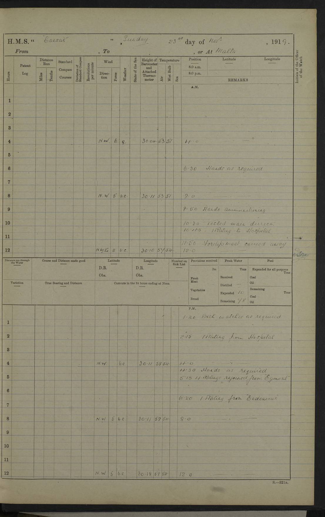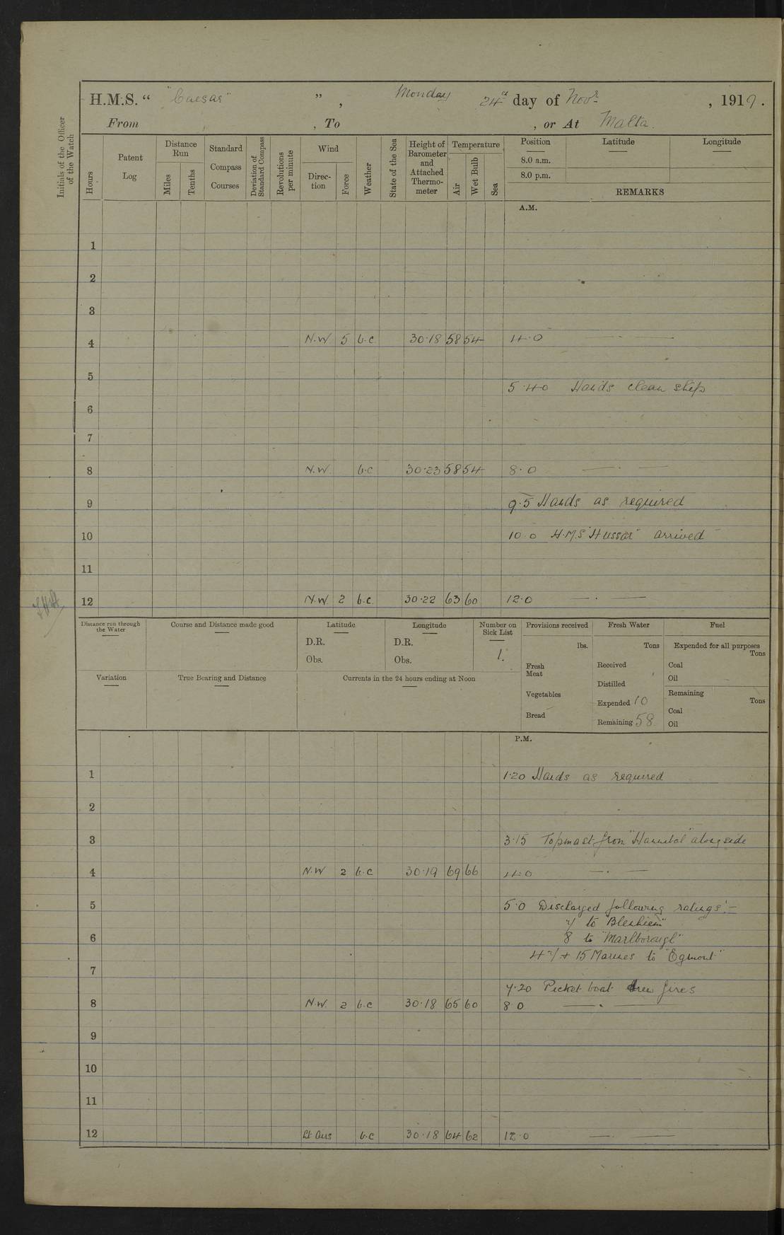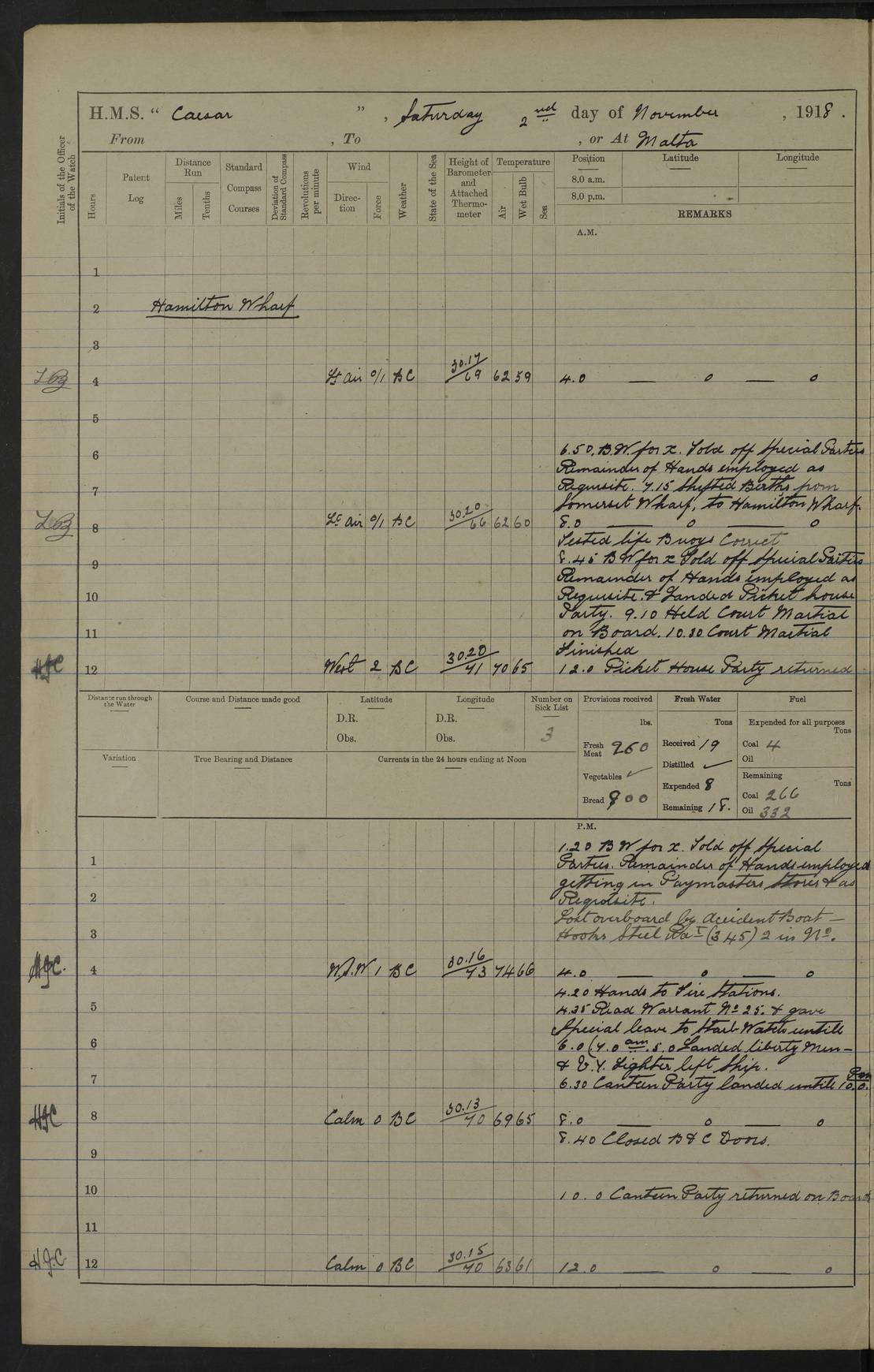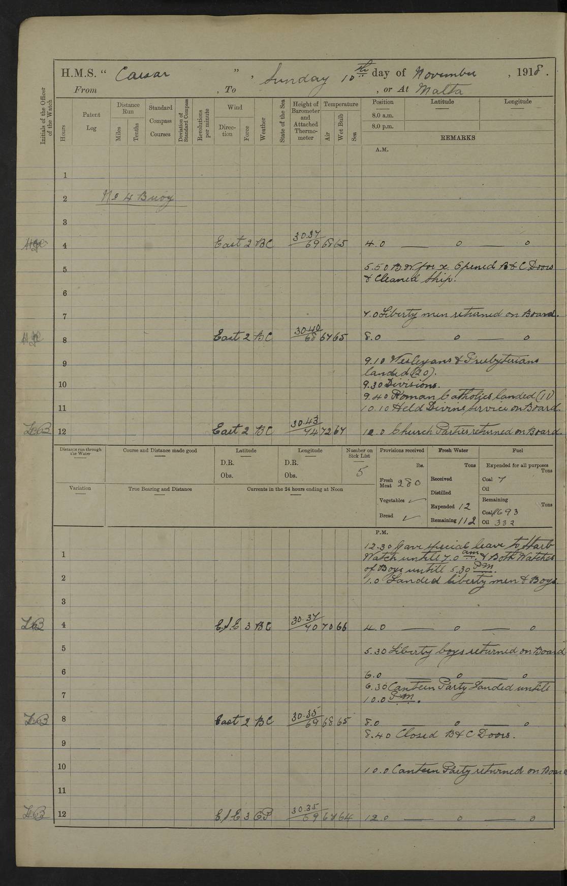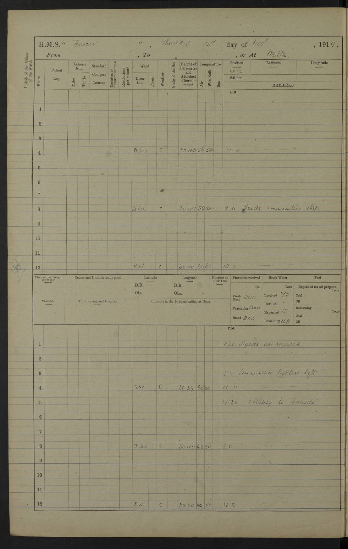 4edebb7b14d0450578000168: (https://s3.amazonaws.com:443/oldweather/ADM53-36589/0003_1.jpg) 1 November 1918 At Malta Lat 35.89, Long 14.52 [Somerset Wharf] 11.15am: Engineers Store Party returned on Board. 0.45pm: Paid Monthly Money. 1.0pm: Mr Goss, Gunner rejoined Ship from RN Hospital. 2.30pm: Gave Special leave to Port Watch untill 7.0am and Port Watch of Boys untill 6.0pm. Hands Made [sic] and Mend Clothes. 2.40pm: Landed liberty Men and Boys. 3.50pm: Provision Boat came alongside. 4.10pm: (4) Recovered Patients rejoined Ship from RN Hospital. 4.30pm: Landed liberty Men and Patrol. 6.0pm: Liberty Boys Returned on Board. 6.30pm: Canteen Party landed untill 10.0pm and Read Warrant No (24). 10.0pm: Canteen Party returned on Board. 11.50pm: Patrol returned on Board. [Provisions received: Fresh Meat 300 lbs, Vegetables 1000 lbs, Bread 450 lbs] 4edebb7c14d0450578000169: (https://s3.amazonaws.com:443/oldweather/ADM53-36589/0004_0.jpg) 2 November 1918 At Malta Lat 35.89, Long 14.52 [Hamilton Wharf] 7.15am: Shifted Berths from Somerset Wharf, to Hamilton Wharf. 8.0am: Tested life Buoys Correct. 8.45am: BW for x Told off Special Parties, Remainder of Hands employed as Requisite, and Landed Picket house Party. 9.10am: Held Court Martial on Board. 10.30am: Court Martial Finished. Noon: Picket House Party returned. 1.20pm: BW for x. Told off Special Parties. Remainder of Hands employed getting in Paymasters Stores and as Requisite. Lost overboard by accident Boat Hooks, Steel, Pattern (345), 2 in Number. 4.20pm: Hands to Fire Stations. 4.35pm: Read Warrant No 25 and gave Special leave to Starboard Watch untill 7.0am. 5.0pm: Landed liberty Men and Victualling Yard Lighter left Ship. 6.30pm: Canteen Party landed untill 10.0pm. [Provisions received: Fresh Meat 260 lbs, Bread 900 lbs] 4edebb7c14d045057800016a: (https://s3.amazonaws.com:443/oldweather/ADM53-36589/0004_1.jpg) 3 November 1918 At Malta Lat 35.89, Long 14.52 [Hamilton Wharf] 9.0am: Landed Church Parties, Wesleyans (14), Presbyterians (10). 9.30am: Divisions. 9.50am: Landed Roman Catholics (15). 10.10am: Discharged (5) Ratings to RN Hospital. 11.35am: All Church Parties returned on Board. 1.0pm: Gave Special leave to Port Watch untill 7.0am and Both Watches of Boys untill 5.30pm. 1.15pm: Landed liberty Men and Boys. 5.30pm: Liberty Boys returned on Board. 6.30pm: Canteen Party landed untill 10.0pm. 8.40pm: Closed B and C Doors. 10.0pm: Canteen Party returned on Board. [Number on sick list: 5] [Provisions received: Fresh Meat 280 lbs] 4edebb7c14d045057800016b: (https://s3.amazonaws.com:443/oldweather/ADM53-36589/0005_0.jpg) 4 November 1918 At Malta Lat 35.89, Long 14.52 [Hamilton Wharf] 6.50am: BW for x Told off Special Parties, remainder of Hands employed as Requisite. 7.0am: Liberty men returned on Board. 8.5am: Provision lighter came alongside. 8.10am: BW for x, Told off Special Parties, remainder of Hands employed Provisioning Ship and as requisite. 8.45am: Landed (1) Carpenter rating for Examination. 3.45pm: (2) Recovered Patients joined Ship from RN Hospital. 4.10pm: Received 8 Bags of Mails from Egmont, and Gave Special leave to Starboard Watch till 7.0am. 5.0pm: Landed Liberty Men and Patrol. 6.0pm: Hands employed getting in and stowing away Provisions. Midnight: Patrol returned on Board. [Weather fine, noon temperature 74F] 4edebb7c14d045057800016c: (https://s3.amazonaws.com:443/oldweather/ADM53-36589/0005_1.jpg) 5 November 1918 At Malta Lat 35.89, Long 14.52 [Hamilton Wharf] 6.45am: BW for x. Told off Special Parties. Remainder of Hands employed getting in and stowing away Provisions. 8.30am: Landed Hospital Party and Picket House Party. 11.0am: Landed (35) Rifles to Naval Ordinance for exchange. Noon: Picket House Party returned. 1.20pm: Landed (2) Ratings for Dental Treatment. 2.25pm: (35) Exchanged Rifles came on Board. 3.40pm: (2) Recovered Patients rejoined Ship from RN Hospital and disinfected Bedding. 4.0pm: Gave Special leave to Port Watch untill 7.0am. Starboard Watch employed stowing Provisions. 4.30pm: Landed Liberty men. Starboard Watch employed stowing away Provisions and Read Warrant No (26). [Provisions received: Fresh Meat 530 lbs, Bread 1000 lbs] 4edebb7c14d045057800016d: (https://s3.amazonaws.com:443/oldweather/ADM53-36589/0006_0.jpg) 6 November 1918 At Malta Lat 35.89, Long 14.52 [Hamilton Wharf] 6.50am: BW for x. Told off Special Parties, Remainder of Port Watch stowing Provisions, Starboard Watch drawing Quarter Deck Awning. 9.0am: Hands employed Provisioning Ship. 4.0pm: Gave Special leave to Starboard Watch untill 7.0am. 4.30pm: Landed liberty Men. Port Watch employed stowing away Provisions. 6.30pm: Canteen Party landed until 10.0pm. 10.0pm: Canteen Party returned on Board. [Number on sick list: 5] [Provisions received: Fresh Meat 250 lbs, Vegetables 1000 lbs, Bread 450 lbs] [Fuel Remaining: Coal 244 tons, Oil 332 tons] 4edebb7c14d045057800016e: (https://s3.amazonaws.com:443/oldweather/ADM53-36589/0006_1.jpg) 7 November 1918 At Malta Lat 35.89, Long 14.52 [No 4 Buoy] 6.30am: BW for x. Told off Special Parties. Remainder of Hands employed prepairing [preparing] Ship to Shift Berths, from Hamilton Wharf to No 4 Buoy. 7.0am: Liberty men returned on Board. 8.50am: Secured Ship to No 4 Buoy and Coal Lighters came alongside. 9.10am: Commenced Coaling Native labour. Hands employed Drawing Stores and as Requisite. 11.50am: Dockyard Parties returned. 1.40pm: BW for x Told off Special Parties, remainder of Hands employed as Requisite. 4.30pm: Gave Special leave to Port Watch untill 7.0am. 4.45pm: Landed liberty men and Patrol and Read Warrant No (27). 7.30pm: Completed Coaling (1481) Tons. 8.40pm: Watch employed sweeping down. 11.50pm: Patrol returned on Board. [Number on sick list: 6] [Provisions received: Fresh Meat 280 lbs, Bread 300 lbs] [Fuel Remaining: Coal 1716 tons, Oil 332 tons] 4edebb7c14d045057800016f: (https://s3.amazonaws.com:443/oldweather/ADM53-36589/0007_0.jpg) 8 November 1918 At Malta Lat 35.89, Long 