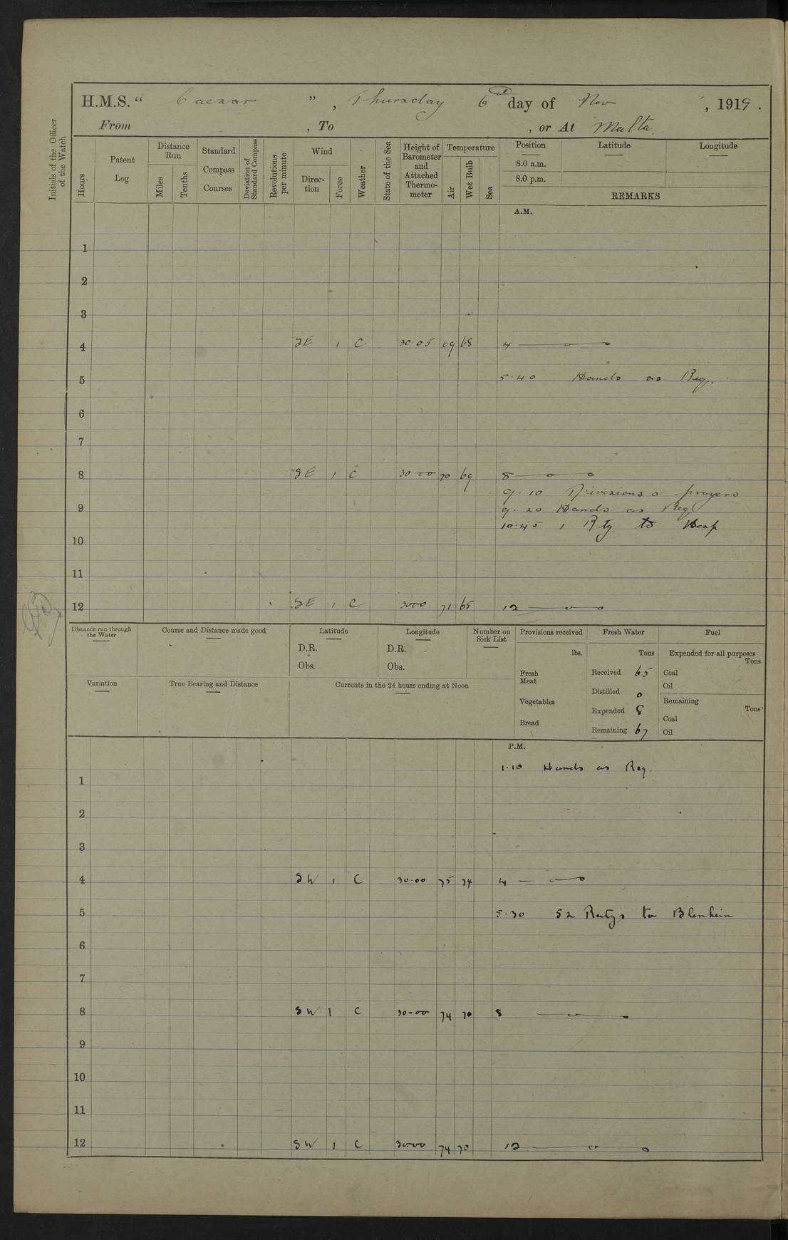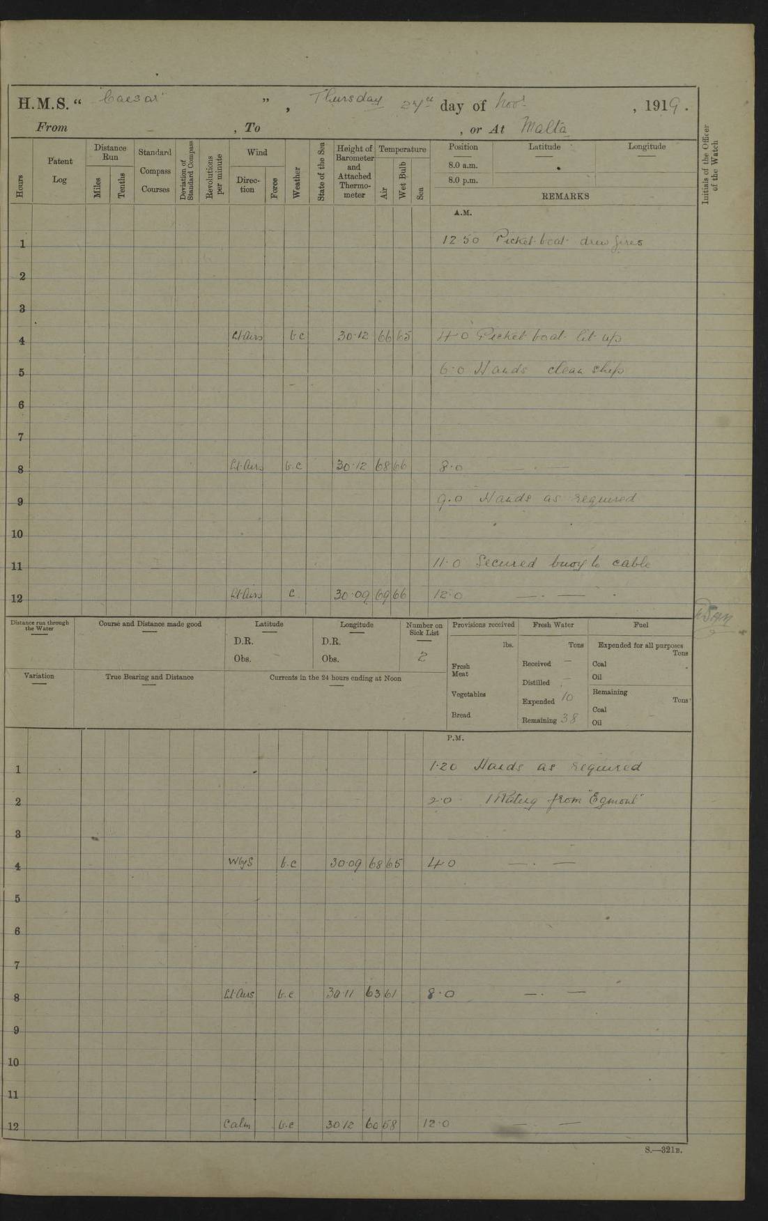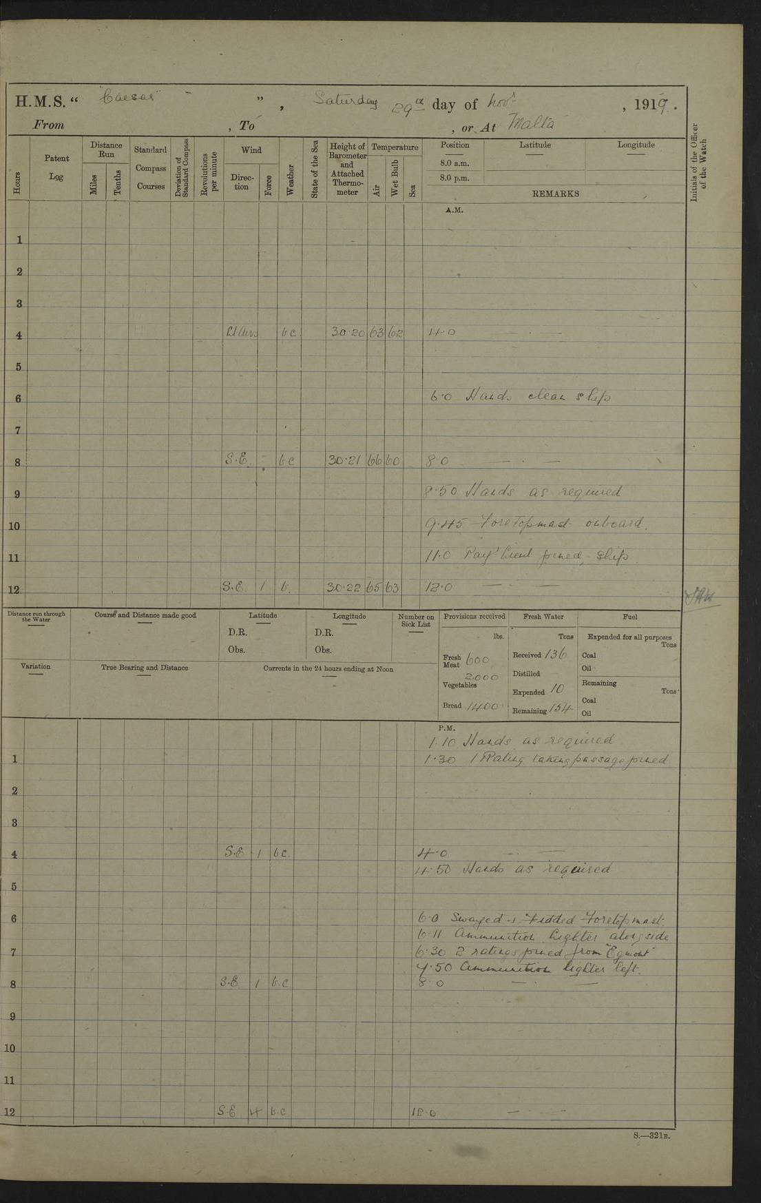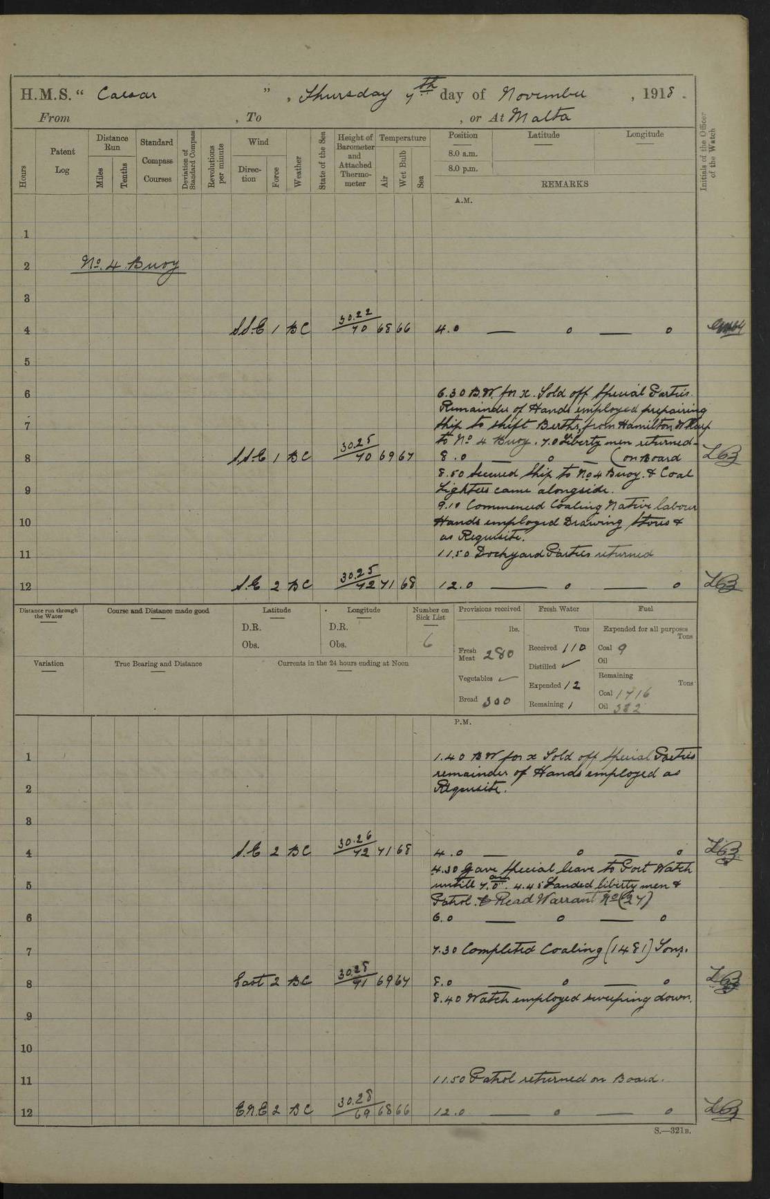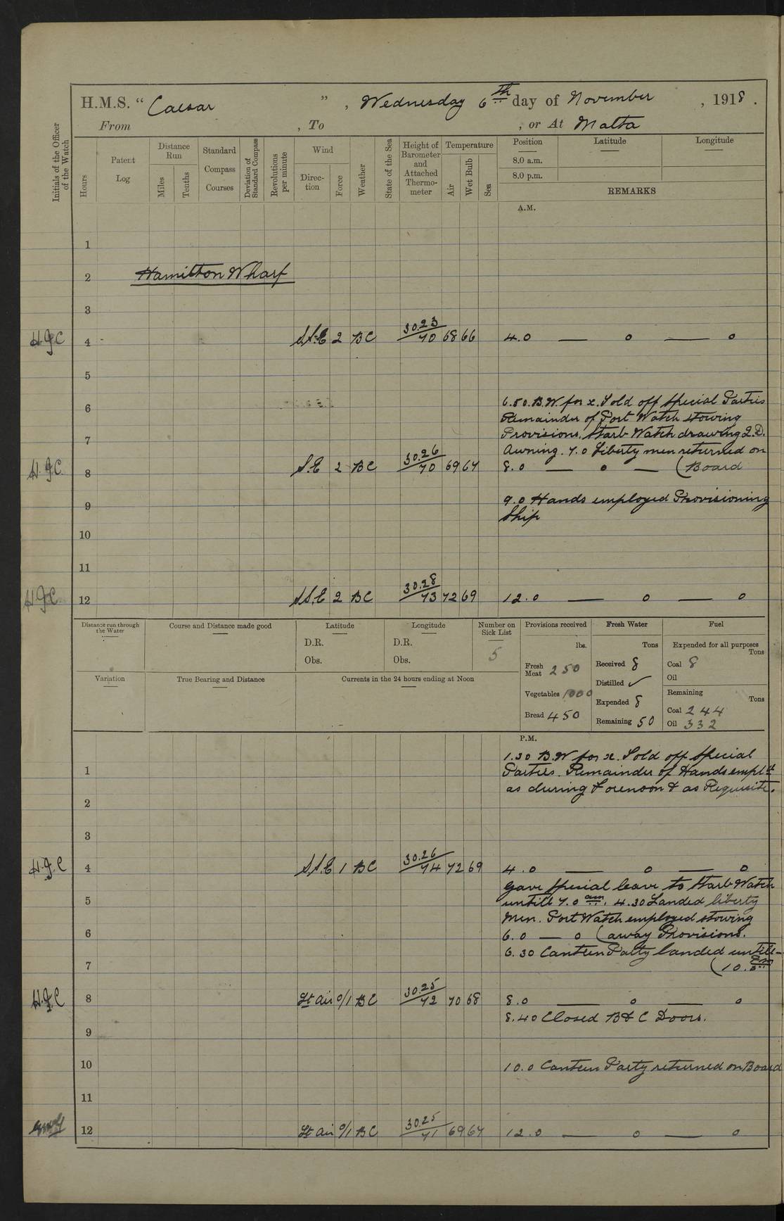 4edebb7b14d0450578000168: (https://s3.amazonaws.com:443/oldweather/ADM53-36589/0003_1.jpg) 1 November 1918 At Malta Lat 35.89, Long 14.52 [Somerset Wharf] 11.15am: Engineers Store Party returned on Board. 0.45pm: Paid Monthly Money. 1.0pm: Mr Goss, Gunner rejoined Ship from RN Hospital. 2.30pm: Gave Special leave to Port Watch untill 7.0am and Port Watch of Boys untill 6.0pm. Hands Made [sic] and Mend Clothes. 2.40pm: Landed liberty Men and Boys. 3.50pm: Provision Boat came alongside. 4.10pm: (4) Recovered Patients rejoined Ship from RN Hospital. 4.30pm: Landed liberty Men and Patrol. 6.0pm: Liberty Boys Returned on Board. 6.30pm: Canteen Party landed untill 10.0pm and Read Warrant No (24). 10.0pm: Canteen Party returned on Board. 11.50pm: Patrol returned on Board. [Provisions received: Fresh Meat 300 lbs, Vegetables 1000 lbs, Bread 450 lbs] 4edebb7c14d0450578000169: (https://s3.amazonaws.com:443/oldweather/ADM53-36589/0004_0.jpg) 2 November 1918 At Malta Lat 35.89, Long 14.52 [Hamilton Wharf] 7.15am: Shifted Berths from Somerset Wharf, to Hamilton Wharf. 8.0am: Tested life Buoys Correct. 8.45am: BW for x Told off Special Parties, Remainder of Hands employed as Requisite, and Landed Picket house Party. 9.10am: Held Court Martial on Board. 10.30am: Court Martial Finished. Noon: Picket House Party returned. 1.20pm: BW for x. Told off Special Parties. Remainder of Hands employed getting in Paymasters Stores and as Requisite. Lost overboard by accident Boat Hooks, Steel, Pattern (345), 2 in Number. 4.20pm: Hands to Fire Stations. 4.35pm: Read Warrant No 25 and gave Special leave to Starboard Watch untill 7.0am. 5.0pm: Landed liberty Men and Victualling Yard Lighter left Ship. 6.30pm: Canteen Party landed untill 10.0pm. [Provisions received: Fresh Meat 260 lbs, Bread 900 lbs] 4edebb7c14d045057800016a: (https://s3.amazonaws.com:443/oldweather/ADM53-36589/0004_1.jpg) 3 November 1918 At Malta Lat 35.89, Long 14.52 [Hamilton Wharf] 9.0am: Landed Church Parties, Wesleyans (14), Presbyterians (10). 9.30am: Divisions. 9.50am: Landed Roman Catholics (15). 10.10am: Discharged (5) Ratings to RN Hospital. 11.35am: All Church Parties returned on Board. 1.0pm: Gave Special leave to Port Watch untill 7.0am and Both Watches of Boys untill 5.30pm. 1.15pm: Landed liberty Men and Boys. 5.30pm: Liberty Boys returned on Board. 6.30pm: Canteen Party landed untill 10.0pm. 8.40pm: Closed B and C Doors. 10.0pm: Canteen Party returned on Board. [Number on sick list: 5] [Provisions received: Fresh Meat 280 lbs] 4edebb7c14d045057800016b: (https://s3.amazonaws.com:443/oldweather/ADM53-36589/0005_0.jpg) 4 November 1918 At Malta Lat 35.89, Long 14.52 [Hamilton Wharf] 6.50am: BW for x Told off Special Parties, remainder of Hands employed as Requisite. 7.0am: Liberty men returned on Board. 8.5am: Provision lighter came alongside. 8.10am: BW for x, Told off Special Parties, remainder of Hands employed Provisioning Ship and as requisite. 8.45am: Landed (1) Carpenter rating for Examination. 3.45pm: (2) Recovered Patients joined Ship from RN Hospital. 4.10pm: Received 8 Bags of Mails from Egmont, and Gave Special leave to Starboard Watch till 7.0am. 5.0pm: Landed Liberty Men and Patrol. 6.0pm: Hands employed getting in and stowing away Provisions. Midnight: Patrol returned on Board. [Weather fine, noon temperature 74F] 4edebb7c14d045057800016c: (https://s3.amazonaws.com:443/oldweather/ADM53-36589/0005_1.jpg) 5 November 1918 At Malta Lat 35.89, Long 14.52 [Hamilton Wharf] 6.45am: BW for x. Told off Special Parties. Remainder of Hands employed getting in and stowing away Provisions. 8.30am: Landed Hospital Party and Picket House Party. 11.0am: Landed (35) Rifles to Naval Ordinance for exchange. Noon: Picket House Party returned. 1.20pm: Landed (2) Ratings for Dental Treatment. 2.25pm: (35) Exchanged Rifles came on Board. 3.40pm: (2) Recovered Patients rejoined Ship from RN Hospital and disinfected Bedding. 4.0pm: Gave Special leave to Port Watch untill 7.0am. Starboard Watch employed stowing Provisions. 4.30pm: Landed Liberty men. Starboard Watch employed stowing away Provisions and Read Warrant No (26). [Provisions received: Fresh Meat 530 lbs, Bread 1000 lbs] 4edebb7c14d045057800016d: (https://s3.amazonaws.com:443/oldweather/ADM53-36589/0006_0.jpg) 6 November 1918 At Malta Lat 35.89, Long 14.52 [Hamilton Wharf] 6.50am: BW for x. Told off Special Parties, Remainder of Port Watch stowing Provisions, Starboard Watch drawing Quarter Deck Awning. 9.0am: Hands employed Provisioning Ship. 4.0pm: Gave Special leave to Starboard Watch untill 7.0am. 4.30pm: Landed liberty Men. Port Watch employed stowing away Provisions. 6.30pm: Canteen Party landed until 10.0pm. 10.0pm: Canteen Party returned on Board. [Number on sick list: 5] [Provisions received: Fresh Meat 250 lbs, Vegetables 1000 lbs, Bread 450 lbs] [Fuel Remaining: Coal 244 tons, Oil 332 tons] 4edebb7c14d045057800016e: (https://s3.amazonaws.com:443/oldweather/ADM53-36589/0006_1.jpg) 7 November 1918 At Malta Lat 35.89, Long 14.52 [No 4 Buoy] 6.30am: BW for x. Told off Special Parties. Remainder of Hands employed prepairing [preparing] Ship to Shift Berths, from Hamilton Wharf to No 4 Buoy. 7.0am: Liberty men returned on Board. 8.50am: Secured Ship to No 4 Buoy and Coal Lighters came alongside. 9.10am: Commenced Coaling Native labour. Hands employed Drawing Stores and as Requisite. 11.50am: Dockyard Parties returned. 1.40pm: BW for x Told off Special Parties, remainder of Hands employed as Requisite. 4.30pm: Gave Special leave to Port Watch untill 7.0am. 4.45pm: Landed liberty men and Patrol and Read Warrant No (27). 7.30pm: Completed Coaling (1481) Tons. 8.40pm: Watch employed sweeping down. 11.50pm: Patrol returned on Board. [Number on sick list: 6] [Provisions received: Fresh Meat 280 lbs, Bread 300 lbs] [Fuel Remaining: Coal 1716 tons, Oil 332 tons] 4edebb7c14d045057800016f: (https://s3.amazonaws.com:443/oldweather/ADM53-36589/0007_0.jpg) 8 November 1918 At Malta Lat 35.89, Long 