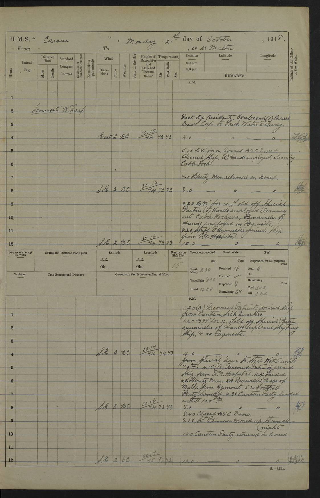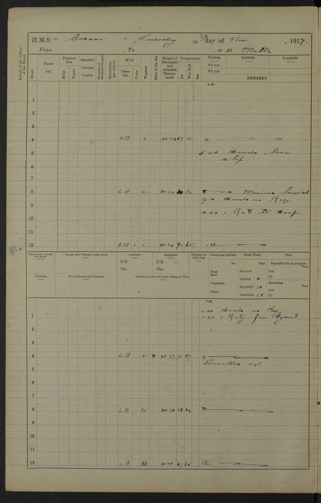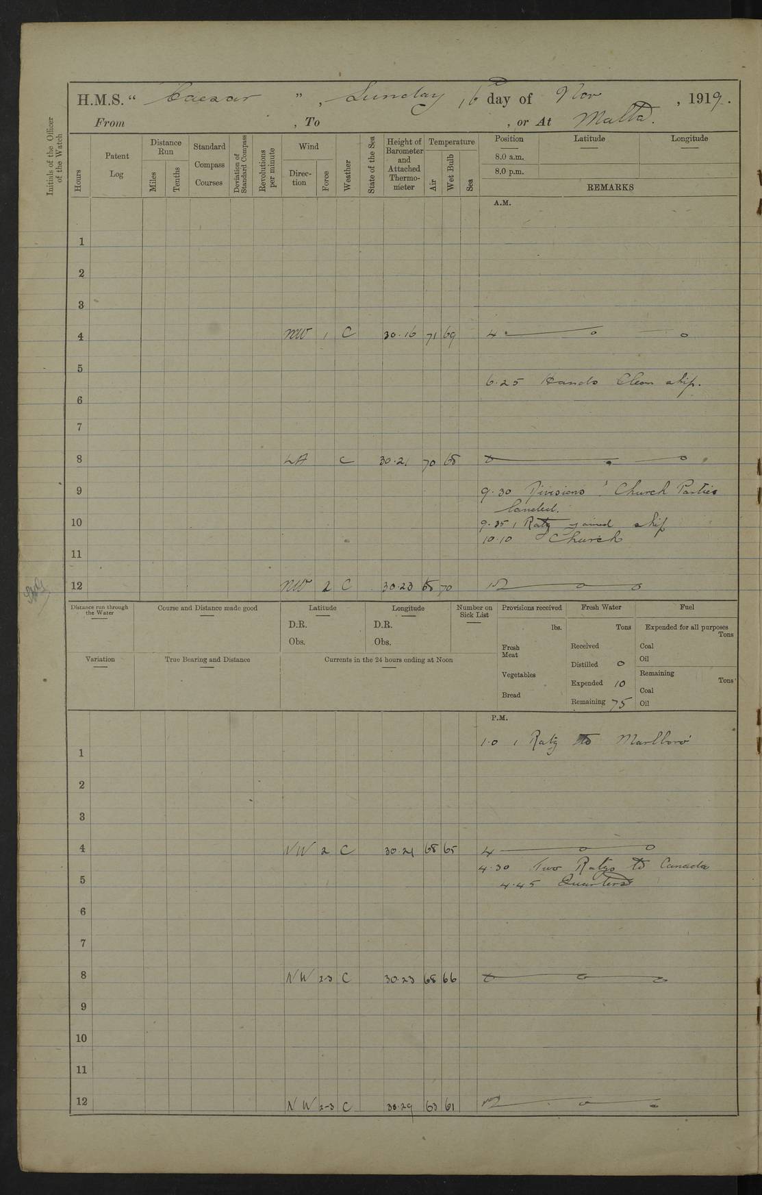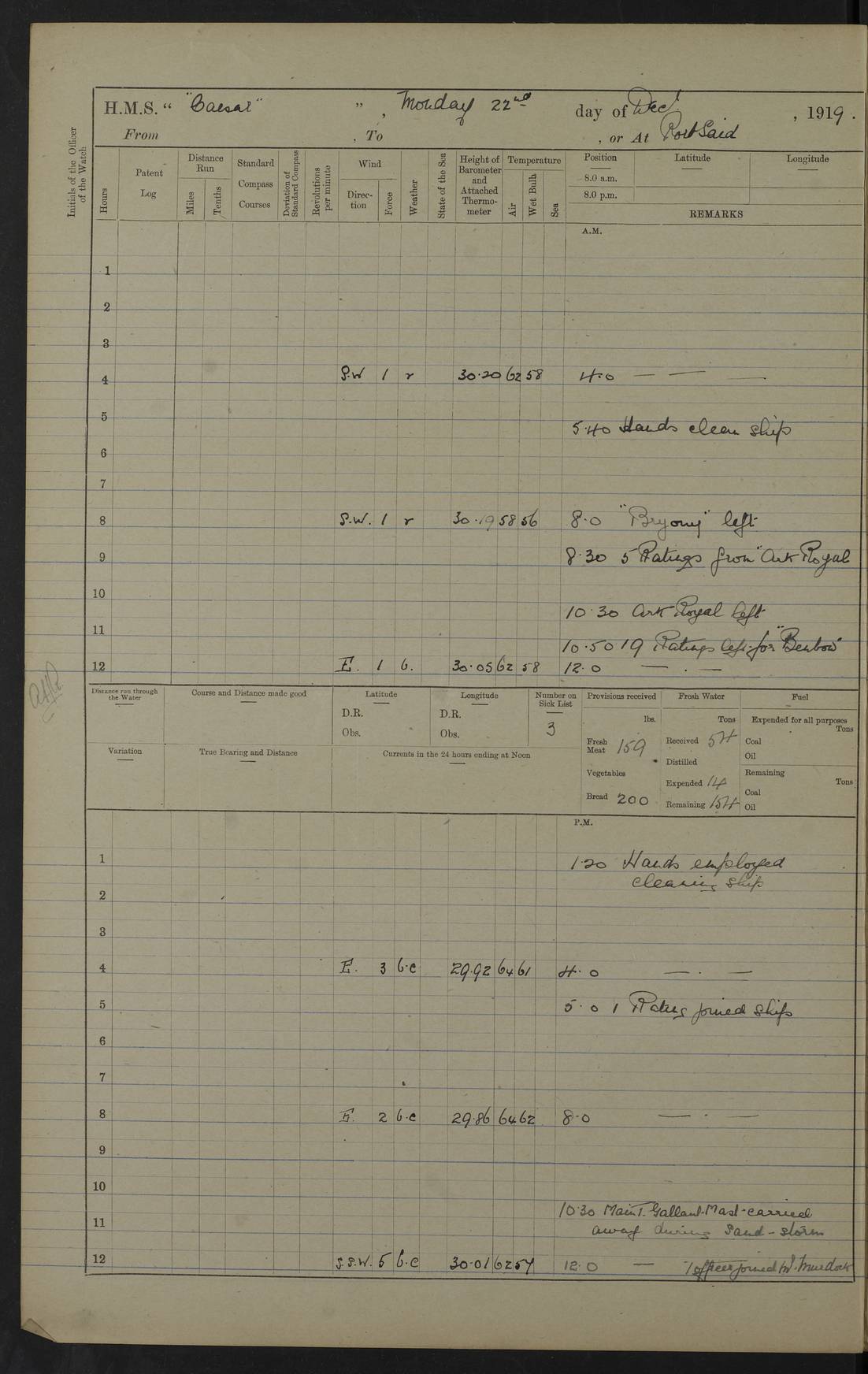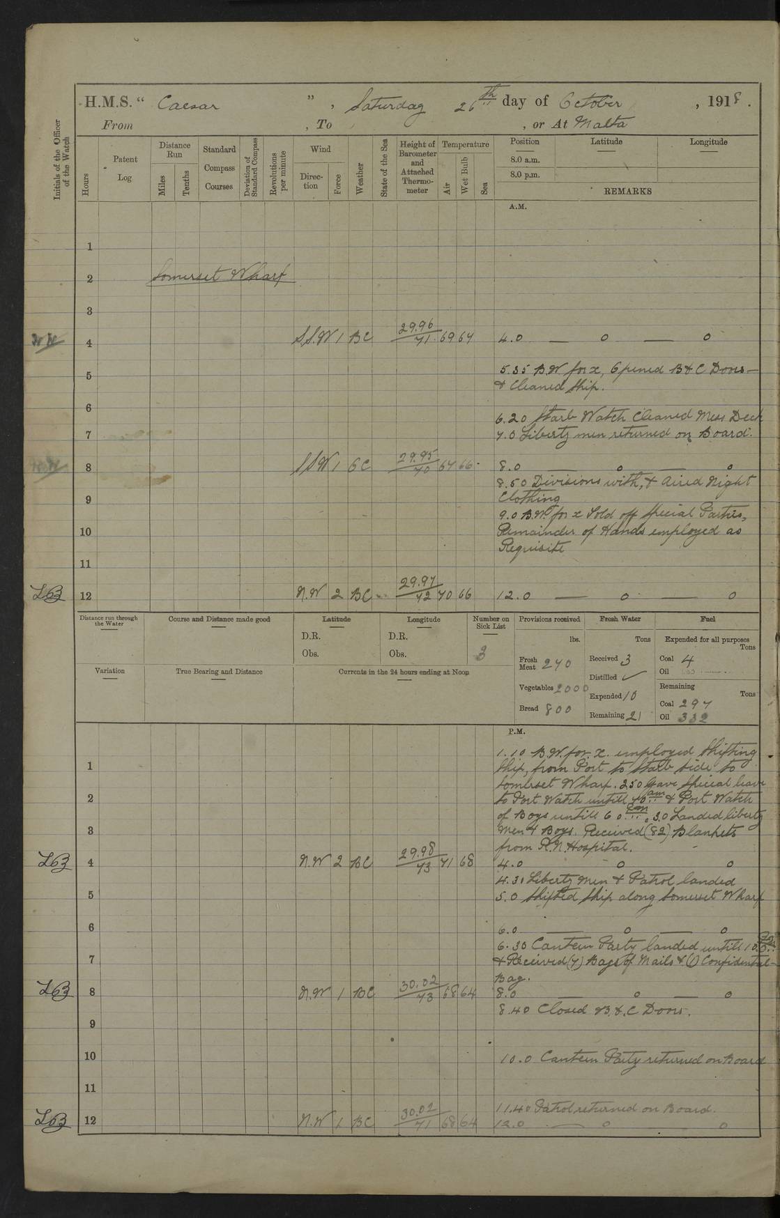 4edebb7b14d0450578000168: (https://s3.amazonaws.com:443/oldweather/ADM53-36589/0003_1.jpg) 1 November 1918 At Malta Lat 35.89, Long 14.52 [Somerset Wharf] 11.15am: Engineers Store Party returned on Board. 0.45pm: Paid Monthly Money. 1.0pm: Mr Goss, Gunner rejoined Ship from RN Hospital. 2.30pm: Gave Special leave to Port Watch untill 7.0am and Port Watch of Boys untill 6.0pm. Hands Made [sic] and Mend Clothes. 2.40pm: Landed liberty Men and Boys. 3.50pm: Provision Boat came alongside. 4.10pm: (4) Recovered Patients rejoined Ship from RN Hospital. 4.30pm: Landed liberty Men and Patrol. 6.0pm: Liberty Boys Returned on Board. 6.30pm: Canteen Party landed untill 10.0pm and Read Warrant No (24). 10.0pm: Canteen Party returned on Board. 11.50pm: Patrol returned on Board. [Provisions received: Fresh Meat 300 lbs, Vegetables 1000 lbs, Bread 450 lbs] 4edebb7c14d0450578000169: (https://s3.amazonaws.com:443/oldweather/ADM53-36589/0004_0.jpg) 2 November 1918 At Malta Lat 35.89, Long 14.52 [Hamilton Wharf] 7.15am: Shifted Berths from Somerset Wharf, to Hamilton Wharf. 8.0am: Tested life Buoys Correct. 8.45am: BW for x Told off Special Parties, Remainder of Hands employed as Requisite, and Landed Picket house Party. 9.10am: Held Court Martial on Board. 10.30am: Court Martial Finished. Noon: Picket House Party returned. 1.20pm: BW for x. Told off Special Parties. Remainder of Hands employed getting in Paymasters Stores and as Requisite. Lost overboard by accident Boat Hooks, Steel, Pattern (345), 2 in Number. 4.20pm: Hands to Fire Stations. 4.35pm: Read Warrant No 25 and gave Special leave to Starboard Watch untill 7.0am. 5.0pm: Landed liberty Men and Victualling Yard Lighter left Ship. 6.30pm: Canteen Party landed untill 10.0pm. [Provisions received: Fresh Meat 260 lbs, Bread 900 lbs] 4edebb7c14d045057800016a: (https://s3.amazonaws.com:443/oldweather/ADM53-36589/0004_1.jpg) 3 November 1918 At Malta Lat 35.89, Long 14.52 [Hamilton Wharf] 9.0am: Landed Church Parties, Wesleyans (14), Presbyterians (10). 9.30am: Divisions. 9.50am: Landed Roman Catholics (15). 10.10am: Discharged (5) Ratings to RN Hospital. 11.35am: All Church Parties returned on Board. 1.0pm: Gave Special leave to Port Watch untill 7.0am and Both Watches of Boys untill 5.30pm. 1.15pm: Landed liberty Men and Boys. 5.30pm: Liberty Boys returned on Board. 6.30pm: Canteen Party landed untill 10.0pm. 8.40pm: Closed B and C Doors. 10.0pm: Canteen Party returned on Board. [Number on sick list: 5] [Provisions received: Fresh Meat 280 lbs] 4edebb7c14d045057800016b: (https://s3.amazonaws.com:443/oldweather/ADM53-36589/0005_0.jpg) 4 November 1918 At Malta Lat 35.89, Long 14.52 [Hamilton Wharf] 6.50am: BW for x Told off Special Parties, remainder of Hands employed as Requisite. 7.0am: Liberty men returned on Board. 8.5am: Provision lighter came alongside. 8.10am: BW for x, Told off Special Parties, remainder of Hands employed Provisioning Ship and as requisite. 8.45am: Landed (1) Carpenter rating for Examination. 3.45pm: (2) Recovered Patients joined Ship from RN Hospital. 4.10pm: Received 8 Bags of Mails from Egmont, and Gave Special leave to Starboard Watch till 7.0am. 5.0pm: Landed Liberty Men and Patrol. 6.0pm: Hands employed getting in and stowing away Provisions. Midnight: Patrol returned on Board. [Weather fine, noon temperature 74F] 4edebb7c14d045057800016c: (https://s3.amazonaws.com:443/oldweather/ADM53-36589/0005_1.jpg) 5 November 1918 At Malta Lat 35.89, Long 14.52 [Hamilton Wharf] 6.45am: BW for x. Told off Special Parties. Remainder of Hands employed getting in and stowing away Provisions. 8.30am: Landed Hospital Party and Picket House Party. 11.0am: Landed (35) Rifles to Naval Ordinance for exchange. Noon: Picket House Party returned. 1.20pm: Landed (2) Ratings for Dental Treatment. 2.25pm: (35) Exchanged Rifles came on Board. 3.40pm: (2) Recovered Patients rejoined Ship from RN Hospital and disinfected Bedding. 4.0pm: Gave Special leave to Port Watch untill 7.0am. Starboard Watch employed stowing Provisions. 4.30pm: Landed Liberty men. Starboard Watch employed stowing away Provisions and Read Warrant No (26). [Provisions received: Fresh Meat 530 lbs, Bread 1000 lbs] 4edebb7c14d045057800016d: (https://s3.amazonaws.com:443/oldweather/ADM53-36589/0006_0.jpg) 6 November 1918 At Malta Lat 35.89, Long 14.52 [Hamilton Wharf] 6.50am: BW for x. Told off Special Parties, Remainder of Port Watch stowing Provisions, Starboard Watch drawing Quarter Deck Awning. 9.0am: Hands employed Provisioning Ship. 4.0pm: Gave Special leave to Starboard Watch untill 7.0am. 4.30pm: Landed liberty Men. Port Watch employed stowing away Provisions. 6.30pm: Canteen Party landed until 10.0pm. 10.0pm: Canteen Party returned on Board. [Number on sick list: 5] [Provisions received: Fresh Meat 250 lbs, Vegetables 1000 lbs, Bread 450 lbs] [Fuel Remaining: Coal 244 tons, Oil 332 tons] 4edebb7c14d045057800016e: (https://s3.amazonaws.com:443/oldweather/ADM53-36589/0006_1.jpg) 7 November 1918 At Malta Lat 35.89, Long 14.52 [No 4 Buoy] 6.30am: BW for x. Told off Special Parties. Remainder of Hands employed prepairing [preparing] Ship to Shift Berths, from Hamilton Wharf to No 4 Buoy. 7.0am: Liberty men returned on Board. 8.50am: Secured Ship to No 4 Buoy and Coal Lighters came alongside. 9.10am: Commenced Coaling Native labour. Hands employed Drawing Stores and as Requisite. 11.50am: Dockyard Parties returned. 1.40pm: BW for x Told off Special Parties, remainder of Hands employed as Requisite. 4.30pm: Gave Special leave to Port Watch untill 7.0am. 4.45pm: Landed liberty men and Patrol and Read Warrant No (27). 7.30pm: Completed Coaling (1481) Tons. 8.40pm: Watch employed sweeping down. 11.50pm: Patrol returned on Board. [Number on sick list: 6] [Provisions received: Fresh Meat 280 lbs, Bread 300 lbs] [Fuel Remaining: Coal 1716 tons, Oil 332 tons] 4edebb7c14d045057800016f: (https://s3.amazonaws.com:443/oldweather/ADM53-36589/0007_0.jpg) 8 November 1918 At Malta Lat 35.89, Long 