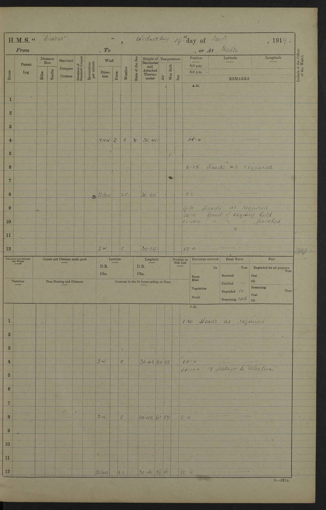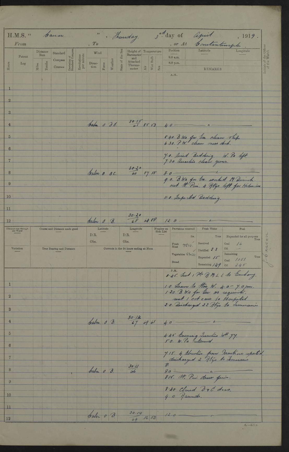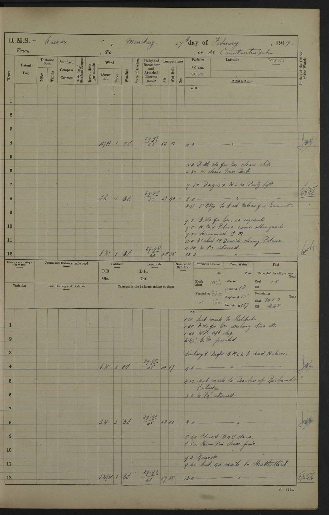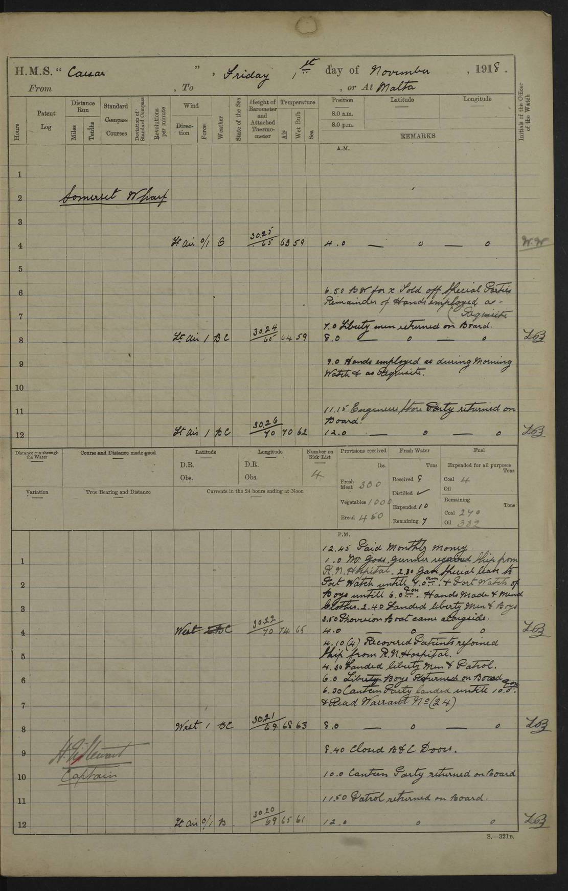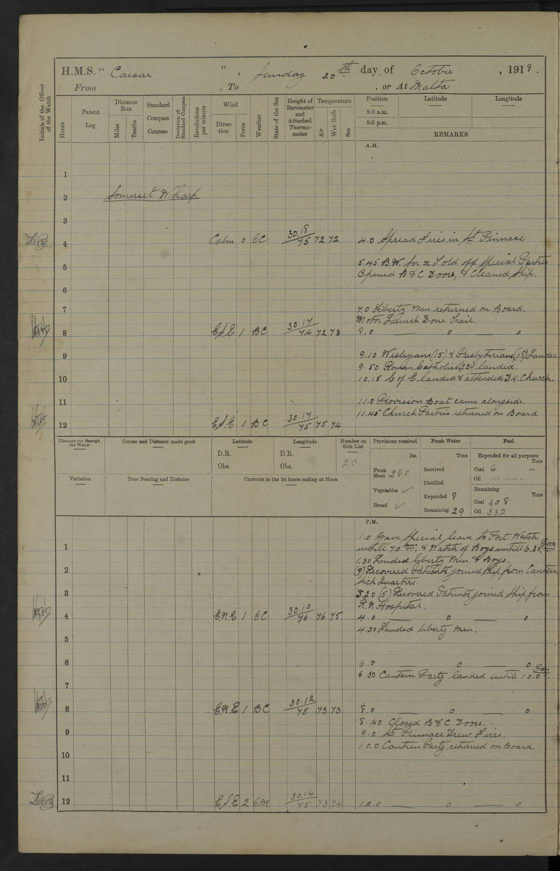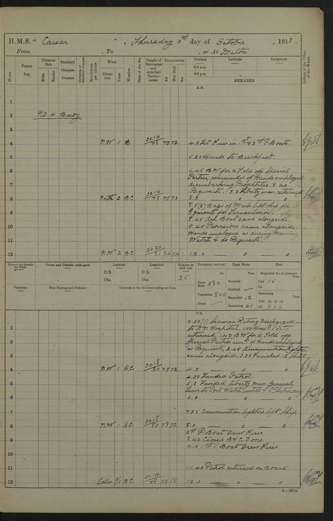4edebb7b14d0450578000168: (https://s3.amazonaws.com:443/oldweather/ADM53-36589/0003_1.jpg) 1 November 1918 At Malta Lat 35.89, Long 14.52 [Somerset Wharf] 11.15am: Engineers Store Party returned on Board. 0.45pm: Paid Monthly Money. 1.0pm: Mr Goss, Gunner rejoined Ship from RN Hospital. 2.30pm: Gave Special leave to Port Watch untill 7.0am and Port Watch of Boys untill 6.0pm. Hands Made [sic] and Mend Clothes. 2.40pm: Landed liberty Men and Boys. 3.50pm: Provision Boat came alongside. 4.10pm: (4) Recovered Patients rejoined Ship from RN Hospital. 4.30pm: Landed liberty Men and Patrol. 6.0pm: Liberty Boys Returned on Board. 6.30pm: Canteen Party landed untill 10.0pm and Read Warrant No (24). 10.0pm: Canteen Party returned on Board. 11.50pm: Patrol returned on Board. [Provisions received: Fresh Meat 300 lbs, Vegetables 1000 lbs, Bread 450 lbs] 4edebb7c14d0450578000169: (https://s3.amazonaws.com:443/oldweather/ADM53-36589/0004_0.jpg) 2 November 1918 At Malta Lat 35.89, Long 14.52 [Hamilton Wharf] 7.15am: Shifted Berths from Somerset Wharf, to Hamilton Wharf. 8.0am: Tested life Buoys Correct. 8.45am: BW for x Told off Special Parties, Remainder of Hands employed as Requisite, and Landed Picket house Party. 9.10am: Held Court Martial on Board. 10.30am: Court Martial Finished. Noon: Picket House Party returned. 1.20pm: BW for x. Told off Special Parties. Remainder of Hands employed getting in Paymasters Stores and as Requisite. Lost overboard by accident Boat Hooks, Steel, Pattern (345), 2 in Number. 4.20pm: Hands to Fire Stations. 4.35pm: Read Warrant No 25 and gave Special leave to Starboard Watch untill 7.0am. 5.0pm: Landed liberty Men and Victualling Yard Lighter left Ship. 6.30pm: Canteen Party landed untill 10.0pm. [Provisions received: Fresh Meat 260 lbs, Bread 900 lbs] 4edebb7c14d045057800016a: (https://s3.amazonaws.com:443/oldweather/ADM53-36589/0004_1.jpg) 3 November 1918 At Malta Lat 35.89, Long 14.52 [Hamilton Wharf] 9.0am: Landed Church Parties, Wesleyans (14), Presbyterians (10). 9.30am: Divisions. 9.50am: Landed Roman Catholics (15). 10.10am: Discharged (5) Ratings to RN Hospital. 11.35am: All Church Parties returned on Board. 1.0pm: Gave Special leave to Port Watch untill 7.0am and Both Watches of Boys untill 5.30pm. 1.15pm: Landed liberty Men and Boys. 5.30pm: Liberty Boys returned on Board. 6.30pm: Canteen Party landed untill 10.0pm. 8.40pm: Closed B and C Doors. 10.0pm: Canteen Party returned on Board. [Number on sick list: 5] [Provisions received: Fresh Meat 280 lbs] 4edebb7c14d045057800016b: (https://s3.amazonaws.com:443/oldweather/ADM53-36589/0005_0.jpg) 4 November 1918 At Malta Lat 35.89, Long 14.52 [Hamilton Wharf] 6.50am: BW for x Told off Special Parties, remainder of Hands employed as Requisite. 7.0am: Liberty men returned on Board. 8.5am: Provision lighter came alongside. 8.10am: BW for x, Told off Special Parties, remainder of Hands employed Provisioning Ship and as requisite. 8.45am: Landed (1) Carpenter rating for Examination. 3.45pm: (2) Recovered Patients joined Ship from RN Hospital. 4.10pm: Received 8 Bags of Mails from Egmont, and Gave Special leave to Starboard Watch till 7.0am. 5.0pm: Landed Liberty Men and Patrol. 6.0pm: Hands employed getting in and stowing away Provisions. Midnight: Patrol returned on Board. [Weather fine, noon temperature 74F] 4edebb7c14d045057800016c: (https://s3.amazonaws.com:443/oldweather/ADM53-36589/0005_1.jpg) 5 November 1918 At Malta Lat 35.89, Long 14.52 [Hamilton Wharf] 6.45am: BW for x. Told off Special Parties. Remainder of Hands employed getting in and stowing away Provisions. 8.30am: Landed Hospital Party and Picket House Party. 11.0am: Landed (35) Rifles to Naval Ordinance for exchange. Noon: Picket House Party returned. 1.20pm: Landed (2) Ratings for Dental Treatment. 2.25pm: (35) Exchanged Rifles came on Board. 3.40pm: (2) Recovered Patients rejoined Ship from RN Hospital and disinfected Bedding. 4.0pm: Gave Special leave to Port Watch untill 7.0am. Starboard Watch employed stowing Provisions. 4.30pm: Landed Liberty men. Starboard Watch employed stowing away Provisions and Read Warrant No (26). [Provisions received: Fresh Meat 530 lbs, Bread 1000 lbs] 4edebb7c14d045057800016d: (https://s3.amazonaws.com:443/oldweather/ADM53-36589/0006_0.jpg) 6 November 1918 At Malta Lat 35.89, Long 14.52 [Hamilton Wharf] 6.50am: BW for x. Told off Special Parties, Remainder of Port Watch stowing Provisions, Starboard Watch drawing Quarter Deck Awning. 9.0am: Hands employed Provisioning Ship. 4.0pm: Gave Special leave to Starboard Watch untill 7.0am. 4.30pm: Landed liberty Men. Port Watch employed stowing away Provisions. 6.30pm: Canteen Party landed until 10.0pm. 10.0pm: Canteen Party returned on Board. [Number on sick list: 5] [Provisions received: Fresh Meat 250 lbs, Vegetables 1000 lbs, Bread 450 lbs] [Fuel Remaining: Coal 244 tons, Oil 332 tons] 4edebb7c14d045057800016e: (https://s3.amazonaws.com:443/oldweather/ADM53-36589/0006_1.jpg) 7 November 1918 At Malta Lat 35.89, Long 14.52 [No 4 Buoy] 6.30am: BW for x. Told off Special Parties. Remainder of Hands employed prepairing [preparing] Ship to Shift Berths, from Hamilton Wharf to No 4 Buoy. 7.0am: Liberty men returned on Board. 8.50am: Secured Ship to No 4 Buoy and Coal Lighters came alongside. 9.10am: Commenced Coaling Native labour. Hands employed Drawing Stores and as Requisite. 11.50am: Dockyard Parties returned. 1.40pm: BW for x Told off Special Parties, remainder of Hands employed as Requisite. 4.30pm: Gave Special leave to Port Watch untill 7.0am. 4.45pm: Landed liberty men and Patrol and Read Warrant No (27). 7.30pm: Completed Coaling (1481) Tons. 8.40pm: Watch employed sweeping down. 11.50pm: Patrol returned on Board. [Number on sick list: 6] [Provisions received: Fresh Meat 280 lbs, Bread 300 lbs] [Fuel Remaining: Coal 1716 tons, Oil 332 tons] 4edebb7c14d045057800016f: (https://s3.amazonaws.com:443/oldweather/ADM53-36589/0007_0.jpg) 8 November 1918 At Malta Lat 35.89, Long 