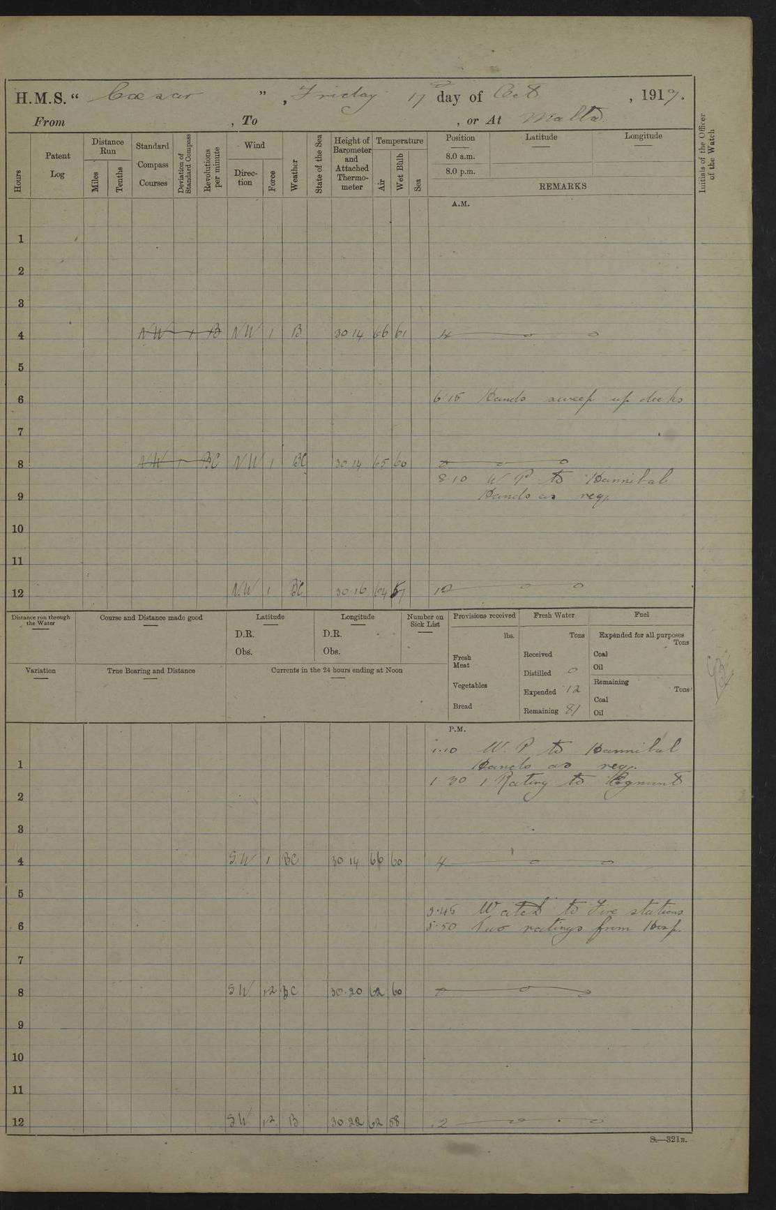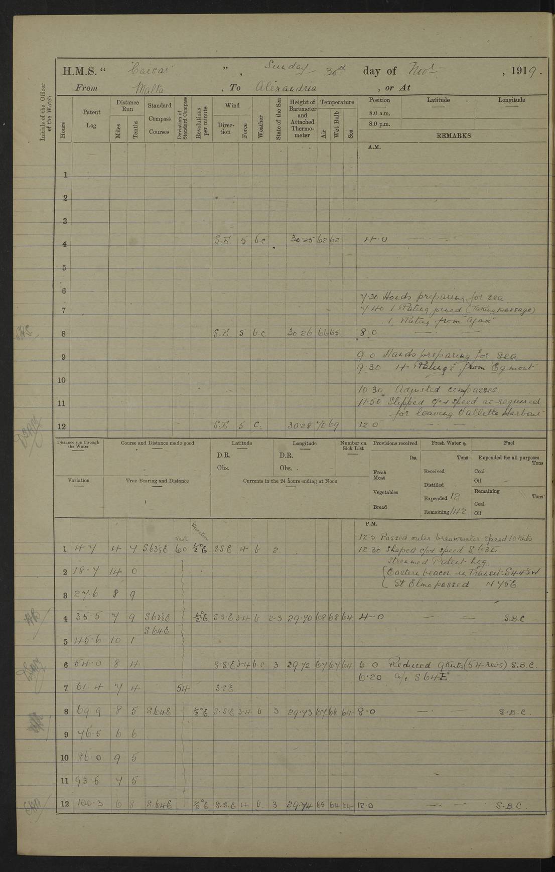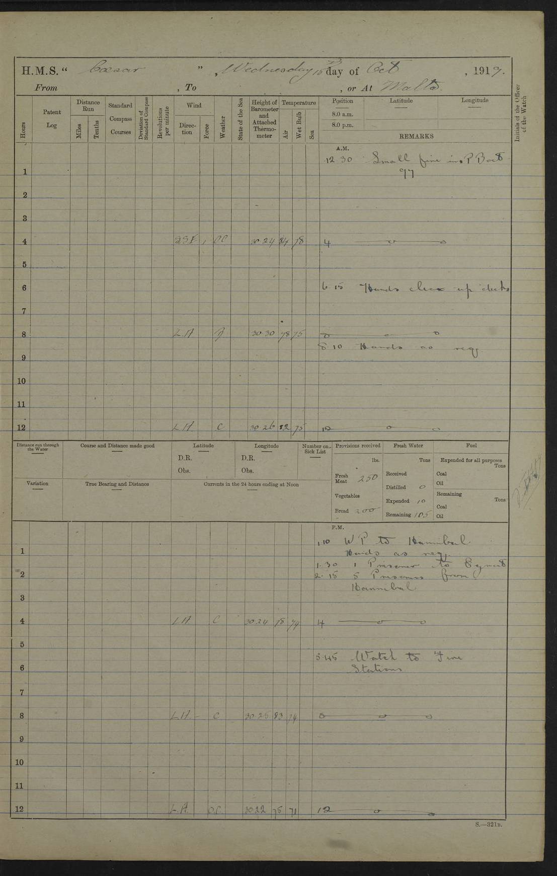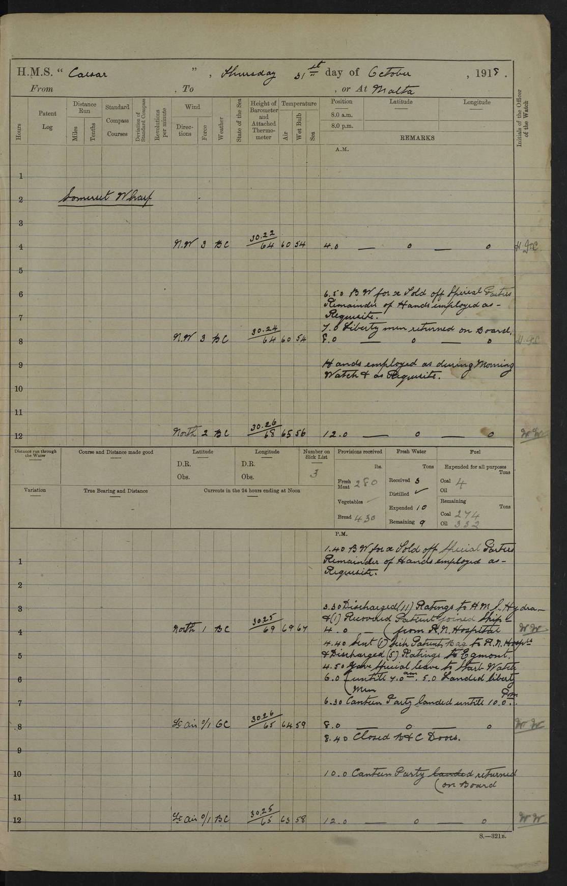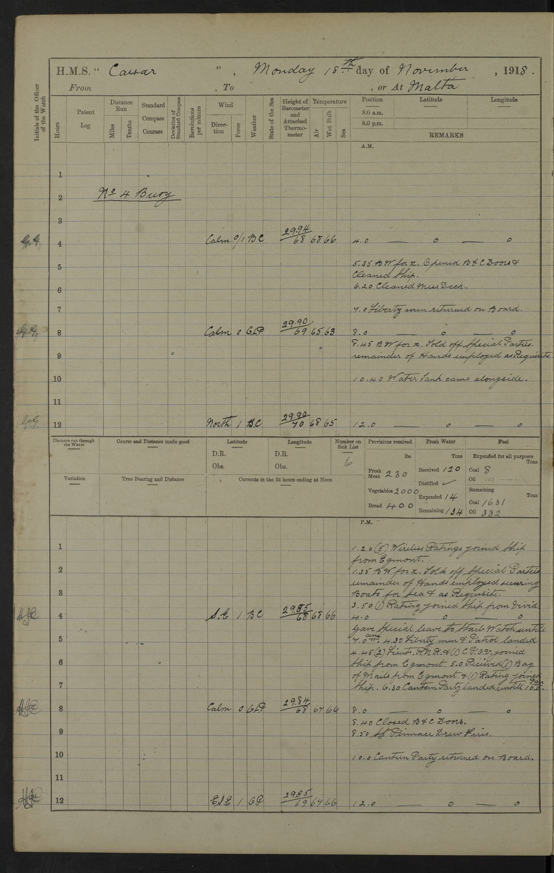 4edebb7b14d0450578000168: (https://s3.amazonaws.com:443/oldweather/ADM53-36589/0003_1.jpg) 1 November 1918 At Malta Lat 35.89, Long 14.52 [Somerset Wharf] 11.15am: Engineers Store Party returned on Board. 0.45pm: Paid Monthly Money. 1.0pm: Mr Goss, Gunner rejoined Ship from RN Hospital. 2.30pm: Gave Special leave to Port Watch untill 7.0am and Port Watch of Boys untill 6.0pm. Hands Made [sic] and Mend Clothes. 2.40pm: Landed liberty Men and Boys. 3.50pm: Provision Boat came alongside. 4.10pm: (4) Recovered Patients rejoined Ship from RN Hospital. 4.30pm: Landed liberty Men and Patrol. 6.0pm: Liberty Boys Returned on Board. 6.30pm: Canteen Party landed untill 10.0pm and Read Warrant No (24). 10.0pm: Canteen Party returned on Board. 11.50pm: Patrol returned on Board. [Provisions received: Fresh Meat 300 lbs, Vegetables 1000 lbs, Bread 450 lbs] 4edebb7c14d0450578000169: (https://s3.amazonaws.com:443/oldweather/ADM53-36589/0004_0.jpg) 2 November 1918 At Malta Lat 35.89, Long 14.52 [Hamilton Wharf] 7.15am: Shifted Berths from Somerset Wharf, to Hamilton Wharf. 8.0am: Tested life Buoys Correct. 8.45am: BW for x Told off Special Parties, Remainder of Hands employed as Requisite, and Landed Picket house Party. 9.10am: Held Court Martial on Board. 10.30am: Court Martial Finished. Noon: Picket House Party returned. 1.20pm: BW for x. Told off Special Parties. Remainder of Hands employed getting in Paymasters Stores and as Requisite. Lost overboard by accident Boat Hooks, Steel, Pattern (345), 2 in Number. 4.20pm: Hands to Fire Stations. 4.35pm: Read Warrant No 25 and gave Special leave to Starboard Watch untill 7.0am. 5.0pm: Landed liberty Men and Victualling Yard Lighter left Ship. 6.30pm: Canteen Party landed untill 10.0pm. [Provisions received: Fresh Meat 260 lbs, Bread 900 lbs] 4edebb7c14d045057800016a: (https://s3.amazonaws.com:443/oldweather/ADM53-36589/0004_1.jpg) 3 November 1918 At Malta Lat 35.89, Long 14.52 [Hamilton Wharf] 9.0am: Landed Church Parties, Wesleyans (14), Presbyterians (10). 9.30am: Divisions. 9.50am: Landed Roman Catholics (15). 10.10am: Discharged (5) Ratings to RN Hospital. 11.35am: All Church Parties returned on Board. 1.0pm: Gave Special leave to Port Watch untill 7.0am and Both Watches of Boys untill 5.30pm. 1.15pm: Landed liberty Men and Boys. 5.30pm: Liberty Boys returned on Board. 6.30pm: Canteen Party landed untill 10.0pm. 8.40pm: Closed B and C Doors. 10.0pm: Canteen Party returned on Board. [Number on sick list: 5] [Provisions received: Fresh Meat 280 lbs] 4edebb7c14d045057800016b: (https://s3.amazonaws.com:443/oldweather/ADM53-36589/0005_0.jpg) 4 November 1918 At Malta Lat 35.89, Long 14.52 [Hamilton Wharf] 6.50am: BW for x Told off Special Parties, remainder of Hands employed as Requisite. 7.0am: Liberty men returned on Board. 8.5am: Provision lighter came alongside. 8.10am: BW for x, Told off Special Parties, remainder of Hands employed Provisioning Ship and as requisite. 8.45am: Landed (1) Carpenter rating for Examination. 3.45pm: (2) Recovered Patients joined Ship from RN Hospital. 4.10pm: Received 8 Bags of Mails from Egmont, and Gave Special leave to Starboard Watch till 7.0am. 5.0pm: Landed Liberty Men and Patrol. 6.0pm: Hands employed getting in and stowing away Provisions. Midnight: Patrol returned on Board. [Weather fine, noon temperature 74F] 4edebb7c14d045057800016c: (https://s3.amazonaws.com:443/oldweather/ADM53-36589/0005_1.jpg) 5 November 1918 At Malta Lat 35.89, Long 14.52 [Hamilton Wharf] 6.45am: BW for x. Told off Special Parties. Remainder of Hands employed getting in and stowing away Provisions. 8.30am: Landed Hospital Party and Picket House Party. 11.0am: Landed (35) Rifles to Naval Ordinance for exchange. Noon: Picket House Party returned. 1.20pm: Landed (2) Ratings for Dental Treatment. 2.25pm: (35) Exchanged Rifles came on Board. 3.40pm: (2) Recovered Patients rejoined Ship from RN Hospital and disinfected Bedding. 4.0pm: Gave Special leave to Port Watch untill 7.0am. Starboard Watch employed stowing Provisions. 4.30pm: Landed Liberty men. Starboard Watch employed stowing away Provisions and Read Warrant No (26). [Provisions received: Fresh Meat 530 lbs, Bread 1000 lbs] 4edebb7c14d045057800016d: (https://s3.amazonaws.com:443/oldweather/ADM53-36589/0006_0.jpg) 6 November 1918 At Malta Lat 35.89, Long 14.52 [Hamilton Wharf] 6.50am: BW for x. Told off Special Parties, Remainder of Port Watch stowing Provisions, Starboard Watch drawing Quarter Deck Awning. 9.0am: Hands employed Provisioning Ship. 4.0pm: Gave Special leave to Starboard Watch untill 7.0am. 4.30pm: Landed liberty Men. Port Watch employed stowing away Provisions. 6.30pm: Canteen Party landed until 10.0pm. 10.0pm: Canteen Party returned on Board. [Number on sick list: 5] [Provisions received: Fresh Meat 250 lbs, Vegetables 1000 lbs, Bread 450 lbs] [Fuel Remaining: Coal 244 tons, Oil 332 tons] 4edebb7c14d045057800016e: (https://s3.amazonaws.com:443/oldweather/ADM53-36589/0006_1.jpg) 7 November 1918 At Malta Lat 35.89, Long 14.52 [No 4 Buoy] 6.30am: BW for x. Told off Special Parties. Remainder of Hands employed prepairing [preparing] Ship to Shift Berths, from Hamilton Wharf to No 4 Buoy. 7.0am: Liberty men returned on Board. 8.50am: Secured Ship to No 4 Buoy and Coal Lighters came alongside. 9.10am: Commenced Coaling Native labour. Hands employed Drawing Stores and as Requisite. 11.50am: Dockyard Parties returned. 1.40pm: BW for x Told off Special Parties, remainder of Hands employed as Requisite. 4.30pm: Gave Special leave to Port Watch untill 7.0am. 4.45pm: Landed liberty men and Patrol and Read Warrant No (27). 7.30pm: Completed Coaling (1481) Tons. 8.40pm: Watch employed sweeping down. 11.50pm: Patrol returned on Board. [Number on sick list: 6] [Provisions received: Fresh Meat 280 lbs, Bread 300 lbs] [Fuel Remaining: Coal 1716 tons, Oil 332 tons] 4edebb7c14d045057800016f: (https://s3.amazonaws.com:443/oldweather/ADM53-36589/0007_0.jpg) 8 November 1918 At Malta Lat 35.89, Long 
