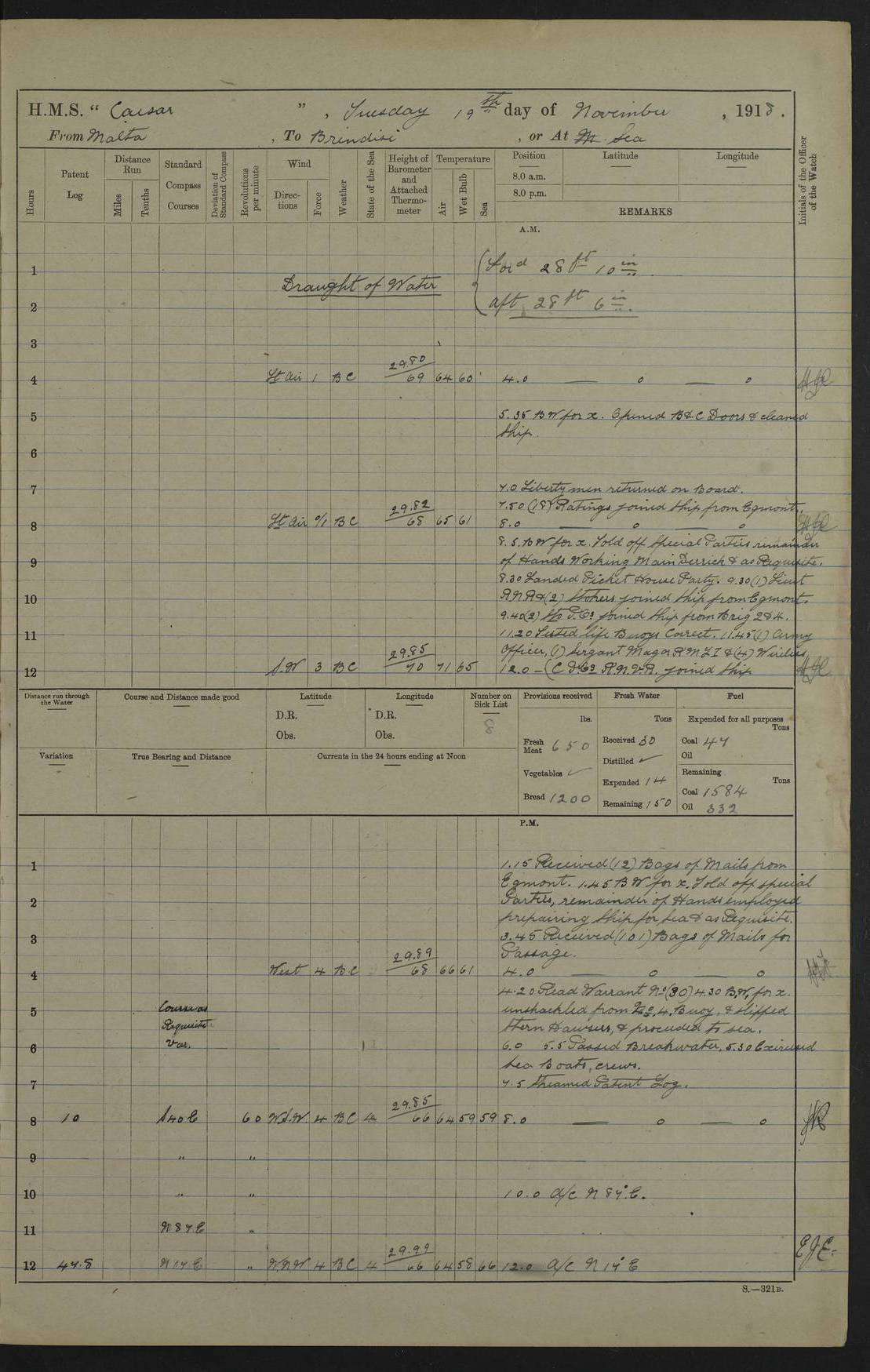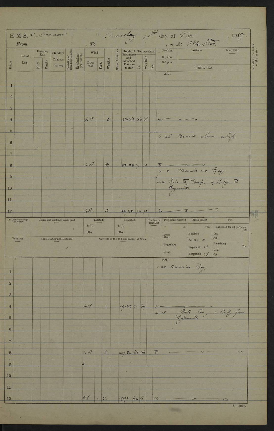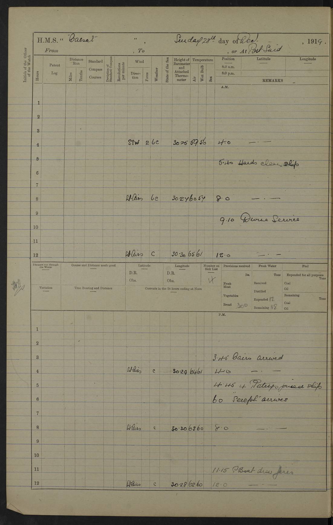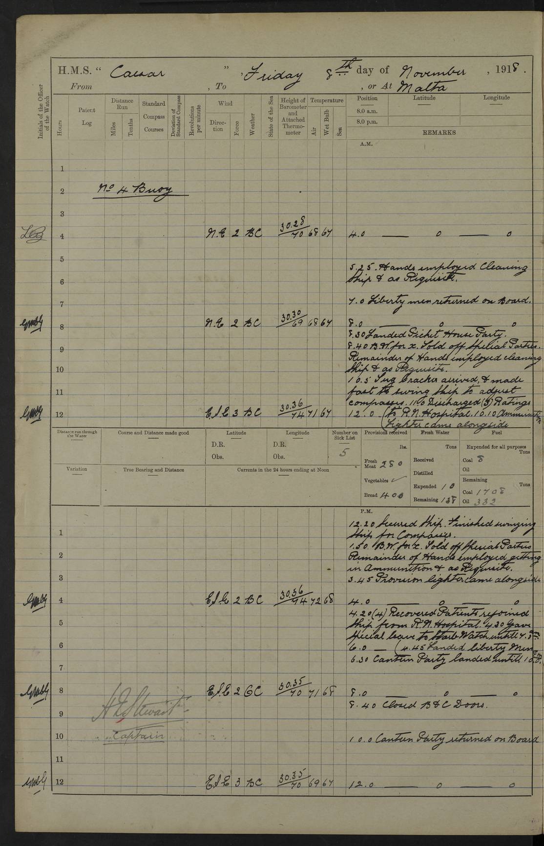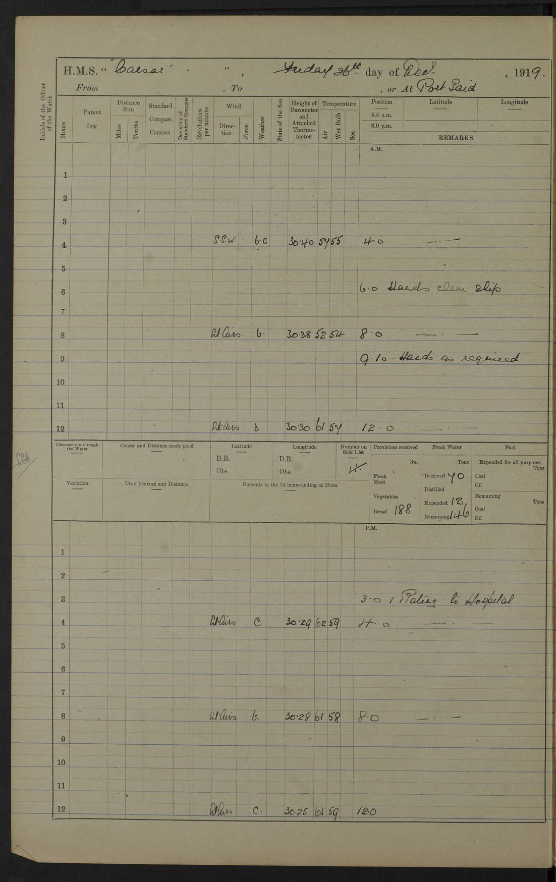 4edebb7b14d0450578000168: (https://s3.amazonaws.com:443/oldweather/ADM53-36589/0003_1.jpg) 1 November 1918 At Malta Lat 35.89, Long 14.52 [Somerset Wharf] 11.15am: Engineers Store Party returned on Board. 0.45pm: Paid Monthly Money. 1.0pm: Mr Goss, Gunner rejoined Ship from RN Hospital. 2.30pm: Gave Special leave to Port Watch untill 7.0am and Port Watch of Boys untill 6.0pm. Hands Made [sic] and Mend Clothes. 2.40pm: Landed liberty Men and Boys. 3.50pm: Provision Boat came alongside. 4.10pm: (4) Recovered Patients rejoined Ship from RN Hospital. 4.30pm: Landed liberty Men and Patrol. 6.0pm: Liberty Boys Returned on Board. 6.30pm: Canteen Party landed untill 10.0pm and Read Warrant No (24). 10.0pm: Canteen Party returned on Board. 11.50pm: Patrol returned on Board. [Provisions received: Fresh Meat 300 lbs, Vegetables 1000 lbs, Bread 450 lbs] 4edebb7c14d0450578000169: (https://s3.amazonaws.com:443/oldweather/ADM53-36589/0004_0.jpg) 2 November 1918 At Malta Lat 35.89, Long 14.52 [Hamilton Wharf] 7.15am: Shifted Berths from Somerset Wharf, to Hamilton Wharf. 8.0am: Tested life Buoys Correct. 8.45am: BW for x Told off Special Parties, Remainder of Hands employed as Requisite, and Landed Picket house Party. 9.10am: Held Court Martial on Board. 10.30am: Court Martial Finished. Noon: Picket House Party returned. 1.20pm: BW for x. Told off Special Parties. Remainder of Hands employed getting in Paymasters Stores and as Requisite. Lost overboard by accident Boat Hooks, Steel, Pattern (345), 2 in Number. 4.20pm: Hands to Fire Stations. 4.35pm: Read Warrant No 25 and gave Special leave to Starboard Watch untill 7.0am. 5.0pm: Landed liberty Men and Victualling Yard Lighter left Ship. 6.30pm: Canteen Party landed untill 10.0pm. [Provisions received: Fresh Meat 260 lbs, Bread 900 lbs] 4edebb7c14d045057800016a: (https://s3.amazonaws.com:443/oldweather/ADM53-36589/0004_1.jpg) 3 November 1918 At Malta Lat 35.89, Long 14.52 [Hamilton Wharf] 9.0am: Landed Church Parties, Wesleyans (14), Presbyterians (10). 9.30am: Divisions. 9.50am: Landed Roman Catholics (15). 10.10am: Discharged (5) Ratings to RN Hospital. 11.35am: All Church Parties returned on Board. 1.0pm: Gave Special leave to Port Watch untill 7.0am and Both Watches of Boys untill 5.30pm. 1.15pm: Landed liberty Men and Boys. 5.30pm: Liberty Boys returned on Board. 6.30pm: Canteen Party landed untill 10.0pm. 8.40pm: Closed B and C Doors. 10.0pm: Canteen Party returned on Board. [Number on sick list: 5] [Provisions received: Fresh Meat 280 lbs] 4edebb7c14d045057800016b: (https://s3.amazonaws.com:443/oldweather/ADM53-36589/0005_0.jpg) 4 November 1918 At Malta Lat 35.89, Long 14.52 [Hamilton Wharf] 6.50am: BW for x Told off Special Parties, remainder of Hands employed as Requisite. 7.0am: Liberty men returned on Board. 8.5am: Provision lighter came alongside. 8.10am: BW for x, Told off Special Parties, remainder of Hands employed Provisioning Ship and as requisite. 8.45am: Landed (1) Carpenter rating for Examination. 3.45pm: (2) Recovered Patients joined Ship from RN Hospital. 4.10pm: Received 8 Bags of Mails from Egmont, and Gave Special leave to Starboard Watch till 7.0am. 5.0pm: Landed Liberty Men and Patrol. 6.0pm: Hands employed getting in and stowing away Provisions. Midnight: Patrol returned on Board. [Weather fine, noon temperature 74F] 4edebb7c14d045057800016c: (https://s3.amazonaws.com:443/oldweather/ADM53-36589/0005_1.jpg) 5 November 1918 At Malta Lat 35.89, Long 14.52 [Hamilton Wharf] 6.45am: BW for x. Told off Special Parties. Remainder of Hands employed getting in and stowing away Provisions. 8.30am: Landed Hospital Party and Picket House Party. 11.0am: Landed (35) Rifles to Naval Ordinance for exchange. Noon: Picket House Party returned. 1.20pm: Landed (2) Ratings for Dental Treatment. 2.25pm: (35) Exchanged Rifles came on Board. 3.40pm: (2) Recovered Patients rejoined Ship from RN Hospital and disinfected Bedding. 4.0pm: Gave Special leave to Port Watch untill 7.0am. Starboard Watch employed stowing Provisions. 4.30pm: Landed Liberty men. Starboard Watch employed stowing away Provisions and Read Warrant No (26). [Provisions received: Fresh Meat 530 lbs, Bread 1000 lbs] 4edebb7c14d045057800016d: (https://s3.amazonaws.com:443/oldweather/ADM53-36589/0006_0.jpg) 6 November 1918 At Malta Lat 35.89, Long 14.52 [Hamilton Wharf] 6.50am: BW for x. Told off Special Parties, Remainder of Port Watch stowing Provisions, Starboard Watch drawing Quarter Deck Awning. 9.0am: Hands employed Provisioning Ship. 4.0pm: Gave Special leave to Starboard Watch untill 7.0am. 4.30pm: Landed liberty Men. Port Watch employed stowing away Provisions. 6.30pm: Canteen Party landed until 10.0pm. 10.0pm: Canteen Party returned on Board. [Number on sick list: 5] [Provisions received: Fresh Meat 250 lbs, Vegetables 1000 lbs, Bread 450 lbs] [Fuel Remaining: Coal 244 tons, Oil 332 tons] 4edebb7c14d045057800016e: (https://s3.amazonaws.com:443/oldweather/ADM53-36589/0006_1.jpg) 7 November 1918 At Malta Lat 35.89, Long 14.52 [No 4 Buoy] 6.30am: BW for x. Told off Special Parties. Remainder of Hands employed prepairing [preparing] Ship to Shift Berths, from Hamilton Wharf to No 4 Buoy. 7.0am: Liberty men returned on Board. 8.50am: Secured Ship to No 4 Buoy and Coal Lighters came alongside. 9.10am: Commenced Coaling Native labour. Hands employed Drawing Stores and as Requisite. 11.50am: Dockyard Parties returned. 1.40pm: BW for x Told off Special Parties, remainder of Hands employed as Requisite. 4.30pm: Gave Special leave to Port Watch untill 7.0am. 4.45pm: Landed liberty men and Patrol and Read Warrant No (27). 7.30pm: Completed Coaling (1481) Tons. 8.40pm: Watch employed sweeping down. 11.50pm: Patrol returned on Board. [Number on sick list: 6] [Provisions received: Fresh Meat 280 lbs, Bread 300 lbs] [Fuel Remaining: Coal 1716 tons, Oil 332 tons] 4edebb7c14d045057800016f: (https://s3.amazonaws.com:443/oldweather/ADM53-36589/0007_0.jpg) 8 November 1918 At Malta Lat 35.89, Long 
