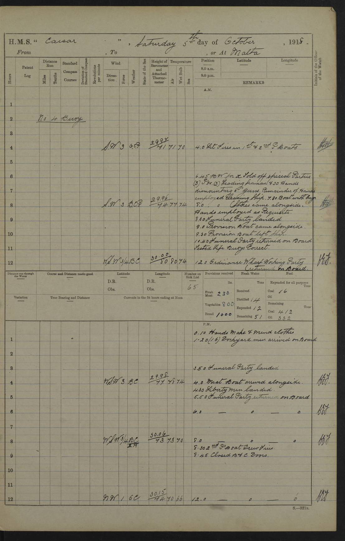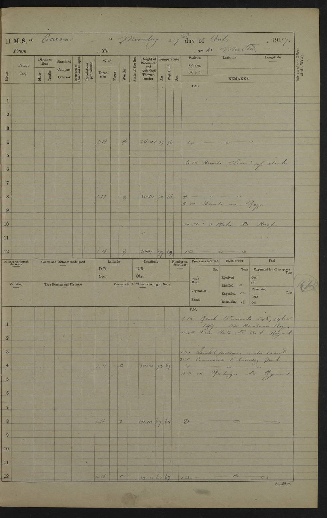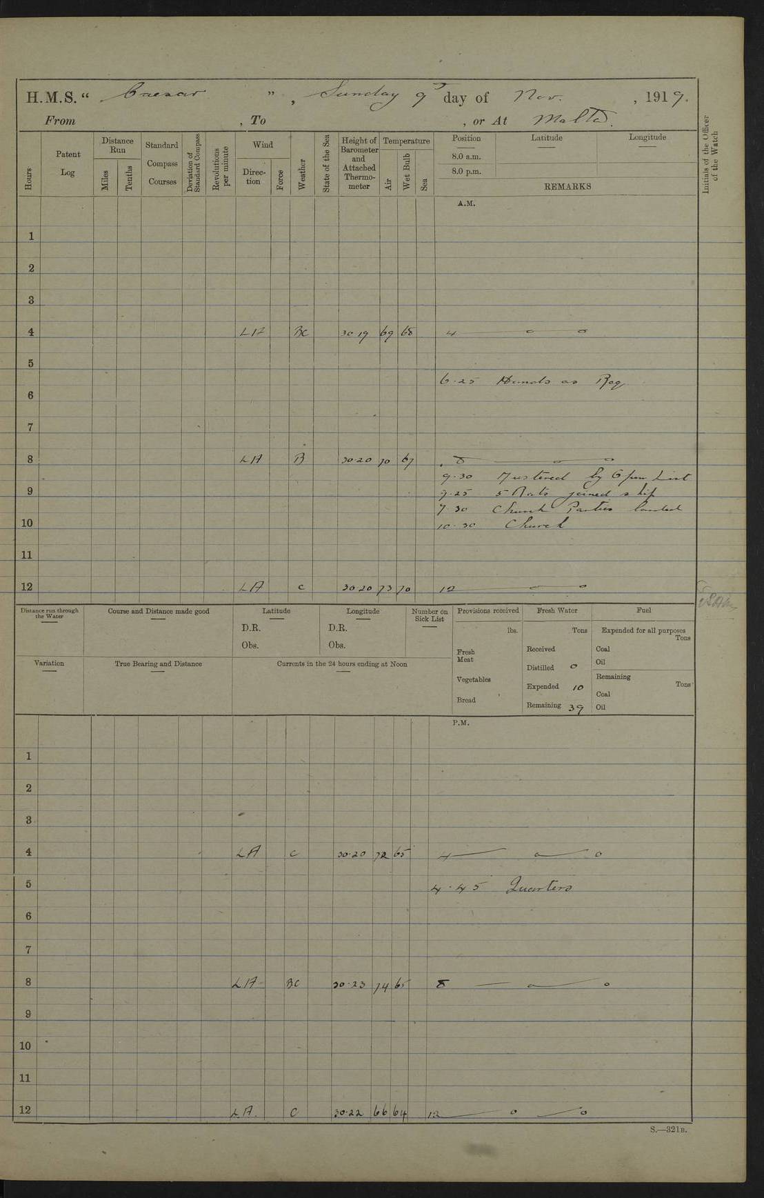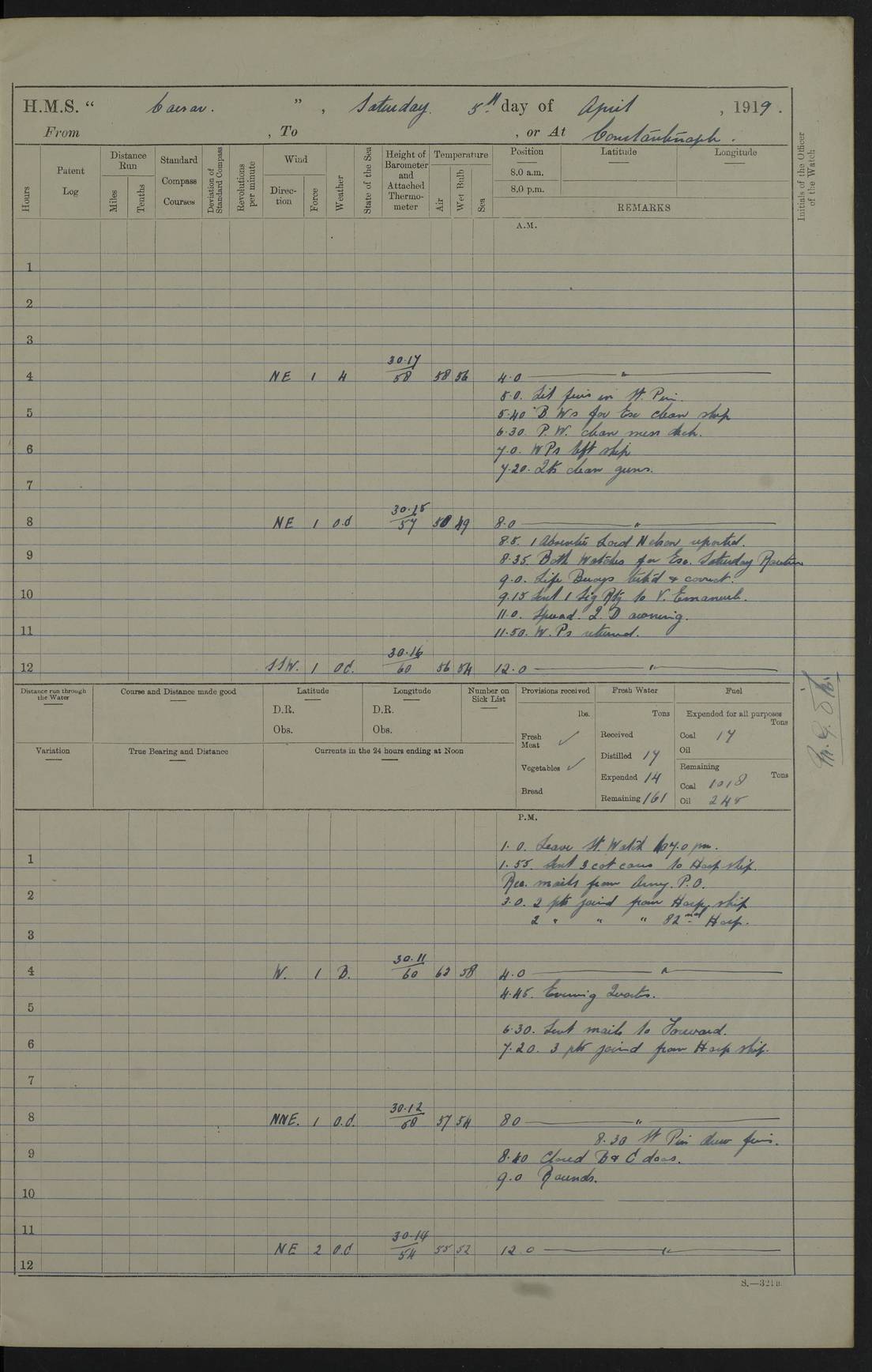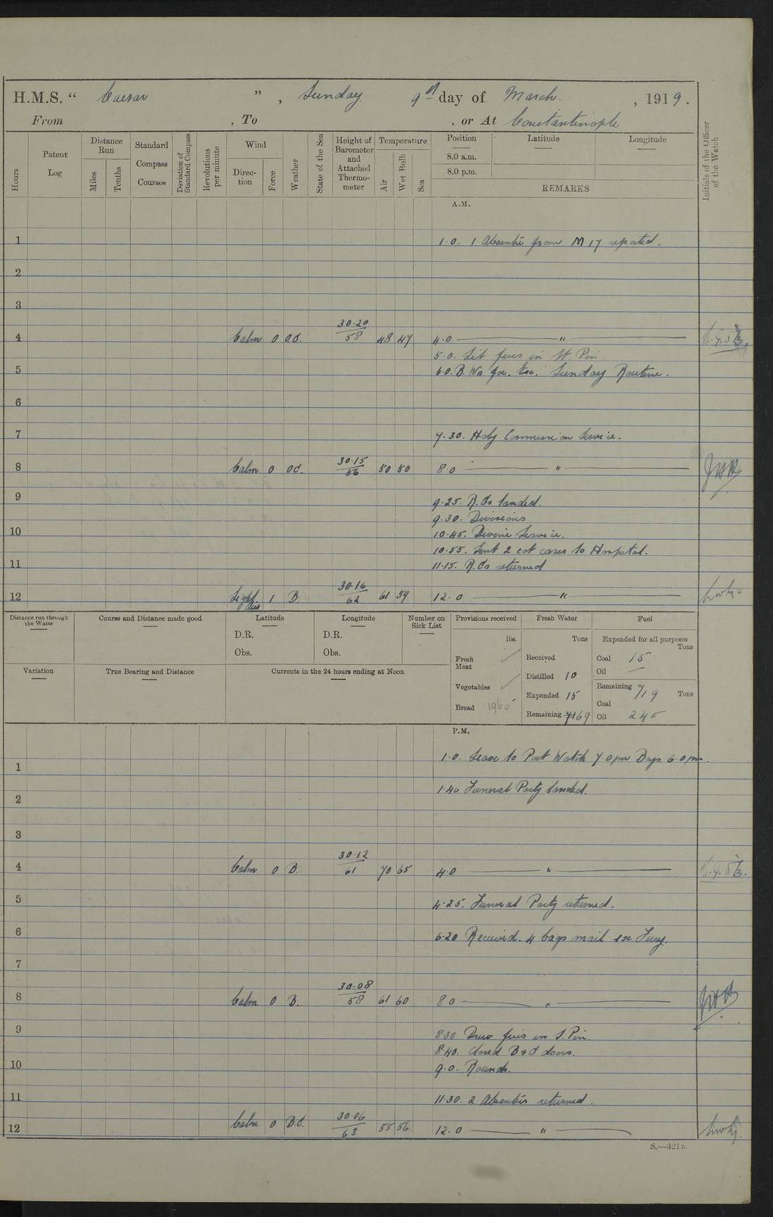 4edebb7b14d0450578000168: (https://s3.amazonaws.com:443/oldweather/ADM53-36589/0003_1.jpg) 1 November 1918 At Malta Lat 35.89, Long 14.52 [Somerset Wharf] 11.15am: Engineers Store Party returned on Board. 0.45pm: Paid Monthly Money. 1.0pm: Mr Goss, Gunner rejoined Ship from RN Hospital. 2.30pm: Gave Special leave to Port Watch untill 7.0am and Port Watch of Boys untill 6.0pm. Hands Made [sic] and Mend Clothes. 2.40pm: Landed liberty Men and Boys. 3.50pm: Provision Boat came alongside. 4.10pm: (4) Recovered Patients rejoined Ship from RN Hospital. 4.30pm: Landed liberty Men and Patrol. 6.0pm: Liberty Boys Returned on Board. 6.30pm: Canteen Party landed untill 10.0pm and Read Warrant No (24). 10.0pm: Canteen Party returned on Board. 11.50pm: Patrol returned on Board. [Provisions received: Fresh Meat 300 lbs, Vegetables 1000 lbs, Bread 450 lbs] 4edebb7c14d0450578000169: (https://s3.amazonaws.com:443/oldweather/ADM53-36589/0004_0.jpg) 2 November 1918 At Malta Lat 35.89, Long 14.52 [Hamilton Wharf] 7.15am: Shifted Berths from Somerset Wharf, to Hamilton Wharf. 8.0am: Tested life Buoys Correct. 8.45am: BW for x Told off Special Parties, Remainder of Hands employed as Requisite, and Landed Picket house Party. 9.10am: Held Court Martial on Board. 10.30am: Court Martial Finished. Noon: Picket House Party returned. 1.20pm: BW for x. Told off Special Parties. Remainder of Hands employed getting in Paymasters Stores and as Requisite. Lost overboard by accident Boat Hooks, Steel, Pattern (345), 2 in Number. 4.20pm: Hands to Fire Stations. 4.35pm: Read Warrant No 25 and gave Special leave to Starboard Watch untill 7.0am. 5.0pm: Landed liberty Men and Victualling Yard Lighter left Ship. 6.30pm: Canteen Party landed untill 10.0pm. [Provisions received: Fresh Meat 260 lbs, Bread 900 lbs] 4edebb7c14d045057800016a: (https://s3.amazonaws.com:443/oldweather/ADM53-36589/0004_1.jpg) 3 November 1918 At Malta Lat 35.89, Long 14.52 [Hamilton Wharf] 9.0am: Landed Church Parties, Wesleyans (14), Presbyterians (10). 9.30am: Divisions. 9.50am: Landed Roman Catholics (15). 10.10am: Discharged (5) Ratings to RN Hospital. 11.35am: All Church Parties returned on Board. 1.0pm: Gave Special leave to Port Watch untill 7.0am and Both Watches of Boys untill 5.30pm. 1.15pm: Landed liberty Men and Boys. 5.30pm: Liberty Boys returned on Board. 6.30pm: Canteen Party landed untill 10.0pm. 8.40pm: Closed B and C Doors. 10.0pm: Canteen Party returned on Board. [Number on sick list: 5] [Provisions received: Fresh Meat 280 lbs] 4edebb7c14d045057800016b: (https://s3.amazonaws.com:443/oldweather/ADM53-36589/0005_0.jpg) 4 November 1918 At Malta Lat 35.89, Long 14.52 [Hamilton Wharf] 6.50am: BW for x Told off Special Parties, remainder of Hands employed as Requisite. 7.0am: Liberty men returned on Board. 8.5am: Provision lighter came alongside. 8.10am: BW for x, Told off Special Parties, remainder of Hands employed Provisioning Ship and as requisite. 8.45am: Landed (1) Carpenter rating for Examination. 3.45pm: (2) Recovered Patients joined Ship from RN Hospital. 4.10pm: Received 8 Bags of Mails from Egmont, and Gave Special leave to Starboard Watch till 7.0am. 5.0pm: Landed Liberty Men and Patrol. 6.0pm: Hands employed getting in and stowing away Provisions. Midnight: Patrol returned on Board. [Weather fine, noon temperature 74F] 4edebb7c14d045057800016c: (https://s3.amazonaws.com:443/oldweather/ADM53-36589/0005_1.jpg) 5 November 1918 At Malta Lat 35.89, Long 14.52 [Hamilton Wharf] 6.45am: BW for x. Told off Special Parties. Remainder of Hands employed getting in and stowing away Provisions. 8.30am: Landed Hospital Party and Picket House Party. 11.0am: Landed (35) Rifles to Naval Ordinance for exchange. Noon: Picket House Party returned. 1.20pm: Landed (2) Ratings for Dental Treatment. 2.25pm: (35) Exchanged Rifles came on Board. 3.40pm: (2) Recovered Patients rejoined Ship from RN Hospital and disinfected Bedding. 4.0pm: Gave Special leave to Port Watch untill 7.0am. Starboard Watch employed stowing Provisions. 4.30pm: Landed Liberty men. Starboard Watch employed stowing away Provisions and Read Warrant No (26). [Provisions received: Fresh Meat 530 lbs, Bread 1000 lbs] 4edebb7c14d045057800016d: (https://s3.amazonaws.com:443/oldweather/ADM53-36589/0006_0.jpg) 6 November 1918 At Malta Lat 35.89, Long 14.52 [Hamilton Wharf] 6.50am: BW for x. Told off Special Parties, Remainder of Port Watch stowing Provisions, Starboard Watch drawing Quarter Deck Awning. 9.0am: Hands employed Provisioning Ship. 4.0pm: Gave Special leave to Starboard Watch untill 7.0am. 4.30pm: Landed liberty Men. Port Watch employed stowing away Provisions. 6.30pm: Canteen Party landed until 10.0pm. 10.0pm: Canteen Party returned on Board. [Number on sick list: 5] [Provisions received: Fresh Meat 250 lbs, Vegetables 1000 lbs, Bread 450 lbs] [Fuel Remaining: Coal 244 tons, Oil 332 tons] 4edebb7c14d045057800016e: (https://s3.amazonaws.com:443/oldweather/ADM53-36589/0006_1.jpg) 7 November 1918 At Malta Lat 35.89, Long 14.52 [No 4 Buoy] 6.30am: BW for x. Told off Special Parties. Remainder of Hands employed prepairing [preparing] Ship to Shift Berths, from Hamilton Wharf to No 4 Buoy. 7.0am: Liberty men returned on Board. 8.50am: Secured Ship to No 4 Buoy and Coal Lighters came alongside. 9.10am: Commenced Coaling Native labour. Hands employed Drawing Stores and as Requisite. 11.50am: Dockyard Parties returned. 1.40pm: BW for x Told off Special Parties, remainder of Hands employed as Requisite. 4.30pm: Gave Special leave to Port Watch untill 7.0am. 4.45pm: Landed liberty men and Patrol and Read Warrant No (27). 7.30pm: Completed Coaling (1481) Tons. 8.40pm: Watch employed sweeping down. 11.50pm: Patrol returned on Board. [Number on sick list: 6] [Provisions received: Fresh Meat 280 lbs, Bread 300 lbs] [Fuel Remaining: Coal 1716 tons, Oil 332 tons] 4edebb7c14d045057800016f: (https://s3.amazonaws.com:443/oldweather/ADM53-36589/0007_0.jpg) 8 November 1918 At Malta Lat 35.89, Long 