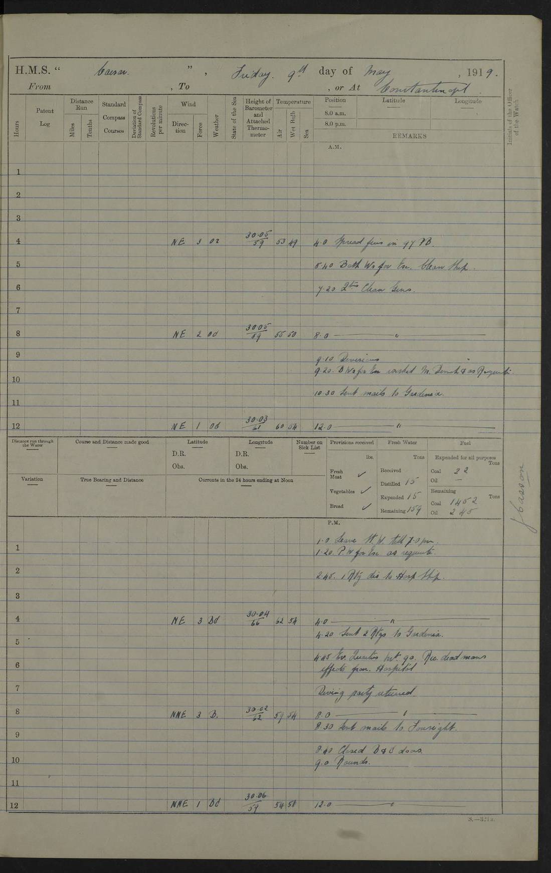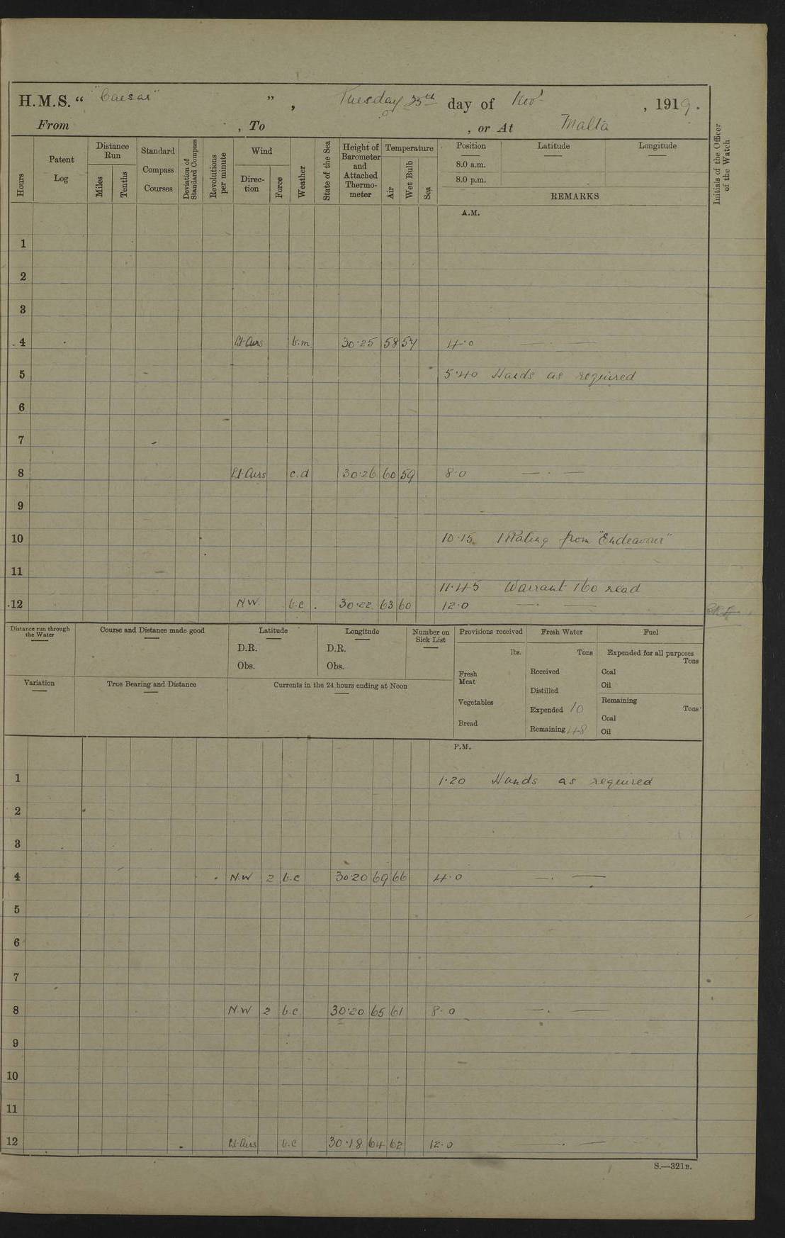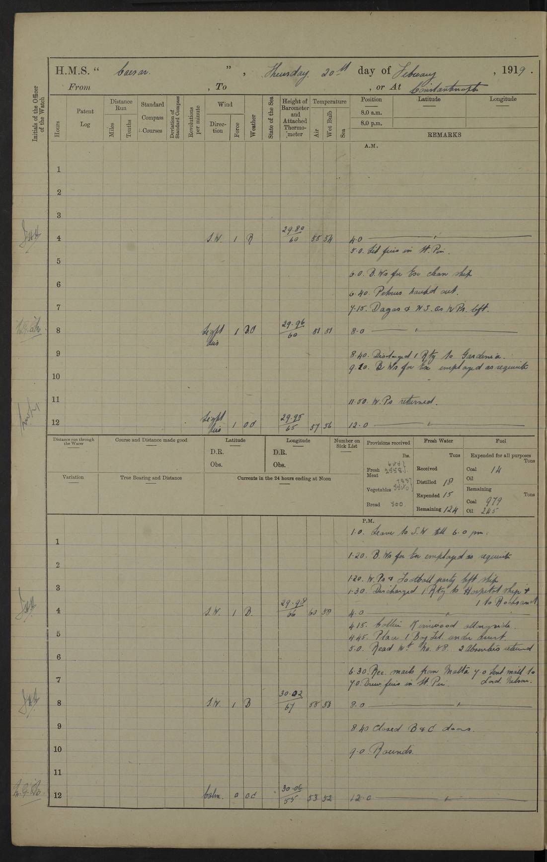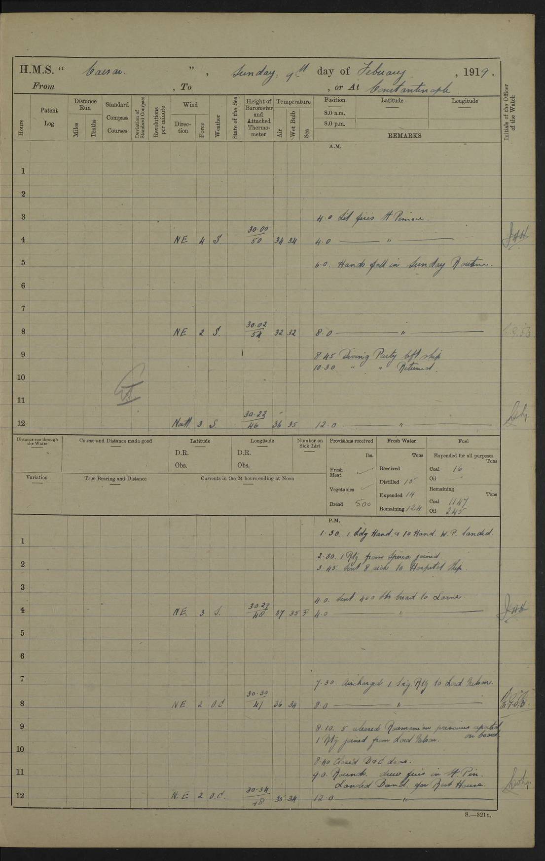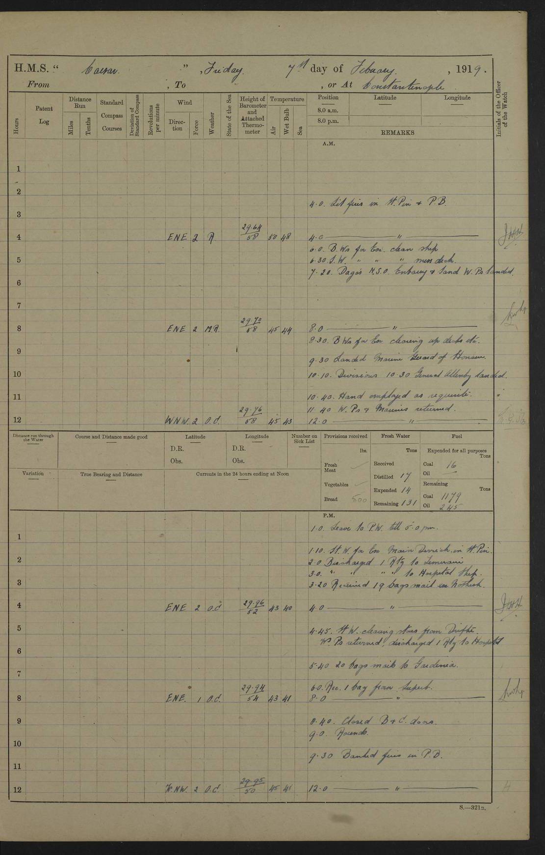 4edebb7b14d0450578000168: (https://s3.amazonaws.com:443/oldweather/ADM53-36589/0003_1.jpg) 1 November 1918 At Malta Lat 35.89, Long 14.52 [Somerset Wharf] 11.15am: Engineers Store Party returned on Board. 0.45pm: Paid Monthly Money. 1.0pm: Mr Goss, Gunner rejoined Ship from RN Hospital. 2.30pm: Gave Special leave to Port Watch untill 7.0am and Port Watch of Boys untill 6.0pm. Hands Made [sic] and Mend Clothes. 2.40pm: Landed liberty Men and Boys. 3.50pm: Provision Boat came alongside. 4.10pm: (4) Recovered Patients rejoined Ship from RN Hospital. 4.30pm: Landed liberty Men and Patrol. 6.0pm: Liberty Boys Returned on Board. 6.30pm: Canteen Party landed untill 10.0pm and Read Warrant No (24). 10.0pm: Canteen Party returned on Board. 11.50pm: Patrol returned on Board. [Provisions received: Fresh Meat 300 lbs, Vegetables 1000 lbs, Bread 450 lbs] 4edebb7c14d0450578000169: (https://s3.amazonaws.com:443/oldweather/ADM53-36589/0004_0.jpg) 2 November 1918 At Malta Lat 35.89, Long 14.52 [Hamilton Wharf] 7.15am: Shifted Berths from Somerset Wharf, to Hamilton Wharf. 8.0am: Tested life Buoys Correct. 8.45am: BW for x Told off Special Parties, Remainder of Hands employed as Requisite, and Landed Picket house Party. 9.10am: Held Court Martial on Board. 10.30am: Court Martial Finished. Noon: Picket House Party returned. 1.20pm: BW for x. Told off Special Parties. Remainder of Hands employed getting in Paymasters Stores and as Requisite. Lost overboard by accident Boat Hooks, Steel, Pattern (345), 2 in Number. 4.20pm: Hands to Fire Stations. 4.35pm: Read Warrant No 25 and gave Special leave to Starboard Watch untill 7.0am. 5.0pm: Landed liberty Men and Victualling Yard Lighter left Ship. 6.30pm: Canteen Party landed untill 10.0pm. [Provisions received: Fresh Meat 260 lbs, Bread 900 lbs] 4edebb7c14d045057800016a: (https://s3.amazonaws.com:443/oldweather/ADM53-36589/0004_1.jpg) 3 November 1918 At Malta Lat 35.89, Long 14.52 [Hamilton Wharf] 9.0am: Landed Church Parties, Wesleyans (14), Presbyterians (10). 9.30am: Divisions. 9.50am: Landed Roman Catholics (15). 10.10am: Discharged (5) Ratings to RN Hospital. 11.35am: All Church Parties returned on Board. 1.0pm: Gave Special leave to Port Watch untill 7.0am and Both Watches of Boys untill 5.30pm. 1.15pm: Landed liberty Men and Boys. 5.30pm: Liberty Boys returned on Board. 6.30pm: Canteen Party landed untill 10.0pm. 8.40pm: Closed B and C Doors. 10.0pm: Canteen Party returned on Board. [Number on sick list: 5] [Provisions received: Fresh Meat 280 lbs] 4edebb7c14d045057800016b: (https://s3.amazonaws.com:443/oldweather/ADM53-36589/0005_0.jpg) 4 November 1918 At Malta Lat 35.89, Long 14.52 [Hamilton Wharf] 6.50am: BW for x Told off Special Parties, remainder of Hands employed as Requisite. 7.0am: Liberty men returned on Board. 8.5am: Provision lighter came alongside. 8.10am: BW for x, Told off Special Parties, remainder of Hands employed Provisioning Ship and as requisite. 8.45am: Landed (1) Carpenter rating for Examination. 3.45pm: (2) Recovered Patients joined Ship from RN Hospital. 4.10pm: Received 8 Bags of Mails from Egmont, and Gave Special leave to Starboard Watch till 7.0am. 5.0pm: Landed Liberty Men and Patrol. 6.0pm: Hands employed getting in and stowing away Provisions. Midnight: Patrol returned on Board. [Weather fine, noon temperature 74F] 4edebb7c14d045057800016c: (https://s3.amazonaws.com:443/oldweather/ADM53-36589/0005_1.jpg) 5 November 1918 At Malta Lat 35.89, Long 14.52 [Hamilton Wharf] 6.45am: BW for x. Told off Special Parties. Remainder of Hands employed getting in and stowing away Provisions. 8.30am: Landed Hospital Party and Picket House Party. 11.0am: Landed (35) Rifles to Naval Ordinance for exchange. Noon: Picket House Party returned. 1.20pm: Landed (2) Ratings for Dental Treatment. 2.25pm: (35) Exchanged Rifles came on Board. 3.40pm: (2) Recovered Patients rejoined Ship from RN Hospital and disinfected Bedding. 4.0pm: Gave Special leave to Port Watch untill 7.0am. Starboard Watch employed stowing Provisions. 4.30pm: Landed Liberty men. Starboard Watch employed stowing away Provisions and Read Warrant No (26). [Provisions received: Fresh Meat 530 lbs, Bread 1000 lbs] 4edebb7c14d045057800016d: (https://s3.amazonaws.com:443/oldweather/ADM53-36589/0006_0.jpg) 6 November 1918 At Malta Lat 35.89, Long 14.52 [Hamilton Wharf] 6.50am: BW for x. Told off Special Parties, Remainder of Port Watch stowing Provisions, Starboard Watch drawing Quarter Deck Awning. 9.0am: Hands employed Provisioning Ship. 4.0pm: Gave Special leave to Starboard Watch untill 7.0am. 4.30pm: Landed liberty Men. Port Watch employed stowing away Provisions. 6.30pm: Canteen Party landed until 10.0pm. 10.0pm: Canteen Party returned on Board. [Number on sick list: 5] [Provisions received: Fresh Meat 250 lbs, Vegetables 1000 lbs, Bread 450 lbs] [Fuel Remaining: Coal 244 tons, Oil 332 tons] 4edebb7c14d045057800016e: (https://s3.amazonaws.com:443/oldweather/ADM53-36589/0006_1.jpg) 7 November 1918 At Malta Lat 35.89, Long 14.52 [No 4 Buoy] 6.30am: BW for x. Told off Special Parties. Remainder of Hands employed prepairing [preparing] Ship to Shift Berths, from Hamilton Wharf to No 4 Buoy. 7.0am: Liberty men returned on Board. 8.50am: Secured Ship to No 4 Buoy and Coal Lighters came alongside. 9.10am: Commenced Coaling Native labour. Hands employed Drawing Stores and as Requisite. 11.50am: Dockyard Parties returned. 1.40pm: BW for x Told off Special Parties, remainder of Hands employed as Requisite. 4.30pm: Gave Special leave to Port Watch untill 7.0am. 4.45pm: Landed liberty men and Patrol and Read Warrant No (27). 7.30pm: Completed Coaling (1481) Tons. 8.40pm: Watch employed sweeping down. 11.50pm: Patrol returned on Board. [Number on sick list: 6] [Provisions received: Fresh Meat 280 lbs, Bread 300 lbs] [Fuel Remaining: Coal 1716 tons, Oil 332 tons] 4edebb7c14d045057800016f: (https://s3.amazonaws.com:443/oldweather/ADM53-36589/0007_0.jpg) 8 November 1918 At Malta Lat 35.89, Long 