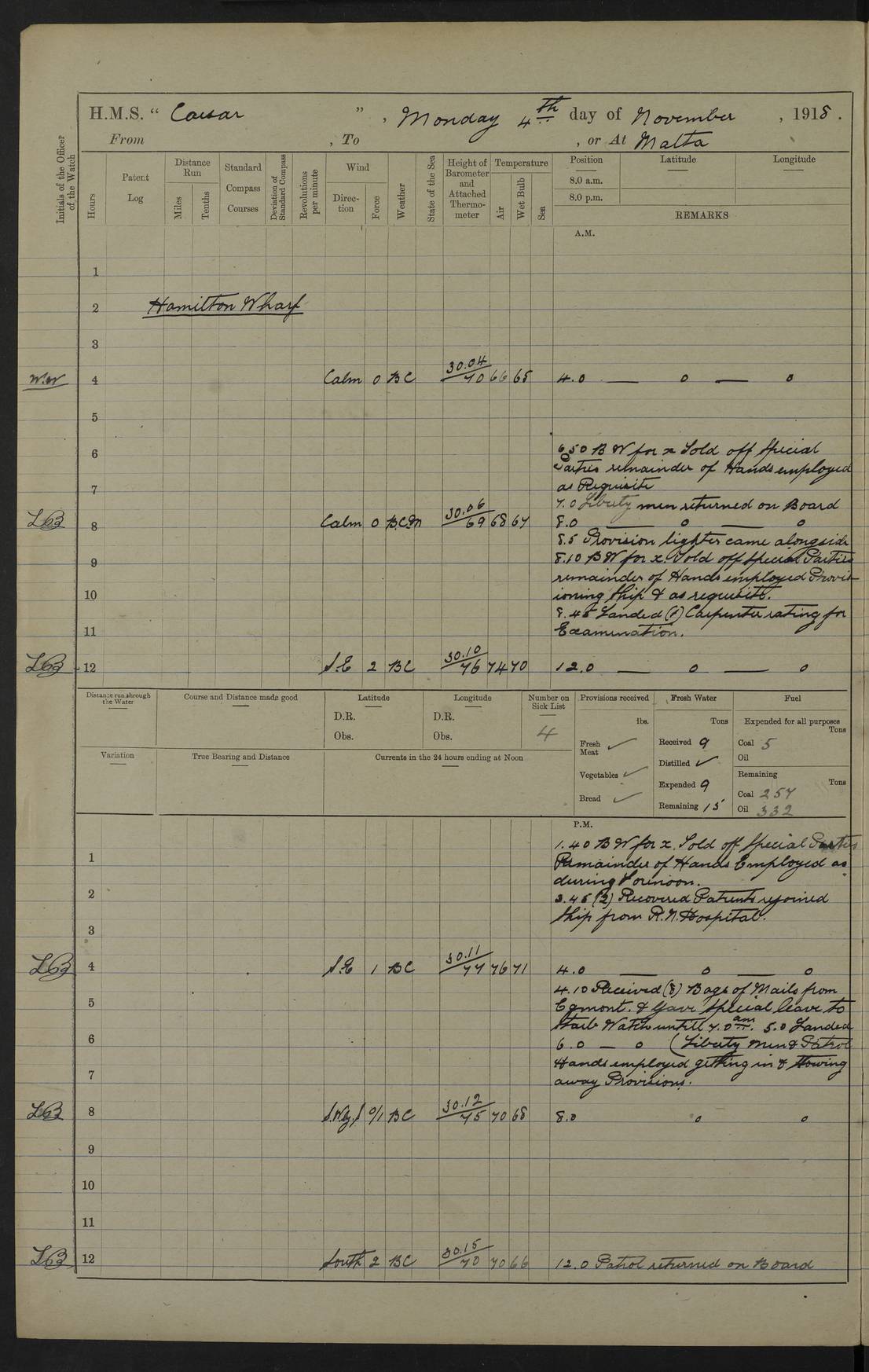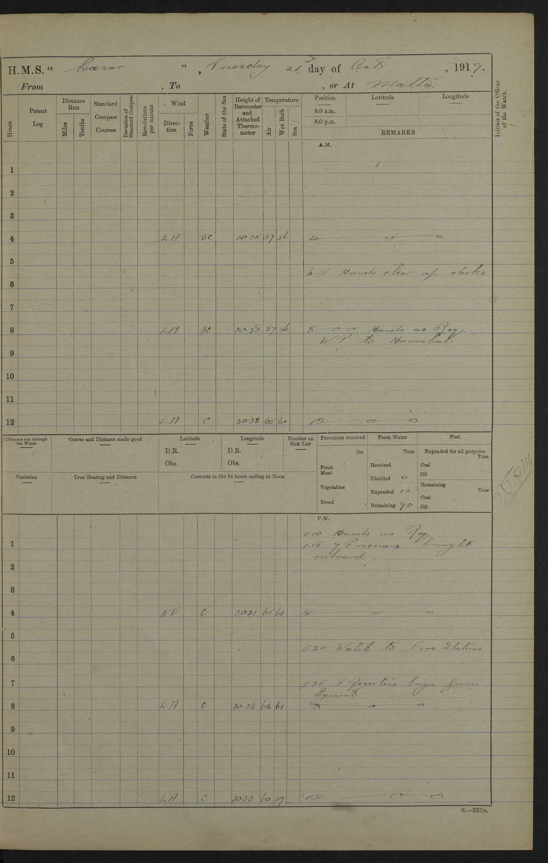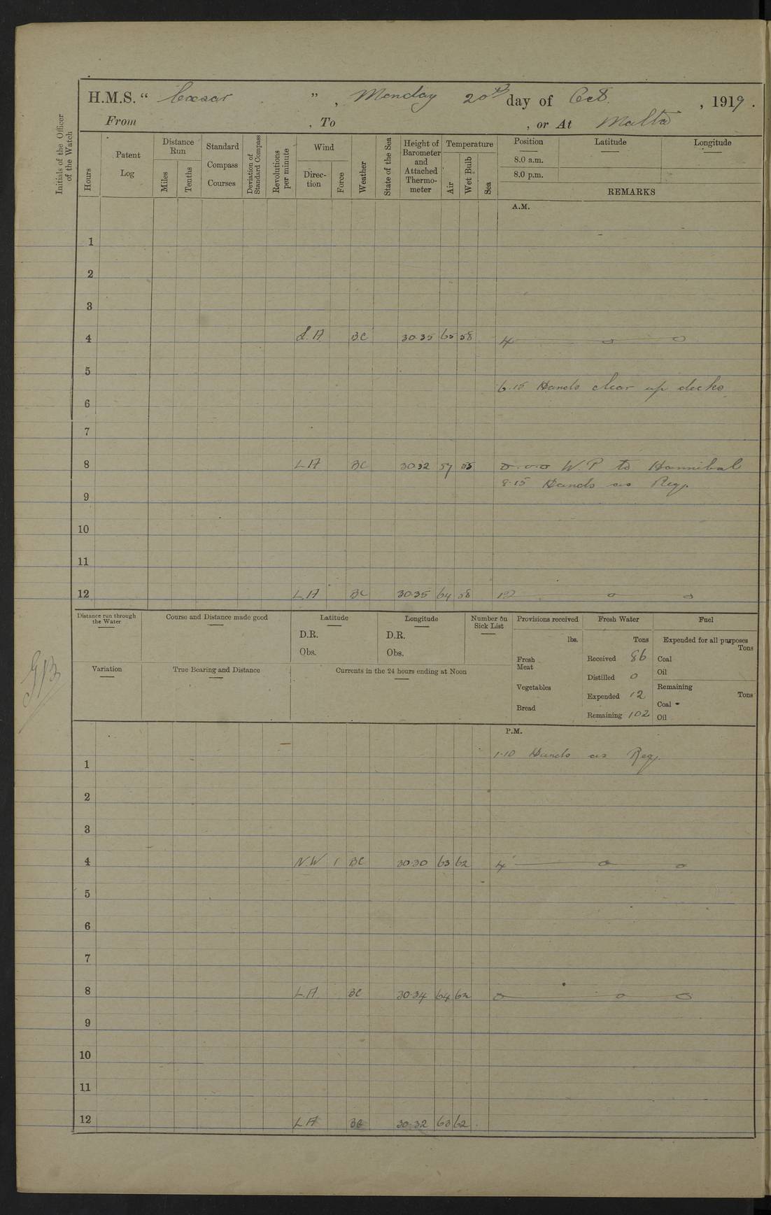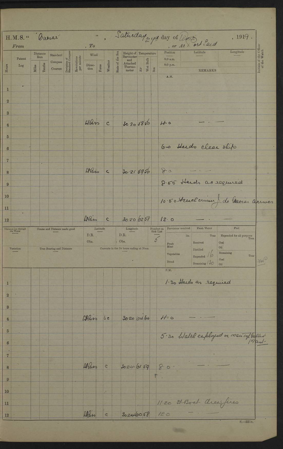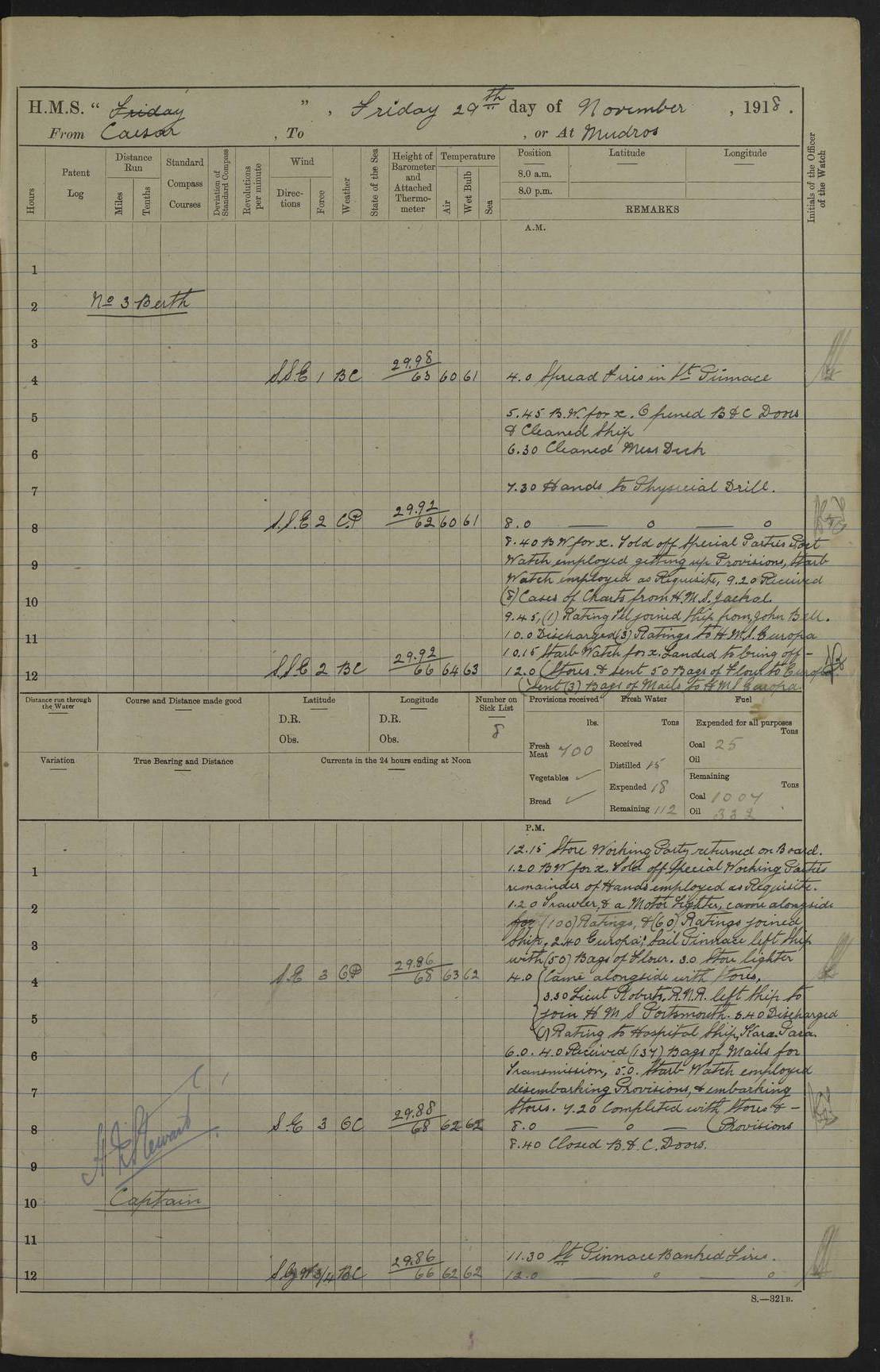 4edebb7b14d0450578000168: (https://s3.amazonaws.com:443/oldweather/ADM53-36589/0003_1.jpg) 1 November 1918 At Malta Lat 35.89, Long 14.52 [Somerset Wharf] 11.15am: Engineers Store Party returned on Board. 0.45pm: Paid Monthly Money. 1.0pm: Mr Goss, Gunner rejoined Ship from RN Hospital. 2.30pm: Gave Special leave to Port Watch untill 7.0am and Port Watch of Boys untill 6.0pm. Hands Made [sic] and Mend Clothes. 2.40pm: Landed liberty Men and Boys. 3.50pm: Provision Boat came alongside. 4.10pm: (4) Recovered Patients rejoined Ship from RN Hospital. 4.30pm: Landed liberty Men and Patrol. 6.0pm: Liberty Boys Returned on Board. 6.30pm: Canteen Party landed untill 10.0pm and Read Warrant No (24). 10.0pm: Canteen Party returned on Board. 11.50pm: Patrol returned on Board. [Provisions received: Fresh Meat 300 lbs, Vegetables 1000 lbs, Bread 450 lbs] 4edebb7c14d0450578000169: (https://s3.amazonaws.com:443/oldweather/ADM53-36589/0004_0.jpg) 2 November 1918 At Malta Lat 35.89, Long 14.52 [Hamilton Wharf] 7.15am: Shifted Berths from Somerset Wharf, to Hamilton Wharf. 8.0am: Tested life Buoys Correct. 8.45am: BW for x Told off Special Parties, Remainder of Hands employed as Requisite, and Landed Picket house Party. 9.10am: Held Court Martial on Board. 10.30am: Court Martial Finished. Noon: Picket House Party returned. 1.20pm: BW for x. Told off Special Parties. Remainder of Hands employed getting in Paymasters Stores and as Requisite. Lost overboard by accident Boat Hooks, Steel, Pattern (345), 2 in Number. 4.20pm: Hands to Fire Stations. 4.35pm: Read Warrant No 25 and gave Special leave to Starboard Watch untill 7.0am. 5.0pm: Landed liberty Men and Victualling Yard Lighter left Ship. 6.30pm: Canteen Party landed untill 10.0pm. [Provisions received: Fresh Meat 260 lbs, Bread 900 lbs] 4edebb7c14d045057800016a: (https://s3.amazonaws.com:443/oldweather/ADM53-36589/0004_1.jpg) 3 November 1918 At Malta Lat 35.89, Long 14.52 [Hamilton Wharf] 9.0am: Landed Church Parties, Wesleyans (14), Presbyterians (10). 9.30am: Divisions. 9.50am: Landed Roman Catholics (15). 10.10am: Discharged (5) Ratings to RN Hospital. 11.35am: All Church Parties returned on Board. 1.0pm: Gave Special leave to Port Watch untill 7.0am and Both Watches of Boys untill 5.30pm. 1.15pm: Landed liberty Men and Boys. 5.30pm: Liberty Boys returned on Board. 6.30pm: Canteen Party landed untill 10.0pm. 8.40pm: Closed B and C Doors. 10.0pm: Canteen Party returned on Board. [Number on sick list: 5] [Provisions received: Fresh Meat 280 lbs] 4edebb7c14d045057800016b: (https://s3.amazonaws.com:443/oldweather/ADM53-36589/0005_0.jpg) 4 November 1918 At Malta Lat 35.89, Long 14.52 [Hamilton Wharf] 6.50am: BW for x Told off Special Parties, remainder of Hands employed as Requisite. 7.0am: Liberty men returned on Board. 8.5am: Provision lighter came alongside. 8.10am: BW for x, Told off Special Parties, remainder of Hands employed Provisioning Ship and as requisite. 8.45am: Landed (1) Carpenter rating for Examination. 3.45pm: (2) Recovered Patients joined Ship from RN Hospital. 4.10pm: Received 8 Bags of Mails from Egmont, and Gave Special leave to Starboard Watch till 7.0am. 5.0pm: Landed Liberty Men and Patrol. 6.0pm: Hands employed getting in and stowing away Provisions. Midnight: Patrol returned on Board. [Weather fine, noon temperature 74F] 4edebb7c14d045057800016c: (https://s3.amazonaws.com:443/oldweather/ADM53-36589/0005_1.jpg) 5 November 1918 At Malta Lat 35.89, Long 14.52 [Hamilton Wharf] 6.45am: BW for x. Told off Special Parties. Remainder of Hands employed getting in and stowing away Provisions. 8.30am: Landed Hospital Party and Picket House Party. 11.0am: Landed (35) Rifles to Naval Ordinance for exchange. Noon: Picket House Party returned. 1.20pm: Landed (2) Ratings for Dental Treatment. 2.25pm: (35) Exchanged Rifles came on Board. 3.40pm: (2) Recovered Patients rejoined Ship from RN Hospital and disinfected Bedding. 4.0pm: Gave Special leave to Port Watch untill 7.0am. Starboard Watch employed stowing Provisions. 4.30pm: Landed Liberty men. Starboard Watch employed stowing away Provisions and Read Warrant No (26). [Provisions received: Fresh Meat 530 lbs, Bread 1000 lbs] 4edebb7c14d045057800016d: (https://s3.amazonaws.com:443/oldweather/ADM53-36589/0006_0.jpg) 6 November 1918 At Malta Lat 35.89, Long 14.52 [Hamilton Wharf] 6.50am: BW for x. Told off Special Parties, Remainder of Port Watch stowing Provisions, Starboard Watch drawing Quarter Deck Awning. 9.0am: Hands employed Provisioning Ship. 4.0pm: Gave Special leave to Starboard Watch untill 7.0am. 4.30pm: Landed liberty Men. Port Watch employed stowing away Provisions. 6.30pm: Canteen Party landed until 10.0pm. 10.0pm: Canteen Party returned on Board. [Number on sick list: 5] [Provisions received: Fresh Meat 250 lbs, Vegetables 1000 lbs, Bread 450 lbs] [Fuel Remaining: Coal 244 tons, Oil 332 tons] 4edebb7c14d045057800016e: (https://s3.amazonaws.com:443/oldweather/ADM53-36589/0006_1.jpg) 7 November 1918 At Malta Lat 35.89, Long 14.52 [No 4 Buoy] 6.30am: BW for x. Told off Special Parties. Remainder of Hands employed prepairing [preparing] Ship to Shift Berths, from Hamilton Wharf to No 4 Buoy. 7.0am: Liberty men returned on Board. 8.50am: Secured Ship to No 4 Buoy and Coal Lighters came alongside. 9.10am: Commenced Coaling Native labour. Hands employed Drawing Stores and as Requisite. 11.50am: Dockyard Parties returned. 1.40pm: BW for x Told off Special Parties, remainder of Hands employed as Requisite. 4.30pm: Gave Special leave to Port Watch untill 7.0am. 4.45pm: Landed liberty men and Patrol and Read Warrant No (27). 7.30pm: Completed Coaling (1481) Tons. 8.40pm: Watch employed sweeping down. 11.50pm: Patrol returned on Board. [Number on sick list: 6] [Provisions received: Fresh Meat 280 lbs, Bread 300 lbs] [Fuel Remaining: Coal 1716 tons, Oil 332 tons] 4edebb7c14d045057800016f: (https://s3.amazonaws.com:443/oldweather/ADM53-36589/0007_0.jpg) 8 November 1918 At Malta Lat 35.89, Long 