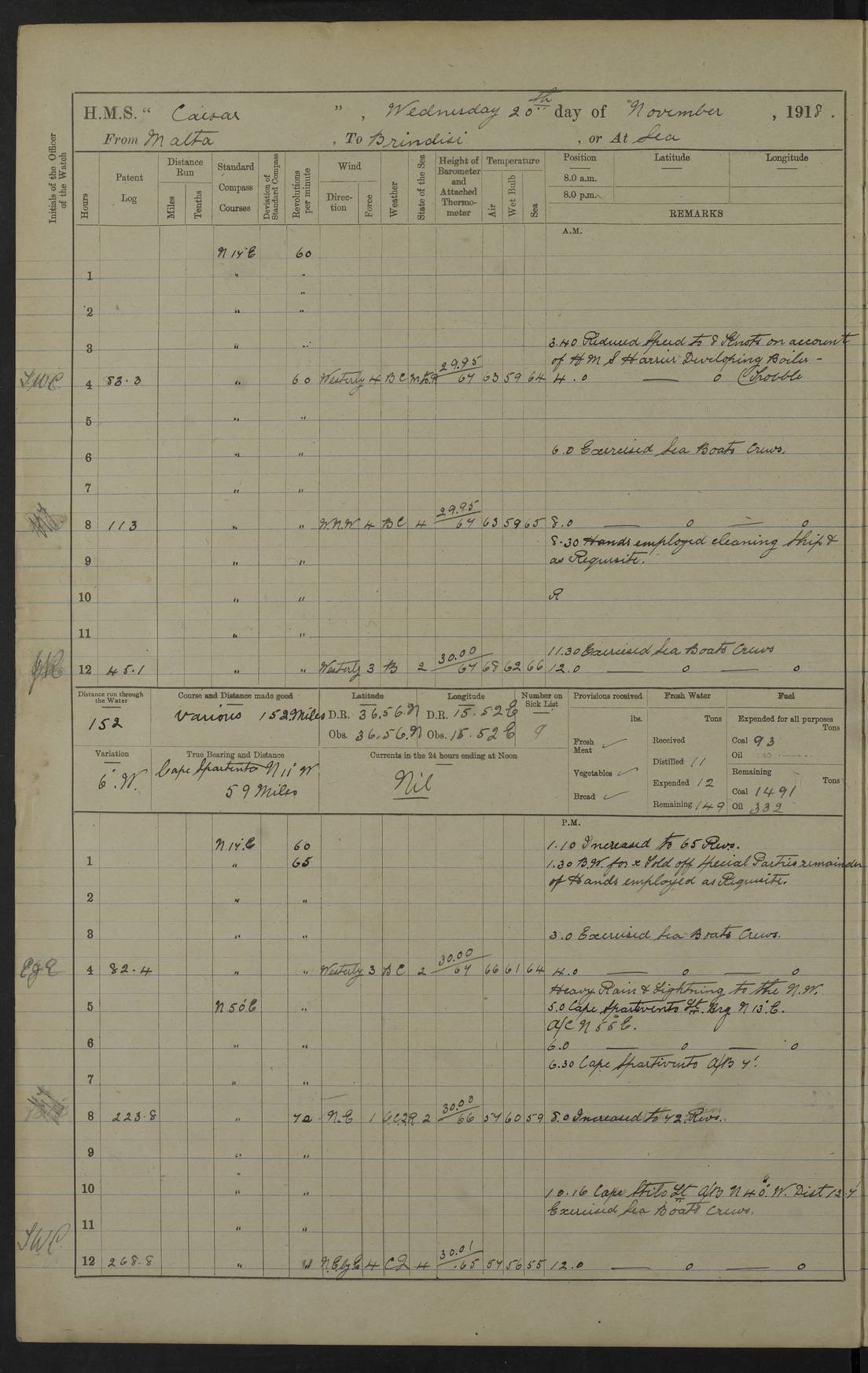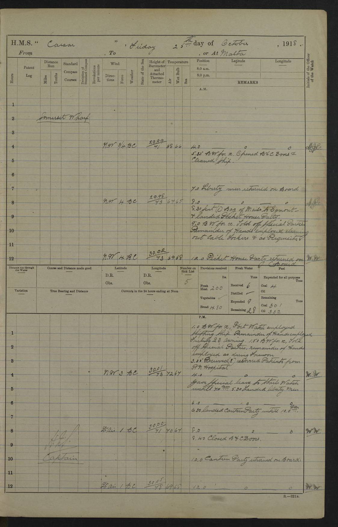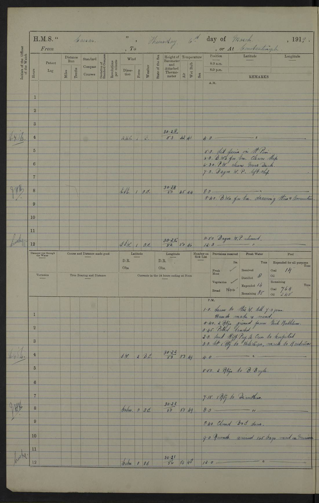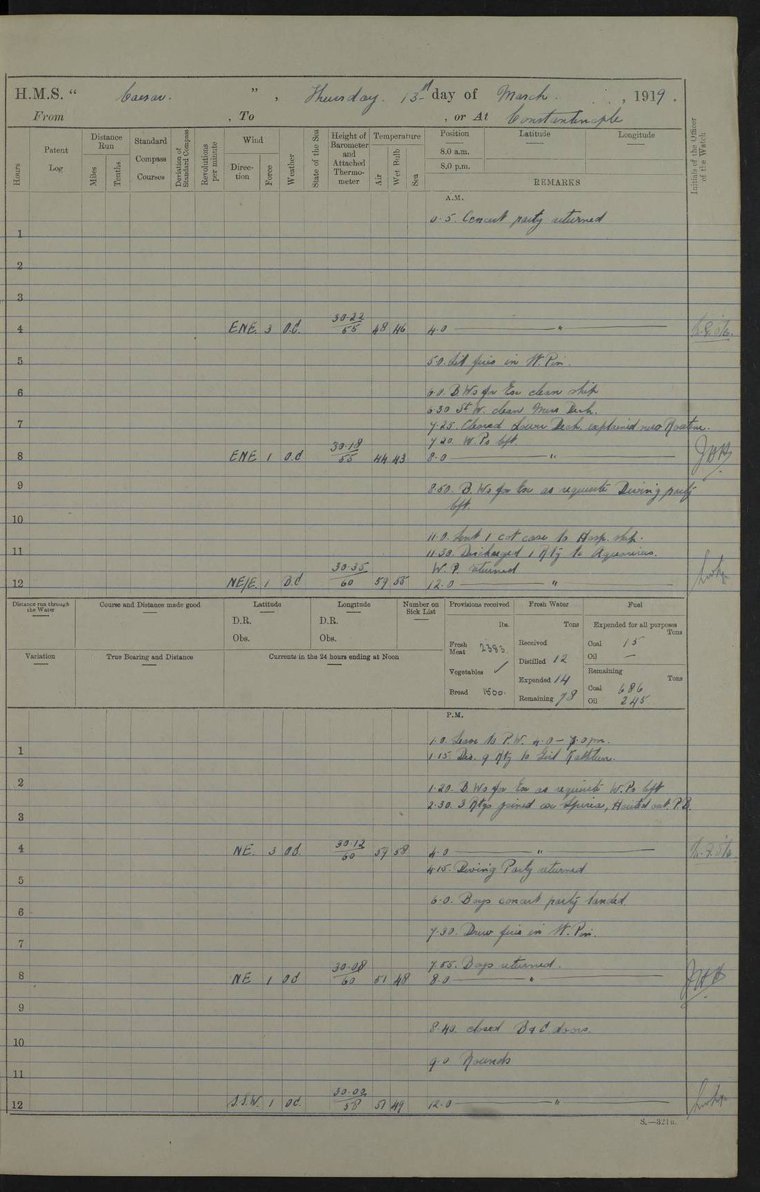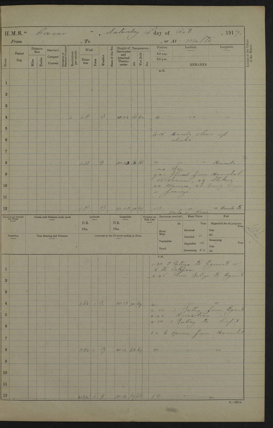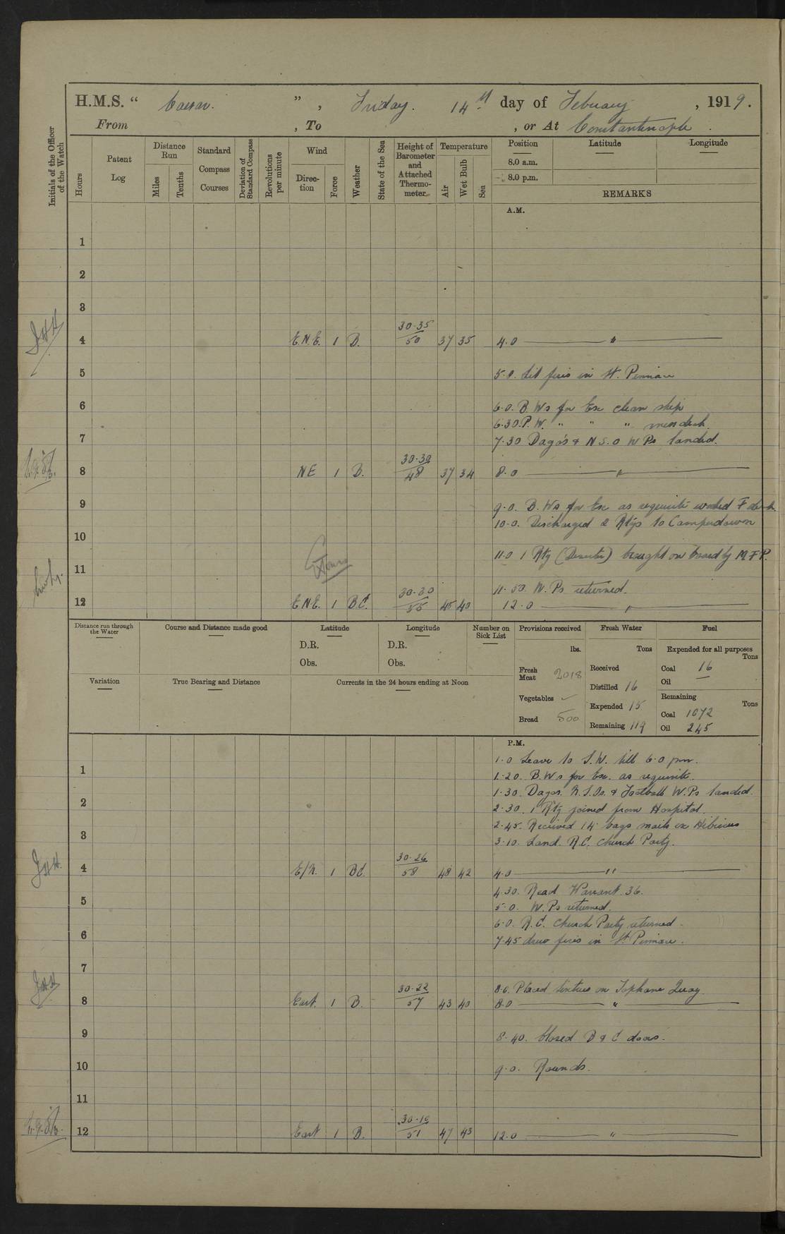 4edebb7b14d0450578000168: (https://s3.amazonaws.com:443/oldweather/ADM53-36589/0003_1.jpg) 1 November 1918 At Malta Lat 35.89, Long 14.52 [Somerset Wharf] 11.15am: Engineers Store Party returned on Board. 0.45pm: Paid Monthly Money. 1.0pm: Mr Goss, Gunner rejoined Ship from RN Hospital. 2.30pm: Gave Special leave to Port Watch untill 7.0am and Port Watch of Boys untill 6.0pm. Hands Made [sic] and Mend Clothes. 2.40pm: Landed liberty Men and Boys. 3.50pm: Provision Boat came alongside. 4.10pm: (4) Recovered Patients rejoined Ship from RN Hospital. 4.30pm: Landed liberty Men and Patrol. 6.0pm: Liberty Boys Returned on Board. 6.30pm: Canteen Party landed untill 10.0pm and Read Warrant No (24). 10.0pm: Canteen Party returned on Board. 11.50pm: Patrol returned on Board. [Provisions received: Fresh Meat 300 lbs, Vegetables 1000 lbs, Bread 450 lbs] 4edebb7c14d0450578000169: (https://s3.amazonaws.com:443/oldweather/ADM53-36589/0004_0.jpg) 2 November 1918 At Malta Lat 35.89, Long 14.52 [Hamilton Wharf] 7.15am: Shifted Berths from Somerset Wharf, to Hamilton Wharf. 8.0am: Tested life Buoys Correct. 8.45am: BW for x Told off Special Parties, Remainder of Hands employed as Requisite, and Landed Picket house Party. 9.10am: Held Court Martial on Board. 10.30am: Court Martial Finished. Noon: Picket House Party returned. 1.20pm: BW for x. Told off Special Parties. Remainder of Hands employed getting in Paymasters Stores and as Requisite. Lost overboard by accident Boat Hooks, Steel, Pattern (345), 2 in Number. 4.20pm: Hands to Fire Stations. 4.35pm: Read Warrant No 25 and gave Special leave to Starboard Watch untill 7.0am. 5.0pm: Landed liberty Men and Victualling Yard Lighter left Ship. 6.30pm: Canteen Party landed untill 10.0pm. [Provisions received: Fresh Meat 260 lbs, Bread 900 lbs] 4edebb7c14d045057800016a: (https://s3.amazonaws.com:443/oldweather/ADM53-36589/0004_1.jpg) 3 November 1918 At Malta Lat 35.89, Long 14.52 [Hamilton Wharf] 9.0am: Landed Church Parties, Wesleyans (14), Presbyterians (10). 9.30am: Divisions. 9.50am: Landed Roman Catholics (15). 10.10am: Discharged (5) Ratings to RN Hospital. 11.35am: All Church Parties returned on Board. 1.0pm: Gave Special leave to Port Watch untill 7.0am and Both Watches of Boys untill 5.30pm. 1.15pm: Landed liberty Men and Boys. 5.30pm: Liberty Boys returned on Board. 6.30pm: Canteen Party landed untill 10.0pm. 8.40pm: Closed B and C Doors. 10.0pm: Canteen Party returned on Board. [Number on sick list: 5] [Provisions received: Fresh Meat 280 lbs] 4edebb7c14d045057800016b: (https://s3.amazonaws.com:443/oldweather/ADM53-36589/0005_0.jpg) 4 November 1918 At Malta Lat 35.89, Long 14.52 [Hamilton Wharf] 6.50am: BW for x Told off Special Parties, remainder of Hands employed as Requisite. 7.0am: Liberty men returned on Board. 8.5am: Provision lighter came alongside. 8.10am: BW for x, Told off Special Parties, remainder of Hands employed Provisioning Ship and as requisite. 8.45am: Landed (1) Carpenter rating for Examination. 3.45pm: (2) Recovered Patients joined Ship from RN Hospital. 4.10pm: Received 8 Bags of Mails from Egmont, and Gave Special leave to Starboard Watch till 7.0am. 5.0pm: Landed Liberty Men and Patrol. 6.0pm: Hands employed getting in and stowing away Provisions. Midnight: Patrol returned on Board. [Weather fine, noon temperature 74F] 4edebb7c14d045057800016c: (https://s3.amazonaws.com:443/oldweather/ADM53-36589/0005_1.jpg) 5 November 1918 At Malta Lat 35.89, Long 14.52 [Hamilton Wharf] 6.45am: BW for x. Told off Special Parties. Remainder of Hands employed getting in and stowing away Provisions. 8.30am: Landed Hospital Party and Picket House Party. 11.0am: Landed (35) Rifles to Naval Ordinance for exchange. Noon: Picket House Party returned. 1.20pm: Landed (2) Ratings for Dental Treatment. 2.25pm: (35) Exchanged Rifles came on Board. 3.40pm: (2) Recovered Patients rejoined Ship from RN Hospital and disinfected Bedding. 4.0pm: Gave Special leave to Port Watch untill 7.0am. Starboard Watch employed stowing Provisions. 4.30pm: Landed Liberty men. Starboard Watch employed stowing away Provisions and Read Warrant No (26). [Provisions received: Fresh Meat 530 lbs, Bread 1000 lbs] 4edebb7c14d045057800016d: (https://s3.amazonaws.com:443/oldweather/ADM53-36589/0006_0.jpg) 6 November 1918 At Malta Lat 35.89, Long 14.52 [Hamilton Wharf] 6.50am: BW for x. Told off Special Parties, Remainder of Port Watch stowing Provisions, Starboard Watch drawing Quarter Deck Awning. 9.0am: Hands employed Provisioning Ship. 4.0pm: Gave Special leave to Starboard Watch untill 7.0am. 4.30pm: Landed liberty Men. Port Watch employed stowing away Provisions. 6.30pm: Canteen Party landed until 10.0pm. 10.0pm: Canteen Party returned on Board. [Number on sick list: 5] [Provisions received: Fresh Meat 250 lbs, Vegetables 1000 lbs, Bread 450 lbs] [Fuel Remaining: Coal 244 tons, Oil 332 tons] 4edebb7c14d045057800016e: (https://s3.amazonaws.com:443/oldweather/ADM53-36589/0006_1.jpg) 7 November 1918 At Malta Lat 35.89, Long 14.52 [No 4 Buoy] 6.30am: BW for x. Told off Special Parties. Remainder of Hands employed prepairing [preparing] Ship to Shift Berths, from Hamilton Wharf to No 4 Buoy. 7.0am: Liberty men returned on Board. 8.50am: Secured Ship to No 4 Buoy and Coal Lighters came alongside. 9.10am: Commenced Coaling Native labour. Hands employed Drawing Stores and as Requisite. 11.50am: Dockyard Parties returned. 1.40pm: BW for x Told off Special Parties, remainder of Hands employed as Requisite. 4.30pm: Gave Special leave to Port Watch untill 7.0am. 4.45pm: Landed liberty men and Patrol and Read Warrant No (27). 7.30pm: Completed Coaling (1481) Tons. 8.40pm: Watch employed sweeping down. 11.50pm: Patrol returned on Board. [Number on sick list: 6] [Provisions received: Fresh Meat 280 lbs, Bread 300 lbs] [Fuel Remaining: Coal 1716 tons, Oil 332 tons] 4edebb7c14d045057800016f: (https://s3.amazonaws.com:443/oldweather/ADM53-36589/0007_0.jpg) 8 November 1918 At Malta Lat 35.89, Long 