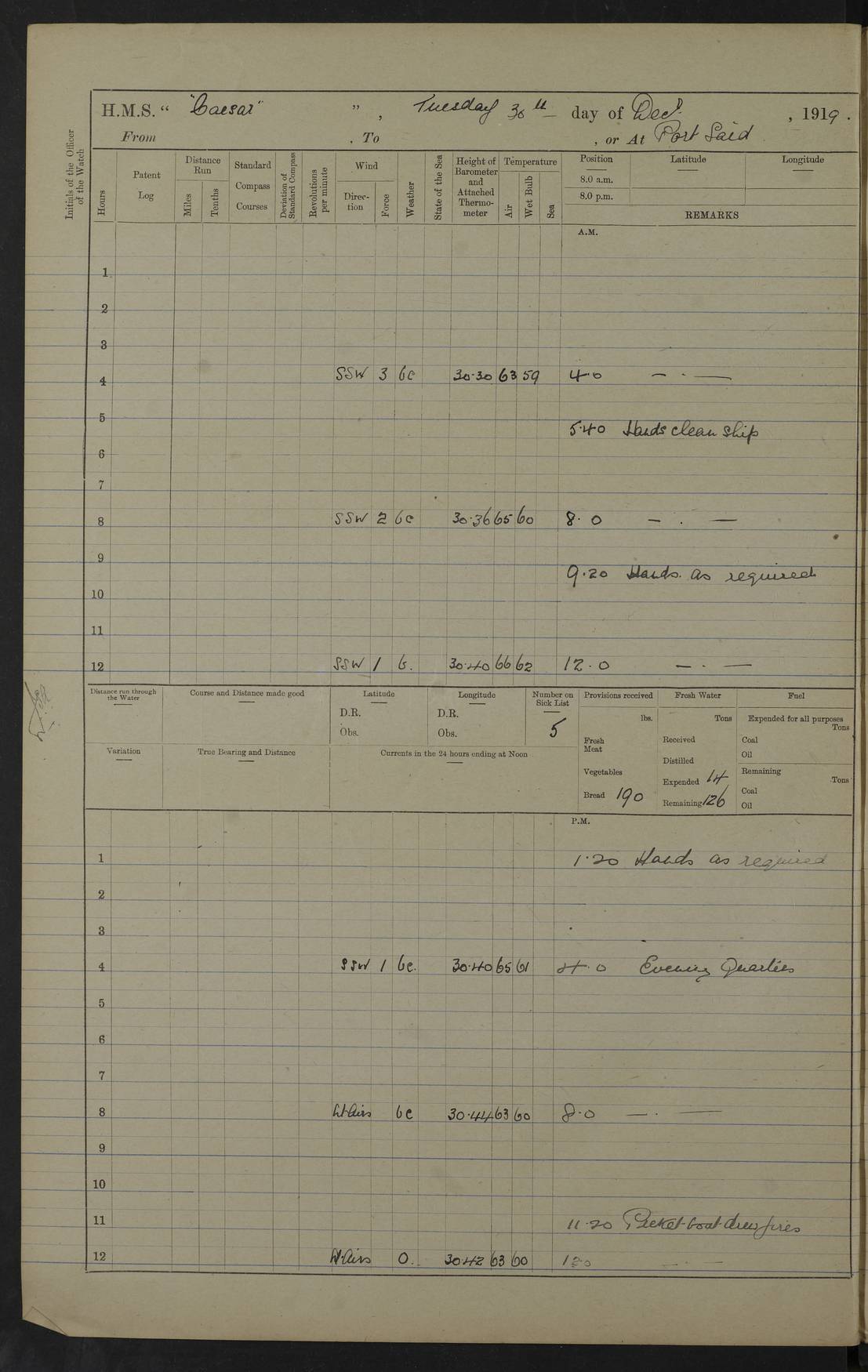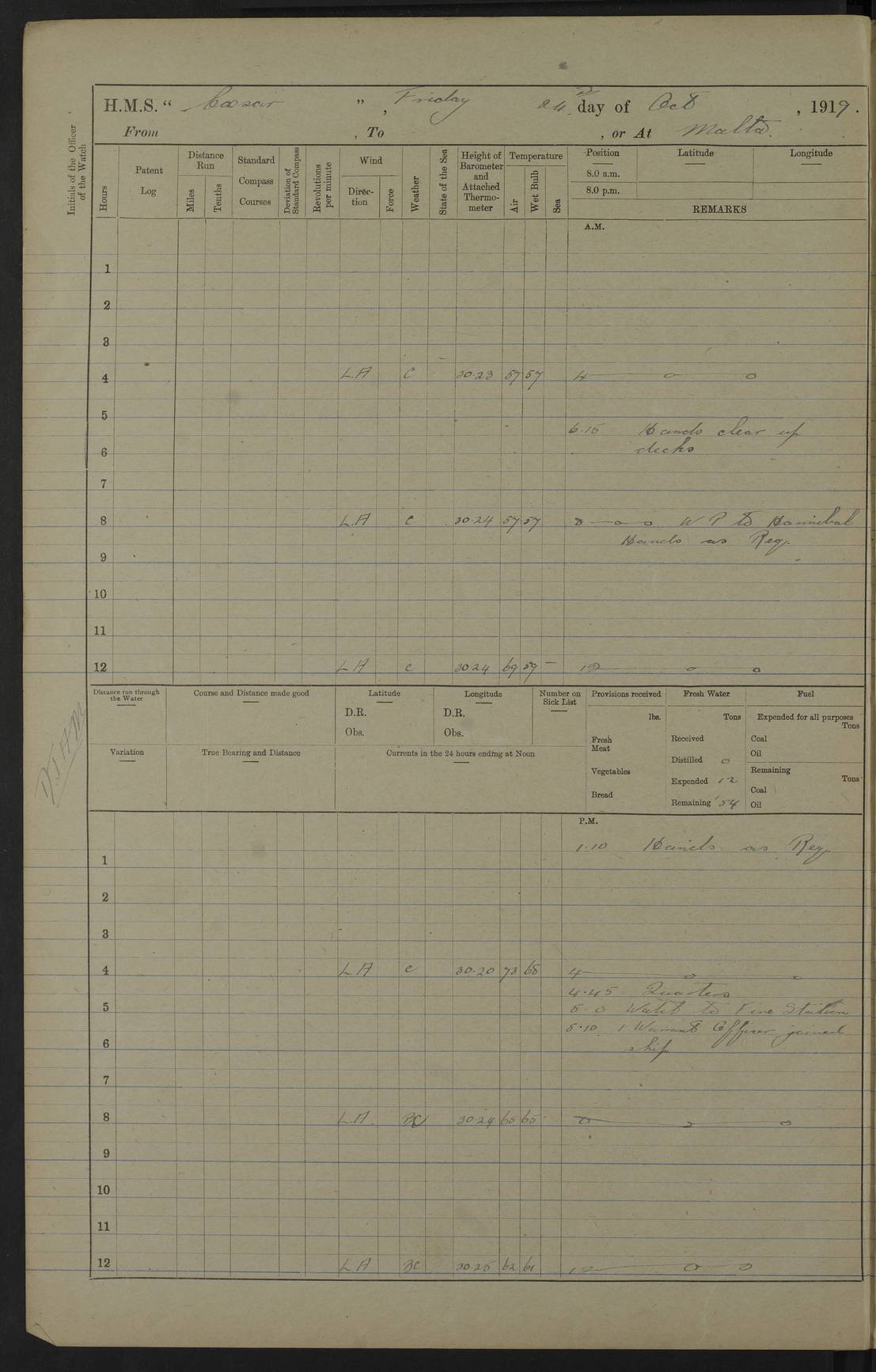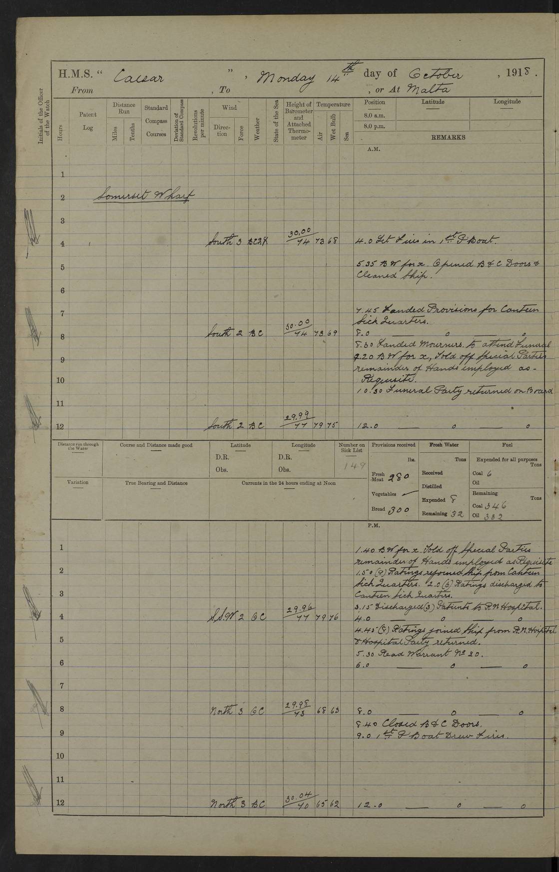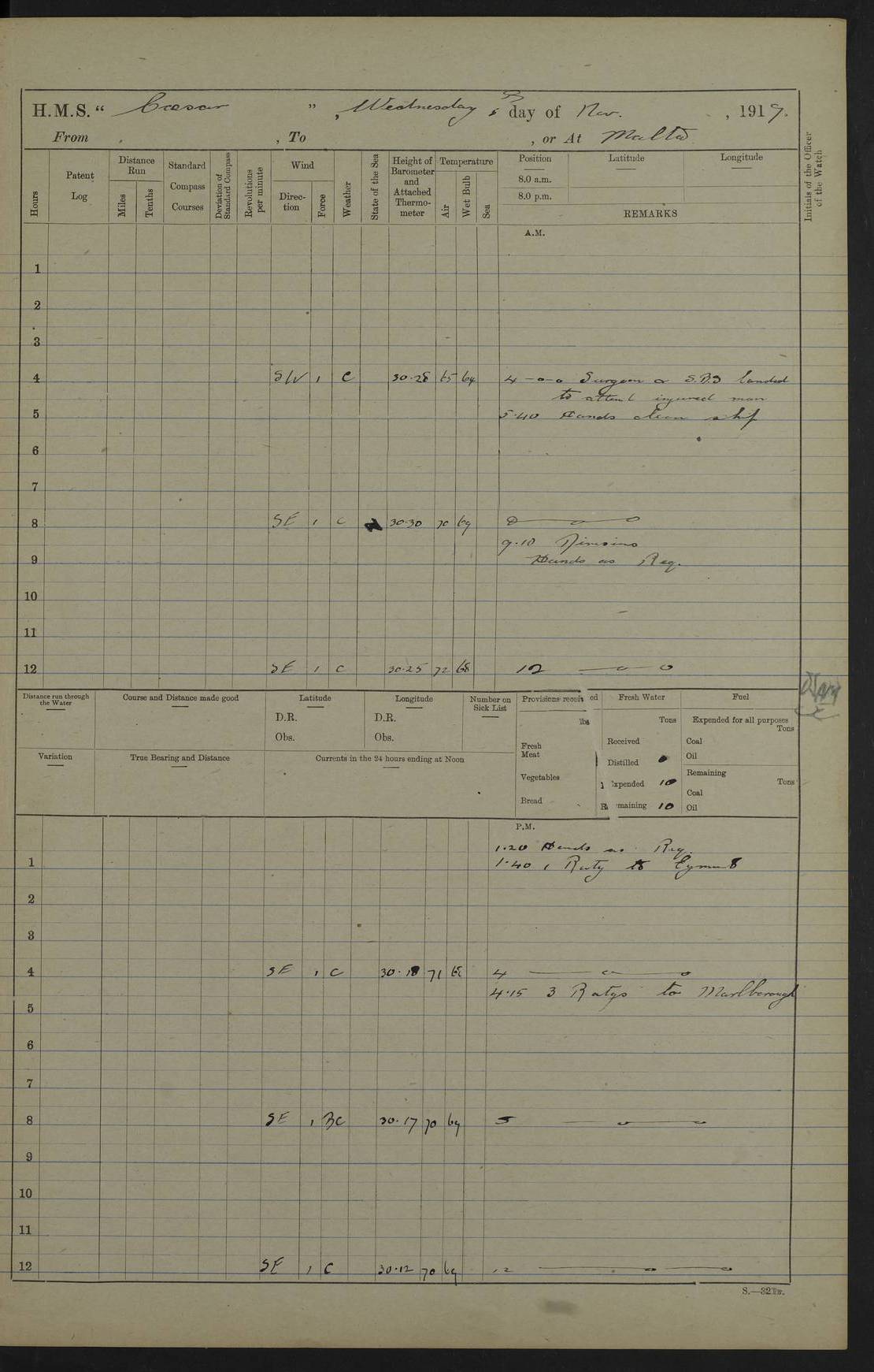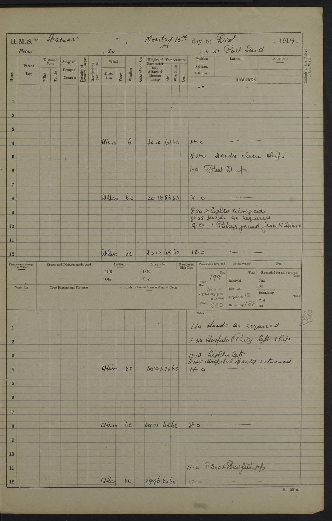 4edebb7b14d0450578000168: (https://s3.amazonaws.com:443/oldweather/ADM53-36589/0003_1.jpg) 1 November 1918 At Malta Lat 35.89, Long 14.52 [Somerset Wharf] 11.15am: Engineers Store Party returned on Board. 0.45pm: Paid Monthly Money. 1.0pm: Mr Goss, Gunner rejoined Ship from RN Hospital. 2.30pm: Gave Special leave to Port Watch untill 7.0am and Port Watch of Boys untill 6.0pm. Hands Made [sic] and Mend Clothes. 2.40pm: Landed liberty Men and Boys. 3.50pm: Provision Boat came alongside. 4.10pm: (4) Recovered Patients rejoined Ship from RN Hospital. 4.30pm: Landed liberty Men and Patrol. 6.0pm: Liberty Boys Returned on Board. 6.30pm: Canteen Party landed untill 10.0pm and Read Warrant No (24). 10.0pm: Canteen Party returned on Board. 11.50pm: Patrol returned on Board. [Provisions received: Fresh Meat 300 lbs, Vegetables 1000 lbs, Bread 450 lbs] 4edebb7c14d0450578000169: (https://s3.amazonaws.com:443/oldweather/ADM53-36589/0004_0.jpg) 2 November 1918 At Malta Lat 35.89, Long 14.52 [Hamilton Wharf] 7.15am: Shifted Berths from Somerset Wharf, to Hamilton Wharf. 8.0am: Tested life Buoys Correct. 8.45am: BW for x Told off Special Parties, Remainder of Hands employed as Requisite, and Landed Picket house Party. 9.10am: Held Court Martial on Board. 10.30am: Court Martial Finished. Noon: Picket House Party returned. 1.20pm: BW for x. Told off Special Parties. Remainder of Hands employed getting in Paymasters Stores and as Requisite. Lost overboard by accident Boat Hooks, Steel, Pattern (345), 2 in Number. 4.20pm: Hands to Fire Stations. 4.35pm: Read Warrant No 25 and gave Special leave to Starboard Watch untill 7.0am. 5.0pm: Landed liberty Men and Victualling Yard Lighter left Ship. 6.30pm: Canteen Party landed untill 10.0pm. [Provisions received: Fresh Meat 260 lbs, Bread 900 lbs] 4edebb7c14d045057800016a: (https://s3.amazonaws.com:443/oldweather/ADM53-36589/0004_1.jpg) 3 November 1918 At Malta Lat 35.89, Long 14.52 [Hamilton Wharf] 9.0am: Landed Church Parties, Wesleyans (14), Presbyterians (10). 9.30am: Divisions. 9.50am: Landed Roman Catholics (15). 10.10am: Discharged (5) Ratings to RN Hospital. 11.35am: All Church Parties returned on Board. 1.0pm: Gave Special leave to Port Watch untill 7.0am and Both Watches of Boys untill 5.30pm. 1.15pm: Landed liberty Men and Boys. 5.30pm: Liberty Boys returned on Board. 6.30pm: Canteen Party landed untill 10.0pm. 8.40pm: Closed B and C Doors. 10.0pm: Canteen Party returned on Board. [Number on sick list: 5] [Provisions received: Fresh Meat 280 lbs] 4edebb7c14d045057800016b: (https://s3.amazonaws.com:443/oldweather/ADM53-36589/0005_0.jpg) 4 November 1918 At Malta Lat 35.89, Long 14.52 [Hamilton Wharf] 6.50am: BW for x Told off Special Parties, remainder of Hands employed as Requisite. 7.0am: Liberty men returned on Board. 8.5am: Provision lighter came alongside. 8.10am: BW for x, Told off Special Parties, remainder of Hands employed Provisioning Ship and as requisite. 8.45am: Landed (1) Carpenter rating for Examination. 3.45pm: (2) Recovered Patients joined Ship from RN Hospital. 4.10pm: Received 8 Bags of Mails from Egmont, and Gave Special leave to Starboard Watch till 7.0am. 5.0pm: Landed Liberty Men and Patrol. 6.0pm: Hands employed getting in and stowing away Provisions. Midnight: Patrol returned on Board. [Weather fine, noon temperature 74F] 4edebb7c14d045057800016c: (https://s3.amazonaws.com:443/oldweather/ADM53-36589/0005_1.jpg) 5 November 1918 At Malta Lat 35.89, Long 14.52 [Hamilton Wharf] 6.45am: BW for x. Told off Special Parties. Remainder of Hands employed getting in and stowing away Provisions. 8.30am: Landed Hospital Party and Picket House Party. 11.0am: Landed (35) Rifles to Naval Ordinance for exchange. Noon: Picket House Party returned. 1.20pm: Landed (2) Ratings for Dental Treatment. 2.25pm: (35) Exchanged Rifles came on Board. 3.40pm: (2) Recovered Patients rejoined Ship from RN Hospital and disinfected Bedding. 4.0pm: Gave Special leave to Port Watch untill 7.0am. Starboard Watch employed stowing Provisions. 4.30pm: Landed Liberty men. Starboard Watch employed stowing away Provisions and Read Warrant No (26). [Provisions received: Fresh Meat 530 lbs, Bread 1000 lbs] 4edebb7c14d045057800016d: (https://s3.amazonaws.com:443/oldweather/ADM53-36589/0006_0.jpg) 6 November 1918 At Malta Lat 35.89, Long 14.52 [Hamilton Wharf] 6.50am: BW for x. Told off Special Parties, Remainder of Port Watch stowing Provisions, Starboard Watch drawing Quarter Deck Awning. 9.0am: Hands employed Provisioning Ship. 4.0pm: Gave Special leave to Starboard Watch untill 7.0am. 4.30pm: Landed liberty Men. Port Watch employed stowing away Provisions. 6.30pm: Canteen Party landed until 10.0pm. 10.0pm: Canteen Party returned on Board. [Number on sick list: 5] [Provisions received: Fresh Meat 250 lbs, Vegetables 1000 lbs, Bread 450 lbs] [Fuel Remaining: Coal 244 tons, Oil 332 tons] 4edebb7c14d045057800016e: (https://s3.amazonaws.com:443/oldweather/ADM53-36589/0006_1.jpg) 7 November 1918 At Malta Lat 35.89, Long 14.52 [No 4 Buoy] 6.30am: BW for x. Told off Special Parties. Remainder of Hands employed prepairing [preparing] Ship to Shift Berths, from Hamilton Wharf to No 4 Buoy. 7.0am: Liberty men returned on Board. 8.50am: Secured Ship to No 4 Buoy and Coal Lighters came alongside. 9.10am: Commenced Coaling Native labour. Hands employed Drawing Stores and as Requisite. 11.50am: Dockyard Parties returned. 1.40pm: BW for x Told off Special Parties, remainder of Hands employed as Requisite. 4.30pm: Gave Special leave to Port Watch untill 7.0am. 4.45pm: Landed liberty men and Patrol and Read Warrant No (27). 7.30pm: Completed Coaling (1481) Tons. 8.40pm: Watch employed sweeping down. 11.50pm: Patrol returned on Board. [Number on sick list: 6] [Provisions received: Fresh Meat 280 lbs, Bread 300 lbs] [Fuel Remaining: Coal 1716 tons, Oil 332 tons] 4edebb7c14d045057800016f: (https://s3.amazonaws.com:443/oldweather/ADM53-36589/0007_0.jpg) 8 November 1918 At Malta Lat 35.89, Long 