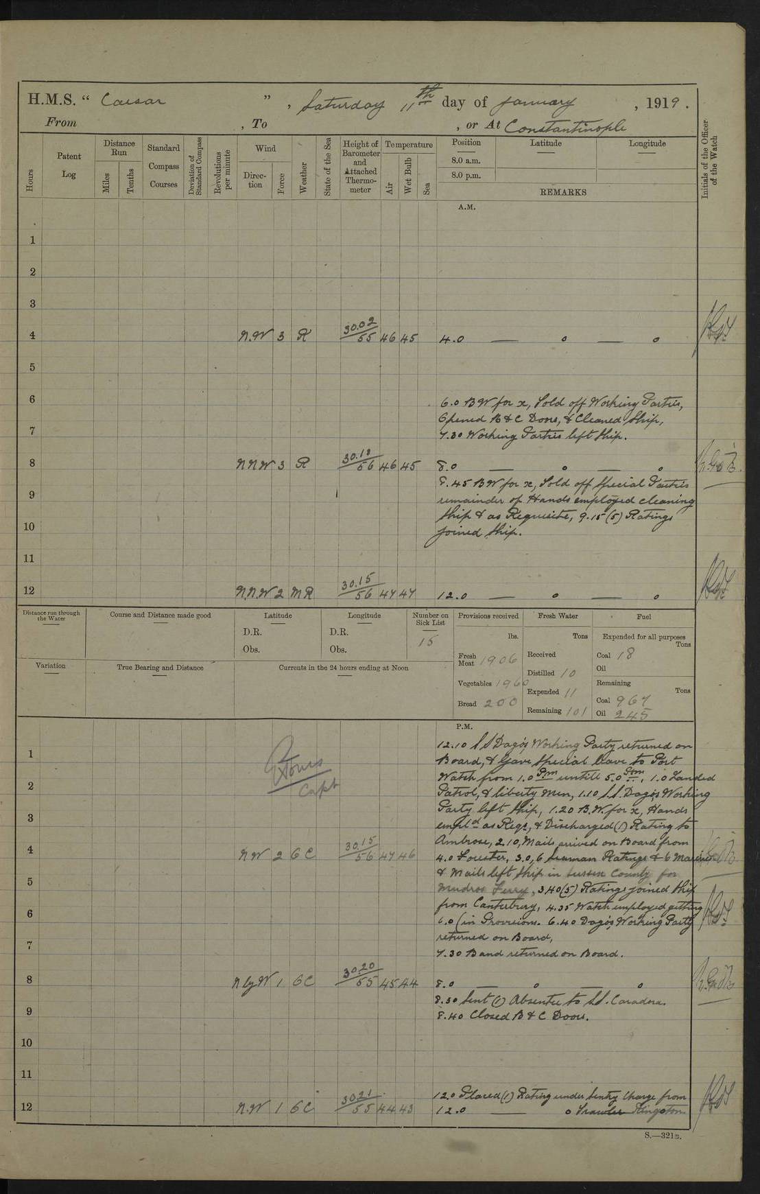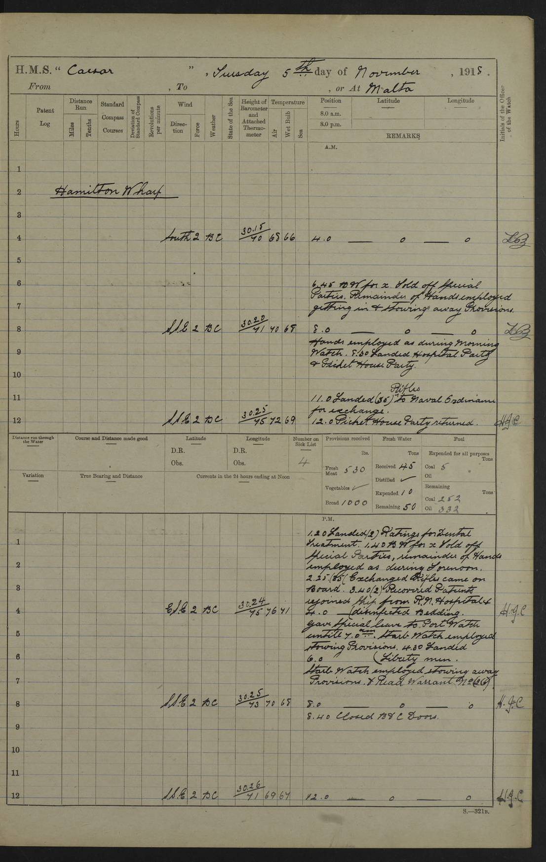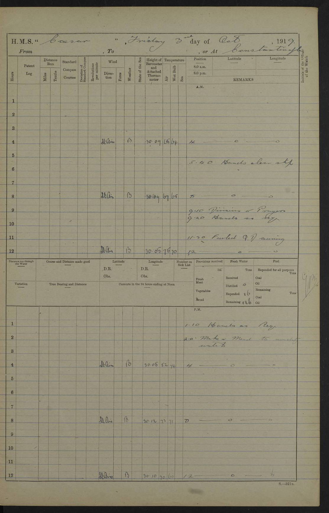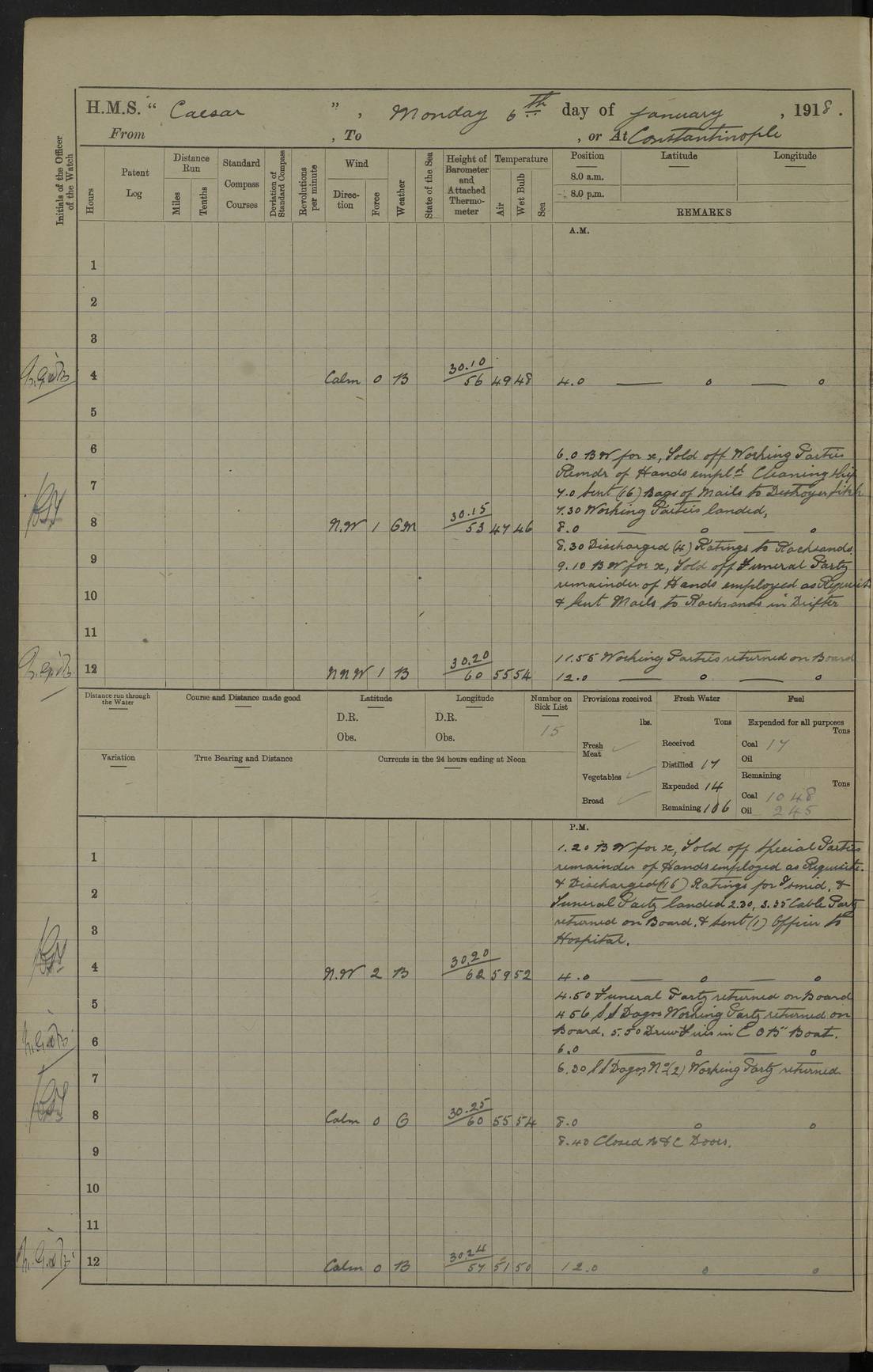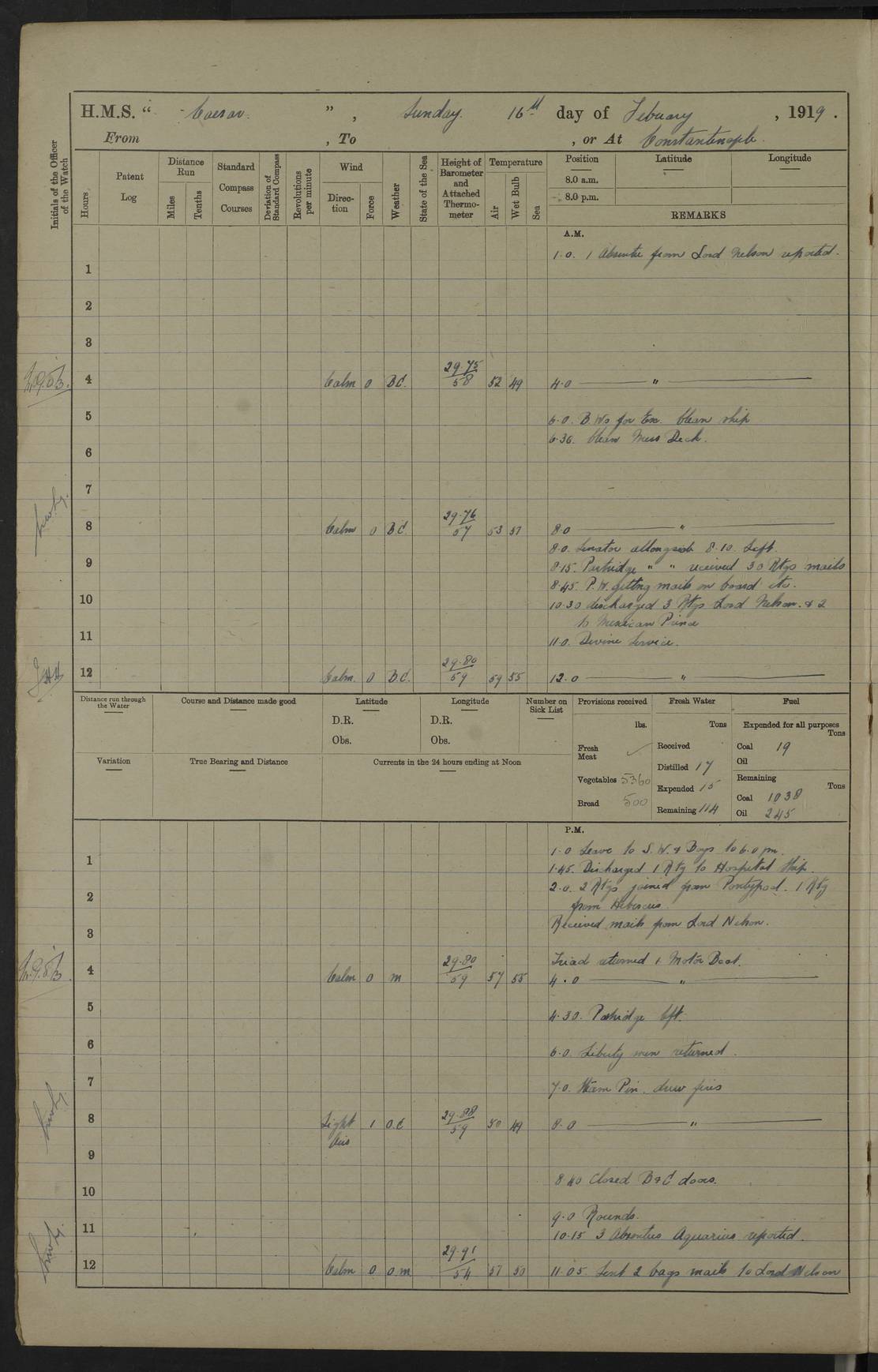4edebb7b14d0450578000168: (https://s3.amazonaws.com:443/oldweather/ADM53-36589/0003_1.jpg) 1 November 1918 At Malta Lat 35.89, Long 14.52 [Somerset Wharf] 11.15am: Engineers Store Party returned on Board. 0.45pm: Paid Monthly Money. 1.0pm: Mr Goss, Gunner rejoined Ship from RN Hospital. 2.30pm: Gave Special leave to Port Watch untill 7.0am and Port Watch of Boys untill 6.0pm. Hands Made [sic] and Mend Clothes. 2.40pm: Landed liberty Men and Boys. 3.50pm: Provision Boat came alongside. 4.10pm: (4) Recovered Patients rejoined Ship from RN Hospital. 4.30pm: Landed liberty Men and Patrol. 6.0pm: Liberty Boys Returned on Board. 6.30pm: Canteen Party landed untill 10.0pm and Read Warrant No (24). 10.0pm: Canteen Party returned on Board. 11.50pm: Patrol returned on Board. [Provisions received: Fresh Meat 300 lbs, Vegetables 1000 lbs, Bread 450 lbs] 4edebb7c14d0450578000169: (https://s3.amazonaws.com:443/oldweather/ADM53-36589/0004_0.jpg) 2 November 1918 At Malta Lat 35.89, Long 14.52 [Hamilton Wharf] 7.15am: Shifted Berths from Somerset Wharf, to Hamilton Wharf. 8.0am: Tested life Buoys Correct. 8.45am: BW for x Told off Special Parties, Remainder of Hands employed as Requisite, and Landed Picket house Party. 9.10am: Held Court Martial on Board. 10.30am: Court Martial Finished. Noon: Picket House Party returned. 1.20pm: BW for x. Told off Special Parties. Remainder of Hands employed getting in Paymasters Stores and as Requisite. Lost overboard by accident Boat Hooks, Steel, Pattern (345), 2 in Number. 4.20pm: Hands to Fire Stations. 4.35pm: Read Warrant No 25 and gave Special leave to Starboard Watch untill 7.0am. 5.0pm: Landed liberty Men and Victualling Yard Lighter left Ship. 6.30pm: Canteen Party landed untill 10.0pm. [Provisions received: Fresh Meat 260 lbs, Bread 900 lbs] 4edebb7c14d045057800016a: (https://s3.amazonaws.com:443/oldweather/ADM53-36589/0004_1.jpg) 3 November 1918 At Malta Lat 35.89, Long 14.52 [Hamilton Wharf] 9.0am: Landed Church Parties, Wesleyans (14), Presbyterians (10). 9.30am: Divisions. 9.50am: Landed Roman Catholics (15). 10.10am: Discharged (5) Ratings to RN Hospital. 11.35am: All Church Parties returned on Board. 1.0pm: Gave Special leave to Port Watch untill 7.0am and Both Watches of Boys untill 5.30pm. 1.15pm: Landed liberty Men and Boys. 5.30pm: Liberty Boys returned on Board. 6.30pm: Canteen Party landed untill 10.0pm. 8.40pm: Closed B and C Doors. 10.0pm: Canteen Party returned on Board. [Number on sick list: 5] [Provisions received: Fresh Meat 280 lbs] 4edebb7c14d045057800016b: (https://s3.amazonaws.com:443/oldweather/ADM53-36589/0005_0.jpg) 4 November 1918 At Malta Lat 35.89, Long 14.52 [Hamilton Wharf] 6.50am: BW for x Told off Special Parties, remainder of Hands employed as Requisite. 7.0am: Liberty men returned on Board. 8.5am: Provision lighter came alongside. 8.10am: BW for x, Told off Special Parties, remainder of Hands employed Provisioning Ship and as requisite. 8.45am: Landed (1) Carpenter rating for Examination. 3.45pm: (2) Recovered Patients joined Ship from RN Hospital. 4.10pm: Received 8 Bags of Mails from Egmont, and Gave Special leave to Starboard Watch till 7.0am. 5.0pm: Landed Liberty Men and Patrol. 6.0pm: Hands employed getting in and stowing away Provisions. Midnight: Patrol returned on Board. [Weather fine, noon temperature 74F] 4edebb7c14d045057800016c: (https://s3.amazonaws.com:443/oldweather/ADM53-36589/0005_1.jpg) 5 November 1918 At Malta Lat 35.89, Long 14.52 [Hamilton Wharf] 6.45am: BW for x. Told off Special Parties. Remainder of Hands employed getting in and stowing away Provisions. 8.30am: Landed Hospital Party and Picket House Party. 11.0am: Landed (35) Rifles to Naval Ordinance for exchange. Noon: Picket House Party returned. 1.20pm: Landed (2) Ratings for Dental Treatment. 2.25pm: (35) Exchanged Rifles came on Board. 3.40pm: (2) Recovered Patients rejoined Ship from RN Hospital and disinfected Bedding. 4.0pm: Gave Special leave to Port Watch untill 7.0am. Starboard Watch employed stowing Provisions. 4.30pm: Landed Liberty men. Starboard Watch employed stowing away Provisions and Read Warrant No (26). [Provisions received: Fresh Meat 530 lbs, Bread 1000 lbs] 4edebb7c14d045057800016d: (https://s3.amazonaws.com:443/oldweather/ADM53-36589/0006_0.jpg) 6 November 1918 At Malta Lat 35.89, Long 14.52 [Hamilton Wharf] 6.50am: BW for x. Told off Special Parties, Remainder of Port Watch stowing Provisions, Starboard Watch drawing Quarter Deck Awning. 9.0am: Hands employed Provisioning Ship. 4.0pm: Gave Special leave to Starboard Watch untill 7.0am. 4.30pm: Landed liberty Men. Port Watch employed stowing away Provisions. 6.30pm: Canteen Party landed until 10.0pm. 10.0pm: Canteen Party returned on Board. [Number on sick list: 5] [Provisions received: Fresh Meat 250 lbs, Vegetables 1000 lbs, Bread 450 lbs] [Fuel Remaining: Coal 244 tons, Oil 332 tons] 4edebb7c14d045057800016e: (https://s3.amazonaws.com:443/oldweather/ADM53-36589/0006_1.jpg) 7 November 1918 At Malta Lat 35.89, Long 14.52 [No 4 Buoy] 6.30am: BW for x. Told off Special Parties. Remainder of Hands employed prepairing [preparing] Ship to Shift Berths, from Hamilton Wharf to No 4 Buoy. 7.0am: Liberty men returned on Board. 8.50am: Secured Ship to No 4 Buoy and Coal Lighters came alongside. 9.10am: Commenced Coaling Native labour. Hands employed Drawing Stores and as Requisite. 11.50am: Dockyard Parties returned. 1.40pm: BW for x Told off Special Parties, remainder of Hands employed as Requisite. 4.30pm: Gave Special leave to Port Watch untill 7.0am. 4.45pm: Landed liberty men and Patrol and Read Warrant No (27). 7.30pm: Completed Coaling (1481) Tons. 8.40pm: Watch employed sweeping down. 11.50pm: Patrol returned on Board. [Number on sick list: 6] [Provisions received: Fresh Meat 280 lbs, Bread 300 lbs] [Fuel Remaining: Coal 1716 tons, Oil 332 tons] 4edebb7c14d045057800016f: (https://s3.amazonaws.com:443/oldweather/ADM53-36589/0007_0.jpg) 8 November 1918 At Malta Lat 35.89, Long 