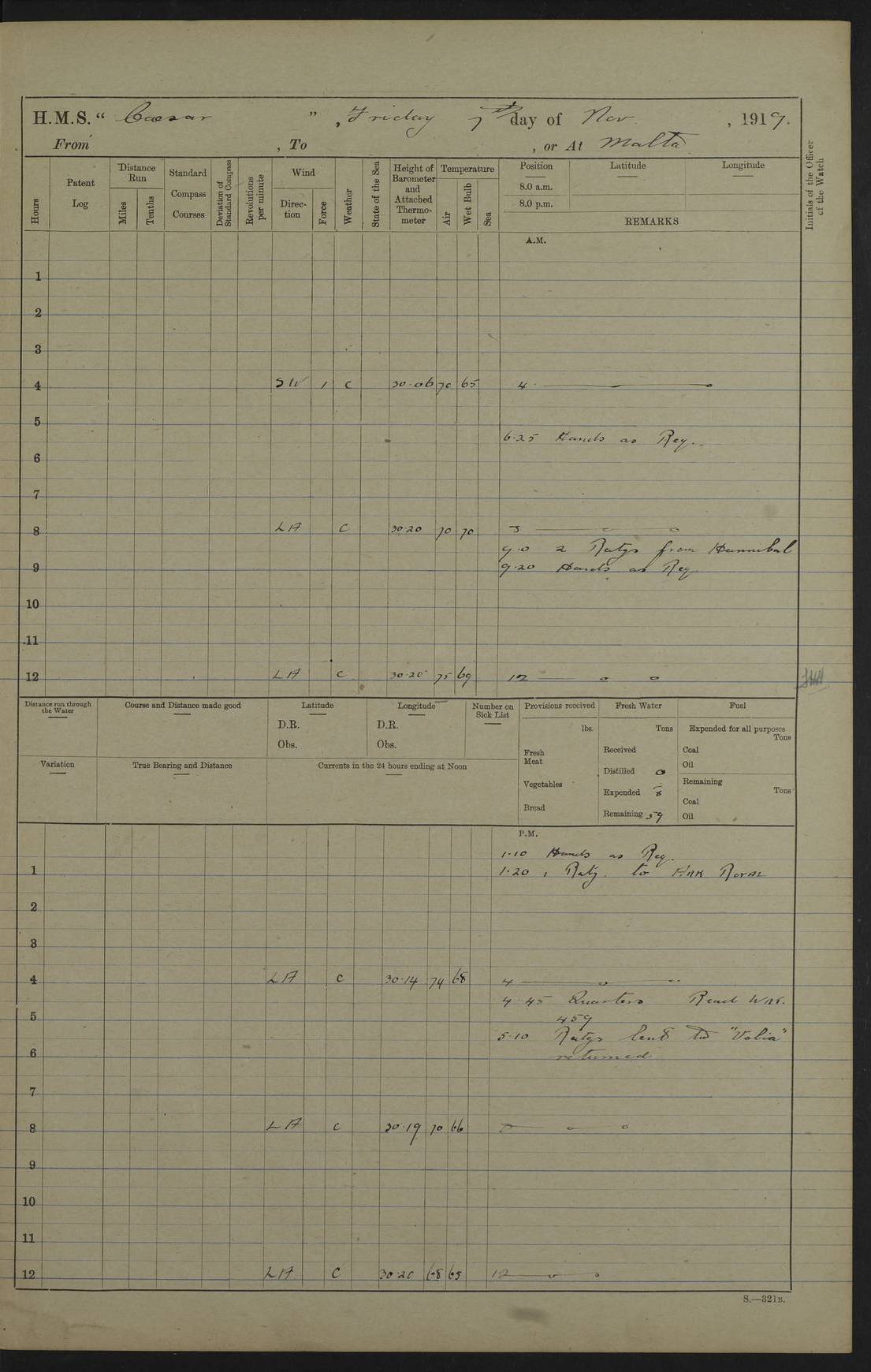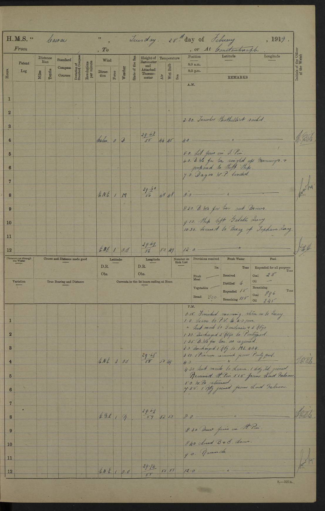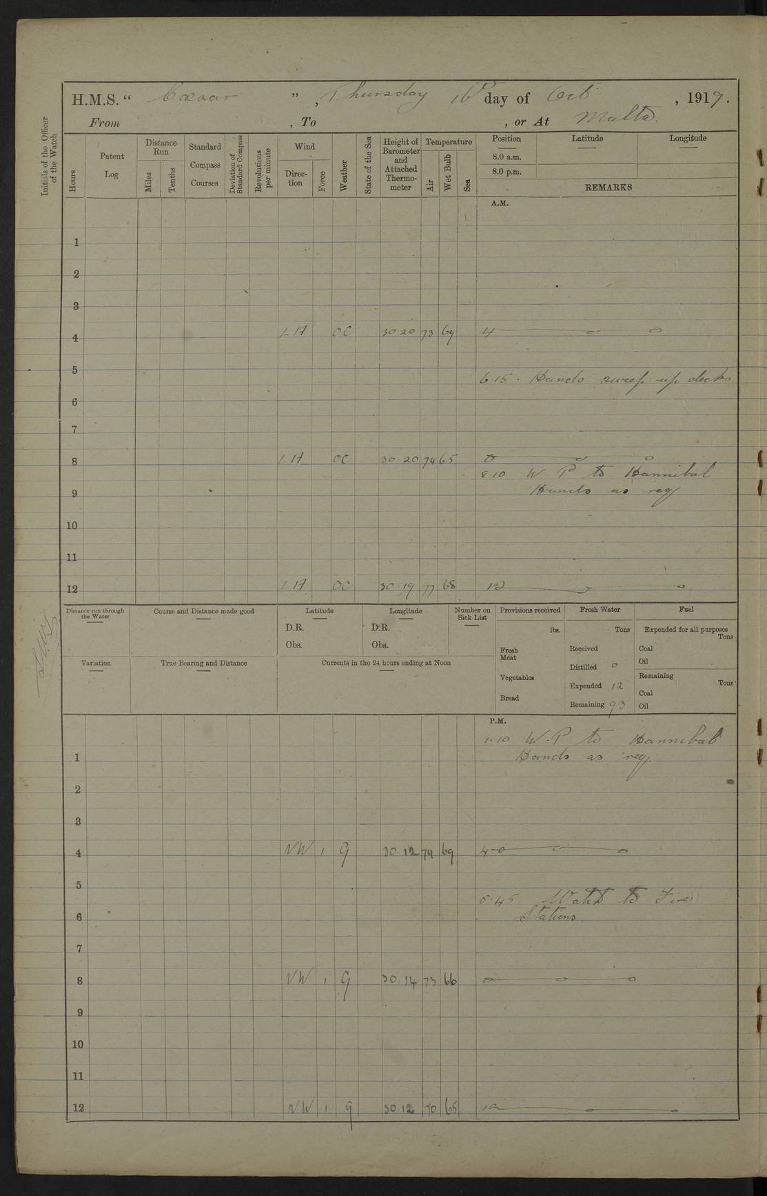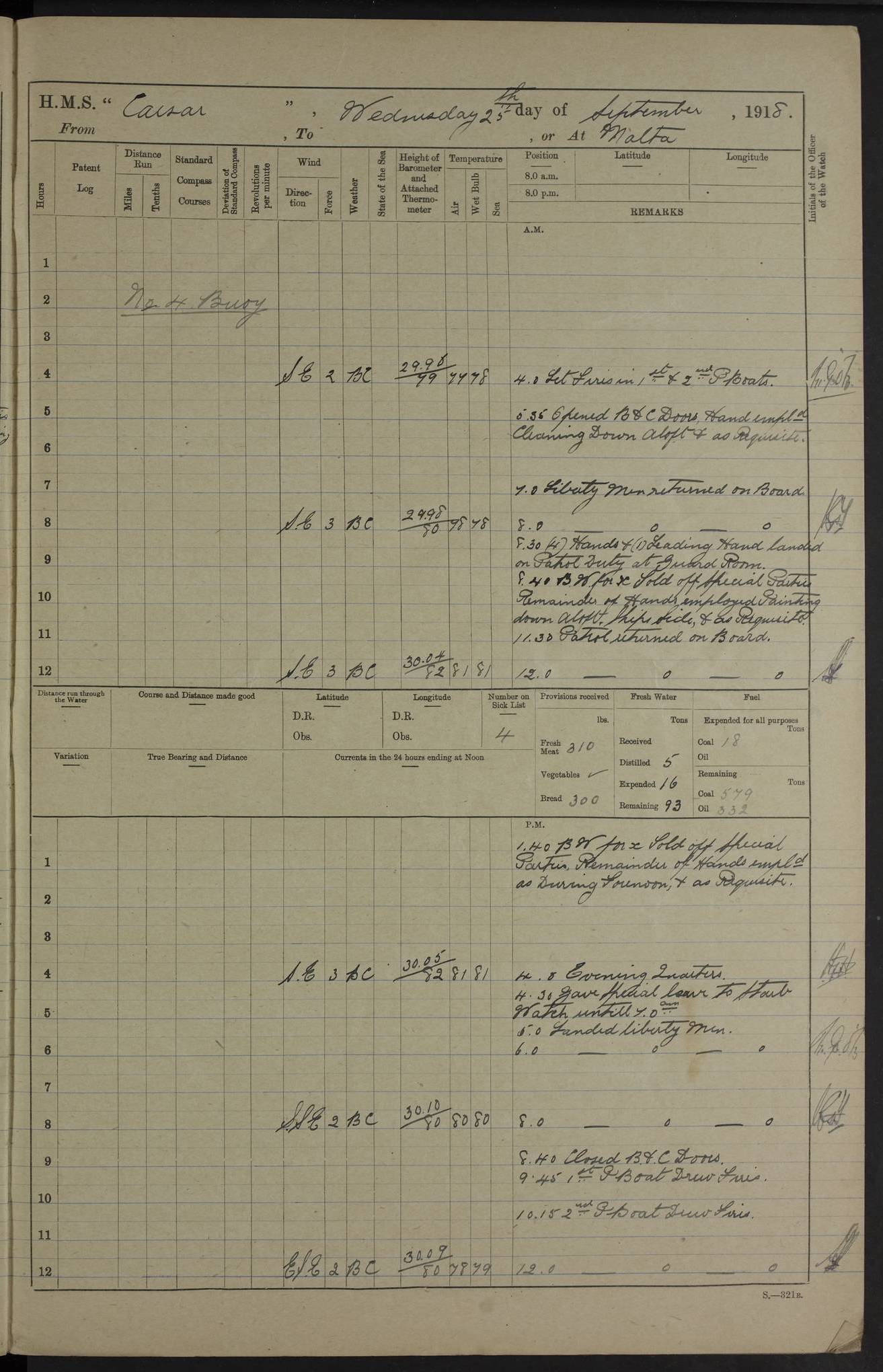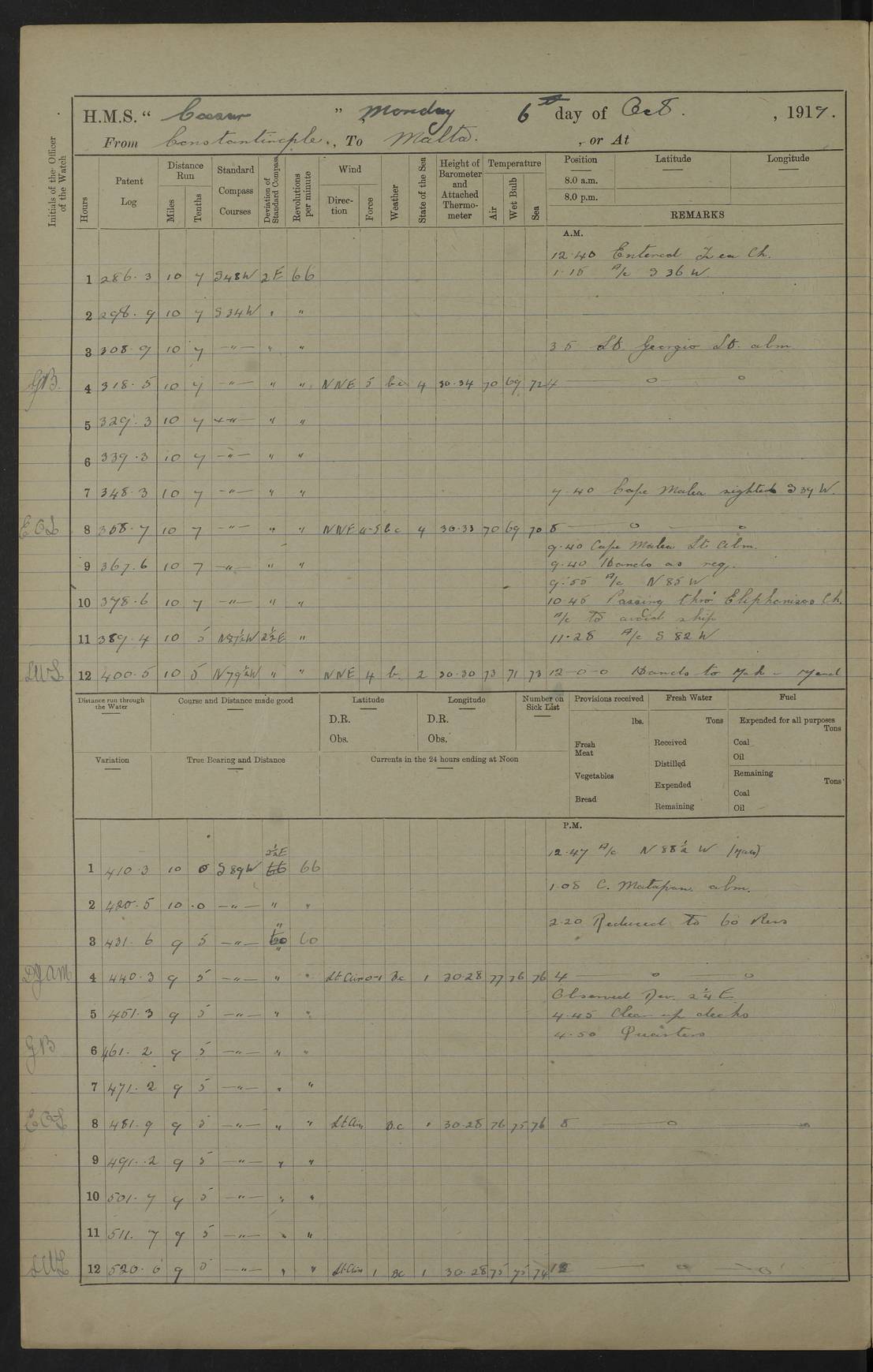 4edebb7b14d0450578000168: (https://s3.amazonaws.com:443/oldweather/ADM53-36589/0003_1.jpg) 1 November 1918 At Malta Lat 35.89, Long 14.52 [Somerset Wharf] 11.15am: Engineers Store Party returned on Board. 0.45pm: Paid Monthly Money. 1.0pm: Mr Goss, Gunner rejoined Ship from RN Hospital. 2.30pm: Gave Special leave to Port Watch untill 7.0am and Port Watch of Boys untill 6.0pm. Hands Made [sic] and Mend Clothes. 2.40pm: Landed liberty Men and Boys. 3.50pm: Provision Boat came alongside. 4.10pm: (4) Recovered Patients rejoined Ship from RN Hospital. 4.30pm: Landed liberty Men and Patrol. 6.0pm: Liberty Boys Returned on Board. 6.30pm: Canteen Party landed untill 10.0pm and Read Warrant No (24). 10.0pm: Canteen Party returned on Board. 11.50pm: Patrol returned on Board. [Provisions received: Fresh Meat 300 lbs, Vegetables 1000 lbs, Bread 450 lbs] 4edebb7c14d0450578000169: (https://s3.amazonaws.com:443/oldweather/ADM53-36589/0004_0.jpg) 2 November 1918 At Malta Lat 35.89, Long 14.52 [Hamilton Wharf] 7.15am: Shifted Berths from Somerset Wharf, to Hamilton Wharf. 8.0am: Tested life Buoys Correct. 8.45am: BW for x Told off Special Parties, Remainder of Hands employed as Requisite, and Landed Picket house Party. 9.10am: Held Court Martial on Board. 10.30am: Court Martial Finished. Noon: Picket House Party returned. 1.20pm: BW for x. Told off Special Parties. Remainder of Hands employed getting in Paymasters Stores and as Requisite. Lost overboard by accident Boat Hooks, Steel, Pattern (345), 2 in Number. 4.20pm: Hands to Fire Stations. 4.35pm: Read Warrant No 25 and gave Special leave to Starboard Watch untill 7.0am. 5.0pm: Landed liberty Men and Victualling Yard Lighter left Ship. 6.30pm: Canteen Party landed untill 10.0pm. [Provisions received: Fresh Meat 260 lbs, Bread 900 lbs] 4edebb7c14d045057800016a: (https://s3.amazonaws.com:443/oldweather/ADM53-36589/0004_1.jpg) 3 November 1918 At Malta Lat 35.89, Long 14.52 [Hamilton Wharf] 9.0am: Landed Church Parties, Wesleyans (14), Presbyterians (10). 9.30am: Divisions. 9.50am: Landed Roman Catholics (15). 10.10am: Discharged (5) Ratings to RN Hospital. 11.35am: All Church Parties returned on Board. 1.0pm: Gave Special leave to Port Watch untill 7.0am and Both Watches of Boys untill 5.30pm. 1.15pm: Landed liberty Men and Boys. 5.30pm: Liberty Boys returned on Board. 6.30pm: Canteen Party landed untill 10.0pm. 8.40pm: Closed B and C Doors. 10.0pm: Canteen Party returned on Board. [Number on sick list: 5] [Provisions received: Fresh Meat 280 lbs] 4edebb7c14d045057800016b: (https://s3.amazonaws.com:443/oldweather/ADM53-36589/0005_0.jpg) 4 November 1918 At Malta Lat 35.89, Long 14.52 [Hamilton Wharf] 6.50am: BW for x Told off Special Parties, remainder of Hands employed as Requisite. 7.0am: Liberty men returned on Board. 8.5am: Provision lighter came alongside. 8.10am: BW for x, Told off Special Parties, remainder of Hands employed Provisioning Ship and as requisite. 8.45am: Landed (1) Carpenter rating for Examination. 3.45pm: (2) Recovered Patients joined Ship from RN Hospital. 4.10pm: Received 8 Bags of Mails from Egmont, and Gave Special leave to Starboard Watch till 7.0am. 5.0pm: Landed Liberty Men and Patrol. 6.0pm: Hands employed getting in and stowing away Provisions. Midnight: Patrol returned on Board. [Weather fine, noon temperature 74F] 4edebb7c14d045057800016c: (https://s3.amazonaws.com:443/oldweather/ADM53-36589/0005_1.jpg) 5 November 1918 At Malta Lat 35.89, Long 14.52 [Hamilton Wharf] 6.45am: BW for x. Told off Special Parties. Remainder of Hands employed getting in and stowing away Provisions. 8.30am: Landed Hospital Party and Picket House Party. 11.0am: Landed (35) Rifles to Naval Ordinance for exchange. Noon: Picket House Party returned. 1.20pm: Landed (2) Ratings for Dental Treatment. 2.25pm: (35) Exchanged Rifles came on Board. 3.40pm: (2) Recovered Patients rejoined Ship from RN Hospital and disinfected Bedding. 4.0pm: Gave Special leave to Port Watch untill 7.0am. Starboard Watch employed stowing Provisions. 4.30pm: Landed Liberty men. Starboard Watch employed stowing away Provisions and Read Warrant No (26). [Provisions received: Fresh Meat 530 lbs, Bread 1000 lbs] 4edebb7c14d045057800016d: (https://s3.amazonaws.com:443/oldweather/ADM53-36589/0006_0.jpg) 6 November 1918 At Malta Lat 35.89, Long 14.52 [Hamilton Wharf] 6.50am: BW for x. Told off Special Parties, Remainder of Port Watch stowing Provisions, Starboard Watch drawing Quarter Deck Awning. 9.0am: Hands employed Provisioning Ship. 4.0pm: Gave Special leave to Starboard Watch untill 7.0am. 4.30pm: Landed liberty Men. Port Watch employed stowing away Provisions. 6.30pm: Canteen Party landed until 10.0pm. 10.0pm: Canteen Party returned on Board. [Number on sick list: 5] [Provisions received: Fresh Meat 250 lbs, Vegetables 1000 lbs, Bread 450 lbs] [Fuel Remaining: Coal 244 tons, Oil 332 tons] 4edebb7c14d045057800016e: (https://s3.amazonaws.com:443/oldweather/ADM53-36589/0006_1.jpg) 7 November 1918 At Malta Lat 35.89, Long 14.52 [No 4 Buoy] 6.30am: BW for x. Told off Special Parties. Remainder of Hands employed prepairing [preparing] Ship to Shift Berths, from Hamilton Wharf to No 4 Buoy. 7.0am: Liberty men returned on Board. 8.50am: Secured Ship to No 4 Buoy and Coal Lighters came alongside. 9.10am: Commenced Coaling Native labour. Hands employed Drawing Stores and as Requisite. 11.50am: Dockyard Parties returned. 1.40pm: BW for x Told off Special Parties, remainder of Hands employed as Requisite. 4.30pm: Gave Special leave to Port Watch untill 7.0am. 4.45pm: Landed liberty men and Patrol and Read Warrant No (27). 7.30pm: Completed Coaling (1481) Tons. 8.40pm: Watch employed sweeping down. 11.50pm: Patrol returned on Board. [Number on sick list: 6] [Provisions received: Fresh Meat 280 lbs, Bread 300 lbs] [Fuel Remaining: Coal 1716 tons, Oil 332 tons] 4edebb7c14d045057800016f: (https://s3.amazonaws.com:443/oldweather/ADM53-36589/0007_0.jpg) 8 November 1918 At Malta Lat 35.89, Long 