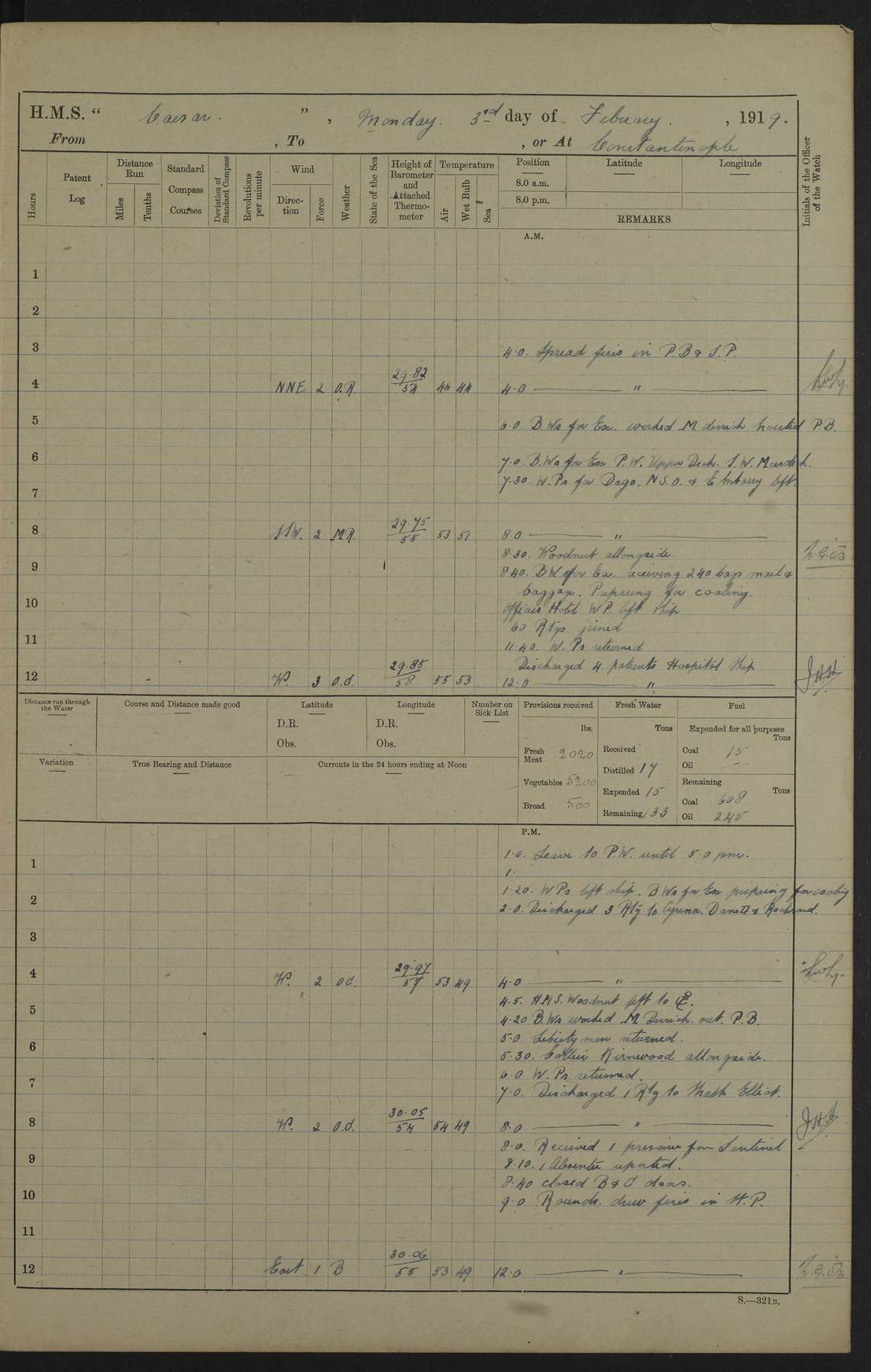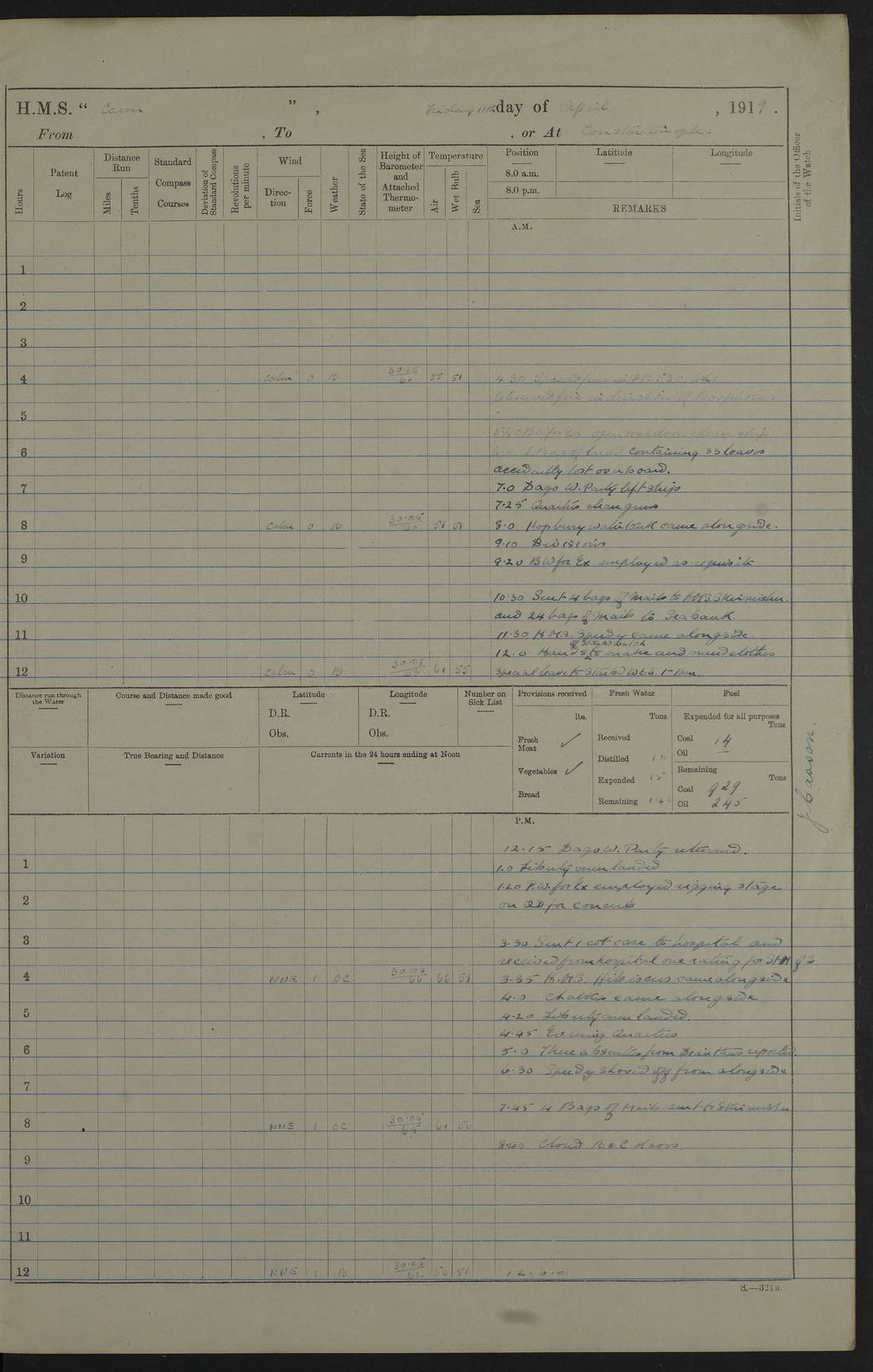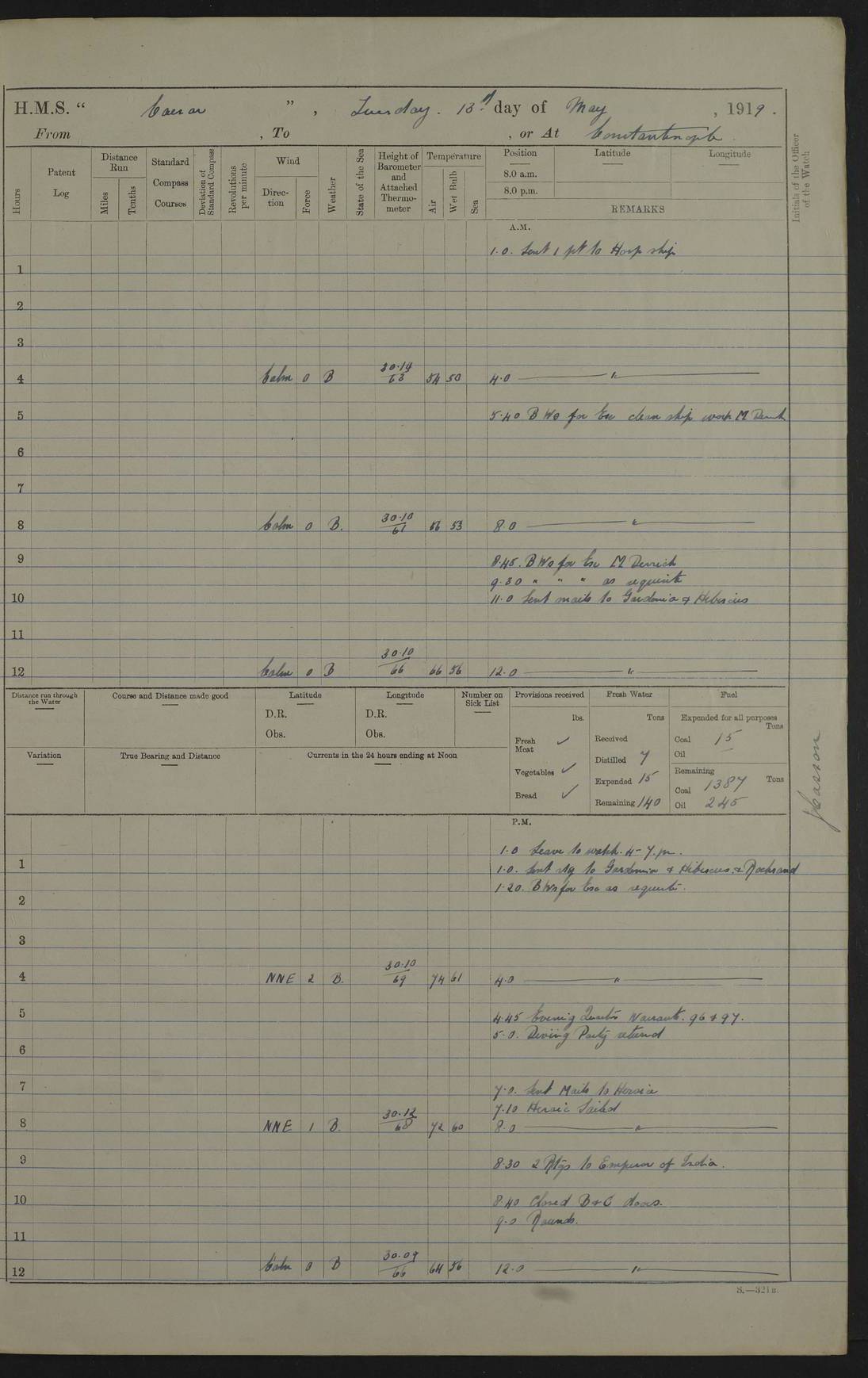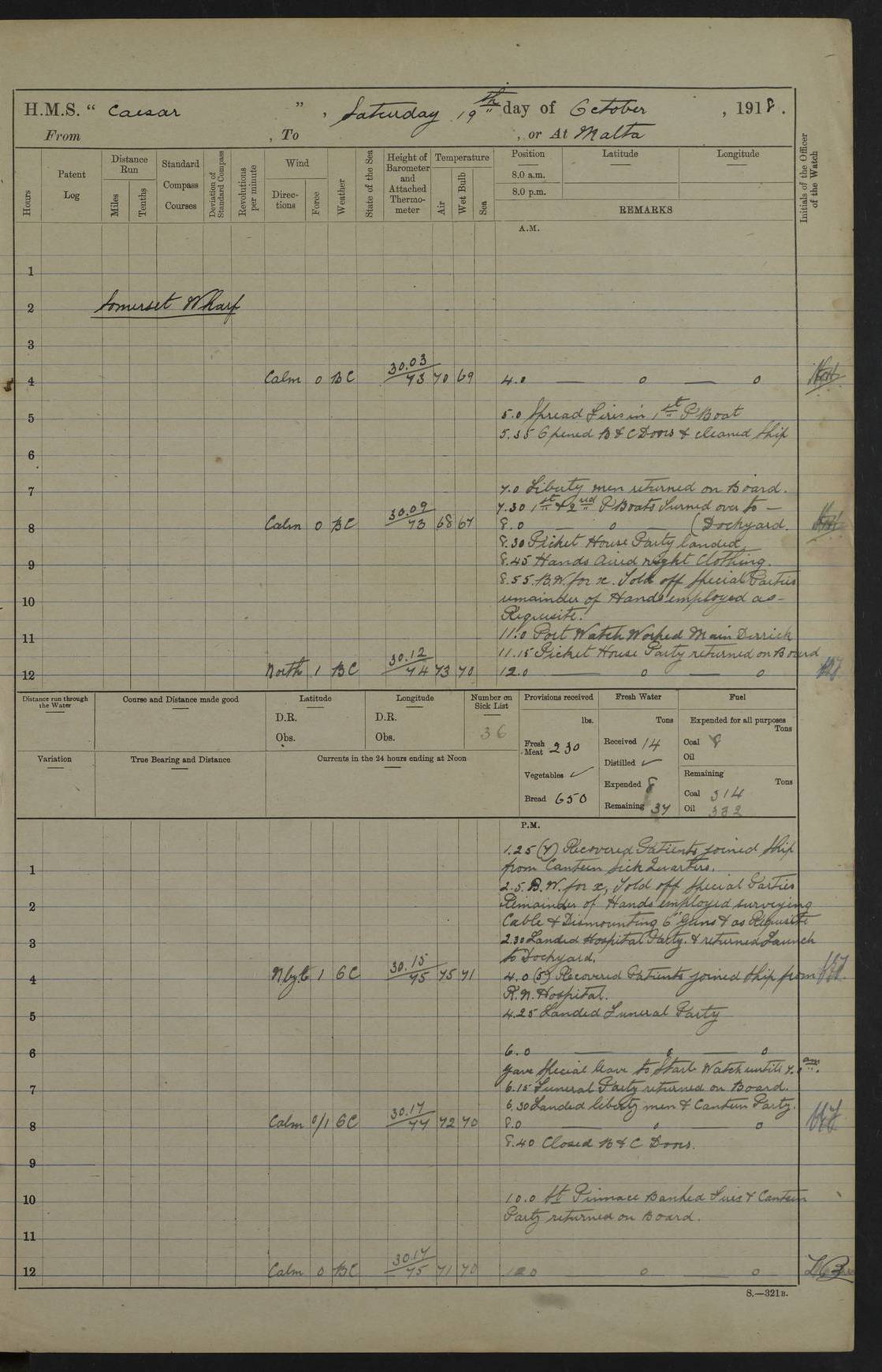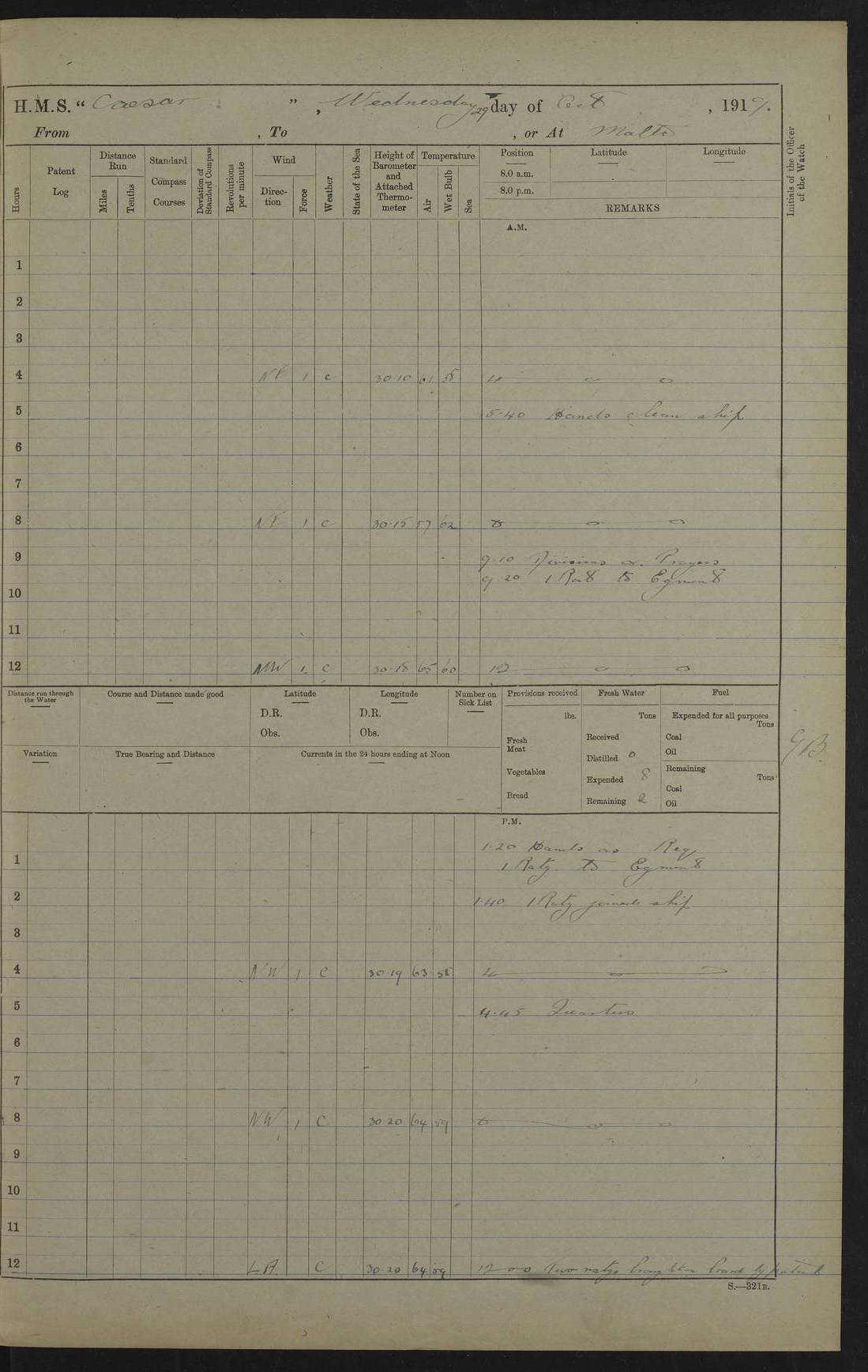 4edebb7b14d0450578000168: (https://s3.amazonaws.com:443/oldweather/ADM53-36589/0003_1.jpg) 1 November 1918 At Malta Lat 35.89, Long 14.52 [Somerset Wharf] 11.15am: Engineers Store Party returned on Board. 0.45pm: Paid Monthly Money. 1.0pm: Mr Goss, Gunner rejoined Ship from RN Hospital. 2.30pm: Gave Special leave to Port Watch untill 7.0am and Port Watch of Boys untill 6.0pm. Hands Made [sic] and Mend Clothes. 2.40pm: Landed liberty Men and Boys. 3.50pm: Provision Boat came alongside. 4.10pm: (4) Recovered Patients rejoined Ship from RN Hospital. 4.30pm: Landed liberty Men and Patrol. 6.0pm: Liberty Boys Returned on Board. 6.30pm: Canteen Party landed untill 10.0pm and Read Warrant No (24). 10.0pm: Canteen Party returned on Board. 11.50pm: Patrol returned on Board. [Provisions received: Fresh Meat 300 lbs, Vegetables 1000 lbs, Bread 450 lbs] 4edebb7c14d0450578000169: (https://s3.amazonaws.com:443/oldweather/ADM53-36589/0004_0.jpg) 2 November 1918 At Malta Lat 35.89, Long 14.52 [Hamilton Wharf] 7.15am: Shifted Berths from Somerset Wharf, to Hamilton Wharf. 8.0am: Tested life Buoys Correct. 8.45am: BW for x Told off Special Parties, Remainder of Hands employed as Requisite, and Landed Picket house Party. 9.10am: Held Court Martial on Board. 10.30am: Court Martial Finished. Noon: Picket House Party returned. 1.20pm: BW for x. Told off Special Parties. Remainder of Hands employed getting in Paymasters Stores and as Requisite. Lost overboard by accident Boat Hooks, Steel, Pattern (345), 2 in Number. 4.20pm: Hands to Fire Stations. 4.35pm: Read Warrant No 25 and gave Special leave to Starboard Watch untill 7.0am. 5.0pm: Landed liberty Men and Victualling Yard Lighter left Ship. 6.30pm: Canteen Party landed untill 10.0pm. [Provisions received: Fresh Meat 260 lbs, Bread 900 lbs] 4edebb7c14d045057800016a: (https://s3.amazonaws.com:443/oldweather/ADM53-36589/0004_1.jpg) 3 November 1918 At Malta Lat 35.89, Long 14.52 [Hamilton Wharf] 9.0am: Landed Church Parties, Wesleyans (14), Presbyterians (10). 9.30am: Divisions. 9.50am: Landed Roman Catholics (15). 10.10am: Discharged (5) Ratings to RN Hospital. 11.35am: All Church Parties returned on Board. 1.0pm: Gave Special leave to Port Watch untill 7.0am and Both Watches of Boys untill 5.30pm. 1.15pm: Landed liberty Men and Boys. 5.30pm: Liberty Boys returned on Board. 6.30pm: Canteen Party landed untill 10.0pm. 8.40pm: Closed B and C Doors. 10.0pm: Canteen Party returned on Board. [Number on sick list: 5] [Provisions received: Fresh Meat 280 lbs] 4edebb7c14d045057800016b: (https://s3.amazonaws.com:443/oldweather/ADM53-36589/0005_0.jpg) 4 November 1918 At Malta Lat 35.89, Long 14.52 [Hamilton Wharf] 6.50am: BW for x Told off Special Parties, remainder of Hands employed as Requisite. 7.0am: Liberty men returned on Board. 8.5am: Provision lighter came alongside. 8.10am: BW for x, Told off Special Parties, remainder of Hands employed Provisioning Ship and as requisite. 8.45am: Landed (1) Carpenter rating for Examination. 3.45pm: (2) Recovered Patients joined Ship from RN Hospital. 4.10pm: Received 8 Bags of Mails from Egmont, and Gave Special leave to Starboard Watch till 7.0am. 5.0pm: Landed Liberty Men and Patrol. 6.0pm: Hands employed getting in and stowing away Provisions. Midnight: Patrol returned on Board. [Weather fine, noon temperature 74F] 4edebb7c14d045057800016c: (https://s3.amazonaws.com:443/oldweather/ADM53-36589/0005_1.jpg) 5 November 1918 At Malta Lat 35.89, Long 14.52 [Hamilton Wharf] 6.45am: BW for x. Told off Special Parties. Remainder of Hands employed getting in and stowing away Provisions. 8.30am: Landed Hospital Party and Picket House Party. 11.0am: Landed (35) Rifles to Naval Ordinance for exchange. Noon: Picket House Party returned. 1.20pm: Landed (2) Ratings for Dental Treatment. 2.25pm: (35) Exchanged Rifles came on Board. 3.40pm: (2) Recovered Patients rejoined Ship from RN Hospital and disinfected Bedding. 4.0pm: Gave Special leave to Port Watch untill 7.0am. Starboard Watch employed stowing Provisions. 4.30pm: Landed Liberty men. Starboard Watch employed stowing away Provisions and Read Warrant No (26). [Provisions received: Fresh Meat 530 lbs, Bread 1000 lbs] 4edebb7c14d045057800016d: (https://s3.amazonaws.com:443/oldweather/ADM53-36589/0006_0.jpg) 6 November 1918 At Malta Lat 35.89, Long 14.52 [Hamilton Wharf] 6.50am: BW for x. Told off Special Parties, Remainder of Port Watch stowing Provisions, Starboard Watch drawing Quarter Deck Awning. 9.0am: Hands employed Provisioning Ship. 4.0pm: Gave Special leave to Starboard Watch untill 7.0am. 4.30pm: Landed liberty Men. Port Watch employed stowing away Provisions. 6.30pm: Canteen Party landed until 10.0pm. 10.0pm: Canteen Party returned on Board. [Number on sick list: 5] [Provisions received: Fresh Meat 250 lbs, Vegetables 1000 lbs, Bread 450 lbs] [Fuel Remaining: Coal 244 tons, Oil 332 tons] 4edebb7c14d045057800016e: (https://s3.amazonaws.com:443/oldweather/ADM53-36589/0006_1.jpg) 7 November 1918 At Malta Lat 35.89, Long 14.52 [No 4 Buoy] 6.30am: BW for x. Told off Special Parties. Remainder of Hands employed prepairing [preparing] Ship to Shift Berths, from Hamilton Wharf to No 4 Buoy. 7.0am: Liberty men returned on Board. 8.50am: Secured Ship to No 4 Buoy and Coal Lighters came alongside. 9.10am: Commenced Coaling Native labour. Hands employed Drawing Stores and as Requisite. 11.50am: Dockyard Parties returned. 1.40pm: BW for x Told off Special Parties, remainder of Hands employed as Requisite. 4.30pm: Gave Special leave to Port Watch untill 7.0am. 4.45pm: Landed liberty men and Patrol and Read Warrant No (27). 7.30pm: Completed Coaling (1481) Tons. 8.40pm: Watch employed sweeping down. 11.50pm: Patrol returned on Board. [Number on sick list: 6] [Provisions received: Fresh Meat 280 lbs, Bread 300 lbs] [Fuel Remaining: Coal 1716 tons, Oil 332 tons] 4edebb7c14d045057800016f: (https://s3.amazonaws.com:443/oldweather/ADM53-36589/0007_0.jpg) 8 November 1918 At Malta Lat 35.89, Long 