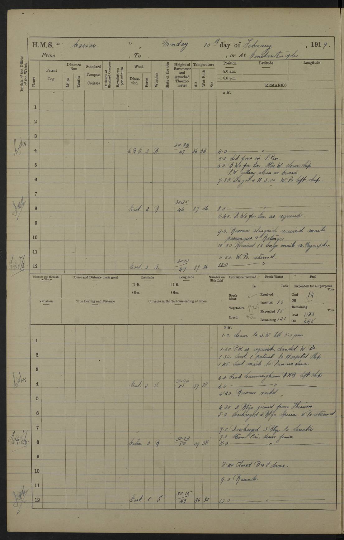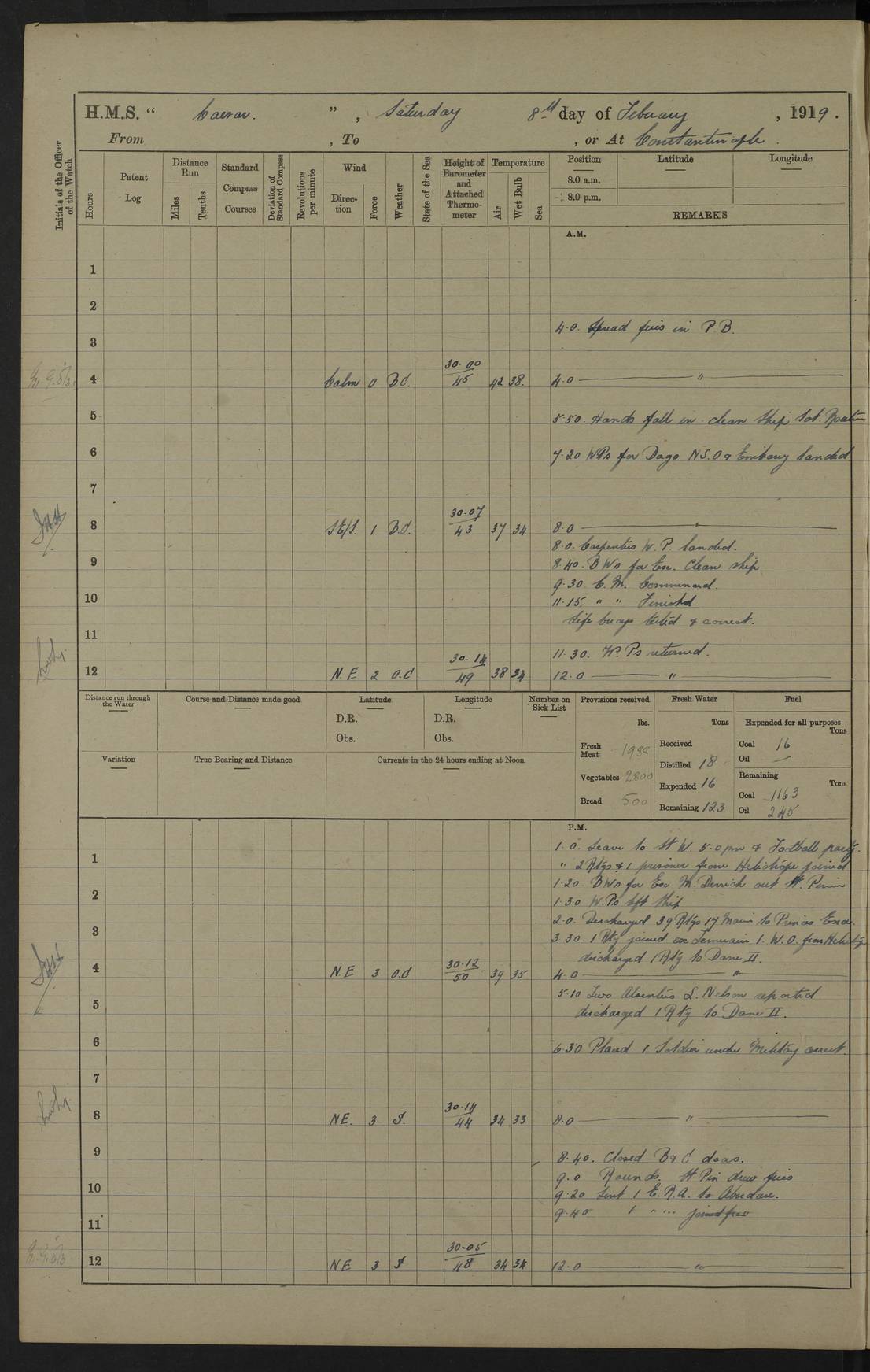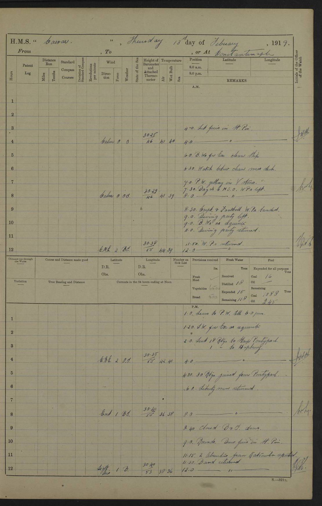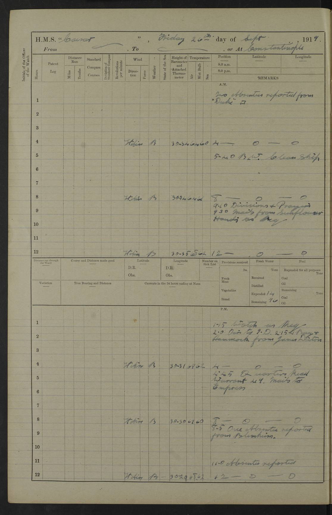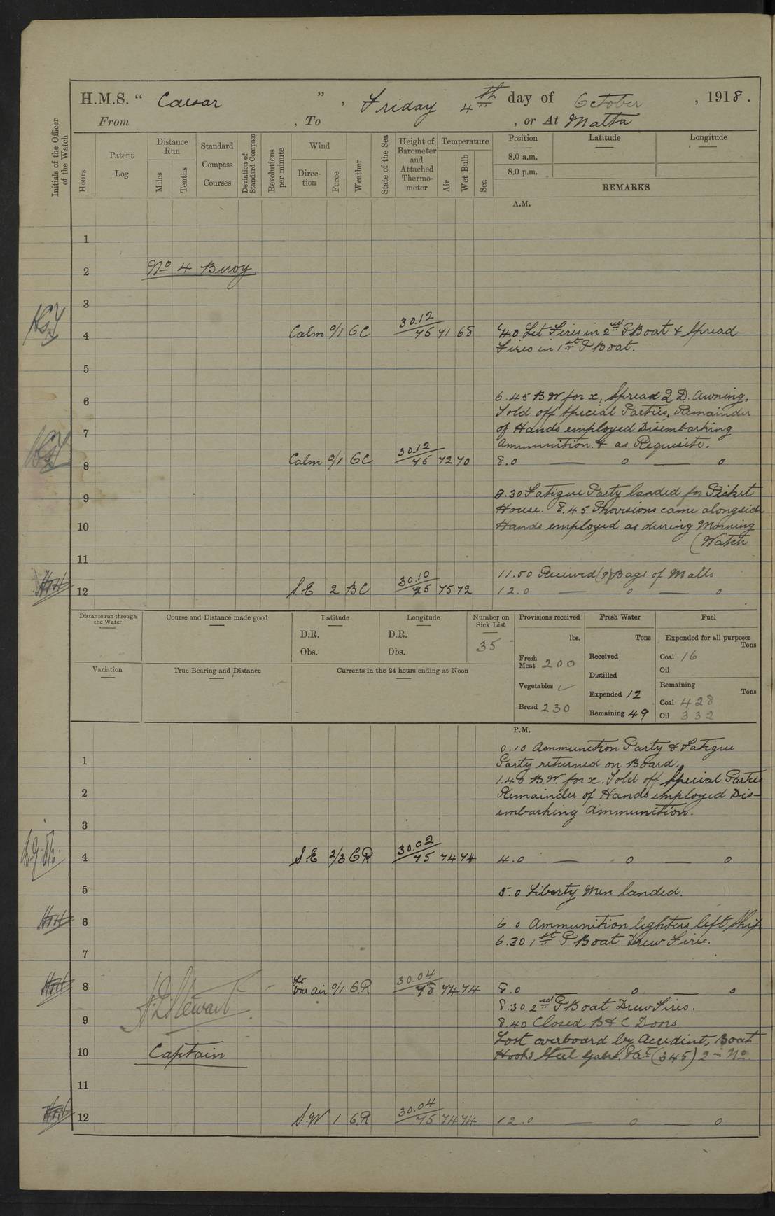 4edebb7b14d0450578000168: (https://s3.amazonaws.com:443/oldweather/ADM53-36589/0003_1.jpg) 1 November 1918 At Malta Lat 35.89, Long 14.52 [Somerset Wharf] 11.15am: Engineers Store Party returned on Board. 0.45pm: Paid Monthly Money. 1.0pm: Mr Goss, Gunner rejoined Ship from RN Hospital. 2.30pm: Gave Special leave to Port Watch untill 7.0am and Port Watch of Boys untill 6.0pm. Hands Made [sic] and Mend Clothes. 2.40pm: Landed liberty Men and Boys. 3.50pm: Provision Boat came alongside. 4.10pm: (4) Recovered Patients rejoined Ship from RN Hospital. 4.30pm: Landed liberty Men and Patrol. 6.0pm: Liberty Boys Returned on Board. 6.30pm: Canteen Party landed untill 10.0pm and Read Warrant No (24). 10.0pm: Canteen Party returned on Board. 11.50pm: Patrol returned on Board. [Provisions received: Fresh Meat 300 lbs, Vegetables 1000 lbs, Bread 450 lbs] 4edebb7c14d0450578000169: (https://s3.amazonaws.com:443/oldweather/ADM53-36589/0004_0.jpg) 2 November 1918 At Malta Lat 35.89, Long 14.52 [Hamilton Wharf] 7.15am: Shifted Berths from Somerset Wharf, to Hamilton Wharf. 8.0am: Tested life Buoys Correct. 8.45am: BW for x Told off Special Parties, Remainder of Hands employed as Requisite, and Landed Picket house Party. 9.10am: Held Court Martial on Board. 10.30am: Court Martial Finished. Noon: Picket House Party returned. 1.20pm: BW for x. Told off Special Parties. Remainder of Hands employed getting in Paymasters Stores and as Requisite. Lost overboard by accident Boat Hooks, Steel, Pattern (345), 2 in Number. 4.20pm: Hands to Fire Stations. 4.35pm: Read Warrant No 25 and gave Special leave to Starboard Watch untill 7.0am. 5.0pm: Landed liberty Men and Victualling Yard Lighter left Ship. 6.30pm: Canteen Party landed untill 10.0pm. [Provisions received: Fresh Meat 260 lbs, Bread 900 lbs] 4edebb7c14d045057800016a: (https://s3.amazonaws.com:443/oldweather/ADM53-36589/0004_1.jpg) 3 November 1918 At Malta Lat 35.89, Long 14.52 [Hamilton Wharf] 9.0am: Landed Church Parties, Wesleyans (14), Presbyterians (10). 9.30am: Divisions. 9.50am: Landed Roman Catholics (15). 10.10am: Discharged (5) Ratings to RN Hospital. 11.35am: All Church Parties returned on Board. 1.0pm: Gave Special leave to Port Watch untill 7.0am and Both Watches of Boys untill 5.30pm. 1.15pm: Landed liberty Men and Boys. 5.30pm: Liberty Boys returned on Board. 6.30pm: Canteen Party landed untill 10.0pm. 8.40pm: Closed B and C Doors. 10.0pm: Canteen Party returned on Board. [Number on sick list: 5] [Provisions received: Fresh Meat 280 lbs] 4edebb7c14d045057800016b: (https://s3.amazonaws.com:443/oldweather/ADM53-36589/0005_0.jpg) 4 November 1918 At Malta Lat 35.89, Long 14.52 [Hamilton Wharf] 6.50am: BW for x Told off Special Parties, remainder of Hands employed as Requisite. 7.0am: Liberty men returned on Board. 8.5am: Provision lighter came alongside. 8.10am: BW for x, Told off Special Parties, remainder of Hands employed Provisioning Ship and as requisite. 8.45am: Landed (1) Carpenter rating for Examination. 3.45pm: (2) Recovered Patients joined Ship from RN Hospital. 4.10pm: Received 8 Bags of Mails from Egmont, and Gave Special leave to Starboard Watch till 7.0am. 5.0pm: Landed Liberty Men and Patrol. 6.0pm: Hands employed getting in and stowing away Provisions. Midnight: Patrol returned on Board. [Weather fine, noon temperature 74F] 4edebb7c14d045057800016c: (https://s3.amazonaws.com:443/oldweather/ADM53-36589/0005_1.jpg) 5 November 1918 At Malta Lat 35.89, Long 14.52 [Hamilton Wharf] 6.45am: BW for x. Told off Special Parties. Remainder of Hands employed getting in and stowing away Provisions. 8.30am: Landed Hospital Party and Picket House Party. 11.0am: Landed (35) Rifles to Naval Ordinance for exchange. Noon: Picket House Party returned. 1.20pm: Landed (2) Ratings for Dental Treatment. 2.25pm: (35) Exchanged Rifles came on Board. 3.40pm: (2) Recovered Patients rejoined Ship from RN Hospital and disinfected Bedding. 4.0pm: Gave Special leave to Port Watch untill 7.0am. Starboard Watch employed stowing Provisions. 4.30pm: Landed Liberty men. Starboard Watch employed stowing away Provisions and Read Warrant No (26). [Provisions received: Fresh Meat 530 lbs, Bread 1000 lbs] 4edebb7c14d045057800016d: (https://s3.amazonaws.com:443/oldweather/ADM53-36589/0006_0.jpg) 6 November 1918 At Malta Lat 35.89, Long 14.52 [Hamilton Wharf] 6.50am: BW for x. Told off Special Parties, Remainder of Port Watch stowing Provisions, Starboard Watch drawing Quarter Deck Awning. 9.0am: Hands employed Provisioning Ship. 4.0pm: Gave Special leave to Starboard Watch untill 7.0am. 4.30pm: Landed liberty Men. Port Watch employed stowing away Provisions. 6.30pm: Canteen Party landed until 10.0pm. 10.0pm: Canteen Party returned on Board. [Number on sick list: 5] [Provisions received: Fresh Meat 250 lbs, Vegetables 1000 lbs, Bread 450 lbs] [Fuel Remaining: Coal 244 tons, Oil 332 tons] 4edebb7c14d045057800016e: (https://s3.amazonaws.com:443/oldweather/ADM53-36589/0006_1.jpg) 7 November 1918 At Malta Lat 35.89, Long 14.52 [No 4 Buoy] 6.30am: BW for x. Told off Special Parties. Remainder of Hands employed prepairing [preparing] Ship to Shift Berths, from Hamilton Wharf to No 4 Buoy. 7.0am: Liberty men returned on Board. 8.50am: Secured Ship to No 4 Buoy and Coal Lighters came alongside. 9.10am: Commenced Coaling Native labour. Hands employed Drawing Stores and as Requisite. 11.50am: Dockyard Parties returned. 1.40pm: BW for x Told off Special Parties, remainder of Hands employed as Requisite. 4.30pm: Gave Special leave to Port Watch untill 7.0am. 4.45pm: Landed liberty men and Patrol and Read Warrant No (27). 7.30pm: Completed Coaling (1481) Tons. 8.40pm: Watch employed sweeping down. 11.50pm: Patrol returned on Board. [Number on sick list: 6] [Provisions received: Fresh Meat 280 lbs, Bread 300 lbs] [Fuel Remaining: Coal 1716 tons, Oil 332 tons] 4edebb7c14d045057800016f: (https://s3.amazonaws.com:443/oldweather/ADM53-36589/0007_0.jpg) 8 November 1918 At Malta Lat 35.89, Long 