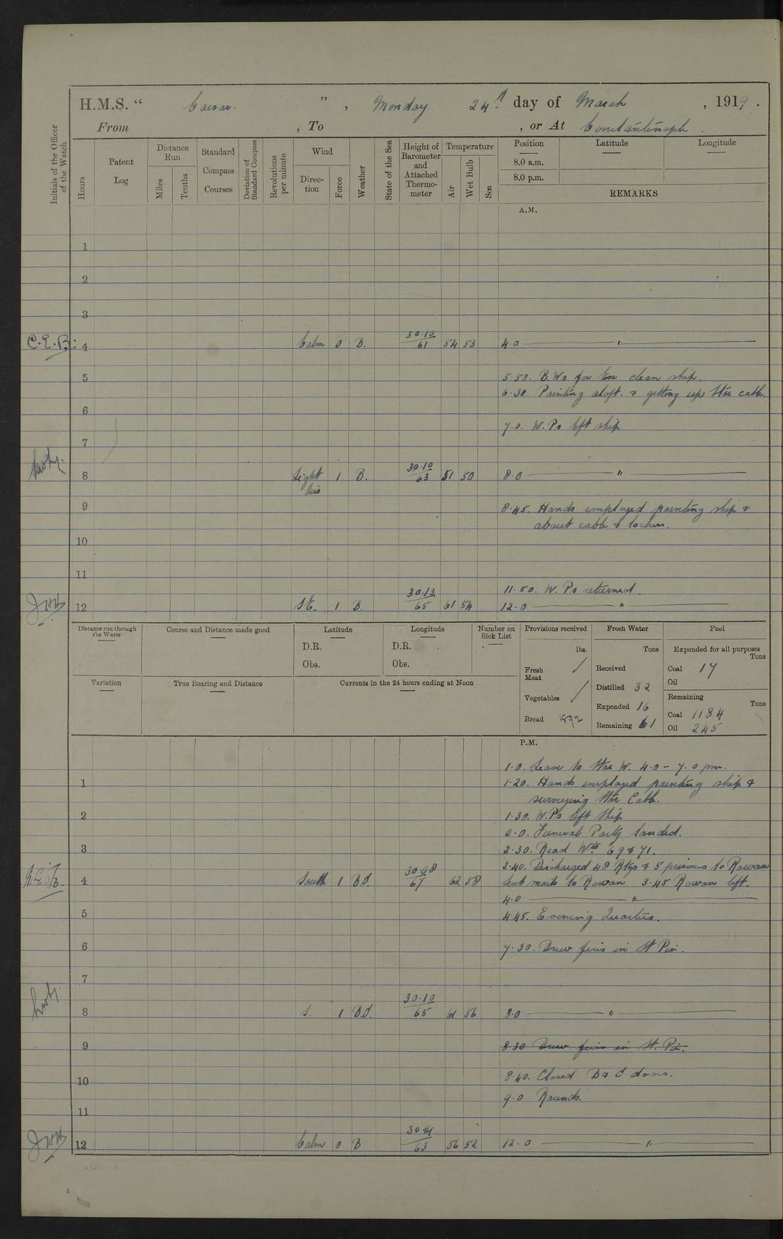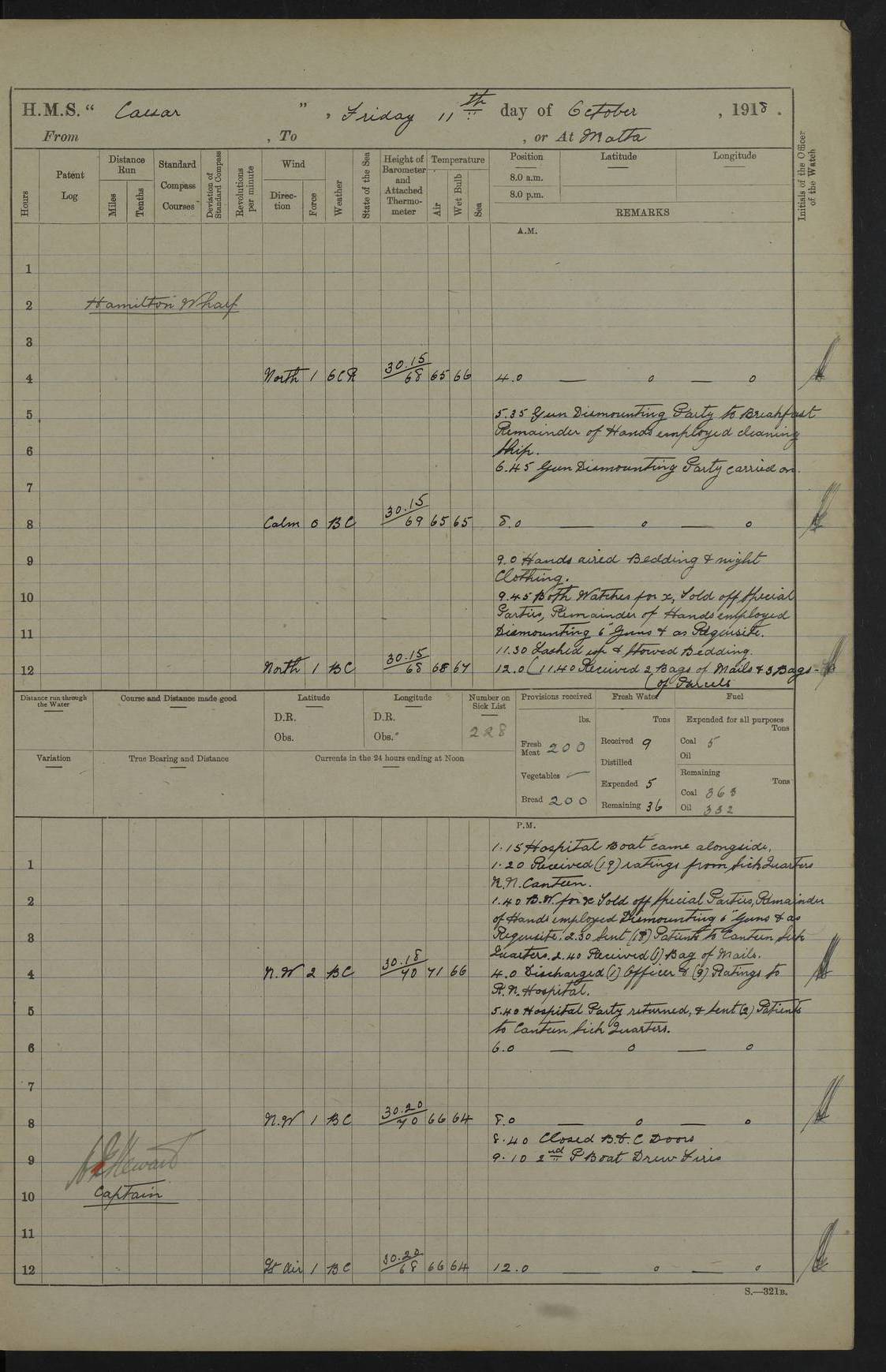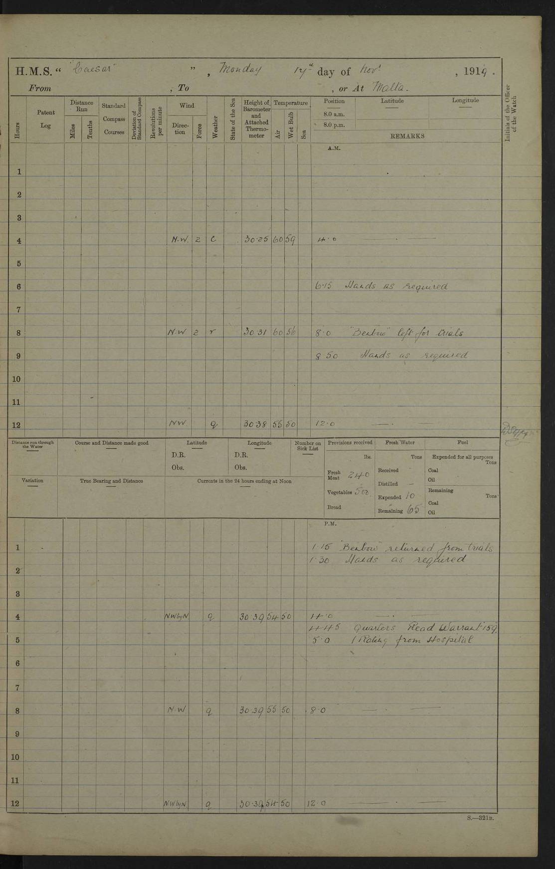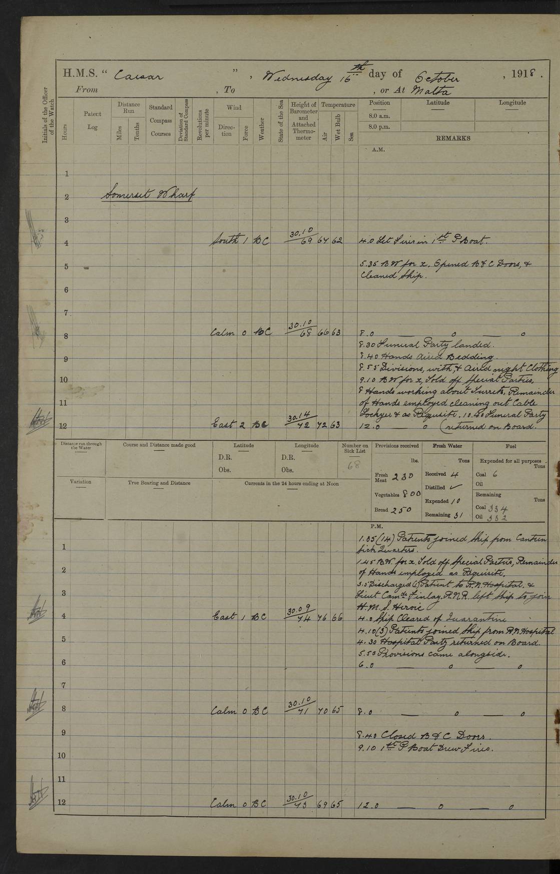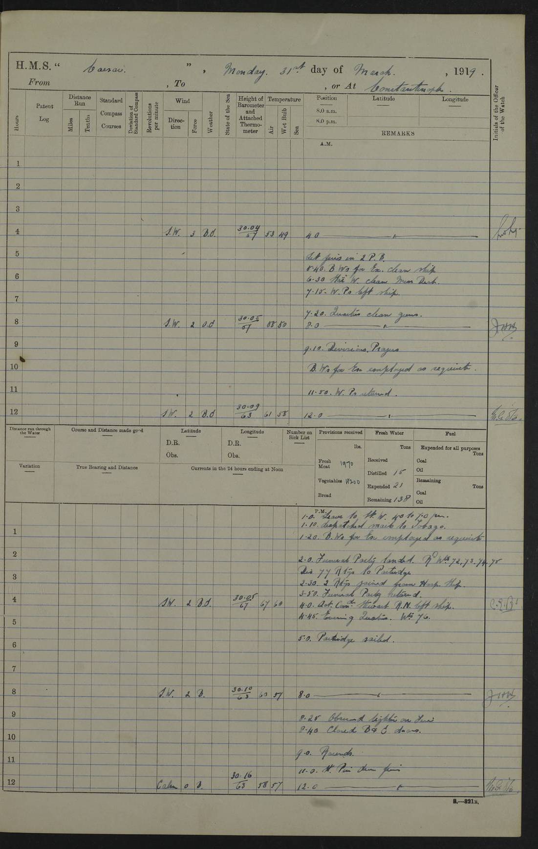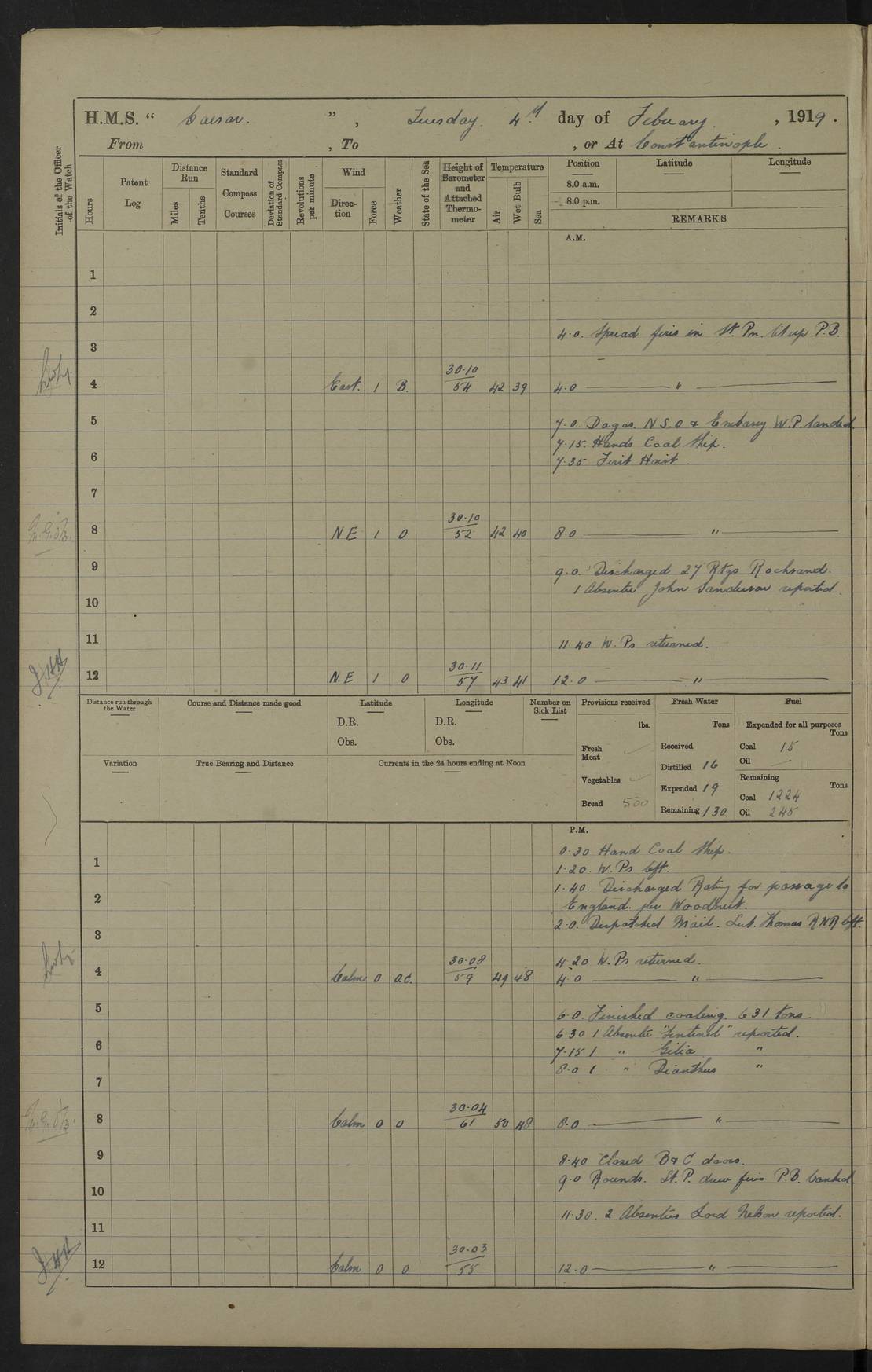 4edebb7b14d0450578000168: (https://s3.amazonaws.com:443/oldweather/ADM53-36589/0003_1.jpg) 1 November 1918 At Malta Lat 35.89, Long 14.52 [Somerset Wharf] 11.15am: Engineers Store Party returned on Board. 0.45pm: Paid Monthly Money. 1.0pm: Mr Goss, Gunner rejoined Ship from RN Hospital. 2.30pm: Gave Special leave to Port Watch untill 7.0am and Port Watch of Boys untill 6.0pm. Hands Made [sic] and Mend Clothes. 2.40pm: Landed liberty Men and Boys. 3.50pm: Provision Boat came alongside. 4.10pm: (4) Recovered Patients rejoined Ship from RN Hospital. 4.30pm: Landed liberty Men and Patrol. 6.0pm: Liberty Boys Returned on Board. 6.30pm: Canteen Party landed untill 10.0pm and Read Warrant No (24). 10.0pm: Canteen Party returned on Board. 11.50pm: Patrol returned on Board. [Provisions received: Fresh Meat 300 lbs, Vegetables 1000 lbs, Bread 450 lbs] 4edebb7c14d0450578000169: (https://s3.amazonaws.com:443/oldweather/ADM53-36589/0004_0.jpg) 2 November 1918 At Malta Lat 35.89, Long 14.52 [Hamilton Wharf] 7.15am: Shifted Berths from Somerset Wharf, to Hamilton Wharf. 8.0am: Tested life Buoys Correct. 8.45am: BW for x Told off Special Parties, Remainder of Hands employed as Requisite, and Landed Picket house Party. 9.10am: Held Court Martial on Board. 10.30am: Court Martial Finished. Noon: Picket House Party returned. 1.20pm: BW for x. Told off Special Parties. Remainder of Hands employed getting in Paymasters Stores and as Requisite. Lost overboard by accident Boat Hooks, Steel, Pattern (345), 2 in Number. 4.20pm: Hands to Fire Stations. 4.35pm: Read Warrant No 25 and gave Special leave to Starboard Watch untill 7.0am. 5.0pm: Landed liberty Men and Victualling Yard Lighter left Ship. 6.30pm: Canteen Party landed untill 10.0pm. [Provisions received: Fresh Meat 260 lbs, Bread 900 lbs] 4edebb7c14d045057800016a: (https://s3.amazonaws.com:443/oldweather/ADM53-36589/0004_1.jpg) 3 November 1918 At Malta Lat 35.89, Long 14.52 [Hamilton Wharf] 9.0am: Landed Church Parties, Wesleyans (14), Presbyterians (10). 9.30am: Divisions. 9.50am: Landed Roman Catholics (15). 10.10am: Discharged (5) Ratings to RN Hospital. 11.35am: All Church Parties returned on Board. 1.0pm: Gave Special leave to Port Watch untill 7.0am and Both Watches of Boys untill 5.30pm. 1.15pm: Landed liberty Men and Boys. 5.30pm: Liberty Boys returned on Board. 6.30pm: Canteen Party landed untill 10.0pm. 8.40pm: Closed B and C Doors. 10.0pm: Canteen Party returned on Board. [Number on sick list: 5] [Provisions received: Fresh Meat 280 lbs] 4edebb7c14d045057800016b: (https://s3.amazonaws.com:443/oldweather/ADM53-36589/0005_0.jpg) 4 November 1918 At Malta Lat 35.89, Long 14.52 [Hamilton Wharf] 6.50am: BW for x Told off Special Parties, remainder of Hands employed as Requisite. 7.0am: Liberty men returned on Board. 8.5am: Provision lighter came alongside. 8.10am: BW for x, Told off Special Parties, remainder of Hands employed Provisioning Ship and as requisite. 8.45am: Landed (1) Carpenter rating for Examination. 3.45pm: (2) Recovered Patients joined Ship from RN Hospital. 4.10pm: Received 8 Bags of Mails from Egmont, and Gave Special leave to Starboard Watch till 7.0am. 5.0pm: Landed Liberty Men and Patrol. 6.0pm: Hands employed getting in and stowing away Provisions. Midnight: Patrol returned on Board. [Weather fine, noon temperature 74F] 4edebb7c14d045057800016c: (https://s3.amazonaws.com:443/oldweather/ADM53-36589/0005_1.jpg) 5 November 1918 At Malta Lat 35.89, Long 14.52 [Hamilton Wharf] 6.45am: BW for x. Told off Special Parties. Remainder of Hands employed getting in and stowing away Provisions. 8.30am: Landed Hospital Party and Picket House Party. 11.0am: Landed (35) Rifles to Naval Ordinance for exchange. Noon: Picket House Party returned. 1.20pm: Landed (2) Ratings for Dental Treatment. 2.25pm: (35) Exchanged Rifles came on Board. 3.40pm: (2) Recovered Patients rejoined Ship from RN Hospital and disinfected Bedding. 4.0pm: Gave Special leave to Port Watch untill 7.0am. Starboard Watch employed stowing Provisions. 4.30pm: Landed Liberty men. Starboard Watch employed stowing away Provisions and Read Warrant No (26). [Provisions received: Fresh Meat 530 lbs, Bread 1000 lbs] 4edebb7c14d045057800016d: (https://s3.amazonaws.com:443/oldweather/ADM53-36589/0006_0.jpg) 6 November 1918 At Malta Lat 35.89, Long 14.52 [Hamilton Wharf] 6.50am: BW for x. Told off Special Parties, Remainder of Port Watch stowing Provisions, Starboard Watch drawing Quarter Deck Awning. 9.0am: Hands employed Provisioning Ship. 4.0pm: Gave Special leave to Starboard Watch untill 7.0am. 4.30pm: Landed liberty Men. Port Watch employed stowing away Provisions. 6.30pm: Canteen Party landed until 10.0pm. 10.0pm: Canteen Party returned on Board. [Number on sick list: 5] [Provisions received: Fresh Meat 250 lbs, Vegetables 1000 lbs, Bread 450 lbs] [Fuel Remaining: Coal 244 tons, Oil 332 tons] 4edebb7c14d045057800016e: (https://s3.amazonaws.com:443/oldweather/ADM53-36589/0006_1.jpg) 7 November 1918 At Malta Lat 35.89, Long 14.52 [No 4 Buoy] 6.30am: BW for x. Told off Special Parties. Remainder of Hands employed prepairing [preparing] Ship to Shift Berths, from Hamilton Wharf to No 4 Buoy. 7.0am: Liberty men returned on Board. 8.50am: Secured Ship to No 4 Buoy and Coal Lighters came alongside. 9.10am: Commenced Coaling Native labour. Hands employed Drawing Stores and as Requisite. 11.50am: Dockyard Parties returned. 1.40pm: BW for x Told off Special Parties, remainder of Hands employed as Requisite. 4.30pm: Gave Special leave to Port Watch untill 7.0am. 4.45pm: Landed liberty men and Patrol and Read Warrant No (27). 7.30pm: Completed Coaling (1481) Tons. 8.40pm: Watch employed sweeping down. 11.50pm: Patrol returned on Board. [Number on sick list: 6] [Provisions received: Fresh Meat 280 lbs, Bread 300 lbs] [Fuel Remaining: Coal 1716 tons, Oil 332 tons] 4edebb7c14d045057800016f: (https://s3.amazonaws.com:443/oldweather/ADM53-36589/0007_0.jpg) 8 November 1918 At Malta Lat 35.89, Long 