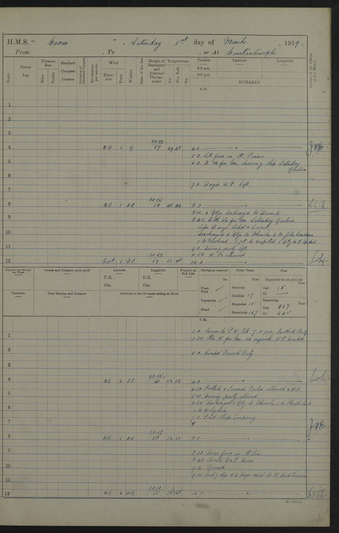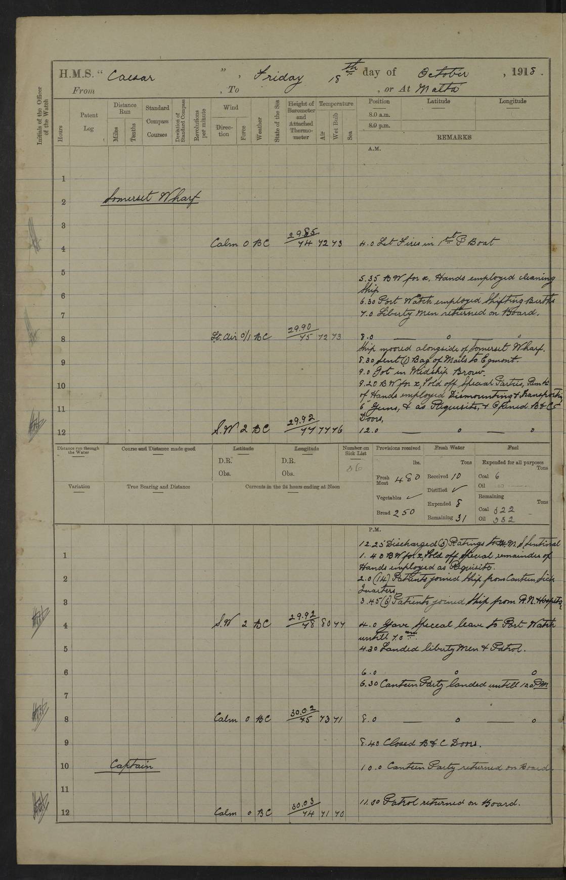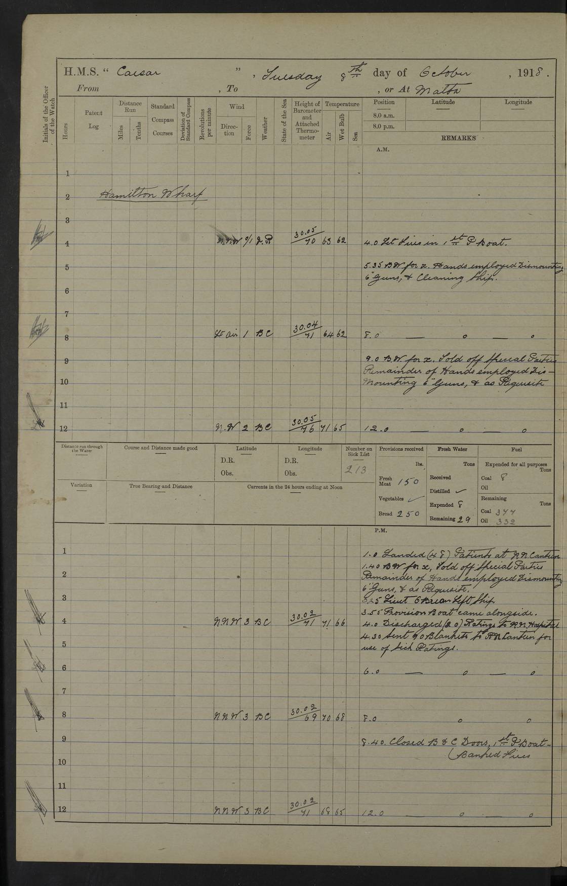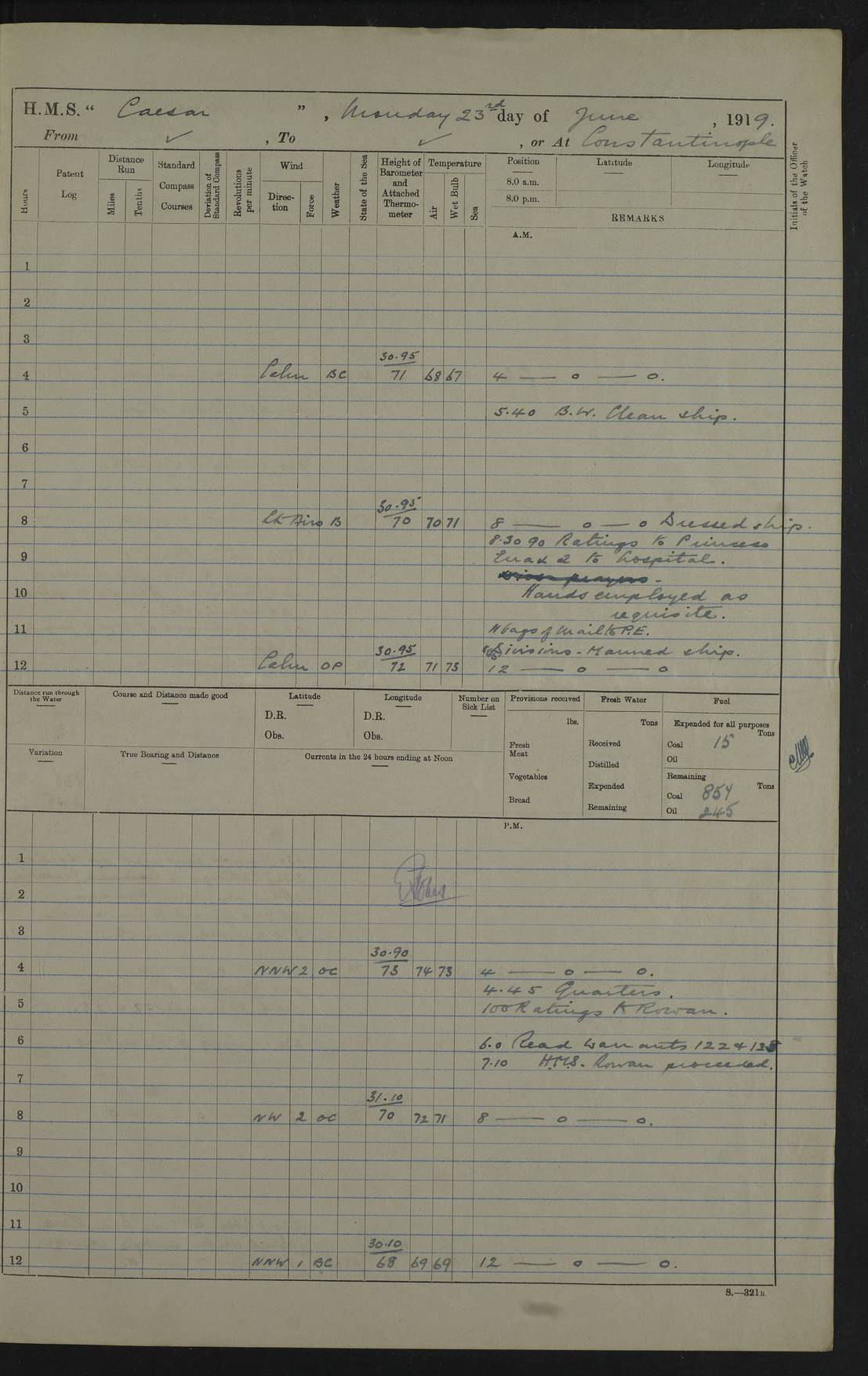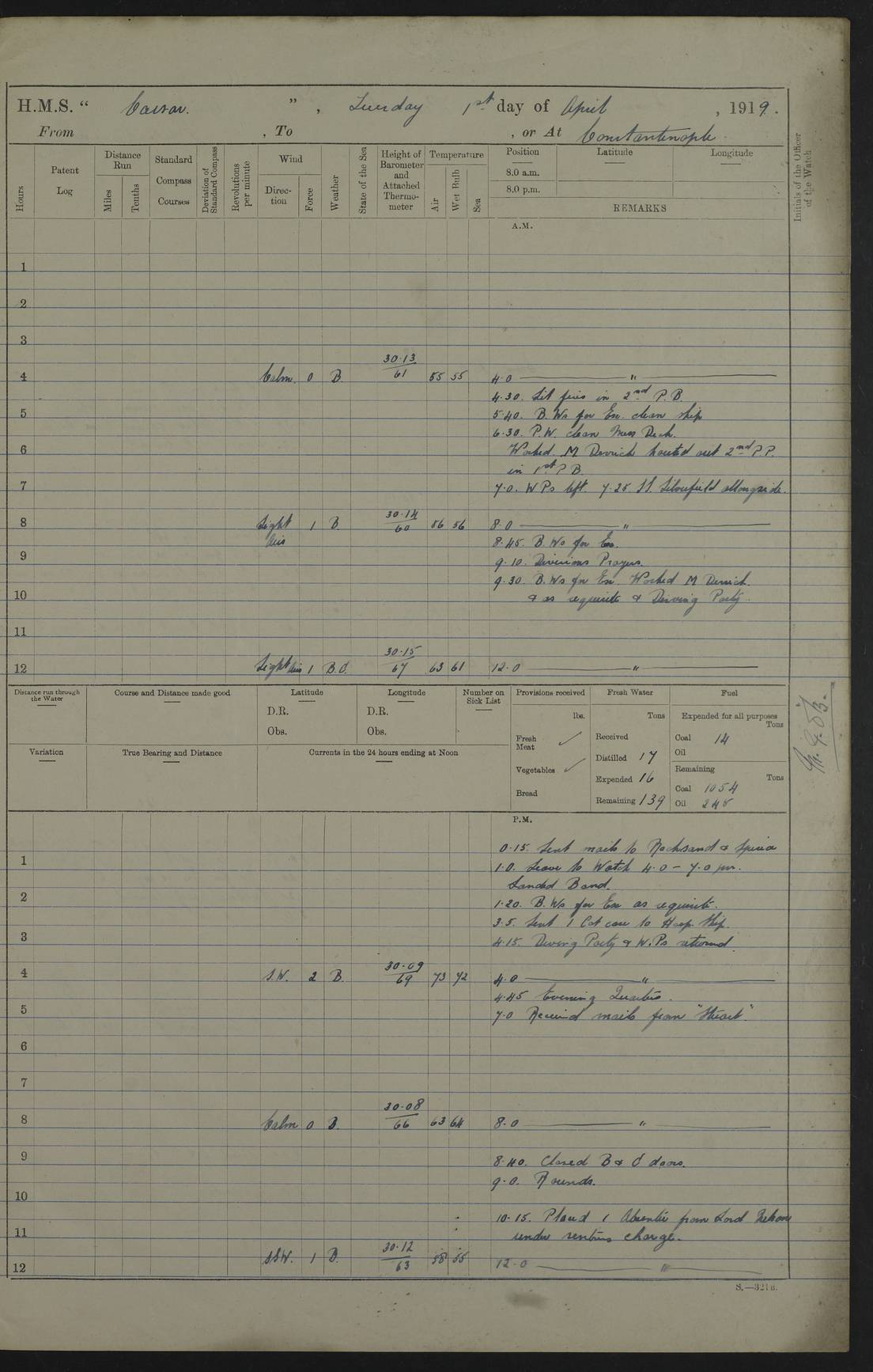 4edebb7b14d0450578000168: (https://s3.amazonaws.com:443/oldweather/ADM53-36589/0003_1.jpg) 1 November 1918 At Malta Lat 35.89, Long 14.52 [Somerset Wharf] 11.15am: Engineers Store Party returned on Board. 0.45pm: Paid Monthly Money. 1.0pm: Mr Goss, Gunner rejoined Ship from RN Hospital. 2.30pm: Gave Special leave to Port Watch untill 7.0am and Port Watch of Boys untill 6.0pm. Hands Made [sic] and Mend Clothes. 2.40pm: Landed liberty Men and Boys. 3.50pm: Provision Boat came alongside. 4.10pm: (4) Recovered Patients rejoined Ship from RN Hospital. 4.30pm: Landed liberty Men and Patrol. 6.0pm: Liberty Boys Returned on Board. 6.30pm: Canteen Party landed untill 10.0pm and Read Warrant No (24). 10.0pm: Canteen Party returned on Board. 11.50pm: Patrol returned on Board. [Provisions received: Fresh Meat 300 lbs, Vegetables 1000 lbs, Bread 450 lbs] 4edebb7c14d0450578000169: (https://s3.amazonaws.com:443/oldweather/ADM53-36589/0004_0.jpg) 2 November 1918 At Malta Lat 35.89, Long 14.52 [Hamilton Wharf] 7.15am: Shifted Berths from Somerset Wharf, to Hamilton Wharf. 8.0am: Tested life Buoys Correct. 8.45am: BW for x Told off Special Parties, Remainder of Hands employed as Requisite, and Landed Picket house Party. 9.10am: Held Court Martial on Board. 10.30am: Court Martial Finished. Noon: Picket House Party returned. 1.20pm: BW for x. Told off Special Parties. Remainder of Hands employed getting in Paymasters Stores and as Requisite. Lost overboard by accident Boat Hooks, Steel, Pattern (345), 2 in Number. 4.20pm: Hands to Fire Stations. 4.35pm: Read Warrant No 25 and gave Special leave to Starboard Watch untill 7.0am. 5.0pm: Landed liberty Men and Victualling Yard Lighter left Ship. 6.30pm: Canteen Party landed untill 10.0pm. [Provisions received: Fresh Meat 260 lbs, Bread 900 lbs] 4edebb7c14d045057800016a: (https://s3.amazonaws.com:443/oldweather/ADM53-36589/0004_1.jpg) 3 November 1918 At Malta Lat 35.89, Long 14.52 [Hamilton Wharf] 9.0am: Landed Church Parties, Wesleyans (14), Presbyterians (10). 9.30am: Divisions. 9.50am: Landed Roman Catholics (15). 10.10am: Discharged (5) Ratings to RN Hospital. 11.35am: All Church Parties returned on Board. 1.0pm: Gave Special leave to Port Watch untill 7.0am and Both Watches of Boys untill 5.30pm. 1.15pm: Landed liberty Men and Boys. 5.30pm: Liberty Boys returned on Board. 6.30pm: Canteen Party landed untill 10.0pm. 8.40pm: Closed B and C Doors. 10.0pm: Canteen Party returned on Board. [Number on sick list: 5] [Provisions received: Fresh Meat 280 lbs] 4edebb7c14d045057800016b: (https://s3.amazonaws.com:443/oldweather/ADM53-36589/0005_0.jpg) 4 November 1918 At Malta Lat 35.89, Long 14.52 [Hamilton Wharf] 6.50am: BW for x Told off Special Parties, remainder of Hands employed as Requisite. 7.0am: Liberty men returned on Board. 8.5am: Provision lighter came alongside. 8.10am: BW for x, Told off Special Parties, remainder of Hands employed Provisioning Ship and as requisite. 8.45am: Landed (1) Carpenter rating for Examination. 3.45pm: (2) Recovered Patients joined Ship from RN Hospital. 4.10pm: Received 8 Bags of Mails from Egmont, and Gave Special leave to Starboard Watch till 7.0am. 5.0pm: Landed Liberty Men and Patrol. 6.0pm: Hands employed getting in and stowing away Provisions. Midnight: Patrol returned on Board. [Weather fine, noon temperature 74F] 4edebb7c14d045057800016c: (https://s3.amazonaws.com:443/oldweather/ADM53-36589/0005_1.jpg) 5 November 1918 At Malta Lat 35.89, Long 14.52 [Hamilton Wharf] 6.45am: BW for x. Told off Special Parties. Remainder of Hands employed getting in and stowing away Provisions. 8.30am: Landed Hospital Party and Picket House Party. 11.0am: Landed (35) Rifles to Naval Ordinance for exchange. Noon: Picket House Party returned. 1.20pm: Landed (2) Ratings for Dental Treatment. 2.25pm: (35) Exchanged Rifles came on Board. 3.40pm: (2) Recovered Patients rejoined Ship from RN Hospital and disinfected Bedding. 4.0pm: Gave Special leave to Port Watch untill 7.0am. Starboard Watch employed stowing Provisions. 4.30pm: Landed Liberty men. Starboard Watch employed stowing away Provisions and Read Warrant No (26). [Provisions received: Fresh Meat 530 lbs, Bread 1000 lbs] 4edebb7c14d045057800016d: (https://s3.amazonaws.com:443/oldweather/ADM53-36589/0006_0.jpg) 6 November 1918 At Malta Lat 35.89, Long 14.52 [Hamilton Wharf] 6.50am: BW for x. Told off Special Parties, Remainder of Port Watch stowing Provisions, Starboard Watch drawing Quarter Deck Awning. 9.0am: Hands employed Provisioning Ship. 4.0pm: Gave Special leave to Starboard Watch untill 7.0am. 4.30pm: Landed liberty Men. Port Watch employed stowing away Provisions. 6.30pm: Canteen Party landed until 10.0pm. 10.0pm: Canteen Party returned on Board. [Number on sick list: 5] [Provisions received: Fresh Meat 250 lbs, Vegetables 1000 lbs, Bread 450 lbs] [Fuel Remaining: Coal 244 tons, Oil 332 tons] 4edebb7c14d045057800016e: (https://s3.amazonaws.com:443/oldweather/ADM53-36589/0006_1.jpg) 7 November 1918 At Malta Lat 35.89, Long 14.52 [No 4 Buoy] 6.30am: BW for x. Told off Special Parties. Remainder of Hands employed prepairing [preparing] Ship to Shift Berths, from Hamilton Wharf to No 4 Buoy. 7.0am: Liberty men returned on Board. 8.50am: Secured Ship to No 4 Buoy and Coal Lighters came alongside. 9.10am: Commenced Coaling Native labour. Hands employed Drawing Stores and as Requisite. 11.50am: Dockyard Parties returned. 1.40pm: BW for x Told off Special Parties, remainder of Hands employed as Requisite. 4.30pm: Gave Special leave to Port Watch untill 7.0am. 4.45pm: Landed liberty men and Patrol and Read Warrant No (27). 7.30pm: Completed Coaling (1481) Tons. 8.40pm: Watch employed sweeping down. 11.50pm: Patrol returned on Board. [Number on sick list: 6] [Provisions received: Fresh Meat 280 lbs, Bread 300 lbs] [Fuel Remaining: Coal 1716 tons, Oil 332 tons] 4edebb7c14d045057800016f: (https://s3.amazonaws.com:443/oldweather/ADM53-36589/0007_0.jpg) 8 November 1918 At Malta Lat 35.89, Long 