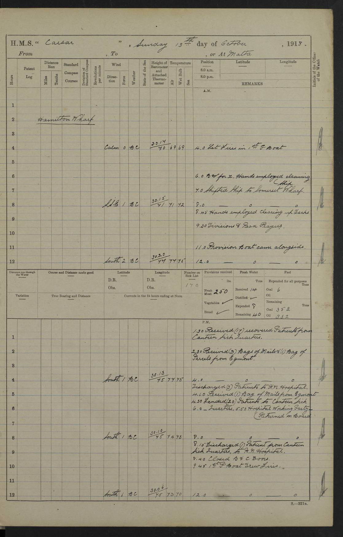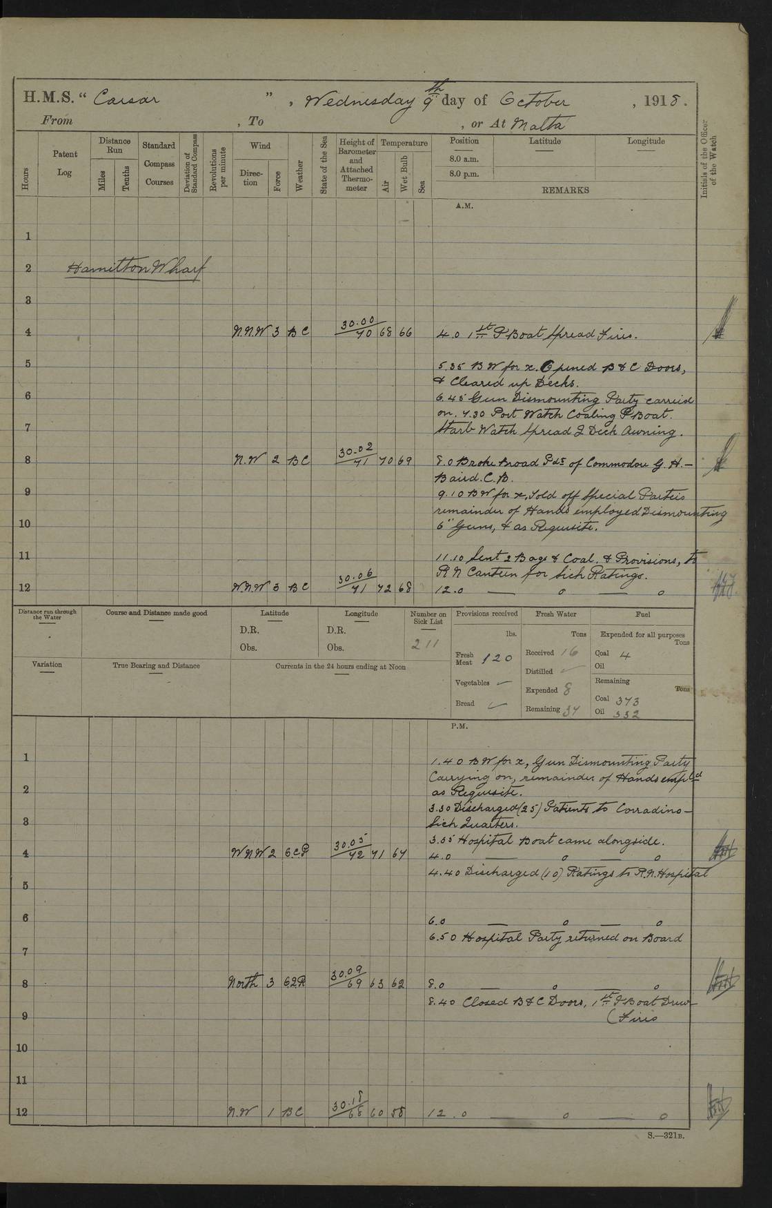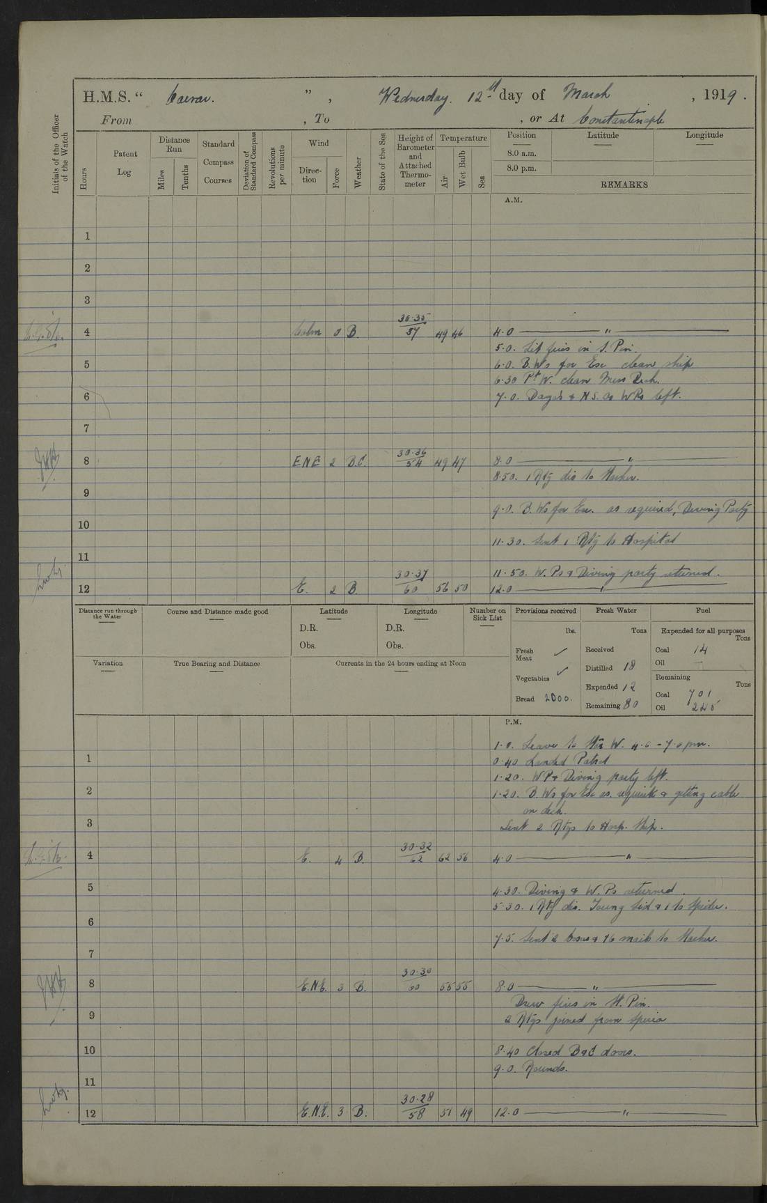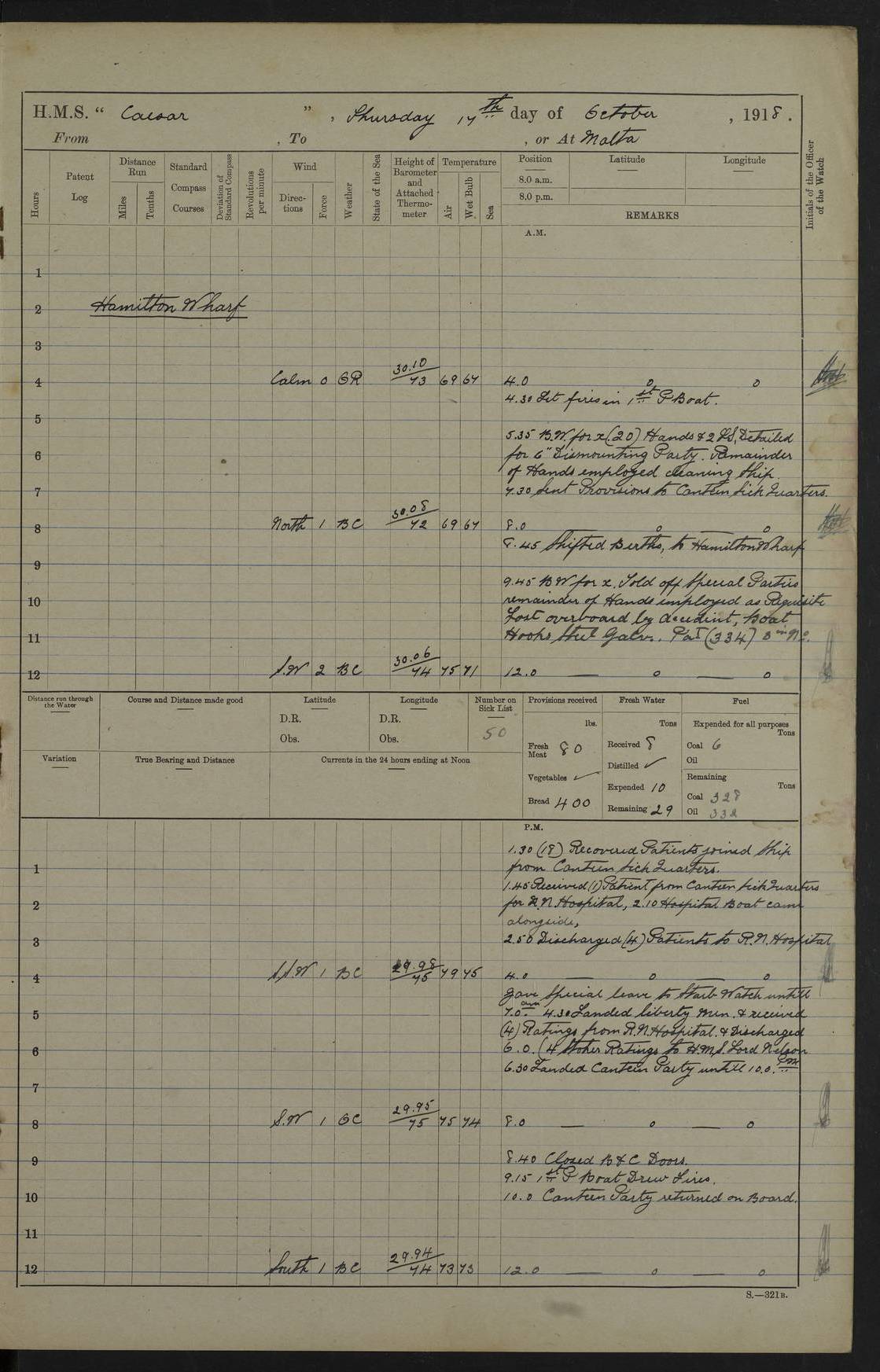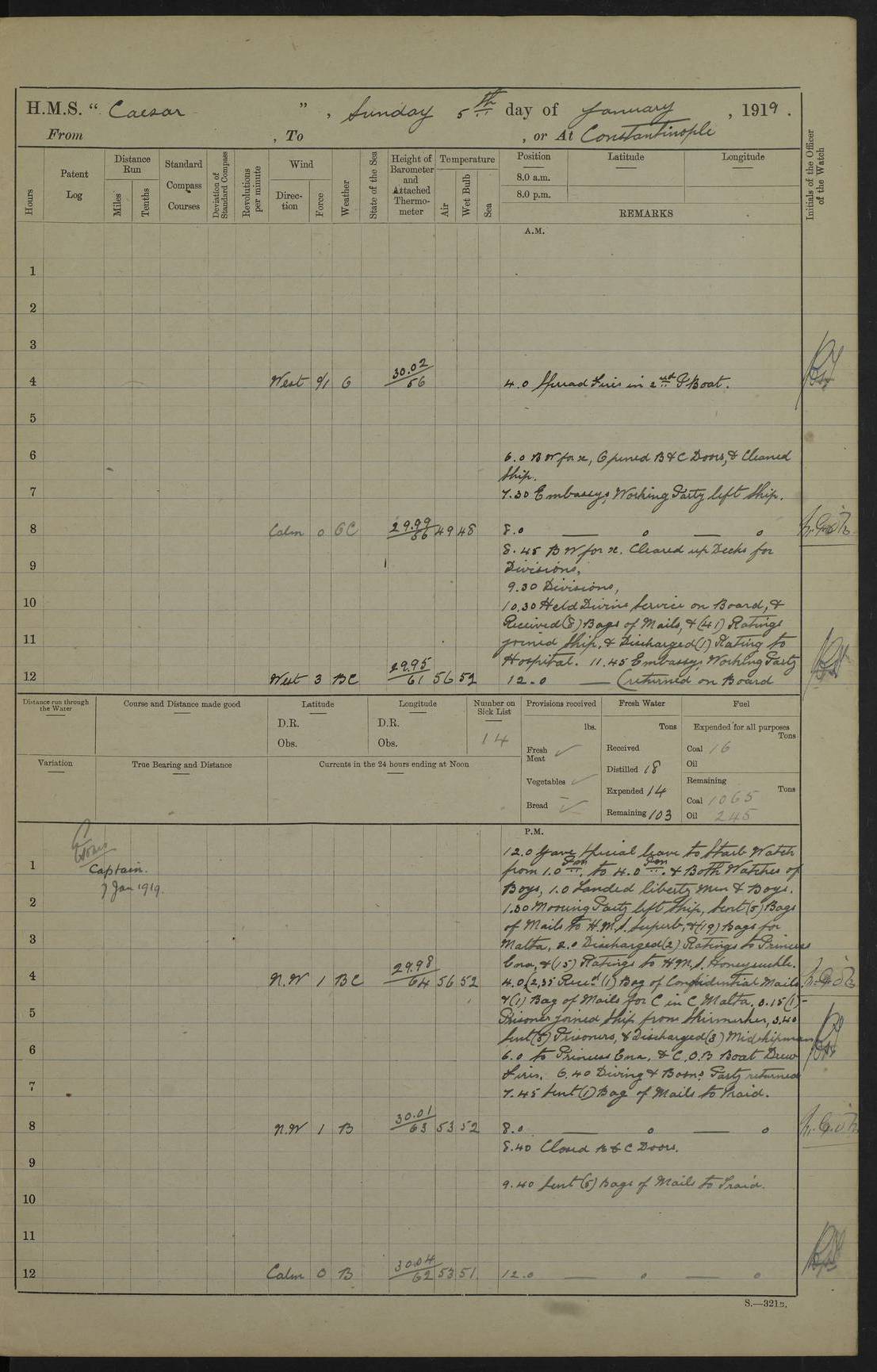 4edebb7b14d0450578000168: (https://s3.amazonaws.com:443/oldweather/ADM53-36589/0003_1.jpg) 1 November 1918 At Malta Lat 35.89, Long 14.52 [Somerset Wharf] 11.15am: Engineers Store Party returned on Board. 0.45pm: Paid Monthly Money. 1.0pm: Mr Goss, Gunner rejoined Ship from RN Hospital. 2.30pm: Gave Special leave to Port Watch untill 7.0am and Port Watch of Boys untill 6.0pm. Hands Made [sic] and Mend Clothes. 2.40pm: Landed liberty Men and Boys. 3.50pm: Provision Boat came alongside. 4.10pm: (4) Recovered Patients rejoined Ship from RN Hospital. 4.30pm: Landed liberty Men and Patrol. 6.0pm: Liberty Boys Returned on Board. 6.30pm: Canteen Party landed untill 10.0pm and Read Warrant No (24). 10.0pm: Canteen Party returned on Board. 11.50pm: Patrol returned on Board. [Provisions received: Fresh Meat 300 lbs, Vegetables 1000 lbs, Bread 450 lbs] 4edebb7c14d0450578000169: (https://s3.amazonaws.com:443/oldweather/ADM53-36589/0004_0.jpg) 2 November 1918 At Malta Lat 35.89, Long 14.52 [Hamilton Wharf] 7.15am: Shifted Berths from Somerset Wharf, to Hamilton Wharf. 8.0am: Tested life Buoys Correct. 8.45am: BW for x Told off Special Parties, Remainder of Hands employed as Requisite, and Landed Picket house Party. 9.10am: Held Court Martial on Board. 10.30am: Court Martial Finished. Noon: Picket House Party returned. 1.20pm: BW for x. Told off Special Parties. Remainder of Hands employed getting in Paymasters Stores and as Requisite. Lost overboard by accident Boat Hooks, Steel, Pattern (345), 2 in Number. 4.20pm: Hands to Fire Stations. 4.35pm: Read Warrant No 25 and gave Special leave to Starboard Watch untill 7.0am. 5.0pm: Landed liberty Men and Victualling Yard Lighter left Ship. 6.30pm: Canteen Party landed untill 10.0pm. [Provisions received: Fresh Meat 260 lbs, Bread 900 lbs] 4edebb7c14d045057800016a: (https://s3.amazonaws.com:443/oldweather/ADM53-36589/0004_1.jpg) 3 November 1918 At Malta Lat 35.89, Long 14.52 [Hamilton Wharf] 9.0am: Landed Church Parties, Wesleyans (14), Presbyterians (10). 9.30am: Divisions. 9.50am: Landed Roman Catholics (15). 10.10am: Discharged (5) Ratings to RN Hospital. 11.35am: All Church Parties returned on Board. 1.0pm: Gave Special leave to Port Watch untill 7.0am and Both Watches of Boys untill 5.30pm. 1.15pm: Landed liberty Men and Boys. 5.30pm: Liberty Boys returned on Board. 6.30pm: Canteen Party landed untill 10.0pm. 8.40pm: Closed B and C Doors. 10.0pm: Canteen Party returned on Board. [Number on sick list: 5] [Provisions received: Fresh Meat 280 lbs] 4edebb7c14d045057800016b: (https://s3.amazonaws.com:443/oldweather/ADM53-36589/0005_0.jpg) 4 November 1918 At Malta Lat 35.89, Long 14.52 [Hamilton Wharf] 6.50am: BW for x Told off Special Parties, remainder of Hands employed as Requisite. 7.0am: Liberty men returned on Board. 8.5am: Provision lighter came alongside. 8.10am: BW for x, Told off Special Parties, remainder of Hands employed Provisioning Ship and as requisite. 8.45am: Landed (1) Carpenter rating for Examination. 3.45pm: (2) Recovered Patients joined Ship from RN Hospital. 4.10pm: Received 8 Bags of Mails from Egmont, and Gave Special leave to Starboard Watch till 7.0am. 5.0pm: Landed Liberty Men and Patrol. 6.0pm: Hands employed getting in and stowing away Provisions. Midnight: Patrol returned on Board. [Weather fine, noon temperature 74F] 4edebb7c14d045057800016c: (https://s3.amazonaws.com:443/oldweather/ADM53-36589/0005_1.jpg) 5 November 1918 At Malta Lat 35.89, Long 14.52 [Hamilton Wharf] 6.45am: BW for x. Told off Special Parties. Remainder of Hands employed getting in and stowing away Provisions. 8.30am: Landed Hospital Party and Picket House Party. 11.0am: Landed (35) Rifles to Naval Ordinance for exchange. Noon: Picket House Party returned. 1.20pm: Landed (2) Ratings for Dental Treatment. 2.25pm: (35) Exchanged Rifles came on Board. 3.40pm: (2) Recovered Patients rejoined Ship from RN Hospital and disinfected Bedding. 4.0pm: Gave Special leave to Port Watch untill 7.0am. Starboard Watch employed stowing Provisions. 4.30pm: Landed Liberty men. Starboard Watch employed stowing away Provisions and Read Warrant No (26). [Provisions received: Fresh Meat 530 lbs, Bread 1000 lbs] 4edebb7c14d045057800016d: (https://s3.amazonaws.com:443/oldweather/ADM53-36589/0006_0.jpg) 6 November 1918 At Malta Lat 35.89, Long 14.52 [Hamilton Wharf] 6.50am: BW for x. Told off Special Parties, Remainder of Port Watch stowing Provisions, Starboard Watch drawing Quarter Deck Awning. 9.0am: Hands employed Provisioning Ship. 4.0pm: Gave Special leave to Starboard Watch untill 7.0am. 4.30pm: Landed liberty Men. Port Watch employed stowing away Provisions. 6.30pm: Canteen Party landed until 10.0pm. 10.0pm: Canteen Party returned on Board. [Number on sick list: 5] [Provisions received: Fresh Meat 250 lbs, Vegetables 1000 lbs, Bread 450 lbs] [Fuel Remaining: Coal 244 tons, Oil 332 tons] 4edebb7c14d045057800016e: (https://s3.amazonaws.com:443/oldweather/ADM53-36589/0006_1.jpg) 7 November 1918 At Malta Lat 35.89, Long 14.52 [No 4 Buoy] 6.30am: BW for x. Told off Special Parties. Remainder of Hands employed prepairing [preparing] Ship to Shift Berths, from Hamilton Wharf to No 4 Buoy. 7.0am: Liberty men returned on Board. 8.50am: Secured Ship to No 4 Buoy and Coal Lighters came alongside. 9.10am: Commenced Coaling Native labour. Hands employed Drawing Stores and as Requisite. 11.50am: Dockyard Parties returned. 1.40pm: BW for x Told off Special Parties, remainder of Hands employed as Requisite. 4.30pm: Gave Special leave to Port Watch untill 7.0am. 4.45pm: Landed liberty men and Patrol and Read Warrant No (27). 7.30pm: Completed Coaling (1481) Tons. 8.40pm: Watch employed sweeping down. 11.50pm: Patrol returned on Board. [Number on sick list: 6] [Provisions received: Fresh Meat 280 lbs, Bread 300 lbs] [Fuel Remaining: Coal 1716 tons, Oil 332 tons] 4edebb7c14d045057800016f: (https://s3.amazonaws.com:443/oldweather/ADM53-36589/0007_0.jpg) 8 November 1918 At Malta Lat 35.89, Long 
