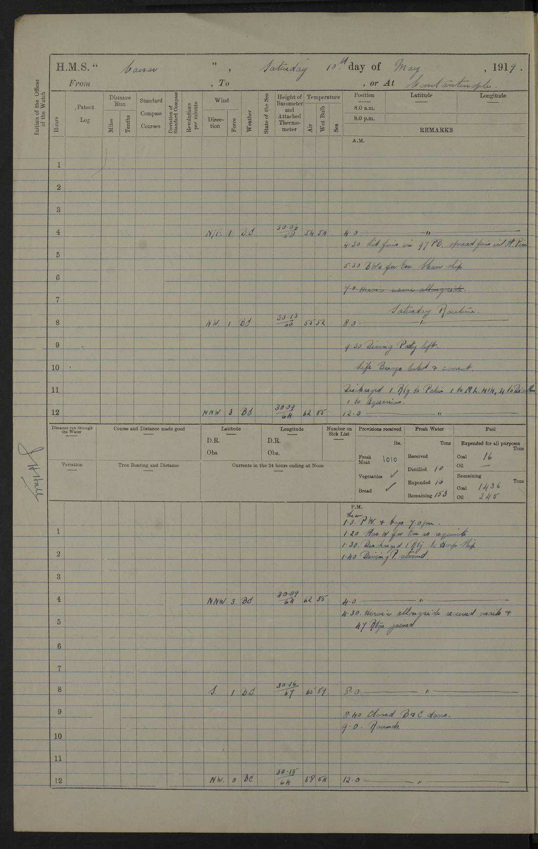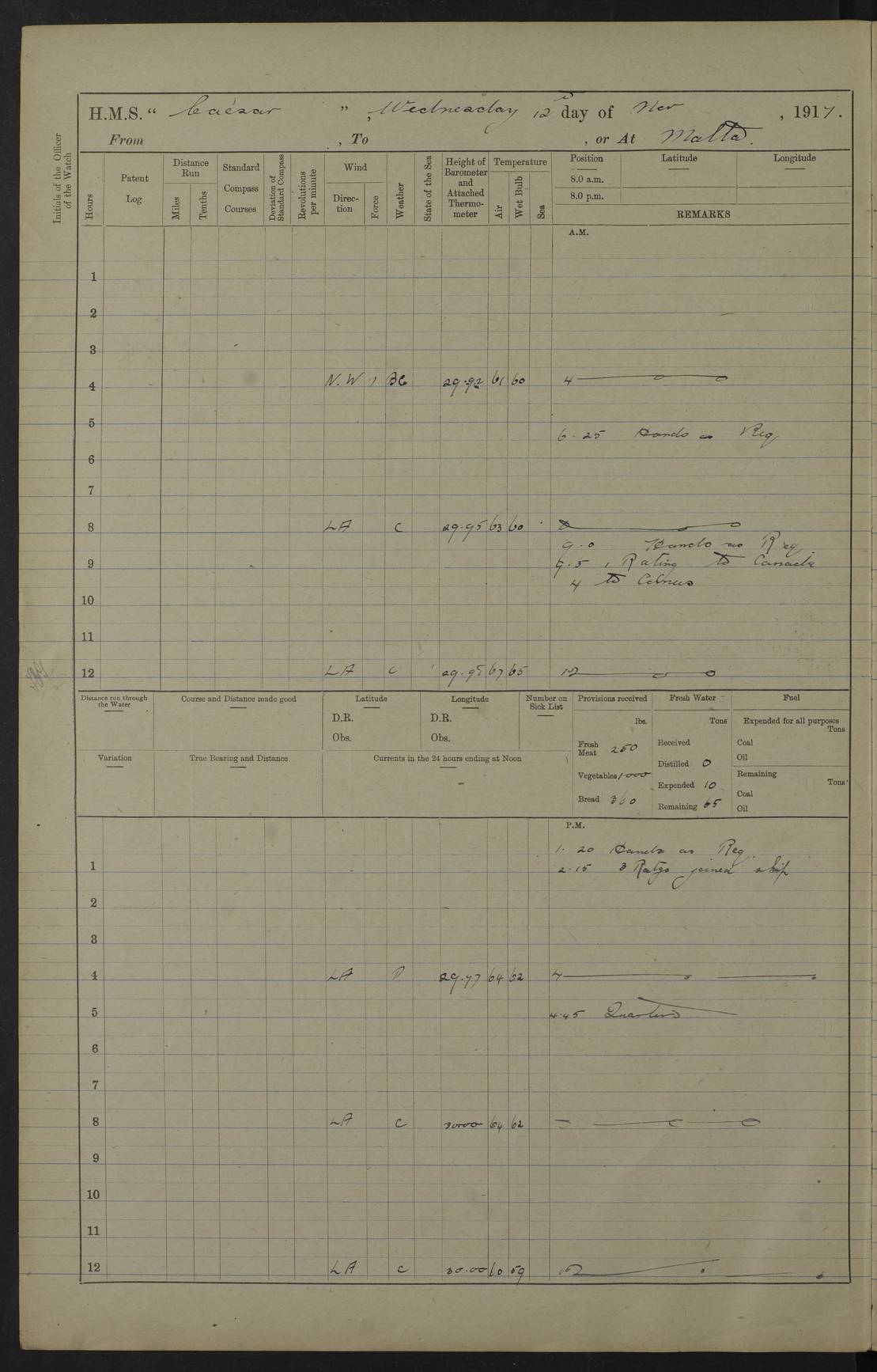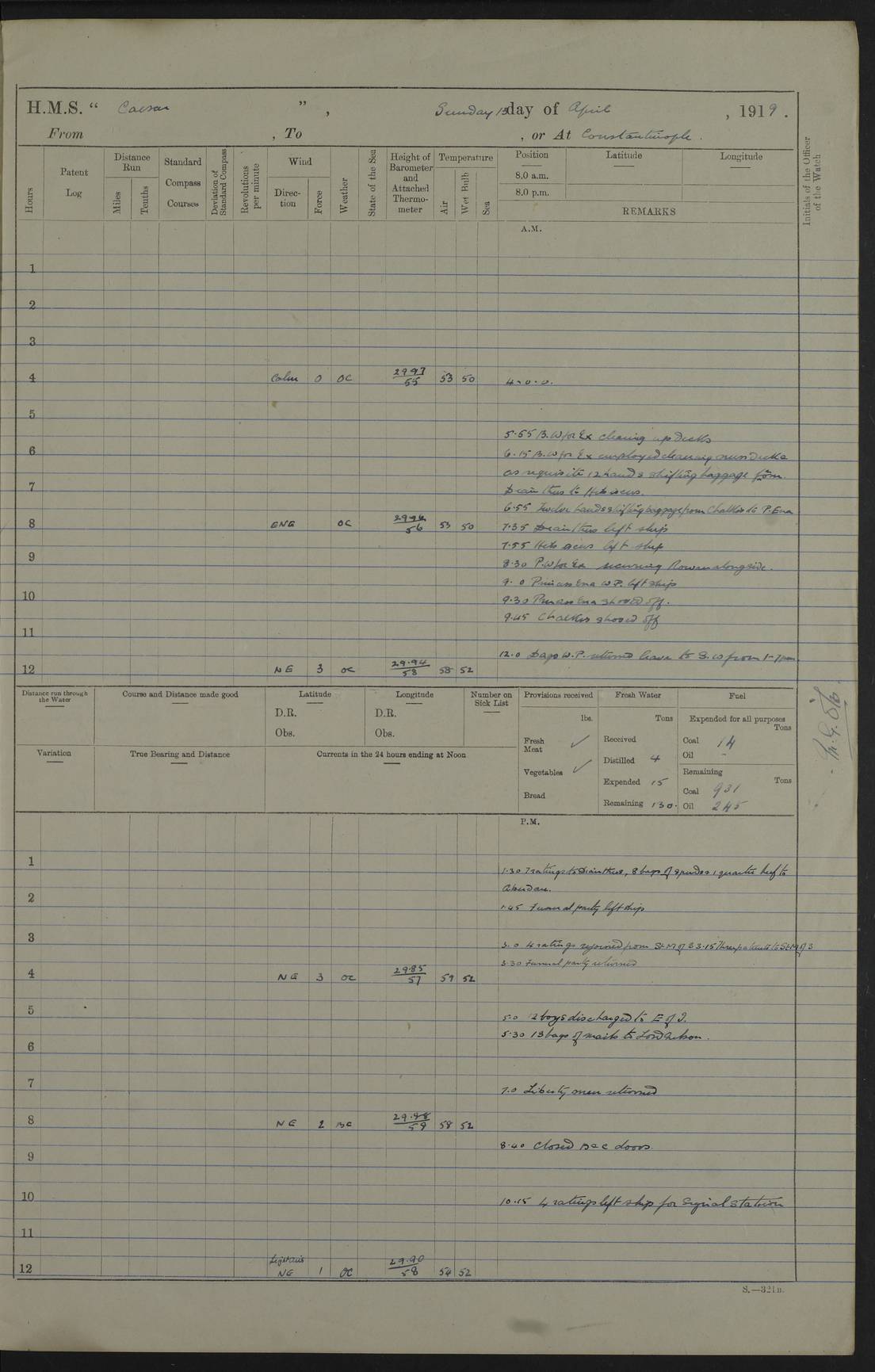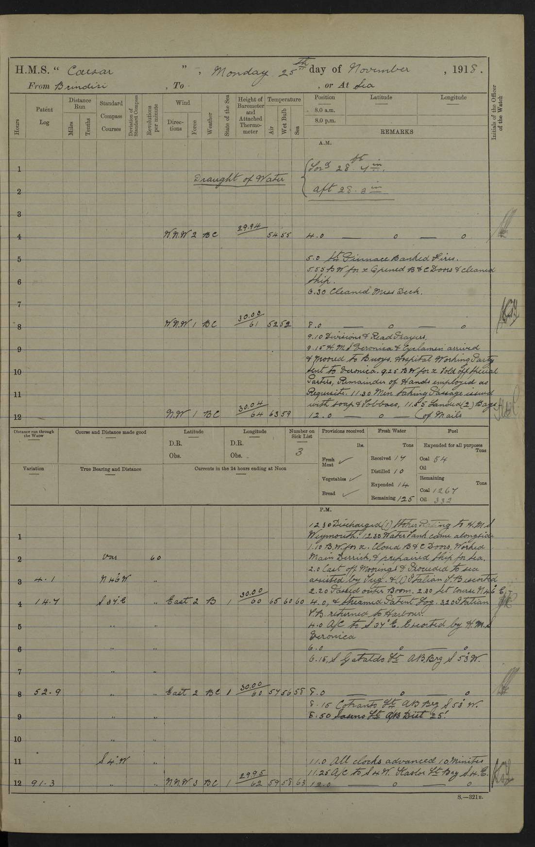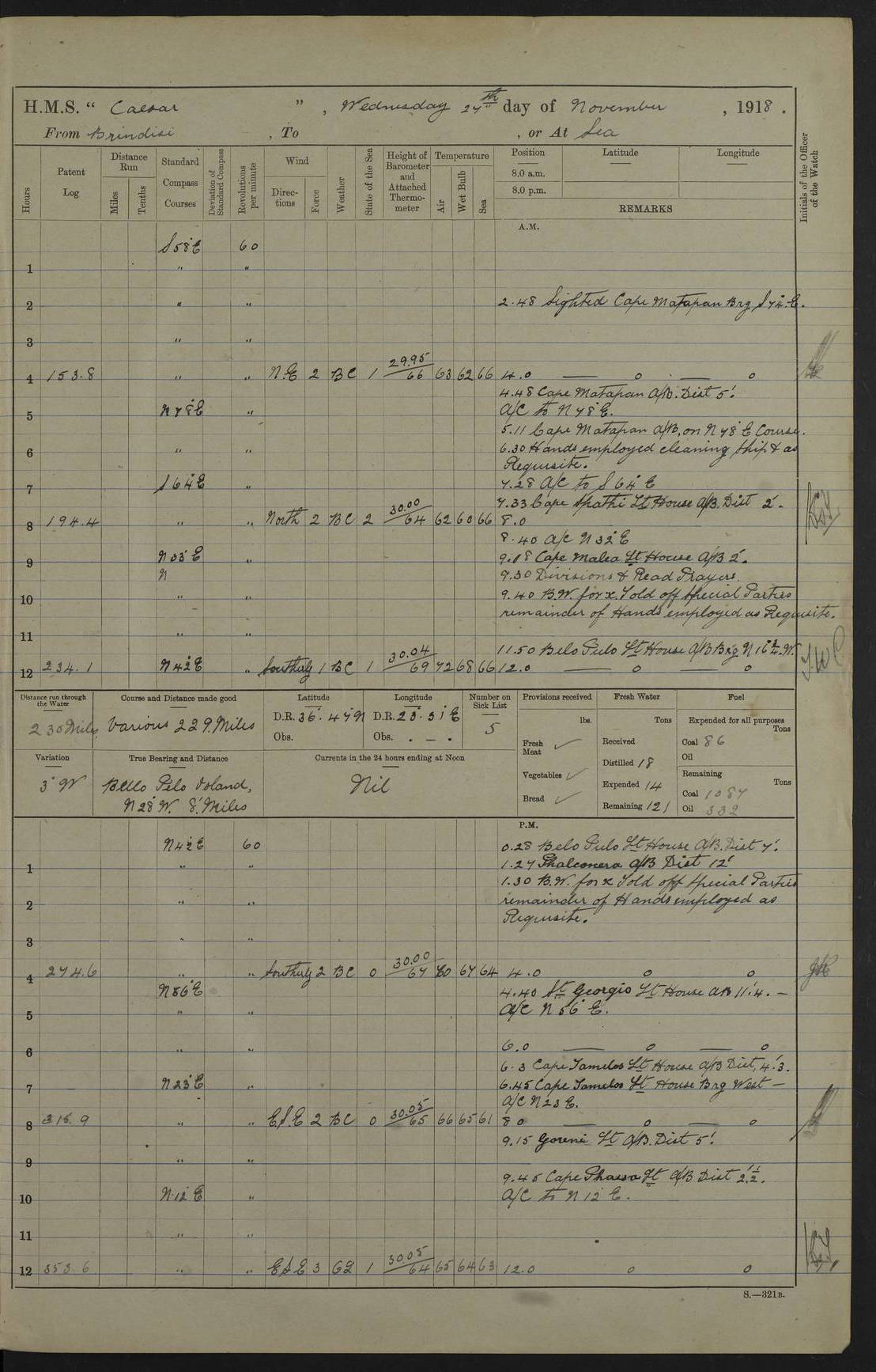 4edebb7b14d0450578000168: (https://s3.amazonaws.com:443/oldweather/ADM53-36589/0003_1.jpg) 1 November 1918 At Malta Lat 35.89, Long 14.52 [Somerset Wharf] 11.15am: Engineers Store Party returned on Board. 0.45pm: Paid Monthly Money. 1.0pm: Mr Goss, Gunner rejoined Ship from RN Hospital. 2.30pm: Gave Special leave to Port Watch untill 7.0am and Port Watch of Boys untill 6.0pm. Hands Made [sic] and Mend Clothes. 2.40pm: Landed liberty Men and Boys. 3.50pm: Provision Boat came alongside. 4.10pm: (4) Recovered Patients rejoined Ship from RN Hospital. 4.30pm: Landed liberty Men and Patrol. 6.0pm: Liberty Boys Returned on Board. 6.30pm: Canteen Party landed untill 10.0pm and Read Warrant No (24). 10.0pm: Canteen Party returned on Board. 11.50pm: Patrol returned on Board. [Provisions received: Fresh Meat 300 lbs, Vegetables 1000 lbs, Bread 450 lbs] 4edebb7c14d0450578000169: (https://s3.amazonaws.com:443/oldweather/ADM53-36589/0004_0.jpg) 2 November 1918 At Malta Lat 35.89, Long 14.52 [Hamilton Wharf] 7.15am: Shifted Berths from Somerset Wharf, to Hamilton Wharf. 8.0am: Tested life Buoys Correct. 8.45am: BW for x Told off Special Parties, Remainder of Hands employed as Requisite, and Landed Picket house Party. 9.10am: Held Court Martial on Board. 10.30am: Court Martial Finished. Noon: Picket House Party returned. 1.20pm: BW for x. Told off Special Parties. Remainder of Hands employed getting in Paymasters Stores and as Requisite. Lost overboard by accident Boat Hooks, Steel, Pattern (345), 2 in Number. 4.20pm: Hands to Fire Stations. 4.35pm: Read Warrant No 25 and gave Special leave to Starboard Watch untill 7.0am. 5.0pm: Landed liberty Men and Victualling Yard Lighter left Ship. 6.30pm: Canteen Party landed untill 10.0pm. [Provisions received: Fresh Meat 260 lbs, Bread 900 lbs] 4edebb7c14d045057800016a: (https://s3.amazonaws.com:443/oldweather/ADM53-36589/0004_1.jpg) 3 November 1918 At Malta Lat 35.89, Long 14.52 [Hamilton Wharf] 9.0am: Landed Church Parties, Wesleyans (14), Presbyterians (10). 9.30am: Divisions. 9.50am: Landed Roman Catholics (15). 10.10am: Discharged (5) Ratings to RN Hospital. 11.35am: All Church Parties returned on Board. 1.0pm: Gave Special leave to Port Watch untill 7.0am and Both Watches of Boys untill 5.30pm. 1.15pm: Landed liberty Men and Boys. 5.30pm: Liberty Boys returned on Board. 6.30pm: Canteen Party landed untill 10.0pm. 8.40pm: Closed B and C Doors. 10.0pm: Canteen Party returned on Board. [Number on sick list: 5] [Provisions received: Fresh Meat 280 lbs] 4edebb7c14d045057800016b: (https://s3.amazonaws.com:443/oldweather/ADM53-36589/0005_0.jpg) 4 November 1918 At Malta Lat 35.89, Long 14.52 [Hamilton Wharf] 6.50am: BW for x Told off Special Parties, remainder of Hands employed as Requisite. 7.0am: Liberty men returned on Board. 8.5am: Provision lighter came alongside. 8.10am: BW for x, Told off Special Parties, remainder of Hands employed Provisioning Ship and as requisite. 8.45am: Landed (1) Carpenter rating for Examination. 3.45pm: (2) Recovered Patients joined Ship from RN Hospital. 4.10pm: Received 8 Bags of Mails from Egmont, and Gave Special leave to Starboard Watch till 7.0am. 5.0pm: Landed Liberty Men and Patrol. 6.0pm: Hands employed getting in and stowing away Provisions. Midnight: Patrol returned on Board. [Weather fine, noon temperature 74F] 4edebb7c14d045057800016c: (https://s3.amazonaws.com:443/oldweather/ADM53-36589/0005_1.jpg) 5 November 1918 At Malta Lat 35.89, Long 14.52 [Hamilton Wharf] 6.45am: BW for x. Told off Special Parties. Remainder of Hands employed getting in and stowing away Provisions. 8.30am: Landed Hospital Party and Picket House Party. 11.0am: Landed (35) Rifles to Naval Ordinance for exchange. Noon: Picket House Party returned. 1.20pm: Landed (2) Ratings for Dental Treatment. 2.25pm: (35) Exchanged Rifles came on Board. 3.40pm: (2) Recovered Patients rejoined Ship from RN Hospital and disinfected Bedding. 4.0pm: Gave Special leave to Port Watch untill 7.0am. Starboard Watch employed stowing Provisions. 4.30pm: Landed Liberty men. Starboard Watch employed stowing away Provisions and Read Warrant No (26). [Provisions received: Fresh Meat 530 lbs, Bread 1000 lbs] 4edebb7c14d045057800016d: (https://s3.amazonaws.com:443/oldweather/ADM53-36589/0006_0.jpg) 6 November 1918 At Malta Lat 35.89, Long 14.52 [Hamilton Wharf] 6.50am: BW for x. Told off Special Parties, Remainder of Port Watch stowing Provisions, Starboard Watch drawing Quarter Deck Awning. 9.0am: Hands employed Provisioning Ship. 4.0pm: Gave Special leave to Starboard Watch untill 7.0am. 4.30pm: Landed liberty Men. Port Watch employed stowing away Provisions. 6.30pm: Canteen Party landed until 10.0pm. 10.0pm: Canteen Party returned on Board. [Number on sick list: 5] [Provisions received: Fresh Meat 250 lbs, Vegetables 1000 lbs, Bread 450 lbs] [Fuel Remaining: Coal 244 tons, Oil 332 tons] 4edebb7c14d045057800016e: (https://s3.amazonaws.com:443/oldweather/ADM53-36589/0006_1.jpg) 7 November 1918 At Malta Lat 35.89, Long 14.52 [No 4 Buoy] 6.30am: BW for x. Told off Special Parties. Remainder of Hands employed prepairing [preparing] Ship to Shift Berths, from Hamilton Wharf to No 4 Buoy. 7.0am: Liberty men returned on Board. 8.50am: Secured Ship to No 4 Buoy and Coal Lighters came alongside. 9.10am: Commenced Coaling Native labour. Hands employed Drawing Stores and as Requisite. 11.50am: Dockyard Parties returned. 1.40pm: BW for x Told off Special Parties, remainder of Hands employed as Requisite. 4.30pm: Gave Special leave to Port Watch untill 7.0am. 4.45pm: Landed liberty men and Patrol and Read Warrant No (27). 7.30pm: Completed Coaling (1481) Tons. 8.40pm: Watch employed sweeping down. 11.50pm: Patrol returned on Board. [Number on sick list: 6] [Provisions received: Fresh Meat 280 lbs, Bread 300 lbs] [Fuel Remaining: Coal 1716 tons, Oil 332 tons] 4edebb7c14d045057800016f: (https://s3.amazonaws.com:443/oldweather/ADM53-36589/0007_0.jpg) 8 November 1918 At Malta Lat 35.89, Long 