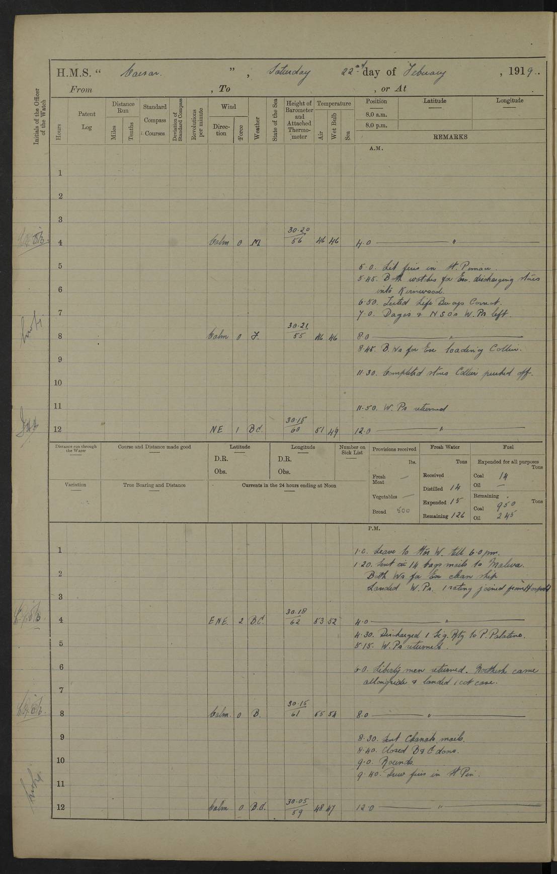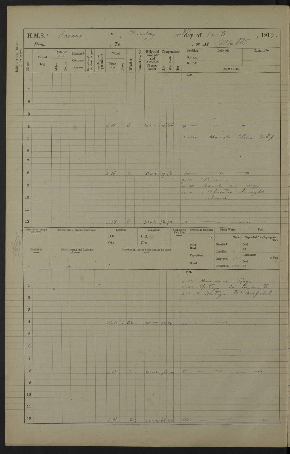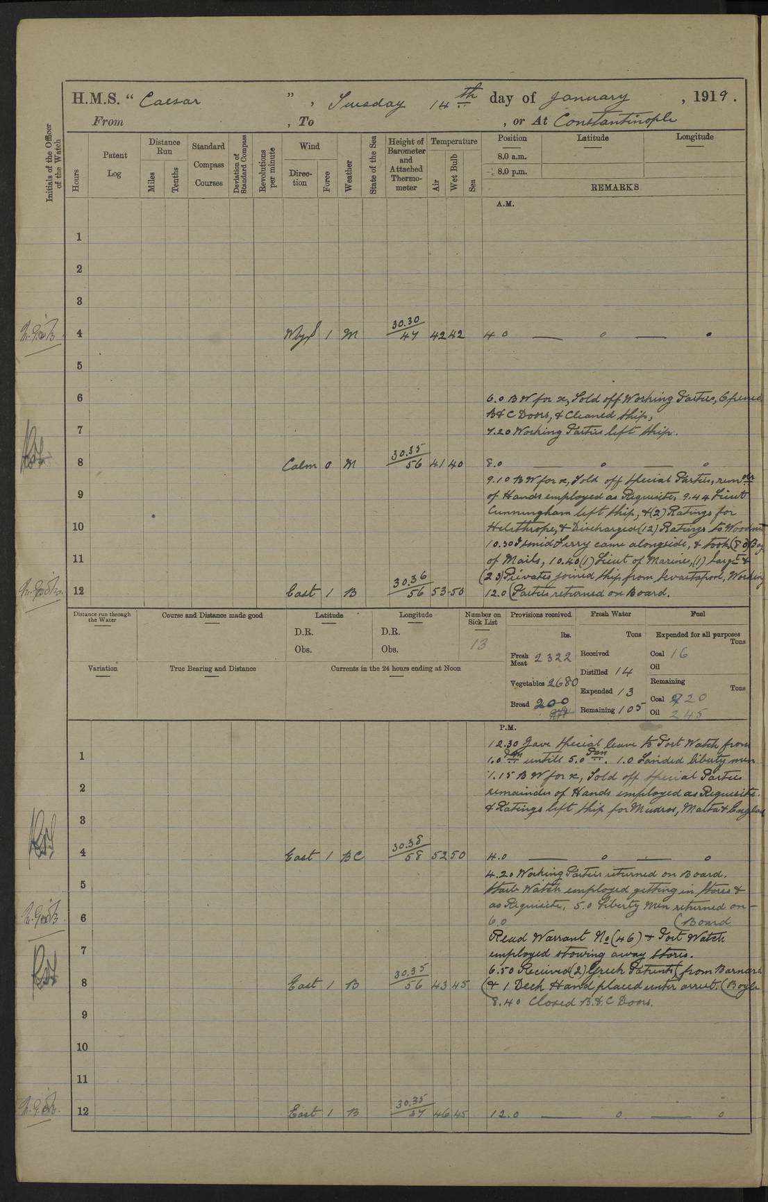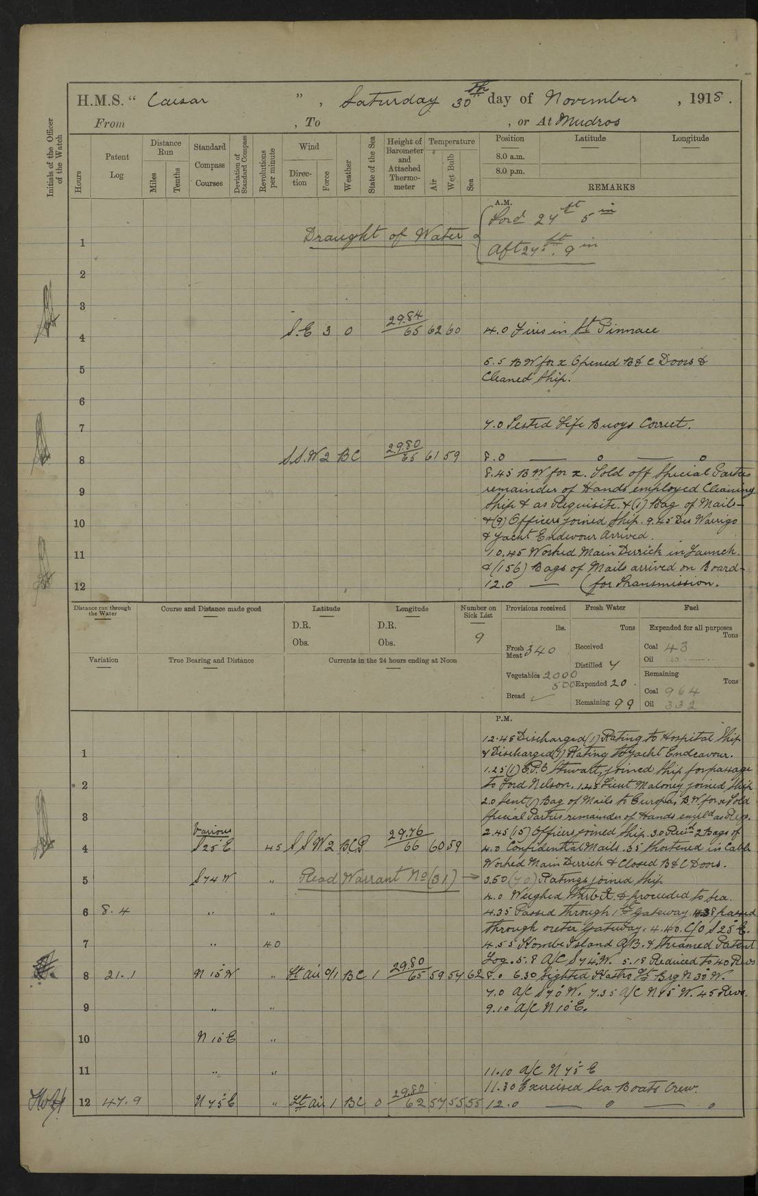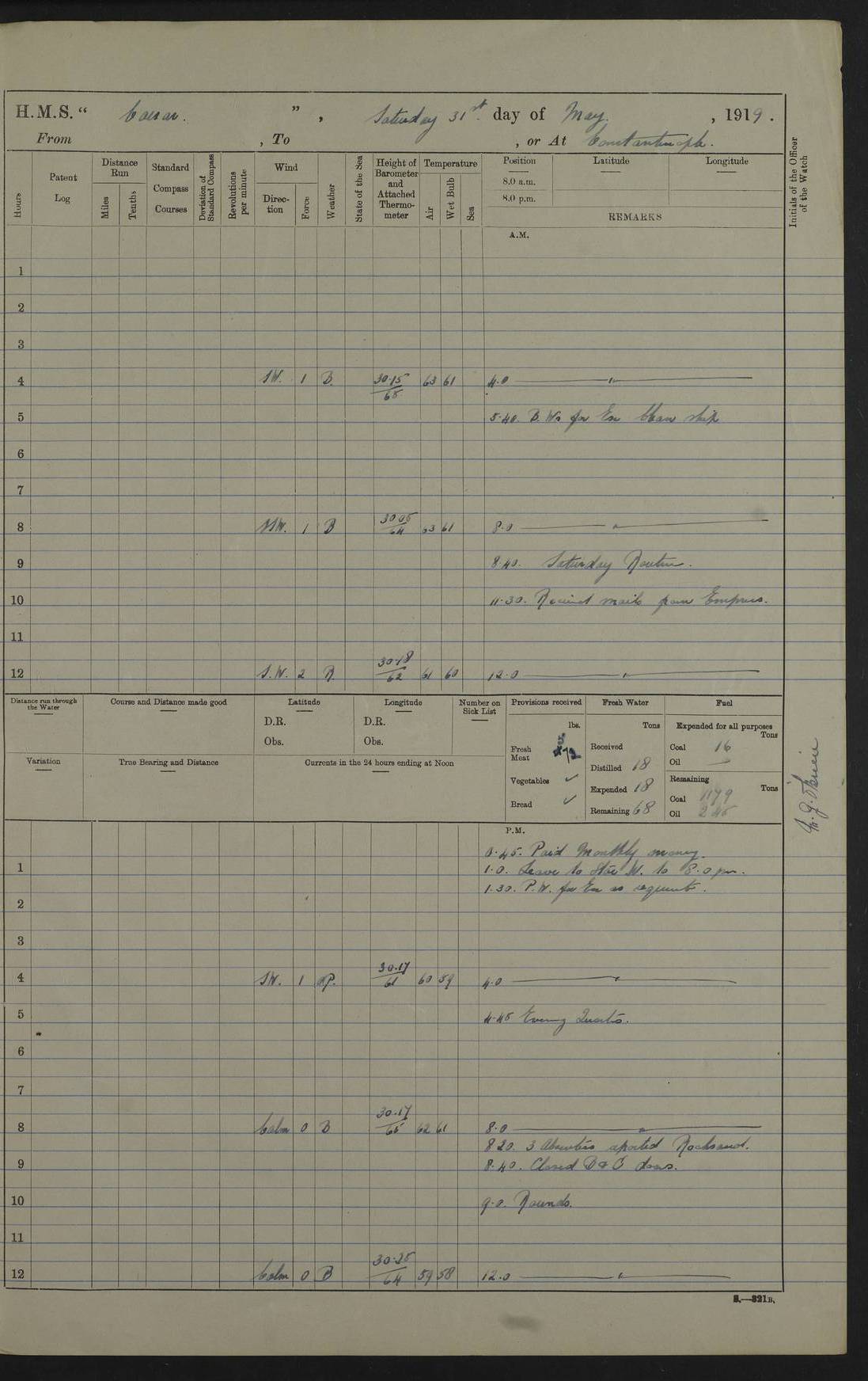 4edebb7b14d0450578000168: (https://s3.amazonaws.com:443/oldweather/ADM53-36589/0003_1.jpg) 1 November 1918 At Malta Lat 35.89, Long 14.52 [Somerset Wharf] 11.15am: Engineers Store Party returned on Board. 0.45pm: Paid Monthly Money. 1.0pm: Mr Goss, Gunner rejoined Ship from RN Hospital. 2.30pm: Gave Special leave to Port Watch untill 7.0am and Port Watch of Boys untill 6.0pm. Hands Made [sic] and Mend Clothes. 2.40pm: Landed liberty Men and Boys. 3.50pm: Provision Boat came alongside. 4.10pm: (4) Recovered Patients rejoined Ship from RN Hospital. 4.30pm: Landed liberty Men and Patrol. 6.0pm: Liberty Boys Returned on Board. 6.30pm: Canteen Party landed untill 10.0pm and Read Warrant No (24). 10.0pm: Canteen Party returned on Board. 11.50pm: Patrol returned on Board. [Provisions received: Fresh Meat 300 lbs, Vegetables 1000 lbs, Bread 450 lbs] 4edebb7c14d0450578000169: (https://s3.amazonaws.com:443/oldweather/ADM53-36589/0004_0.jpg) 2 November 1918 At Malta Lat 35.89, Long 14.52 [Hamilton Wharf] 7.15am: Shifted Berths from Somerset Wharf, to Hamilton Wharf. 8.0am: Tested life Buoys Correct. 8.45am: BW for x Told off Special Parties, Remainder of Hands employed as Requisite, and Landed Picket house Party. 9.10am: Held Court Martial on Board. 10.30am: Court Martial Finished. Noon: Picket House Party returned. 1.20pm: BW for x. Told off Special Parties. Remainder of Hands employed getting in Paymasters Stores and as Requisite. Lost overboard by accident Boat Hooks, Steel, Pattern (345), 2 in Number. 4.20pm: Hands to Fire Stations. 4.35pm: Read Warrant No 25 and gave Special leave to Starboard Watch untill 7.0am. 5.0pm: Landed liberty Men and Victualling Yard Lighter left Ship. 6.30pm: Canteen Party landed untill 10.0pm. [Provisions received: Fresh Meat 260 lbs, Bread 900 lbs] 4edebb7c14d045057800016a: (https://s3.amazonaws.com:443/oldweather/ADM53-36589/0004_1.jpg) 3 November 1918 At Malta Lat 35.89, Long 14.52 [Hamilton Wharf] 9.0am: Landed Church Parties, Wesleyans (14), Presbyterians (10). 9.30am: Divisions. 9.50am: Landed Roman Catholics (15). 10.10am: Discharged (5) Ratings to RN Hospital. 11.35am: All Church Parties returned on Board. 1.0pm: Gave Special leave to Port Watch untill 7.0am and Both Watches of Boys untill 5.30pm. 1.15pm: Landed liberty Men and Boys. 5.30pm: Liberty Boys returned on Board. 6.30pm: Canteen Party landed untill 10.0pm. 8.40pm: Closed B and C Doors. 10.0pm: Canteen Party returned on Board. [Number on sick list: 5] [Provisions received: Fresh Meat 280 lbs] 4edebb7c14d045057800016b: (https://s3.amazonaws.com:443/oldweather/ADM53-36589/0005_0.jpg) 4 November 1918 At Malta Lat 35.89, Long 14.52 [Hamilton Wharf] 6.50am: BW for x Told off Special Parties, remainder of Hands employed as Requisite. 7.0am: Liberty men returned on Board. 8.5am: Provision lighter came alongside. 8.10am: BW for x, Told off Special Parties, remainder of Hands employed Provisioning Ship and as requisite. 8.45am: Landed (1) Carpenter rating for Examination. 3.45pm: (2) Recovered Patients joined Ship from RN Hospital. 4.10pm: Received 8 Bags of Mails from Egmont, and Gave Special leave to Starboard Watch till 7.0am. 5.0pm: Landed Liberty Men and Patrol. 6.0pm: Hands employed getting in and stowing away Provisions. Midnight: Patrol returned on Board. [Weather fine, noon temperature 74F] 4edebb7c14d045057800016c: (https://s3.amazonaws.com:443/oldweather/ADM53-36589/0005_1.jpg) 5 November 1918 At Malta Lat 35.89, Long 14.52 [Hamilton Wharf] 6.45am: BW for x. Told off Special Parties. Remainder of Hands employed getting in and stowing away Provisions. 8.30am: Landed Hospital Party and Picket House Party. 11.0am: Landed (35) Rifles to Naval Ordinance for exchange. Noon: Picket House Party returned. 1.20pm: Landed (2) Ratings for Dental Treatment. 2.25pm: (35) Exchanged Rifles came on Board. 3.40pm: (2) Recovered Patients rejoined Ship from RN Hospital and disinfected Bedding. 4.0pm: Gave Special leave to Port Watch untill 7.0am. Starboard Watch employed stowing Provisions. 4.30pm: Landed Liberty men. Starboard Watch employed stowing away Provisions and Read Warrant No (26). [Provisions received: Fresh Meat 530 lbs, Bread 1000 lbs] 4edebb7c14d045057800016d: (https://s3.amazonaws.com:443/oldweather/ADM53-36589/0006_0.jpg) 6 November 1918 At Malta Lat 35.89, Long 14.52 [Hamilton Wharf] 6.50am: BW for x. Told off Special Parties, Remainder of Port Watch stowing Provisions, Starboard Watch drawing Quarter Deck Awning. 9.0am: Hands employed Provisioning Ship. 4.0pm: Gave Special leave to Starboard Watch untill 7.0am. 4.30pm: Landed liberty Men. Port Watch employed stowing away Provisions. 6.30pm: Canteen Party landed until 10.0pm. 10.0pm: Canteen Party returned on Board. [Number on sick list: 5] [Provisions received: Fresh Meat 250 lbs, Vegetables 1000 lbs, Bread 450 lbs] [Fuel Remaining: Coal 244 tons, Oil 332 tons] 4edebb7c14d045057800016e: (https://s3.amazonaws.com:443/oldweather/ADM53-36589/0006_1.jpg) 7 November 1918 At Malta Lat 35.89, Long 14.52 [No 4 Buoy] 6.30am: BW for x. Told off Special Parties. Remainder of Hands employed prepairing [preparing] Ship to Shift Berths, from Hamilton Wharf to No 4 Buoy. 7.0am: Liberty men returned on Board. 8.50am: Secured Ship to No 4 Buoy and Coal Lighters came alongside. 9.10am: Commenced Coaling Native labour. Hands employed Drawing Stores and as Requisite. 11.50am: Dockyard Parties returned. 1.40pm: BW for x Told off Special Parties, remainder of Hands employed as Requisite. 4.30pm: Gave Special leave to Port Watch untill 7.0am. 4.45pm: Landed liberty men and Patrol and Read Warrant No (27). 7.30pm: Completed Coaling (1481) Tons. 8.40pm: Watch employed sweeping down. 11.50pm: Patrol returned on Board. [Number on sick list: 6] [Provisions received: Fresh Meat 280 lbs, Bread 300 lbs] [Fuel Remaining: Coal 1716 tons, Oil 332 tons] 4edebb7c14d045057800016f: (https://s3.amazonaws.com:443/oldweather/ADM53-36589/0007_0.jpg) 8 November 1918 At Malta Lat 35.89, Long 