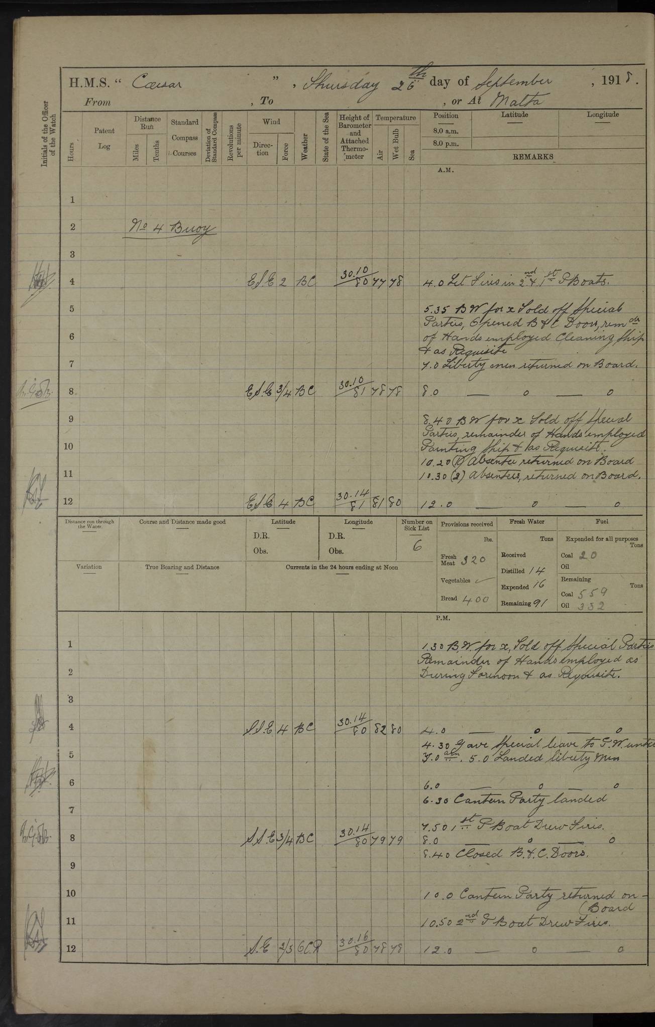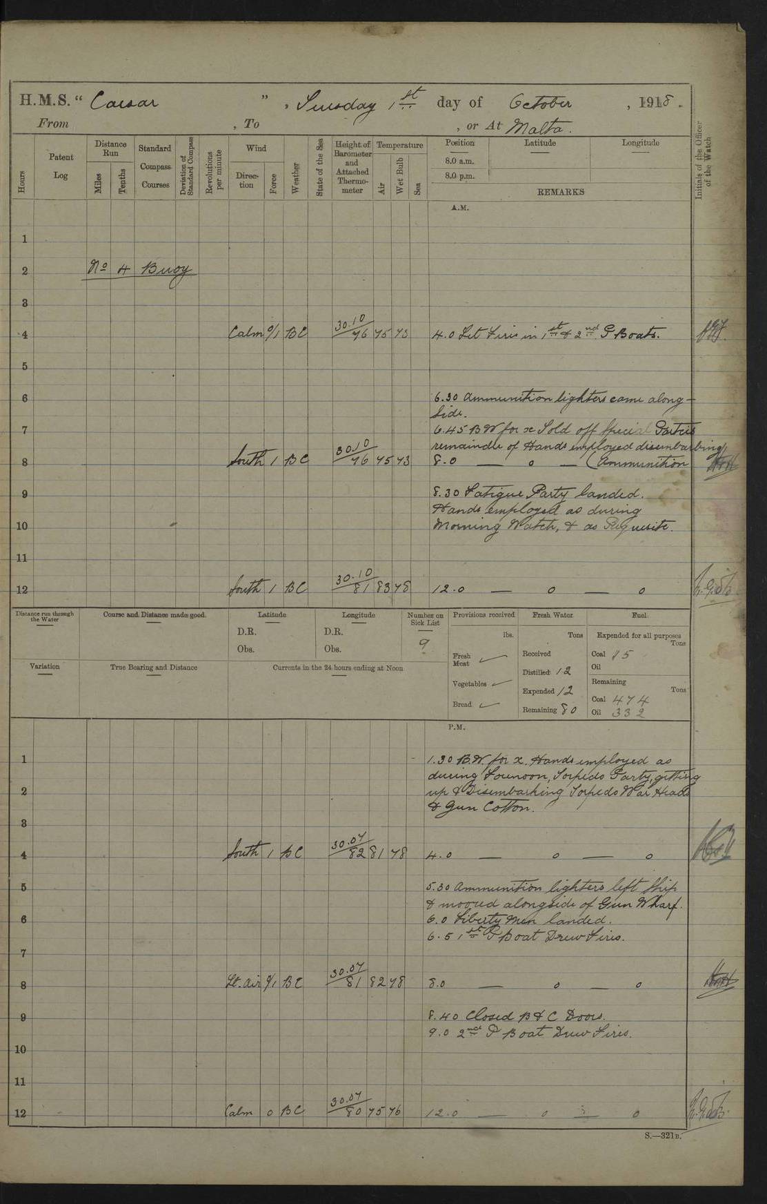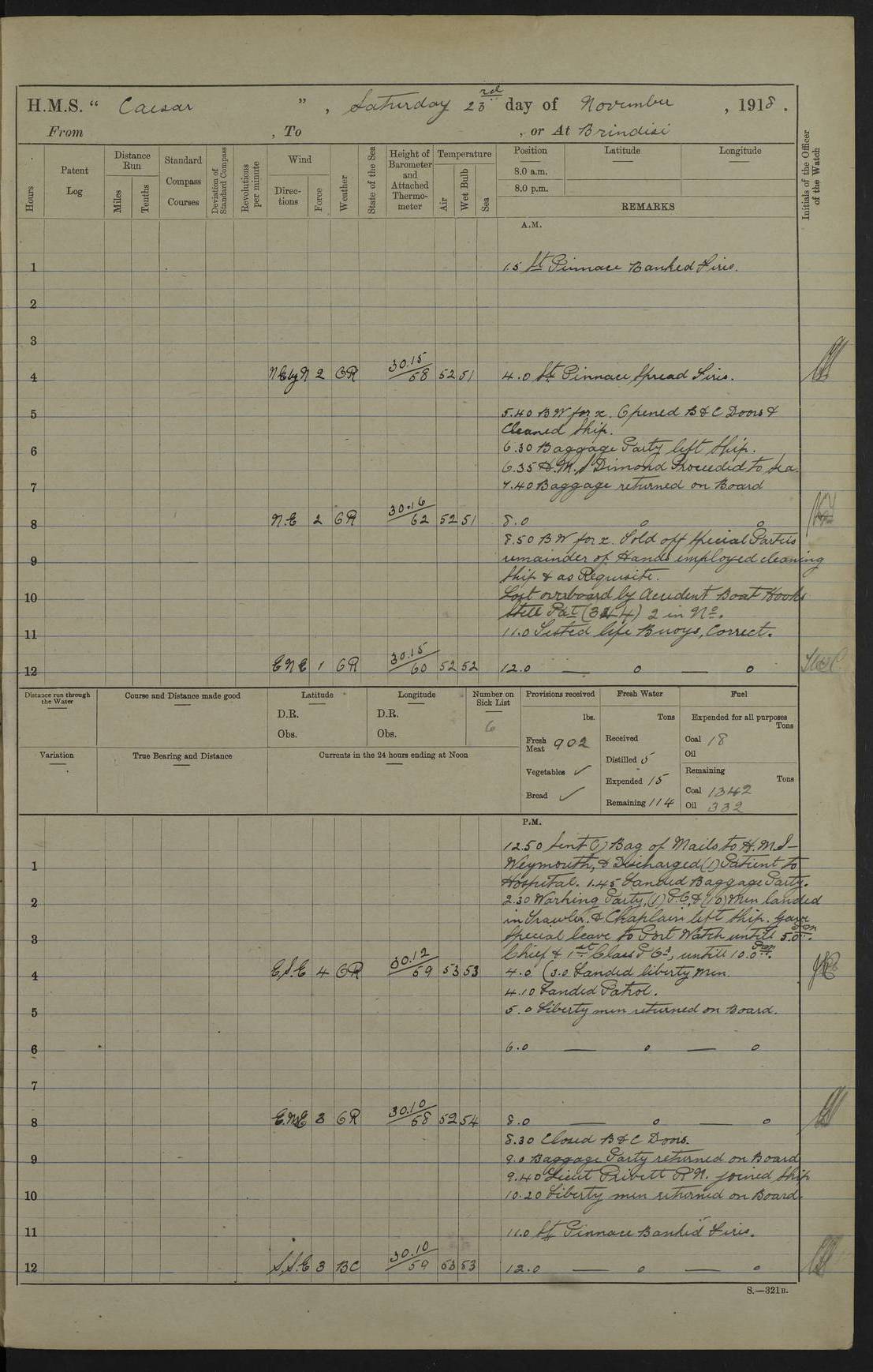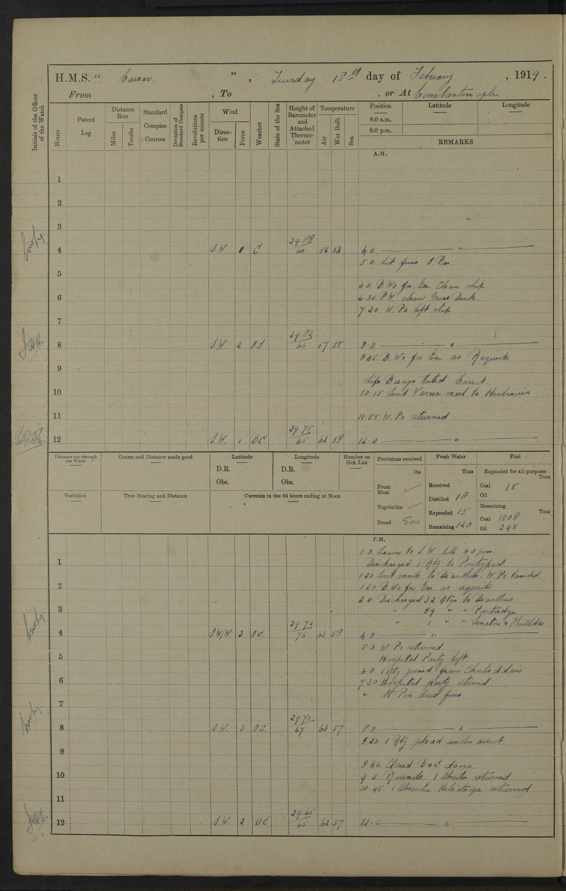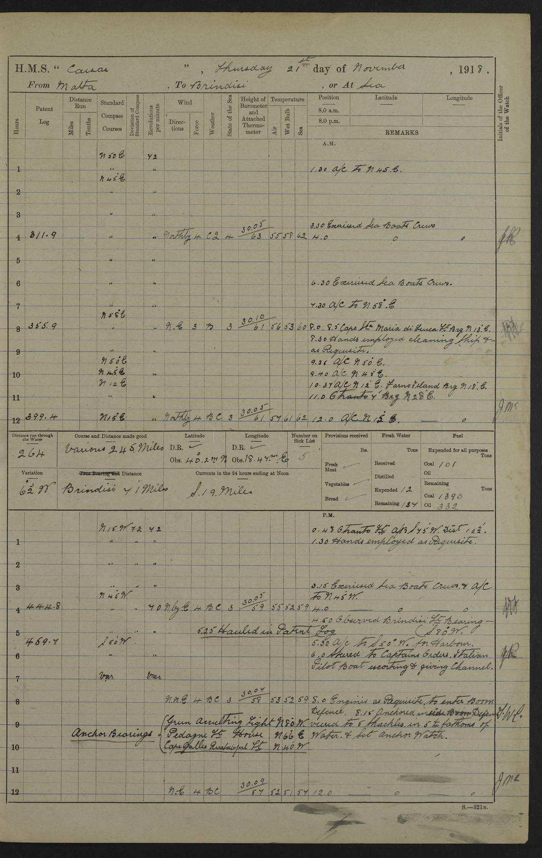 4edebb7b14d0450578000168: (https://s3.amazonaws.com:443/oldweather/ADM53-36589/0003_1.jpg) 1 November 1918 At Malta Lat 35.89, Long 14.52 [Somerset Wharf] 11.15am: Engineers Store Party returned on Board. 0.45pm: Paid Monthly Money. 1.0pm: Mr Goss, Gunner rejoined Ship from RN Hospital. 2.30pm: Gave Special leave to Port Watch untill 7.0am and Port Watch of Boys untill 6.0pm. Hands Made [sic] and Mend Clothes. 2.40pm: Landed liberty Men and Boys. 3.50pm: Provision Boat came alongside. 4.10pm: (4) Recovered Patients rejoined Ship from RN Hospital. 4.30pm: Landed liberty Men and Patrol. 6.0pm: Liberty Boys Returned on Board. 6.30pm: Canteen Party landed untill 10.0pm and Read Warrant No (24). 10.0pm: Canteen Party returned on Board. 11.50pm: Patrol returned on Board. [Provisions received: Fresh Meat 300 lbs, Vegetables 1000 lbs, Bread 450 lbs] 4edebb7c14d0450578000169: (https://s3.amazonaws.com:443/oldweather/ADM53-36589/0004_0.jpg) 2 November 1918 At Malta Lat 35.89, Long 14.52 [Hamilton Wharf] 7.15am: Shifted Berths from Somerset Wharf, to Hamilton Wharf. 8.0am: Tested life Buoys Correct. 8.45am: BW for x Told off Special Parties, Remainder of Hands employed as Requisite, and Landed Picket house Party. 9.10am: Held Court Martial on Board. 10.30am: Court Martial Finished. Noon: Picket House Party returned. 1.20pm: BW for x. Told off Special Parties. Remainder of Hands employed getting in Paymasters Stores and as Requisite. Lost overboard by accident Boat Hooks, Steel, Pattern (345), 2 in Number. 4.20pm: Hands to Fire Stations. 4.35pm: Read Warrant No 25 and gave Special leave to Starboard Watch untill 7.0am. 5.0pm: Landed liberty Men and Victualling Yard Lighter left Ship. 6.30pm: Canteen Party landed untill 10.0pm. [Provisions received: Fresh Meat 260 lbs, Bread 900 lbs] 4edebb7c14d045057800016a: (https://s3.amazonaws.com:443/oldweather/ADM53-36589/0004_1.jpg) 3 November 1918 At Malta Lat 35.89, Long 14.52 [Hamilton Wharf] 9.0am: Landed Church Parties, Wesleyans (14), Presbyterians (10). 9.30am: Divisions. 9.50am: Landed Roman Catholics (15). 10.10am: Discharged (5) Ratings to RN Hospital. 11.35am: All Church Parties returned on Board. 1.0pm: Gave Special leave to Port Watch untill 7.0am and Both Watches of Boys untill 5.30pm. 1.15pm: Landed liberty Men and Boys. 5.30pm: Liberty Boys returned on Board. 6.30pm: Canteen Party landed untill 10.0pm. 8.40pm: Closed B and C Doors. 10.0pm: Canteen Party returned on Board. [Number on sick list: 5] [Provisions received: Fresh Meat 280 lbs] 4edebb7c14d045057800016b: (https://s3.amazonaws.com:443/oldweather/ADM53-36589/0005_0.jpg) 4 November 1918 At Malta Lat 35.89, Long 14.52 [Hamilton Wharf] 6.50am: BW for x Told off Special Parties, remainder of Hands employed as Requisite. 7.0am: Liberty men returned on Board. 8.5am: Provision lighter came alongside. 8.10am: BW for x, Told off Special Parties, remainder of Hands employed Provisioning Ship and as requisite. 8.45am: Landed (1) Carpenter rating for Examination. 3.45pm: (2) Recovered Patients joined Ship from RN Hospital. 4.10pm: Received 8 Bags of Mails from Egmont, and Gave Special leave to Starboard Watch till 7.0am. 5.0pm: Landed Liberty Men and Patrol. 6.0pm: Hands employed getting in and stowing away Provisions. Midnight: Patrol returned on Board. [Weather fine, noon temperature 74F] 4edebb7c14d045057800016c: (https://s3.amazonaws.com:443/oldweather/ADM53-36589/0005_1.jpg) 5 November 1918 At Malta Lat 35.89, Long 14.52 [Hamilton Wharf] 6.45am: BW for x. Told off Special Parties. Remainder of Hands employed getting in and stowing away Provisions. 8.30am: Landed Hospital Party and Picket House Party. 11.0am: Landed (35) Rifles to Naval Ordinance for exchange. Noon: Picket House Party returned. 1.20pm: Landed (2) Ratings for Dental Treatment. 2.25pm: (35) Exchanged Rifles came on Board. 3.40pm: (2) Recovered Patients rejoined Ship from RN Hospital and disinfected Bedding. 4.0pm: Gave Special leave to Port Watch untill 7.0am. Starboard Watch employed stowing Provisions. 4.30pm: Landed Liberty men. Starboard Watch employed stowing away Provisions and Read Warrant No (26). [Provisions received: Fresh Meat 530 lbs, Bread 1000 lbs] 4edebb7c14d045057800016d: (https://s3.amazonaws.com:443/oldweather/ADM53-36589/0006_0.jpg) 6 November 1918 At Malta Lat 35.89, Long 14.52 [Hamilton Wharf] 6.50am: BW for x. Told off Special Parties, Remainder of Port Watch stowing Provisions, Starboard Watch drawing Quarter Deck Awning. 9.0am: Hands employed Provisioning Ship. 4.0pm: Gave Special leave to Starboard Watch untill 7.0am. 4.30pm: Landed liberty Men. Port Watch employed stowing away Provisions. 6.30pm: Canteen Party landed until 10.0pm. 10.0pm: Canteen Party returned on Board. [Number on sick list: 5] [Provisions received: Fresh Meat 250 lbs, Vegetables 1000 lbs, Bread 450 lbs] [Fuel Remaining: Coal 244 tons, Oil 332 tons] 4edebb7c14d045057800016e: (https://s3.amazonaws.com:443/oldweather/ADM53-36589/0006_1.jpg) 7 November 1918 At Malta Lat 35.89, Long 14.52 [No 4 Buoy] 6.30am: BW for x. Told off Special Parties. Remainder of Hands employed prepairing [preparing] Ship to Shift Berths, from Hamilton Wharf to No 4 Buoy. 7.0am: Liberty men returned on Board. 8.50am: Secured Ship to No 4 Buoy and Coal Lighters came alongside. 9.10am: Commenced Coaling Native labour. Hands employed Drawing Stores and as Requisite. 11.50am: Dockyard Parties returned. 1.40pm: BW for x Told off Special Parties, remainder of Hands employed as Requisite. 4.30pm: Gave Special leave to Port Watch untill 7.0am. 4.45pm: Landed liberty men and Patrol and Read Warrant No (27). 7.30pm: Completed Coaling (1481) Tons. 8.40pm: Watch employed sweeping down. 11.50pm: Patrol returned on Board. [Number on sick list: 6] [Provisions received: Fresh Meat 280 lbs, Bread 300 lbs] [Fuel Remaining: Coal 1716 tons, Oil 332 tons] 4edebb7c14d045057800016f: (https://s3.amazonaws.com:443/oldweather/ADM53-36589/0007_0.jpg) 8 November 1918 At Malta Lat 35.89, Long 