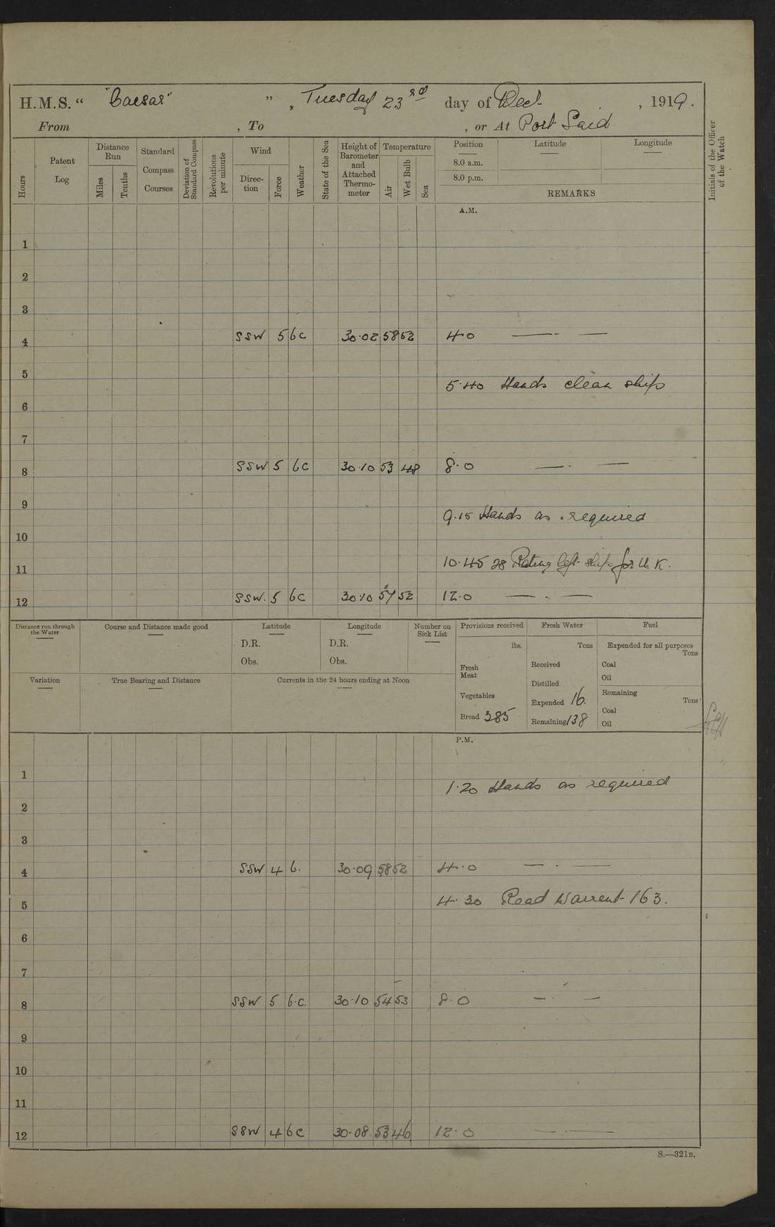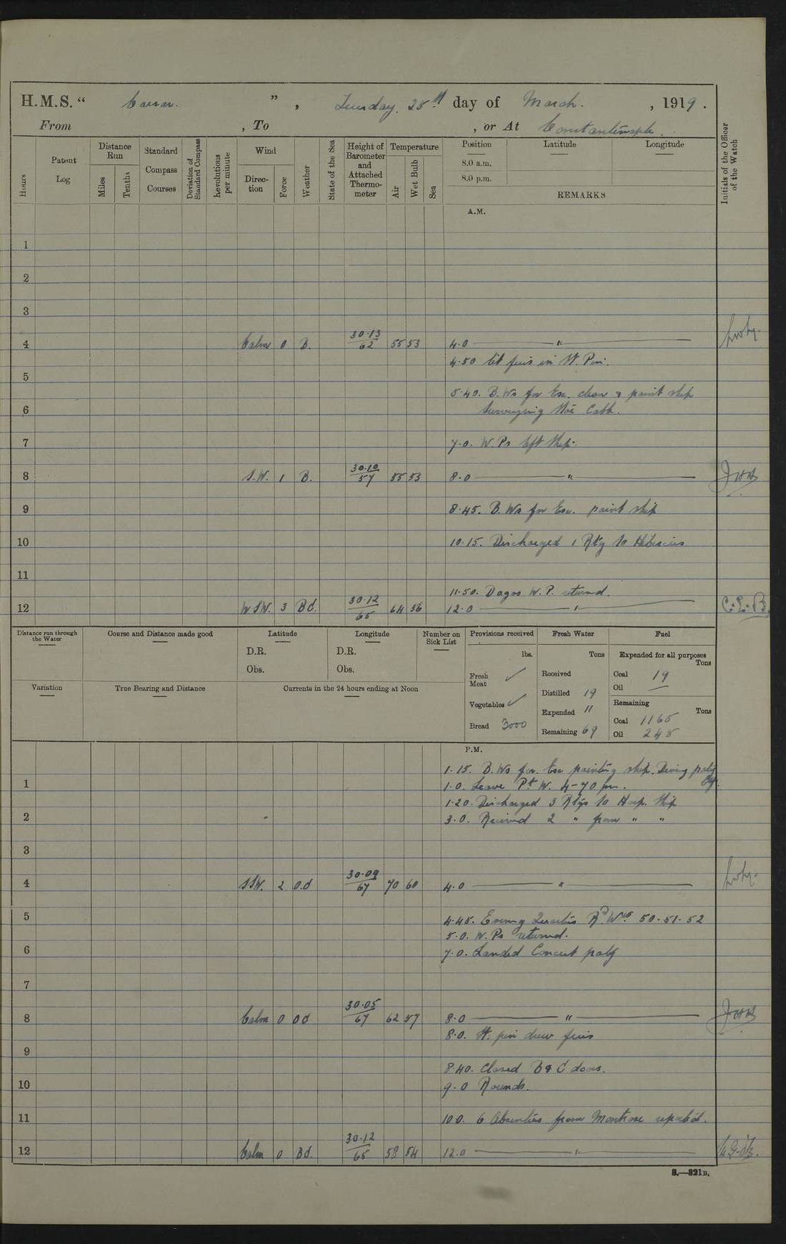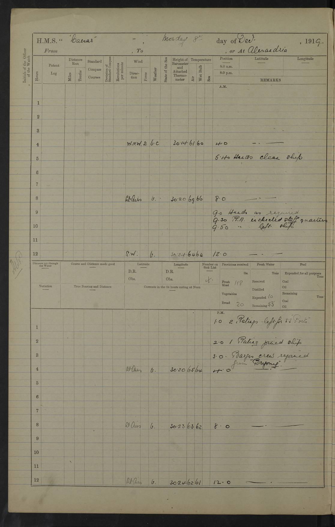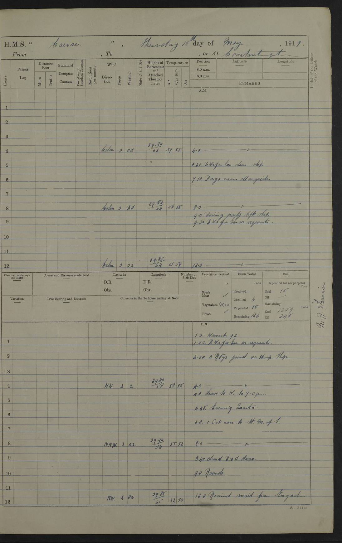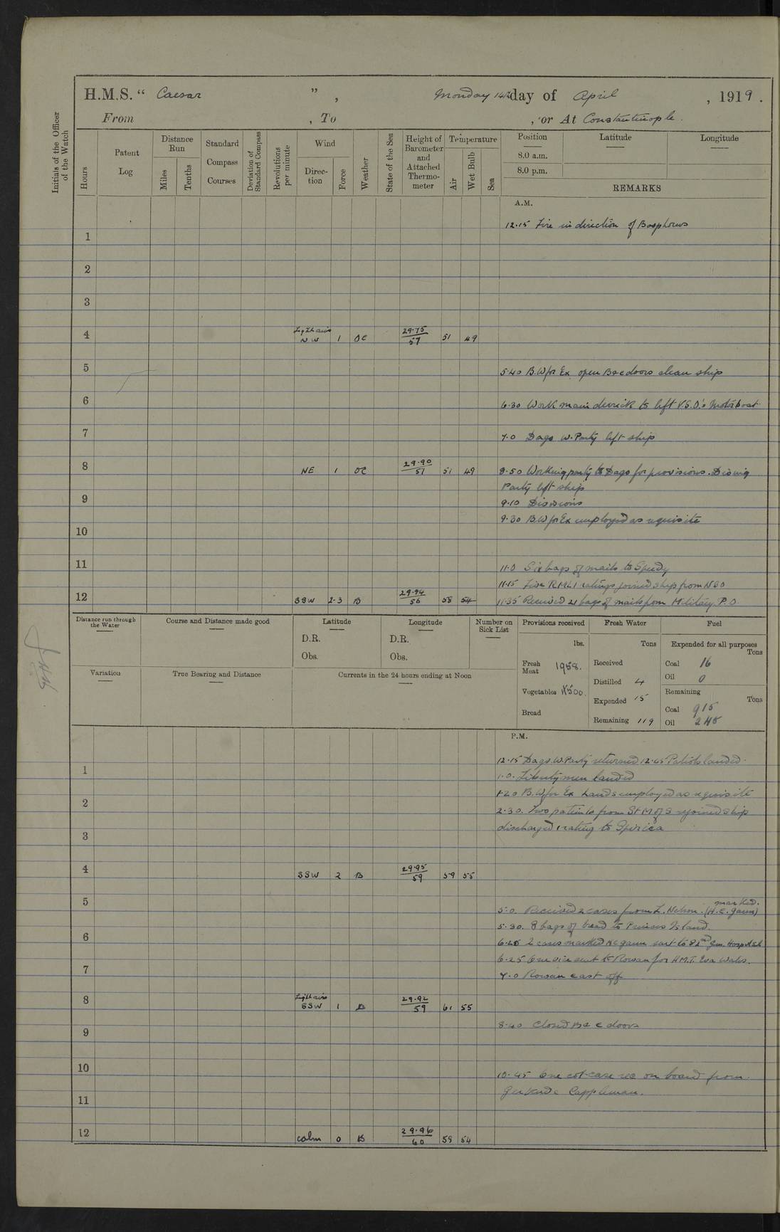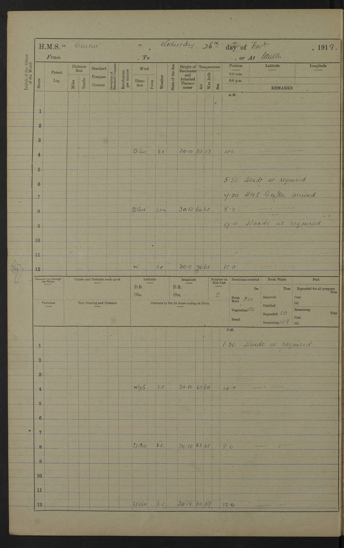 4edebb7b14d0450578000168: (https://s3.amazonaws.com:443/oldweather/ADM53-36589/0003_1.jpg) 1 November 1918 At Malta Lat 35.89, Long 14.52 [Somerset Wharf] 11.15am: Engineers Store Party returned on Board. 0.45pm: Paid Monthly Money. 1.0pm: Mr Goss, Gunner rejoined Ship from RN Hospital. 2.30pm: Gave Special leave to Port Watch untill 7.0am and Port Watch of Boys untill 6.0pm. Hands Made [sic] and Mend Clothes. 2.40pm: Landed liberty Men and Boys. 3.50pm: Provision Boat came alongside. 4.10pm: (4) Recovered Patients rejoined Ship from RN Hospital. 4.30pm: Landed liberty Men and Patrol. 6.0pm: Liberty Boys Returned on Board. 6.30pm: Canteen Party landed untill 10.0pm and Read Warrant No (24). 10.0pm: Canteen Party returned on Board. 11.50pm: Patrol returned on Board. [Provisions received: Fresh Meat 300 lbs, Vegetables 1000 lbs, Bread 450 lbs] 4edebb7c14d0450578000169: (https://s3.amazonaws.com:443/oldweather/ADM53-36589/0004_0.jpg) 2 November 1918 At Malta Lat 35.89, Long 14.52 [Hamilton Wharf] 7.15am: Shifted Berths from Somerset Wharf, to Hamilton Wharf. 8.0am: Tested life Buoys Correct. 8.45am: BW for x Told off Special Parties, Remainder of Hands employed as Requisite, and Landed Picket house Party. 9.10am: Held Court Martial on Board. 10.30am: Court Martial Finished. Noon: Picket House Party returned. 1.20pm: BW for x. Told off Special Parties. Remainder of Hands employed getting in Paymasters Stores and as Requisite. Lost overboard by accident Boat Hooks, Steel, Pattern (345), 2 in Number. 4.20pm: Hands to Fire Stations. 4.35pm: Read Warrant No 25 and gave Special leave to Starboard Watch untill 7.0am. 5.0pm: Landed liberty Men and Victualling Yard Lighter left Ship. 6.30pm: Canteen Party landed untill 10.0pm. [Provisions received: Fresh Meat 260 lbs, Bread 900 lbs] 4edebb7c14d045057800016a: (https://s3.amazonaws.com:443/oldweather/ADM53-36589/0004_1.jpg) 3 November 1918 At Malta Lat 35.89, Long 14.52 [Hamilton Wharf] 9.0am: Landed Church Parties, Wesleyans (14), Presbyterians (10). 9.30am: Divisions. 9.50am: Landed Roman Catholics (15). 10.10am: Discharged (5) Ratings to RN Hospital. 11.35am: All Church Parties returned on Board. 1.0pm: Gave Special leave to Port Watch untill 7.0am and Both Watches of Boys untill 5.30pm. 1.15pm: Landed liberty Men and Boys. 5.30pm: Liberty Boys returned on Board. 6.30pm: Canteen Party landed untill 10.0pm. 8.40pm: Closed B and C Doors. 10.0pm: Canteen Party returned on Board. [Number on sick list: 5] [Provisions received: Fresh Meat 280 lbs] 4edebb7c14d045057800016b: (https://s3.amazonaws.com:443/oldweather/ADM53-36589/0005_0.jpg) 4 November 1918 At Malta Lat 35.89, Long 14.52 [Hamilton Wharf] 6.50am: BW for x Told off Special Parties, remainder of Hands employed as Requisite. 7.0am: Liberty men returned on Board. 8.5am: Provision lighter came alongside. 8.10am: BW for x, Told off Special Parties, remainder of Hands employed Provisioning Ship and as requisite. 8.45am: Landed (1) Carpenter rating for Examination. 3.45pm: (2) Recovered Patients joined Ship from RN Hospital. 4.10pm: Received 8 Bags of Mails from Egmont, and Gave Special leave to Starboard Watch till 7.0am. 5.0pm: Landed Liberty Men and Patrol. 6.0pm: Hands employed getting in and stowing away Provisions. Midnight: Patrol returned on Board. [Weather fine, noon temperature 74F] 4edebb7c14d045057800016c: (https://s3.amazonaws.com:443/oldweather/ADM53-36589/0005_1.jpg) 5 November 1918 At Malta Lat 35.89, Long 14.52 [Hamilton Wharf] 6.45am: BW for x. Told off Special Parties. Remainder of Hands employed getting in and stowing away Provisions. 8.30am: Landed Hospital Party and Picket House Party. 11.0am: Landed (35) Rifles to Naval Ordinance for exchange. Noon: Picket House Party returned. 1.20pm: Landed (2) Ratings for Dental Treatment. 2.25pm: (35) Exchanged Rifles came on Board. 3.40pm: (2) Recovered Patients rejoined Ship from RN Hospital and disinfected Bedding. 4.0pm: Gave Special leave to Port Watch untill 7.0am. Starboard Watch employed stowing Provisions. 4.30pm: Landed Liberty men. Starboard Watch employed stowing away Provisions and Read Warrant No (26). [Provisions received: Fresh Meat 530 lbs, Bread 1000 lbs] 4edebb7c14d045057800016d: (https://s3.amazonaws.com:443/oldweather/ADM53-36589/0006_0.jpg) 6 November 1918 At Malta Lat 35.89, Long 14.52 [Hamilton Wharf] 6.50am: BW for x. Told off Special Parties, Remainder of Port Watch stowing Provisions, Starboard Watch drawing Quarter Deck Awning. 9.0am: Hands employed Provisioning Ship. 4.0pm: Gave Special leave to Starboard Watch untill 7.0am. 4.30pm: Landed liberty Men. Port Watch employed stowing away Provisions. 6.30pm: Canteen Party landed until 10.0pm. 10.0pm: Canteen Party returned on Board. [Number on sick list: 5] [Provisions received: Fresh Meat 250 lbs, Vegetables 1000 lbs, Bread 450 lbs] [Fuel Remaining: Coal 244 tons, Oil 332 tons] 4edebb7c14d045057800016e: (https://s3.amazonaws.com:443/oldweather/ADM53-36589/0006_1.jpg) 7 November 1918 At Malta Lat 35.89, Long 14.52 [No 4 Buoy] 6.30am: BW for x. Told off Special Parties. Remainder of Hands employed prepairing [preparing] Ship to Shift Berths, from Hamilton Wharf to No 4 Buoy. 7.0am: Liberty men returned on Board. 8.50am: Secured Ship to No 4 Buoy and Coal Lighters came alongside. 9.10am: Commenced Coaling Native labour. Hands employed Drawing Stores and as Requisite. 11.50am: Dockyard Parties returned. 1.40pm: BW for x Told off Special Parties, remainder of Hands employed as Requisite. 4.30pm: Gave Special leave to Port Watch untill 7.0am. 4.45pm: Landed liberty men and Patrol and Read Warrant No (27). 7.30pm: Completed Coaling (1481) Tons. 8.40pm: Watch employed sweeping down. 11.50pm: Patrol returned on Board. [Number on sick list: 6] [Provisions received: Fresh Meat 280 lbs, Bread 300 lbs] [Fuel Remaining: Coal 1716 tons, Oil 332 tons] 4edebb7c14d045057800016f: (https://s3.amazonaws.com:443/oldweather/ADM53-36589/0007_0.jpg) 8 November 1918 At Malta Lat 35.89, Long 