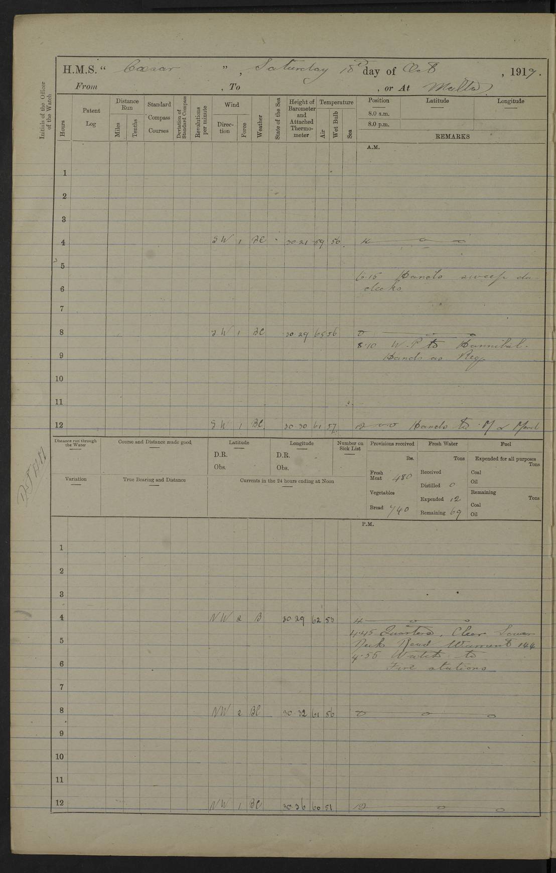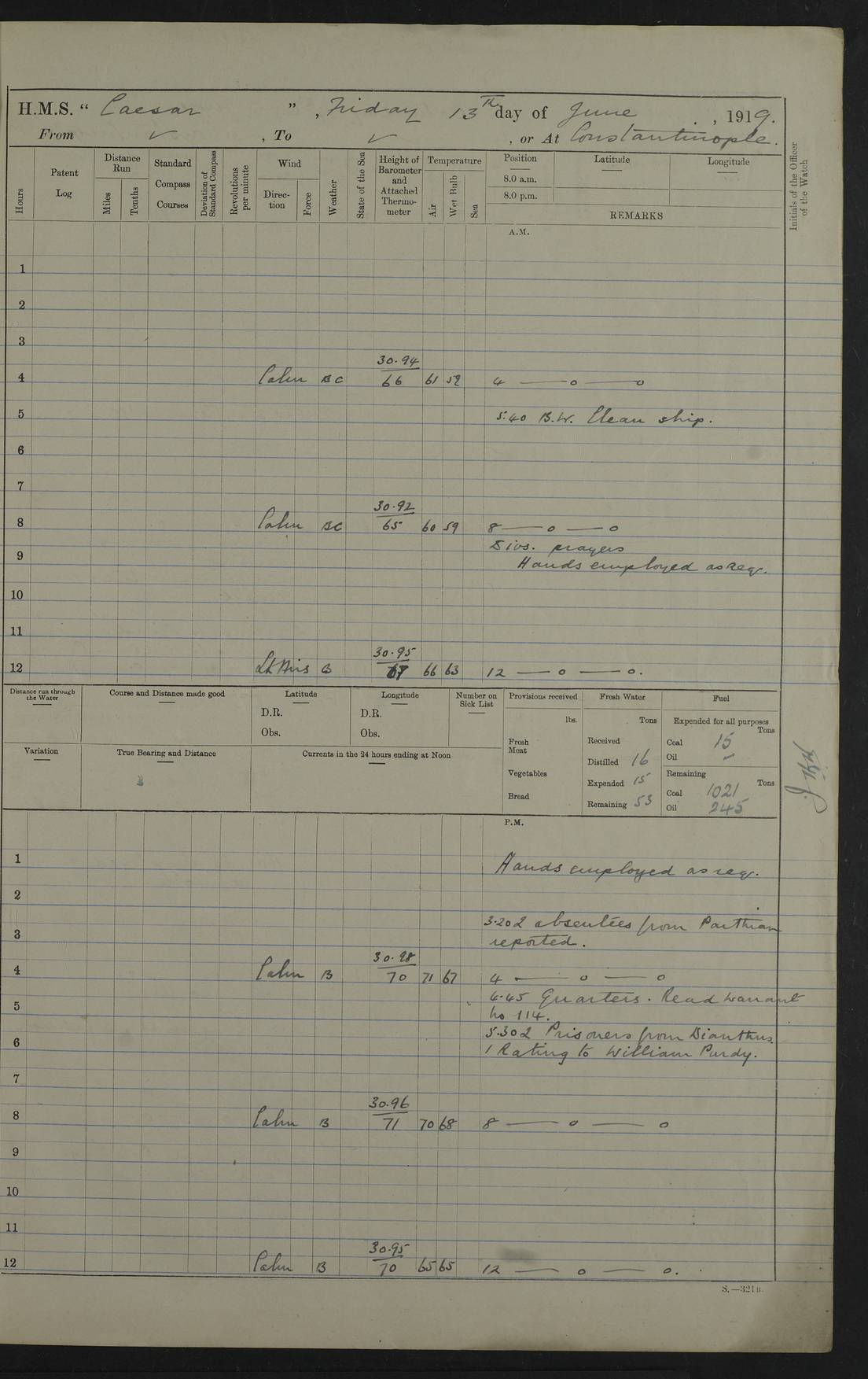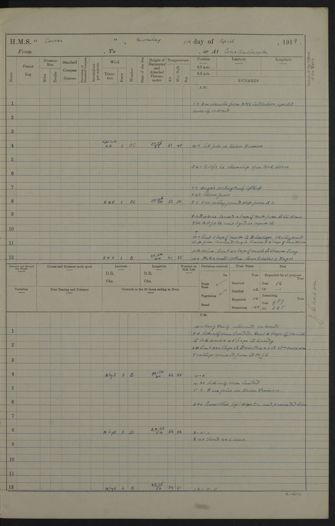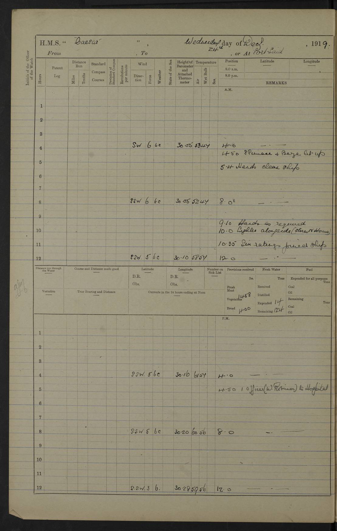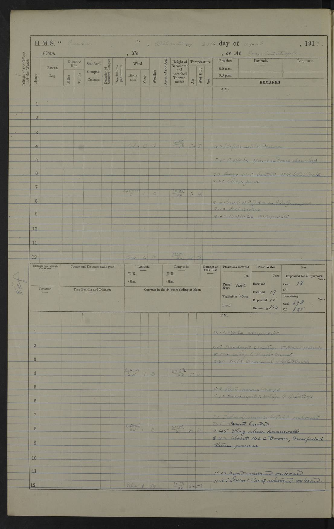 4edebb7b14d0450578000168: (https://s3.amazonaws.com:443/oldweather/ADM53-36589/0003_1.jpg) 1 November 1918 At Malta Lat 35.89, Long 14.52 [Somerset Wharf] 11.15am: Engineers Store Party returned on Board. 0.45pm: Paid Monthly Money. 1.0pm: Mr Goss, Gunner rejoined Ship from RN Hospital. 2.30pm: Gave Special leave to Port Watch untill 7.0am and Port Watch of Boys untill 6.0pm. Hands Made [sic] and Mend Clothes. 2.40pm: Landed liberty Men and Boys. 3.50pm: Provision Boat came alongside. 4.10pm: (4) Recovered Patients rejoined Ship from RN Hospital. 4.30pm: Landed liberty Men and Patrol. 6.0pm: Liberty Boys Returned on Board. 6.30pm: Canteen Party landed untill 10.0pm and Read Warrant No (24). 10.0pm: Canteen Party returned on Board. 11.50pm: Patrol returned on Board. [Provisions received: Fresh Meat 300 lbs, Vegetables 1000 lbs, Bread 450 lbs] 4edebb7c14d0450578000169: (https://s3.amazonaws.com:443/oldweather/ADM53-36589/0004_0.jpg) 2 November 1918 At Malta Lat 35.89, Long 14.52 [Hamilton Wharf] 7.15am: Shifted Berths from Somerset Wharf, to Hamilton Wharf. 8.0am: Tested life Buoys Correct. 8.45am: BW for x Told off Special Parties, Remainder of Hands employed as Requisite, and Landed Picket house Party. 9.10am: Held Court Martial on Board. 10.30am: Court Martial Finished. Noon: Picket House Party returned. 1.20pm: BW for x. Told off Special Parties. Remainder of Hands employed getting in Paymasters Stores and as Requisite. Lost overboard by accident Boat Hooks, Steel, Pattern (345), 2 in Number. 4.20pm: Hands to Fire Stations. 4.35pm: Read Warrant No 25 and gave Special leave to Starboard Watch untill 7.0am. 5.0pm: Landed liberty Men and Victualling Yard Lighter left Ship. 6.30pm: Canteen Party landed untill 10.0pm. [Provisions received: Fresh Meat 260 lbs, Bread 900 lbs] 4edebb7c14d045057800016a: (https://s3.amazonaws.com:443/oldweather/ADM53-36589/0004_1.jpg) 3 November 1918 At Malta Lat 35.89, Long 14.52 [Hamilton Wharf] 9.0am: Landed Church Parties, Wesleyans (14), Presbyterians (10). 9.30am: Divisions. 9.50am: Landed Roman Catholics (15). 10.10am: Discharged (5) Ratings to RN Hospital. 11.35am: All Church Parties returned on Board. 1.0pm: Gave Special leave to Port Watch untill 7.0am and Both Watches of Boys untill 5.30pm. 1.15pm: Landed liberty Men and Boys. 5.30pm: Liberty Boys returned on Board. 6.30pm: Canteen Party landed untill 10.0pm. 8.40pm: Closed B and C Doors. 10.0pm: Canteen Party returned on Board. [Number on sick list: 5] [Provisions received: Fresh Meat 280 lbs] 4edebb7c14d045057800016b: (https://s3.amazonaws.com:443/oldweather/ADM53-36589/0005_0.jpg) 4 November 1918 At Malta Lat 35.89, Long 14.52 [Hamilton Wharf] 6.50am: BW for x Told off Special Parties, remainder of Hands employed as Requisite. 7.0am: Liberty men returned on Board. 8.5am: Provision lighter came alongside. 8.10am: BW for x, Told off Special Parties, remainder of Hands employed Provisioning Ship and as requisite. 8.45am: Landed (1) Carpenter rating for Examination. 3.45pm: (2) Recovered Patients joined Ship from RN Hospital. 4.10pm: Received 8 Bags of Mails from Egmont, and Gave Special leave to Starboard Watch till 7.0am. 5.0pm: Landed Liberty Men and Patrol. 6.0pm: Hands employed getting in and stowing away Provisions. Midnight: Patrol returned on Board. [Weather fine, noon temperature 74F] 4edebb7c14d045057800016c: (https://s3.amazonaws.com:443/oldweather/ADM53-36589/0005_1.jpg) 5 November 1918 At Malta Lat 35.89, Long 14.52 [Hamilton Wharf] 6.45am: BW for x. Told off Special Parties. Remainder of Hands employed getting in and stowing away Provisions. 8.30am: Landed Hospital Party and Picket House Party. 11.0am: Landed (35) Rifles to Naval Ordinance for exchange. Noon: Picket House Party returned. 1.20pm: Landed (2) Ratings for Dental Treatment. 2.25pm: (35) Exchanged Rifles came on Board. 3.40pm: (2) Recovered Patients rejoined Ship from RN Hospital and disinfected Bedding. 4.0pm: Gave Special leave to Port Watch untill 7.0am. Starboard Watch employed stowing Provisions. 4.30pm: Landed Liberty men. Starboard Watch employed stowing away Provisions and Read Warrant No (26). [Provisions received: Fresh Meat 530 lbs, Bread 1000 lbs] 4edebb7c14d045057800016d: (https://s3.amazonaws.com:443/oldweather/ADM53-36589/0006_0.jpg) 6 November 1918 At Malta Lat 35.89, Long 14.52 [Hamilton Wharf] 6.50am: BW for x. Told off Special Parties, Remainder of Port Watch stowing Provisions, Starboard Watch drawing Quarter Deck Awning. 9.0am: Hands employed Provisioning Ship. 4.0pm: Gave Special leave to Starboard Watch untill 7.0am. 4.30pm: Landed liberty Men. Port Watch employed stowing away Provisions. 6.30pm: Canteen Party landed until 10.0pm. 10.0pm: Canteen Party returned on Board. [Number on sick list: 5] [Provisions received: Fresh Meat 250 lbs, Vegetables 1000 lbs, Bread 450 lbs] [Fuel Remaining: Coal 244 tons, Oil 332 tons] 4edebb7c14d045057800016e: (https://s3.amazonaws.com:443/oldweather/ADM53-36589/0006_1.jpg) 7 November 1918 At Malta Lat 35.89, Long 14.52 [No 4 Buoy] 6.30am: BW for x. Told off Special Parties. Remainder of Hands employed prepairing [preparing] Ship to Shift Berths, from Hamilton Wharf to No 4 Buoy. 7.0am: Liberty men returned on Board. 8.50am: Secured Ship to No 4 Buoy and Coal Lighters came alongside. 9.10am: Commenced Coaling Native labour. Hands employed Drawing Stores and as Requisite. 11.50am: Dockyard Parties returned. 1.40pm: BW for x Told off Special Parties, remainder of Hands employed as Requisite. 4.30pm: Gave Special leave to Port Watch untill 7.0am. 4.45pm: Landed liberty men and Patrol and Read Warrant No (27). 7.30pm: Completed Coaling (1481) Tons. 8.40pm: Watch employed sweeping down. 11.50pm: Patrol returned on Board. [Number on sick list: 6] [Provisions received: Fresh Meat 280 lbs, Bread 300 lbs] [Fuel Remaining: Coal 1716 tons, Oil 332 tons] 4edebb7c14d045057800016f: (https://s3.amazonaws.com:443/oldweather/ADM53-36589/0007_0.jpg) 8 November 1918 At Malta Lat 35.89, Long 