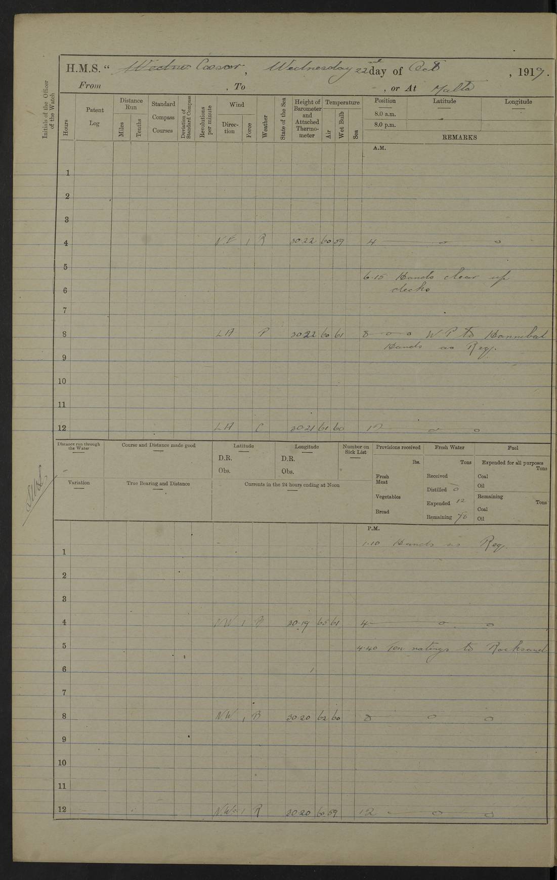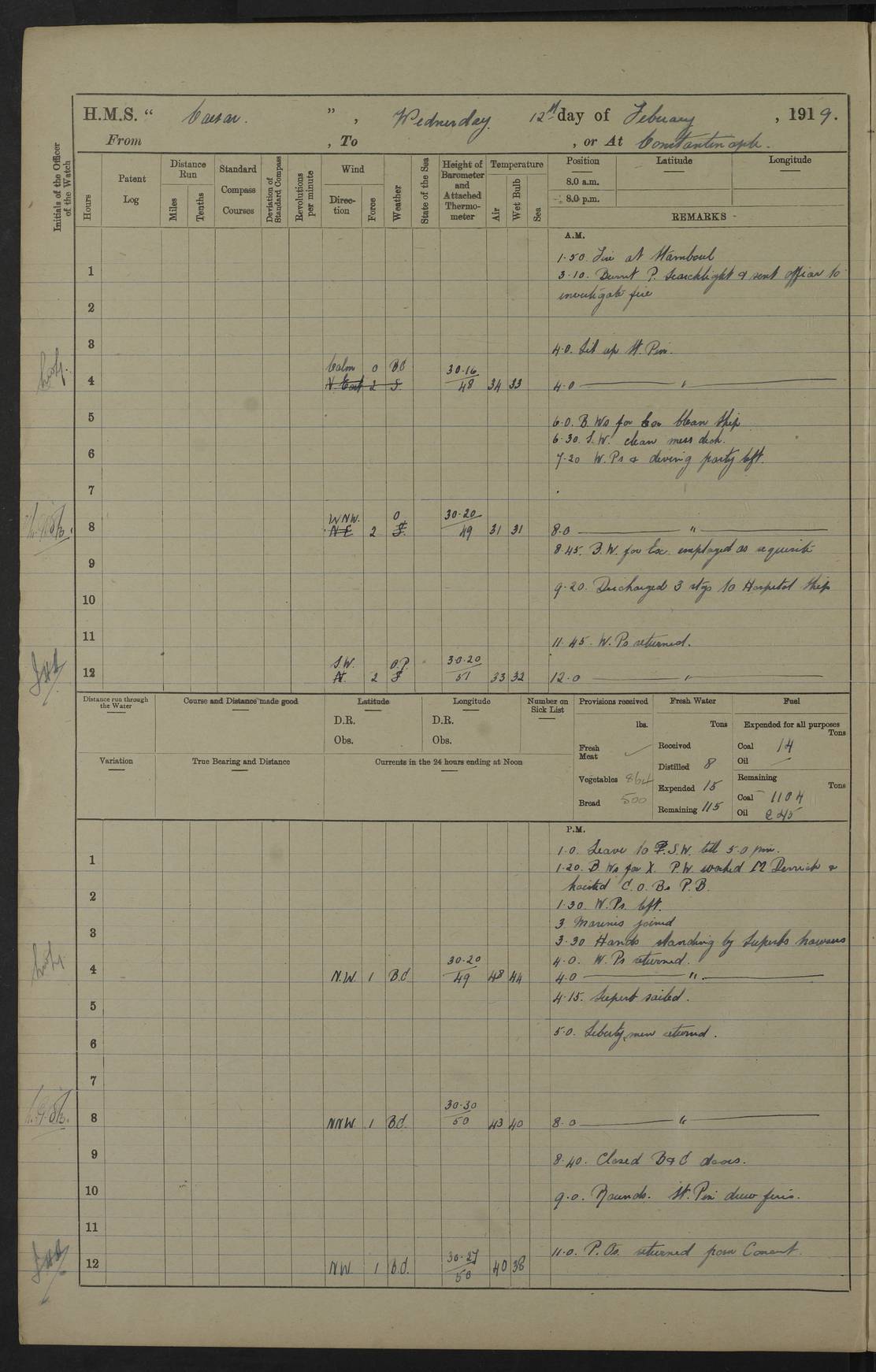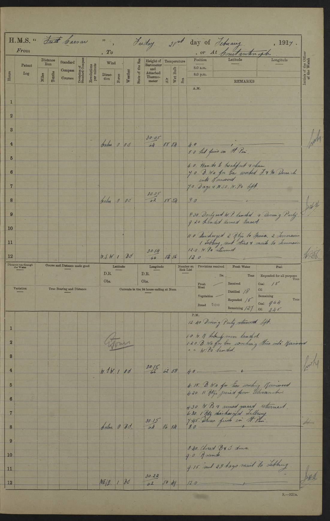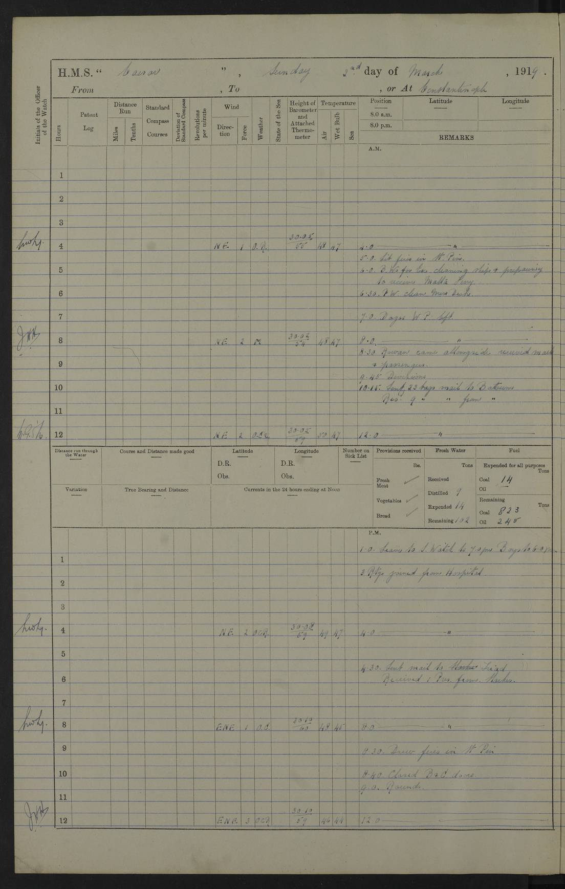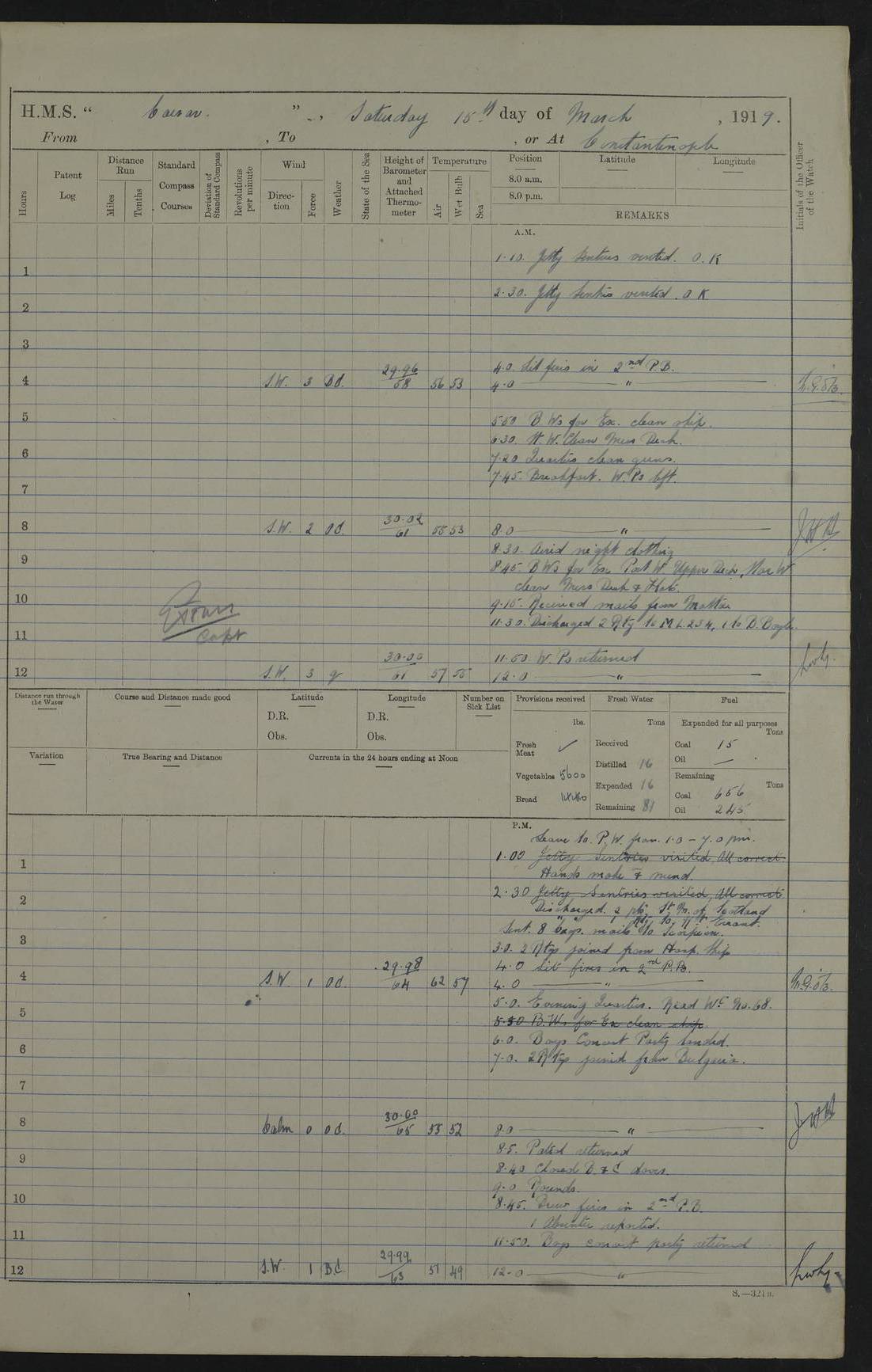 4edebb7b14d0450578000168: (https://s3.amazonaws.com:443/oldweather/ADM53-36589/0003_1.jpg) 1 November 1918 At Malta Lat 35.89, Long 14.52 [Somerset Wharf] 11.15am: Engineers Store Party returned on Board. 0.45pm: Paid Monthly Money. 1.0pm: Mr Goss, Gunner rejoined Ship from RN Hospital. 2.30pm: Gave Special leave to Port Watch untill 7.0am and Port Watch of Boys untill 6.0pm. Hands Made [sic] and Mend Clothes. 2.40pm: Landed liberty Men and Boys. 3.50pm: Provision Boat came alongside. 4.10pm: (4) Recovered Patients rejoined Ship from RN Hospital. 4.30pm: Landed liberty Men and Patrol. 6.0pm: Liberty Boys Returned on Board. 6.30pm: Canteen Party landed untill 10.0pm and Read Warrant No (24). 10.0pm: Canteen Party returned on Board. 11.50pm: Patrol returned on Board. [Provisions received: Fresh Meat 300 lbs, Vegetables 1000 lbs, Bread 450 lbs] 4edebb7c14d0450578000169: (https://s3.amazonaws.com:443/oldweather/ADM53-36589/0004_0.jpg) 2 November 1918 At Malta Lat 35.89, Long 14.52 [Hamilton Wharf] 7.15am: Shifted Berths from Somerset Wharf, to Hamilton Wharf. 8.0am: Tested life Buoys Correct. 8.45am: BW for x Told off Special Parties, Remainder of Hands employed as Requisite, and Landed Picket house Party. 9.10am: Held Court Martial on Board. 10.30am: Court Martial Finished. Noon: Picket House Party returned. 1.20pm: BW for x. Told off Special Parties. Remainder of Hands employed getting in Paymasters Stores and as Requisite. Lost overboard by accident Boat Hooks, Steel, Pattern (345), 2 in Number. 4.20pm: Hands to Fire Stations. 4.35pm: Read Warrant No 25 and gave Special leave to Starboard Watch untill 7.0am. 5.0pm: Landed liberty Men and Victualling Yard Lighter left Ship. 6.30pm: Canteen Party landed untill 10.0pm. [Provisions received: Fresh Meat 260 lbs, Bread 900 lbs] 4edebb7c14d045057800016a: (https://s3.amazonaws.com:443/oldweather/ADM53-36589/0004_1.jpg) 3 November 1918 At Malta Lat 35.89, Long 14.52 [Hamilton Wharf] 9.0am: Landed Church Parties, Wesleyans (14), Presbyterians (10). 9.30am: Divisions. 9.50am: Landed Roman Catholics (15). 10.10am: Discharged (5) Ratings to RN Hospital. 11.35am: All Church Parties returned on Board. 1.0pm: Gave Special leave to Port Watch untill 7.0am and Both Watches of Boys untill 5.30pm. 1.15pm: Landed liberty Men and Boys. 5.30pm: Liberty Boys returned on Board. 6.30pm: Canteen Party landed untill 10.0pm. 8.40pm: Closed B and C Doors. 10.0pm: Canteen Party returned on Board. [Number on sick list: 5] [Provisions received: Fresh Meat 280 lbs] 4edebb7c14d045057800016b: (https://s3.amazonaws.com:443/oldweather/ADM53-36589/0005_0.jpg) 4 November 1918 At Malta Lat 35.89, Long 14.52 [Hamilton Wharf] 6.50am: BW for x Told off Special Parties, remainder of Hands employed as Requisite. 7.0am: Liberty men returned on Board. 8.5am: Provision lighter came alongside. 8.10am: BW for x, Told off Special Parties, remainder of Hands employed Provisioning Ship and as requisite. 8.45am: Landed (1) Carpenter rating for Examination. 3.45pm: (2) Recovered Patients joined Ship from RN Hospital. 4.10pm: Received 8 Bags of Mails from Egmont, and Gave Special leave to Starboard Watch till 7.0am. 5.0pm: Landed Liberty Men and Patrol. 6.0pm: Hands employed getting in and stowing away Provisions. Midnight: Patrol returned on Board. [Weather fine, noon temperature 74F] 4edebb7c14d045057800016c: (https://s3.amazonaws.com:443/oldweather/ADM53-36589/0005_1.jpg) 5 November 1918 At Malta Lat 35.89, Long 14.52 [Hamilton Wharf] 6.45am: BW for x. Told off Special Parties. Remainder of Hands employed getting in and stowing away Provisions. 8.30am: Landed Hospital Party and Picket House Party. 11.0am: Landed (35) Rifles to Naval Ordinance for exchange. Noon: Picket House Party returned. 1.20pm: Landed (2) Ratings for Dental Treatment. 2.25pm: (35) Exchanged Rifles came on Board. 3.40pm: (2) Recovered Patients rejoined Ship from RN Hospital and disinfected Bedding. 4.0pm: Gave Special leave to Port Watch untill 7.0am. Starboard Watch employed stowing Provisions. 4.30pm: Landed Liberty men. Starboard Watch employed stowing away Provisions and Read Warrant No (26). [Provisions received: Fresh Meat 530 lbs, Bread 1000 lbs] 4edebb7c14d045057800016d: (https://s3.amazonaws.com:443/oldweather/ADM53-36589/0006_0.jpg) 6 November 1918 At Malta Lat 35.89, Long 14.52 [Hamilton Wharf] 6.50am: BW for x. Told off Special Parties, Remainder of Port Watch stowing Provisions, Starboard Watch drawing Quarter Deck Awning. 9.0am: Hands employed Provisioning Ship. 4.0pm: Gave Special leave to Starboard Watch untill 7.0am. 4.30pm: Landed liberty Men. Port Watch employed stowing away Provisions. 6.30pm: Canteen Party landed until 10.0pm. 10.0pm: Canteen Party returned on Board. [Number on sick list: 5] [Provisions received: Fresh Meat 250 lbs, Vegetables 1000 lbs, Bread 450 lbs] [Fuel Remaining: Coal 244 tons, Oil 332 tons] 4edebb7c14d045057800016e: (https://s3.amazonaws.com:443/oldweather/ADM53-36589/0006_1.jpg) 7 November 1918 At Malta Lat 35.89, Long 14.52 [No 4 Buoy] 6.30am: BW for x. Told off Special Parties. Remainder of Hands employed prepairing [preparing] Ship to Shift Berths, from Hamilton Wharf to No 4 Buoy. 7.0am: Liberty men returned on Board. 8.50am: Secured Ship to No 4 Buoy and Coal Lighters came alongside. 9.10am: Commenced Coaling Native labour. Hands employed Drawing Stores and as Requisite. 11.50am: Dockyard Parties returned. 1.40pm: BW for x Told off Special Parties, remainder of Hands employed as Requisite. 4.30pm: Gave Special leave to Port Watch untill 7.0am. 4.45pm: Landed liberty men and Patrol and Read Warrant No (27). 7.30pm: Completed Coaling (1481) Tons. 8.40pm: Watch employed sweeping down. 11.50pm: Patrol returned on Board. [Number on sick list: 6] [Provisions received: Fresh Meat 280 lbs, Bread 300 lbs] [Fuel Remaining: Coal 1716 tons, Oil 332 tons] 4edebb7c14d045057800016f: (https://s3.amazonaws.com:443/oldweather/ADM53-36589/0007_0.jpg) 8 November 1918 At Malta Lat 35.89, Long 