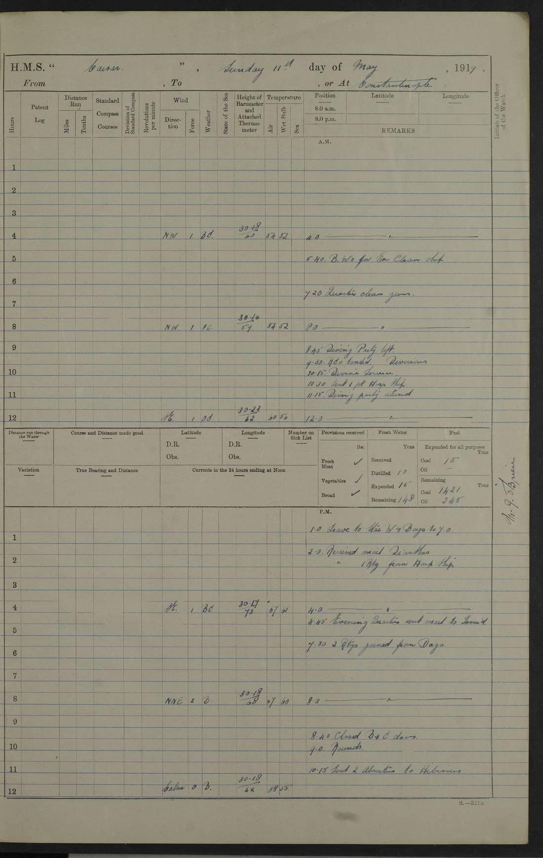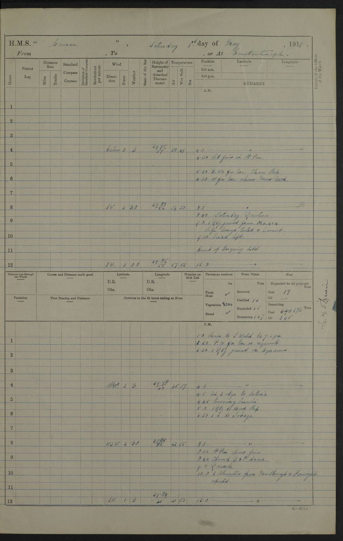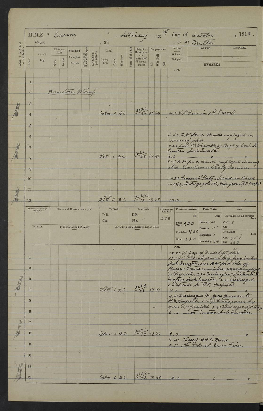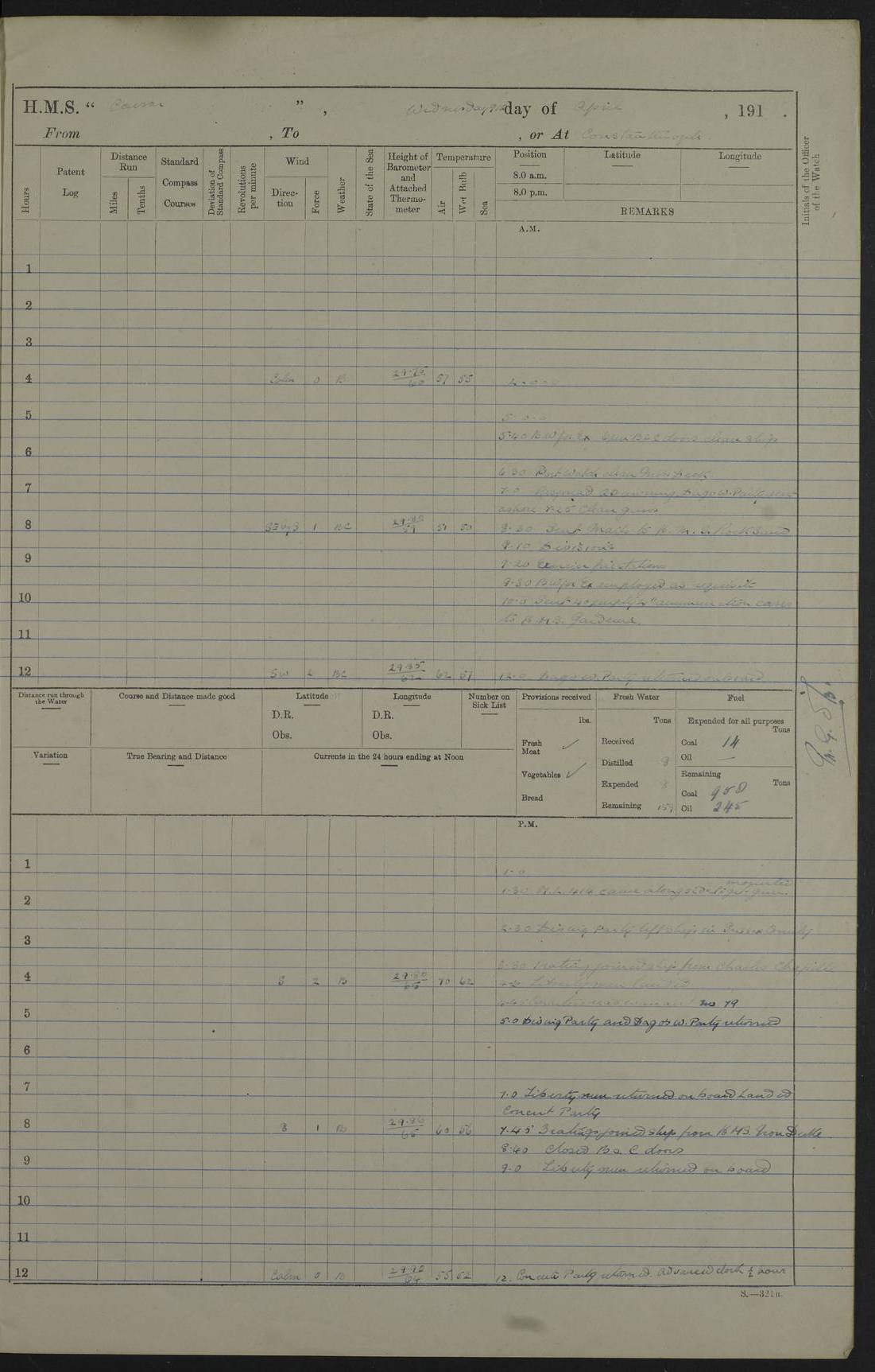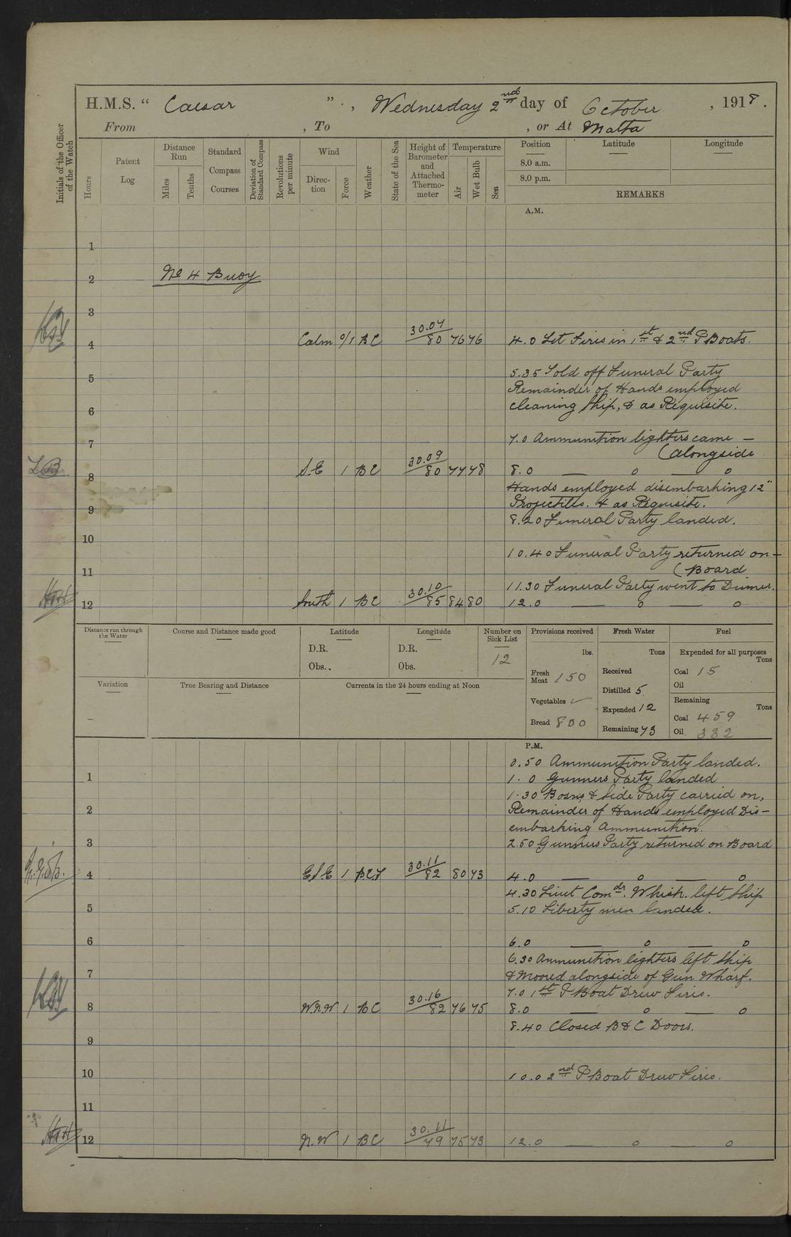 4edebb7b14d0450578000168: (https://s3.amazonaws.com:443/oldweather/ADM53-36589/0003_1.jpg) 1 November 1918 At Malta Lat 35.89, Long 14.52 [Somerset Wharf] 11.15am: Engineers Store Party returned on Board. 0.45pm: Paid Monthly Money. 1.0pm: Mr Goss, Gunner rejoined Ship from RN Hospital. 2.30pm: Gave Special leave to Port Watch untill 7.0am and Port Watch of Boys untill 6.0pm. Hands Made [sic] and Mend Clothes. 2.40pm: Landed liberty Men and Boys. 3.50pm: Provision Boat came alongside. 4.10pm: (4) Recovered Patients rejoined Ship from RN Hospital. 4.30pm: Landed liberty Men and Patrol. 6.0pm: Liberty Boys Returned on Board. 6.30pm: Canteen Party landed untill 10.0pm and Read Warrant No (24). 10.0pm: Canteen Party returned on Board. 11.50pm: Patrol returned on Board. [Provisions received: Fresh Meat 300 lbs, Vegetables 1000 lbs, Bread 450 lbs] 4edebb7c14d0450578000169: (https://s3.amazonaws.com:443/oldweather/ADM53-36589/0004_0.jpg) 2 November 1918 At Malta Lat 35.89, Long 14.52 [Hamilton Wharf] 7.15am: Shifted Berths from Somerset Wharf, to Hamilton Wharf. 8.0am: Tested life Buoys Correct. 8.45am: BW for x Told off Special Parties, Remainder of Hands employed as Requisite, and Landed Picket house Party. 9.10am: Held Court Martial on Board. 10.30am: Court Martial Finished. Noon: Picket House Party returned. 1.20pm: BW for x. Told off Special Parties. Remainder of Hands employed getting in Paymasters Stores and as Requisite. Lost overboard by accident Boat Hooks, Steel, Pattern (345), 2 in Number. 4.20pm: Hands to Fire Stations. 4.35pm: Read Warrant No 25 and gave Special leave to Starboard Watch untill 7.0am. 5.0pm: Landed liberty Men and Victualling Yard Lighter left Ship. 6.30pm: Canteen Party landed untill 10.0pm. [Provisions received: Fresh Meat 260 lbs, Bread 900 lbs] 4edebb7c14d045057800016a: (https://s3.amazonaws.com:443/oldweather/ADM53-36589/0004_1.jpg) 3 November 1918 At Malta Lat 35.89, Long 14.52 [Hamilton Wharf] 9.0am: Landed Church Parties, Wesleyans (14), Presbyterians (10). 9.30am: Divisions. 9.50am: Landed Roman Catholics (15). 10.10am: Discharged (5) Ratings to RN Hospital. 11.35am: All Church Parties returned on Board. 1.0pm: Gave Special leave to Port Watch untill 7.0am and Both Watches of Boys untill 5.30pm. 1.15pm: Landed liberty Men and Boys. 5.30pm: Liberty Boys returned on Board. 6.30pm: Canteen Party landed untill 10.0pm. 8.40pm: Closed B and C Doors. 10.0pm: Canteen Party returned on Board. [Number on sick list: 5] [Provisions received: Fresh Meat 280 lbs] 4edebb7c14d045057800016b: (https://s3.amazonaws.com:443/oldweather/ADM53-36589/0005_0.jpg) 4 November 1918 At Malta Lat 35.89, Long 14.52 [Hamilton Wharf] 6.50am: BW for x Told off Special Parties, remainder of Hands employed as Requisite. 7.0am: Liberty men returned on Board. 8.5am: Provision lighter came alongside. 8.10am: BW for x, Told off Special Parties, remainder of Hands employed Provisioning Ship and as requisite. 8.45am: Landed (1) Carpenter rating for Examination. 3.45pm: (2) Recovered Patients joined Ship from RN Hospital. 4.10pm: Received 8 Bags of Mails from Egmont, and Gave Special leave to Starboard Watch till 7.0am. 5.0pm: Landed Liberty Men and Patrol. 6.0pm: Hands employed getting in and stowing away Provisions. Midnight: Patrol returned on Board. [Weather fine, noon temperature 74F] 4edebb7c14d045057800016c: (https://s3.amazonaws.com:443/oldweather/ADM53-36589/0005_1.jpg) 5 November 1918 At Malta Lat 35.89, Long 14.52 [Hamilton Wharf] 6.45am: BW for x. Told off Special Parties. Remainder of Hands employed getting in and stowing away Provisions. 8.30am: Landed Hospital Party and Picket House Party. 11.0am: Landed (35) Rifles to Naval Ordinance for exchange. Noon: Picket House Party returned. 1.20pm: Landed (2) Ratings for Dental Treatment. 2.25pm: (35) Exchanged Rifles came on Board. 3.40pm: (2) Recovered Patients rejoined Ship from RN Hospital and disinfected Bedding. 4.0pm: Gave Special leave to Port Watch untill 7.0am. Starboard Watch employed stowing Provisions. 4.30pm: Landed Liberty men. Starboard Watch employed stowing away Provisions and Read Warrant No (26). [Provisions received: Fresh Meat 530 lbs, Bread 1000 lbs] 4edebb7c14d045057800016d: (https://s3.amazonaws.com:443/oldweather/ADM53-36589/0006_0.jpg) 6 November 1918 At Malta Lat 35.89, Long 14.52 [Hamilton Wharf] 6.50am: BW for x. Told off Special Parties, Remainder of Port Watch stowing Provisions, Starboard Watch drawing Quarter Deck Awning. 9.0am: Hands employed Provisioning Ship. 4.0pm: Gave Special leave to Starboard Watch untill 7.0am. 4.30pm: Landed liberty Men. Port Watch employed stowing away Provisions. 6.30pm: Canteen Party landed until 10.0pm. 10.0pm: Canteen Party returned on Board. [Number on sick list: 5] [Provisions received: Fresh Meat 250 lbs, Vegetables 1000 lbs, Bread 450 lbs] [Fuel Remaining: Coal 244 tons, Oil 332 tons] 4edebb7c14d045057800016e: (https://s3.amazonaws.com:443/oldweather/ADM53-36589/0006_1.jpg) 7 November 1918 At Malta Lat 35.89, Long 14.52 [No 4 Buoy] 6.30am: BW for x. Told off Special Parties. Remainder of Hands employed prepairing [preparing] Ship to Shift Berths, from Hamilton Wharf to No 4 Buoy. 7.0am: Liberty men returned on Board. 8.50am: Secured Ship to No 4 Buoy and Coal Lighters came alongside. 9.10am: Commenced Coaling Native labour. Hands employed Drawing Stores and as Requisite. 11.50am: Dockyard Parties returned. 1.40pm: BW for x Told off Special Parties, remainder of Hands employed as Requisite. 4.30pm: Gave Special leave to Port Watch untill 7.0am. 4.45pm: Landed liberty men and Patrol and Read Warrant No (27). 7.30pm: Completed Coaling (1481) Tons. 8.40pm: Watch employed sweeping down. 11.50pm: Patrol returned on Board. [Number on sick list: 6] [Provisions received: Fresh Meat 280 lbs, Bread 300 lbs] [Fuel Remaining: Coal 1716 tons, Oil 332 tons] 4edebb7c14d045057800016f: (https://s3.amazonaws.com:443/oldweather/ADM53-36589/0007_0.jpg) 8 November 1918 At Malta Lat 35.89, Long 