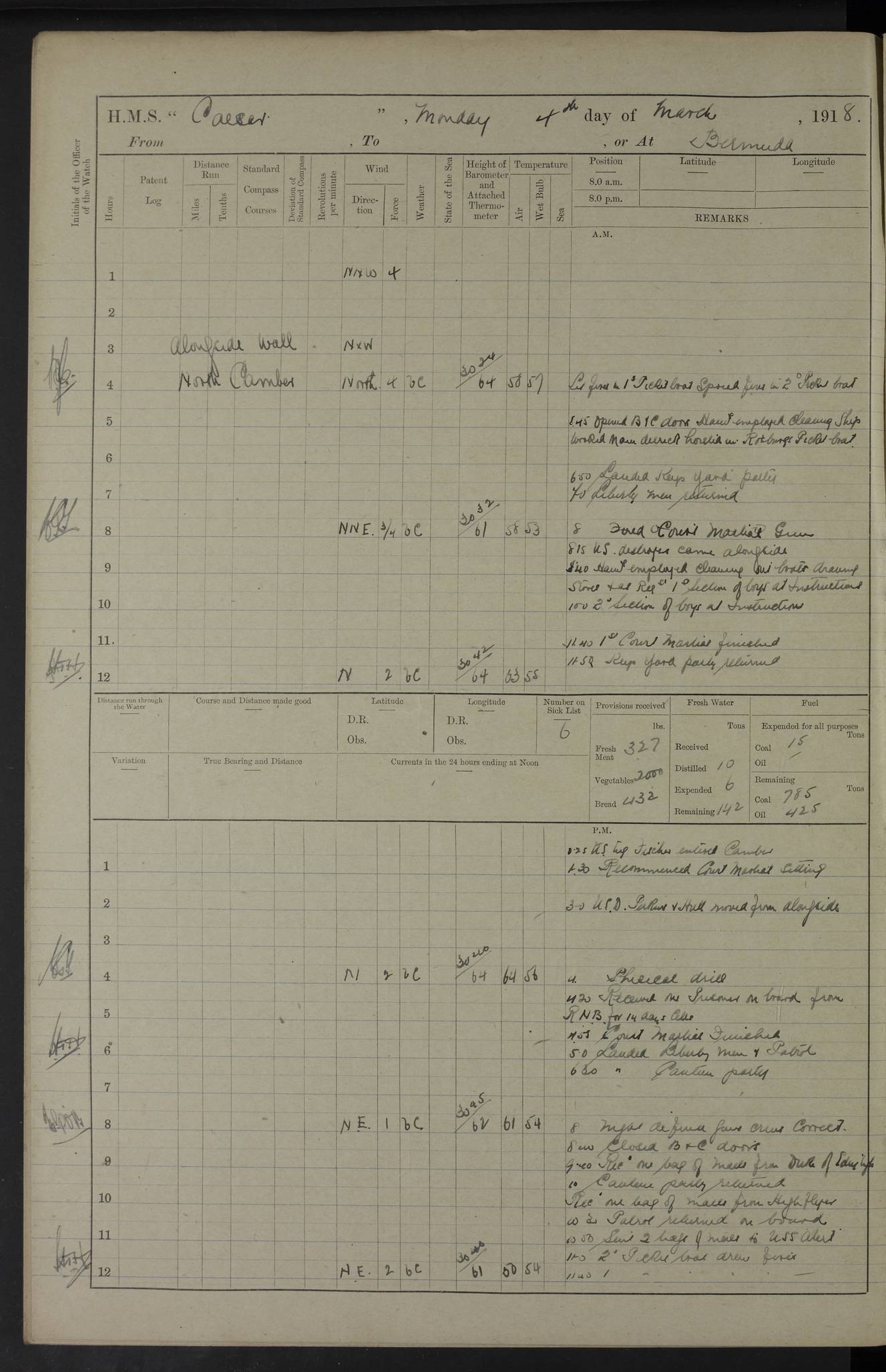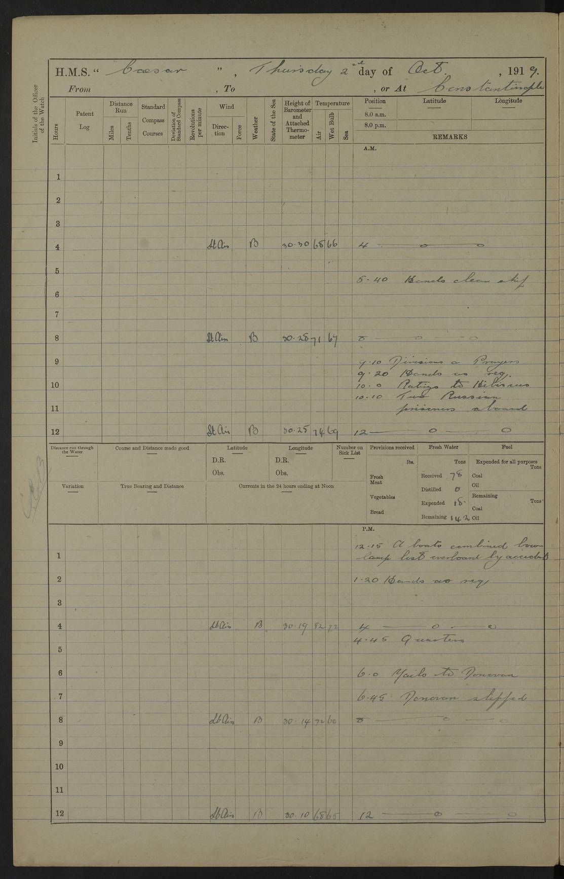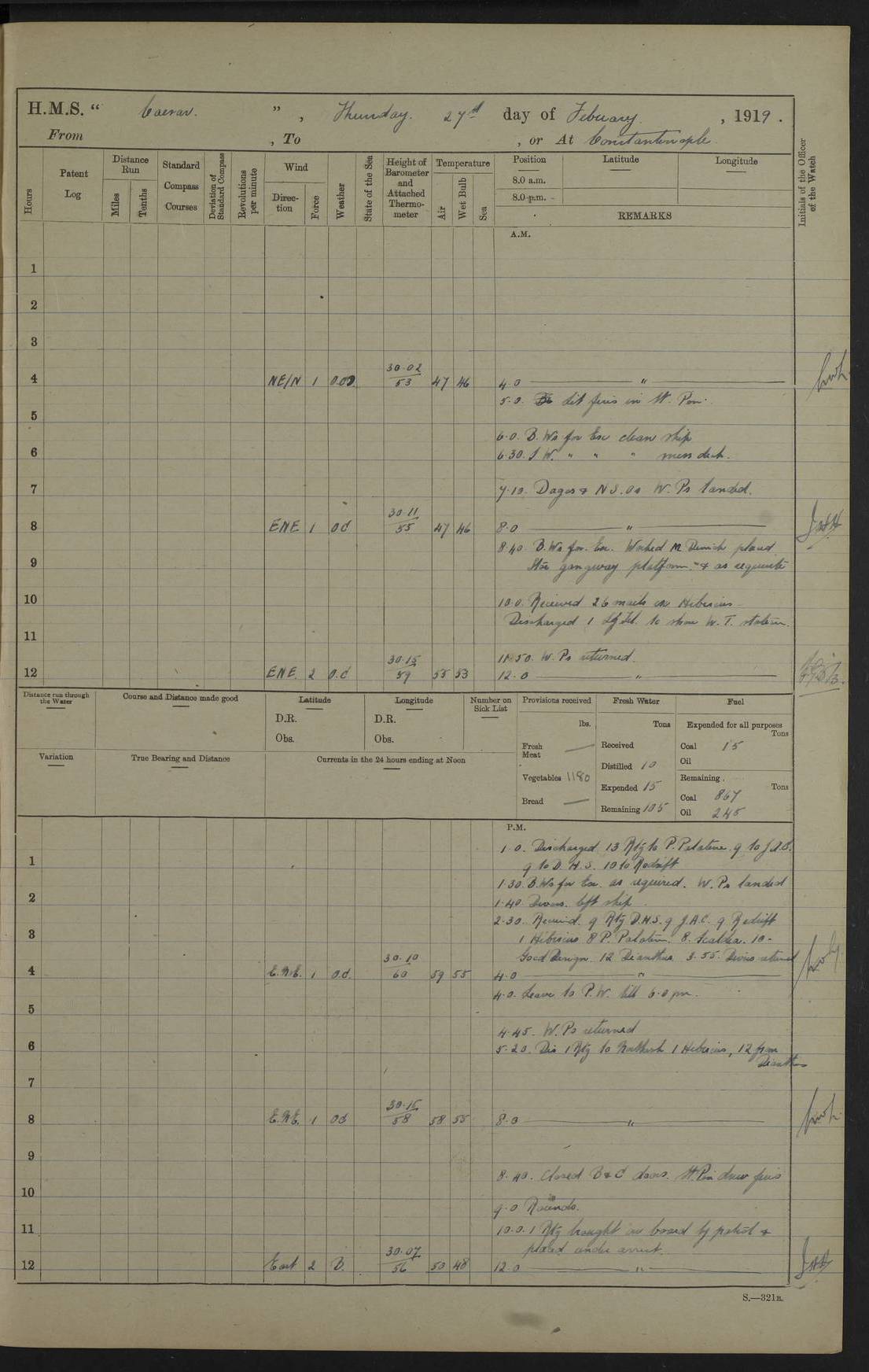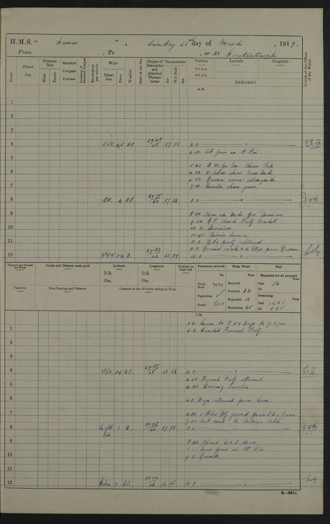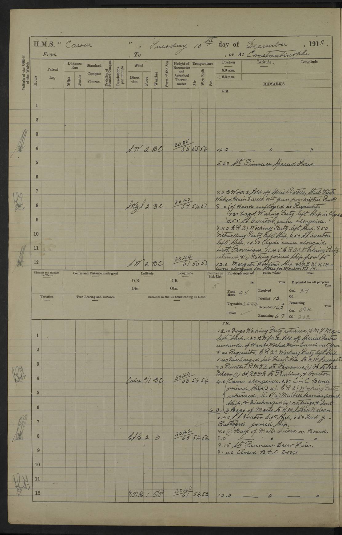 4edebb7b14d0450578000168: (https://s3.amazonaws.com:443/oldweather/ADM53-36589/0003_1.jpg) 1 November 1918 At Malta Lat 35.89, Long 14.52 [Somerset Wharf] 11.15am: Engineers Store Party returned on Board. 0.45pm: Paid Monthly Money. 1.0pm: Mr Goss, Gunner rejoined Ship from RN Hospital. 2.30pm: Gave Special leave to Port Watch untill 7.0am and Port Watch of Boys untill 6.0pm. Hands Made [sic] and Mend Clothes. 2.40pm: Landed liberty Men and Boys. 3.50pm: Provision Boat came alongside. 4.10pm: (4) Recovered Patients rejoined Ship from RN Hospital. 4.30pm: Landed liberty Men and Patrol. 6.0pm: Liberty Boys Returned on Board. 6.30pm: Canteen Party landed untill 10.0pm and Read Warrant No (24). 10.0pm: Canteen Party returned on Board. 11.50pm: Patrol returned on Board. [Provisions received: Fresh Meat 300 lbs, Vegetables 1000 lbs, Bread 450 lbs] 4edebb7c14d0450578000169: (https://s3.amazonaws.com:443/oldweather/ADM53-36589/0004_0.jpg) 2 November 1918 At Malta Lat 35.89, Long 14.52 [Hamilton Wharf] 7.15am: Shifted Berths from Somerset Wharf, to Hamilton Wharf. 8.0am: Tested life Buoys Correct. 8.45am: BW for x Told off Special Parties, Remainder of Hands employed as Requisite, and Landed Picket house Party. 9.10am: Held Court Martial on Board. 10.30am: Court Martial Finished. Noon: Picket House Party returned. 1.20pm: BW for x. Told off Special Parties. Remainder of Hands employed getting in Paymasters Stores and as Requisite. Lost overboard by accident Boat Hooks, Steel, Pattern (345), 2 in Number. 4.20pm: Hands to Fire Stations. 4.35pm: Read Warrant No 25 and gave Special leave to Starboard Watch untill 7.0am. 5.0pm: Landed liberty Men and Victualling Yard Lighter left Ship. 6.30pm: Canteen Party landed untill 10.0pm. [Provisions received: Fresh Meat 260 lbs, Bread 900 lbs] 4edebb7c14d045057800016a: (https://s3.amazonaws.com:443/oldweather/ADM53-36589/0004_1.jpg) 3 November 1918 At Malta Lat 35.89, Long 14.52 [Hamilton Wharf] 9.0am: Landed Church Parties, Wesleyans (14), Presbyterians (10). 9.30am: Divisions. 9.50am: Landed Roman Catholics (15). 10.10am: Discharged (5) Ratings to RN Hospital. 11.35am: All Church Parties returned on Board. 1.0pm: Gave Special leave to Port Watch untill 7.0am and Both Watches of Boys untill 5.30pm. 1.15pm: Landed liberty Men and Boys. 5.30pm: Liberty Boys returned on Board. 6.30pm: Canteen Party landed untill 10.0pm. 8.40pm: Closed B and C Doors. 10.0pm: Canteen Party returned on Board. [Number on sick list: 5] [Provisions received: Fresh Meat 280 lbs] 4edebb7c14d045057800016b: (https://s3.amazonaws.com:443/oldweather/ADM53-36589/0005_0.jpg) 4 November 1918 At Malta Lat 35.89, Long 14.52 [Hamilton Wharf] 6.50am: BW for x Told off Special Parties, remainder of Hands employed as Requisite. 7.0am: Liberty men returned on Board. 8.5am: Provision lighter came alongside. 8.10am: BW for x, Told off Special Parties, remainder of Hands employed Provisioning Ship and as requisite. 8.45am: Landed (1) Carpenter rating for Examination. 3.45pm: (2) Recovered Patients joined Ship from RN Hospital. 4.10pm: Received 8 Bags of Mails from Egmont, and Gave Special leave to Starboard Watch till 7.0am. 5.0pm: Landed Liberty Men and Patrol. 6.0pm: Hands employed getting in and stowing away Provisions. Midnight: Patrol returned on Board. [Weather fine, noon temperature 74F] 4edebb7c14d045057800016c: (https://s3.amazonaws.com:443/oldweather/ADM53-36589/0005_1.jpg) 5 November 1918 At Malta Lat 35.89, Long 14.52 [Hamilton Wharf] 6.45am: BW for x. Told off Special Parties. Remainder of Hands employed getting in and stowing away Provisions. 8.30am: Landed Hospital Party and Picket House Party. 11.0am: Landed (35) Rifles to Naval Ordinance for exchange. Noon: Picket House Party returned. 1.20pm: Landed (2) Ratings for Dental Treatment. 2.25pm: (35) Exchanged Rifles came on Board. 3.40pm: (2) Recovered Patients rejoined Ship from RN Hospital and disinfected Bedding. 4.0pm: Gave Special leave to Port Watch untill 7.0am. Starboard Watch employed stowing Provisions. 4.30pm: Landed Liberty men. Starboard Watch employed stowing away Provisions and Read Warrant No (26). [Provisions received: Fresh Meat 530 lbs, Bread 1000 lbs] 4edebb7c14d045057800016d: (https://s3.amazonaws.com:443/oldweather/ADM53-36589/0006_0.jpg) 6 November 1918 At Malta Lat 35.89, Long 14.52 [Hamilton Wharf] 6.50am: BW for x. Told off Special Parties, Remainder of Port Watch stowing Provisions, Starboard Watch drawing Quarter Deck Awning. 9.0am: Hands employed Provisioning Ship. 4.0pm: Gave Special leave to Starboard Watch untill 7.0am. 4.30pm: Landed liberty Men. Port Watch employed stowing away Provisions. 6.30pm: Canteen Party landed until 10.0pm. 10.0pm: Canteen Party returned on Board. [Number on sick list: 5] [Provisions received: Fresh Meat 250 lbs, Vegetables 1000 lbs, Bread 450 lbs] [Fuel Remaining: Coal 244 tons, Oil 332 tons] 4edebb7c14d045057800016e: (https://s3.amazonaws.com:443/oldweather/ADM53-36589/0006_1.jpg) 7 November 1918 At Malta Lat 35.89, Long 14.52 [No 4 Buoy] 6.30am: BW for x. Told off Special Parties. Remainder of Hands employed prepairing [preparing] Ship to Shift Berths, from Hamilton Wharf to No 4 Buoy. 7.0am: Liberty men returned on Board. 8.50am: Secured Ship to No 4 Buoy and Coal Lighters came alongside. 9.10am: Commenced Coaling Native labour. Hands employed Drawing Stores and as Requisite. 11.50am: Dockyard Parties returned. 1.40pm: BW for x Told off Special Parties, remainder of Hands employed as Requisite. 4.30pm: Gave Special leave to Port Watch untill 7.0am. 4.45pm: Landed liberty men and Patrol and Read Warrant No (27). 7.30pm: Completed Coaling (1481) Tons. 8.40pm: Watch employed sweeping down. 11.50pm: Patrol returned on Board. [Number on sick list: 6] [Provisions received: Fresh Meat 280 lbs, Bread 300 lbs] [Fuel Remaining: Coal 1716 tons, Oil 332 tons] 4edebb7c14d045057800016f: (https://s3.amazonaws.com:443/oldweather/ADM53-36589/0007_0.jpg) 8 November 1918 At Malta Lat 35.89, Long 