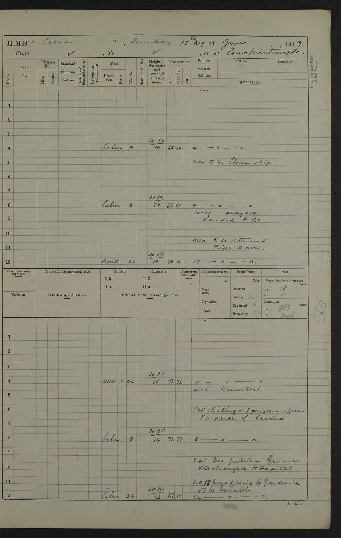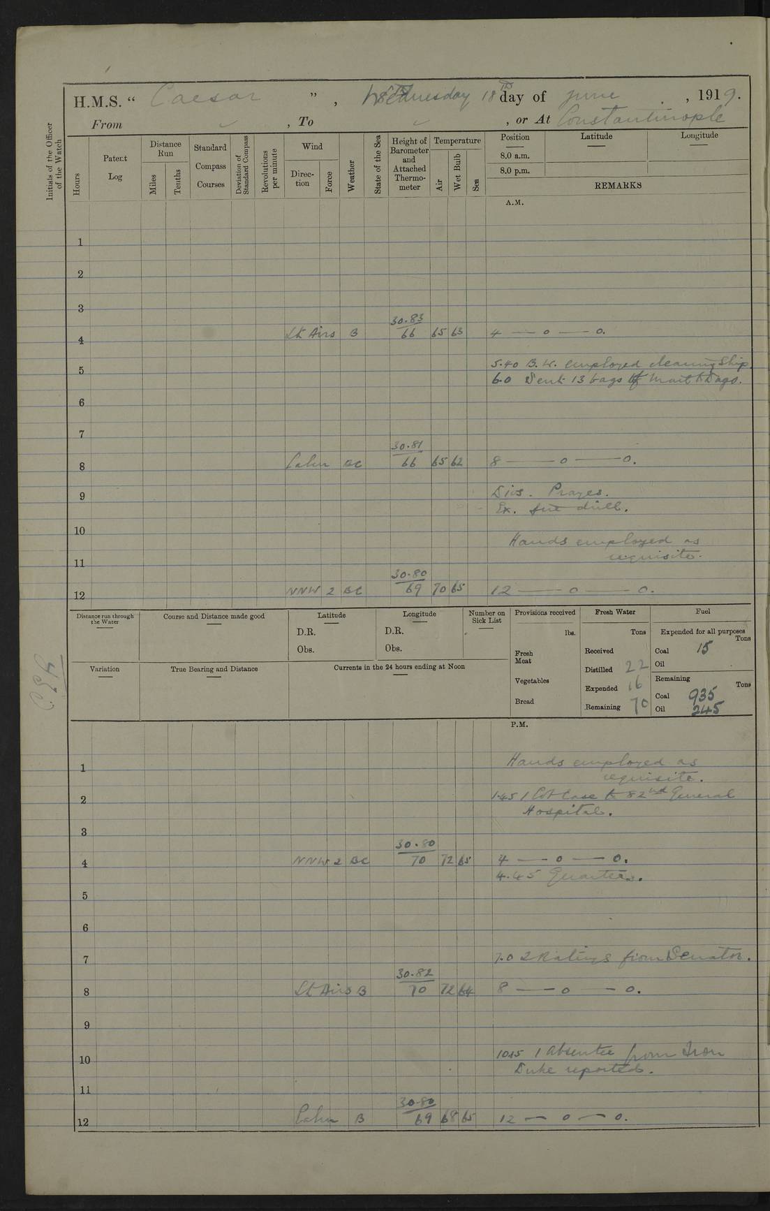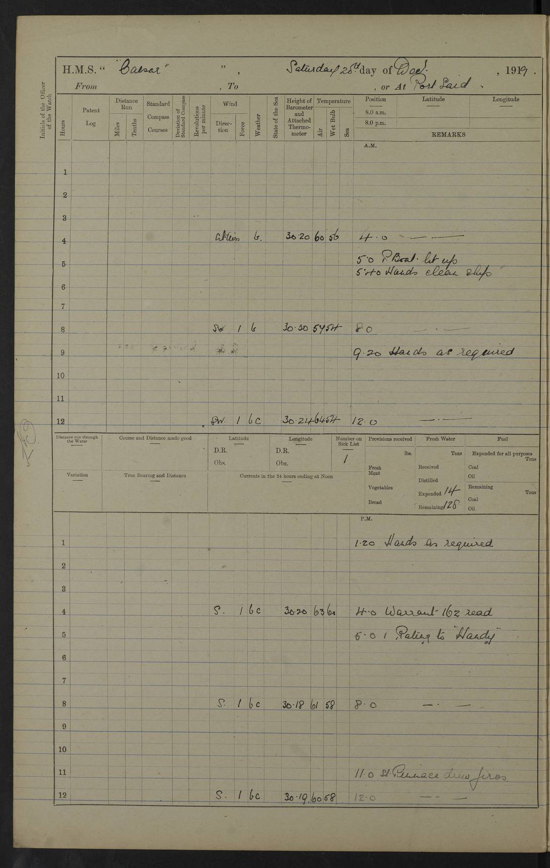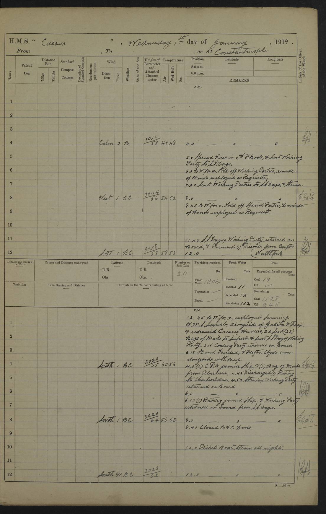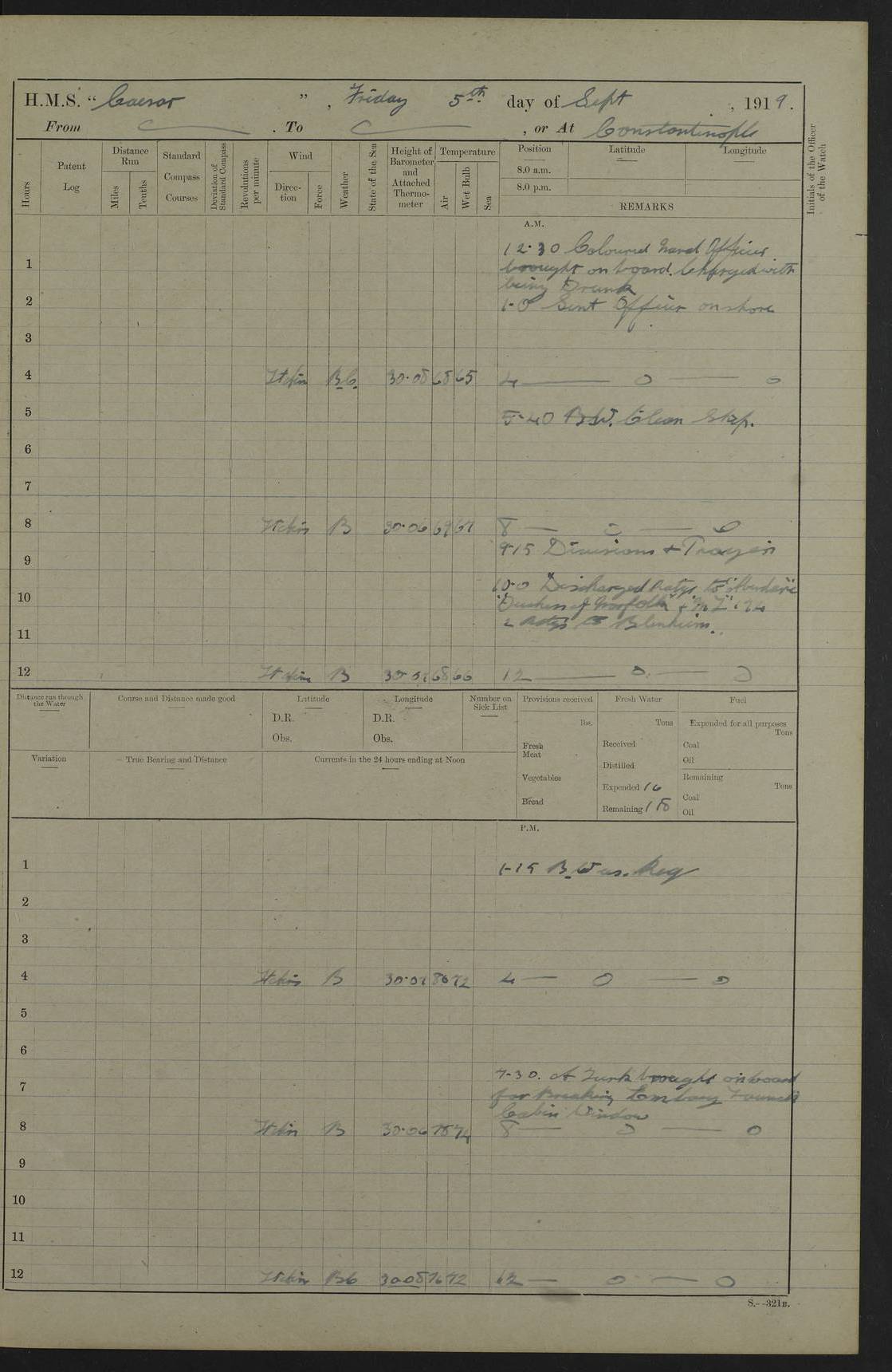 4edebb7b14d0450578000168: (https://s3.amazonaws.com:443/oldweather/ADM53-36589/0003_1.jpg) 1 November 1918 At Malta Lat 35.89, Long 14.52 [Somerset Wharf] 11.15am: Engineers Store Party returned on Board. 0.45pm: Paid Monthly Money. 1.0pm: Mr Goss, Gunner rejoined Ship from RN Hospital. 2.30pm: Gave Special leave to Port Watch untill 7.0am and Port Watch of Boys untill 6.0pm. Hands Made [sic] and Mend Clothes. 2.40pm: Landed liberty Men and Boys. 3.50pm: Provision Boat came alongside. 4.10pm: (4) Recovered Patients rejoined Ship from RN Hospital. 4.30pm: Landed liberty Men and Patrol. 6.0pm: Liberty Boys Returned on Board. 6.30pm: Canteen Party landed untill 10.0pm and Read Warrant No (24). 10.0pm: Canteen Party returned on Board. 11.50pm: Patrol returned on Board. [Provisions received: Fresh Meat 300 lbs, Vegetables 1000 lbs, Bread 450 lbs] 4edebb7c14d0450578000169: (https://s3.amazonaws.com:443/oldweather/ADM53-36589/0004_0.jpg) 2 November 1918 At Malta Lat 35.89, Long 14.52 [Hamilton Wharf] 7.15am: Shifted Berths from Somerset Wharf, to Hamilton Wharf. 8.0am: Tested life Buoys Correct. 8.45am: BW for x Told off Special Parties, Remainder of Hands employed as Requisite, and Landed Picket house Party. 9.10am: Held Court Martial on Board. 10.30am: Court Martial Finished. Noon: Picket House Party returned. 1.20pm: BW for x. Told off Special Parties. Remainder of Hands employed getting in Paymasters Stores and as Requisite. Lost overboard by accident Boat Hooks, Steel, Pattern (345), 2 in Number. 4.20pm: Hands to Fire Stations. 4.35pm: Read Warrant No 25 and gave Special leave to Starboard Watch untill 7.0am. 5.0pm: Landed liberty Men and Victualling Yard Lighter left Ship. 6.30pm: Canteen Party landed untill 10.0pm. [Provisions received: Fresh Meat 260 lbs, Bread 900 lbs] 4edebb7c14d045057800016a: (https://s3.amazonaws.com:443/oldweather/ADM53-36589/0004_1.jpg) 3 November 1918 At Malta Lat 35.89, Long 14.52 [Hamilton Wharf] 9.0am: Landed Church Parties, Wesleyans (14), Presbyterians (10). 9.30am: Divisions. 9.50am: Landed Roman Catholics (15). 10.10am: Discharged (5) Ratings to RN Hospital. 11.35am: All Church Parties returned on Board. 1.0pm: Gave Special leave to Port Watch untill 7.0am and Both Watches of Boys untill 5.30pm. 1.15pm: Landed liberty Men and Boys. 5.30pm: Liberty Boys returned on Board. 6.30pm: Canteen Party landed untill 10.0pm. 8.40pm: Closed B and C Doors. 10.0pm: Canteen Party returned on Board. [Number on sick list: 5] [Provisions received: Fresh Meat 280 lbs] 4edebb7c14d045057800016b: (https://s3.amazonaws.com:443/oldweather/ADM53-36589/0005_0.jpg) 4 November 1918 At Malta Lat 35.89, Long 14.52 [Hamilton Wharf] 6.50am: BW for x Told off Special Parties, remainder of Hands employed as Requisite. 7.0am: Liberty men returned on Board. 8.5am: Provision lighter came alongside. 8.10am: BW for x, Told off Special Parties, remainder of Hands employed Provisioning Ship and as requisite. 8.45am: Landed (1) Carpenter rating for Examination. 3.45pm: (2) Recovered Patients joined Ship from RN Hospital. 4.10pm: Received 8 Bags of Mails from Egmont, and Gave Special leave to Starboard Watch till 7.0am. 5.0pm: Landed Liberty Men and Patrol. 6.0pm: Hands employed getting in and stowing away Provisions. Midnight: Patrol returned on Board. [Weather fine, noon temperature 74F] 4edebb7c14d045057800016c: (https://s3.amazonaws.com:443/oldweather/ADM53-36589/0005_1.jpg) 5 November 1918 At Malta Lat 35.89, Long 14.52 [Hamilton Wharf] 6.45am: BW for x. Told off Special Parties. Remainder of Hands employed getting in and stowing away Provisions. 8.30am: Landed Hospital Party and Picket House Party. 11.0am: Landed (35) Rifles to Naval Ordinance for exchange. Noon: Picket House Party returned. 1.20pm: Landed (2) Ratings for Dental Treatment. 2.25pm: (35) Exchanged Rifles came on Board. 3.40pm: (2) Recovered Patients rejoined Ship from RN Hospital and disinfected Bedding. 4.0pm: Gave Special leave to Port Watch untill 7.0am. Starboard Watch employed stowing Provisions. 4.30pm: Landed Liberty men. Starboard Watch employed stowing away Provisions and Read Warrant No (26). [Provisions received: Fresh Meat 530 lbs, Bread 1000 lbs] 4edebb7c14d045057800016d: (https://s3.amazonaws.com:443/oldweather/ADM53-36589/0006_0.jpg) 6 November 1918 At Malta Lat 35.89, Long 14.52 [Hamilton Wharf] 6.50am: BW for x. Told off Special Parties, Remainder of Port Watch stowing Provisions, Starboard Watch drawing Quarter Deck Awning. 9.0am: Hands employed Provisioning Ship. 4.0pm: Gave Special leave to Starboard Watch untill 7.0am. 4.30pm: Landed liberty Men. Port Watch employed stowing away Provisions. 6.30pm: Canteen Party landed until 10.0pm. 10.0pm: Canteen Party returned on Board. [Number on sick list: 5] [Provisions received: Fresh Meat 250 lbs, Vegetables 1000 lbs, Bread 450 lbs] [Fuel Remaining: Coal 244 tons, Oil 332 tons] 4edebb7c14d045057800016e: (https://s3.amazonaws.com:443/oldweather/ADM53-36589/0006_1.jpg) 7 November 1918 At Malta Lat 35.89, Long 14.52 [No 4 Buoy] 6.30am: BW for x. Told off Special Parties. Remainder of Hands employed prepairing [preparing] Ship to Shift Berths, from Hamilton Wharf to No 4 Buoy. 7.0am: Liberty men returned on Board. 8.50am: Secured Ship to No 4 Buoy and Coal Lighters came alongside. 9.10am: Commenced Coaling Native labour. Hands employed Drawing Stores and as Requisite. 11.50am: Dockyard Parties returned. 1.40pm: BW for x Told off Special Parties, remainder of Hands employed as Requisite. 4.30pm: Gave Special leave to Port Watch untill 7.0am. 4.45pm: Landed liberty men and Patrol and Read Warrant No (27). 7.30pm: Completed Coaling (1481) Tons. 8.40pm: Watch employed sweeping down. 11.50pm: Patrol returned on Board. [Number on sick list: 6] [Provisions received: Fresh Meat 280 lbs, Bread 300 lbs] [Fuel Remaining: Coal 1716 tons, Oil 332 tons] 4edebb7c14d045057800016f: (https://s3.amazonaws.com:443/oldweather/ADM53-36589/0007_0.jpg) 8 November 1918 At Malta Lat 35.89, Long 
