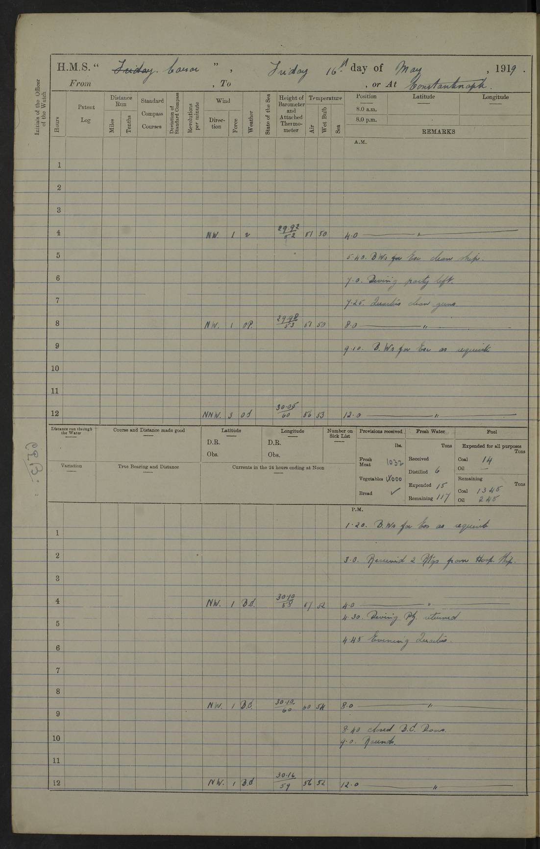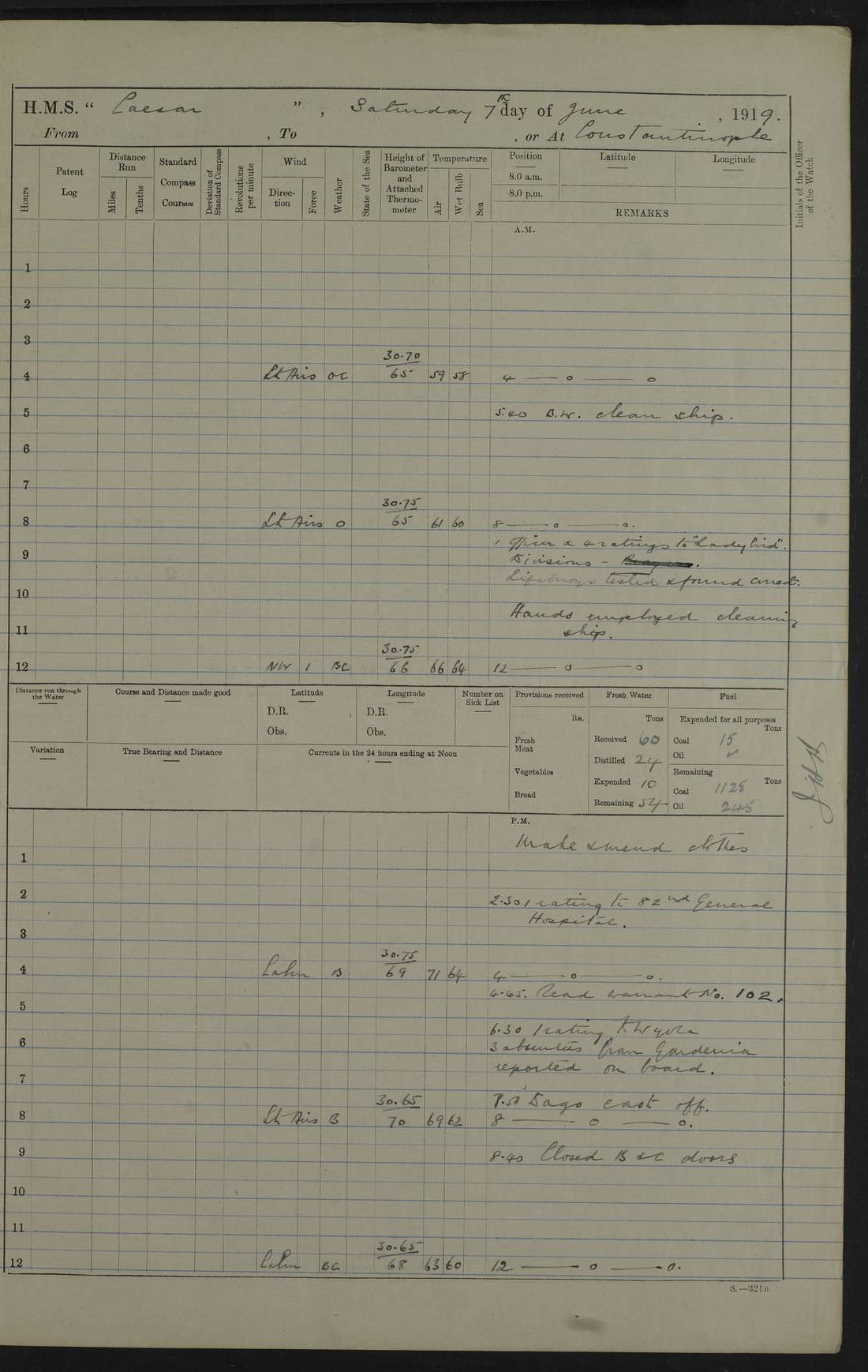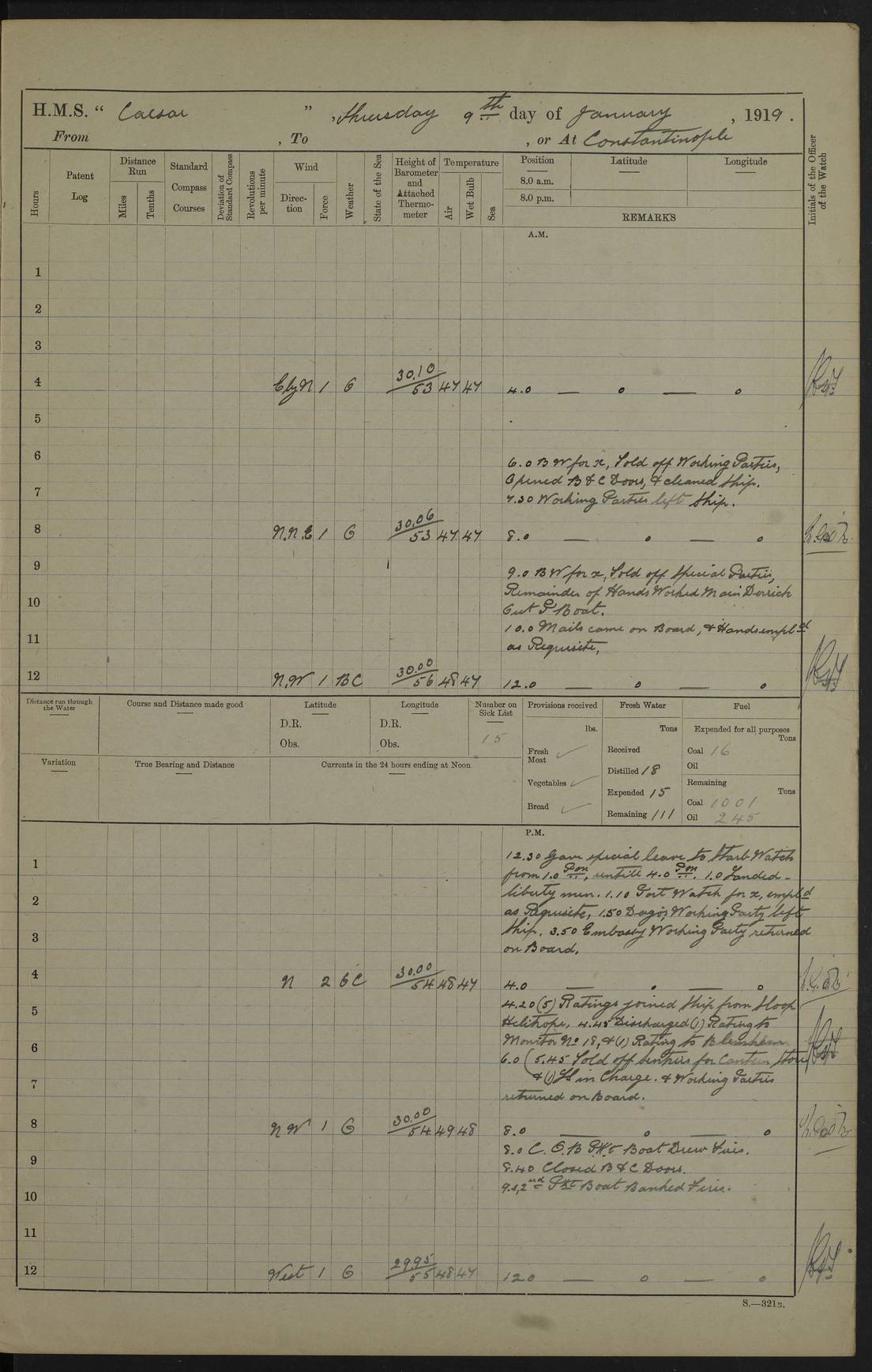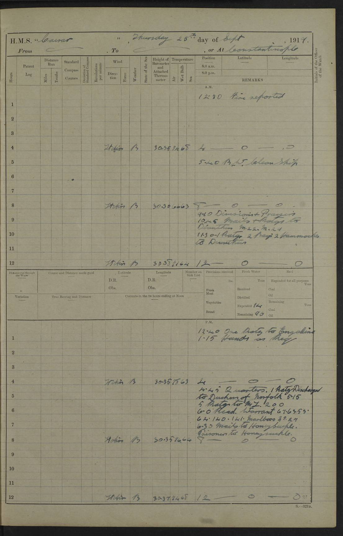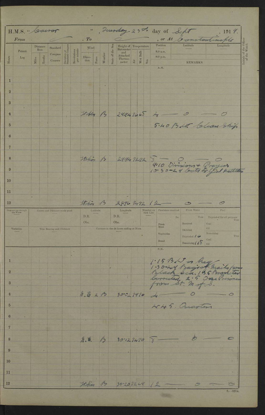 4edebb7b14d0450578000168: (https://s3.amazonaws.com:443/oldweather/ADM53-36589/0003_1.jpg) 1 November 1918 At Malta Lat 35.89, Long 14.52 [Somerset Wharf] 11.15am: Engineers Store Party returned on Board. 0.45pm: Paid Monthly Money. 1.0pm: Mr Goss, Gunner rejoined Ship from RN Hospital. 2.30pm: Gave Special leave to Port Watch untill 7.0am and Port Watch of Boys untill 6.0pm. Hands Made [sic] and Mend Clothes. 2.40pm: Landed liberty Men and Boys. 3.50pm: Provision Boat came alongside. 4.10pm: (4) Recovered Patients rejoined Ship from RN Hospital. 4.30pm: Landed liberty Men and Patrol. 6.0pm: Liberty Boys Returned on Board. 6.30pm: Canteen Party landed untill 10.0pm and Read Warrant No (24). 10.0pm: Canteen Party returned on Board. 11.50pm: Patrol returned on Board. [Provisions received: Fresh Meat 300 lbs, Vegetables 1000 lbs, Bread 450 lbs] 4edebb7c14d0450578000169: (https://s3.amazonaws.com:443/oldweather/ADM53-36589/0004_0.jpg) 2 November 1918 At Malta Lat 35.89, Long 14.52 [Hamilton Wharf] 7.15am: Shifted Berths from Somerset Wharf, to Hamilton Wharf. 8.0am: Tested life Buoys Correct. 8.45am: BW for x Told off Special Parties, Remainder of Hands employed as Requisite, and Landed Picket house Party. 9.10am: Held Court Martial on Board. 10.30am: Court Martial Finished. Noon: Picket House Party returned. 1.20pm: BW for x. Told off Special Parties. Remainder of Hands employed getting in Paymasters Stores and as Requisite. Lost overboard by accident Boat Hooks, Steel, Pattern (345), 2 in Number. 4.20pm: Hands to Fire Stations. 4.35pm: Read Warrant No 25 and gave Special leave to Starboard Watch untill 7.0am. 5.0pm: Landed liberty Men and Victualling Yard Lighter left Ship. 6.30pm: Canteen Party landed untill 10.0pm. [Provisions received: Fresh Meat 260 lbs, Bread 900 lbs] 4edebb7c14d045057800016a: (https://s3.amazonaws.com:443/oldweather/ADM53-36589/0004_1.jpg) 3 November 1918 At Malta Lat 35.89, Long 14.52 [Hamilton Wharf] 9.0am: Landed Church Parties, Wesleyans (14), Presbyterians (10). 9.30am: Divisions. 9.50am: Landed Roman Catholics (15). 10.10am: Discharged (5) Ratings to RN Hospital. 11.35am: All Church Parties returned on Board. 1.0pm: Gave Special leave to Port Watch untill 7.0am and Both Watches of Boys untill 5.30pm. 1.15pm: Landed liberty Men and Boys. 5.30pm: Liberty Boys returned on Board. 6.30pm: Canteen Party landed untill 10.0pm. 8.40pm: Closed B and C Doors. 10.0pm: Canteen Party returned on Board. [Number on sick list: 5] [Provisions received: Fresh Meat 280 lbs] 4edebb7c14d045057800016b: (https://s3.amazonaws.com:443/oldweather/ADM53-36589/0005_0.jpg) 4 November 1918 At Malta Lat 35.89, Long 14.52 [Hamilton Wharf] 6.50am: BW for x Told off Special Parties, remainder of Hands employed as Requisite. 7.0am: Liberty men returned on Board. 8.5am: Provision lighter came alongside. 8.10am: BW for x, Told off Special Parties, remainder of Hands employed Provisioning Ship and as requisite. 8.45am: Landed (1) Carpenter rating for Examination. 3.45pm: (2) Recovered Patients joined Ship from RN Hospital. 4.10pm: Received 8 Bags of Mails from Egmont, and Gave Special leave to Starboard Watch till 7.0am. 5.0pm: Landed Liberty Men and Patrol. 6.0pm: Hands employed getting in and stowing away Provisions. Midnight: Patrol returned on Board. [Weather fine, noon temperature 74F] 4edebb7c14d045057800016c: (https://s3.amazonaws.com:443/oldweather/ADM53-36589/0005_1.jpg) 5 November 1918 At Malta Lat 35.89, Long 14.52 [Hamilton Wharf] 6.45am: BW for x. Told off Special Parties. Remainder of Hands employed getting in and stowing away Provisions. 8.30am: Landed Hospital Party and Picket House Party. 11.0am: Landed (35) Rifles to Naval Ordinance for exchange. Noon: Picket House Party returned. 1.20pm: Landed (2) Ratings for Dental Treatment. 2.25pm: (35) Exchanged Rifles came on Board. 3.40pm: (2) Recovered Patients rejoined Ship from RN Hospital and disinfected Bedding. 4.0pm: Gave Special leave to Port Watch untill 7.0am. Starboard Watch employed stowing Provisions. 4.30pm: Landed Liberty men. Starboard Watch employed stowing away Provisions and Read Warrant No (26). [Provisions received: Fresh Meat 530 lbs, Bread 1000 lbs] 4edebb7c14d045057800016d: (https://s3.amazonaws.com:443/oldweather/ADM53-36589/0006_0.jpg) 6 November 1918 At Malta Lat 35.89, Long 14.52 [Hamilton Wharf] 6.50am: BW for x. Told off Special Parties, Remainder of Port Watch stowing Provisions, Starboard Watch drawing Quarter Deck Awning. 9.0am: Hands employed Provisioning Ship. 4.0pm: Gave Special leave to Starboard Watch untill 7.0am. 4.30pm: Landed liberty Men. Port Watch employed stowing away Provisions. 6.30pm: Canteen Party landed until 10.0pm. 10.0pm: Canteen Party returned on Board. [Number on sick list: 5] [Provisions received: Fresh Meat 250 lbs, Vegetables 1000 lbs, Bread 450 lbs] [Fuel Remaining: Coal 244 tons, Oil 332 tons] 4edebb7c14d045057800016e: (https://s3.amazonaws.com:443/oldweather/ADM53-36589/0006_1.jpg) 7 November 1918 At Malta Lat 35.89, Long 14.52 [No 4 Buoy] 6.30am: BW for x. Told off Special Parties. Remainder of Hands employed prepairing [preparing] Ship to Shift Berths, from Hamilton Wharf to No 4 Buoy. 7.0am: Liberty men returned on Board. 8.50am: Secured Ship to No 4 Buoy and Coal Lighters came alongside. 9.10am: Commenced Coaling Native labour. Hands employed Drawing Stores and as Requisite. 11.50am: Dockyard Parties returned. 1.40pm: BW for x Told off Special Parties, remainder of Hands employed as Requisite. 4.30pm: Gave Special leave to Port Watch untill 7.0am. 4.45pm: Landed liberty men and Patrol and Read Warrant No (27). 7.30pm: Completed Coaling (1481) Tons. 8.40pm: Watch employed sweeping down. 11.50pm: Patrol returned on Board. [Number on sick list: 6] [Provisions received: Fresh Meat 280 lbs, Bread 300 lbs] [Fuel Remaining: Coal 1716 tons, Oil 332 tons] 4edebb7c14d045057800016f: (https://s3.amazonaws.com:443/oldweather/ADM53-36589/0007_0.jpg) 8 November 1918 At Malta Lat 35.89, Long 