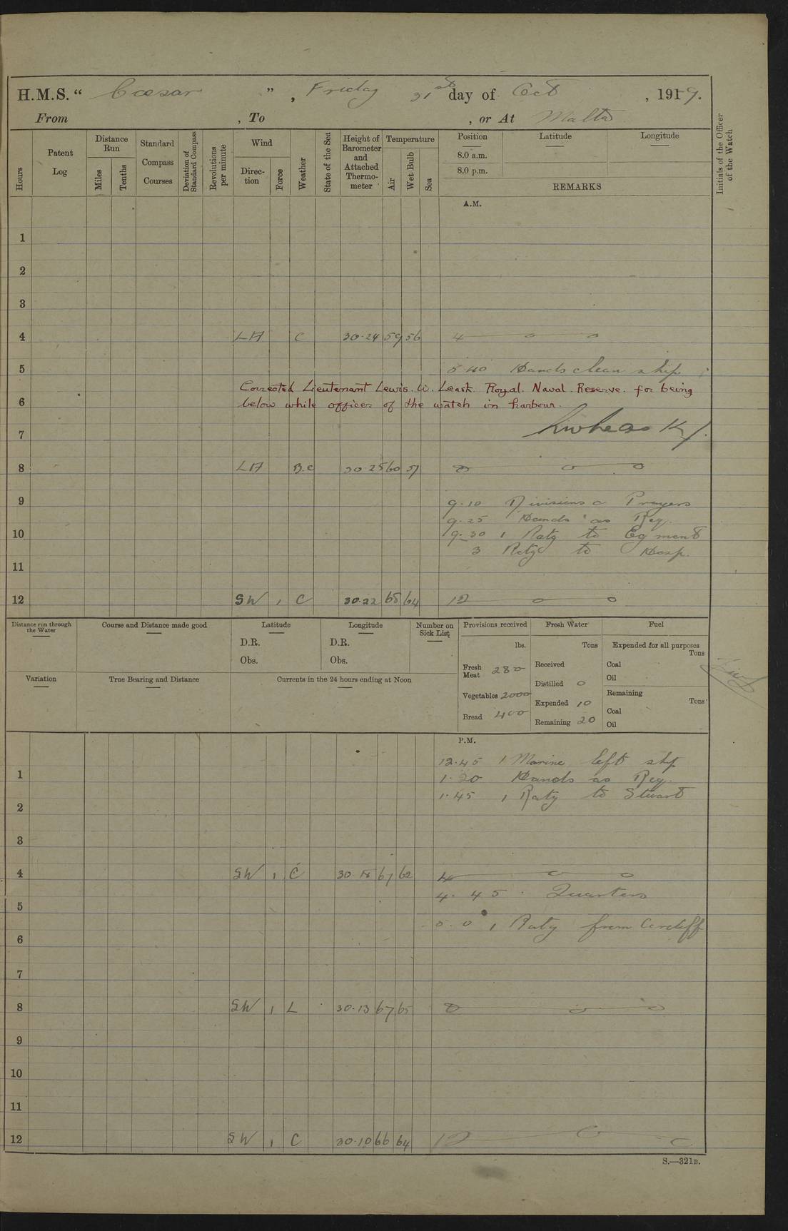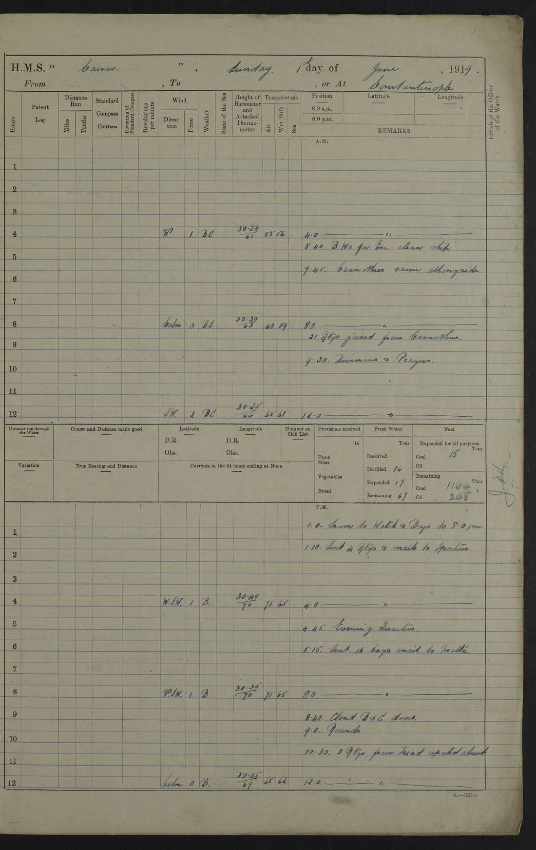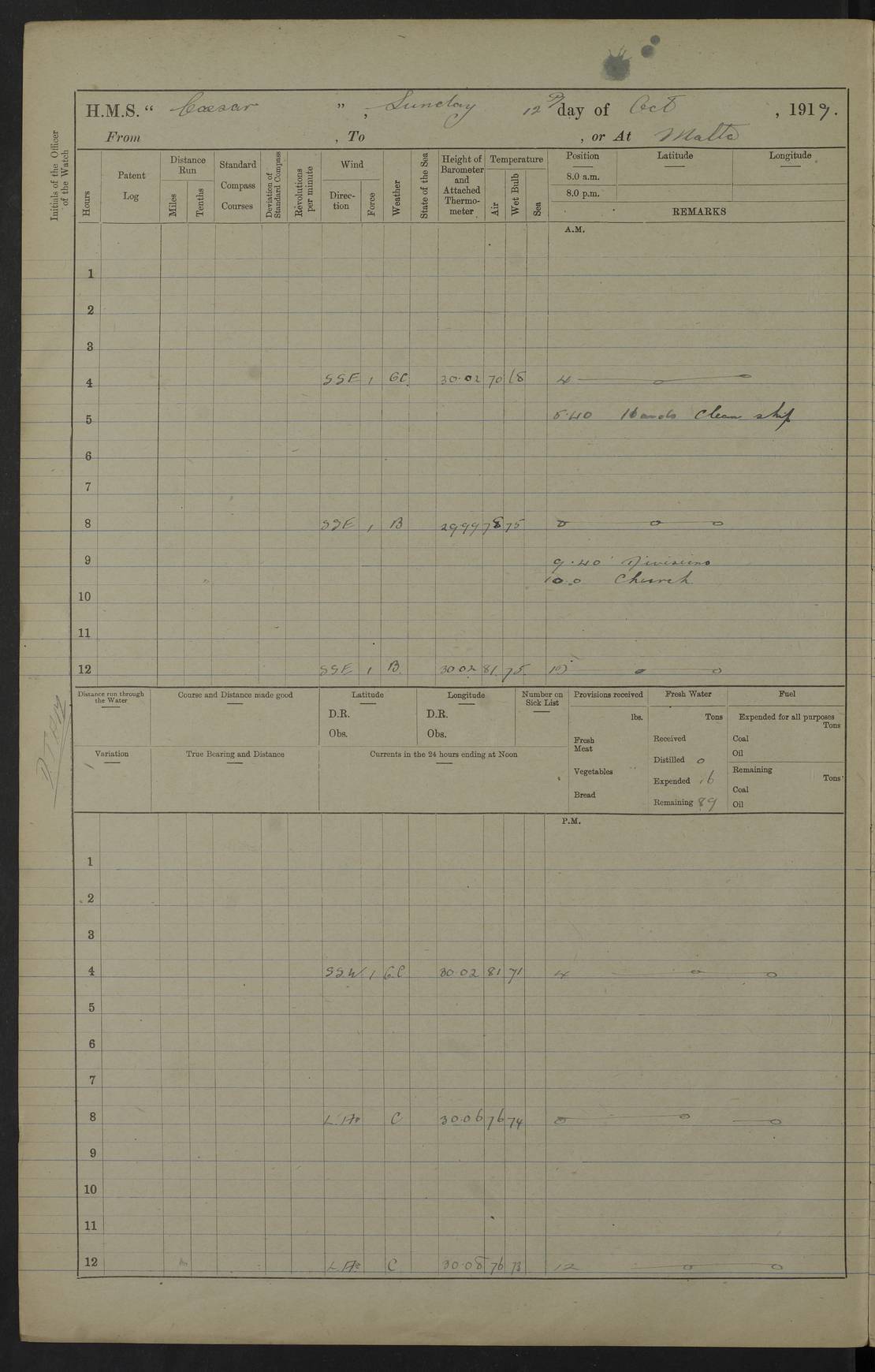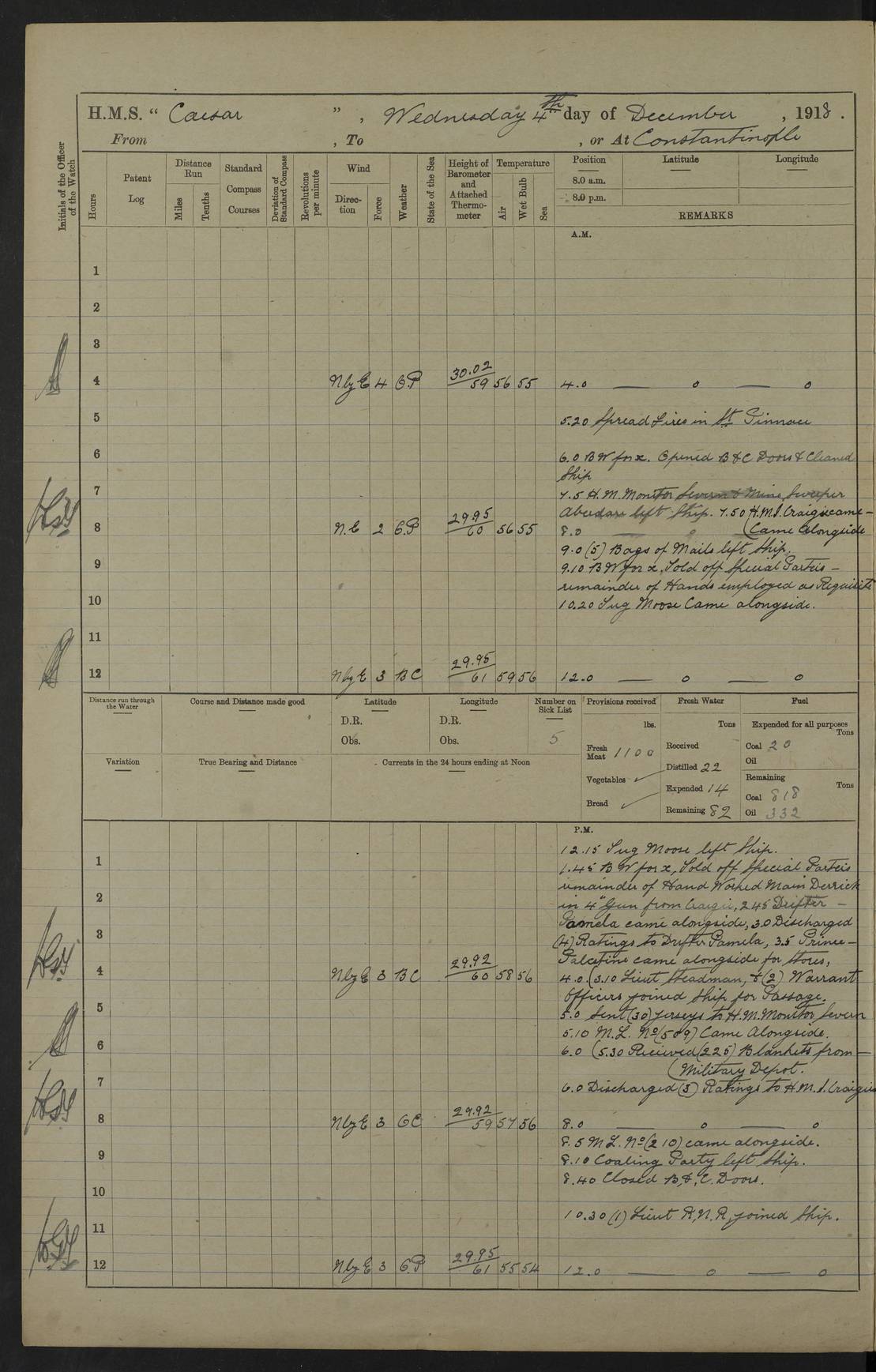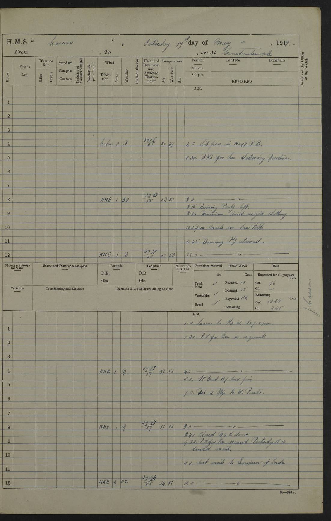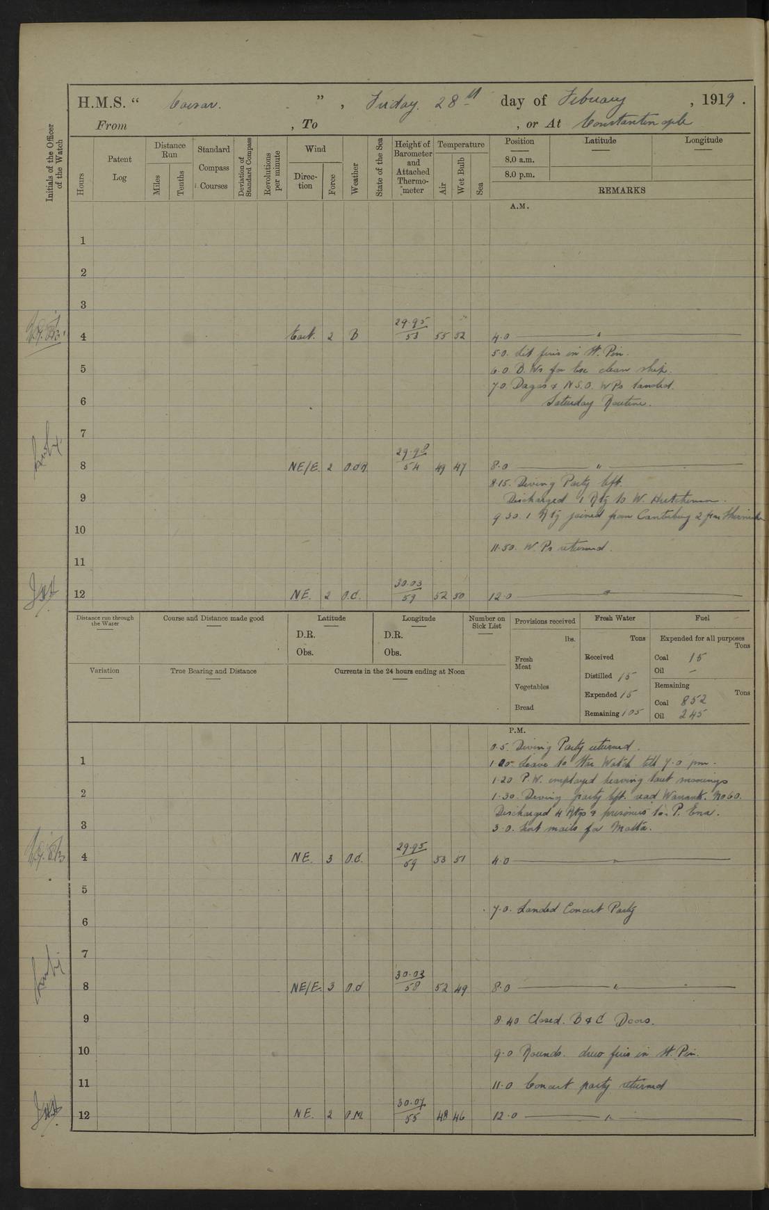 4edebb7b14d0450578000168: (https://s3.amazonaws.com:443/oldweather/ADM53-36589/0003_1.jpg) 1 November 1918 At Malta Lat 35.89, Long 14.52 [Somerset Wharf] 11.15am: Engineers Store Party returned on Board. 0.45pm: Paid Monthly Money. 1.0pm: Mr Goss, Gunner rejoined Ship from RN Hospital. 2.30pm: Gave Special leave to Port Watch untill 7.0am and Port Watch of Boys untill 6.0pm. Hands Made [sic] and Mend Clothes. 2.40pm: Landed liberty Men and Boys. 3.50pm: Provision Boat came alongside. 4.10pm: (4) Recovered Patients rejoined Ship from RN Hospital. 4.30pm: Landed liberty Men and Patrol. 6.0pm: Liberty Boys Returned on Board. 6.30pm: Canteen Party landed untill 10.0pm and Read Warrant No (24). 10.0pm: Canteen Party returned on Board. 11.50pm: Patrol returned on Board. [Provisions received: Fresh Meat 300 lbs, Vegetables 1000 lbs, Bread 450 lbs] 4edebb7c14d0450578000169: (https://s3.amazonaws.com:443/oldweather/ADM53-36589/0004_0.jpg) 2 November 1918 At Malta Lat 35.89, Long 14.52 [Hamilton Wharf] 7.15am: Shifted Berths from Somerset Wharf, to Hamilton Wharf. 8.0am: Tested life Buoys Correct. 8.45am: BW for x Told off Special Parties, Remainder of Hands employed as Requisite, and Landed Picket house Party. 9.10am: Held Court Martial on Board. 10.30am: Court Martial Finished. Noon: Picket House Party returned. 1.20pm: BW for x. Told off Special Parties. Remainder of Hands employed getting in Paymasters Stores and as Requisite. Lost overboard by accident Boat Hooks, Steel, Pattern (345), 2 in Number. 4.20pm: Hands to Fire Stations. 4.35pm: Read Warrant No 25 and gave Special leave to Starboard Watch untill 7.0am. 5.0pm: Landed liberty Men and Victualling Yard Lighter left Ship. 6.30pm: Canteen Party landed untill 10.0pm. [Provisions received: Fresh Meat 260 lbs, Bread 900 lbs] 4edebb7c14d045057800016a: (https://s3.amazonaws.com:443/oldweather/ADM53-36589/0004_1.jpg) 3 November 1918 At Malta Lat 35.89, Long 14.52 [Hamilton Wharf] 9.0am: Landed Church Parties, Wesleyans (14), Presbyterians (10). 9.30am: Divisions. 9.50am: Landed Roman Catholics (15). 10.10am: Discharged (5) Ratings to RN Hospital. 11.35am: All Church Parties returned on Board. 1.0pm: Gave Special leave to Port Watch untill 7.0am and Both Watches of Boys untill 5.30pm. 1.15pm: Landed liberty Men and Boys. 5.30pm: Liberty Boys returned on Board. 6.30pm: Canteen Party landed untill 10.0pm. 8.40pm: Closed B and C Doors. 10.0pm: Canteen Party returned on Board. [Number on sick list: 5] [Provisions received: Fresh Meat 280 lbs] 4edebb7c14d045057800016b: (https://s3.amazonaws.com:443/oldweather/ADM53-36589/0005_0.jpg) 4 November 1918 At Malta Lat 35.89, Long 14.52 [Hamilton Wharf] 6.50am: BW for x Told off Special Parties, remainder of Hands employed as Requisite. 7.0am: Liberty men returned on Board. 8.5am: Provision lighter came alongside. 8.10am: BW for x, Told off Special Parties, remainder of Hands employed Provisioning Ship and as requisite. 8.45am: Landed (1) Carpenter rating for Examination. 3.45pm: (2) Recovered Patients joined Ship from RN Hospital. 4.10pm: Received 8 Bags of Mails from Egmont, and Gave Special leave to Starboard Watch till 7.0am. 5.0pm: Landed Liberty Men and Patrol. 6.0pm: Hands employed getting in and stowing away Provisions. Midnight: Patrol returned on Board. [Weather fine, noon temperature 74F] 4edebb7c14d045057800016c: (https://s3.amazonaws.com:443/oldweather/ADM53-36589/0005_1.jpg) 5 November 1918 At Malta Lat 35.89, Long 14.52 [Hamilton Wharf] 6.45am: BW for x. Told off Special Parties. Remainder of Hands employed getting in and stowing away Provisions. 8.30am: Landed Hospital Party and Picket House Party. 11.0am: Landed (35) Rifles to Naval Ordinance for exchange. Noon: Picket House Party returned. 1.20pm: Landed (2) Ratings for Dental Treatment. 2.25pm: (35) Exchanged Rifles came on Board. 3.40pm: (2) Recovered Patients rejoined Ship from RN Hospital and disinfected Bedding. 4.0pm: Gave Special leave to Port Watch untill 7.0am. Starboard Watch employed stowing Provisions. 4.30pm: Landed Liberty men. Starboard Watch employed stowing away Provisions and Read Warrant No (26). [Provisions received: Fresh Meat 530 lbs, Bread 1000 lbs] 4edebb7c14d045057800016d: (https://s3.amazonaws.com:443/oldweather/ADM53-36589/0006_0.jpg) 6 November 1918 At Malta Lat 35.89, Long 14.52 [Hamilton Wharf] 6.50am: BW for x. Told off Special Parties, Remainder of Port Watch stowing Provisions, Starboard Watch drawing Quarter Deck Awning. 9.0am: Hands employed Provisioning Ship. 4.0pm: Gave Special leave to Starboard Watch untill 7.0am. 4.30pm: Landed liberty Men. Port Watch employed stowing away Provisions. 6.30pm: Canteen Party landed until 10.0pm. 10.0pm: Canteen Party returned on Board. [Number on sick list: 5] [Provisions received: Fresh Meat 250 lbs, Vegetables 1000 lbs, Bread 450 lbs] [Fuel Remaining: Coal 244 tons, Oil 332 tons] 4edebb7c14d045057800016e: (https://s3.amazonaws.com:443/oldweather/ADM53-36589/0006_1.jpg) 7 November 1918 At Malta Lat 35.89, Long 14.52 [No 4 Buoy] 6.30am: BW for x. Told off Special Parties. Remainder of Hands employed prepairing [preparing] Ship to Shift Berths, from Hamilton Wharf to No 4 Buoy. 7.0am: Liberty men returned on Board. 8.50am: Secured Ship to No 4 Buoy and Coal Lighters came alongside. 9.10am: Commenced Coaling Native labour. Hands employed Drawing Stores and as Requisite. 11.50am: Dockyard Parties returned. 1.40pm: BW for x Told off Special Parties, remainder of Hands employed as Requisite. 4.30pm: Gave Special leave to Port Watch untill 7.0am. 4.45pm: Landed liberty men and Patrol and Read Warrant No (27). 7.30pm: Completed Coaling (1481) Tons. 8.40pm: Watch employed sweeping down. 11.50pm: Patrol returned on Board. [Number on sick list: 6] [Provisions received: Fresh Meat 280 lbs, Bread 300 lbs] [Fuel Remaining: Coal 1716 tons, Oil 332 tons] 4edebb7c14d045057800016f: (https://s3.amazonaws.com:443/oldweather/ADM53-36589/0007_0.jpg) 8 November 1918 At Malta Lat 35.89, Long 