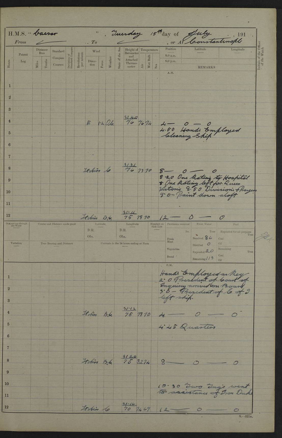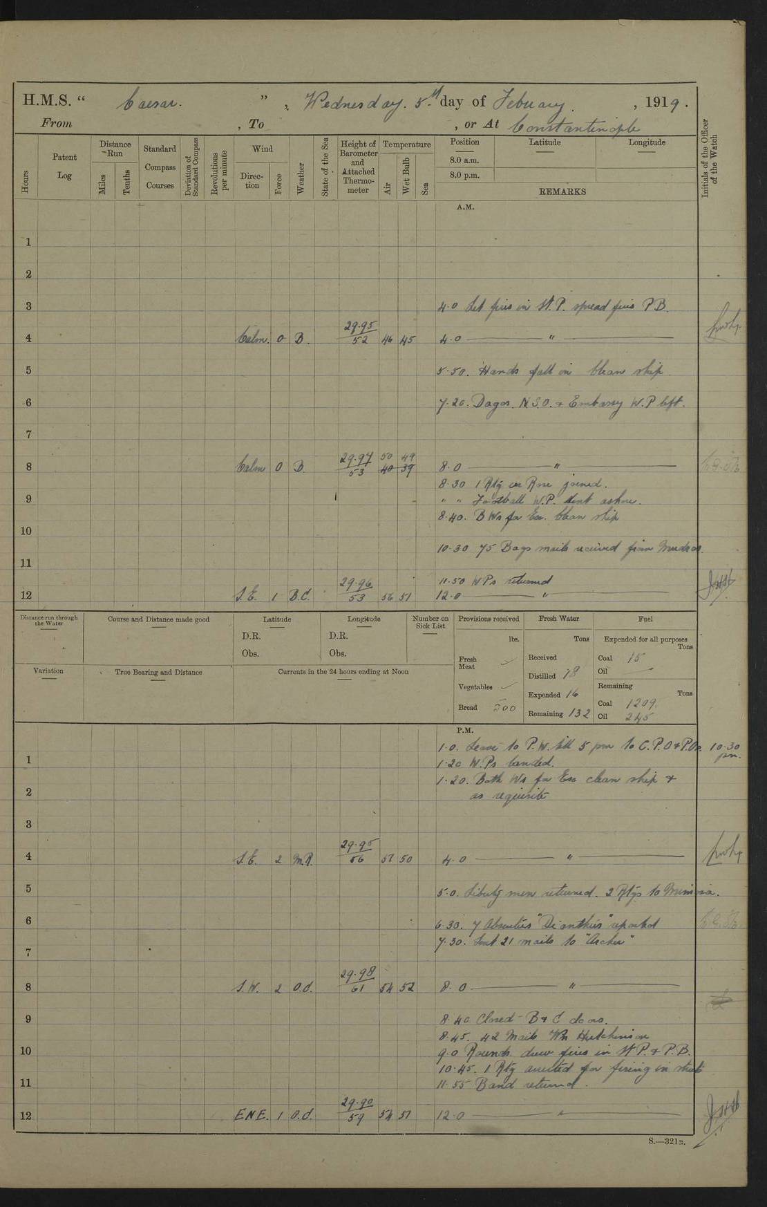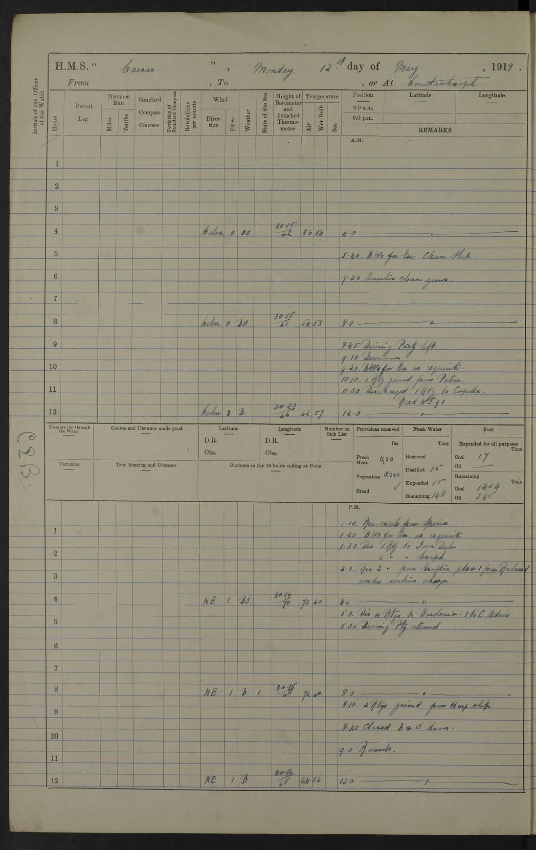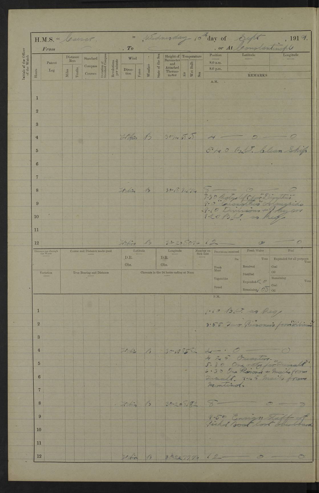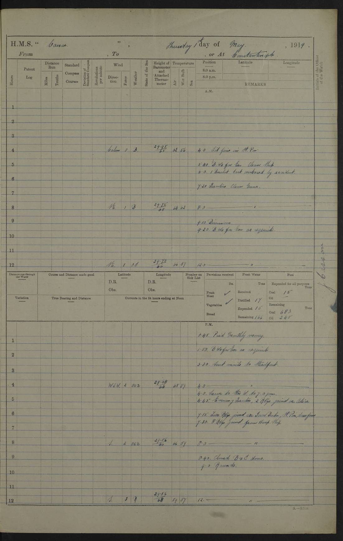 4edebb7b14d0450578000168: (https://s3.amazonaws.com:443/oldweather/ADM53-36589/0003_1.jpg) 1 November 1918 At Malta Lat 35.89, Long 14.52 [Somerset Wharf] 11.15am: Engineers Store Party returned on Board. 0.45pm: Paid Monthly Money. 1.0pm: Mr Goss, Gunner rejoined Ship from RN Hospital. 2.30pm: Gave Special leave to Port Watch untill 7.0am and Port Watch of Boys untill 6.0pm. Hands Made [sic] and Mend Clothes. 2.40pm: Landed liberty Men and Boys. 3.50pm: Provision Boat came alongside. 4.10pm: (4) Recovered Patients rejoined Ship from RN Hospital. 4.30pm: Landed liberty Men and Patrol. 6.0pm: Liberty Boys Returned on Board. 6.30pm: Canteen Party landed untill 10.0pm and Read Warrant No (24). 10.0pm: Canteen Party returned on Board. 11.50pm: Patrol returned on Board. [Provisions received: Fresh Meat 300 lbs, Vegetables 1000 lbs, Bread 450 lbs] 4edebb7c14d0450578000169: (https://s3.amazonaws.com:443/oldweather/ADM53-36589/0004_0.jpg) 2 November 1918 At Malta Lat 35.89, Long 14.52 [Hamilton Wharf] 7.15am: Shifted Berths from Somerset Wharf, to Hamilton Wharf. 8.0am: Tested life Buoys Correct. 8.45am: BW for x Told off Special Parties, Remainder of Hands employed as Requisite, and Landed Picket house Party. 9.10am: Held Court Martial on Board. 10.30am: Court Martial Finished. Noon: Picket House Party returned. 1.20pm: BW for x. Told off Special Parties. Remainder of Hands employed getting in Paymasters Stores and as Requisite. Lost overboard by accident Boat Hooks, Steel, Pattern (345), 2 in Number. 4.20pm: Hands to Fire Stations. 4.35pm: Read Warrant No 25 and gave Special leave to Starboard Watch untill 7.0am. 5.0pm: Landed liberty Men and Victualling Yard Lighter left Ship. 6.30pm: Canteen Party landed untill 10.0pm. [Provisions received: Fresh Meat 260 lbs, Bread 900 lbs] 4edebb7c14d045057800016a: (https://s3.amazonaws.com:443/oldweather/ADM53-36589/0004_1.jpg) 3 November 1918 At Malta Lat 35.89, Long 14.52 [Hamilton Wharf] 9.0am: Landed Church Parties, Wesleyans (14), Presbyterians (10). 9.30am: Divisions. 9.50am: Landed Roman Catholics (15). 10.10am: Discharged (5) Ratings to RN Hospital. 11.35am: All Church Parties returned on Board. 1.0pm: Gave Special leave to Port Watch untill 7.0am and Both Watches of Boys untill 5.30pm. 1.15pm: Landed liberty Men and Boys. 5.30pm: Liberty Boys returned on Board. 6.30pm: Canteen Party landed untill 10.0pm. 8.40pm: Closed B and C Doors. 10.0pm: Canteen Party returned on Board. [Number on sick list: 5] [Provisions received: Fresh Meat 280 lbs] 4edebb7c14d045057800016b: (https://s3.amazonaws.com:443/oldweather/ADM53-36589/0005_0.jpg) 4 November 1918 At Malta Lat 35.89, Long 14.52 [Hamilton Wharf] 6.50am: BW for x Told off Special Parties, remainder of Hands employed as Requisite. 7.0am: Liberty men returned on Board. 8.5am: Provision lighter came alongside. 8.10am: BW for x, Told off Special Parties, remainder of Hands employed Provisioning Ship and as requisite. 8.45am: Landed (1) Carpenter rating for Examination. 3.45pm: (2) Recovered Patients joined Ship from RN Hospital. 4.10pm: Received 8 Bags of Mails from Egmont, and Gave Special leave to Starboard Watch till 7.0am. 5.0pm: Landed Liberty Men and Patrol. 6.0pm: Hands employed getting in and stowing away Provisions. Midnight: Patrol returned on Board. [Weather fine, noon temperature 74F] 4edebb7c14d045057800016c: (https://s3.amazonaws.com:443/oldweather/ADM53-36589/0005_1.jpg) 5 November 1918 At Malta Lat 35.89, Long 14.52 [Hamilton Wharf] 6.45am: BW for x. Told off Special Parties. Remainder of Hands employed getting in and stowing away Provisions. 8.30am: Landed Hospital Party and Picket House Party. 11.0am: Landed (35) Rifles to Naval Ordinance for exchange. Noon: Picket House Party returned. 1.20pm: Landed (2) Ratings for Dental Treatment. 2.25pm: (35) Exchanged Rifles came on Board. 3.40pm: (2) Recovered Patients rejoined Ship from RN Hospital and disinfected Bedding. 4.0pm: Gave Special leave to Port Watch untill 7.0am. Starboard Watch employed stowing Provisions. 4.30pm: Landed Liberty men. Starboard Watch employed stowing away Provisions and Read Warrant No (26). [Provisions received: Fresh Meat 530 lbs, Bread 1000 lbs] 4edebb7c14d045057800016d: (https://s3.amazonaws.com:443/oldweather/ADM53-36589/0006_0.jpg) 6 November 1918 At Malta Lat 35.89, Long 14.52 [Hamilton Wharf] 6.50am: BW for x. Told off Special Parties, Remainder of Port Watch stowing Provisions, Starboard Watch drawing Quarter Deck Awning. 9.0am: Hands employed Provisioning Ship. 4.0pm: Gave Special leave to Starboard Watch untill 7.0am. 4.30pm: Landed liberty Men. Port Watch employed stowing away Provisions. 6.30pm: Canteen Party landed until 10.0pm. 10.0pm: Canteen Party returned on Board. [Number on sick list: 5] [Provisions received: Fresh Meat 250 lbs, Vegetables 1000 lbs, Bread 450 lbs] [Fuel Remaining: Coal 244 tons, Oil 332 tons] 4edebb7c14d045057800016e: (https://s3.amazonaws.com:443/oldweather/ADM53-36589/0006_1.jpg) 7 November 1918 At Malta Lat 35.89, Long 14.52 [No 4 Buoy] 6.30am: BW for x. Told off Special Parties. Remainder of Hands employed prepairing [preparing] Ship to Shift Berths, from Hamilton Wharf to No 4 Buoy. 7.0am: Liberty men returned on Board. 8.50am: Secured Ship to No 4 Buoy and Coal Lighters came alongside. 9.10am: Commenced Coaling Native labour. Hands employed Drawing Stores and as Requisite. 11.50am: Dockyard Parties returned. 1.40pm: BW for x Told off Special Parties, remainder of Hands employed as Requisite. 4.30pm: Gave Special leave to Port Watch untill 7.0am. 4.45pm: Landed liberty men and Patrol and Read Warrant No (27). 7.30pm: Completed Coaling (1481) Tons. 8.40pm: Watch employed sweeping down. 11.50pm: Patrol returned on Board. [Number on sick list: 6] [Provisions received: Fresh Meat 280 lbs, Bread 300 lbs] [Fuel Remaining: Coal 1716 tons, Oil 332 tons] 4edebb7c14d045057800016f: (https://s3.amazonaws.com:443/oldweather/ADM53-36589/0007_0.jpg) 8 November 1918 At Malta Lat 35.89, Long 