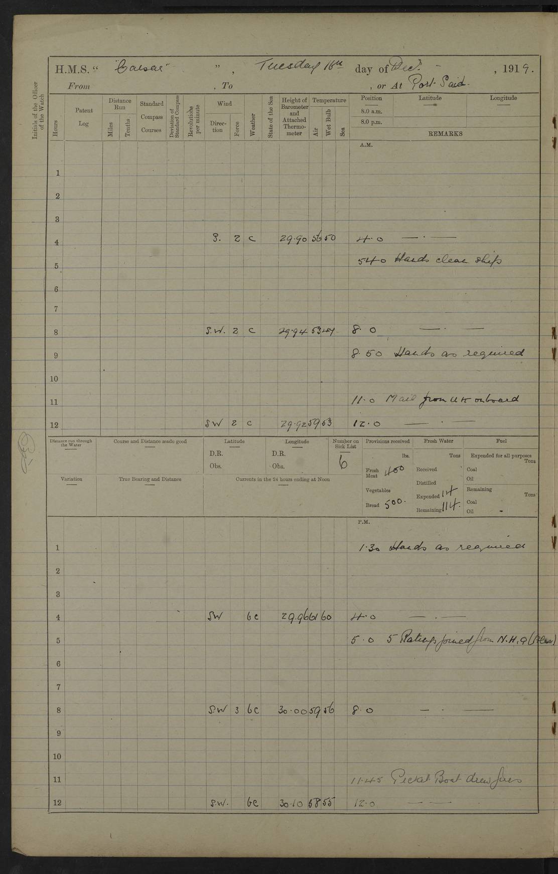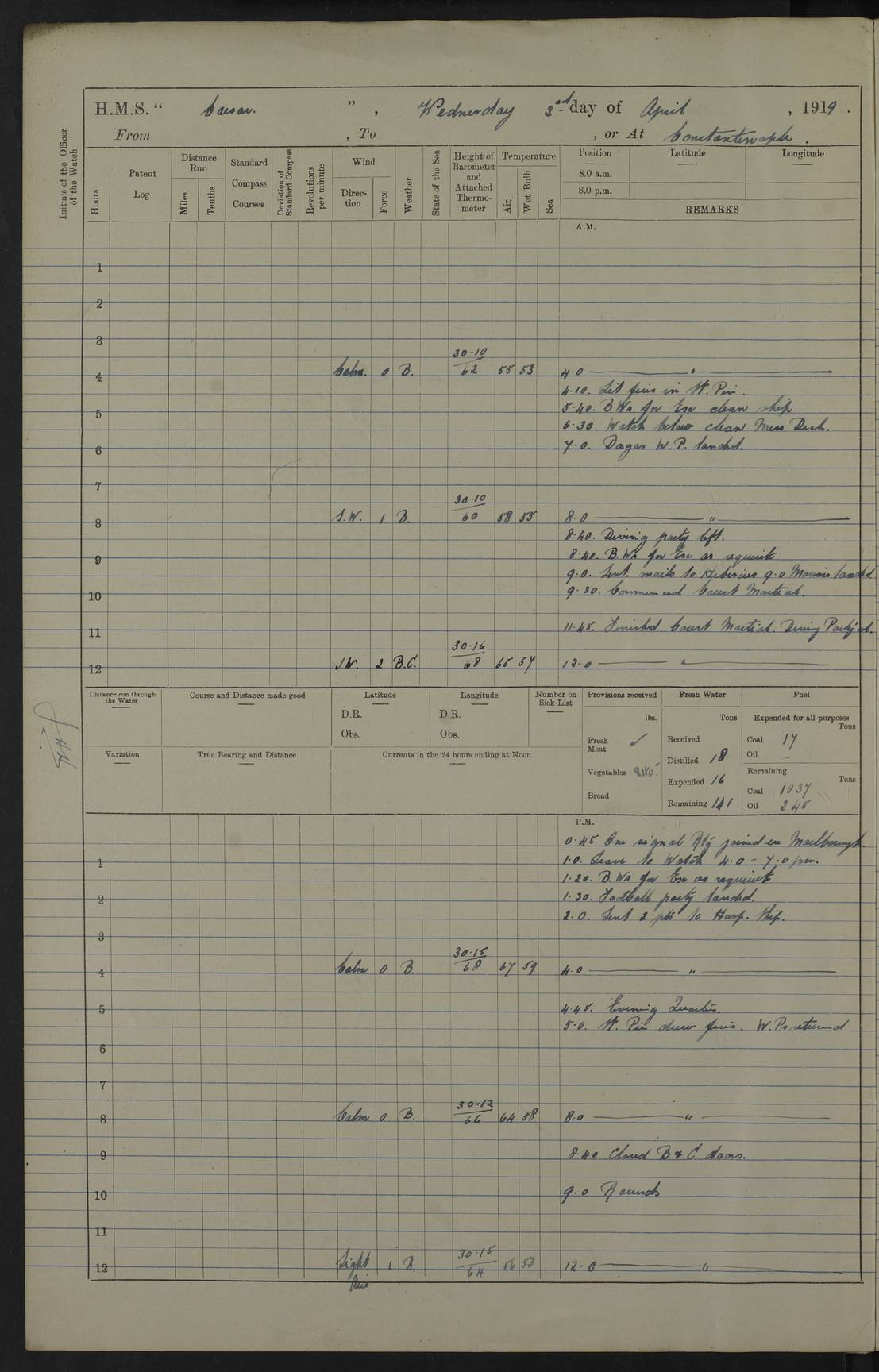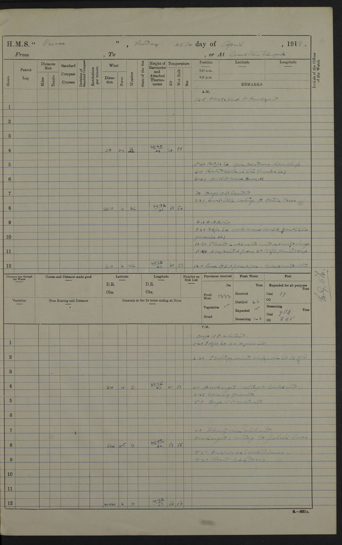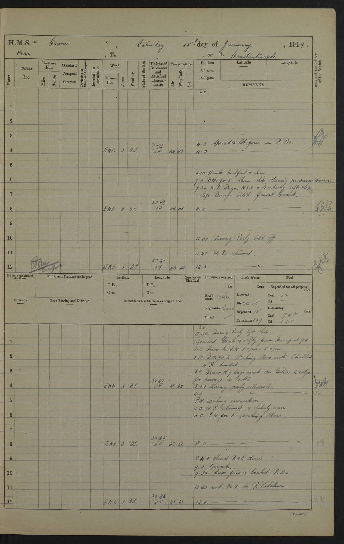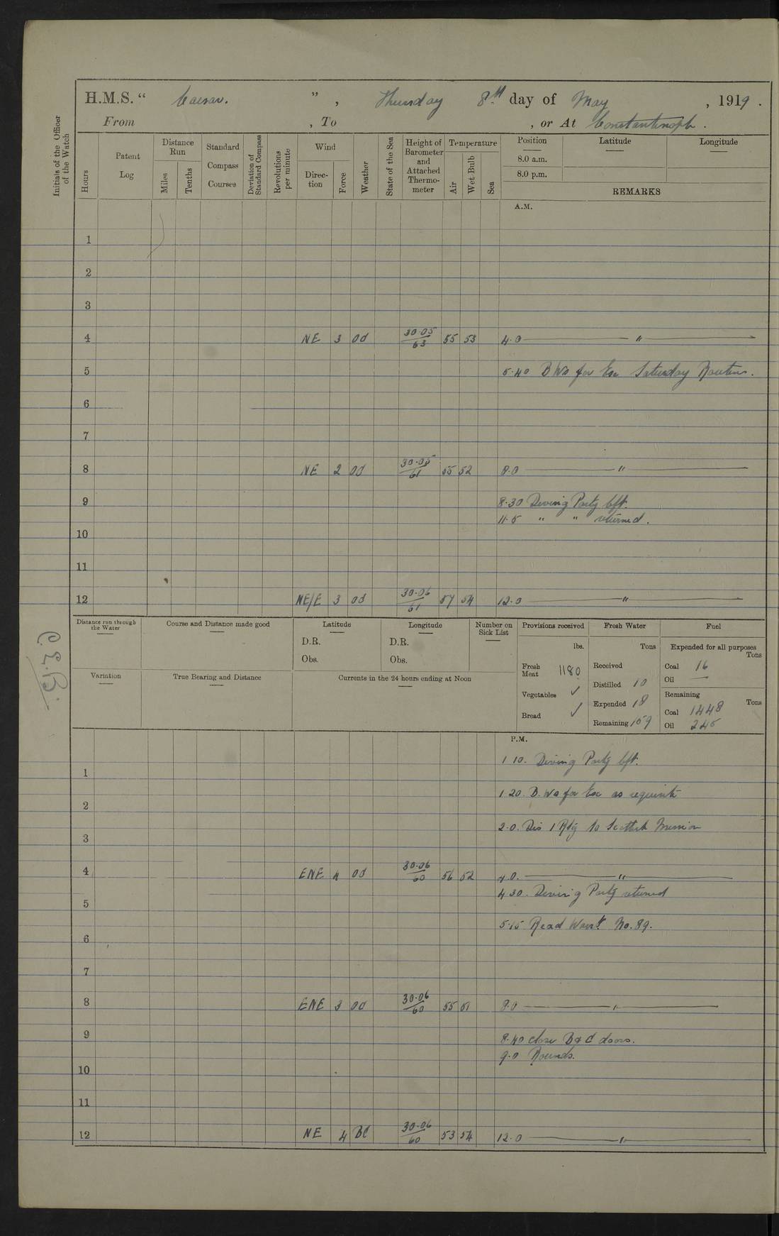 4edebb7b14d0450578000168: (https://s3.amazonaws.com:443/oldweather/ADM53-36589/0003_1.jpg) 1 November 1918 At Malta Lat 35.89, Long 14.52 [Somerset Wharf] 11.15am: Engineers Store Party returned on Board. 0.45pm: Paid Monthly Money. 1.0pm: Mr Goss, Gunner rejoined Ship from RN Hospital. 2.30pm: Gave Special leave to Port Watch untill 7.0am and Port Watch of Boys untill 6.0pm. Hands Made [sic] and Mend Clothes. 2.40pm: Landed liberty Men and Boys. 3.50pm: Provision Boat came alongside. 4.10pm: (4) Recovered Patients rejoined Ship from RN Hospital. 4.30pm: Landed liberty Men and Patrol. 6.0pm: Liberty Boys Returned on Board. 6.30pm: Canteen Party landed untill 10.0pm and Read Warrant No (24). 10.0pm: Canteen Party returned on Board. 11.50pm: Patrol returned on Board. [Provisions received: Fresh Meat 300 lbs, Vegetables 1000 lbs, Bread 450 lbs] 4edebb7c14d0450578000169: (https://s3.amazonaws.com:443/oldweather/ADM53-36589/0004_0.jpg) 2 November 1918 At Malta Lat 35.89, Long 14.52 [Hamilton Wharf] 7.15am: Shifted Berths from Somerset Wharf, to Hamilton Wharf. 8.0am: Tested life Buoys Correct. 8.45am: BW for x Told off Special Parties, Remainder of Hands employed as Requisite, and Landed Picket house Party. 9.10am: Held Court Martial on Board. 10.30am: Court Martial Finished. Noon: Picket House Party returned. 1.20pm: BW for x. Told off Special Parties. Remainder of Hands employed getting in Paymasters Stores and as Requisite. Lost overboard by accident Boat Hooks, Steel, Pattern (345), 2 in Number. 4.20pm: Hands to Fire Stations. 4.35pm: Read Warrant No 25 and gave Special leave to Starboard Watch untill 7.0am. 5.0pm: Landed liberty Men and Victualling Yard Lighter left Ship. 6.30pm: Canteen Party landed untill 10.0pm. [Provisions received: Fresh Meat 260 lbs, Bread 900 lbs] 4edebb7c14d045057800016a: (https://s3.amazonaws.com:443/oldweather/ADM53-36589/0004_1.jpg) 3 November 1918 At Malta Lat 35.89, Long 14.52 [Hamilton Wharf] 9.0am: Landed Church Parties, Wesleyans (14), Presbyterians (10). 9.30am: Divisions. 9.50am: Landed Roman Catholics (15). 10.10am: Discharged (5) Ratings to RN Hospital. 11.35am: All Church Parties returned on Board. 1.0pm: Gave Special leave to Port Watch untill 7.0am and Both Watches of Boys untill 5.30pm. 1.15pm: Landed liberty Men and Boys. 5.30pm: Liberty Boys returned on Board. 6.30pm: Canteen Party landed untill 10.0pm. 8.40pm: Closed B and C Doors. 10.0pm: Canteen Party returned on Board. [Number on sick list: 5] [Provisions received: Fresh Meat 280 lbs] 4edebb7c14d045057800016b: (https://s3.amazonaws.com:443/oldweather/ADM53-36589/0005_0.jpg) 4 November 1918 At Malta Lat 35.89, Long 14.52 [Hamilton Wharf] 6.50am: BW for x Told off Special Parties, remainder of Hands employed as Requisite. 7.0am: Liberty men returned on Board. 8.5am: Provision lighter came alongside. 8.10am: BW for x, Told off Special Parties, remainder of Hands employed Provisioning Ship and as requisite. 8.45am: Landed (1) Carpenter rating for Examination. 3.45pm: (2) Recovered Patients joined Ship from RN Hospital. 4.10pm: Received 8 Bags of Mails from Egmont, and Gave Special leave to Starboard Watch till 7.0am. 5.0pm: Landed Liberty Men and Patrol. 6.0pm: Hands employed getting in and stowing away Provisions. Midnight: Patrol returned on Board. [Weather fine, noon temperature 74F] 4edebb7c14d045057800016c: (https://s3.amazonaws.com:443/oldweather/ADM53-36589/0005_1.jpg) 5 November 1918 At Malta Lat 35.89, Long 14.52 [Hamilton Wharf] 6.45am: BW for x. Told off Special Parties. Remainder of Hands employed getting in and stowing away Provisions. 8.30am: Landed Hospital Party and Picket House Party. 11.0am: Landed (35) Rifles to Naval Ordinance for exchange. Noon: Picket House Party returned. 1.20pm: Landed (2) Ratings for Dental Treatment. 2.25pm: (35) Exchanged Rifles came on Board. 3.40pm: (2) Recovered Patients rejoined Ship from RN Hospital and disinfected Bedding. 4.0pm: Gave Special leave to Port Watch untill 7.0am. Starboard Watch employed stowing Provisions. 4.30pm: Landed Liberty men. Starboard Watch employed stowing away Provisions and Read Warrant No (26). [Provisions received: Fresh Meat 530 lbs, Bread 1000 lbs] 4edebb7c14d045057800016d: (https://s3.amazonaws.com:443/oldweather/ADM53-36589/0006_0.jpg) 6 November 1918 At Malta Lat 35.89, Long 14.52 [Hamilton Wharf] 6.50am: BW for x. Told off Special Parties, Remainder of Port Watch stowing Provisions, Starboard Watch drawing Quarter Deck Awning. 9.0am: Hands employed Provisioning Ship. 4.0pm: Gave Special leave to Starboard Watch untill 7.0am. 4.30pm: Landed liberty Men. Port Watch employed stowing away Provisions. 6.30pm: Canteen Party landed until 10.0pm. 10.0pm: Canteen Party returned on Board. [Number on sick list: 5] [Provisions received: Fresh Meat 250 lbs, Vegetables 1000 lbs, Bread 450 lbs] [Fuel Remaining: Coal 244 tons, Oil 332 tons] 4edebb7c14d045057800016e: (https://s3.amazonaws.com:443/oldweather/ADM53-36589/0006_1.jpg) 7 November 1918 At Malta Lat 35.89, Long 14.52 [No 4 Buoy] 6.30am: BW for x. Told off Special Parties. Remainder of Hands employed prepairing [preparing] Ship to Shift Berths, from Hamilton Wharf to No 4 Buoy. 7.0am: Liberty men returned on Board. 8.50am: Secured Ship to No 4 Buoy and Coal Lighters came alongside. 9.10am: Commenced Coaling Native labour. Hands employed Drawing Stores and as Requisite. 11.50am: Dockyard Parties returned. 1.40pm: BW for x Told off Special Parties, remainder of Hands employed as Requisite. 4.30pm: Gave Special leave to Port Watch untill 7.0am. 4.45pm: Landed liberty men and Patrol and Read Warrant No (27). 7.30pm: Completed Coaling (1481) Tons. 8.40pm: Watch employed sweeping down. 11.50pm: Patrol returned on Board. [Number on sick list: 6] [Provisions received: Fresh Meat 280 lbs, Bread 300 lbs] [Fuel Remaining: Coal 1716 tons, Oil 332 tons] 4edebb7c14d045057800016f: (https://s3.amazonaws.com:443/oldweather/ADM53-36589/0007_0.jpg) 8 November 1918 At Malta Lat 35.89, Long 