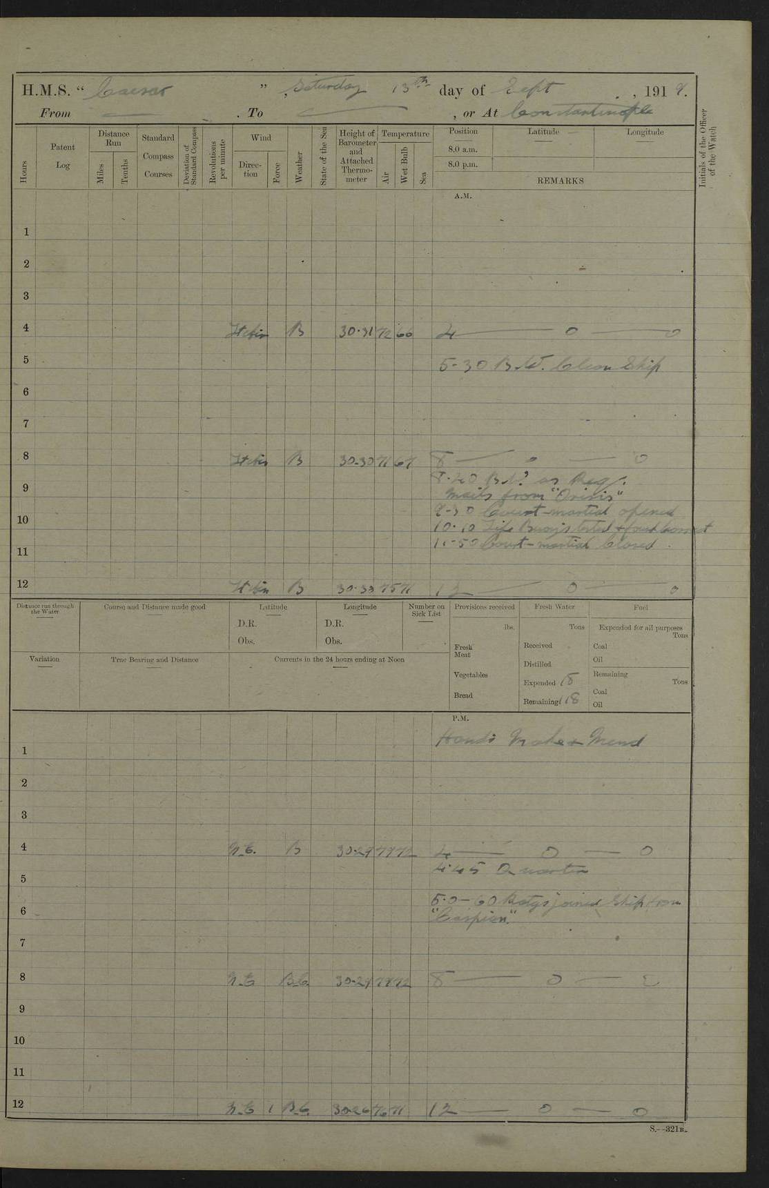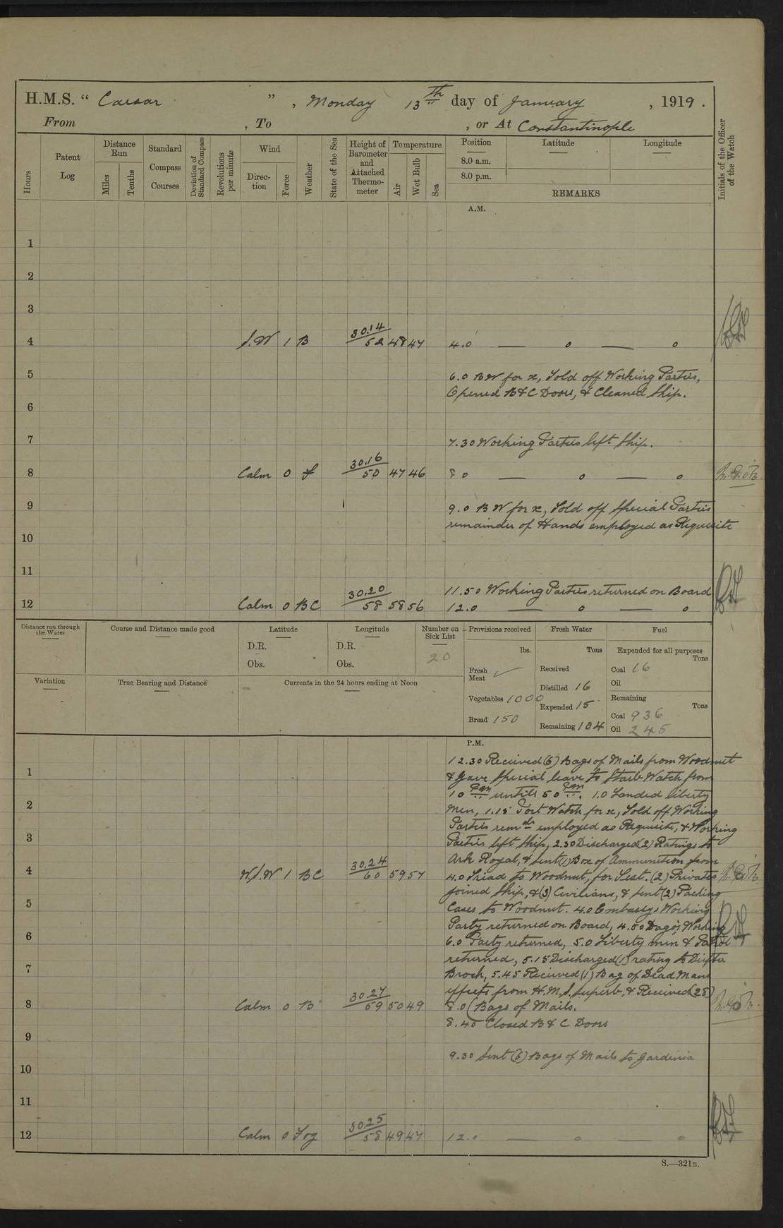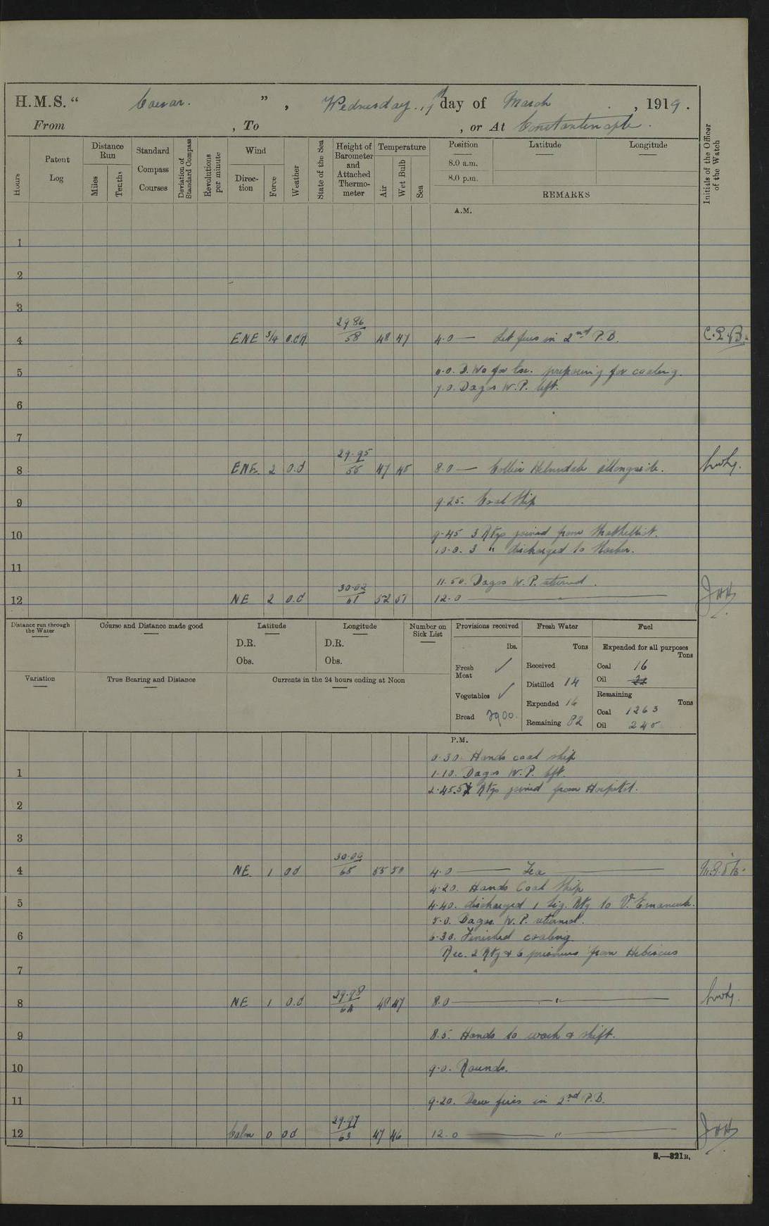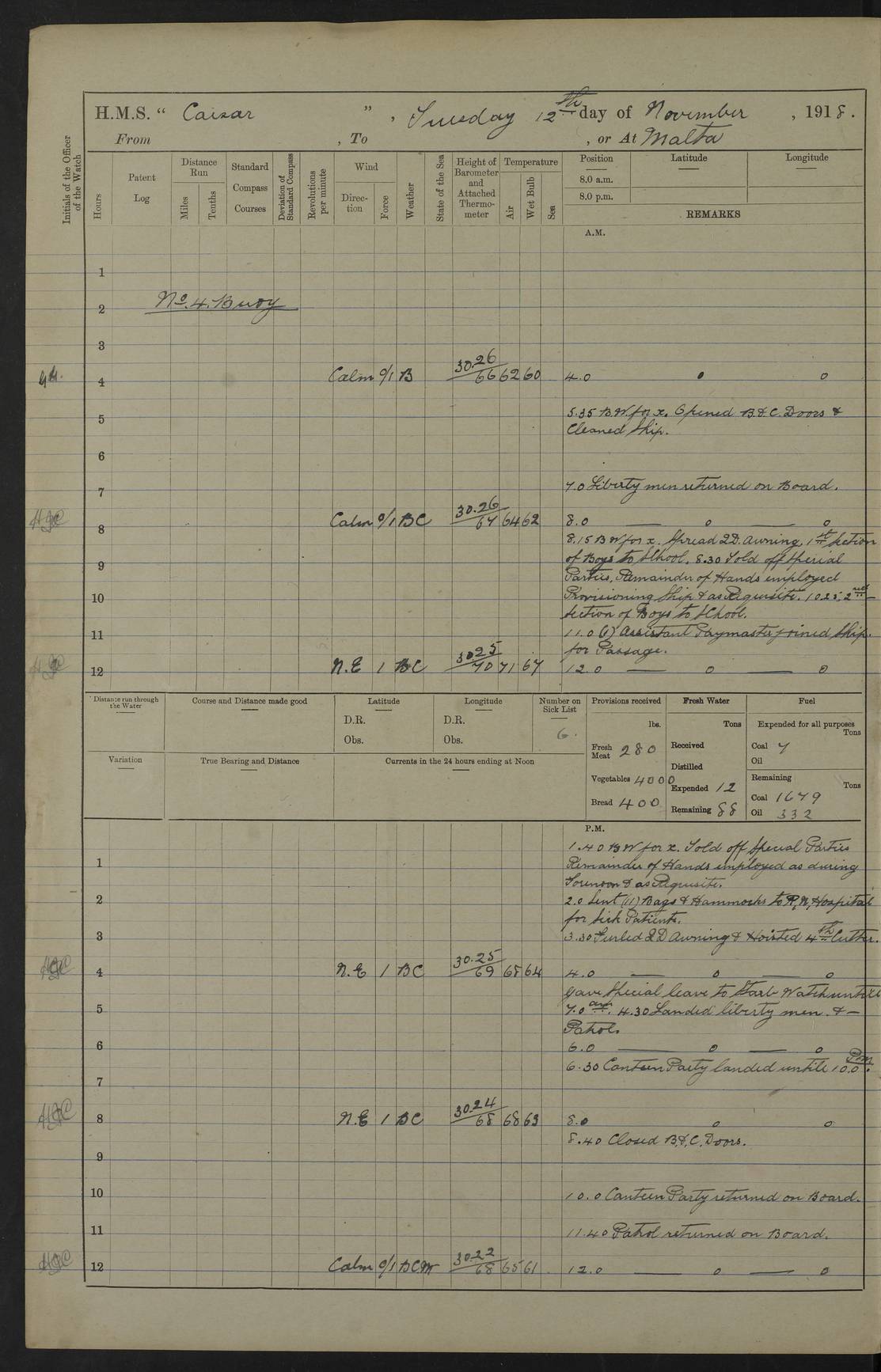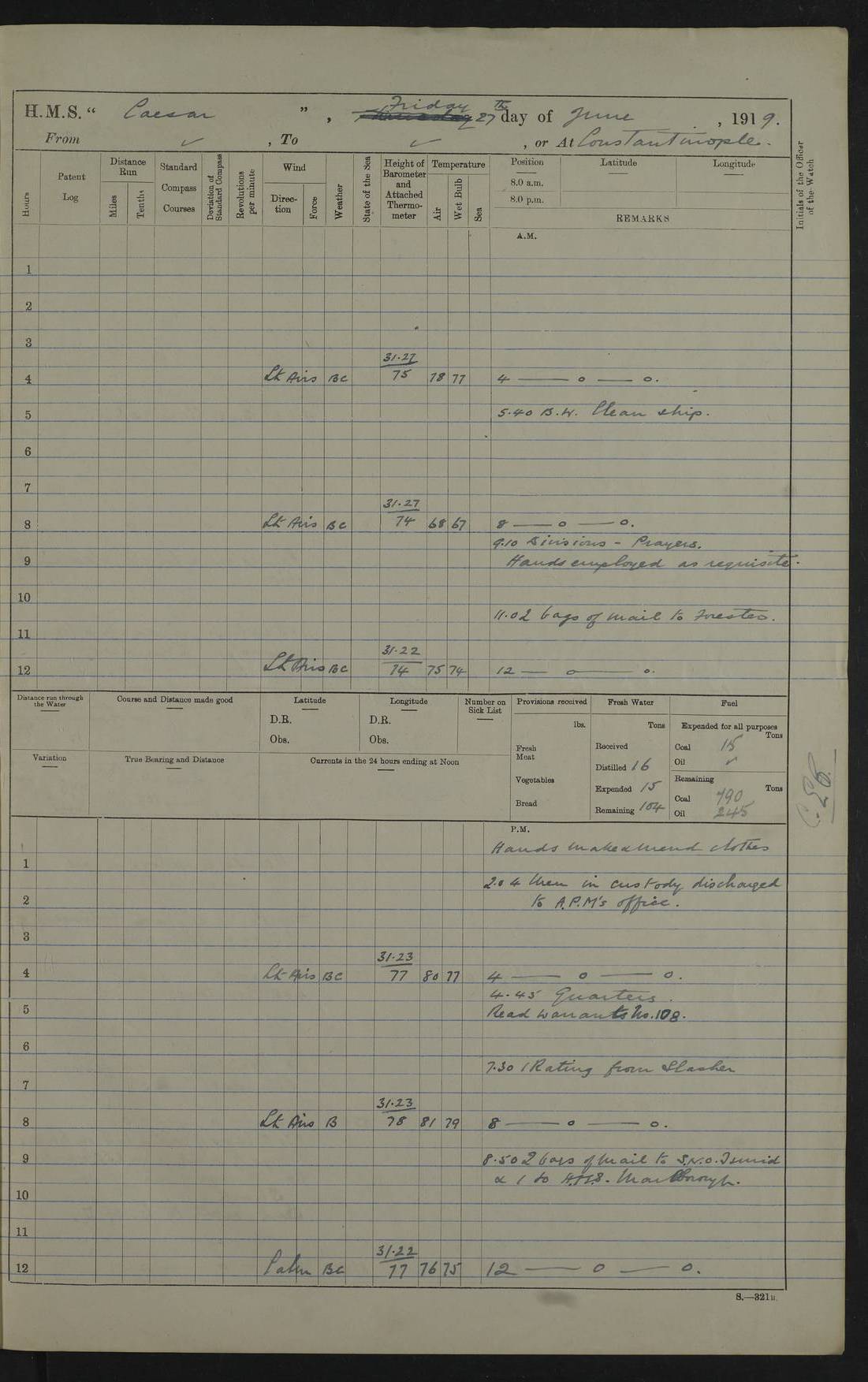 4edebb7b14d0450578000168: (https://s3.amazonaws.com:443/oldweather/ADM53-36589/0003_1.jpg) 1 November 1918 At Malta Lat 35.89, Long 14.52 [Somerset Wharf] 11.15am: Engineers Store Party returned on Board. 0.45pm: Paid Monthly Money. 1.0pm: Mr Goss, Gunner rejoined Ship from RN Hospital. 2.30pm: Gave Special leave to Port Watch untill 7.0am and Port Watch of Boys untill 6.0pm. Hands Made [sic] and Mend Clothes. 2.40pm: Landed liberty Men and Boys. 3.50pm: Provision Boat came alongside. 4.10pm: (4) Recovered Patients rejoined Ship from RN Hospital. 4.30pm: Landed liberty Men and Patrol. 6.0pm: Liberty Boys Returned on Board. 6.30pm: Canteen Party landed untill 10.0pm and Read Warrant No (24). 10.0pm: Canteen Party returned on Board. 11.50pm: Patrol returned on Board. [Provisions received: Fresh Meat 300 lbs, Vegetables 1000 lbs, Bread 450 lbs] 4edebb7c14d0450578000169: (https://s3.amazonaws.com:443/oldweather/ADM53-36589/0004_0.jpg) 2 November 1918 At Malta Lat 35.89, Long 14.52 [Hamilton Wharf] 7.15am: Shifted Berths from Somerset Wharf, to Hamilton Wharf. 8.0am: Tested life Buoys Correct. 8.45am: BW for x Told off Special Parties, Remainder of Hands employed as Requisite, and Landed Picket house Party. 9.10am: Held Court Martial on Board. 10.30am: Court Martial Finished. Noon: Picket House Party returned. 1.20pm: BW for x. Told off Special Parties. Remainder of Hands employed getting in Paymasters Stores and as Requisite. Lost overboard by accident Boat Hooks, Steel, Pattern (345), 2 in Number. 4.20pm: Hands to Fire Stations. 4.35pm: Read Warrant No 25 and gave Special leave to Starboard Watch untill 7.0am. 5.0pm: Landed liberty Men and Victualling Yard Lighter left Ship. 6.30pm: Canteen Party landed untill 10.0pm. [Provisions received: Fresh Meat 260 lbs, Bread 900 lbs] 4edebb7c14d045057800016a: (https://s3.amazonaws.com:443/oldweather/ADM53-36589/0004_1.jpg) 3 November 1918 At Malta Lat 35.89, Long 14.52 [Hamilton Wharf] 9.0am: Landed Church Parties, Wesleyans (14), Presbyterians (10). 9.30am: Divisions. 9.50am: Landed Roman Catholics (15). 10.10am: Discharged (5) Ratings to RN Hospital. 11.35am: All Church Parties returned on Board. 1.0pm: Gave Special leave to Port Watch untill 7.0am and Both Watches of Boys untill 5.30pm. 1.15pm: Landed liberty Men and Boys. 5.30pm: Liberty Boys returned on Board. 6.30pm: Canteen Party landed untill 10.0pm. 8.40pm: Closed B and C Doors. 10.0pm: Canteen Party returned on Board. [Number on sick list: 5] [Provisions received: Fresh Meat 280 lbs] 4edebb7c14d045057800016b: (https://s3.amazonaws.com:443/oldweather/ADM53-36589/0005_0.jpg) 4 November 1918 At Malta Lat 35.89, Long 14.52 [Hamilton Wharf] 6.50am: BW for x Told off Special Parties, remainder of Hands employed as Requisite. 7.0am: Liberty men returned on Board. 8.5am: Provision lighter came alongside. 8.10am: BW for x, Told off Special Parties, remainder of Hands employed Provisioning Ship and as requisite. 8.45am: Landed (1) Carpenter rating for Examination. 3.45pm: (2) Recovered Patients joined Ship from RN Hospital. 4.10pm: Received 8 Bags of Mails from Egmont, and Gave Special leave to Starboard Watch till 7.0am. 5.0pm: Landed Liberty Men and Patrol. 6.0pm: Hands employed getting in and stowing away Provisions. Midnight: Patrol returned on Board. [Weather fine, noon temperature 74F] 4edebb7c14d045057800016c: (https://s3.amazonaws.com:443/oldweather/ADM53-36589/0005_1.jpg) 5 November 1918 At Malta Lat 35.89, Long 14.52 [Hamilton Wharf] 6.45am: BW for x. Told off Special Parties. Remainder of Hands employed getting in and stowing away Provisions. 8.30am: Landed Hospital Party and Picket House Party. 11.0am: Landed (35) Rifles to Naval Ordinance for exchange. Noon: Picket House Party returned. 1.20pm: Landed (2) Ratings for Dental Treatment. 2.25pm: (35) Exchanged Rifles came on Board. 3.40pm: (2) Recovered Patients rejoined Ship from RN Hospital and disinfected Bedding. 4.0pm: Gave Special leave to Port Watch untill 7.0am. Starboard Watch employed stowing Provisions. 4.30pm: Landed Liberty men. Starboard Watch employed stowing away Provisions and Read Warrant No (26). [Provisions received: Fresh Meat 530 lbs, Bread 1000 lbs] 4edebb7c14d045057800016d: (https://s3.amazonaws.com:443/oldweather/ADM53-36589/0006_0.jpg) 6 November 1918 At Malta Lat 35.89, Long 14.52 [Hamilton Wharf] 6.50am: BW for x. Told off Special Parties, Remainder of Port Watch stowing Provisions, Starboard Watch drawing Quarter Deck Awning. 9.0am: Hands employed Provisioning Ship. 4.0pm: Gave Special leave to Starboard Watch untill 7.0am. 4.30pm: Landed liberty Men. Port Watch employed stowing away Provisions. 6.30pm: Canteen Party landed until 10.0pm. 10.0pm: Canteen Party returned on Board. [Number on sick list: 5] [Provisions received: Fresh Meat 250 lbs, Vegetables 1000 lbs, Bread 450 lbs] [Fuel Remaining: Coal 244 tons, Oil 332 tons] 4edebb7c14d045057800016e: (https://s3.amazonaws.com:443/oldweather/ADM53-36589/0006_1.jpg) 7 November 1918 At Malta Lat 35.89, Long 14.52 [No 4 Buoy] 6.30am: BW for x. Told off Special Parties. Remainder of Hands employed prepairing [preparing] Ship to Shift Berths, from Hamilton Wharf to No 4 Buoy. 7.0am: Liberty men returned on Board. 8.50am: Secured Ship to No 4 Buoy and Coal Lighters came alongside. 9.10am: Commenced Coaling Native labour. Hands employed Drawing Stores and as Requisite. 11.50am: Dockyard Parties returned. 1.40pm: BW for x Told off Special Parties, remainder of Hands employed as Requisite. 4.30pm: Gave Special leave to Port Watch untill 7.0am. 4.45pm: Landed liberty men and Patrol and Read Warrant No (27). 7.30pm: Completed Coaling (1481) Tons. 8.40pm: Watch employed sweeping down. 11.50pm: Patrol returned on Board. [Number on sick list: 6] [Provisions received: Fresh Meat 280 lbs, Bread 300 lbs] [Fuel Remaining: Coal 1716 tons, Oil 332 tons] 4edebb7c14d045057800016f: (https://s3.amazonaws.com:443/oldweather/ADM53-36589/0007_0.jpg) 8 November 1918 At Malta Lat 35.89, Long 