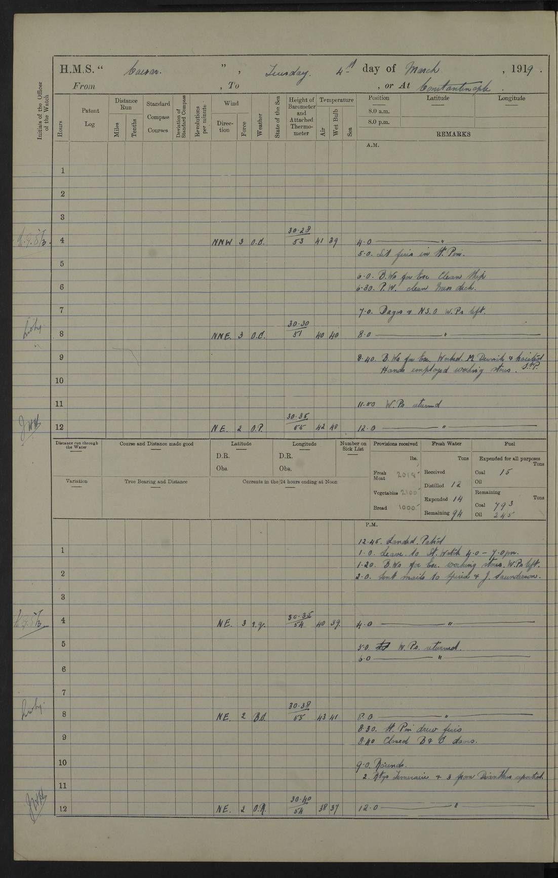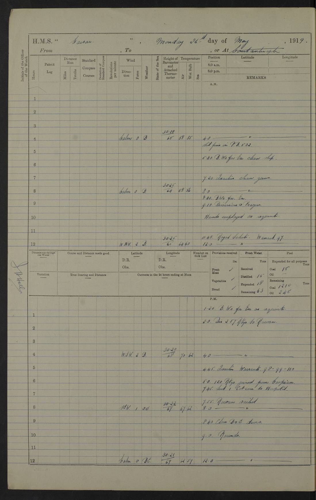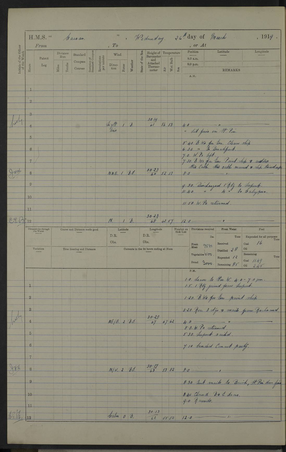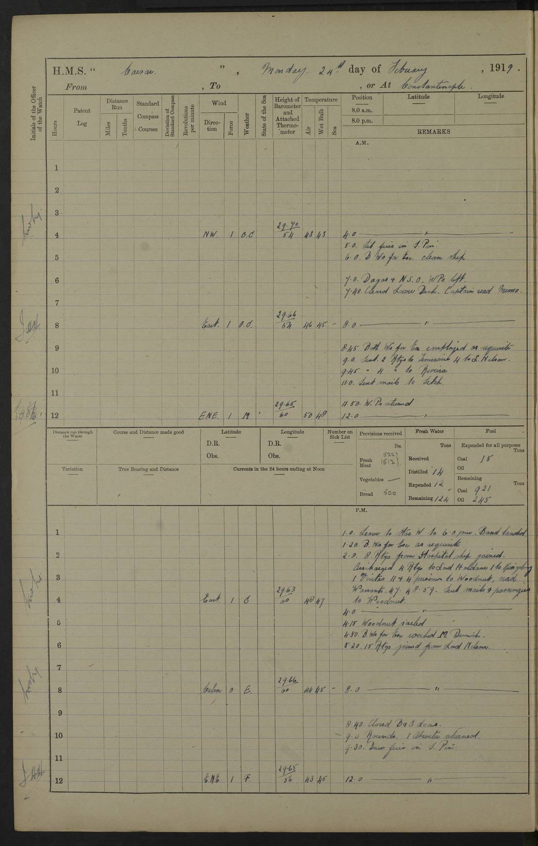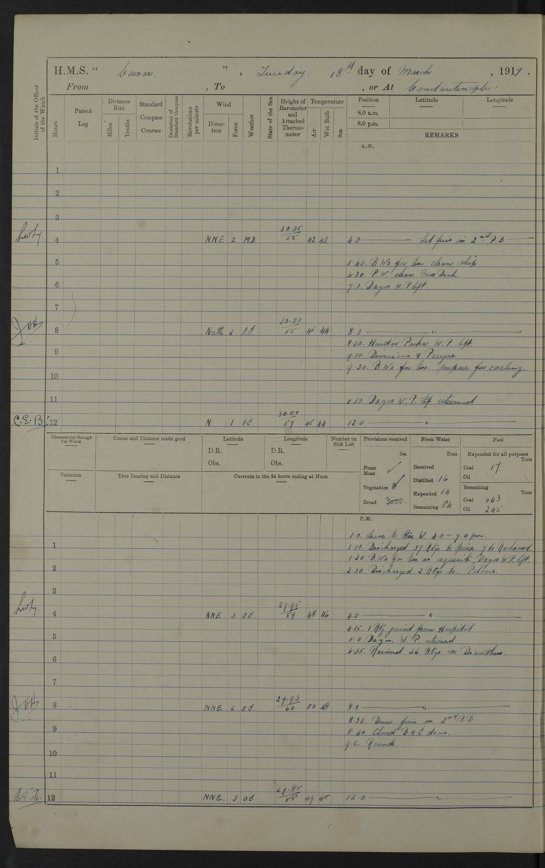 4edebb7b14d0450578000168: (https://s3.amazonaws.com:443/oldweather/ADM53-36589/0003_1.jpg) 1 November 1918 At Malta Lat 35.89, Long 14.52 [Somerset Wharf] 11.15am: Engineers Store Party returned on Board. 0.45pm: Paid Monthly Money. 1.0pm: Mr Goss, Gunner rejoined Ship from RN Hospital. 2.30pm: Gave Special leave to Port Watch untill 7.0am and Port Watch of Boys untill 6.0pm. Hands Made [sic] and Mend Clothes. 2.40pm: Landed liberty Men and Boys. 3.50pm: Provision Boat came alongside. 4.10pm: (4) Recovered Patients rejoined Ship from RN Hospital. 4.30pm: Landed liberty Men and Patrol. 6.0pm: Liberty Boys Returned on Board. 6.30pm: Canteen Party landed untill 10.0pm and Read Warrant No (24). 10.0pm: Canteen Party returned on Board. 11.50pm: Patrol returned on Board. [Provisions received: Fresh Meat 300 lbs, Vegetables 1000 lbs, Bread 450 lbs] 4edebb7c14d0450578000169: (https://s3.amazonaws.com:443/oldweather/ADM53-36589/0004_0.jpg) 2 November 1918 At Malta Lat 35.89, Long 14.52 [Hamilton Wharf] 7.15am: Shifted Berths from Somerset Wharf, to Hamilton Wharf. 8.0am: Tested life Buoys Correct. 8.45am: BW for x Told off Special Parties, Remainder of Hands employed as Requisite, and Landed Picket house Party. 9.10am: Held Court Martial on Board. 10.30am: Court Martial Finished. Noon: Picket House Party returned. 1.20pm: BW for x. Told off Special Parties. Remainder of Hands employed getting in Paymasters Stores and as Requisite. Lost overboard by accident Boat Hooks, Steel, Pattern (345), 2 in Number. 4.20pm: Hands to Fire Stations. 4.35pm: Read Warrant No 25 and gave Special leave to Starboard Watch untill 7.0am. 5.0pm: Landed liberty Men and Victualling Yard Lighter left Ship. 6.30pm: Canteen Party landed untill 10.0pm. [Provisions received: Fresh Meat 260 lbs, Bread 900 lbs] 4edebb7c14d045057800016a: (https://s3.amazonaws.com:443/oldweather/ADM53-36589/0004_1.jpg) 3 November 1918 At Malta Lat 35.89, Long 14.52 [Hamilton Wharf] 9.0am: Landed Church Parties, Wesleyans (14), Presbyterians (10). 9.30am: Divisions. 9.50am: Landed Roman Catholics (15). 10.10am: Discharged (5) Ratings to RN Hospital. 11.35am: All Church Parties returned on Board. 1.0pm: Gave Special leave to Port Watch untill 7.0am and Both Watches of Boys untill 5.30pm. 1.15pm: Landed liberty Men and Boys. 5.30pm: Liberty Boys returned on Board. 6.30pm: Canteen Party landed untill 10.0pm. 8.40pm: Closed B and C Doors. 10.0pm: Canteen Party returned on Board. [Number on sick list: 5] [Provisions received: Fresh Meat 280 lbs] 4edebb7c14d045057800016b: (https://s3.amazonaws.com:443/oldweather/ADM53-36589/0005_0.jpg) 4 November 1918 At Malta Lat 35.89, Long 14.52 [Hamilton Wharf] 6.50am: BW for x Told off Special Parties, remainder of Hands employed as Requisite. 7.0am: Liberty men returned on Board. 8.5am: Provision lighter came alongside. 8.10am: BW for x, Told off Special Parties, remainder of Hands employed Provisioning Ship and as requisite. 8.45am: Landed (1) Carpenter rating for Examination. 3.45pm: (2) Recovered Patients joined Ship from RN Hospital. 4.10pm: Received 8 Bags of Mails from Egmont, and Gave Special leave to Starboard Watch till 7.0am. 5.0pm: Landed Liberty Men and Patrol. 6.0pm: Hands employed getting in and stowing away Provisions. Midnight: Patrol returned on Board. [Weather fine, noon temperature 74F] 4edebb7c14d045057800016c: (https://s3.amazonaws.com:443/oldweather/ADM53-36589/0005_1.jpg) 5 November 1918 At Malta Lat 35.89, Long 14.52 [Hamilton Wharf] 6.45am: BW for x. Told off Special Parties. Remainder of Hands employed getting in and stowing away Provisions. 8.30am: Landed Hospital Party and Picket House Party. 11.0am: Landed (35) Rifles to Naval Ordinance for exchange. Noon: Picket House Party returned. 1.20pm: Landed (2) Ratings for Dental Treatment. 2.25pm: (35) Exchanged Rifles came on Board. 3.40pm: (2) Recovered Patients rejoined Ship from RN Hospital and disinfected Bedding. 4.0pm: Gave Special leave to Port Watch untill 7.0am. Starboard Watch employed stowing Provisions. 4.30pm: Landed Liberty men. Starboard Watch employed stowing away Provisions and Read Warrant No (26). [Provisions received: Fresh Meat 530 lbs, Bread 1000 lbs] 4edebb7c14d045057800016d: (https://s3.amazonaws.com:443/oldweather/ADM53-36589/0006_0.jpg) 6 November 1918 At Malta Lat 35.89, Long 14.52 [Hamilton Wharf] 6.50am: BW for x. Told off Special Parties, Remainder of Port Watch stowing Provisions, Starboard Watch drawing Quarter Deck Awning. 9.0am: Hands employed Provisioning Ship. 4.0pm: Gave Special leave to Starboard Watch untill 7.0am. 4.30pm: Landed liberty Men. Port Watch employed stowing away Provisions. 6.30pm: Canteen Party landed until 10.0pm. 10.0pm: Canteen Party returned on Board. [Number on sick list: 5] [Provisions received: Fresh Meat 250 lbs, Vegetables 1000 lbs, Bread 450 lbs] [Fuel Remaining: Coal 244 tons, Oil 332 tons] 4edebb7c14d045057800016e: (https://s3.amazonaws.com:443/oldweather/ADM53-36589/0006_1.jpg) 7 November 1918 At Malta Lat 35.89, Long 14.52 [No 4 Buoy] 6.30am: BW for x. Told off Special Parties. Remainder of Hands employed prepairing [preparing] Ship to Shift Berths, from Hamilton Wharf to No 4 Buoy. 7.0am: Liberty men returned on Board. 8.50am: Secured Ship to No 4 Buoy and Coal Lighters came alongside. 9.10am: Commenced Coaling Native labour. Hands employed Drawing Stores and as Requisite. 11.50am: Dockyard Parties returned. 1.40pm: BW for x Told off Special Parties, remainder of Hands employed as Requisite. 4.30pm: Gave Special leave to Port Watch untill 7.0am. 4.45pm: Landed liberty men and Patrol and Read Warrant No (27). 7.30pm: Completed Coaling (1481) Tons. 8.40pm: Watch employed sweeping down. 11.50pm: Patrol returned on Board. [Number on sick list: 6] [Provisions received: Fresh Meat 280 lbs, Bread 300 lbs] [Fuel Remaining: Coal 1716 tons, Oil 332 tons] 4edebb7c14d045057800016f: (https://s3.amazonaws.com:443/oldweather/ADM53-36589/0007_0.jpg) 8 November 1918 At Malta Lat 35.89, Long 