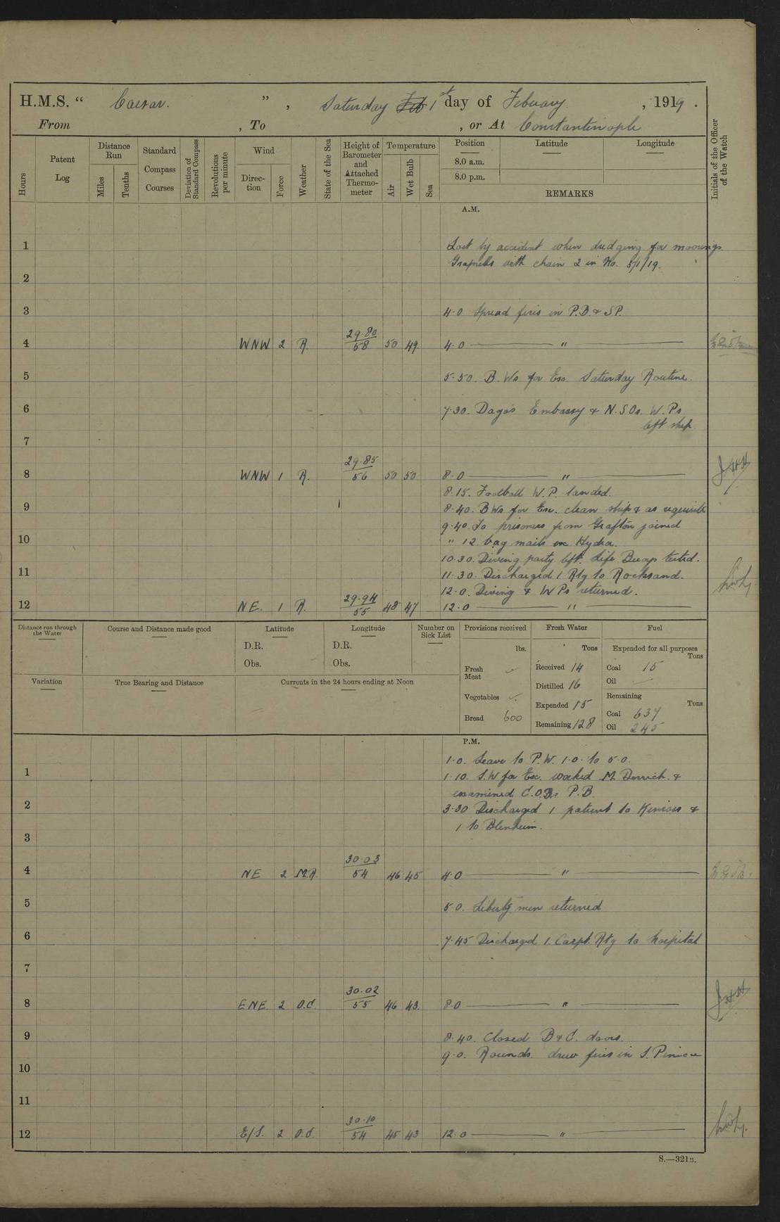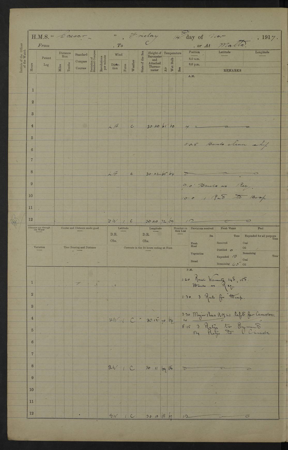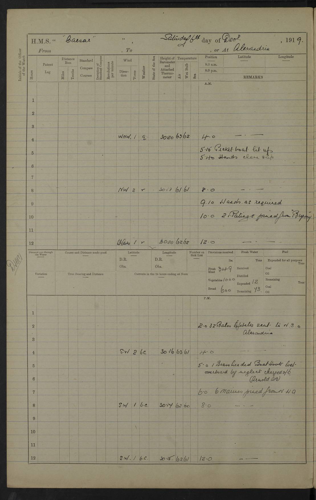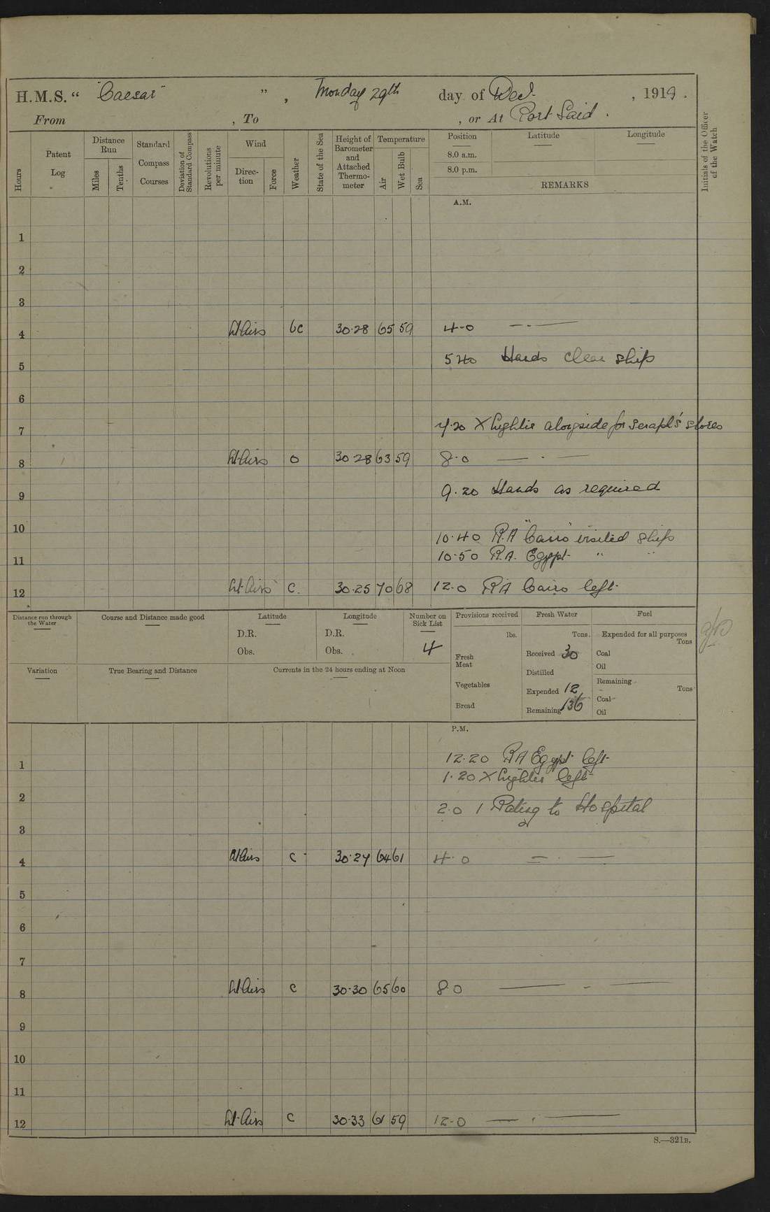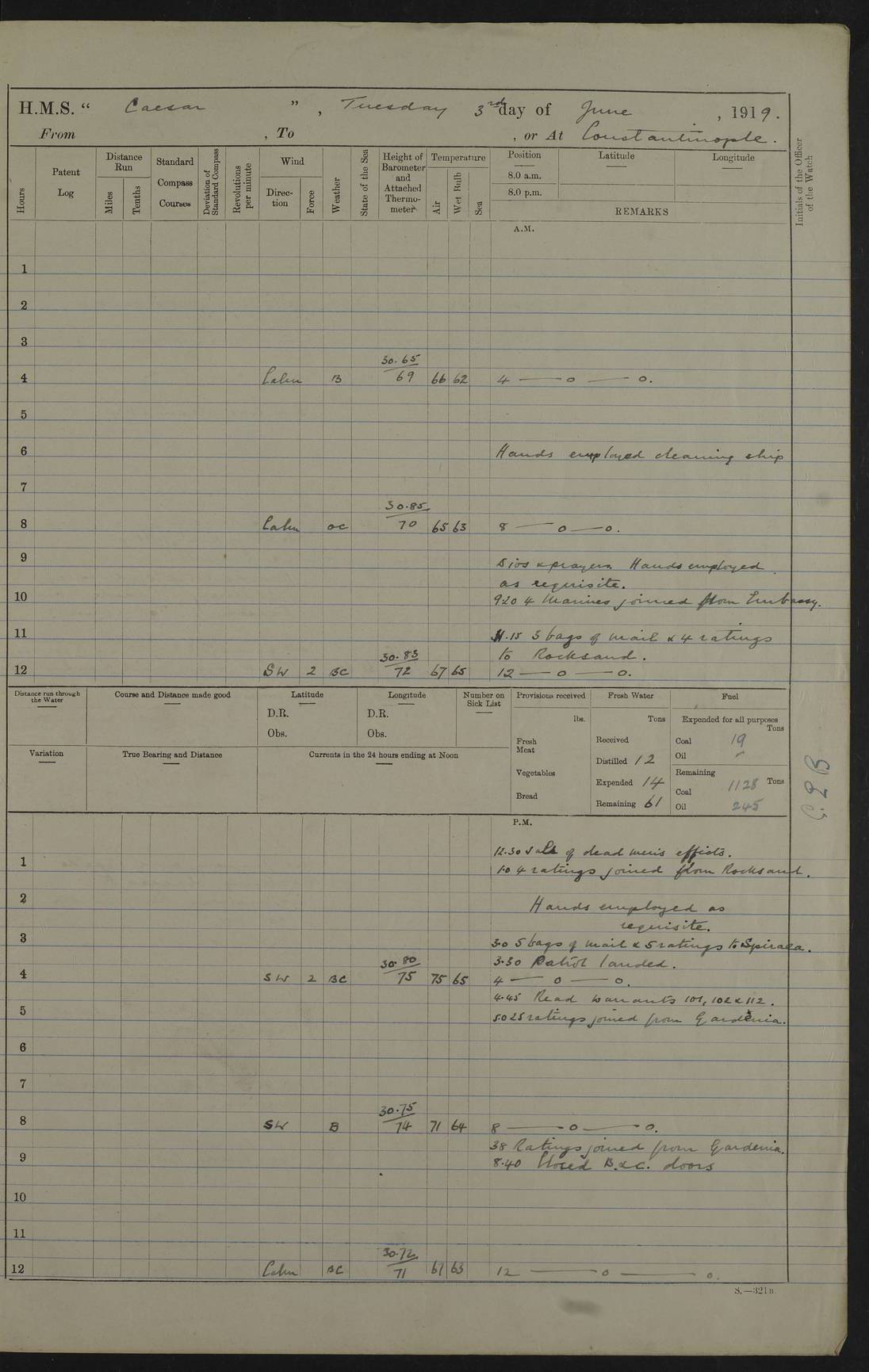 4edebb7b14d0450578000168: (https://s3.amazonaws.com:443/oldweather/ADM53-36589/0003_1.jpg) 1 November 1918 At Malta Lat 35.89, Long 14.52 [Somerset Wharf] 11.15am: Engineers Store Party returned on Board. 0.45pm: Paid Monthly Money. 1.0pm: Mr Goss, Gunner rejoined Ship from RN Hospital. 2.30pm: Gave Special leave to Port Watch untill 7.0am and Port Watch of Boys untill 6.0pm. Hands Made [sic] and Mend Clothes. 2.40pm: Landed liberty Men and Boys. 3.50pm: Provision Boat came alongside. 4.10pm: (4) Recovered Patients rejoined Ship from RN Hospital. 4.30pm: Landed liberty Men and Patrol. 6.0pm: Liberty Boys Returned on Board. 6.30pm: Canteen Party landed untill 10.0pm and Read Warrant No (24). 10.0pm: Canteen Party returned on Board. 11.50pm: Patrol returned on Board. [Provisions received: Fresh Meat 300 lbs, Vegetables 1000 lbs, Bread 450 lbs] 4edebb7c14d0450578000169: (https://s3.amazonaws.com:443/oldweather/ADM53-36589/0004_0.jpg) 2 November 1918 At Malta Lat 35.89, Long 14.52 [Hamilton Wharf] 7.15am: Shifted Berths from Somerset Wharf, to Hamilton Wharf. 8.0am: Tested life Buoys Correct. 8.45am: BW for x Told off Special Parties, Remainder of Hands employed as Requisite, and Landed Picket house Party. 9.10am: Held Court Martial on Board. 10.30am: Court Martial Finished. Noon: Picket House Party returned. 1.20pm: BW for x. Told off Special Parties. Remainder of Hands employed getting in Paymasters Stores and as Requisite. Lost overboard by accident Boat Hooks, Steel, Pattern (345), 2 in Number. 4.20pm: Hands to Fire Stations. 4.35pm: Read Warrant No 25 and gave Special leave to Starboard Watch untill 7.0am. 5.0pm: Landed liberty Men and Victualling Yard Lighter left Ship. 6.30pm: Canteen Party landed untill 10.0pm. [Provisions received: Fresh Meat 260 lbs, Bread 900 lbs] 4edebb7c14d045057800016a: (https://s3.amazonaws.com:443/oldweather/ADM53-36589/0004_1.jpg) 3 November 1918 At Malta Lat 35.89, Long 14.52 [Hamilton Wharf] 9.0am: Landed Church Parties, Wesleyans (14), Presbyterians (10). 9.30am: Divisions. 9.50am: Landed Roman Catholics (15). 10.10am: Discharged (5) Ratings to RN Hospital. 11.35am: All Church Parties returned on Board. 1.0pm: Gave Special leave to Port Watch untill 7.0am and Both Watches of Boys untill 5.30pm. 1.15pm: Landed liberty Men and Boys. 5.30pm: Liberty Boys returned on Board. 6.30pm: Canteen Party landed untill 10.0pm. 8.40pm: Closed B and C Doors. 10.0pm: Canteen Party returned on Board. [Number on sick list: 5] [Provisions received: Fresh Meat 280 lbs] 4edebb7c14d045057800016b: (https://s3.amazonaws.com:443/oldweather/ADM53-36589/0005_0.jpg) 4 November 1918 At Malta Lat 35.89, Long 14.52 [Hamilton Wharf] 6.50am: BW for x Told off Special Parties, remainder of Hands employed as Requisite. 7.0am: Liberty men returned on Board. 8.5am: Provision lighter came alongside. 8.10am: BW for x, Told off Special Parties, remainder of Hands employed Provisioning Ship and as requisite. 8.45am: Landed (1) Carpenter rating for Examination. 3.45pm: (2) Recovered Patients joined Ship from RN Hospital. 4.10pm: Received 8 Bags of Mails from Egmont, and Gave Special leave to Starboard Watch till 7.0am. 5.0pm: Landed Liberty Men and Patrol. 6.0pm: Hands employed getting in and stowing away Provisions. Midnight: Patrol returned on Board. [Weather fine, noon temperature 74F] 4edebb7c14d045057800016c: (https://s3.amazonaws.com:443/oldweather/ADM53-36589/0005_1.jpg) 5 November 1918 At Malta Lat 35.89, Long 14.52 [Hamilton Wharf] 6.45am: BW for x. Told off Special Parties. Remainder of Hands employed getting in and stowing away Provisions. 8.30am: Landed Hospital Party and Picket House Party. 11.0am: Landed (35) Rifles to Naval Ordinance for exchange. Noon: Picket House Party returned. 1.20pm: Landed (2) Ratings for Dental Treatment. 2.25pm: (35) Exchanged Rifles came on Board. 3.40pm: (2) Recovered Patients rejoined Ship from RN Hospital and disinfected Bedding. 4.0pm: Gave Special leave to Port Watch untill 7.0am. Starboard Watch employed stowing Provisions. 4.30pm: Landed Liberty men. Starboard Watch employed stowing away Provisions and Read Warrant No (26). [Provisions received: Fresh Meat 530 lbs, Bread 1000 lbs] 4edebb7c14d045057800016d: (https://s3.amazonaws.com:443/oldweather/ADM53-36589/0006_0.jpg) 6 November 1918 At Malta Lat 35.89, Long 14.52 [Hamilton Wharf] 6.50am: BW for x. Told off Special Parties, Remainder of Port Watch stowing Provisions, Starboard Watch drawing Quarter Deck Awning. 9.0am: Hands employed Provisioning Ship. 4.0pm: Gave Special leave to Starboard Watch untill 7.0am. 4.30pm: Landed liberty Men. Port Watch employed stowing away Provisions. 6.30pm: Canteen Party landed until 10.0pm. 10.0pm: Canteen Party returned on Board. [Number on sick list: 5] [Provisions received: Fresh Meat 250 lbs, Vegetables 1000 lbs, Bread 450 lbs] [Fuel Remaining: Coal 244 tons, Oil 332 tons] 4edebb7c14d045057800016e: (https://s3.amazonaws.com:443/oldweather/ADM53-36589/0006_1.jpg) 7 November 1918 At Malta Lat 35.89, Long 14.52 [No 4 Buoy] 6.30am: BW for x. Told off Special Parties. Remainder of Hands employed prepairing [preparing] Ship to Shift Berths, from Hamilton Wharf to No 4 Buoy. 7.0am: Liberty men returned on Board. 8.50am: Secured Ship to No 4 Buoy and Coal Lighters came alongside. 9.10am: Commenced Coaling Native labour. Hands employed Drawing Stores and as Requisite. 11.50am: Dockyard Parties returned. 1.40pm: BW for x Told off Special Parties, remainder of Hands employed as Requisite. 4.30pm: Gave Special leave to Port Watch untill 7.0am. 4.45pm: Landed liberty men and Patrol and Read Warrant No (27). 7.30pm: Completed Coaling (1481) Tons. 8.40pm: Watch employed sweeping down. 11.50pm: Patrol returned on Board. [Number on sick list: 6] [Provisions received: Fresh Meat 280 lbs, Bread 300 lbs] [Fuel Remaining: Coal 1716 tons, Oil 332 tons] 4edebb7c14d045057800016f: (https://s3.amazonaws.com:443/oldweather/ADM53-36589/0007_0.jpg) 8 November 1918 At Malta Lat 35.89, Long 