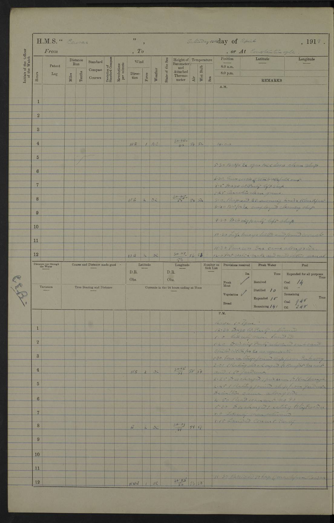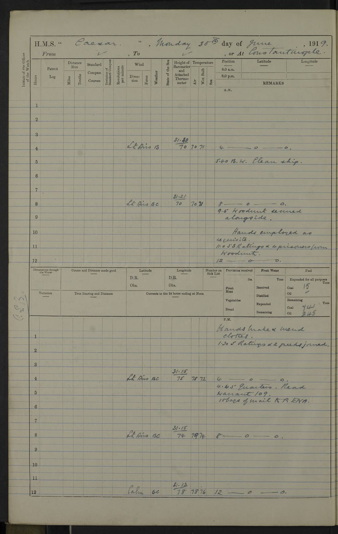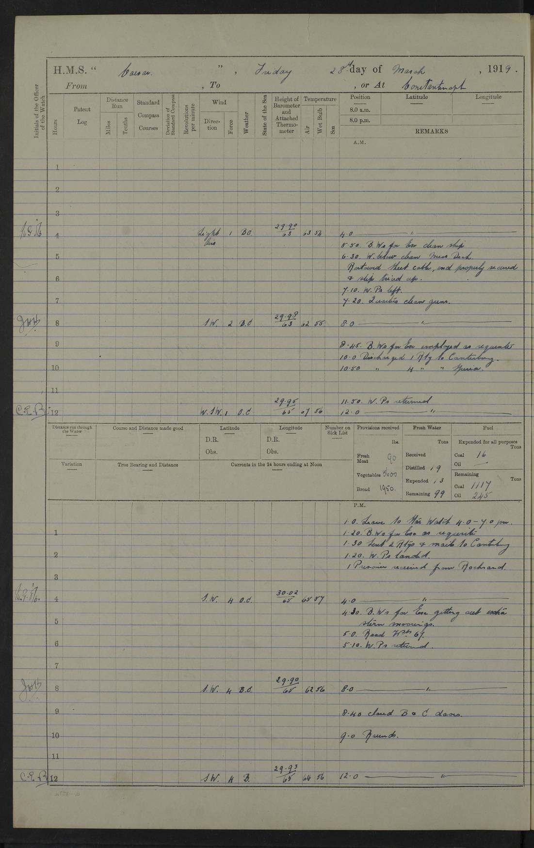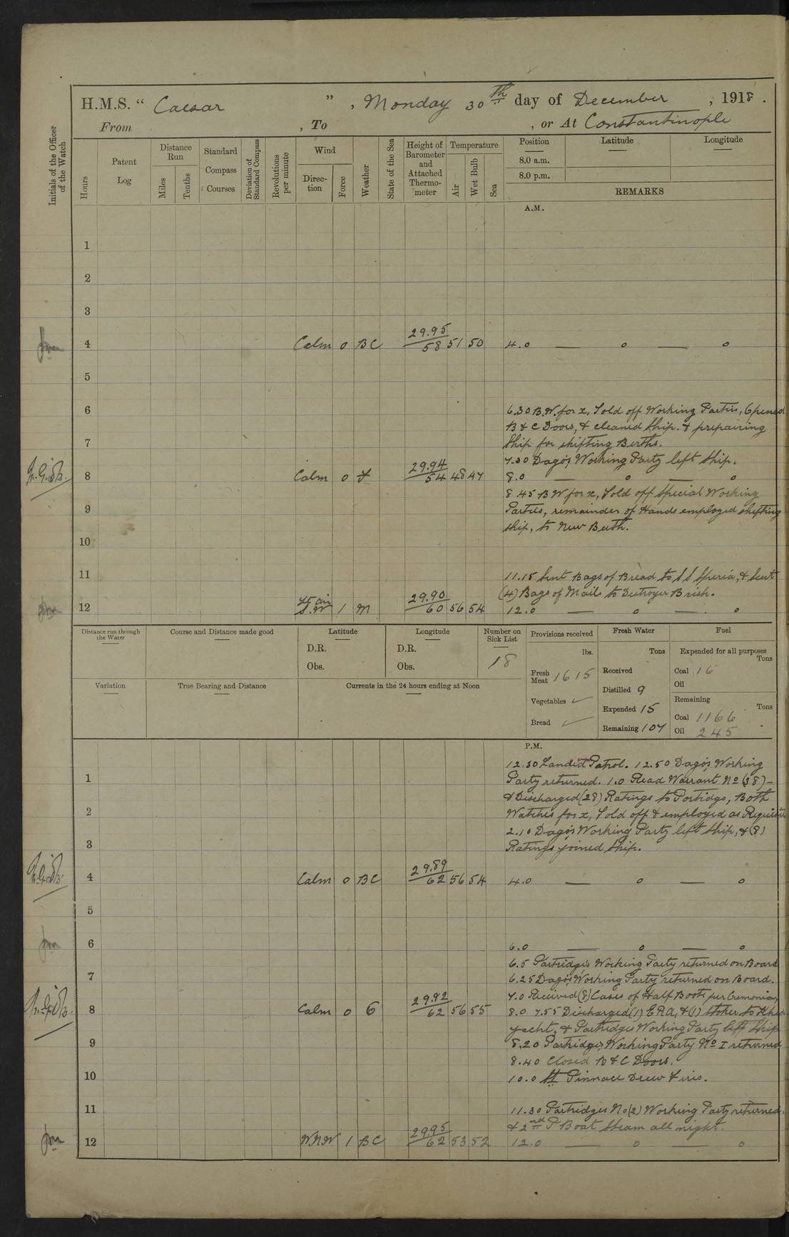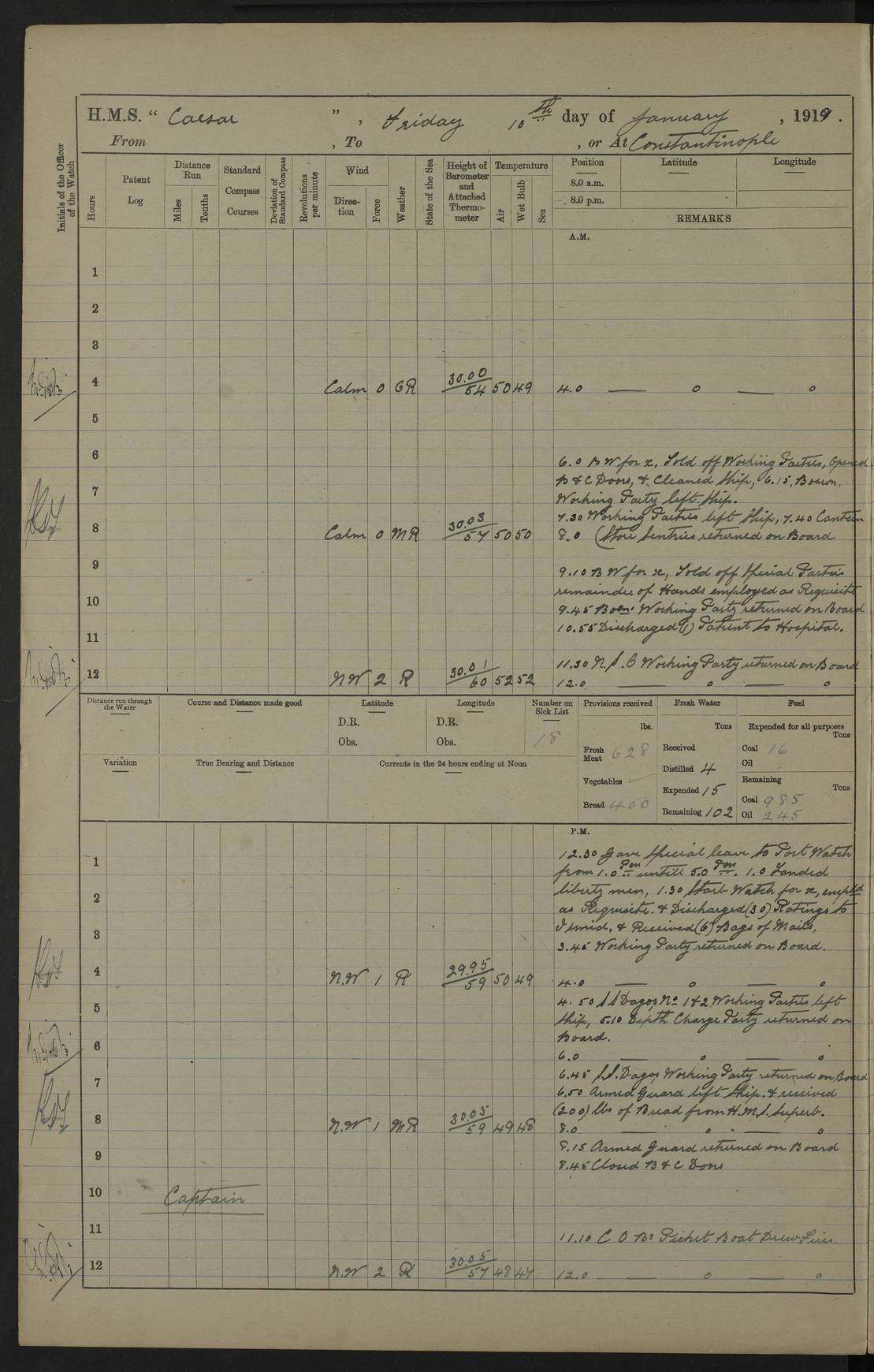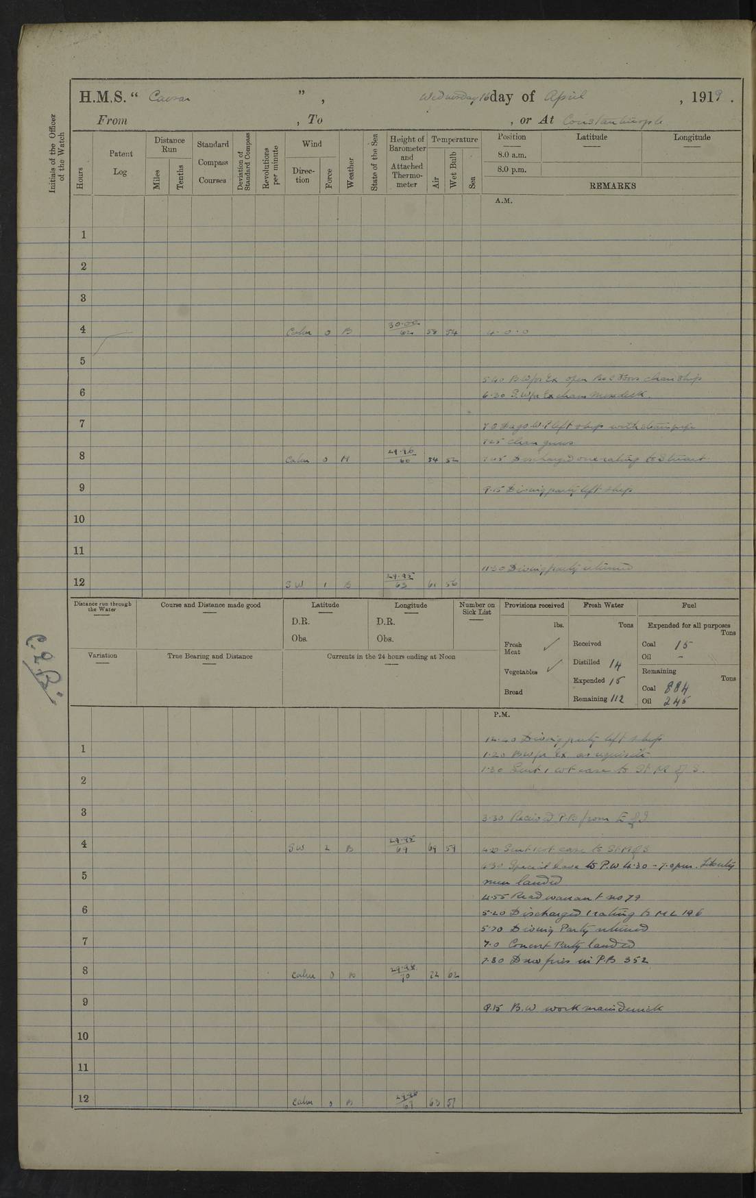 4edebb7b14d0450578000168: (https://s3.amazonaws.com:443/oldweather/ADM53-36589/0003_1.jpg) 1 November 1918 At Malta Lat 35.89, Long 14.52 [Somerset Wharf] 11.15am: Engineers Store Party returned on Board. 0.45pm: Paid Monthly Money. 1.0pm: Mr Goss, Gunner rejoined Ship from RN Hospital. 2.30pm: Gave Special leave to Port Watch untill 7.0am and Port Watch of Boys untill 6.0pm. Hands Made [sic] and Mend Clothes. 2.40pm: Landed liberty Men and Boys. 3.50pm: Provision Boat came alongside. 4.10pm: (4) Recovered Patients rejoined Ship from RN Hospital. 4.30pm: Landed liberty Men and Patrol. 6.0pm: Liberty Boys Returned on Board. 6.30pm: Canteen Party landed untill 10.0pm and Read Warrant No (24). 10.0pm: Canteen Party returned on Board. 11.50pm: Patrol returned on Board. [Provisions received: Fresh Meat 300 lbs, Vegetables 1000 lbs, Bread 450 lbs] 4edebb7c14d0450578000169: (https://s3.amazonaws.com:443/oldweather/ADM53-36589/0004_0.jpg) 2 November 1918 At Malta Lat 35.89, Long 14.52 [Hamilton Wharf] 7.15am: Shifted Berths from Somerset Wharf, to Hamilton Wharf. 8.0am: Tested life Buoys Correct. 8.45am: BW for x Told off Special Parties, Remainder of Hands employed as Requisite, and Landed Picket house Party. 9.10am: Held Court Martial on Board. 10.30am: Court Martial Finished. Noon: Picket House Party returned. 1.20pm: BW for x. Told off Special Parties. Remainder of Hands employed getting in Paymasters Stores and as Requisite. Lost overboard by accident Boat Hooks, Steel, Pattern (345), 2 in Number. 4.20pm: Hands to Fire Stations. 4.35pm: Read Warrant No 25 and gave Special leave to Starboard Watch untill 7.0am. 5.0pm: Landed liberty Men and Victualling Yard Lighter left Ship. 6.30pm: Canteen Party landed untill 10.0pm. [Provisions received: Fresh Meat 260 lbs, Bread 900 lbs] 4edebb7c14d045057800016a: (https://s3.amazonaws.com:443/oldweather/ADM53-36589/0004_1.jpg) 3 November 1918 At Malta Lat 35.89, Long 14.52 [Hamilton Wharf] 9.0am: Landed Church Parties, Wesleyans (14), Presbyterians (10). 9.30am: Divisions. 9.50am: Landed Roman Catholics (15). 10.10am: Discharged (5) Ratings to RN Hospital. 11.35am: All Church Parties returned on Board. 1.0pm: Gave Special leave to Port Watch untill 7.0am and Both Watches of Boys untill 5.30pm. 1.15pm: Landed liberty Men and Boys. 5.30pm: Liberty Boys returned on Board. 6.30pm: Canteen Party landed untill 10.0pm. 8.40pm: Closed B and C Doors. 10.0pm: Canteen Party returned on Board. [Number on sick list: 5] [Provisions received: Fresh Meat 280 lbs] 4edebb7c14d045057800016b: (https://s3.amazonaws.com:443/oldweather/ADM53-36589/0005_0.jpg) 4 November 1918 At Malta Lat 35.89, Long 14.52 [Hamilton Wharf] 6.50am: BW for x Told off Special Parties, remainder of Hands employed as Requisite. 7.0am: Liberty men returned on Board. 8.5am: Provision lighter came alongside. 8.10am: BW for x, Told off Special Parties, remainder of Hands employed Provisioning Ship and as requisite. 8.45am: Landed (1) Carpenter rating for Examination. 3.45pm: (2) Recovered Patients joined Ship from RN Hospital. 4.10pm: Received 8 Bags of Mails from Egmont, and Gave Special leave to Starboard Watch till 7.0am. 5.0pm: Landed Liberty Men and Patrol. 6.0pm: Hands employed getting in and stowing away Provisions. Midnight: Patrol returned on Board. [Weather fine, noon temperature 74F] 4edebb7c14d045057800016c: (https://s3.amazonaws.com:443/oldweather/ADM53-36589/0005_1.jpg) 5 November 1918 At Malta Lat 35.89, Long 14.52 [Hamilton Wharf] 6.45am: BW for x. Told off Special Parties. Remainder of Hands employed getting in and stowing away Provisions. 8.30am: Landed Hospital Party and Picket House Party. 11.0am: Landed (35) Rifles to Naval Ordinance for exchange. Noon: Picket House Party returned. 1.20pm: Landed (2) Ratings for Dental Treatment. 2.25pm: (35) Exchanged Rifles came on Board. 3.40pm: (2) Recovered Patients rejoined Ship from RN Hospital and disinfected Bedding. 4.0pm: Gave Special leave to Port Watch untill 7.0am. Starboard Watch employed stowing Provisions. 4.30pm: Landed Liberty men. Starboard Watch employed stowing away Provisions and Read Warrant No (26). [Provisions received: Fresh Meat 530 lbs, Bread 1000 lbs] 4edebb7c14d045057800016d: (https://s3.amazonaws.com:443/oldweather/ADM53-36589/0006_0.jpg) 6 November 1918 At Malta Lat 35.89, Long 14.52 [Hamilton Wharf] 6.50am: BW for x. Told off Special Parties, Remainder of Port Watch stowing Provisions, Starboard Watch drawing Quarter Deck Awning. 9.0am: Hands employed Provisioning Ship. 4.0pm: Gave Special leave to Starboard Watch untill 7.0am. 4.30pm: Landed liberty Men. Port Watch employed stowing away Provisions. 6.30pm: Canteen Party landed until 10.0pm. 10.0pm: Canteen Party returned on Board. [Number on sick list: 5] [Provisions received: Fresh Meat 250 lbs, Vegetables 1000 lbs, Bread 450 lbs] [Fuel Remaining: Coal 244 tons, Oil 332 tons] 4edebb7c14d045057800016e: (https://s3.amazonaws.com:443/oldweather/ADM53-36589/0006_1.jpg) 7 November 1918 At Malta Lat 35.89, Long 14.52 [No 4 Buoy] 6.30am: BW for x. Told off Special Parties. Remainder of Hands employed prepairing [preparing] Ship to Shift Berths, from Hamilton Wharf to No 4 Buoy. 7.0am: Liberty men returned on Board. 8.50am: Secured Ship to No 4 Buoy and Coal Lighters came alongside. 9.10am: Commenced Coaling Native labour. Hands employed Drawing Stores and as Requisite. 11.50am: Dockyard Parties returned. 1.40pm: BW for x Told off Special Parties, remainder of Hands employed as Requisite. 4.30pm: Gave Special leave to Port Watch untill 7.0am. 4.45pm: Landed liberty men and Patrol and Read Warrant No (27). 7.30pm: Completed Coaling (1481) Tons. 8.40pm: Watch employed sweeping down. 11.50pm: Patrol returned on Board. [Number on sick list: 6] [Provisions received: Fresh Meat 280 lbs, Bread 300 lbs] [Fuel Remaining: Coal 1716 tons, Oil 332 tons] 4edebb7c14d045057800016f: (https://s3.amazonaws.com:443/oldweather/ADM53-36589/0007_0.jpg) 8 November 1918 At Malta Lat 35.89, Long 