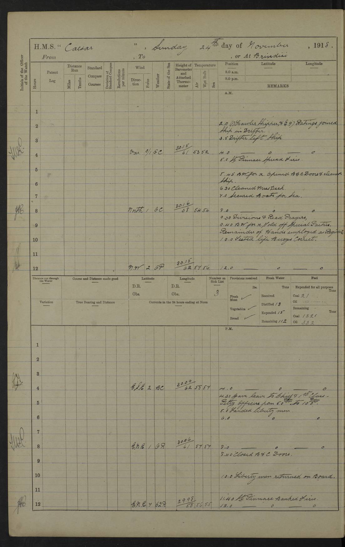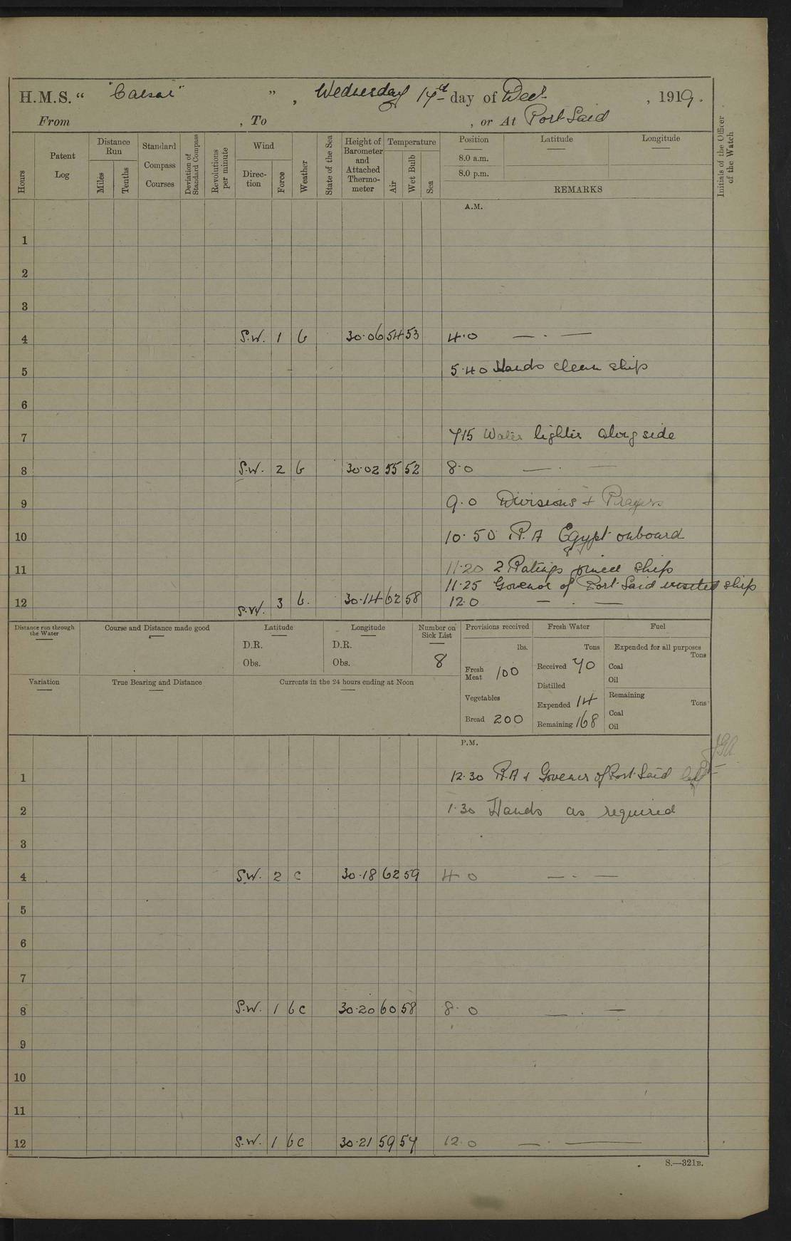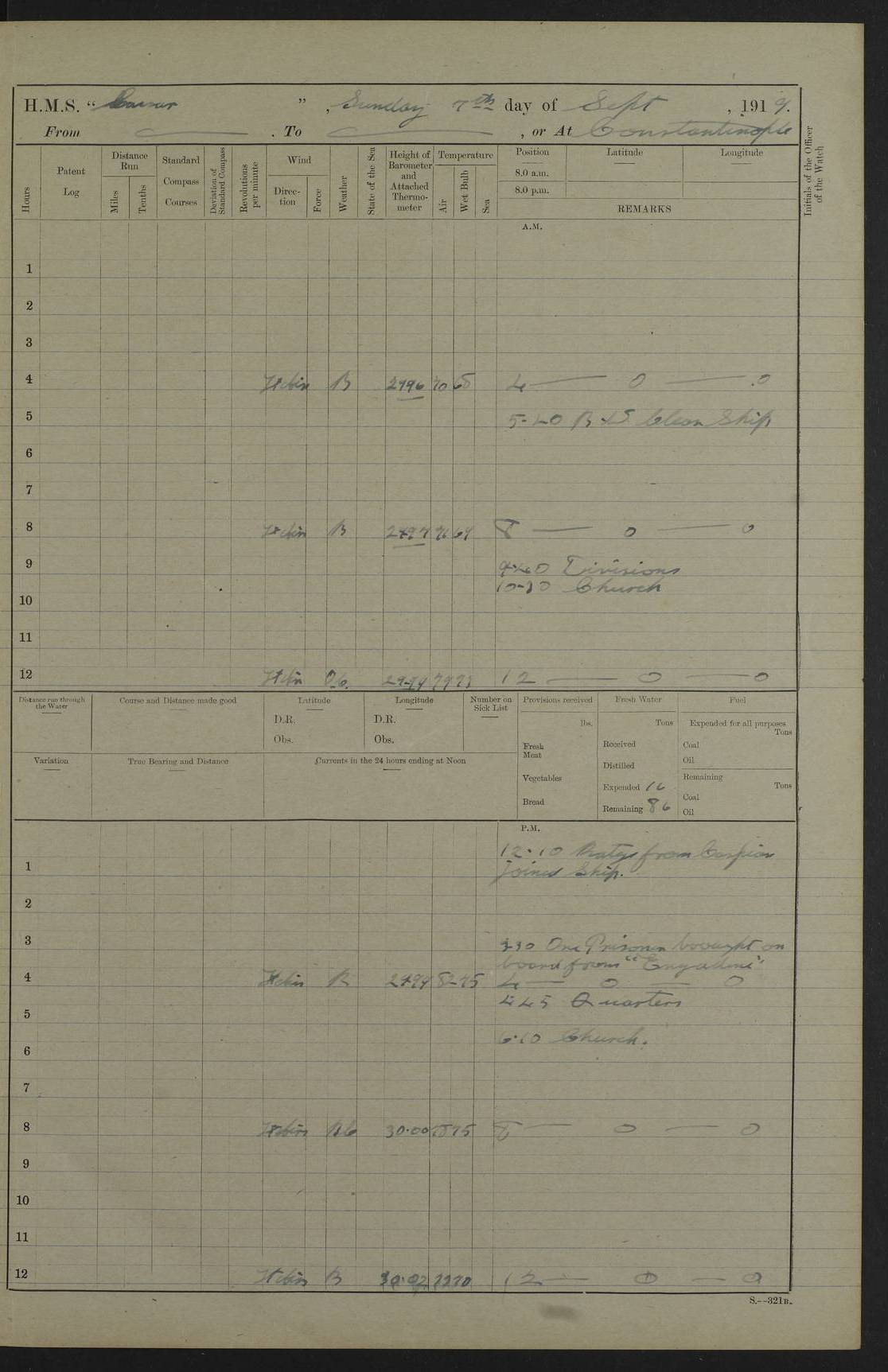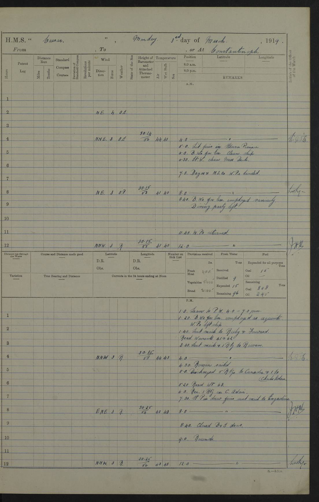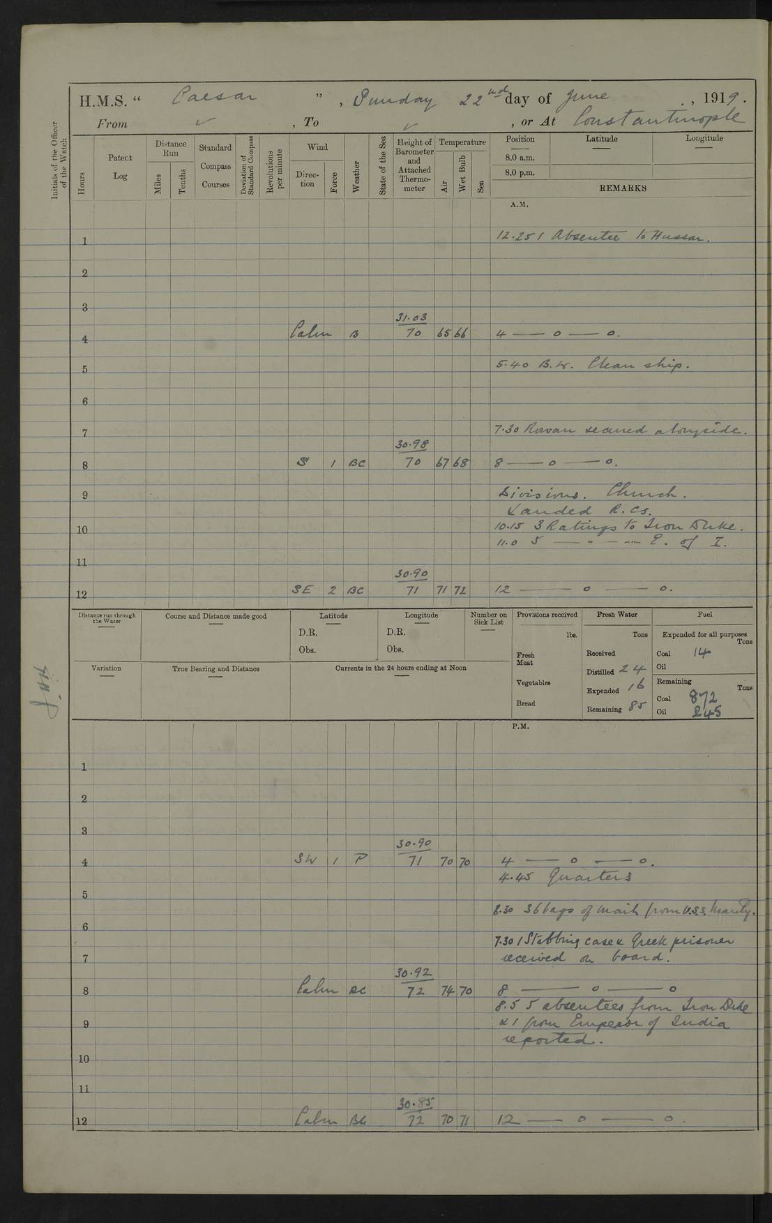 4edebb7b14d0450578000168: (https://s3.amazonaws.com:443/oldweather/ADM53-36589/0003_1.jpg) 1 November 1918 At Malta Lat 35.89, Long 14.52 [Somerset Wharf] 11.15am: Engineers Store Party returned on Board. 0.45pm: Paid Monthly Money. 1.0pm: Mr Goss, Gunner rejoined Ship from RN Hospital. 2.30pm: Gave Special leave to Port Watch untill 7.0am and Port Watch of Boys untill 6.0pm. Hands Made [sic] and Mend Clothes. 2.40pm: Landed liberty Men and Boys. 3.50pm: Provision Boat came alongside. 4.10pm: (4) Recovered Patients rejoined Ship from RN Hospital. 4.30pm: Landed liberty Men and Patrol. 6.0pm: Liberty Boys Returned on Board. 6.30pm: Canteen Party landed untill 10.0pm and Read Warrant No (24). 10.0pm: Canteen Party returned on Board. 11.50pm: Patrol returned on Board. [Provisions received: Fresh Meat 300 lbs, Vegetables 1000 lbs, Bread 450 lbs] 4edebb7c14d0450578000169: (https://s3.amazonaws.com:443/oldweather/ADM53-36589/0004_0.jpg) 2 November 1918 At Malta Lat 35.89, Long 14.52 [Hamilton Wharf] 7.15am: Shifted Berths from Somerset Wharf, to Hamilton Wharf. 8.0am: Tested life Buoys Correct. 8.45am: BW for x Told off Special Parties, Remainder of Hands employed as Requisite, and Landed Picket house Party. 9.10am: Held Court Martial on Board. 10.30am: Court Martial Finished. Noon: Picket House Party returned. 1.20pm: BW for x. Told off Special Parties. Remainder of Hands employed getting in Paymasters Stores and as Requisite. Lost overboard by accident Boat Hooks, Steel, Pattern (345), 2 in Number. 4.20pm: Hands to Fire Stations. 4.35pm: Read Warrant No 25 and gave Special leave to Starboard Watch untill 7.0am. 5.0pm: Landed liberty Men and Victualling Yard Lighter left Ship. 6.30pm: Canteen Party landed untill 10.0pm. [Provisions received: Fresh Meat 260 lbs, Bread 900 lbs] 4edebb7c14d045057800016a: (https://s3.amazonaws.com:443/oldweather/ADM53-36589/0004_1.jpg) 3 November 1918 At Malta Lat 35.89, Long 14.52 [Hamilton Wharf] 9.0am: Landed Church Parties, Wesleyans (14), Presbyterians (10). 9.30am: Divisions. 9.50am: Landed Roman Catholics (15). 10.10am: Discharged (5) Ratings to RN Hospital. 11.35am: All Church Parties returned on Board. 1.0pm: Gave Special leave to Port Watch untill 7.0am and Both Watches of Boys untill 5.30pm. 1.15pm: Landed liberty Men and Boys. 5.30pm: Liberty Boys returned on Board. 6.30pm: Canteen Party landed untill 10.0pm. 8.40pm: Closed B and C Doors. 10.0pm: Canteen Party returned on Board. [Number on sick list: 5] [Provisions received: Fresh Meat 280 lbs] 4edebb7c14d045057800016b: (https://s3.amazonaws.com:443/oldweather/ADM53-36589/0005_0.jpg) 4 November 1918 At Malta Lat 35.89, Long 14.52 [Hamilton Wharf] 6.50am: BW for x Told off Special Parties, remainder of Hands employed as Requisite. 7.0am: Liberty men returned on Board. 8.5am: Provision lighter came alongside. 8.10am: BW for x, Told off Special Parties, remainder of Hands employed Provisioning Ship and as requisite. 8.45am: Landed (1) Carpenter rating for Examination. 3.45pm: (2) Recovered Patients joined Ship from RN Hospital. 4.10pm: Received 8 Bags of Mails from Egmont, and Gave Special leave to Starboard Watch till 7.0am. 5.0pm: Landed Liberty Men and Patrol. 6.0pm: Hands employed getting in and stowing away Provisions. Midnight: Patrol returned on Board. [Weather fine, noon temperature 74F] 4edebb7c14d045057800016c: (https://s3.amazonaws.com:443/oldweather/ADM53-36589/0005_1.jpg) 5 November 1918 At Malta Lat 35.89, Long 14.52 [Hamilton Wharf] 6.45am: BW for x. Told off Special Parties. Remainder of Hands employed getting in and stowing away Provisions. 8.30am: Landed Hospital Party and Picket House Party. 11.0am: Landed (35) Rifles to Naval Ordinance for exchange. Noon: Picket House Party returned. 1.20pm: Landed (2) Ratings for Dental Treatment. 2.25pm: (35) Exchanged Rifles came on Board. 3.40pm: (2) Recovered Patients rejoined Ship from RN Hospital and disinfected Bedding. 4.0pm: Gave Special leave to Port Watch untill 7.0am. Starboard Watch employed stowing Provisions. 4.30pm: Landed Liberty men. Starboard Watch employed stowing away Provisions and Read Warrant No (26). [Provisions received: Fresh Meat 530 lbs, Bread 1000 lbs] 4edebb7c14d045057800016d: (https://s3.amazonaws.com:443/oldweather/ADM53-36589/0006_0.jpg) 6 November 1918 At Malta Lat 35.89, Long 14.52 [Hamilton Wharf] 6.50am: BW for x. Told off Special Parties, Remainder of Port Watch stowing Provisions, Starboard Watch drawing Quarter Deck Awning. 9.0am: Hands employed Provisioning Ship. 4.0pm: Gave Special leave to Starboard Watch untill 7.0am. 4.30pm: Landed liberty Men. Port Watch employed stowing away Provisions. 6.30pm: Canteen Party landed until 10.0pm. 10.0pm: Canteen Party returned on Board. [Number on sick list: 5] [Provisions received: Fresh Meat 250 lbs, Vegetables 1000 lbs, Bread 450 lbs] [Fuel Remaining: Coal 244 tons, Oil 332 tons] 4edebb7c14d045057800016e: (https://s3.amazonaws.com:443/oldweather/ADM53-36589/0006_1.jpg) 7 November 1918 At Malta Lat 35.89, Long 14.52 [No 4 Buoy] 6.30am: BW for x. Told off Special Parties. Remainder of Hands employed prepairing [preparing] Ship to Shift Berths, from Hamilton Wharf to No 4 Buoy. 7.0am: Liberty men returned on Board. 8.50am: Secured Ship to No 4 Buoy and Coal Lighters came alongside. 9.10am: Commenced Coaling Native labour. Hands employed Drawing Stores and as Requisite. 11.50am: Dockyard Parties returned. 1.40pm: BW for x Told off Special Parties, remainder of Hands employed as Requisite. 4.30pm: Gave Special leave to Port Watch untill 7.0am. 4.45pm: Landed liberty men and Patrol and Read Warrant No (27). 7.30pm: Completed Coaling (1481) Tons. 8.40pm: Watch employed sweeping down. 11.50pm: Patrol returned on Board. [Number on sick list: 6] [Provisions received: Fresh Meat 280 lbs, Bread 300 lbs] [Fuel Remaining: Coal 1716 tons, Oil 332 tons] 4edebb7c14d045057800016f: (https://s3.amazonaws.com:443/oldweather/ADM53-36589/0007_0.jpg) 8 November 1918 At Malta Lat 35.89, Long 