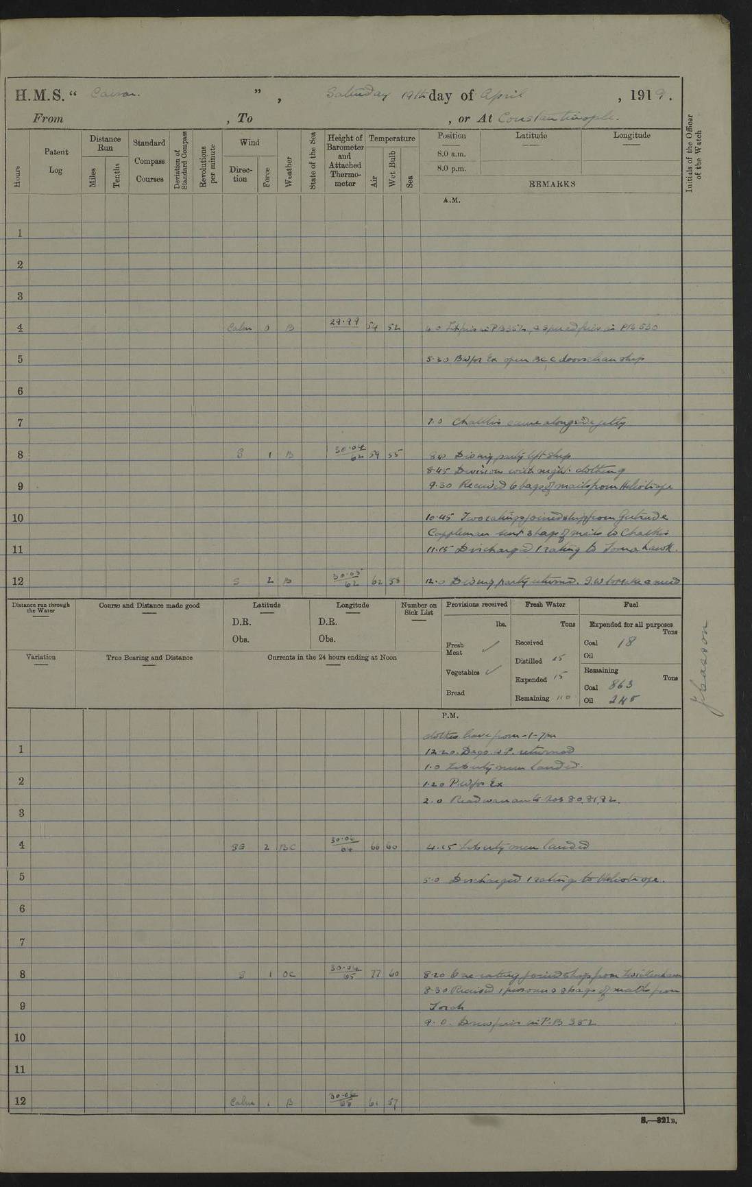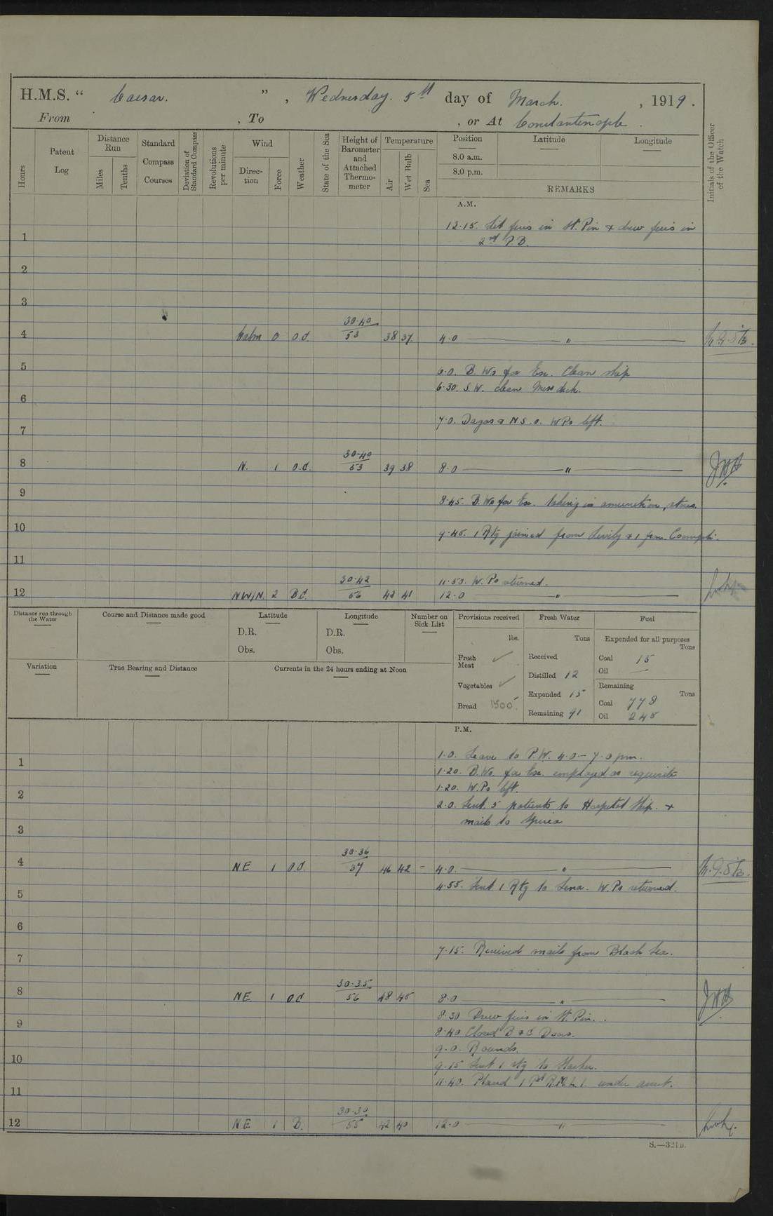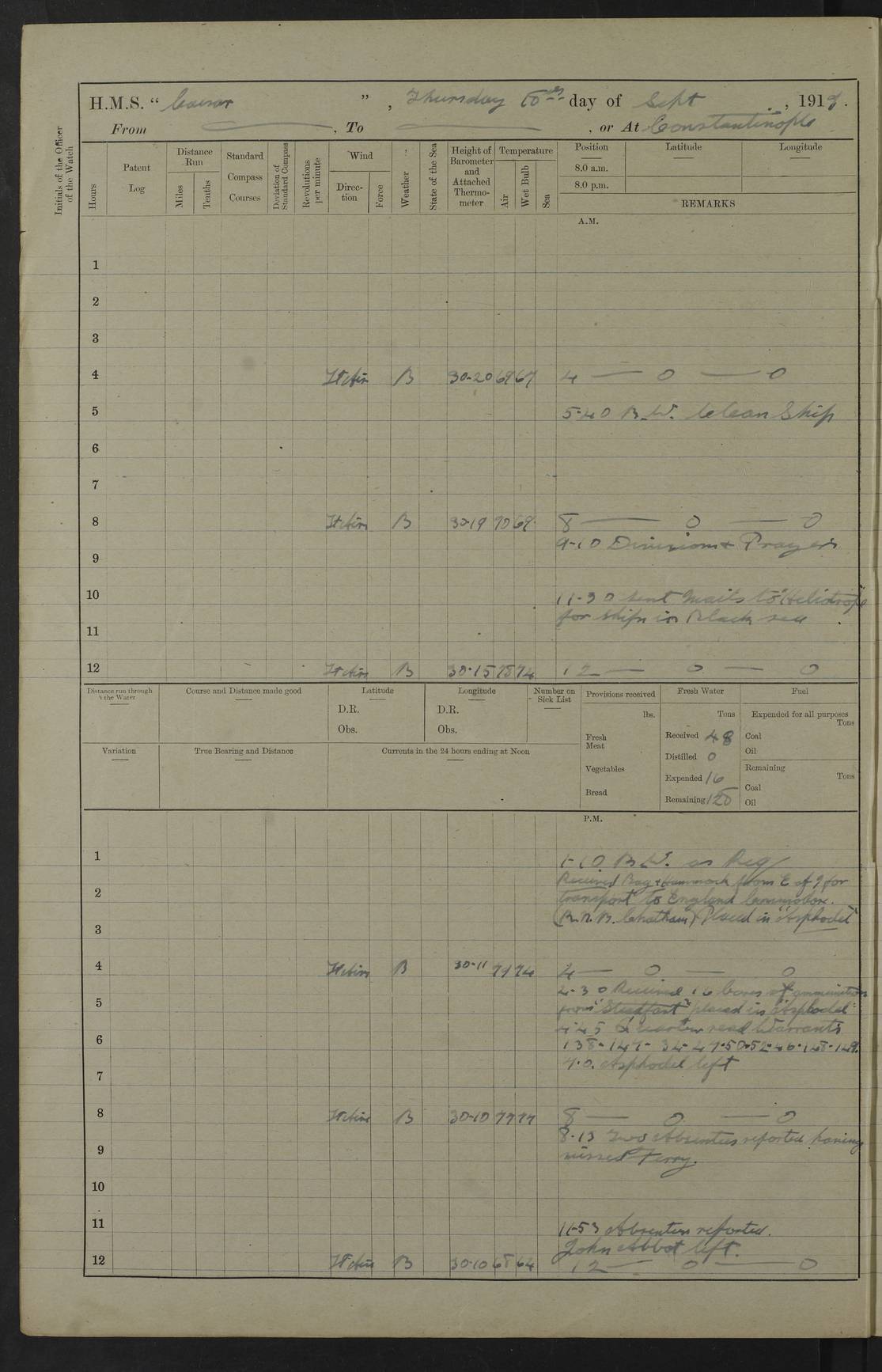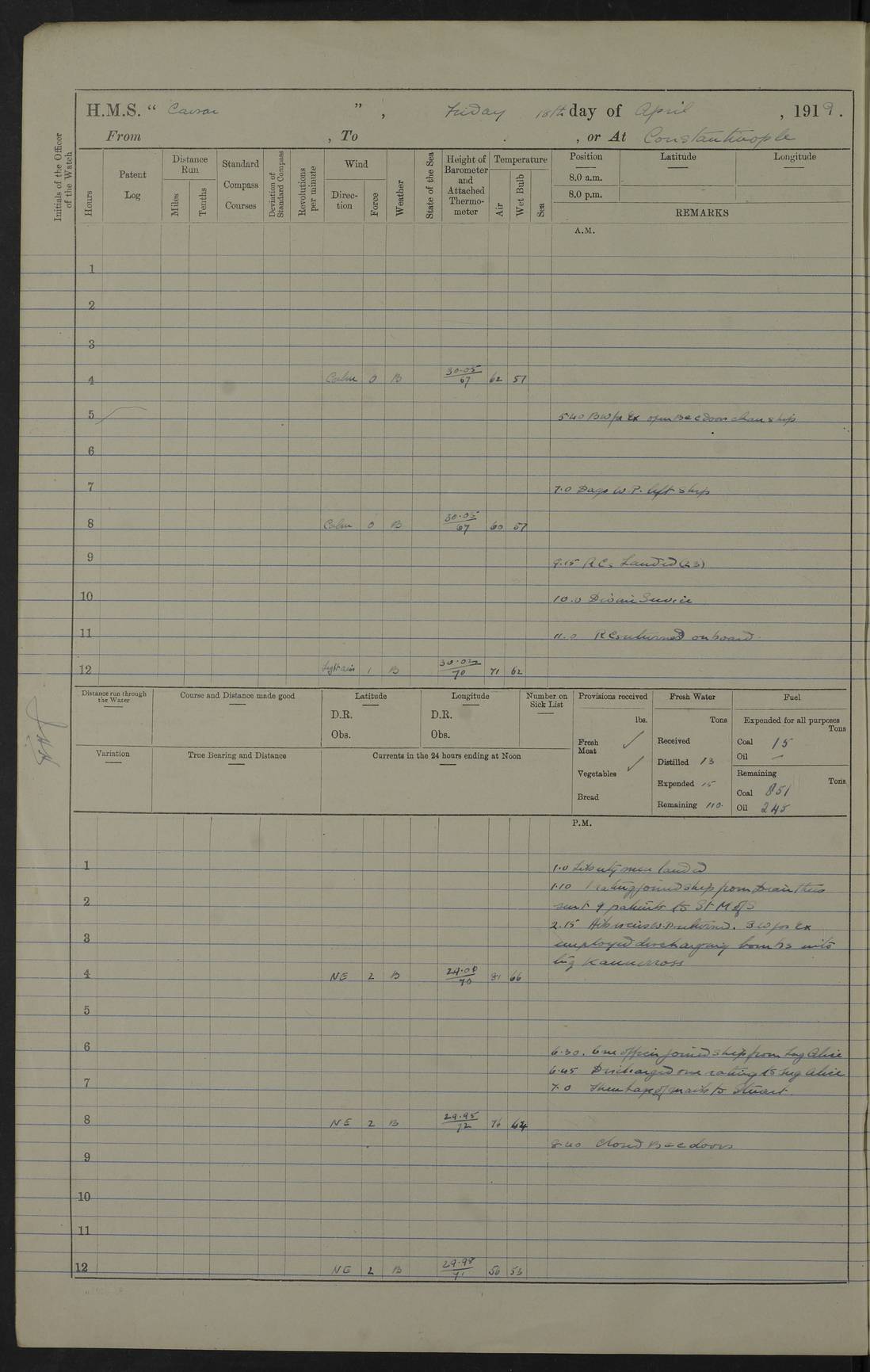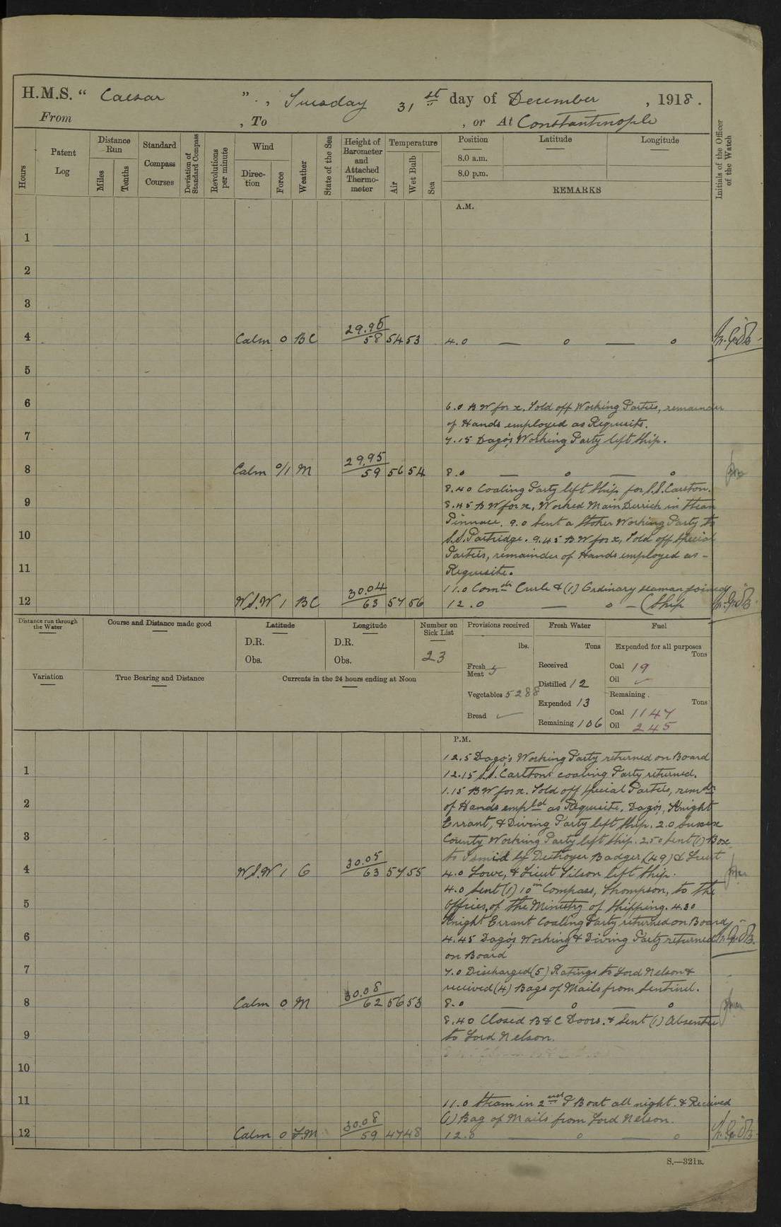 4edebb7b14d0450578000168: (https://s3.amazonaws.com:443/oldweather/ADM53-36589/0003_1.jpg) 1 November 1918 At Malta Lat 35.89, Long 14.52 [Somerset Wharf] 11.15am: Engineers Store Party returned on Board. 0.45pm: Paid Monthly Money. 1.0pm: Mr Goss, Gunner rejoined Ship from RN Hospital. 2.30pm: Gave Special leave to Port Watch untill 7.0am and Port Watch of Boys untill 6.0pm. Hands Made [sic] and Mend Clothes. 2.40pm: Landed liberty Men and Boys. 3.50pm: Provision Boat came alongside. 4.10pm: (4) Recovered Patients rejoined Ship from RN Hospital. 4.30pm: Landed liberty Men and Patrol. 6.0pm: Liberty Boys Returned on Board. 6.30pm: Canteen Party landed untill 10.0pm and Read Warrant No (24). 10.0pm: Canteen Party returned on Board. 11.50pm: Patrol returned on Board. [Provisions received: Fresh Meat 300 lbs, Vegetables 1000 lbs, Bread 450 lbs] 4edebb7c14d0450578000169: (https://s3.amazonaws.com:443/oldweather/ADM53-36589/0004_0.jpg) 2 November 1918 At Malta Lat 35.89, Long 14.52 [Hamilton Wharf] 7.15am: Shifted Berths from Somerset Wharf, to Hamilton Wharf. 8.0am: Tested life Buoys Correct. 8.45am: BW for x Told off Special Parties, Remainder of Hands employed as Requisite, and Landed Picket house Party. 9.10am: Held Court Martial on Board. 10.30am: Court Martial Finished. Noon: Picket House Party returned. 1.20pm: BW for x. Told off Special Parties. Remainder of Hands employed getting in Paymasters Stores and as Requisite. Lost overboard by accident Boat Hooks, Steel, Pattern (345), 2 in Number. 4.20pm: Hands to Fire Stations. 4.35pm: Read Warrant No 25 and gave Special leave to Starboard Watch untill 7.0am. 5.0pm: Landed liberty Men and Victualling Yard Lighter left Ship. 6.30pm: Canteen Party landed untill 10.0pm. [Provisions received: Fresh Meat 260 lbs, Bread 900 lbs] 4edebb7c14d045057800016a: (https://s3.amazonaws.com:443/oldweather/ADM53-36589/0004_1.jpg) 3 November 1918 At Malta Lat 35.89, Long 14.52 [Hamilton Wharf] 9.0am: Landed Church Parties, Wesleyans (14), Presbyterians (10). 9.30am: Divisions. 9.50am: Landed Roman Catholics (15). 10.10am: Discharged (5) Ratings to RN Hospital. 11.35am: All Church Parties returned on Board. 1.0pm: Gave Special leave to Port Watch untill 7.0am and Both Watches of Boys untill 5.30pm. 1.15pm: Landed liberty Men and Boys. 5.30pm: Liberty Boys returned on Board. 6.30pm: Canteen Party landed untill 10.0pm. 8.40pm: Closed B and C Doors. 10.0pm: Canteen Party returned on Board. [Number on sick list: 5] [Provisions received: Fresh Meat 280 lbs] 4edebb7c14d045057800016b: (https://s3.amazonaws.com:443/oldweather/ADM53-36589/0005_0.jpg) 4 November 1918 At Malta Lat 35.89, Long 14.52 [Hamilton Wharf] 6.50am: BW for x Told off Special Parties, remainder of Hands employed as Requisite. 7.0am: Liberty men returned on Board. 8.5am: Provision lighter came alongside. 8.10am: BW for x, Told off Special Parties, remainder of Hands employed Provisioning Ship and as requisite. 8.45am: Landed (1) Carpenter rating for Examination. 3.45pm: (2) Recovered Patients joined Ship from RN Hospital. 4.10pm: Received 8 Bags of Mails from Egmont, and Gave Special leave to Starboard Watch till 7.0am. 5.0pm: Landed Liberty Men and Patrol. 6.0pm: Hands employed getting in and stowing away Provisions. Midnight: Patrol returned on Board. [Weather fine, noon temperature 74F] 4edebb7c14d045057800016c: (https://s3.amazonaws.com:443/oldweather/ADM53-36589/0005_1.jpg) 5 November 1918 At Malta Lat 35.89, Long 14.52 [Hamilton Wharf] 6.45am: BW for x. Told off Special Parties. Remainder of Hands employed getting in and stowing away Provisions. 8.30am: Landed Hospital Party and Picket House Party. 11.0am: Landed (35) Rifles to Naval Ordinance for exchange. Noon: Picket House Party returned. 1.20pm: Landed (2) Ratings for Dental Treatment. 2.25pm: (35) Exchanged Rifles came on Board. 3.40pm: (2) Recovered Patients rejoined Ship from RN Hospital and disinfected Bedding. 4.0pm: Gave Special leave to Port Watch untill 7.0am. Starboard Watch employed stowing Provisions. 4.30pm: Landed Liberty men. Starboard Watch employed stowing away Provisions and Read Warrant No (26). [Provisions received: Fresh Meat 530 lbs, Bread 1000 lbs] 4edebb7c14d045057800016d: (https://s3.amazonaws.com:443/oldweather/ADM53-36589/0006_0.jpg) 6 November 1918 At Malta Lat 35.89, Long 14.52 [Hamilton Wharf] 6.50am: BW for x. Told off Special Parties, Remainder of Port Watch stowing Provisions, Starboard Watch drawing Quarter Deck Awning. 9.0am: Hands employed Provisioning Ship. 4.0pm: Gave Special leave to Starboard Watch untill 7.0am. 4.30pm: Landed liberty Men. Port Watch employed stowing away Provisions. 6.30pm: Canteen Party landed until 10.0pm. 10.0pm: Canteen Party returned on Board. [Number on sick list: 5] [Provisions received: Fresh Meat 250 lbs, Vegetables 1000 lbs, Bread 450 lbs] [Fuel Remaining: Coal 244 tons, Oil 332 tons] 4edebb7c14d045057800016e: (https://s3.amazonaws.com:443/oldweather/ADM53-36589/0006_1.jpg) 7 November 1918 At Malta Lat 35.89, Long 14.52 [No 4 Buoy] 6.30am: BW for x. Told off Special Parties. Remainder of Hands employed prepairing [preparing] Ship to Shift Berths, from Hamilton Wharf to No 4 Buoy. 7.0am: Liberty men returned on Board. 8.50am: Secured Ship to No 4 Buoy and Coal Lighters came alongside. 9.10am: Commenced Coaling Native labour. Hands employed Drawing Stores and as Requisite. 11.50am: Dockyard Parties returned. 1.40pm: BW for x Told off Special Parties, remainder of Hands employed as Requisite. 4.30pm: Gave Special leave to Port Watch untill 7.0am. 4.45pm: Landed liberty men and Patrol and Read Warrant No (27). 7.30pm: Completed Coaling (1481) Tons. 8.40pm: Watch employed sweeping down. 11.50pm: Patrol returned on Board. [Number on sick list: 6] [Provisions received: Fresh Meat 280 lbs, Bread 300 lbs] [Fuel Remaining: Coal 1716 tons, Oil 332 tons] 4edebb7c14d045057800016f: (https://s3.amazonaws.com:443/oldweather/ADM53-36589/0007_0.jpg) 8 November 1918 At Malta Lat 35.89, Long 
