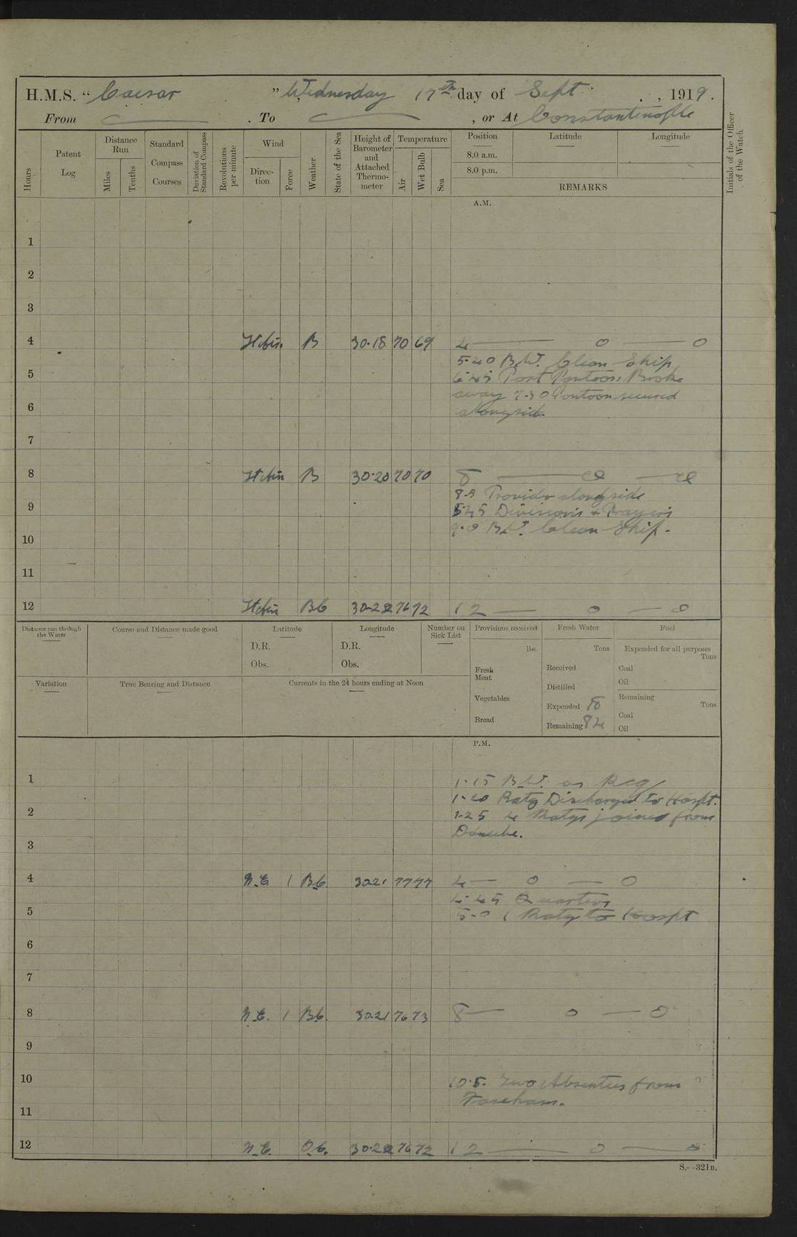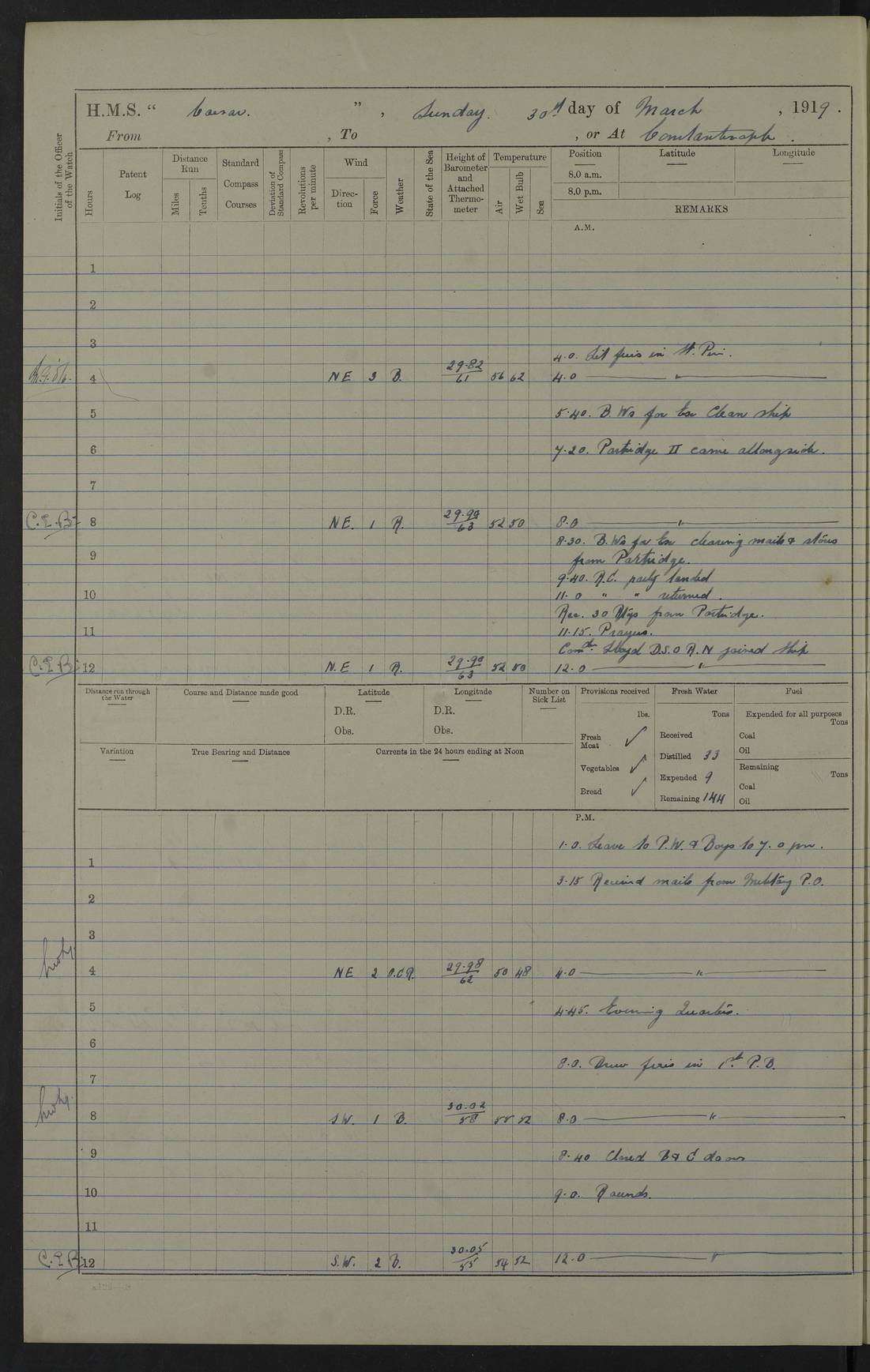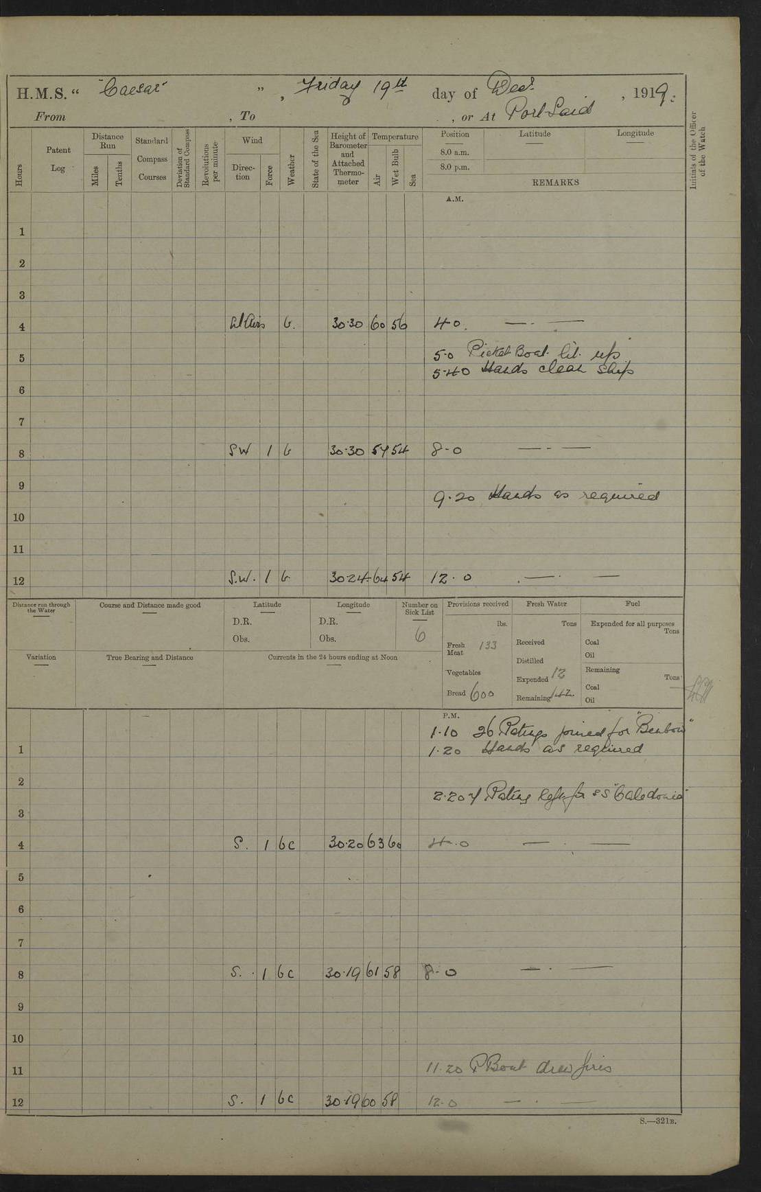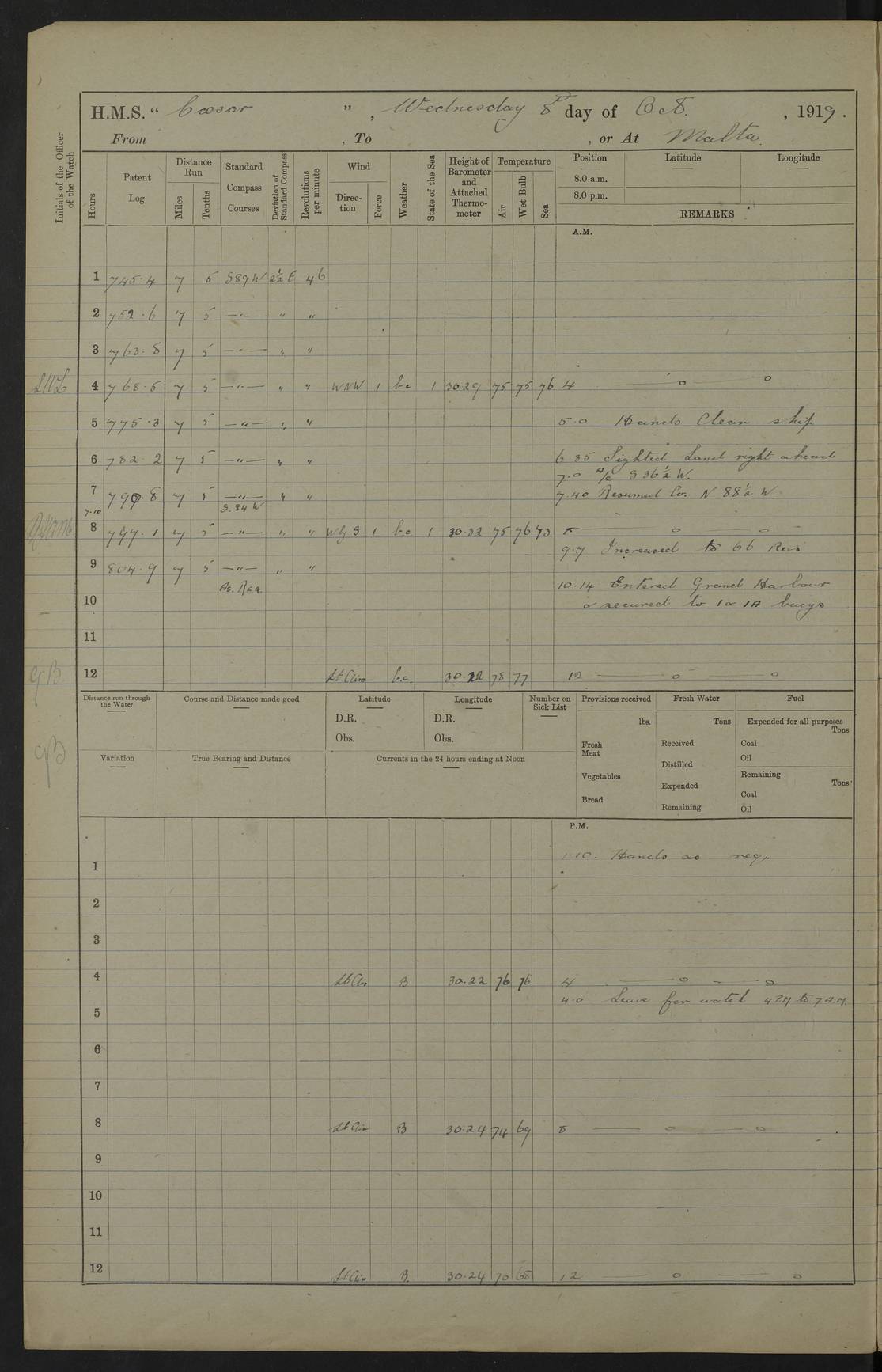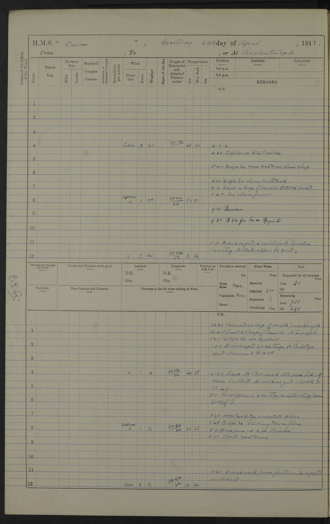4edebb7b14d0450578000168: (https://s3.amazonaws.com:443/oldweather/ADM53-36589/0003_1.jpg) 1 November 1918 At Malta Lat 35.89, Long 14.52 [Somerset Wharf] 11.15am: Engineers Store Party returned on Board. 0.45pm: Paid Monthly Money. 1.0pm: Mr Goss, Gunner rejoined Ship from RN Hospital. 2.30pm: Gave Special leave to Port Watch untill 7.0am and Port Watch of Boys untill 6.0pm. Hands Made [sic] and Mend Clothes. 2.40pm: Landed liberty Men and Boys. 3.50pm: Provision Boat came alongside. 4.10pm: (4) Recovered Patients rejoined Ship from RN Hospital. 4.30pm: Landed liberty Men and Patrol. 6.0pm: Liberty Boys Returned on Board. 6.30pm: Canteen Party landed untill 10.0pm and Read Warrant No (24). 10.0pm: Canteen Party returned on Board. 11.50pm: Patrol returned on Board. [Provisions received: Fresh Meat 300 lbs, Vegetables 1000 lbs, Bread 450 lbs] 4edebb7c14d0450578000169: (https://s3.amazonaws.com:443/oldweather/ADM53-36589/0004_0.jpg) 2 November 1918 At Malta Lat 35.89, Long 14.52 [Hamilton Wharf] 7.15am: Shifted Berths from Somerset Wharf, to Hamilton Wharf. 8.0am: Tested life Buoys Correct. 8.45am: BW for x Told off Special Parties, Remainder of Hands employed as Requisite, and Landed Picket house Party. 9.10am: Held Court Martial on Board. 10.30am: Court Martial Finished. Noon: Picket House Party returned. 1.20pm: BW for x. Told off Special Parties. Remainder of Hands employed getting in Paymasters Stores and as Requisite. Lost overboard by accident Boat Hooks, Steel, Pattern (345), 2 in Number. 4.20pm: Hands to Fire Stations. 4.35pm: Read Warrant No 25 and gave Special leave to Starboard Watch untill 7.0am. 5.0pm: Landed liberty Men and Victualling Yard Lighter left Ship. 6.30pm: Canteen Party landed untill 10.0pm. [Provisions received: Fresh Meat 260 lbs, Bread 900 lbs] 4edebb7c14d045057800016a: (https://s3.amazonaws.com:443/oldweather/ADM53-36589/0004_1.jpg) 3 November 1918 At Malta Lat 35.89, Long 14.52 [Hamilton Wharf] 9.0am: Landed Church Parties, Wesleyans (14), Presbyterians (10). 9.30am: Divisions. 9.50am: Landed Roman Catholics (15). 10.10am: Discharged (5) Ratings to RN Hospital. 11.35am: All Church Parties returned on Board. 1.0pm: Gave Special leave to Port Watch untill 7.0am and Both Watches of Boys untill 5.30pm. 1.15pm: Landed liberty Men and Boys. 5.30pm: Liberty Boys returned on Board. 6.30pm: Canteen Party landed untill 10.0pm. 8.40pm: Closed B and C Doors. 10.0pm: Canteen Party returned on Board. [Number on sick list: 5] [Provisions received: Fresh Meat 280 lbs] 4edebb7c14d045057800016b: (https://s3.amazonaws.com:443/oldweather/ADM53-36589/0005_0.jpg) 4 November 1918 At Malta Lat 35.89, Long 14.52 [Hamilton Wharf] 6.50am: BW for x Told off Special Parties, remainder of Hands employed as Requisite. 7.0am: Liberty men returned on Board. 8.5am: Provision lighter came alongside. 8.10am: BW for x, Told off Special Parties, remainder of Hands employed Provisioning Ship and as requisite. 8.45am: Landed (1) Carpenter rating for Examination. 3.45pm: (2) Recovered Patients joined Ship from RN Hospital. 4.10pm: Received 8 Bags of Mails from Egmont, and Gave Special leave to Starboard Watch till 7.0am. 5.0pm: Landed Liberty Men and Patrol. 6.0pm: Hands employed getting in and stowing away Provisions. Midnight: Patrol returned on Board. [Weather fine, noon temperature 74F] 4edebb7c14d045057800016c: (https://s3.amazonaws.com:443/oldweather/ADM53-36589/0005_1.jpg) 5 November 1918 At Malta Lat 35.89, Long 14.52 [Hamilton Wharf] 6.45am: BW for x. Told off Special Parties. Remainder of Hands employed getting in and stowing away Provisions. 8.30am: Landed Hospital Party and Picket House Party. 11.0am: Landed (35) Rifles to Naval Ordinance for exchange. Noon: Picket House Party returned. 1.20pm: Landed (2) Ratings for Dental Treatment. 2.25pm: (35) Exchanged Rifles came on Board. 3.40pm: (2) Recovered Patients rejoined Ship from RN Hospital and disinfected Bedding. 4.0pm: Gave Special leave to Port Watch untill 7.0am. Starboard Watch employed stowing Provisions. 4.30pm: Landed Liberty men. Starboard Watch employed stowing away Provisions and Read Warrant No (26). [Provisions received: Fresh Meat 530 lbs, Bread 1000 lbs] 4edebb7c14d045057800016d: (https://s3.amazonaws.com:443/oldweather/ADM53-36589/0006_0.jpg) 6 November 1918 At Malta Lat 35.89, Long 14.52 [Hamilton Wharf] 6.50am: BW for x. Told off Special Parties, Remainder of Port Watch stowing Provisions, Starboard Watch drawing Quarter Deck Awning. 9.0am: Hands employed Provisioning Ship. 4.0pm: Gave Special leave to Starboard Watch untill 7.0am. 4.30pm: Landed liberty Men. Port Watch employed stowing away Provisions. 6.30pm: Canteen Party landed until 10.0pm. 10.0pm: Canteen Party returned on Board. [Number on sick list: 5] [Provisions received: Fresh Meat 250 lbs, Vegetables 1000 lbs, Bread 450 lbs] [Fuel Remaining: Coal 244 tons, Oil 332 tons] 4edebb7c14d045057800016e: (https://s3.amazonaws.com:443/oldweather/ADM53-36589/0006_1.jpg) 7 November 1918 At Malta Lat 35.89, Long 14.52 [No 4 Buoy] 6.30am: BW for x. Told off Special Parties. Remainder of Hands employed prepairing [preparing] Ship to Shift Berths, from Hamilton Wharf to No 4 Buoy. 7.0am: Liberty men returned on Board. 8.50am: Secured Ship to No 4 Buoy and Coal Lighters came alongside. 9.10am: Commenced Coaling Native labour. Hands employed Drawing Stores and as Requisite. 11.50am: Dockyard Parties returned. 1.40pm: BW for x Told off Special Parties, remainder of Hands employed as Requisite. 4.30pm: Gave Special leave to Port Watch untill 7.0am. 4.45pm: Landed liberty men and Patrol and Read Warrant No (27). 7.30pm: Completed Coaling (1481) Tons. 8.40pm: Watch employed sweeping down. 11.50pm: Patrol returned on Board. [Number on sick list: 6] [Provisions received: Fresh Meat 280 lbs, Bread 300 lbs] [Fuel Remaining: Coal 1716 tons, Oil 332 tons] 4edebb7c14d045057800016f: (https://s3.amazonaws.com:443/oldweather/ADM53-36589/0007_0.jpg) 8 November 1918 At Malta Lat 35.89, Long 