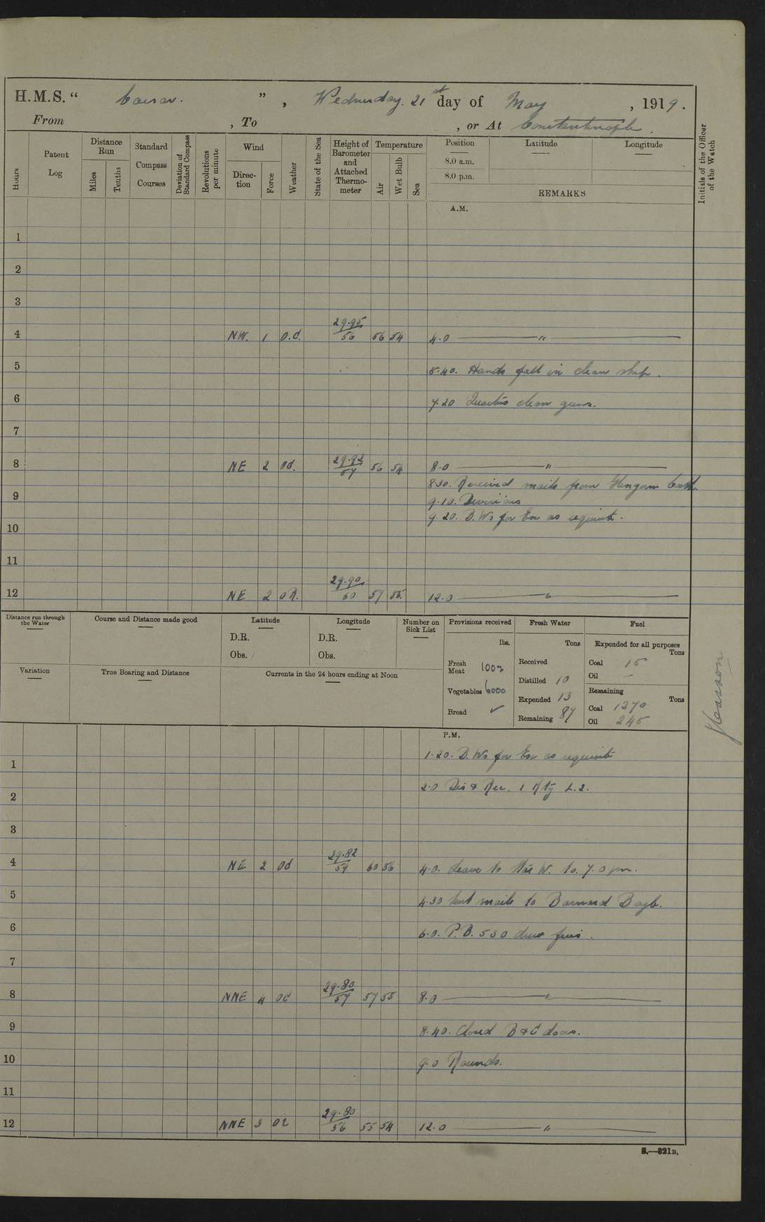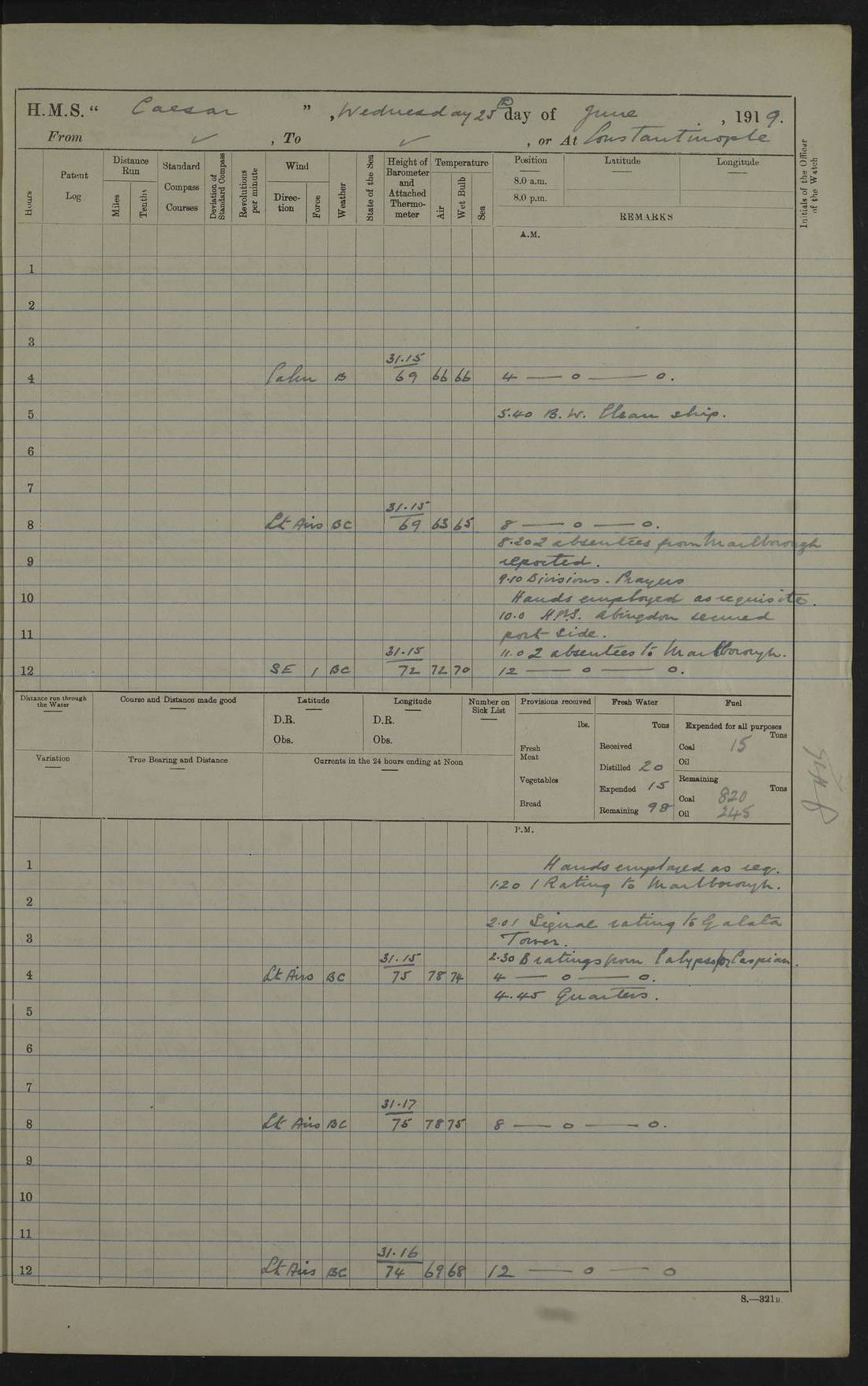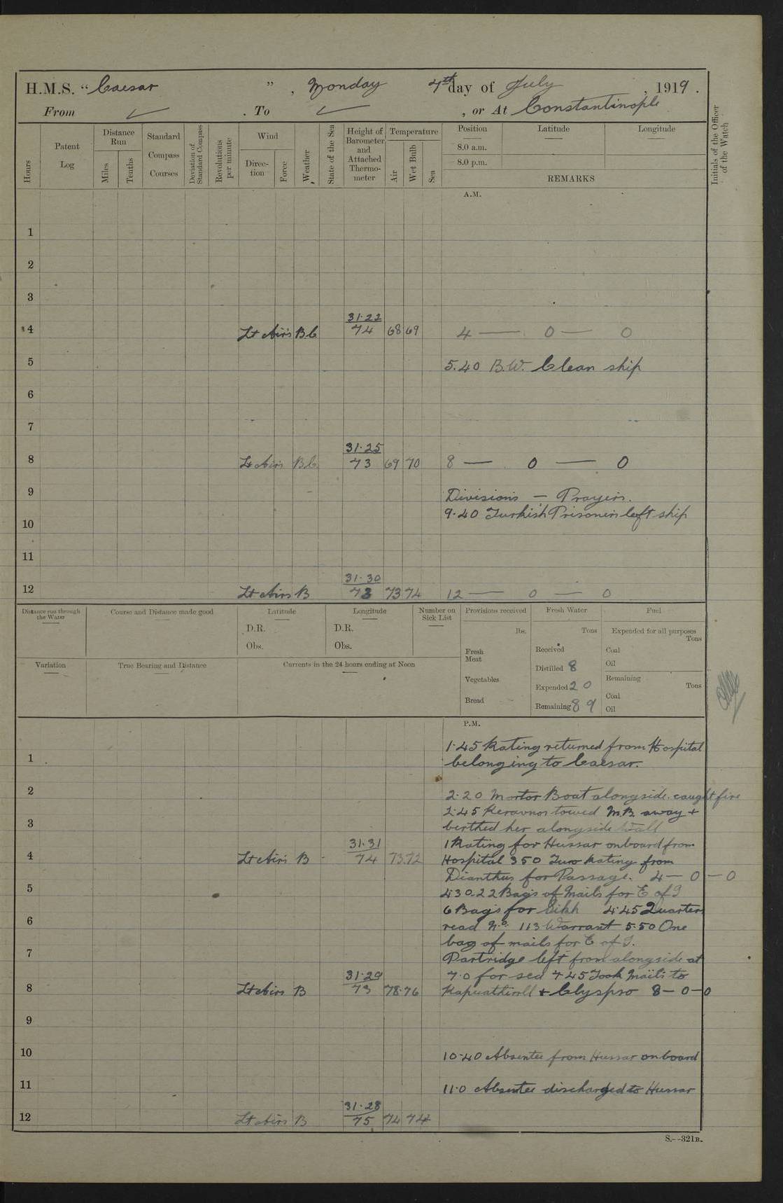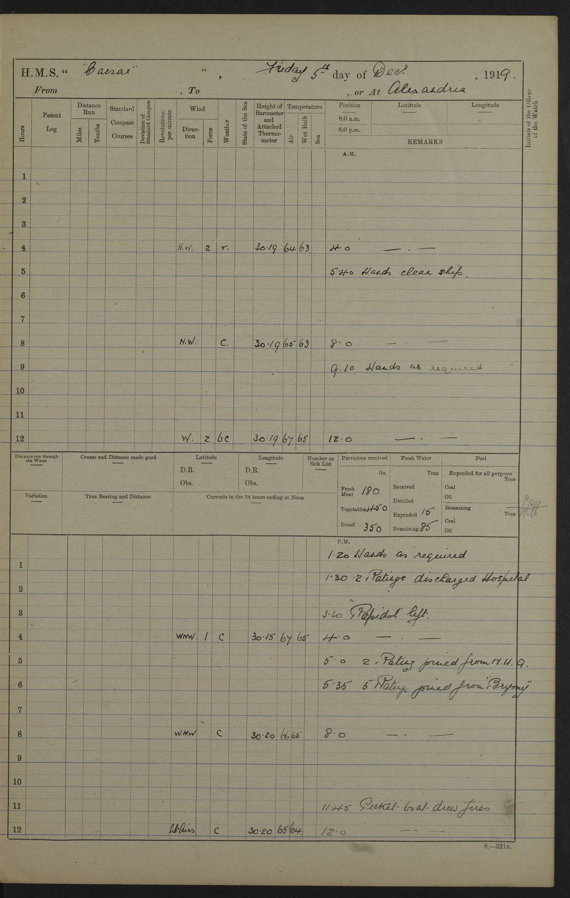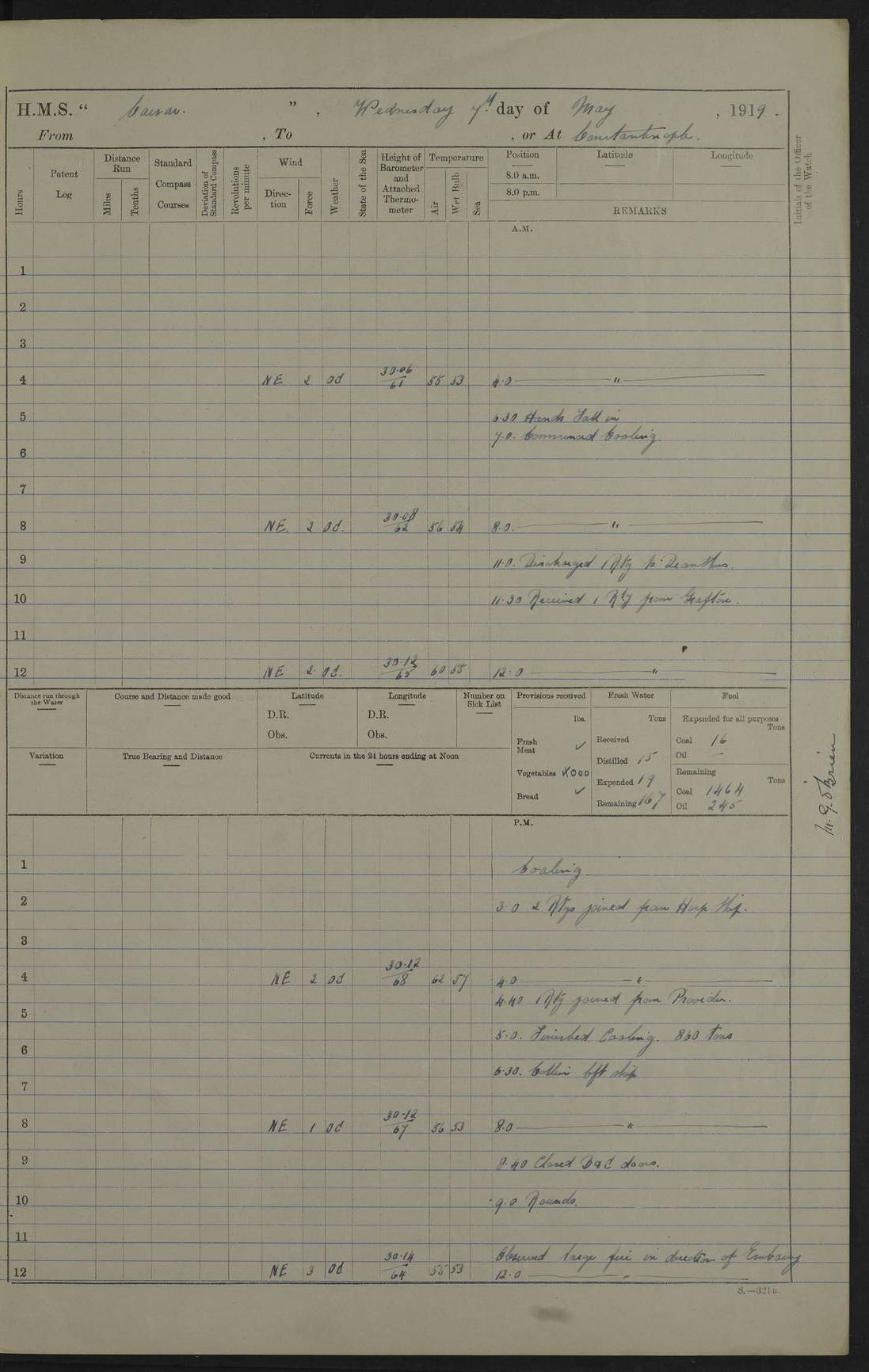 4edebb7b14d0450578000168: (https://s3.amazonaws.com:443/oldweather/ADM53-36589/0003_1.jpg) 1 November 1918 At Malta Lat 35.89, Long 14.52 [Somerset Wharf] 11.15am: Engineers Store Party returned on Board. 0.45pm: Paid Monthly Money. 1.0pm: Mr Goss, Gunner rejoined Ship from RN Hospital. 2.30pm: Gave Special leave to Port Watch untill 7.0am and Port Watch of Boys untill 6.0pm. Hands Made [sic] and Mend Clothes. 2.40pm: Landed liberty Men and Boys. 3.50pm: Provision Boat came alongside. 4.10pm: (4) Recovered Patients rejoined Ship from RN Hospital. 4.30pm: Landed liberty Men and Patrol. 6.0pm: Liberty Boys Returned on Board. 6.30pm: Canteen Party landed untill 10.0pm and Read Warrant No (24). 10.0pm: Canteen Party returned on Board. 11.50pm: Patrol returned on Board. [Provisions received: Fresh Meat 300 lbs, Vegetables 1000 lbs, Bread 450 lbs] 4edebb7c14d0450578000169: (https://s3.amazonaws.com:443/oldweather/ADM53-36589/0004_0.jpg) 2 November 1918 At Malta Lat 35.89, Long 14.52 [Hamilton Wharf] 7.15am: Shifted Berths from Somerset Wharf, to Hamilton Wharf. 8.0am: Tested life Buoys Correct. 8.45am: BW for x Told off Special Parties, Remainder of Hands employed as Requisite, and Landed Picket house Party. 9.10am: Held Court Martial on Board. 10.30am: Court Martial Finished. Noon: Picket House Party returned. 1.20pm: BW for x. Told off Special Parties. Remainder of Hands employed getting in Paymasters Stores and as Requisite. Lost overboard by accident Boat Hooks, Steel, Pattern (345), 2 in Number. 4.20pm: Hands to Fire Stations. 4.35pm: Read Warrant No 25 and gave Special leave to Starboard Watch untill 7.0am. 5.0pm: Landed liberty Men and Victualling Yard Lighter left Ship. 6.30pm: Canteen Party landed untill 10.0pm. [Provisions received: Fresh Meat 260 lbs, Bread 900 lbs] 4edebb7c14d045057800016a: (https://s3.amazonaws.com:443/oldweather/ADM53-36589/0004_1.jpg) 3 November 1918 At Malta Lat 35.89, Long 14.52 [Hamilton Wharf] 9.0am: Landed Church Parties, Wesleyans (14), Presbyterians (10). 9.30am: Divisions. 9.50am: Landed Roman Catholics (15). 10.10am: Discharged (5) Ratings to RN Hospital. 11.35am: All Church Parties returned on Board. 1.0pm: Gave Special leave to Port Watch untill 7.0am and Both Watches of Boys untill 5.30pm. 1.15pm: Landed liberty Men and Boys. 5.30pm: Liberty Boys returned on Board. 6.30pm: Canteen Party landed untill 10.0pm. 8.40pm: Closed B and C Doors. 10.0pm: Canteen Party returned on Board. [Number on sick list: 5] [Provisions received: Fresh Meat 280 lbs] 4edebb7c14d045057800016b: (https://s3.amazonaws.com:443/oldweather/ADM53-36589/0005_0.jpg) 4 November 1918 At Malta Lat 35.89, Long 14.52 [Hamilton Wharf] 6.50am: BW for x Told off Special Parties, remainder of Hands employed as Requisite. 7.0am: Liberty men returned on Board. 8.5am: Provision lighter came alongside. 8.10am: BW for x, Told off Special Parties, remainder of Hands employed Provisioning Ship and as requisite. 8.45am: Landed (1) Carpenter rating for Examination. 3.45pm: (2) Recovered Patients joined Ship from RN Hospital. 4.10pm: Received 8 Bags of Mails from Egmont, and Gave Special leave to Starboard Watch till 7.0am. 5.0pm: Landed Liberty Men and Patrol. 6.0pm: Hands employed getting in and stowing away Provisions. Midnight: Patrol returned on Board. [Weather fine, noon temperature 74F] 4edebb7c14d045057800016c: (https://s3.amazonaws.com:443/oldweather/ADM53-36589/0005_1.jpg) 5 November 1918 At Malta Lat 35.89, Long 14.52 [Hamilton Wharf] 6.45am: BW for x. Told off Special Parties. Remainder of Hands employed getting in and stowing away Provisions. 8.30am: Landed Hospital Party and Picket House Party. 11.0am: Landed (35) Rifles to Naval Ordinance for exchange. Noon: Picket House Party returned. 1.20pm: Landed (2) Ratings for Dental Treatment. 2.25pm: (35) Exchanged Rifles came on Board. 3.40pm: (2) Recovered Patients rejoined Ship from RN Hospital and disinfected Bedding. 4.0pm: Gave Special leave to Port Watch untill 7.0am. Starboard Watch employed stowing Provisions. 4.30pm: Landed Liberty men. Starboard Watch employed stowing away Provisions and Read Warrant No (26). [Provisions received: Fresh Meat 530 lbs, Bread 1000 lbs] 4edebb7c14d045057800016d: (https://s3.amazonaws.com:443/oldweather/ADM53-36589/0006_0.jpg) 6 November 1918 At Malta Lat 35.89, Long 14.52 [Hamilton Wharf] 6.50am: BW for x. Told off Special Parties, Remainder of Port Watch stowing Provisions, Starboard Watch drawing Quarter Deck Awning. 9.0am: Hands employed Provisioning Ship. 4.0pm: Gave Special leave to Starboard Watch untill 7.0am. 4.30pm: Landed liberty Men. Port Watch employed stowing away Provisions. 6.30pm: Canteen Party landed until 10.0pm. 10.0pm: Canteen Party returned on Board. [Number on sick list: 5] [Provisions received: Fresh Meat 250 lbs, Vegetables 1000 lbs, Bread 450 lbs] [Fuel Remaining: Coal 244 tons, Oil 332 tons] 4edebb7c14d045057800016e: (https://s3.amazonaws.com:443/oldweather/ADM53-36589/0006_1.jpg) 7 November 1918 At Malta Lat 35.89, Long 14.52 [No 4 Buoy] 6.30am: BW for x. Told off Special Parties. Remainder of Hands employed prepairing [preparing] Ship to Shift Berths, from Hamilton Wharf to No 4 Buoy. 7.0am: Liberty men returned on Board. 8.50am: Secured Ship to No 4 Buoy and Coal Lighters came alongside. 9.10am: Commenced Coaling Native labour. Hands employed Drawing Stores and as Requisite. 11.50am: Dockyard Parties returned. 1.40pm: BW for x Told off Special Parties, remainder of Hands employed as Requisite. 4.30pm: Gave Special leave to Port Watch untill 7.0am. 4.45pm: Landed liberty men and Patrol and Read Warrant No (27). 7.30pm: Completed Coaling (1481) Tons. 8.40pm: Watch employed sweeping down. 11.50pm: Patrol returned on Board. [Number on sick list: 6] [Provisions received: Fresh Meat 280 lbs, Bread 300 lbs] [Fuel Remaining: Coal 1716 tons, Oil 332 tons] 4edebb7c14d045057800016f: (https://s3.amazonaws.com:443/oldweather/ADM53-36589/0007_0.jpg) 8 November 1918 At Malta Lat 35.89, Long 
