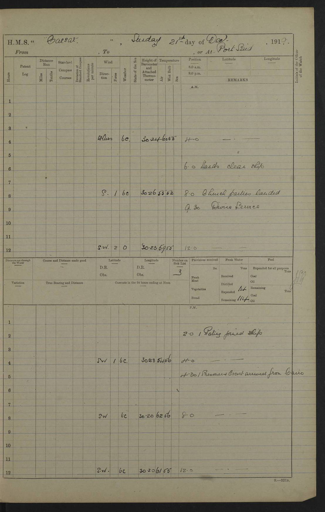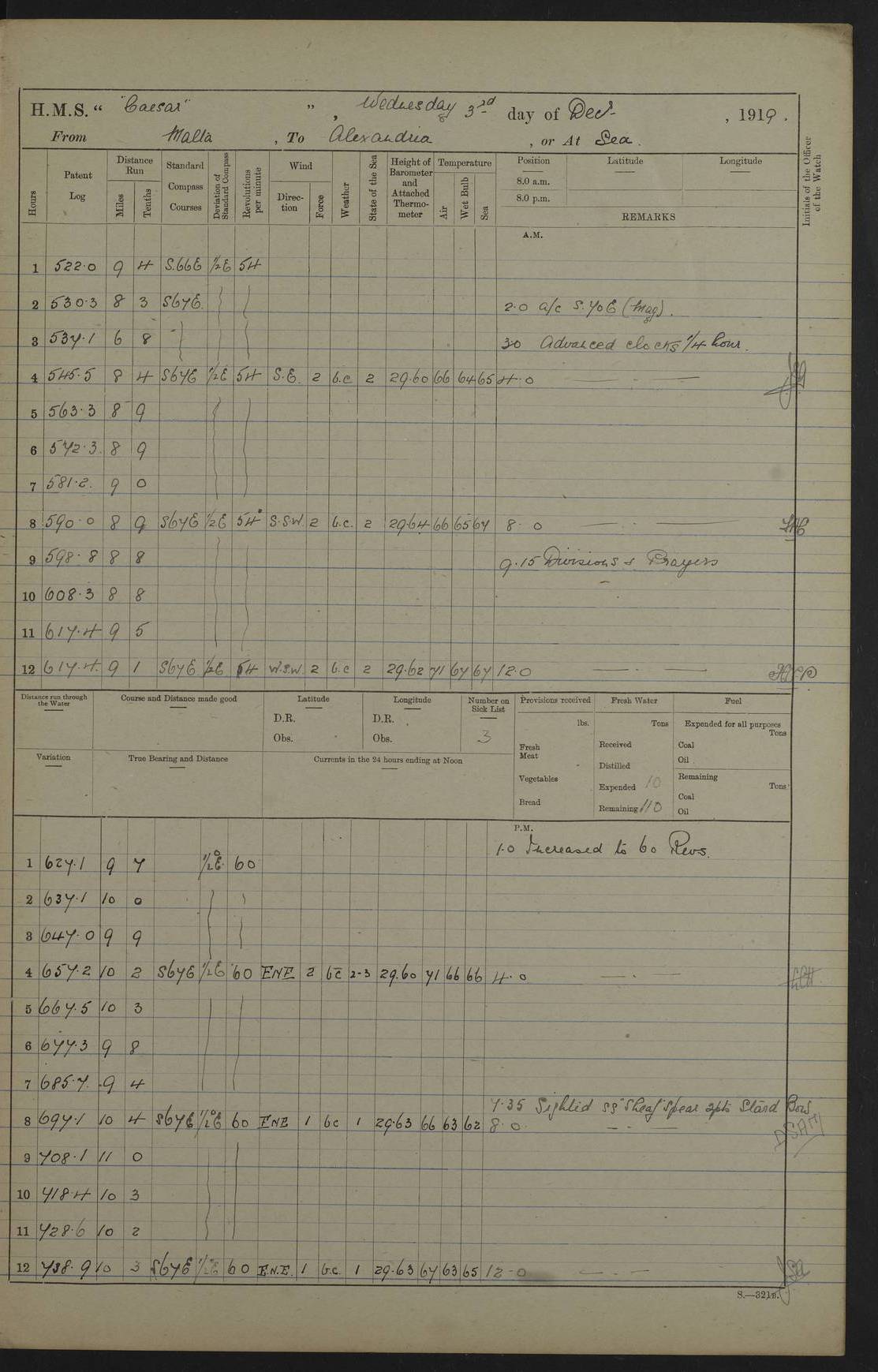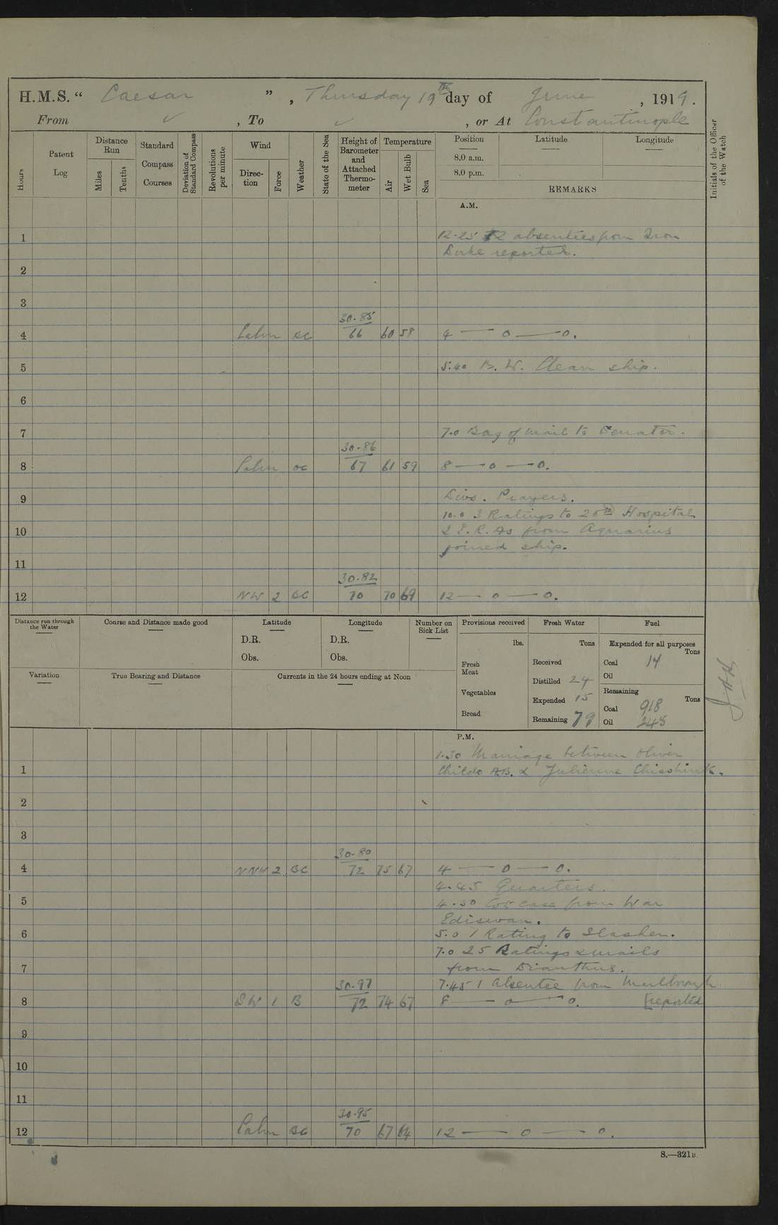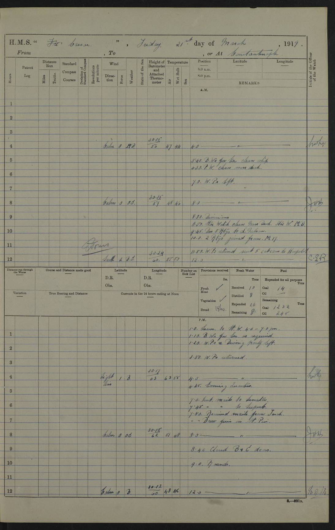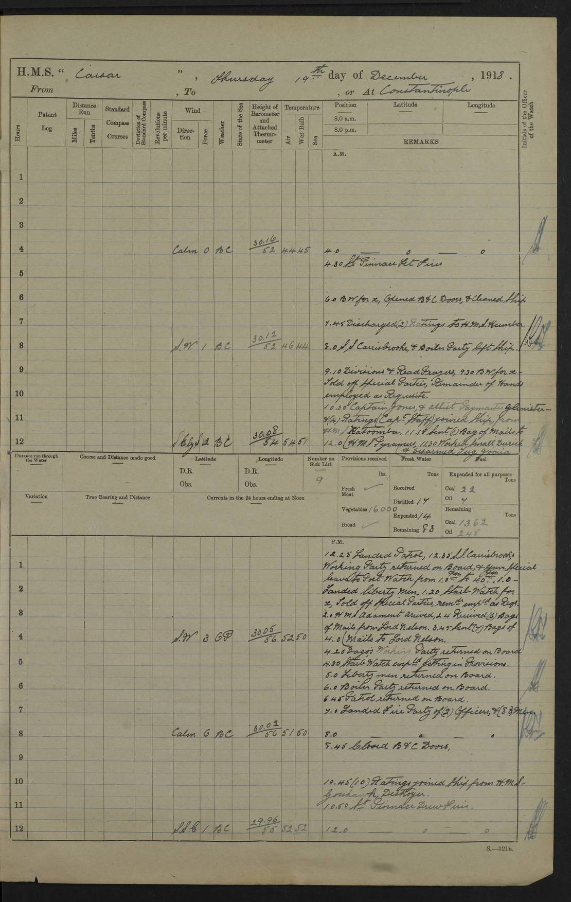 4edebb7b14d0450578000168: (https://s3.amazonaws.com:443/oldweather/ADM53-36589/0003_1.jpg) 1 November 1918 At Malta Lat 35.89, Long 14.52 [Somerset Wharf] 11.15am: Engineers Store Party returned on Board. 0.45pm: Paid Monthly Money. 1.0pm: Mr Goss, Gunner rejoined Ship from RN Hospital. 2.30pm: Gave Special leave to Port Watch untill 7.0am and Port Watch of Boys untill 6.0pm. Hands Made [sic] and Mend Clothes. 2.40pm: Landed liberty Men and Boys. 3.50pm: Provision Boat came alongside. 4.10pm: (4) Recovered Patients rejoined Ship from RN Hospital. 4.30pm: Landed liberty Men and Patrol. 6.0pm: Liberty Boys Returned on Board. 6.30pm: Canteen Party landed untill 10.0pm and Read Warrant No (24). 10.0pm: Canteen Party returned on Board. 11.50pm: Patrol returned on Board. [Provisions received: Fresh Meat 300 lbs, Vegetables 1000 lbs, Bread 450 lbs] 4edebb7c14d0450578000169: (https://s3.amazonaws.com:443/oldweather/ADM53-36589/0004_0.jpg) 2 November 1918 At Malta Lat 35.89, Long 14.52 [Hamilton Wharf] 7.15am: Shifted Berths from Somerset Wharf, to Hamilton Wharf. 8.0am: Tested life Buoys Correct. 8.45am: BW for x Told off Special Parties, Remainder of Hands employed as Requisite, and Landed Picket house Party. 9.10am: Held Court Martial on Board. 10.30am: Court Martial Finished. Noon: Picket House Party returned. 1.20pm: BW for x. Told off Special Parties. Remainder of Hands employed getting in Paymasters Stores and as Requisite. Lost overboard by accident Boat Hooks, Steel, Pattern (345), 2 in Number. 4.20pm: Hands to Fire Stations. 4.35pm: Read Warrant No 25 and gave Special leave to Starboard Watch untill 7.0am. 5.0pm: Landed liberty Men and Victualling Yard Lighter left Ship. 6.30pm: Canteen Party landed untill 10.0pm. [Provisions received: Fresh Meat 260 lbs, Bread 900 lbs] 4edebb7c14d045057800016a: (https://s3.amazonaws.com:443/oldweather/ADM53-36589/0004_1.jpg) 3 November 1918 At Malta Lat 35.89, Long 14.52 [Hamilton Wharf] 9.0am: Landed Church Parties, Wesleyans (14), Presbyterians (10). 9.30am: Divisions. 9.50am: Landed Roman Catholics (15). 10.10am: Discharged (5) Ratings to RN Hospital. 11.35am: All Church Parties returned on Board. 1.0pm: Gave Special leave to Port Watch untill 7.0am and Both Watches of Boys untill 5.30pm. 1.15pm: Landed liberty Men and Boys. 5.30pm: Liberty Boys returned on Board. 6.30pm: Canteen Party landed untill 10.0pm. 8.40pm: Closed B and C Doors. 10.0pm: Canteen Party returned on Board. [Number on sick list: 5] [Provisions received: Fresh Meat 280 lbs] 4edebb7c14d045057800016b: (https://s3.amazonaws.com:443/oldweather/ADM53-36589/0005_0.jpg) 4 November 1918 At Malta Lat 35.89, Long 14.52 [Hamilton Wharf] 6.50am: BW for x Told off Special Parties, remainder of Hands employed as Requisite. 7.0am: Liberty men returned on Board. 8.5am: Provision lighter came alongside. 8.10am: BW for x, Told off Special Parties, remainder of Hands employed Provisioning Ship and as requisite. 8.45am: Landed (1) Carpenter rating for Examination. 3.45pm: (2) Recovered Patients joined Ship from RN Hospital. 4.10pm: Received 8 Bags of Mails from Egmont, and Gave Special leave to Starboard Watch till 7.0am. 5.0pm: Landed Liberty Men and Patrol. 6.0pm: Hands employed getting in and stowing away Provisions. Midnight: Patrol returned on Board. [Weather fine, noon temperature 74F] 4edebb7c14d045057800016c: (https://s3.amazonaws.com:443/oldweather/ADM53-36589/0005_1.jpg) 5 November 1918 At Malta Lat 35.89, Long 14.52 [Hamilton Wharf] 6.45am: BW for x. Told off Special Parties. Remainder of Hands employed getting in and stowing away Provisions. 8.30am: Landed Hospital Party and Picket House Party. 11.0am: Landed (35) Rifles to Naval Ordinance for exchange. Noon: Picket House Party returned. 1.20pm: Landed (2) Ratings for Dental Treatment. 2.25pm: (35) Exchanged Rifles came on Board. 3.40pm: (2) Recovered Patients rejoined Ship from RN Hospital and disinfected Bedding. 4.0pm: Gave Special leave to Port Watch untill 7.0am. Starboard Watch employed stowing Provisions. 4.30pm: Landed Liberty men. Starboard Watch employed stowing away Provisions and Read Warrant No (26). [Provisions received: Fresh Meat 530 lbs, Bread 1000 lbs] 4edebb7c14d045057800016d: (https://s3.amazonaws.com:443/oldweather/ADM53-36589/0006_0.jpg) 6 November 1918 At Malta Lat 35.89, Long 14.52 [Hamilton Wharf] 6.50am: BW for x. Told off Special Parties, Remainder of Port Watch stowing Provisions, Starboard Watch drawing Quarter Deck Awning. 9.0am: Hands employed Provisioning Ship. 4.0pm: Gave Special leave to Starboard Watch untill 7.0am. 4.30pm: Landed liberty Men. Port Watch employed stowing away Provisions. 6.30pm: Canteen Party landed until 10.0pm. 10.0pm: Canteen Party returned on Board. [Number on sick list: 5] [Provisions received: Fresh Meat 250 lbs, Vegetables 1000 lbs, Bread 450 lbs] [Fuel Remaining: Coal 244 tons, Oil 332 tons] 4edebb7c14d045057800016e: (https://s3.amazonaws.com:443/oldweather/ADM53-36589/0006_1.jpg) 7 November 1918 At Malta Lat 35.89, Long 14.52 [No 4 Buoy] 6.30am: BW for x. Told off Special Parties. Remainder of Hands employed prepairing [preparing] Ship to Shift Berths, from Hamilton Wharf to No 4 Buoy. 7.0am: Liberty men returned on Board. 8.50am: Secured Ship to No 4 Buoy and Coal Lighters came alongside. 9.10am: Commenced Coaling Native labour. Hands employed Drawing Stores and as Requisite. 11.50am: Dockyard Parties returned. 1.40pm: BW for x Told off Special Parties, remainder of Hands employed as Requisite. 4.30pm: Gave Special leave to Port Watch untill 7.0am. 4.45pm: Landed liberty men and Patrol and Read Warrant No (27). 7.30pm: Completed Coaling (1481) Tons. 8.40pm: Watch employed sweeping down. 11.50pm: Patrol returned on Board. [Number on sick list: 6] [Provisions received: Fresh Meat 280 lbs, Bread 300 lbs] [Fuel Remaining: Coal 1716 tons, Oil 332 tons] 4edebb7c14d045057800016f: (https://s3.amazonaws.com:443/oldweather/ADM53-36589/0007_0.jpg) 8 November 1918 At Malta Lat 35.89, Long 