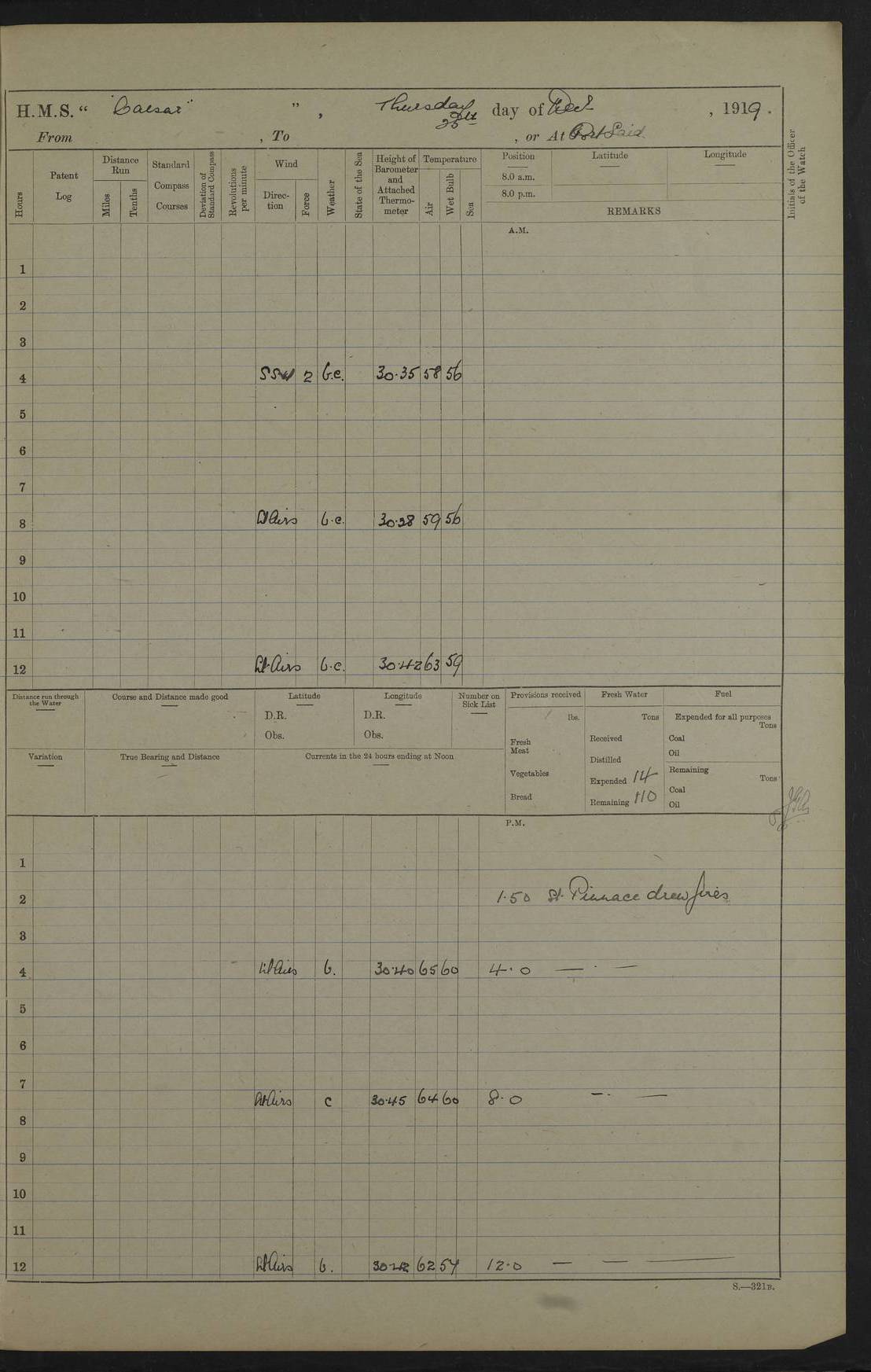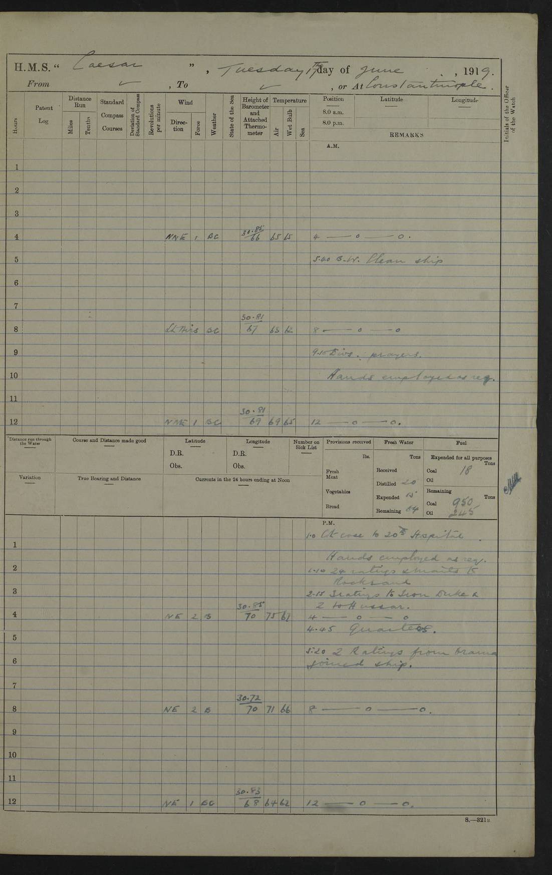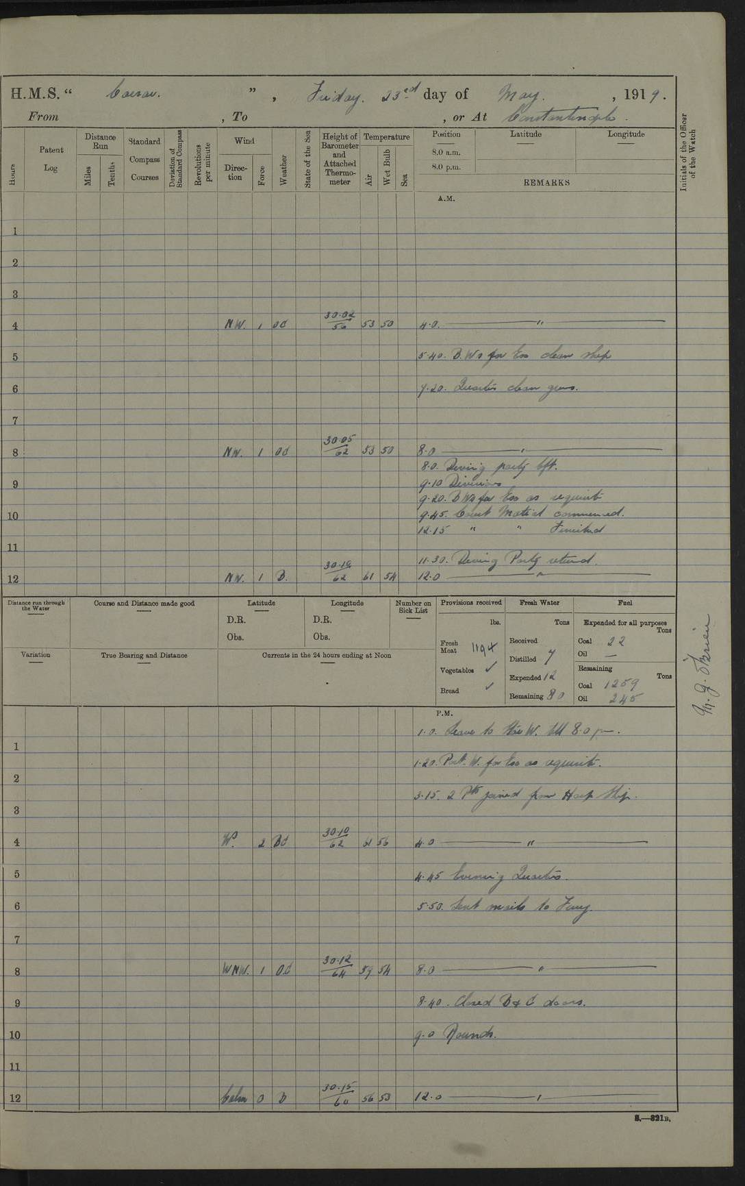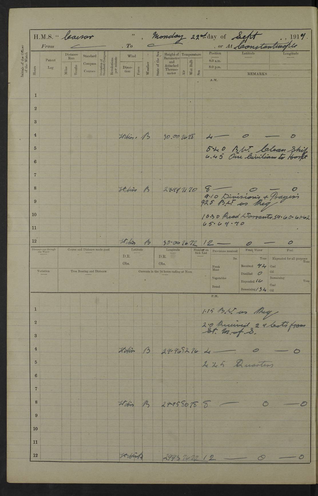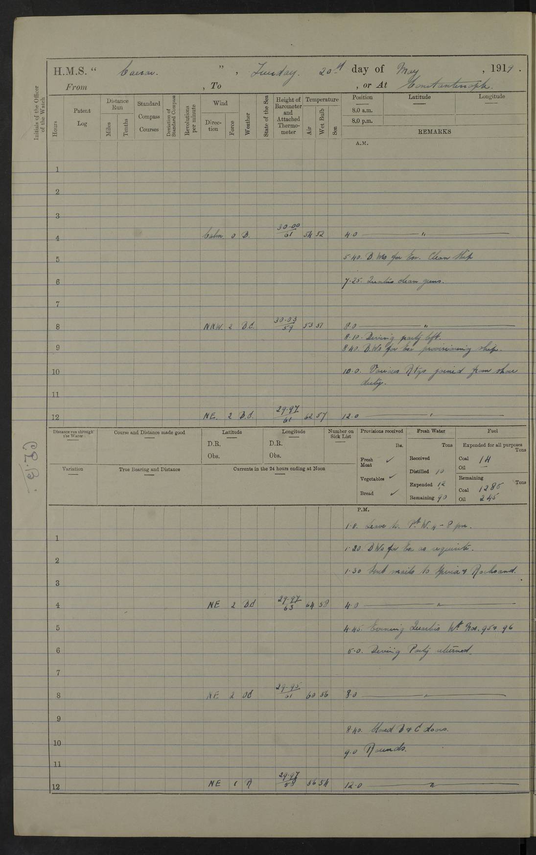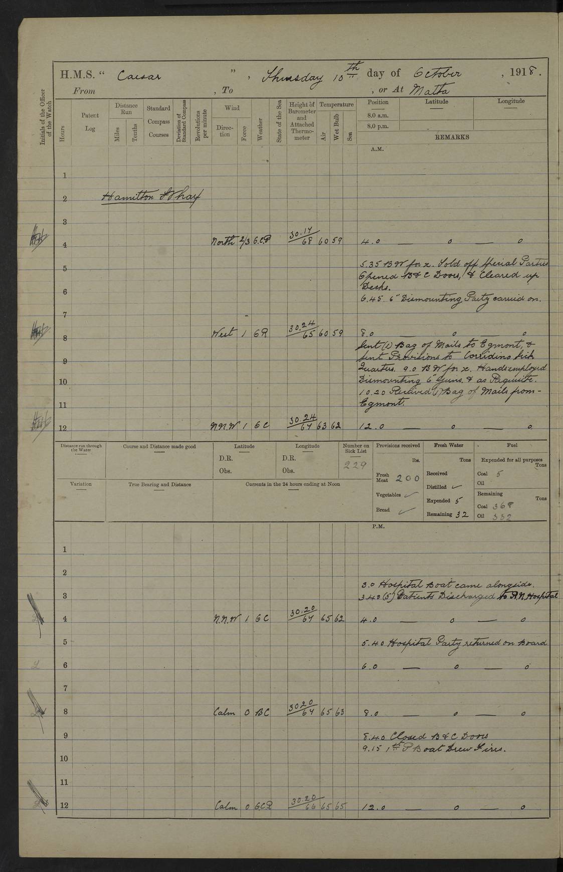 4edebb7b14d0450578000168: (https://s3.amazonaws.com:443/oldweather/ADM53-36589/0003_1.jpg) 1 November 1918 At Malta Lat 35.89, Long 14.52 [Somerset Wharf] 11.15am: Engineers Store Party returned on Board. 0.45pm: Paid Monthly Money. 1.0pm: Mr Goss, Gunner rejoined Ship from RN Hospital. 2.30pm: Gave Special leave to Port Watch untill 7.0am and Port Watch of Boys untill 6.0pm. Hands Made [sic] and Mend Clothes. 2.40pm: Landed liberty Men and Boys. 3.50pm: Provision Boat came alongside. 4.10pm: (4) Recovered Patients rejoined Ship from RN Hospital. 4.30pm: Landed liberty Men and Patrol. 6.0pm: Liberty Boys Returned on Board. 6.30pm: Canteen Party landed untill 10.0pm and Read Warrant No (24). 10.0pm: Canteen Party returned on Board. 11.50pm: Patrol returned on Board. [Provisions received: Fresh Meat 300 lbs, Vegetables 1000 lbs, Bread 450 lbs] 4edebb7c14d0450578000169: (https://s3.amazonaws.com:443/oldweather/ADM53-36589/0004_0.jpg) 2 November 1918 At Malta Lat 35.89, Long 14.52 [Hamilton Wharf] 7.15am: Shifted Berths from Somerset Wharf, to Hamilton Wharf. 8.0am: Tested life Buoys Correct. 8.45am: BW for x Told off Special Parties, Remainder of Hands employed as Requisite, and Landed Picket house Party. 9.10am: Held Court Martial on Board. 10.30am: Court Martial Finished. Noon: Picket House Party returned. 1.20pm: BW for x. Told off Special Parties. Remainder of Hands employed getting in Paymasters Stores and as Requisite. Lost overboard by accident Boat Hooks, Steel, Pattern (345), 2 in Number. 4.20pm: Hands to Fire Stations. 4.35pm: Read Warrant No 25 and gave Special leave to Starboard Watch untill 7.0am. 5.0pm: Landed liberty Men and Victualling Yard Lighter left Ship. 6.30pm: Canteen Party landed untill 10.0pm. [Provisions received: Fresh Meat 260 lbs, Bread 900 lbs] 4edebb7c14d045057800016a: (https://s3.amazonaws.com:443/oldweather/ADM53-36589/0004_1.jpg) 3 November 1918 At Malta Lat 35.89, Long 14.52 [Hamilton Wharf] 9.0am: Landed Church Parties, Wesleyans (14), Presbyterians (10). 9.30am: Divisions. 9.50am: Landed Roman Catholics (15). 10.10am: Discharged (5) Ratings to RN Hospital. 11.35am: All Church Parties returned on Board. 1.0pm: Gave Special leave to Port Watch untill 7.0am and Both Watches of Boys untill 5.30pm. 1.15pm: Landed liberty Men and Boys. 5.30pm: Liberty Boys returned on Board. 6.30pm: Canteen Party landed untill 10.0pm. 8.40pm: Closed B and C Doors. 10.0pm: Canteen Party returned on Board. [Number on sick list: 5] [Provisions received: Fresh Meat 280 lbs] 4edebb7c14d045057800016b: (https://s3.amazonaws.com:443/oldweather/ADM53-36589/0005_0.jpg) 4 November 1918 At Malta Lat 35.89, Long 14.52 [Hamilton Wharf] 6.50am: BW for x Told off Special Parties, remainder of Hands employed as Requisite. 7.0am: Liberty men returned on Board. 8.5am: Provision lighter came alongside. 8.10am: BW for x, Told off Special Parties, remainder of Hands employed Provisioning Ship and as requisite. 8.45am: Landed (1) Carpenter rating for Examination. 3.45pm: (2) Recovered Patients joined Ship from RN Hospital. 4.10pm: Received 8 Bags of Mails from Egmont, and Gave Special leave to Starboard Watch till 7.0am. 5.0pm: Landed Liberty Men and Patrol. 6.0pm: Hands employed getting in and stowing away Provisions. Midnight: Patrol returned on Board. [Weather fine, noon temperature 74F] 4edebb7c14d045057800016c: (https://s3.amazonaws.com:443/oldweather/ADM53-36589/0005_1.jpg) 5 November 1918 At Malta Lat 35.89, Long 14.52 [Hamilton Wharf] 6.45am: BW for x. Told off Special Parties. Remainder of Hands employed getting in and stowing away Provisions. 8.30am: Landed Hospital Party and Picket House Party. 11.0am: Landed (35) Rifles to Naval Ordinance for exchange. Noon: Picket House Party returned. 1.20pm: Landed (2) Ratings for Dental Treatment. 2.25pm: (35) Exchanged Rifles came on Board. 3.40pm: (2) Recovered Patients rejoined Ship from RN Hospital and disinfected Bedding. 4.0pm: Gave Special leave to Port Watch untill 7.0am. Starboard Watch employed stowing Provisions. 4.30pm: Landed Liberty men. Starboard Watch employed stowing away Provisions and Read Warrant No (26). [Provisions received: Fresh Meat 530 lbs, Bread 1000 lbs] 4edebb7c14d045057800016d: (https://s3.amazonaws.com:443/oldweather/ADM53-36589/0006_0.jpg) 6 November 1918 At Malta Lat 35.89, Long 14.52 [Hamilton Wharf] 6.50am: BW for x. Told off Special Parties, Remainder of Port Watch stowing Provisions, Starboard Watch drawing Quarter Deck Awning. 9.0am: Hands employed Provisioning Ship. 4.0pm: Gave Special leave to Starboard Watch untill 7.0am. 4.30pm: Landed liberty Men. Port Watch employed stowing away Provisions. 6.30pm: Canteen Party landed until 10.0pm. 10.0pm: Canteen Party returned on Board. [Number on sick list: 5] [Provisions received: Fresh Meat 250 lbs, Vegetables 1000 lbs, Bread 450 lbs] [Fuel Remaining: Coal 244 tons, Oil 332 tons] 4edebb7c14d045057800016e: (https://s3.amazonaws.com:443/oldweather/ADM53-36589/0006_1.jpg) 7 November 1918 At Malta Lat 35.89, Long 14.52 [No 4 Buoy] 6.30am: BW for x. Told off Special Parties. Remainder of Hands employed prepairing [preparing] Ship to Shift Berths, from Hamilton Wharf to No 4 Buoy. 7.0am: Liberty men returned on Board. 8.50am: Secured Ship to No 4 Buoy and Coal Lighters came alongside. 9.10am: Commenced Coaling Native labour. Hands employed Drawing Stores and as Requisite. 11.50am: Dockyard Parties returned. 1.40pm: BW for x Told off Special Parties, remainder of Hands employed as Requisite. 4.30pm: Gave Special leave to Port Watch untill 7.0am. 4.45pm: Landed liberty men and Patrol and Read Warrant No (27). 7.30pm: Completed Coaling (1481) Tons. 8.40pm: Watch employed sweeping down. 11.50pm: Patrol returned on Board. [Number on sick list: 6] [Provisions received: Fresh Meat 280 lbs, Bread 300 lbs] [Fuel Remaining: Coal 1716 tons, Oil 332 tons] 4edebb7c14d045057800016f: (https://s3.amazonaws.com:443/oldweather/ADM53-36589/0007_0.jpg) 8 November 1918 At Malta Lat 35.89, Long 