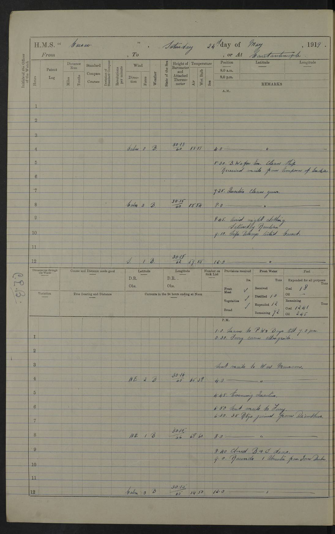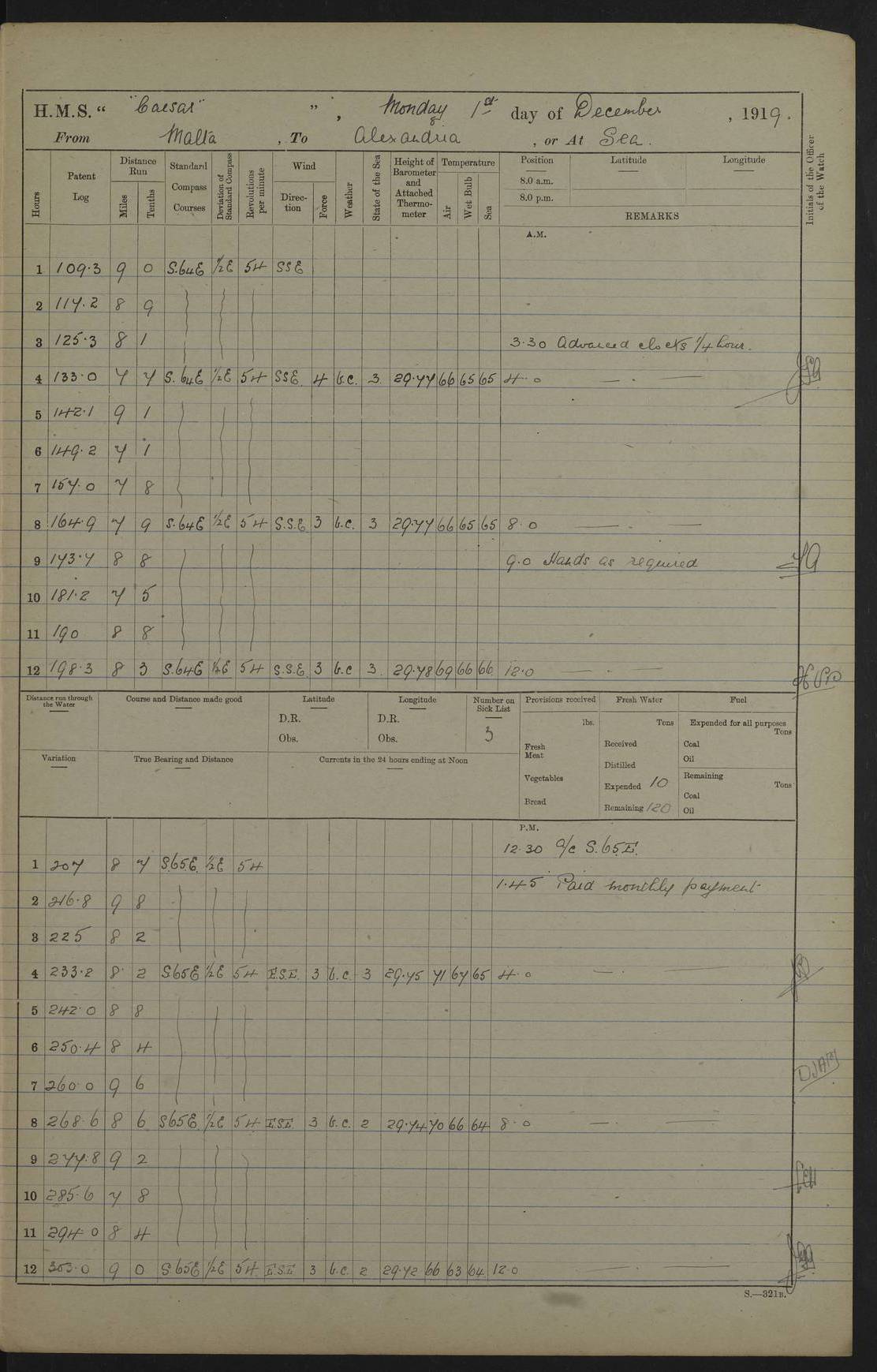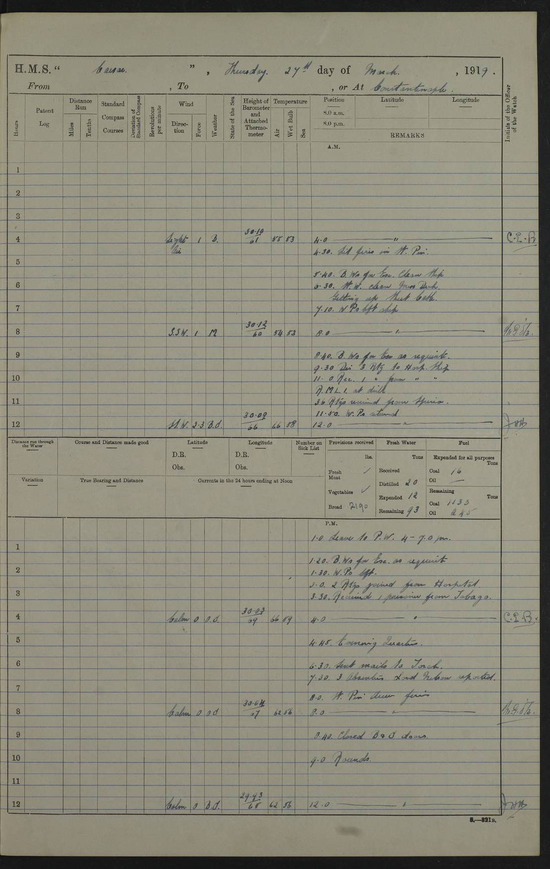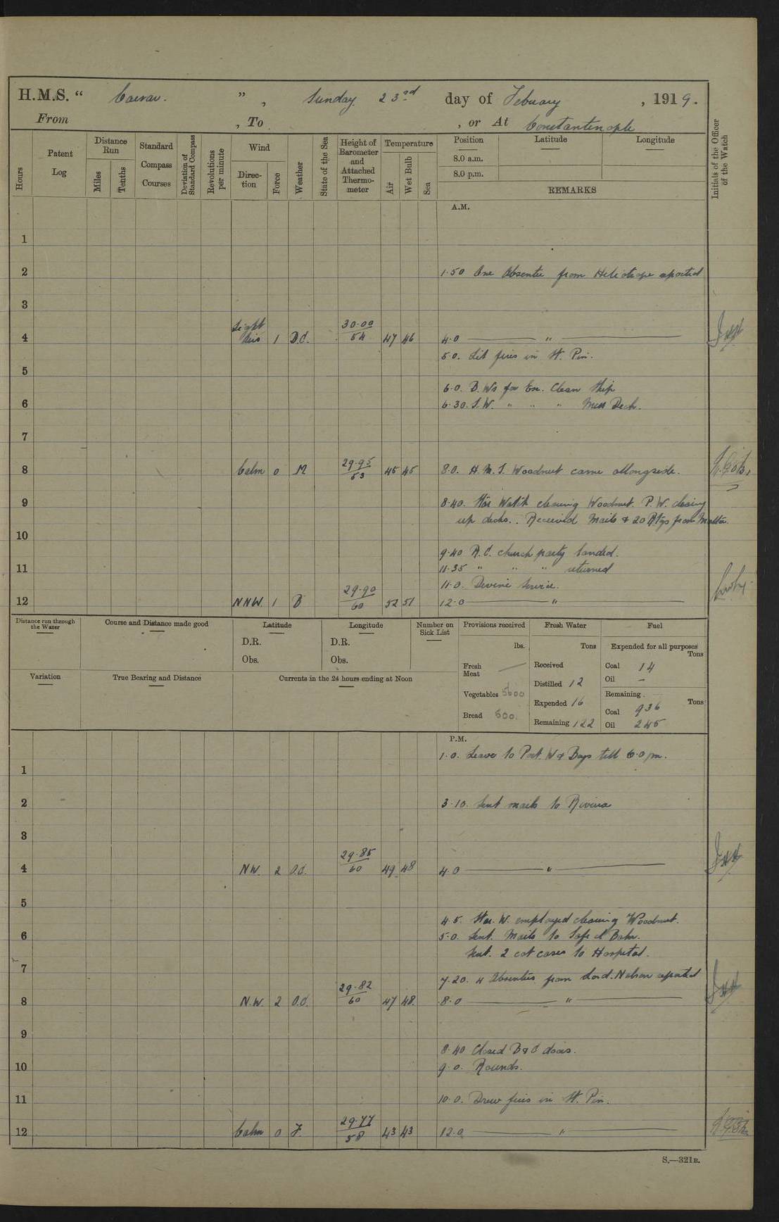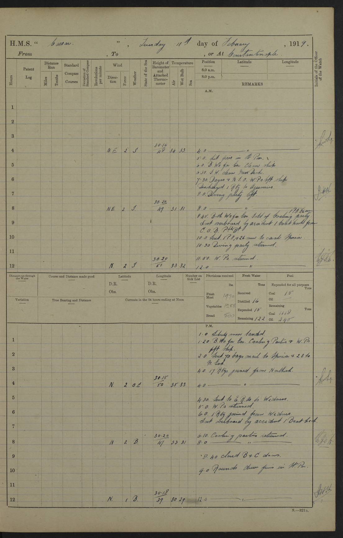 4edebb7b14d0450578000168: (https://s3.amazonaws.com:443/oldweather/ADM53-36589/0003_1.jpg) 1 November 1918 At Malta Lat 35.89, Long 14.52 [Somerset Wharf] 11.15am: Engineers Store Party returned on Board. 0.45pm: Paid Monthly Money. 1.0pm: Mr Goss, Gunner rejoined Ship from RN Hospital. 2.30pm: Gave Special leave to Port Watch untill 7.0am and Port Watch of Boys untill 6.0pm. Hands Made [sic] and Mend Clothes. 2.40pm: Landed liberty Men and Boys. 3.50pm: Provision Boat came alongside. 4.10pm: (4) Recovered Patients rejoined Ship from RN Hospital. 4.30pm: Landed liberty Men and Patrol. 6.0pm: Liberty Boys Returned on Board. 6.30pm: Canteen Party landed untill 10.0pm and Read Warrant No (24). 10.0pm: Canteen Party returned on Board. 11.50pm: Patrol returned on Board. [Provisions received: Fresh Meat 300 lbs, Vegetables 1000 lbs, Bread 450 lbs] 4edebb7c14d0450578000169: (https://s3.amazonaws.com:443/oldweather/ADM53-36589/0004_0.jpg) 2 November 1918 At Malta Lat 35.89, Long 14.52 [Hamilton Wharf] 7.15am: Shifted Berths from Somerset Wharf, to Hamilton Wharf. 8.0am: Tested life Buoys Correct. 8.45am: BW for x Told off Special Parties, Remainder of Hands employed as Requisite, and Landed Picket house Party. 9.10am: Held Court Martial on Board. 10.30am: Court Martial Finished. Noon: Picket House Party returned. 1.20pm: BW for x. Told off Special Parties. Remainder of Hands employed getting in Paymasters Stores and as Requisite. Lost overboard by accident Boat Hooks, Steel, Pattern (345), 2 in Number. 4.20pm: Hands to Fire Stations. 4.35pm: Read Warrant No 25 and gave Special leave to Starboard Watch untill 7.0am. 5.0pm: Landed liberty Men and Victualling Yard Lighter left Ship. 6.30pm: Canteen Party landed untill 10.0pm. [Provisions received: Fresh Meat 260 lbs, Bread 900 lbs] 4edebb7c14d045057800016a: (https://s3.amazonaws.com:443/oldweather/ADM53-36589/0004_1.jpg) 3 November 1918 At Malta Lat 35.89, Long 14.52 [Hamilton Wharf] 9.0am: Landed Church Parties, Wesleyans (14), Presbyterians (10). 9.30am: Divisions. 9.50am: Landed Roman Catholics (15). 10.10am: Discharged (5) Ratings to RN Hospital. 11.35am: All Church Parties returned on Board. 1.0pm: Gave Special leave to Port Watch untill 7.0am and Both Watches of Boys untill 5.30pm. 1.15pm: Landed liberty Men and Boys. 5.30pm: Liberty Boys returned on Board. 6.30pm: Canteen Party landed untill 10.0pm. 8.40pm: Closed B and C Doors. 10.0pm: Canteen Party returned on Board. [Number on sick list: 5] [Provisions received: Fresh Meat 280 lbs] 4edebb7c14d045057800016b: (https://s3.amazonaws.com:443/oldweather/ADM53-36589/0005_0.jpg) 4 November 1918 At Malta Lat 35.89, Long 14.52 [Hamilton Wharf] 6.50am: BW for x Told off Special Parties, remainder of Hands employed as Requisite. 7.0am: Liberty men returned on Board. 8.5am: Provision lighter came alongside. 8.10am: BW for x, Told off Special Parties, remainder of Hands employed Provisioning Ship and as requisite. 8.45am: Landed (1) Carpenter rating for Examination. 3.45pm: (2) Recovered Patients joined Ship from RN Hospital. 4.10pm: Received 8 Bags of Mails from Egmont, and Gave Special leave to Starboard Watch till 7.0am. 5.0pm: Landed Liberty Men and Patrol. 6.0pm: Hands employed getting in and stowing away Provisions. Midnight: Patrol returned on Board. [Weather fine, noon temperature 74F] 4edebb7c14d045057800016c: (https://s3.amazonaws.com:443/oldweather/ADM53-36589/0005_1.jpg) 5 November 1918 At Malta Lat 35.89, Long 14.52 [Hamilton Wharf] 6.45am: BW for x. Told off Special Parties. Remainder of Hands employed getting in and stowing away Provisions. 8.30am: Landed Hospital Party and Picket House Party. 11.0am: Landed (35) Rifles to Naval Ordinance for exchange. Noon: Picket House Party returned. 1.20pm: Landed (2) Ratings for Dental Treatment. 2.25pm: (35) Exchanged Rifles came on Board. 3.40pm: (2) Recovered Patients rejoined Ship from RN Hospital and disinfected Bedding. 4.0pm: Gave Special leave to Port Watch untill 7.0am. Starboard Watch employed stowing Provisions. 4.30pm: Landed Liberty men. Starboard Watch employed stowing away Provisions and Read Warrant No (26). [Provisions received: Fresh Meat 530 lbs, Bread 1000 lbs] 4edebb7c14d045057800016d: (https://s3.amazonaws.com:443/oldweather/ADM53-36589/0006_0.jpg) 6 November 1918 At Malta Lat 35.89, Long 14.52 [Hamilton Wharf] 6.50am: BW for x. Told off Special Parties, Remainder of Port Watch stowing Provisions, Starboard Watch drawing Quarter Deck Awning. 9.0am: Hands employed Provisioning Ship. 4.0pm: Gave Special leave to Starboard Watch untill 7.0am. 4.30pm: Landed liberty Men. Port Watch employed stowing away Provisions. 6.30pm: Canteen Party landed until 10.0pm. 10.0pm: Canteen Party returned on Board. [Number on sick list: 5] [Provisions received: Fresh Meat 250 lbs, Vegetables 1000 lbs, Bread 450 lbs] [Fuel Remaining: Coal 244 tons, Oil 332 tons] 4edebb7c14d045057800016e: (https://s3.amazonaws.com:443/oldweather/ADM53-36589/0006_1.jpg) 7 November 1918 At Malta Lat 35.89, Long 14.52 [No 4 Buoy] 6.30am: BW for x. Told off Special Parties. Remainder of Hands employed prepairing [preparing] Ship to Shift Berths, from Hamilton Wharf to No 4 Buoy. 7.0am: Liberty men returned on Board. 8.50am: Secured Ship to No 4 Buoy and Coal Lighters came alongside. 9.10am: Commenced Coaling Native labour. Hands employed Drawing Stores and as Requisite. 11.50am: Dockyard Parties returned. 1.40pm: BW for x Told off Special Parties, remainder of Hands employed as Requisite. 4.30pm: Gave Special leave to Port Watch untill 7.0am. 4.45pm: Landed liberty men and Patrol and Read Warrant No (27). 7.30pm: Completed Coaling (1481) Tons. 8.40pm: Watch employed sweeping down. 11.50pm: Patrol returned on Board. [Number on sick list: 6] [Provisions received: Fresh Meat 280 lbs, Bread 300 lbs] [Fuel Remaining: Coal 1716 tons, Oil 332 tons] 4edebb7c14d045057800016f: (https://s3.amazonaws.com:443/oldweather/ADM53-36589/0007_0.jpg) 8 November 1918 At Malta Lat 35.89, Long 