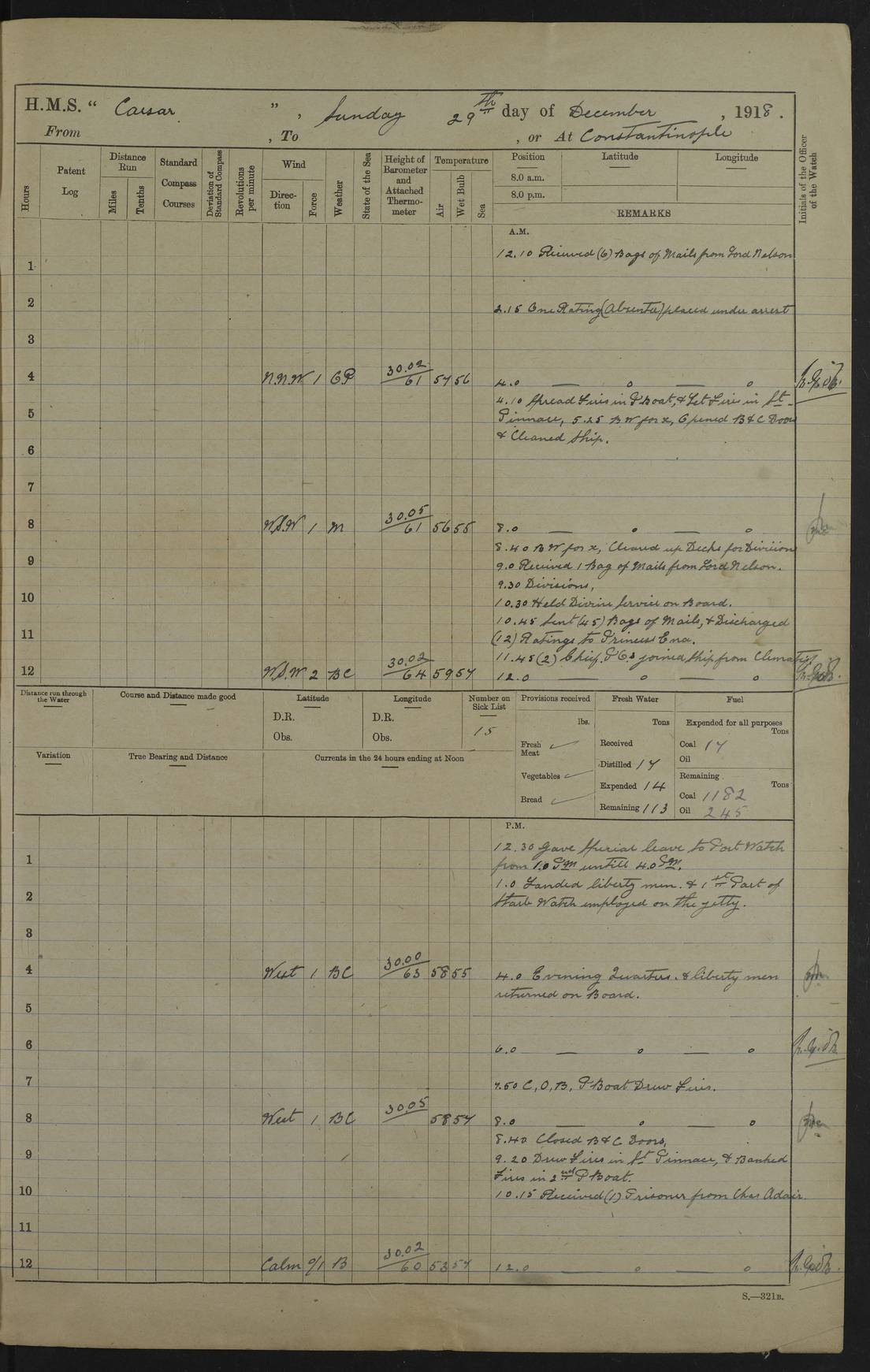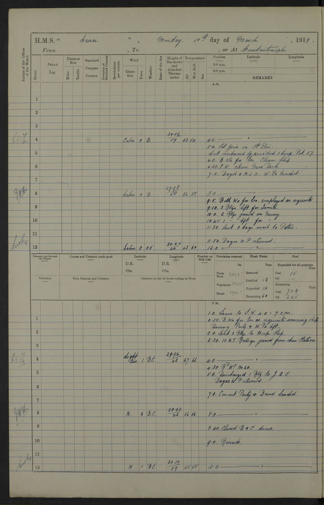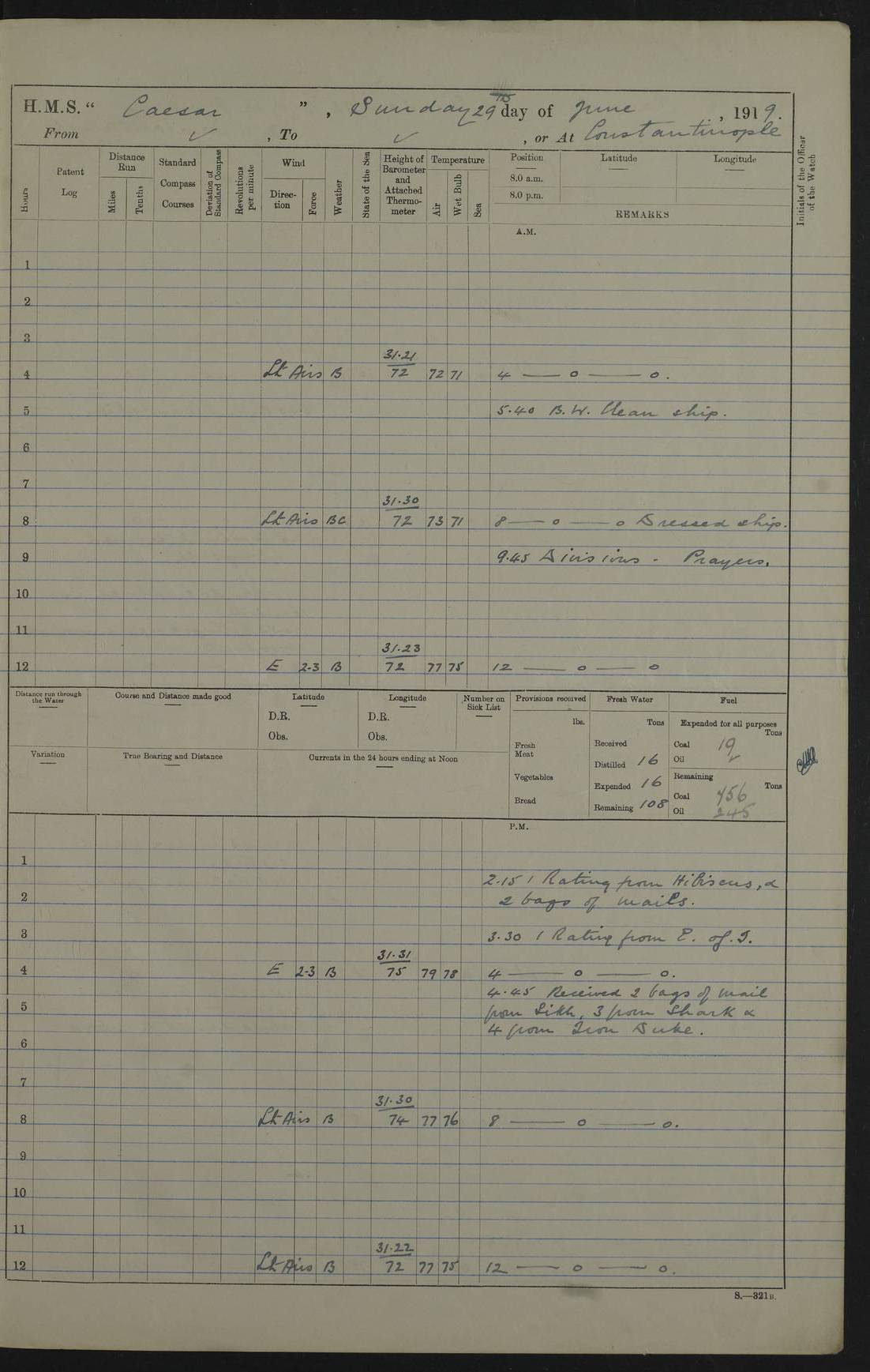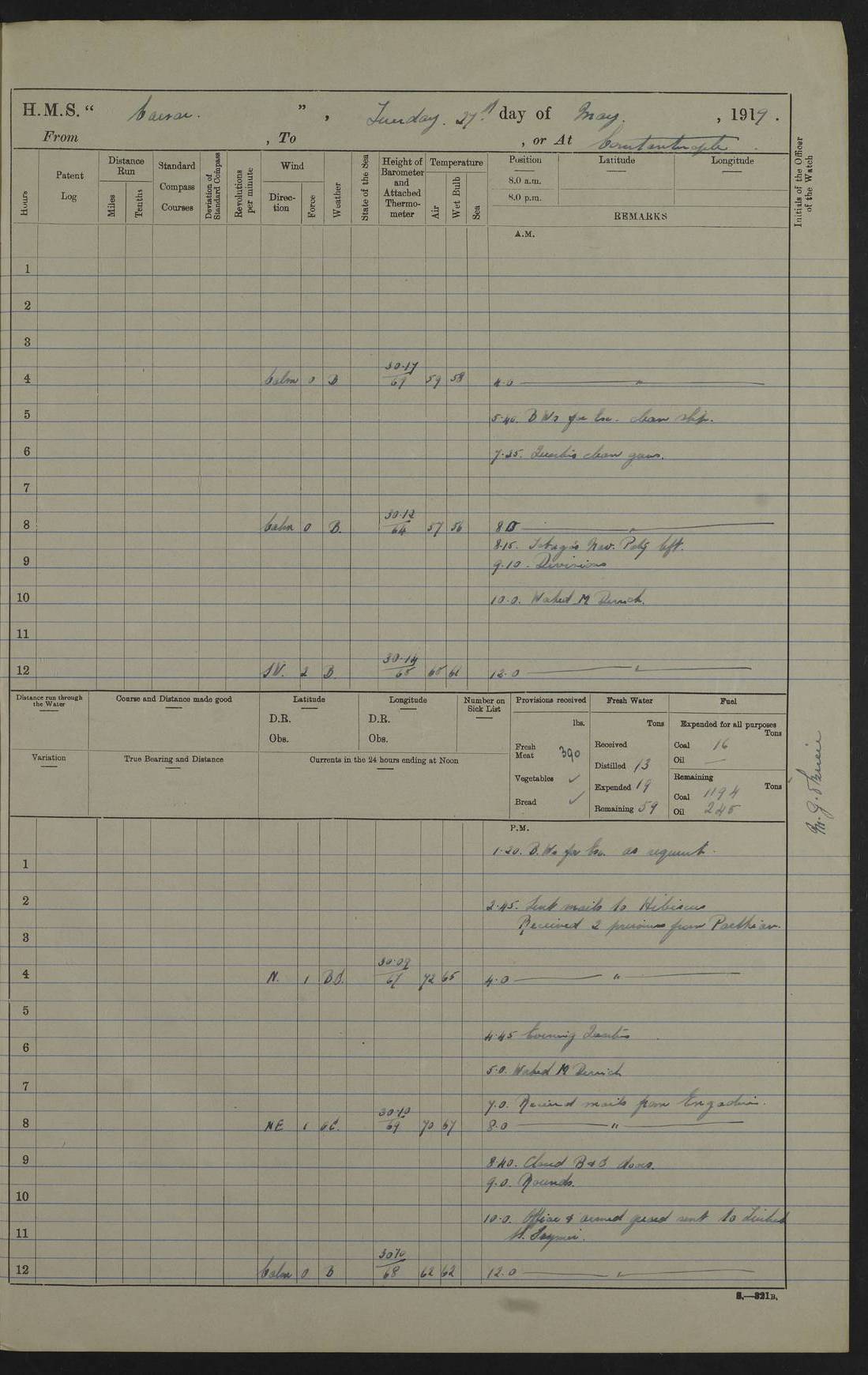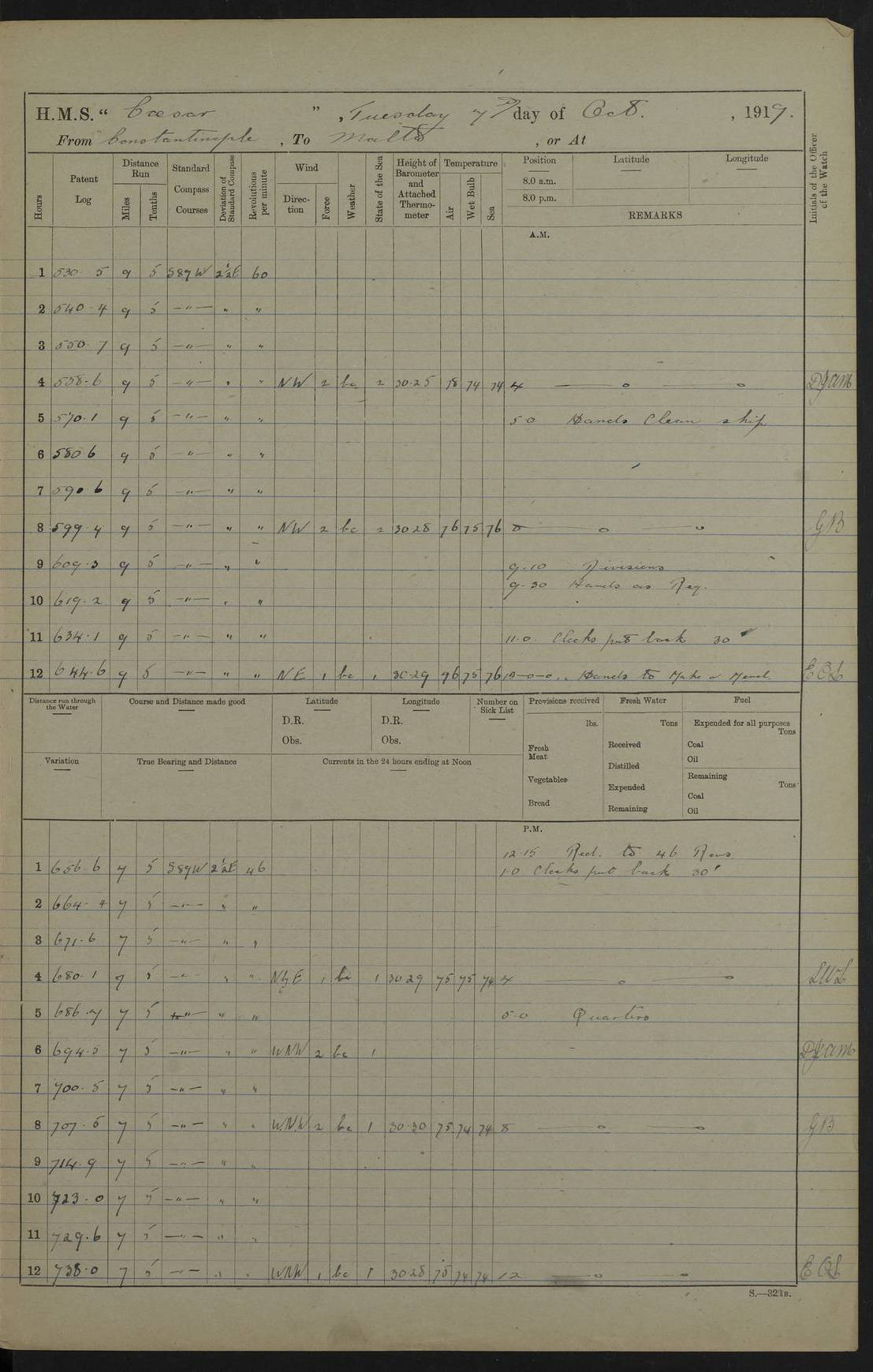 4edebb7b14d0450578000168: (https://s3.amazonaws.com:443/oldweather/ADM53-36589/0003_1.jpg) 1 November 1918 At Malta Lat 35.89, Long 14.52 [Somerset Wharf] 11.15am: Engineers Store Party returned on Board. 0.45pm: Paid Monthly Money. 1.0pm: Mr Goss, Gunner rejoined Ship from RN Hospital. 2.30pm: Gave Special leave to Port Watch untill 7.0am and Port Watch of Boys untill 6.0pm. Hands Made [sic] and Mend Clothes. 2.40pm: Landed liberty Men and Boys. 3.50pm: Provision Boat came alongside. 4.10pm: (4) Recovered Patients rejoined Ship from RN Hospital. 4.30pm: Landed liberty Men and Patrol. 6.0pm: Liberty Boys Returned on Board. 6.30pm: Canteen Party landed untill 10.0pm and Read Warrant No (24). 10.0pm: Canteen Party returned on Board. 11.50pm: Patrol returned on Board. [Provisions received: Fresh Meat 300 lbs, Vegetables 1000 lbs, Bread 450 lbs] 4edebb7c14d0450578000169: (https://s3.amazonaws.com:443/oldweather/ADM53-36589/0004_0.jpg) 2 November 1918 At Malta Lat 35.89, Long 14.52 [Hamilton Wharf] 7.15am: Shifted Berths from Somerset Wharf, to Hamilton Wharf. 8.0am: Tested life Buoys Correct. 8.45am: BW for x Told off Special Parties, Remainder of Hands employed as Requisite, and Landed Picket house Party. 9.10am: Held Court Martial on Board. 10.30am: Court Martial Finished. Noon: Picket House Party returned. 1.20pm: BW for x. Told off Special Parties. Remainder of Hands employed getting in Paymasters Stores and as Requisite. Lost overboard by accident Boat Hooks, Steel, Pattern (345), 2 in Number. 4.20pm: Hands to Fire Stations. 4.35pm: Read Warrant No 25 and gave Special leave to Starboard Watch untill 7.0am. 5.0pm: Landed liberty Men and Victualling Yard Lighter left Ship. 6.30pm: Canteen Party landed untill 10.0pm. [Provisions received: Fresh Meat 260 lbs, Bread 900 lbs] 4edebb7c14d045057800016a: (https://s3.amazonaws.com:443/oldweather/ADM53-36589/0004_1.jpg) 3 November 1918 At Malta Lat 35.89, Long 14.52 [Hamilton Wharf] 9.0am: Landed Church Parties, Wesleyans (14), Presbyterians (10). 9.30am: Divisions. 9.50am: Landed Roman Catholics (15). 10.10am: Discharged (5) Ratings to RN Hospital. 11.35am: All Church Parties returned on Board. 1.0pm: Gave Special leave to Port Watch untill 7.0am and Both Watches of Boys untill 5.30pm. 1.15pm: Landed liberty Men and Boys. 5.30pm: Liberty Boys returned on Board. 6.30pm: Canteen Party landed untill 10.0pm. 8.40pm: Closed B and C Doors. 10.0pm: Canteen Party returned on Board. [Number on sick list: 5] [Provisions received: Fresh Meat 280 lbs] 4edebb7c14d045057800016b: (https://s3.amazonaws.com:443/oldweather/ADM53-36589/0005_0.jpg) 4 November 1918 At Malta Lat 35.89, Long 14.52 [Hamilton Wharf] 6.50am: BW for x Told off Special Parties, remainder of Hands employed as Requisite. 7.0am: Liberty men returned on Board. 8.5am: Provision lighter came alongside. 8.10am: BW for x, Told off Special Parties, remainder of Hands employed Provisioning Ship and as requisite. 8.45am: Landed (1) Carpenter rating for Examination. 3.45pm: (2) Recovered Patients joined Ship from RN Hospital. 4.10pm: Received 8 Bags of Mails from Egmont, and Gave Special leave to Starboard Watch till 7.0am. 5.0pm: Landed Liberty Men and Patrol. 6.0pm: Hands employed getting in and stowing away Provisions. Midnight: Patrol returned on Board. [Weather fine, noon temperature 74F] 4edebb7c14d045057800016c: (https://s3.amazonaws.com:443/oldweather/ADM53-36589/0005_1.jpg) 5 November 1918 At Malta Lat 35.89, Long 14.52 [Hamilton Wharf] 6.45am: BW for x. Told off Special Parties. Remainder of Hands employed getting in and stowing away Provisions. 8.30am: Landed Hospital Party and Picket House Party. 11.0am: Landed (35) Rifles to Naval Ordinance for exchange. Noon: Picket House Party returned. 1.20pm: Landed (2) Ratings for Dental Treatment. 2.25pm: (35) Exchanged Rifles came on Board. 3.40pm: (2) Recovered Patients rejoined Ship from RN Hospital and disinfected Bedding. 4.0pm: Gave Special leave to Port Watch untill 7.0am. Starboard Watch employed stowing Provisions. 4.30pm: Landed Liberty men. Starboard Watch employed stowing away Provisions and Read Warrant No (26). [Provisions received: Fresh Meat 530 lbs, Bread 1000 lbs] 4edebb7c14d045057800016d: (https://s3.amazonaws.com:443/oldweather/ADM53-36589/0006_0.jpg) 6 November 1918 At Malta Lat 35.89, Long 14.52 [Hamilton Wharf] 6.50am: BW for x. Told off Special Parties, Remainder of Port Watch stowing Provisions, Starboard Watch drawing Quarter Deck Awning. 9.0am: Hands employed Provisioning Ship. 4.0pm: Gave Special leave to Starboard Watch untill 7.0am. 4.30pm: Landed liberty Men. Port Watch employed stowing away Provisions. 6.30pm: Canteen Party landed until 10.0pm. 10.0pm: Canteen Party returned on Board. [Number on sick list: 5] [Provisions received: Fresh Meat 250 lbs, Vegetables 1000 lbs, Bread 450 lbs] [Fuel Remaining: Coal 244 tons, Oil 332 tons] 4edebb7c14d045057800016e: (https://s3.amazonaws.com:443/oldweather/ADM53-36589/0006_1.jpg) 7 November 1918 At Malta Lat 35.89, Long 14.52 [No 4 Buoy] 6.30am: BW for x. Told off Special Parties. Remainder of Hands employed prepairing [preparing] Ship to Shift Berths, from Hamilton Wharf to No 4 Buoy. 7.0am: Liberty men returned on Board. 8.50am: Secured Ship to No 4 Buoy and Coal Lighters came alongside. 9.10am: Commenced Coaling Native labour. Hands employed Drawing Stores and as Requisite. 11.50am: Dockyard Parties returned. 1.40pm: BW for x Told off Special Parties, remainder of Hands employed as Requisite. 4.30pm: Gave Special leave to Port Watch untill 7.0am. 4.45pm: Landed liberty men and Patrol and Read Warrant No (27). 7.30pm: Completed Coaling (1481) Tons. 8.40pm: Watch employed sweeping down. 11.50pm: Patrol returned on Board. [Number on sick list: 6] [Provisions received: Fresh Meat 280 lbs, Bread 300 lbs] [Fuel Remaining: Coal 1716 tons, Oil 332 tons] 4edebb7c14d045057800016f: (https://s3.amazonaws.com:443/oldweather/ADM53-36589/0007_0.jpg) 8 November 1918 At Malta Lat 35.89, Long 