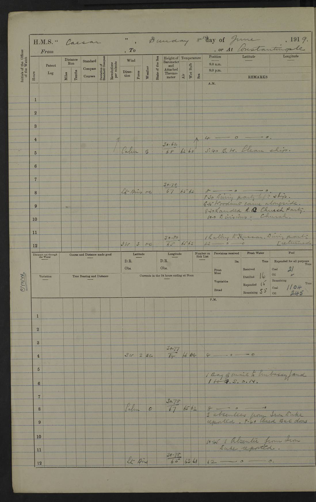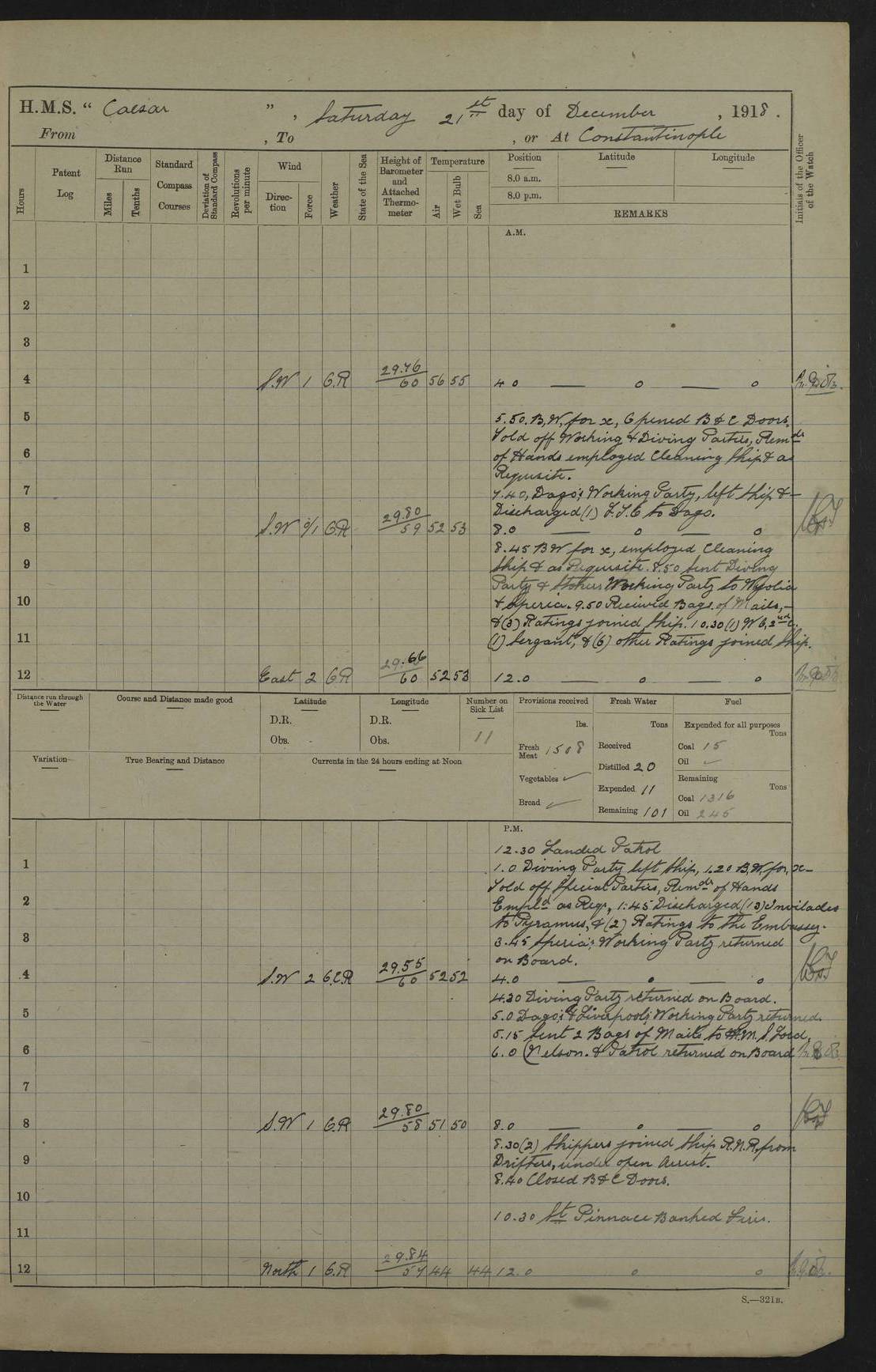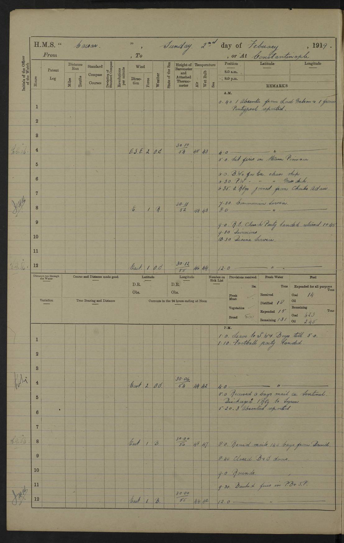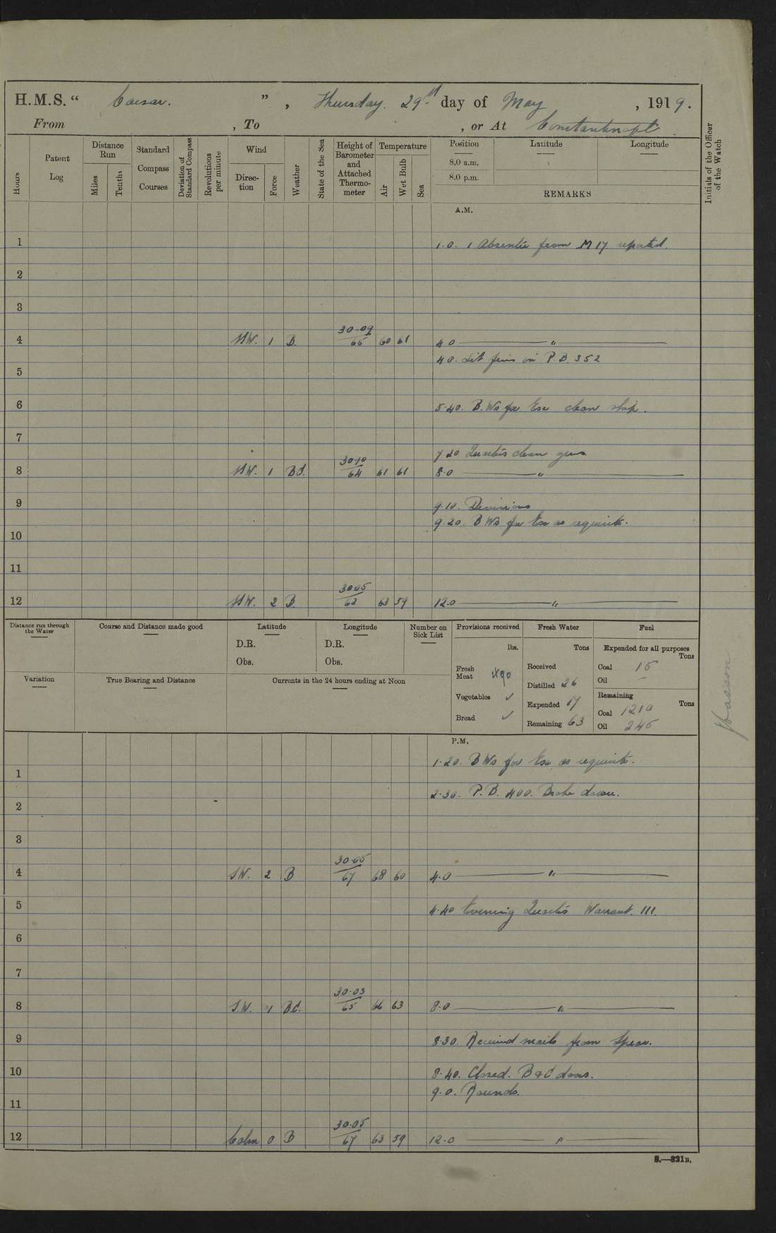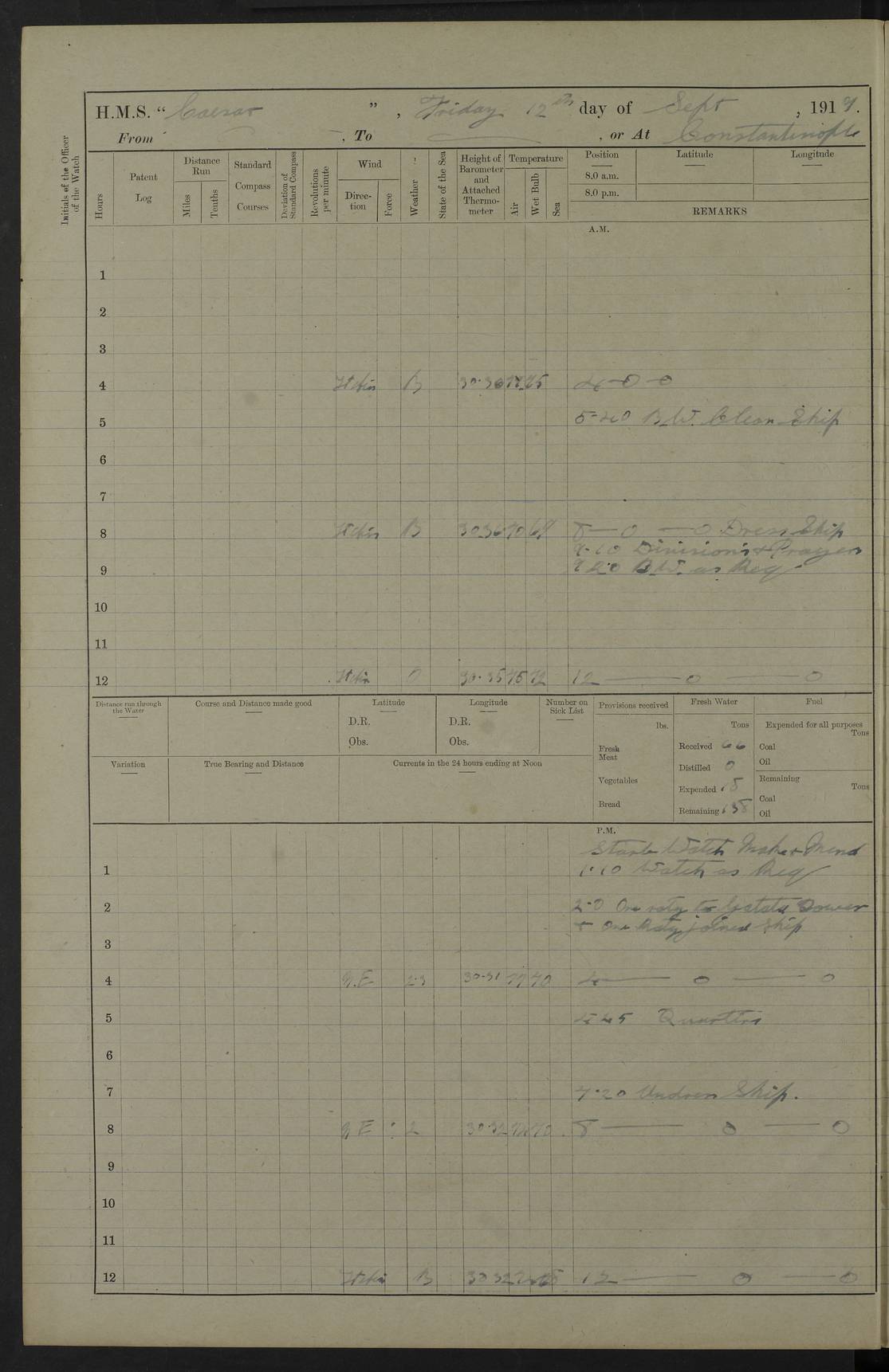 4edebb7b14d0450578000168: (https://s3.amazonaws.com:443/oldweather/ADM53-36589/0003_1.jpg) 1 November 1918 At Malta Lat 35.89, Long 14.52 [Somerset Wharf] 11.15am: Engineers Store Party returned on Board. 0.45pm: Paid Monthly Money. 1.0pm: Mr Goss, Gunner rejoined Ship from RN Hospital. 2.30pm: Gave Special leave to Port Watch untill 7.0am and Port Watch of Boys untill 6.0pm. Hands Made [sic] and Mend Clothes. 2.40pm: Landed liberty Men and Boys. 3.50pm: Provision Boat came alongside. 4.10pm: (4) Recovered Patients rejoined Ship from RN Hospital. 4.30pm: Landed liberty Men and Patrol. 6.0pm: Liberty Boys Returned on Board. 6.30pm: Canteen Party landed untill 10.0pm and Read Warrant No (24). 10.0pm: Canteen Party returned on Board. 11.50pm: Patrol returned on Board. [Provisions received: Fresh Meat 300 lbs, Vegetables 1000 lbs, Bread 450 lbs] 4edebb7c14d0450578000169: (https://s3.amazonaws.com:443/oldweather/ADM53-36589/0004_0.jpg) 2 November 1918 At Malta Lat 35.89, Long 14.52 [Hamilton Wharf] 7.15am: Shifted Berths from Somerset Wharf, to Hamilton Wharf. 8.0am: Tested life Buoys Correct. 8.45am: BW for x Told off Special Parties, Remainder of Hands employed as Requisite, and Landed Picket house Party. 9.10am: Held Court Martial on Board. 10.30am: Court Martial Finished. Noon: Picket House Party returned. 1.20pm: BW for x. Told off Special Parties. Remainder of Hands employed getting in Paymasters Stores and as Requisite. Lost overboard by accident Boat Hooks, Steel, Pattern (345), 2 in Number. 4.20pm: Hands to Fire Stations. 4.35pm: Read Warrant No 25 and gave Special leave to Starboard Watch untill 7.0am. 5.0pm: Landed liberty Men and Victualling Yard Lighter left Ship. 6.30pm: Canteen Party landed untill 10.0pm. [Provisions received: Fresh Meat 260 lbs, Bread 900 lbs] 4edebb7c14d045057800016a: (https://s3.amazonaws.com:443/oldweather/ADM53-36589/0004_1.jpg) 3 November 1918 At Malta Lat 35.89, Long 14.52 [Hamilton Wharf] 9.0am: Landed Church Parties, Wesleyans (14), Presbyterians (10). 9.30am: Divisions. 9.50am: Landed Roman Catholics (15). 10.10am: Discharged (5) Ratings to RN Hospital. 11.35am: All Church Parties returned on Board. 1.0pm: Gave Special leave to Port Watch untill 7.0am and Both Watches of Boys untill 5.30pm. 1.15pm: Landed liberty Men and Boys. 5.30pm: Liberty Boys returned on Board. 6.30pm: Canteen Party landed untill 10.0pm. 8.40pm: Closed B and C Doors. 10.0pm: Canteen Party returned on Board. [Number on sick list: 5] [Provisions received: Fresh Meat 280 lbs] 4edebb7c14d045057800016b: (https://s3.amazonaws.com:443/oldweather/ADM53-36589/0005_0.jpg) 4 November 1918 At Malta Lat 35.89, Long 14.52 [Hamilton Wharf] 6.50am: BW for x Told off Special Parties, remainder of Hands employed as Requisite. 7.0am: Liberty men returned on Board. 8.5am: Provision lighter came alongside. 8.10am: BW for x, Told off Special Parties, remainder of Hands employed Provisioning Ship and as requisite. 8.45am: Landed (1) Carpenter rating for Examination. 3.45pm: (2) Recovered Patients joined Ship from RN Hospital. 4.10pm: Received 8 Bags of Mails from Egmont, and Gave Special leave to Starboard Watch till 7.0am. 5.0pm: Landed Liberty Men and Patrol. 6.0pm: Hands employed getting in and stowing away Provisions. Midnight: Patrol returned on Board. [Weather fine, noon temperature 74F] 4edebb7c14d045057800016c: (https://s3.amazonaws.com:443/oldweather/ADM53-36589/0005_1.jpg) 5 November 1918 At Malta Lat 35.89, Long 14.52 [Hamilton Wharf] 6.45am: BW for x. Told off Special Parties. Remainder of Hands employed getting in and stowing away Provisions. 8.30am: Landed Hospital Party and Picket House Party. 11.0am: Landed (35) Rifles to Naval Ordinance for exchange. Noon: Picket House Party returned. 1.20pm: Landed (2) Ratings for Dental Treatment. 2.25pm: (35) Exchanged Rifles came on Board. 3.40pm: (2) Recovered Patients rejoined Ship from RN Hospital and disinfected Bedding. 4.0pm: Gave Special leave to Port Watch untill 7.0am. Starboard Watch employed stowing Provisions. 4.30pm: Landed Liberty men. Starboard Watch employed stowing away Provisions and Read Warrant No (26). [Provisions received: Fresh Meat 530 lbs, Bread 1000 lbs] 4edebb7c14d045057800016d: (https://s3.amazonaws.com:443/oldweather/ADM53-36589/0006_0.jpg) 6 November 1918 At Malta Lat 35.89, Long 14.52 [Hamilton Wharf] 6.50am: BW for x. Told off Special Parties, Remainder of Port Watch stowing Provisions, Starboard Watch drawing Quarter Deck Awning. 9.0am: Hands employed Provisioning Ship. 4.0pm: Gave Special leave to Starboard Watch untill 7.0am. 4.30pm: Landed liberty Men. Port Watch employed stowing away Provisions. 6.30pm: Canteen Party landed until 10.0pm. 10.0pm: Canteen Party returned on Board. [Number on sick list: 5] [Provisions received: Fresh Meat 250 lbs, Vegetables 1000 lbs, Bread 450 lbs] [Fuel Remaining: Coal 244 tons, Oil 332 tons] 4edebb7c14d045057800016e: (https://s3.amazonaws.com:443/oldweather/ADM53-36589/0006_1.jpg) 7 November 1918 At Malta Lat 35.89, Long 14.52 [No 4 Buoy] 6.30am: BW for x. Told off Special Parties. Remainder of Hands employed prepairing [preparing] Ship to Shift Berths, from Hamilton Wharf to No 4 Buoy. 7.0am: Liberty men returned on Board. 8.50am: Secured Ship to No 4 Buoy and Coal Lighters came alongside. 9.10am: Commenced Coaling Native labour. Hands employed Drawing Stores and as Requisite. 11.50am: Dockyard Parties returned. 1.40pm: BW for x Told off Special Parties, remainder of Hands employed as Requisite. 4.30pm: Gave Special leave to Port Watch untill 7.0am. 4.45pm: Landed liberty men and Patrol and Read Warrant No (27). 7.30pm: Completed Coaling (1481) Tons. 8.40pm: Watch employed sweeping down. 11.50pm: Patrol returned on Board. [Number on sick list: 6] [Provisions received: Fresh Meat 280 lbs, Bread 300 lbs] [Fuel Remaining: Coal 1716 tons, Oil 332 tons] 4edebb7c14d045057800016f: (https://s3.amazonaws.com:443/oldweather/ADM53-36589/0007_0.jpg) 8 November 1918 At Malta Lat 35.89, Long 