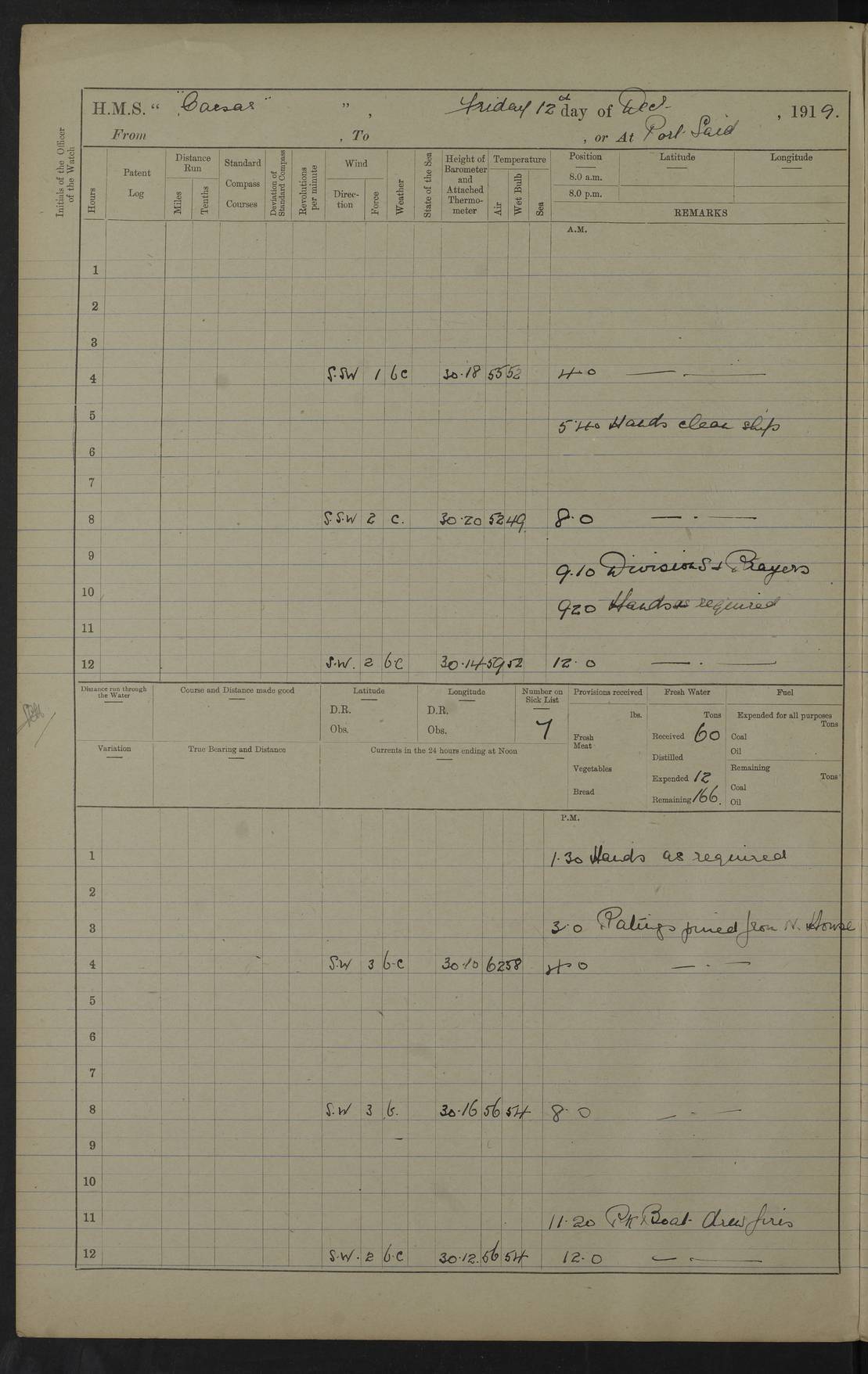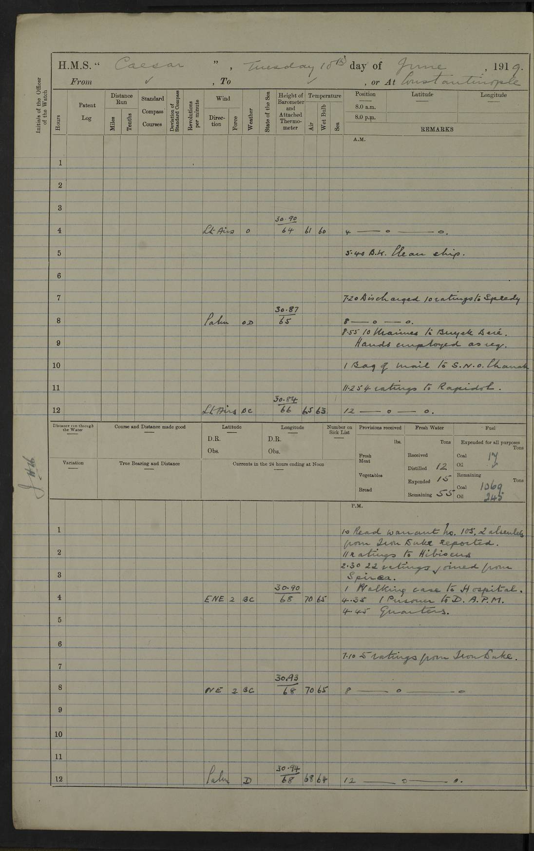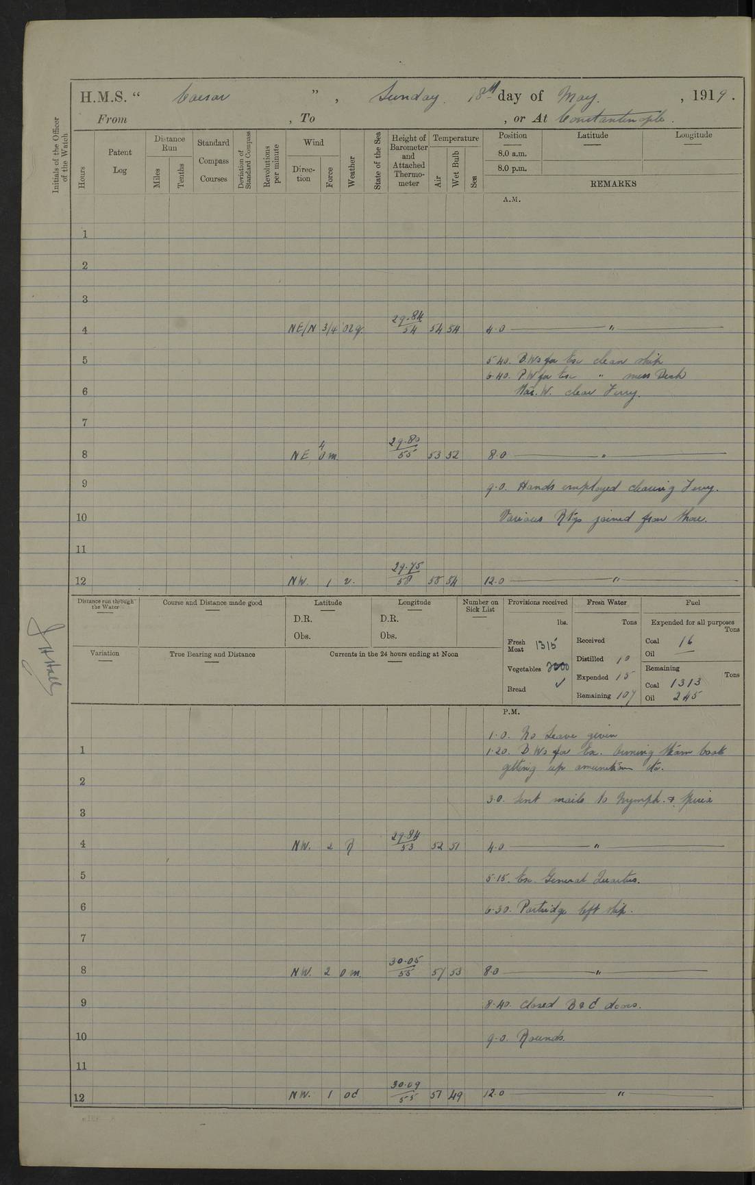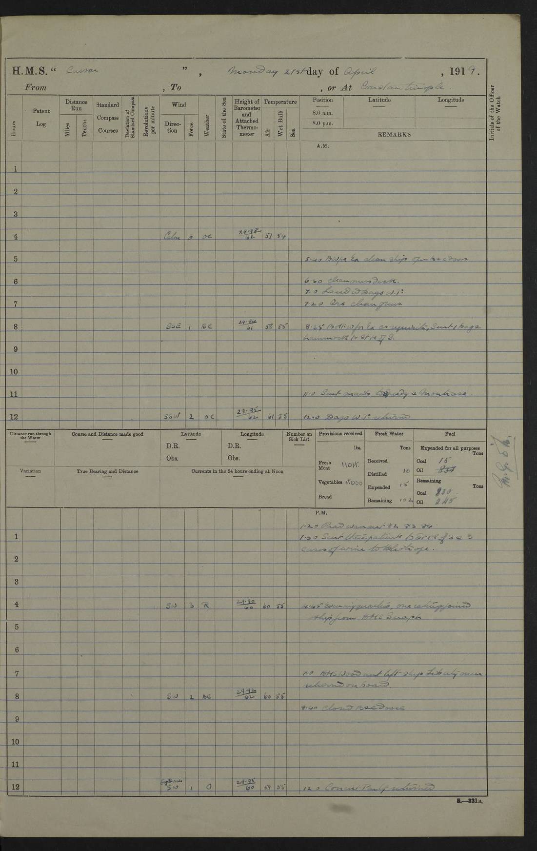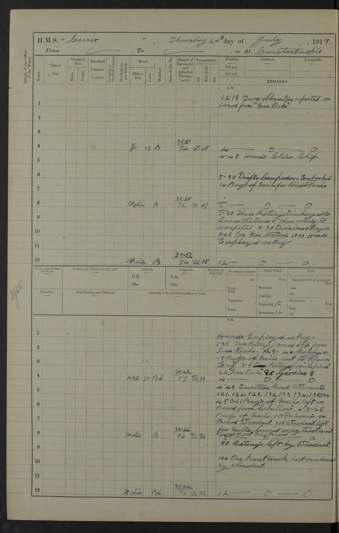 4edebb7b14d0450578000168: (https://s3.amazonaws.com:443/oldweather/ADM53-36589/0003_1.jpg) 1 November 1918 At Malta Lat 35.89, Long 14.52 [Somerset Wharf] 11.15am: Engineers Store Party returned on Board. 0.45pm: Paid Monthly Money. 1.0pm: Mr Goss, Gunner rejoined Ship from RN Hospital. 2.30pm: Gave Special leave to Port Watch untill 7.0am and Port Watch of Boys untill 6.0pm. Hands Made [sic] and Mend Clothes. 2.40pm: Landed liberty Men and Boys. 3.50pm: Provision Boat came alongside. 4.10pm: (4) Recovered Patients rejoined Ship from RN Hospital. 4.30pm: Landed liberty Men and Patrol. 6.0pm: Liberty Boys Returned on Board. 6.30pm: Canteen Party landed untill 10.0pm and Read Warrant No (24). 10.0pm: Canteen Party returned on Board. 11.50pm: Patrol returned on Board. [Provisions received: Fresh Meat 300 lbs, Vegetables 1000 lbs, Bread 450 lbs] 4edebb7c14d0450578000169: (https://s3.amazonaws.com:443/oldweather/ADM53-36589/0004_0.jpg) 2 November 1918 At Malta Lat 35.89, Long 14.52 [Hamilton Wharf] 7.15am: Shifted Berths from Somerset Wharf, to Hamilton Wharf. 8.0am: Tested life Buoys Correct. 8.45am: BW for x Told off Special Parties, Remainder of Hands employed as Requisite, and Landed Picket house Party. 9.10am: Held Court Martial on Board. 10.30am: Court Martial Finished. Noon: Picket House Party returned. 1.20pm: BW for x. Told off Special Parties. Remainder of Hands employed getting in Paymasters Stores and as Requisite. Lost overboard by accident Boat Hooks, Steel, Pattern (345), 2 in Number. 4.20pm: Hands to Fire Stations. 4.35pm: Read Warrant No 25 and gave Special leave to Starboard Watch untill 7.0am. 5.0pm: Landed liberty Men and Victualling Yard Lighter left Ship. 6.30pm: Canteen Party landed untill 10.0pm. [Provisions received: Fresh Meat 260 lbs, Bread 900 lbs] 4edebb7c14d045057800016a: (https://s3.amazonaws.com:443/oldweather/ADM53-36589/0004_1.jpg) 3 November 1918 At Malta Lat 35.89, Long 14.52 [Hamilton Wharf] 9.0am: Landed Church Parties, Wesleyans (14), Presbyterians (10). 9.30am: Divisions. 9.50am: Landed Roman Catholics (15). 10.10am: Discharged (5) Ratings to RN Hospital. 11.35am: All Church Parties returned on Board. 1.0pm: Gave Special leave to Port Watch untill 7.0am and Both Watches of Boys untill 5.30pm. 1.15pm: Landed liberty Men and Boys. 5.30pm: Liberty Boys returned on Board. 6.30pm: Canteen Party landed untill 10.0pm. 8.40pm: Closed B and C Doors. 10.0pm: Canteen Party returned on Board. [Number on sick list: 5] [Provisions received: Fresh Meat 280 lbs] 4edebb7c14d045057800016b: (https://s3.amazonaws.com:443/oldweather/ADM53-36589/0005_0.jpg) 4 November 1918 At Malta Lat 35.89, Long 14.52 [Hamilton Wharf] 6.50am: BW for x Told off Special Parties, remainder of Hands employed as Requisite. 7.0am: Liberty men returned on Board. 8.5am: Provision lighter came alongside. 8.10am: BW for x, Told off Special Parties, remainder of Hands employed Provisioning Ship and as requisite. 8.45am: Landed (1) Carpenter rating for Examination. 3.45pm: (2) Recovered Patients joined Ship from RN Hospital. 4.10pm: Received 8 Bags of Mails from Egmont, and Gave Special leave to Starboard Watch till 7.0am. 5.0pm: Landed Liberty Men and Patrol. 6.0pm: Hands employed getting in and stowing away Provisions. Midnight: Patrol returned on Board. [Weather fine, noon temperature 74F] 4edebb7c14d045057800016c: (https://s3.amazonaws.com:443/oldweather/ADM53-36589/0005_1.jpg) 5 November 1918 At Malta Lat 35.89, Long 14.52 [Hamilton Wharf] 6.45am: BW for x. Told off Special Parties. Remainder of Hands employed getting in and stowing away Provisions. 8.30am: Landed Hospital Party and Picket House Party. 11.0am: Landed (35) Rifles to Naval Ordinance for exchange. Noon: Picket House Party returned. 1.20pm: Landed (2) Ratings for Dental Treatment. 2.25pm: (35) Exchanged Rifles came on Board. 3.40pm: (2) Recovered Patients rejoined Ship from RN Hospital and disinfected Bedding. 4.0pm: Gave Special leave to Port Watch untill 7.0am. Starboard Watch employed stowing Provisions. 4.30pm: Landed Liberty men. Starboard Watch employed stowing away Provisions and Read Warrant No (26). [Provisions received: Fresh Meat 530 lbs, Bread 1000 lbs] 4edebb7c14d045057800016d: (https://s3.amazonaws.com:443/oldweather/ADM53-36589/0006_0.jpg) 6 November 1918 At Malta Lat 35.89, Long 14.52 [Hamilton Wharf] 6.50am: BW for x. Told off Special Parties, Remainder of Port Watch stowing Provisions, Starboard Watch drawing Quarter Deck Awning. 9.0am: Hands employed Provisioning Ship. 4.0pm: Gave Special leave to Starboard Watch untill 7.0am. 4.30pm: Landed liberty Men. Port Watch employed stowing away Provisions. 6.30pm: Canteen Party landed until 10.0pm. 10.0pm: Canteen Party returned on Board. [Number on sick list: 5] [Provisions received: Fresh Meat 250 lbs, Vegetables 1000 lbs, Bread 450 lbs] [Fuel Remaining: Coal 244 tons, Oil 332 tons] 4edebb7c14d045057800016e: (https://s3.amazonaws.com:443/oldweather/ADM53-36589/0006_1.jpg) 7 November 1918 At Malta Lat 35.89, Long 14.52 [No 4 Buoy] 6.30am: BW for x. Told off Special Parties. Remainder of Hands employed prepairing [preparing] Ship to Shift Berths, from Hamilton Wharf to No 4 Buoy. 7.0am: Liberty men returned on Board. 8.50am: Secured Ship to No 4 Buoy and Coal Lighters came alongside. 9.10am: Commenced Coaling Native labour. Hands employed Drawing Stores and as Requisite. 11.50am: Dockyard Parties returned. 1.40pm: BW for x Told off Special Parties, remainder of Hands employed as Requisite. 4.30pm: Gave Special leave to Port Watch untill 7.0am. 4.45pm: Landed liberty men and Patrol and Read Warrant No (27). 7.30pm: Completed Coaling (1481) Tons. 8.40pm: Watch employed sweeping down. 11.50pm: Patrol returned on Board. [Number on sick list: 6] [Provisions received: Fresh Meat 280 lbs, Bread 300 lbs] [Fuel Remaining: Coal 1716 tons, Oil 332 tons] 4edebb7c14d045057800016f: (https://s3.amazonaws.com:443/oldweather/ADM53-36589/0007_0.jpg) 8 November 1918 At Malta Lat 35.89, Long 