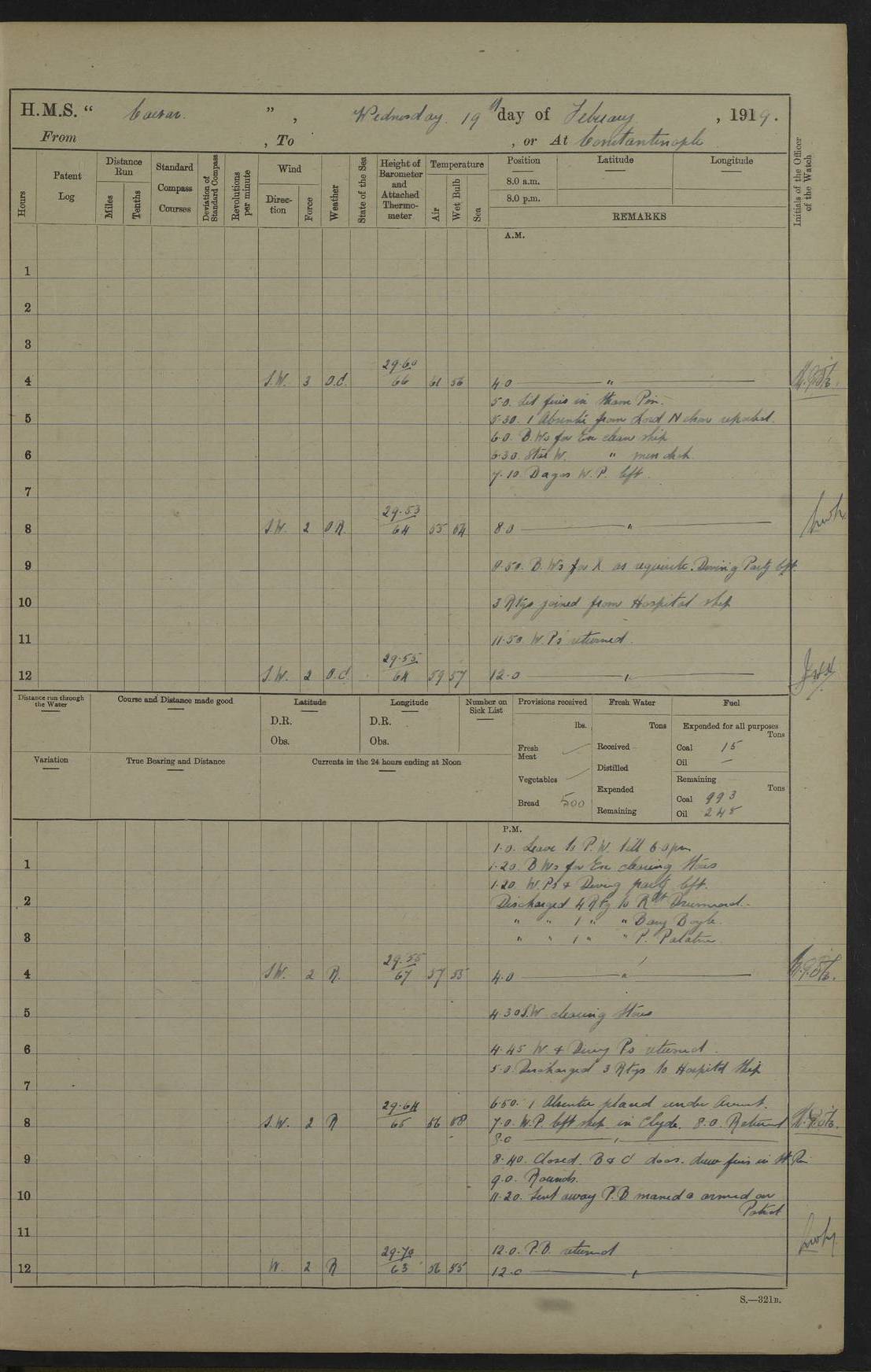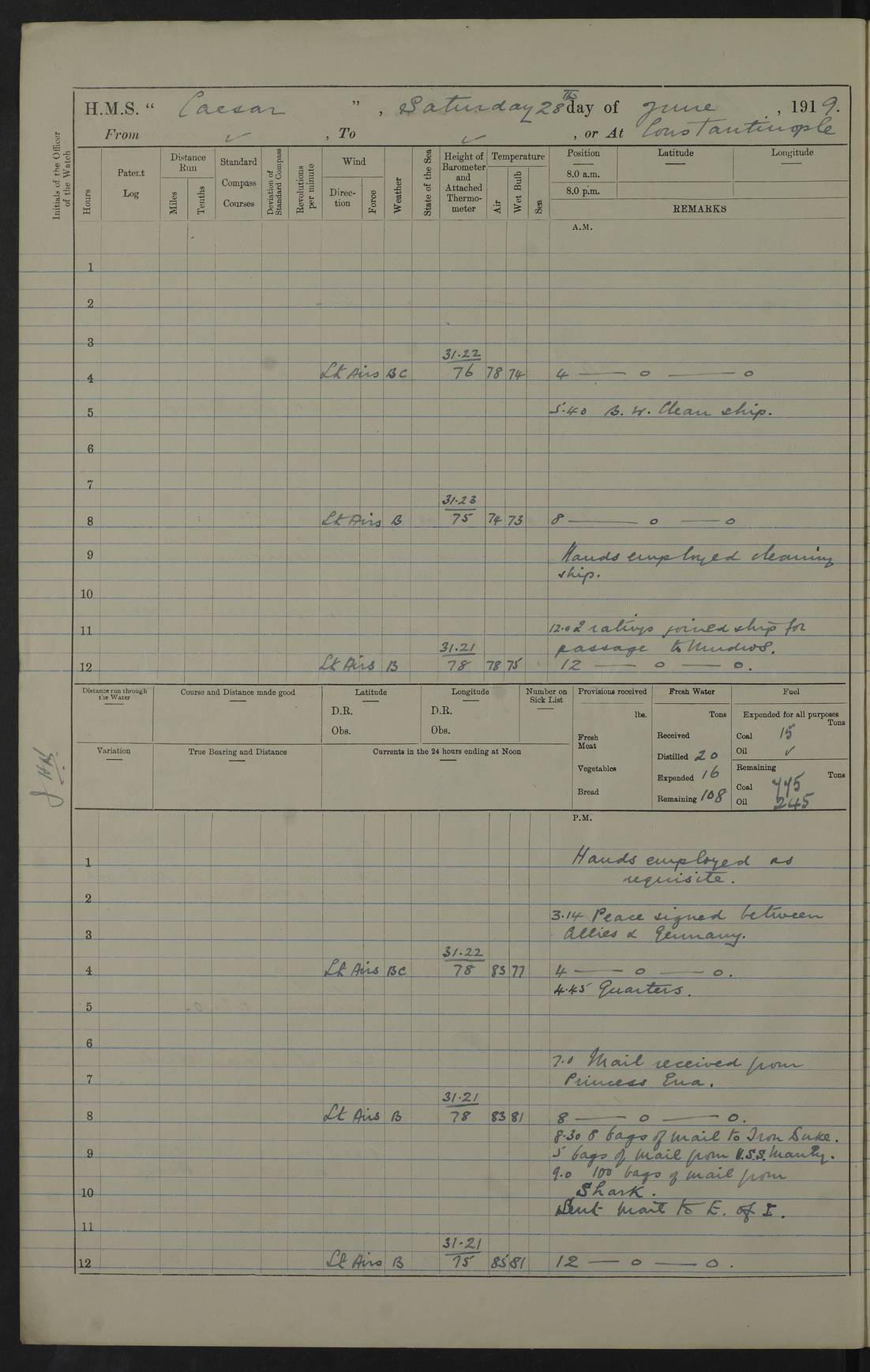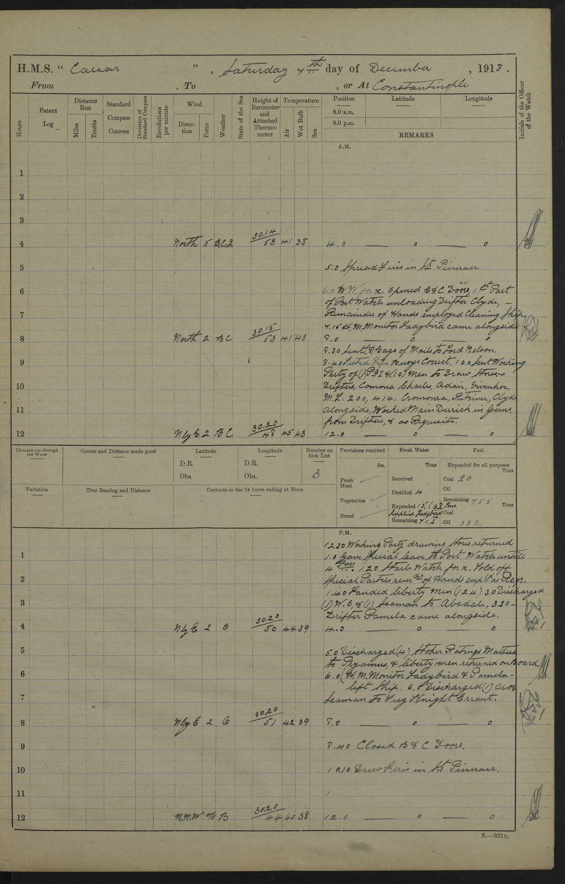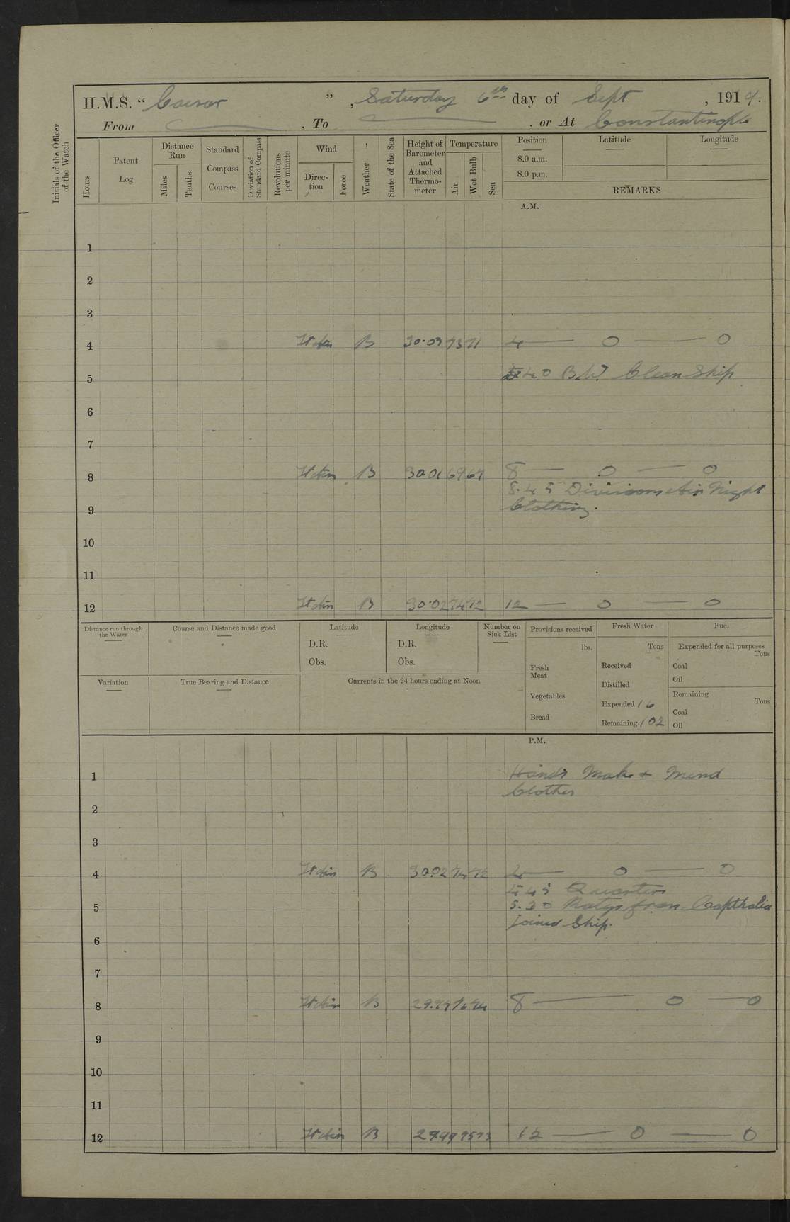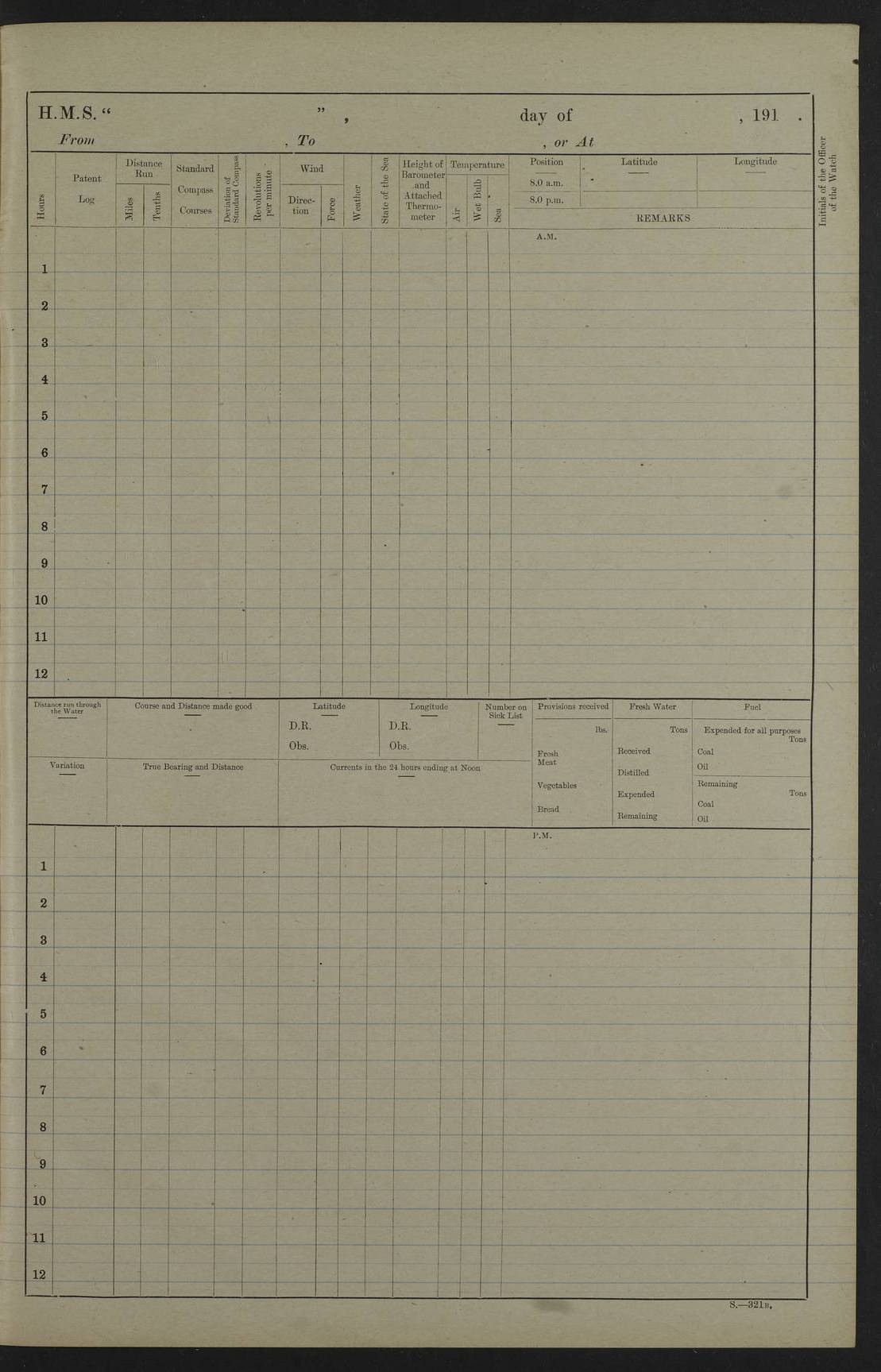 4edebb7b14d0450578000168: (https://s3.amazonaws.com:443/oldweather/ADM53-36589/0003_1.jpg) 1 November 1918 At Malta Lat 35.89, Long 14.52 [Somerset Wharf] 11.15am: Engineers Store Party returned on Board. 0.45pm: Paid Monthly Money. 1.0pm: Mr Goss, Gunner rejoined Ship from RN Hospital. 2.30pm: Gave Special leave to Port Watch untill 7.0am and Port Watch of Boys untill 6.0pm. Hands Made [sic] and Mend Clothes. 2.40pm: Landed liberty Men and Boys. 3.50pm: Provision Boat came alongside. 4.10pm: (4) Recovered Patients rejoined Ship from RN Hospital. 4.30pm: Landed liberty Men and Patrol. 6.0pm: Liberty Boys Returned on Board. 6.30pm: Canteen Party landed untill 10.0pm and Read Warrant No (24). 10.0pm: Canteen Party returned on Board. 11.50pm: Patrol returned on Board. [Provisions received: Fresh Meat 300 lbs, Vegetables 1000 lbs, Bread 450 lbs] 4edebb7c14d0450578000169: (https://s3.amazonaws.com:443/oldweather/ADM53-36589/0004_0.jpg) 2 November 1918 At Malta Lat 35.89, Long 14.52 [Hamilton Wharf] 7.15am: Shifted Berths from Somerset Wharf, to Hamilton Wharf. 8.0am: Tested life Buoys Correct. 8.45am: BW for x Told off Special Parties, Remainder of Hands employed as Requisite, and Landed Picket house Party. 9.10am: Held Court Martial on Board. 10.30am: Court Martial Finished. Noon: Picket House Party returned. 1.20pm: BW for x. Told off Special Parties. Remainder of Hands employed getting in Paymasters Stores and as Requisite. Lost overboard by accident Boat Hooks, Steel, Pattern (345), 2 in Number. 4.20pm: Hands to Fire Stations. 4.35pm: Read Warrant No 25 and gave Special leave to Starboard Watch untill 7.0am. 5.0pm: Landed liberty Men and Victualling Yard Lighter left Ship. 6.30pm: Canteen Party landed untill 10.0pm. [Provisions received: Fresh Meat 260 lbs, Bread 900 lbs] 4edebb7c14d045057800016a: (https://s3.amazonaws.com:443/oldweather/ADM53-36589/0004_1.jpg) 3 November 1918 At Malta Lat 35.89, Long 14.52 [Hamilton Wharf] 9.0am: Landed Church Parties, Wesleyans (14), Presbyterians (10). 9.30am: Divisions. 9.50am: Landed Roman Catholics (15). 10.10am: Discharged (5) Ratings to RN Hospital. 11.35am: All Church Parties returned on Board. 1.0pm: Gave Special leave to Port Watch untill 7.0am and Both Watches of Boys untill 5.30pm. 1.15pm: Landed liberty Men and Boys. 5.30pm: Liberty Boys returned on Board. 6.30pm: Canteen Party landed untill 10.0pm. 8.40pm: Closed B and C Doors. 10.0pm: Canteen Party returned on Board. [Number on sick list: 5] [Provisions received: Fresh Meat 280 lbs] 4edebb7c14d045057800016b: (https://s3.amazonaws.com:443/oldweather/ADM53-36589/0005_0.jpg) 4 November 1918 At Malta Lat 35.89, Long 14.52 [Hamilton Wharf] 6.50am: BW for x Told off Special Parties, remainder of Hands employed as Requisite. 7.0am: Liberty men returned on Board. 8.5am: Provision lighter came alongside. 8.10am: BW for x, Told off Special Parties, remainder of Hands employed Provisioning Ship and as requisite. 8.45am: Landed (1) Carpenter rating for Examination. 3.45pm: (2) Recovered Patients joined Ship from RN Hospital. 4.10pm: Received 8 Bags of Mails from Egmont, and Gave Special leave to Starboard Watch till 7.0am. 5.0pm: Landed Liberty Men and Patrol. 6.0pm: Hands employed getting in and stowing away Provisions. Midnight: Patrol returned on Board. [Weather fine, noon temperature 74F] 4edebb7c14d045057800016c: (https://s3.amazonaws.com:443/oldweather/ADM53-36589/0005_1.jpg) 5 November 1918 At Malta Lat 35.89, Long 14.52 [Hamilton Wharf] 6.45am: BW for x. Told off Special Parties. Remainder of Hands employed getting in and stowing away Provisions. 8.30am: Landed Hospital Party and Picket House Party. 11.0am: Landed (35) Rifles to Naval Ordinance for exchange. Noon: Picket House Party returned. 1.20pm: Landed (2) Ratings for Dental Treatment. 2.25pm: (35) Exchanged Rifles came on Board. 3.40pm: (2) Recovered Patients rejoined Ship from RN Hospital and disinfected Bedding. 4.0pm: Gave Special leave to Port Watch untill 7.0am. Starboard Watch employed stowing Provisions. 4.30pm: Landed Liberty men. Starboard Watch employed stowing away Provisions and Read Warrant No (26). [Provisions received: Fresh Meat 530 lbs, Bread 1000 lbs] 4edebb7c14d045057800016d: (https://s3.amazonaws.com:443/oldweather/ADM53-36589/0006_0.jpg) 6 November 1918 At Malta Lat 35.89, Long 14.52 [Hamilton Wharf] 6.50am: BW for x. Told off Special Parties, Remainder of Port Watch stowing Provisions, Starboard Watch drawing Quarter Deck Awning. 9.0am: Hands employed Provisioning Ship. 4.0pm: Gave Special leave to Starboard Watch untill 7.0am. 4.30pm: Landed liberty Men. Port Watch employed stowing away Provisions. 6.30pm: Canteen Party landed until 10.0pm. 10.0pm: Canteen Party returned on Board. [Number on sick list: 5] [Provisions received: Fresh Meat 250 lbs, Vegetables 1000 lbs, Bread 450 lbs] [Fuel Remaining: Coal 244 tons, Oil 332 tons] 4edebb7c14d045057800016e: (https://s3.amazonaws.com:443/oldweather/ADM53-36589/0006_1.jpg) 7 November 1918 At Malta Lat 35.89, Long 14.52 [No 4 Buoy] 6.30am: BW for x. Told off Special Parties. Remainder of Hands employed prepairing [preparing] Ship to Shift Berths, from Hamilton Wharf to No 4 Buoy. 7.0am: Liberty men returned on Board. 8.50am: Secured Ship to No 4 Buoy and Coal Lighters came alongside. 9.10am: Commenced Coaling Native labour. Hands employed Drawing Stores and as Requisite. 11.50am: Dockyard Parties returned. 1.40pm: BW for x Told off Special Parties, remainder of Hands employed as Requisite. 4.30pm: Gave Special leave to Port Watch untill 7.0am. 4.45pm: Landed liberty men and Patrol and Read Warrant No (27). 7.30pm: Completed Coaling (1481) Tons. 8.40pm: Watch employed sweeping down. 11.50pm: Patrol returned on Board. [Number on sick list: 6] [Provisions received: Fresh Meat 280 lbs, Bread 300 lbs] [Fuel Remaining: Coal 1716 tons, Oil 332 tons] 4edebb7c14d045057800016f: (https://s3.amazonaws.com:443/oldweather/ADM53-36589/0007_0.jpg) 8 November 1918 At Malta Lat 35.89, Long 