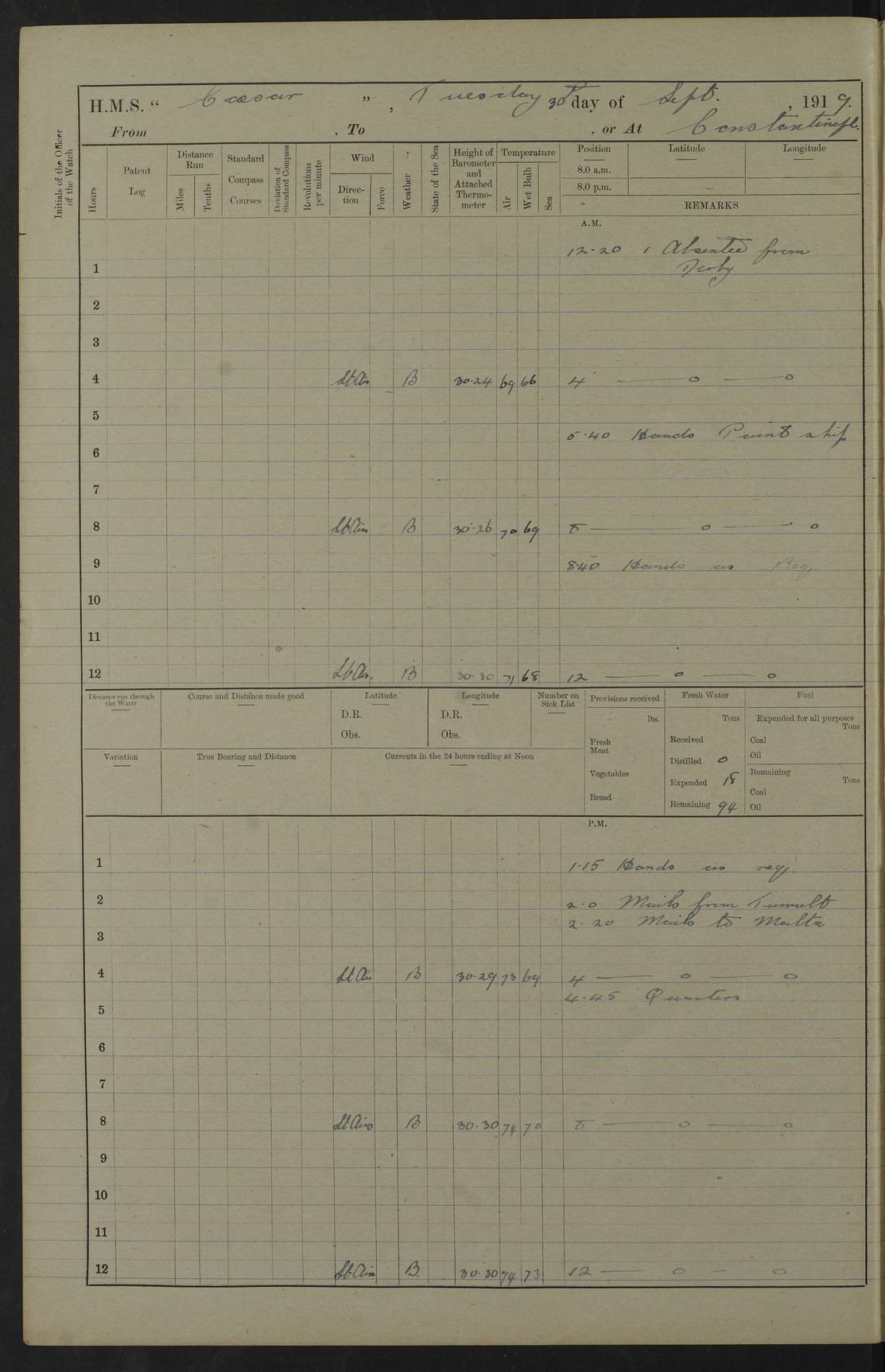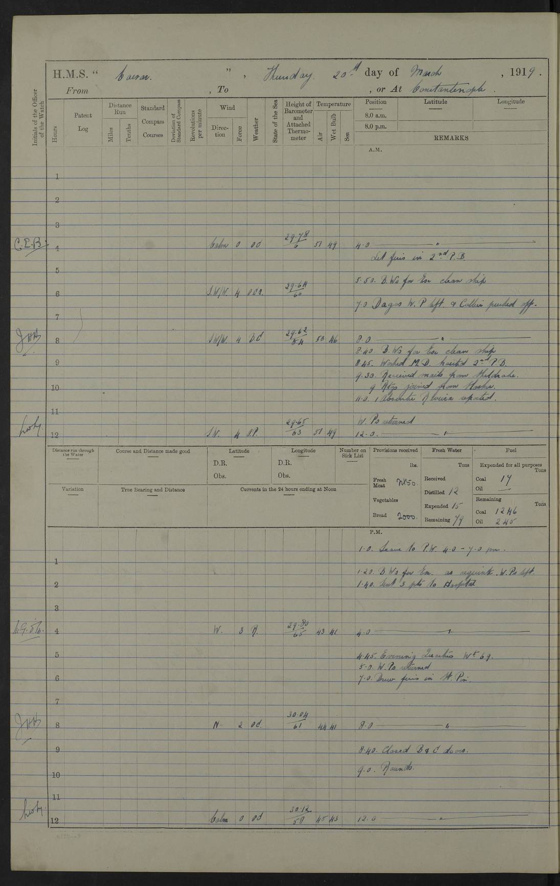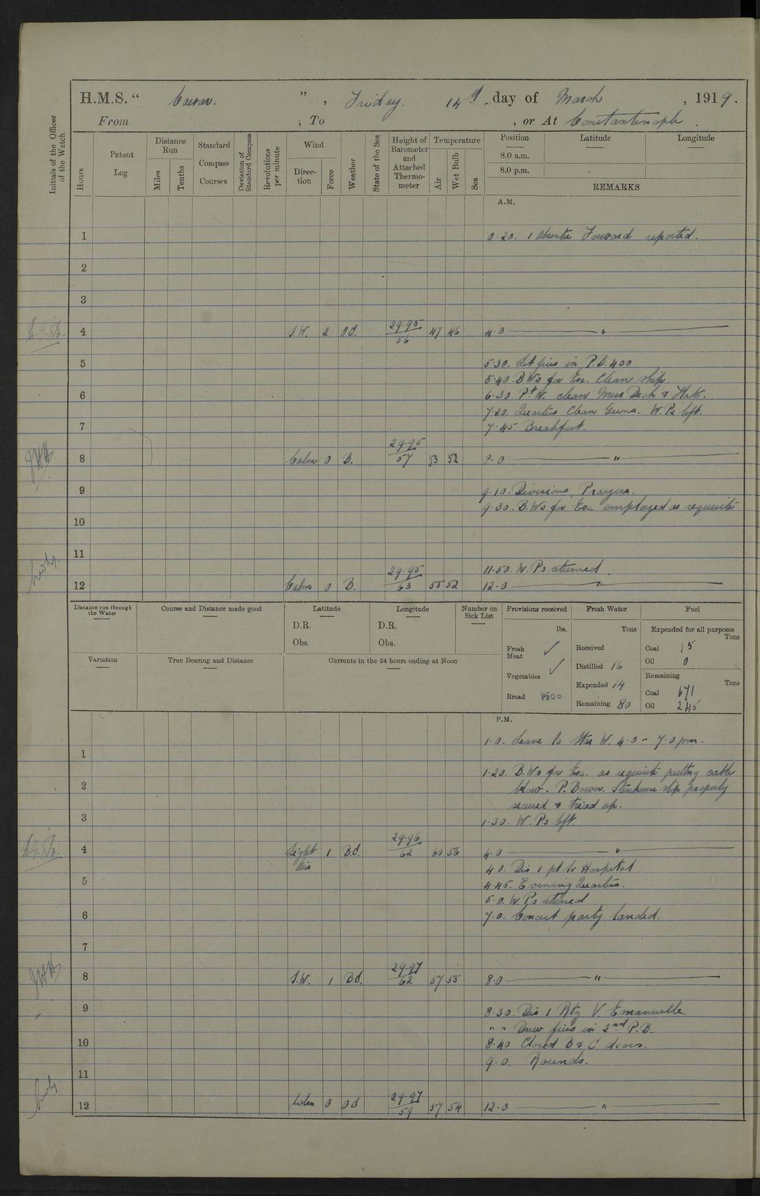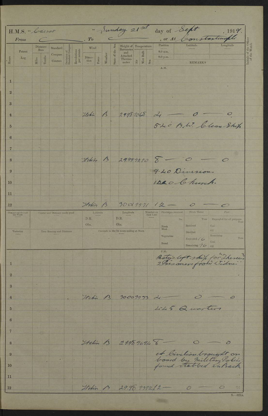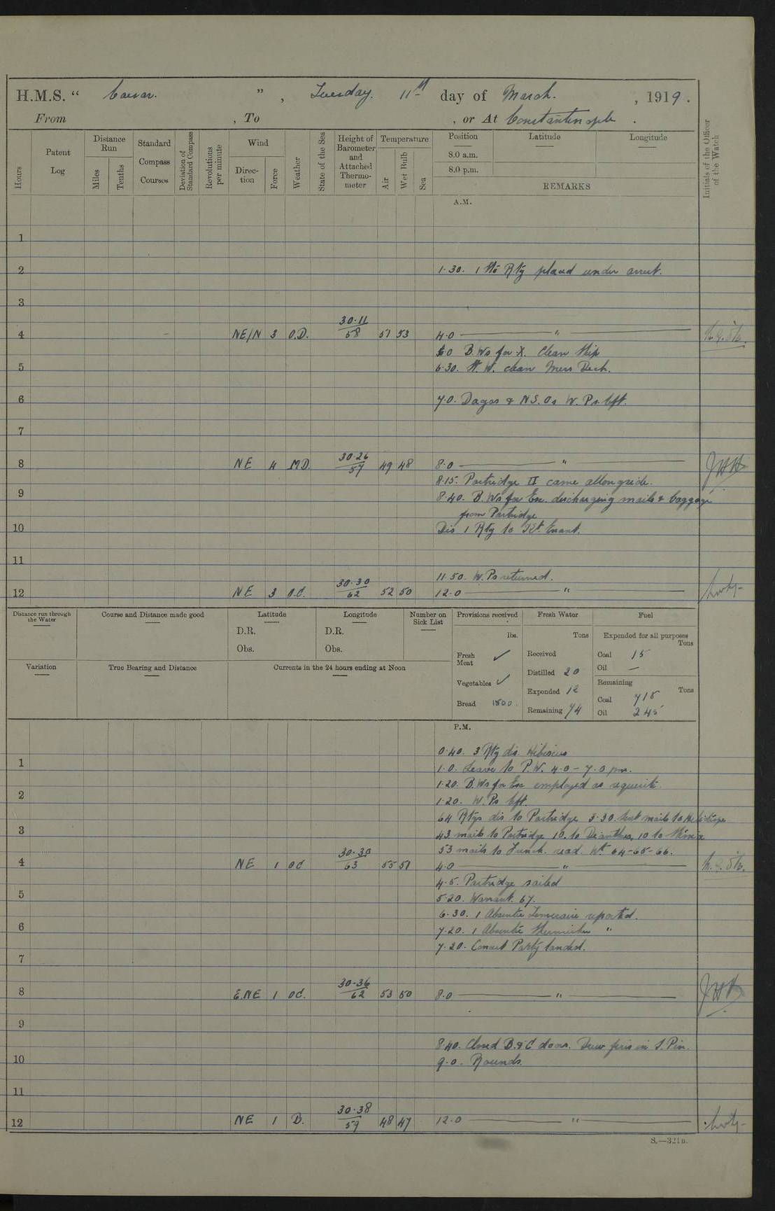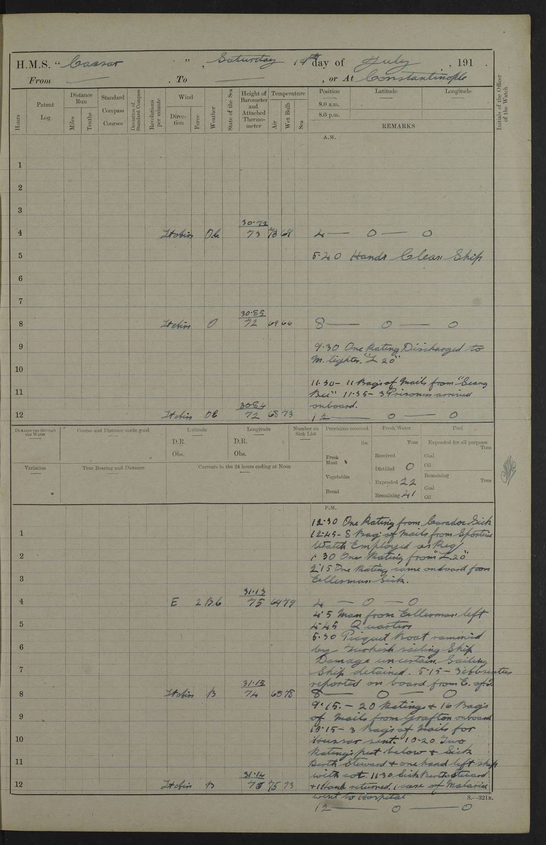 4edebb7b14d0450578000168: (https://s3.amazonaws.com:443/oldweather/ADM53-36589/0003_1.jpg) 1 November 1918 At Malta Lat 35.89, Long 14.52 [Somerset Wharf] 11.15am: Engineers Store Party returned on Board. 0.45pm: Paid Monthly Money. 1.0pm: Mr Goss, Gunner rejoined Ship from RN Hospital. 2.30pm: Gave Special leave to Port Watch untill 7.0am and Port Watch of Boys untill 6.0pm. Hands Made [sic] and Mend Clothes. 2.40pm: Landed liberty Men and Boys. 3.50pm: Provision Boat came alongside. 4.10pm: (4) Recovered Patients rejoined Ship from RN Hospital. 4.30pm: Landed liberty Men and Patrol. 6.0pm: Liberty Boys Returned on Board. 6.30pm: Canteen Party landed untill 10.0pm and Read Warrant No (24). 10.0pm: Canteen Party returned on Board. 11.50pm: Patrol returned on Board. [Provisions received: Fresh Meat 300 lbs, Vegetables 1000 lbs, Bread 450 lbs] 4edebb7c14d0450578000169: (https://s3.amazonaws.com:443/oldweather/ADM53-36589/0004_0.jpg) 2 November 1918 At Malta Lat 35.89, Long 14.52 [Hamilton Wharf] 7.15am: Shifted Berths from Somerset Wharf, to Hamilton Wharf. 8.0am: Tested life Buoys Correct. 8.45am: BW for x Told off Special Parties, Remainder of Hands employed as Requisite, and Landed Picket house Party. 9.10am: Held Court Martial on Board. 10.30am: Court Martial Finished. Noon: Picket House Party returned. 1.20pm: BW for x. Told off Special Parties. Remainder of Hands employed getting in Paymasters Stores and as Requisite. Lost overboard by accident Boat Hooks, Steel, Pattern (345), 2 in Number. 4.20pm: Hands to Fire Stations. 4.35pm: Read Warrant No 25 and gave Special leave to Starboard Watch untill 7.0am. 5.0pm: Landed liberty Men and Victualling Yard Lighter left Ship. 6.30pm: Canteen Party landed untill 10.0pm. [Provisions received: Fresh Meat 260 lbs, Bread 900 lbs] 4edebb7c14d045057800016a: (https://s3.amazonaws.com:443/oldweather/ADM53-36589/0004_1.jpg) 3 November 1918 At Malta Lat 35.89, Long 14.52 [Hamilton Wharf] 9.0am: Landed Church Parties, Wesleyans (14), Presbyterians (10). 9.30am: Divisions. 9.50am: Landed Roman Catholics (15). 10.10am: Discharged (5) Ratings to RN Hospital. 11.35am: All Church Parties returned on Board. 1.0pm: Gave Special leave to Port Watch untill 7.0am and Both Watches of Boys untill 5.30pm. 1.15pm: Landed liberty Men and Boys. 5.30pm: Liberty Boys returned on Board. 6.30pm: Canteen Party landed untill 10.0pm. 8.40pm: Closed B and C Doors. 10.0pm: Canteen Party returned on Board. [Number on sick list: 5] [Provisions received: Fresh Meat 280 lbs] 4edebb7c14d045057800016b: (https://s3.amazonaws.com:443/oldweather/ADM53-36589/0005_0.jpg) 4 November 1918 At Malta Lat 35.89, Long 14.52 [Hamilton Wharf] 6.50am: BW for x Told off Special Parties, remainder of Hands employed as Requisite. 7.0am: Liberty men returned on Board. 8.5am: Provision lighter came alongside. 8.10am: BW for x, Told off Special Parties, remainder of Hands employed Provisioning Ship and as requisite. 8.45am: Landed (1) Carpenter rating for Examination. 3.45pm: (2) Recovered Patients joined Ship from RN Hospital. 4.10pm: Received 8 Bags of Mails from Egmont, and Gave Special leave to Starboard Watch till 7.0am. 5.0pm: Landed Liberty Men and Patrol. 6.0pm: Hands employed getting in and stowing away Provisions. Midnight: Patrol returned on Board. [Weather fine, noon temperature 74F] 4edebb7c14d045057800016c: (https://s3.amazonaws.com:443/oldweather/ADM53-36589/0005_1.jpg) 5 November 1918 At Malta Lat 35.89, Long 14.52 [Hamilton Wharf] 6.45am: BW for x. Told off Special Parties. Remainder of Hands employed getting in and stowing away Provisions. 8.30am: Landed Hospital Party and Picket House Party. 11.0am: Landed (35) Rifles to Naval Ordinance for exchange. Noon: Picket House Party returned. 1.20pm: Landed (2) Ratings for Dental Treatment. 2.25pm: (35) Exchanged Rifles came on Board. 3.40pm: (2) Recovered Patients rejoined Ship from RN Hospital and disinfected Bedding. 4.0pm: Gave Special leave to Port Watch untill 7.0am. Starboard Watch employed stowing Provisions. 4.30pm: Landed Liberty men. Starboard Watch employed stowing away Provisions and Read Warrant No (26). [Provisions received: Fresh Meat 530 lbs, Bread 1000 lbs] 4edebb7c14d045057800016d: (https://s3.amazonaws.com:443/oldweather/ADM53-36589/0006_0.jpg) 6 November 1918 At Malta Lat 35.89, Long 14.52 [Hamilton Wharf] 6.50am: BW for x. Told off Special Parties, Remainder of Port Watch stowing Provisions, Starboard Watch drawing Quarter Deck Awning. 9.0am: Hands employed Provisioning Ship. 4.0pm: Gave Special leave to Starboard Watch untill 7.0am. 4.30pm: Landed liberty Men. Port Watch employed stowing away Provisions. 6.30pm: Canteen Party landed until 10.0pm. 10.0pm: Canteen Party returned on Board. [Number on sick list: 5] [Provisions received: Fresh Meat 250 lbs, Vegetables 1000 lbs, Bread 450 lbs] [Fuel Remaining: Coal 244 tons, Oil 332 tons] 4edebb7c14d045057800016e: (https://s3.amazonaws.com:443/oldweather/ADM53-36589/0006_1.jpg) 7 November 1918 At Malta Lat 35.89, Long 14.52 [No 4 Buoy] 6.30am: BW for x. Told off Special Parties. Remainder of Hands employed prepairing [preparing] Ship to Shift Berths, from Hamilton Wharf to No 4 Buoy. 7.0am: Liberty men returned on Board. 8.50am: Secured Ship to No 4 Buoy and Coal Lighters came alongside. 9.10am: Commenced Coaling Native labour. Hands employed Drawing Stores and as Requisite. 11.50am: Dockyard Parties returned. 1.40pm: BW for x Told off Special Parties, remainder of Hands employed as Requisite. 4.30pm: Gave Special leave to Port Watch untill 7.0am. 4.45pm: Landed liberty men and Patrol and Read Warrant No (27). 7.30pm: Completed Coaling (1481) Tons. 8.40pm: Watch employed sweeping down. 11.50pm: Patrol returned on Board. [Number on sick list: 6] [Provisions received: Fresh Meat 280 lbs, Bread 300 lbs] [Fuel Remaining: Coal 1716 tons, Oil 332 tons] 4edebb7c14d045057800016f: (https://s3.amazonaws.com:443/oldweather/ADM53-36589/0007_0.jpg) 8 November 1918 At Malta Lat 35.89, Long 