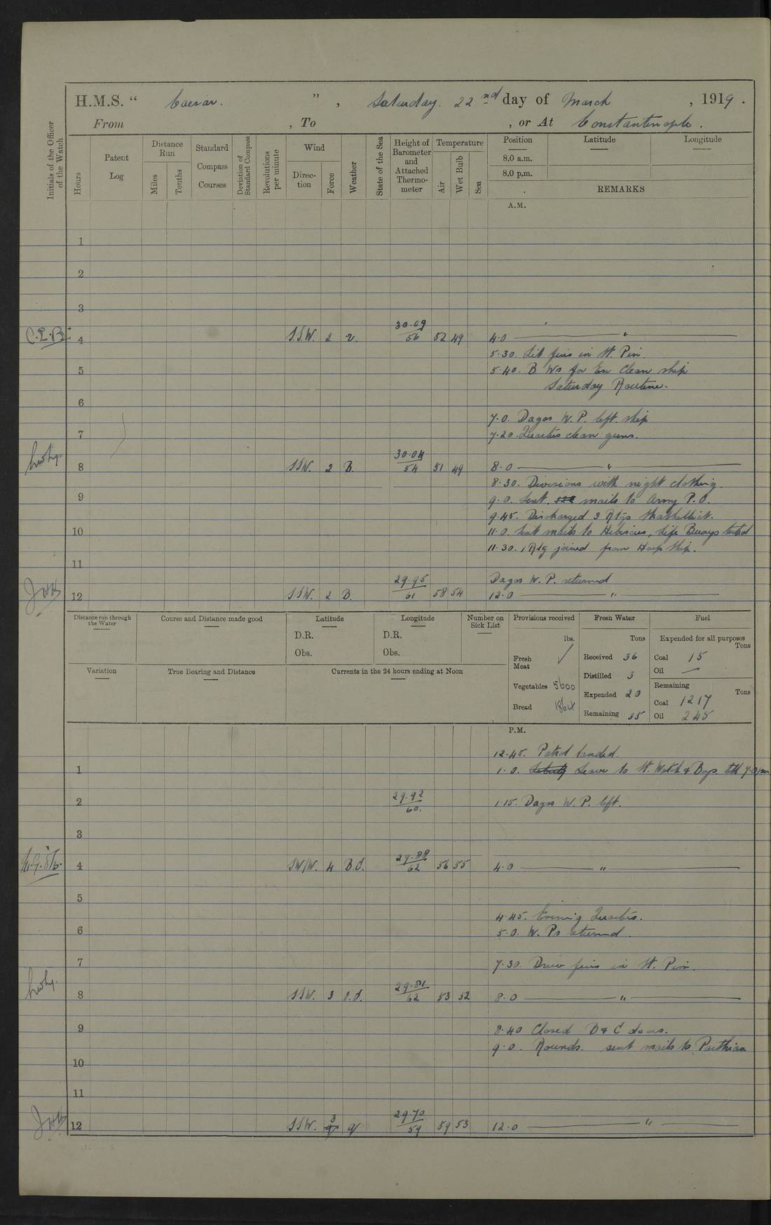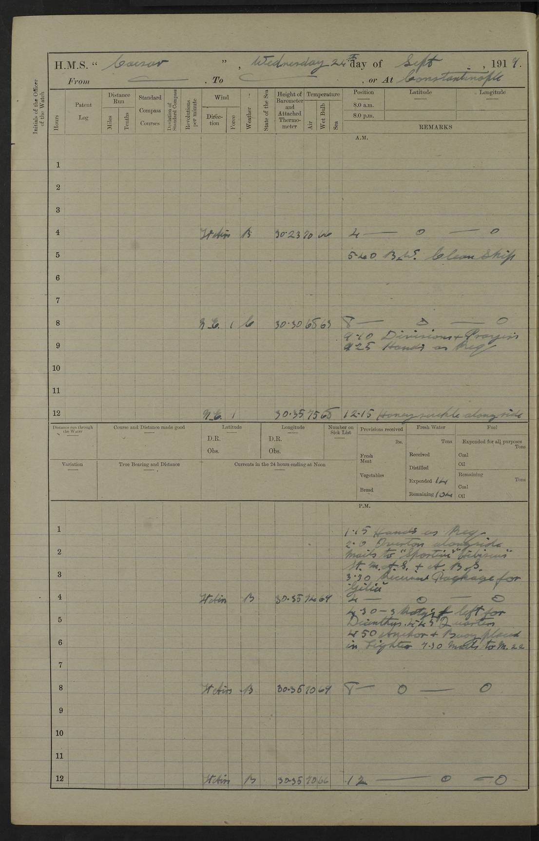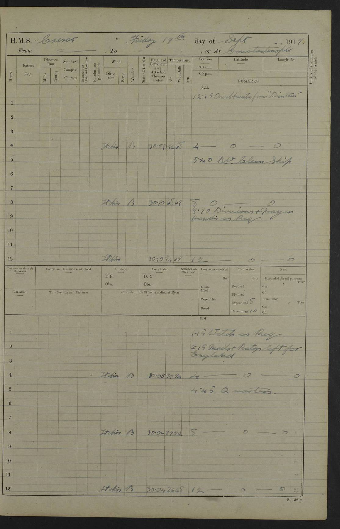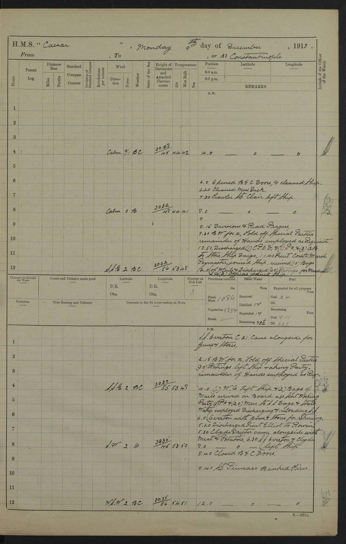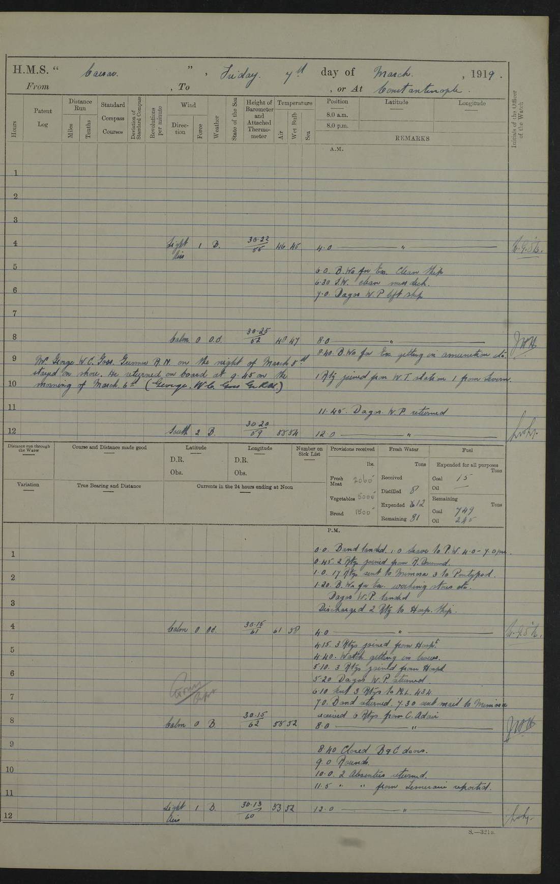 4edebb7b14d0450578000168: (https://s3.amazonaws.com:443/oldweather/ADM53-36589/0003_1.jpg) 1 November 1918 At Malta Lat 35.89, Long 14.52 [Somerset Wharf] 11.15am: Engineers Store Party returned on Board. 0.45pm: Paid Monthly Money. 1.0pm: Mr Goss, Gunner rejoined Ship from RN Hospital. 2.30pm: Gave Special leave to Port Watch untill 7.0am and Port Watch of Boys untill 6.0pm. Hands Made [sic] and Mend Clothes. 2.40pm: Landed liberty Men and Boys. 3.50pm: Provision Boat came alongside. 4.10pm: (4) Recovered Patients rejoined Ship from RN Hospital. 4.30pm: Landed liberty Men and Patrol. 6.0pm: Liberty Boys Returned on Board. 6.30pm: Canteen Party landed untill 10.0pm and Read Warrant No (24). 10.0pm: Canteen Party returned on Board. 11.50pm: Patrol returned on Board. [Provisions received: Fresh Meat 300 lbs, Vegetables 1000 lbs, Bread 450 lbs] 4edebb7c14d0450578000169: (https://s3.amazonaws.com:443/oldweather/ADM53-36589/0004_0.jpg) 2 November 1918 At Malta Lat 35.89, Long 14.52 [Hamilton Wharf] 7.15am: Shifted Berths from Somerset Wharf, to Hamilton Wharf. 8.0am: Tested life Buoys Correct. 8.45am: BW for x Told off Special Parties, Remainder of Hands employed as Requisite, and Landed Picket house Party. 9.10am: Held Court Martial on Board. 10.30am: Court Martial Finished. Noon: Picket House Party returned. 1.20pm: BW for x. Told off Special Parties. Remainder of Hands employed getting in Paymasters Stores and as Requisite. Lost overboard by accident Boat Hooks, Steel, Pattern (345), 2 in Number. 4.20pm: Hands to Fire Stations. 4.35pm: Read Warrant No 25 and gave Special leave to Starboard Watch untill 7.0am. 5.0pm: Landed liberty Men and Victualling Yard Lighter left Ship. 6.30pm: Canteen Party landed untill 10.0pm. [Provisions received: Fresh Meat 260 lbs, Bread 900 lbs] 4edebb7c14d045057800016a: (https://s3.amazonaws.com:443/oldweather/ADM53-36589/0004_1.jpg) 3 November 1918 At Malta Lat 35.89, Long 14.52 [Hamilton Wharf] 9.0am: Landed Church Parties, Wesleyans (14), Presbyterians (10). 9.30am: Divisions. 9.50am: Landed Roman Catholics (15). 10.10am: Discharged (5) Ratings to RN Hospital. 11.35am: All Church Parties returned on Board. 1.0pm: Gave Special leave to Port Watch untill 7.0am and Both Watches of Boys untill 5.30pm. 1.15pm: Landed liberty Men and Boys. 5.30pm: Liberty Boys returned on Board. 6.30pm: Canteen Party landed untill 10.0pm. 8.40pm: Closed B and C Doors. 10.0pm: Canteen Party returned on Board. [Number on sick list: 5] [Provisions received: Fresh Meat 280 lbs] 4edebb7c14d045057800016b: (https://s3.amazonaws.com:443/oldweather/ADM53-36589/0005_0.jpg) 4 November 1918 At Malta Lat 35.89, Long 14.52 [Hamilton Wharf] 6.50am: BW for x Told off Special Parties, remainder of Hands employed as Requisite. 7.0am: Liberty men returned on Board. 8.5am: Provision lighter came alongside. 8.10am: BW for x, Told off Special Parties, remainder of Hands employed Provisioning Ship and as requisite. 8.45am: Landed (1) Carpenter rating for Examination. 3.45pm: (2) Recovered Patients joined Ship from RN Hospital. 4.10pm: Received 8 Bags of Mails from Egmont, and Gave Special leave to Starboard Watch till 7.0am. 5.0pm: Landed Liberty Men and Patrol. 6.0pm: Hands employed getting in and stowing away Provisions. Midnight: Patrol returned on Board. [Weather fine, noon temperature 74F] 4edebb7c14d045057800016c: (https://s3.amazonaws.com:443/oldweather/ADM53-36589/0005_1.jpg) 5 November 1918 At Malta Lat 35.89, Long 14.52 [Hamilton Wharf] 6.45am: BW for x. Told off Special Parties. Remainder of Hands employed getting in and stowing away Provisions. 8.30am: Landed Hospital Party and Picket House Party. 11.0am: Landed (35) Rifles to Naval Ordinance for exchange. Noon: Picket House Party returned. 1.20pm: Landed (2) Ratings for Dental Treatment. 2.25pm: (35) Exchanged Rifles came on Board. 3.40pm: (2) Recovered Patients rejoined Ship from RN Hospital and disinfected Bedding. 4.0pm: Gave Special leave to Port Watch untill 7.0am. Starboard Watch employed stowing Provisions. 4.30pm: Landed Liberty men. Starboard Watch employed stowing away Provisions and Read Warrant No (26). [Provisions received: Fresh Meat 530 lbs, Bread 1000 lbs] 4edebb7c14d045057800016d: (https://s3.amazonaws.com:443/oldweather/ADM53-36589/0006_0.jpg) 6 November 1918 At Malta Lat 35.89, Long 14.52 [Hamilton Wharf] 6.50am: BW for x. Told off Special Parties, Remainder of Port Watch stowing Provisions, Starboard Watch drawing Quarter Deck Awning. 9.0am: Hands employed Provisioning Ship. 4.0pm: Gave Special leave to Starboard Watch untill 7.0am. 4.30pm: Landed liberty Men. Port Watch employed stowing away Provisions. 6.30pm: Canteen Party landed until 10.0pm. 10.0pm: Canteen Party returned on Board. [Number on sick list: 5] [Provisions received: Fresh Meat 250 lbs, Vegetables 1000 lbs, Bread 450 lbs] [Fuel Remaining: Coal 244 tons, Oil 332 tons] 4edebb7c14d045057800016e: (https://s3.amazonaws.com:443/oldweather/ADM53-36589/0006_1.jpg) 7 November 1918 At Malta Lat 35.89, Long 14.52 [No 4 Buoy] 6.30am: BW for x. Told off Special Parties. Remainder of Hands employed prepairing [preparing] Ship to Shift Berths, from Hamilton Wharf to No 4 Buoy. 7.0am: Liberty men returned on Board. 8.50am: Secured Ship to No 4 Buoy and Coal Lighters came alongside. 9.10am: Commenced Coaling Native labour. Hands employed Drawing Stores and as Requisite. 11.50am: Dockyard Parties returned. 1.40pm: BW for x Told off Special Parties, remainder of Hands employed as Requisite. 4.30pm: Gave Special leave to Port Watch untill 7.0am. 4.45pm: Landed liberty men and Patrol and Read Warrant No (27). 7.30pm: Completed Coaling (1481) Tons. 8.40pm: Watch employed sweeping down. 11.50pm: Patrol returned on Board. [Number on sick list: 6] [Provisions received: Fresh Meat 280 lbs, Bread 300 lbs] [Fuel Remaining: Coal 1716 tons, Oil 332 tons] 4edebb7c14d045057800016f: (https://s3.amazonaws.com:443/oldweather/ADM53-36589/0007_0.jpg) 8 November 1918 At Malta Lat 35.89, Long 